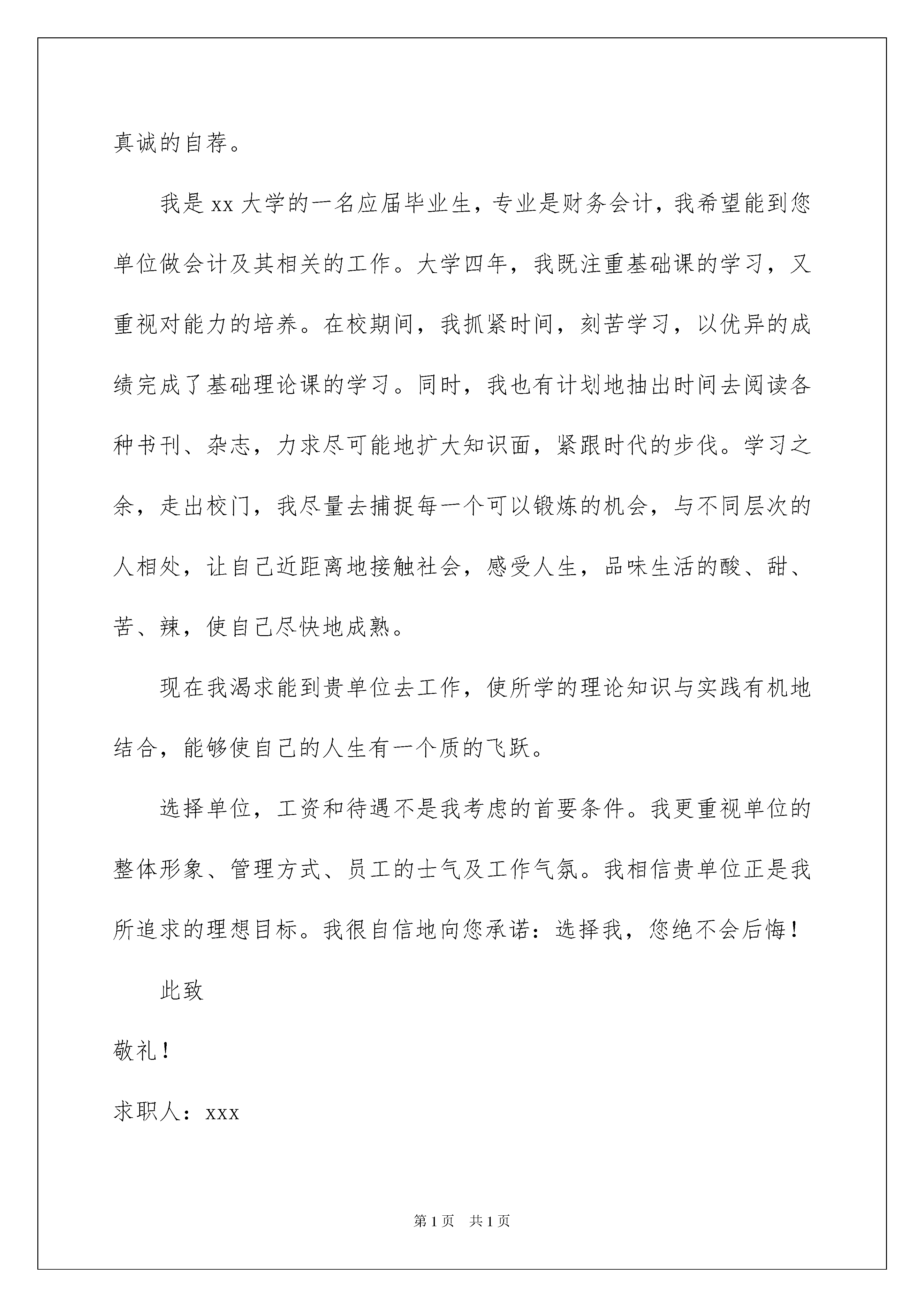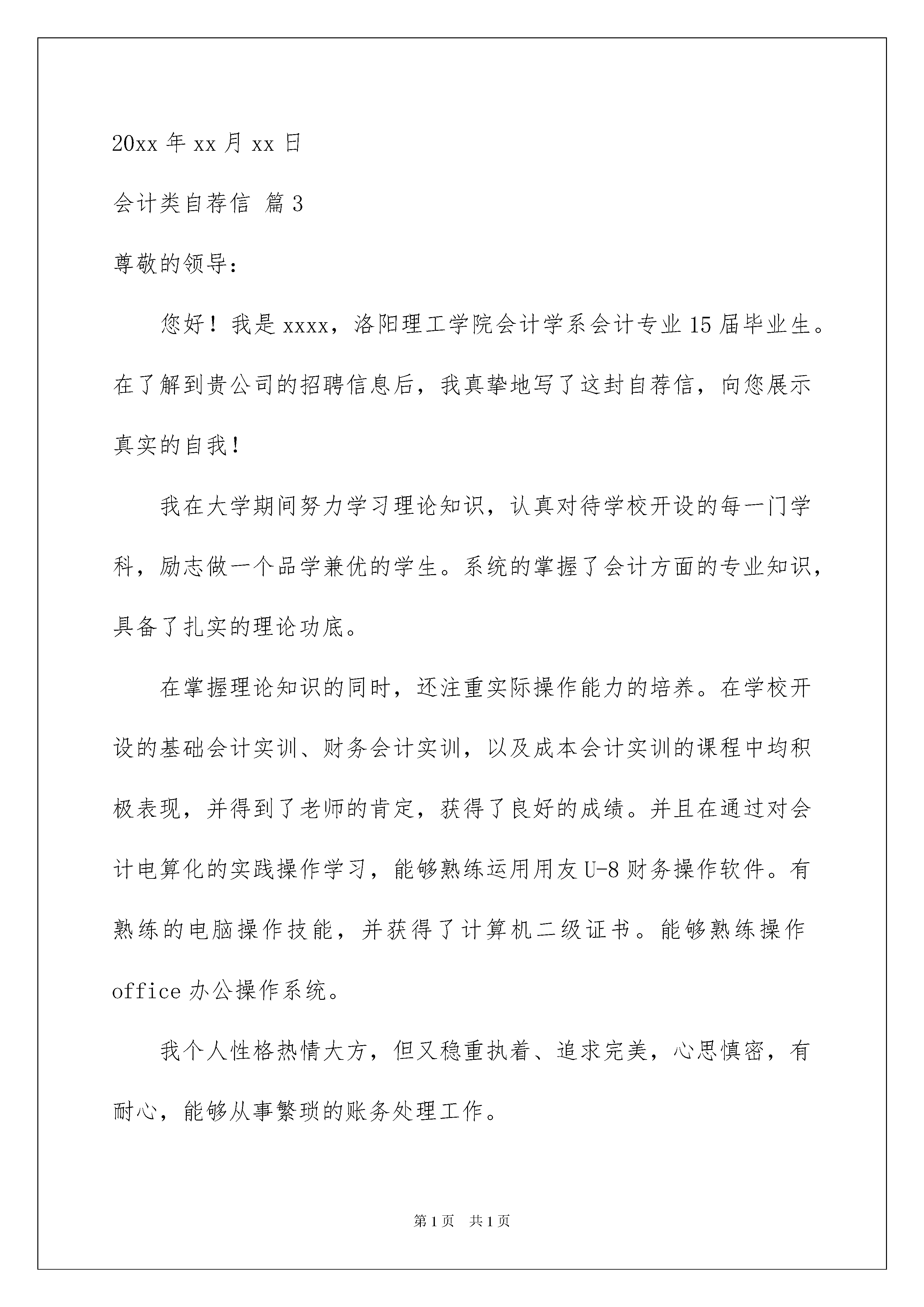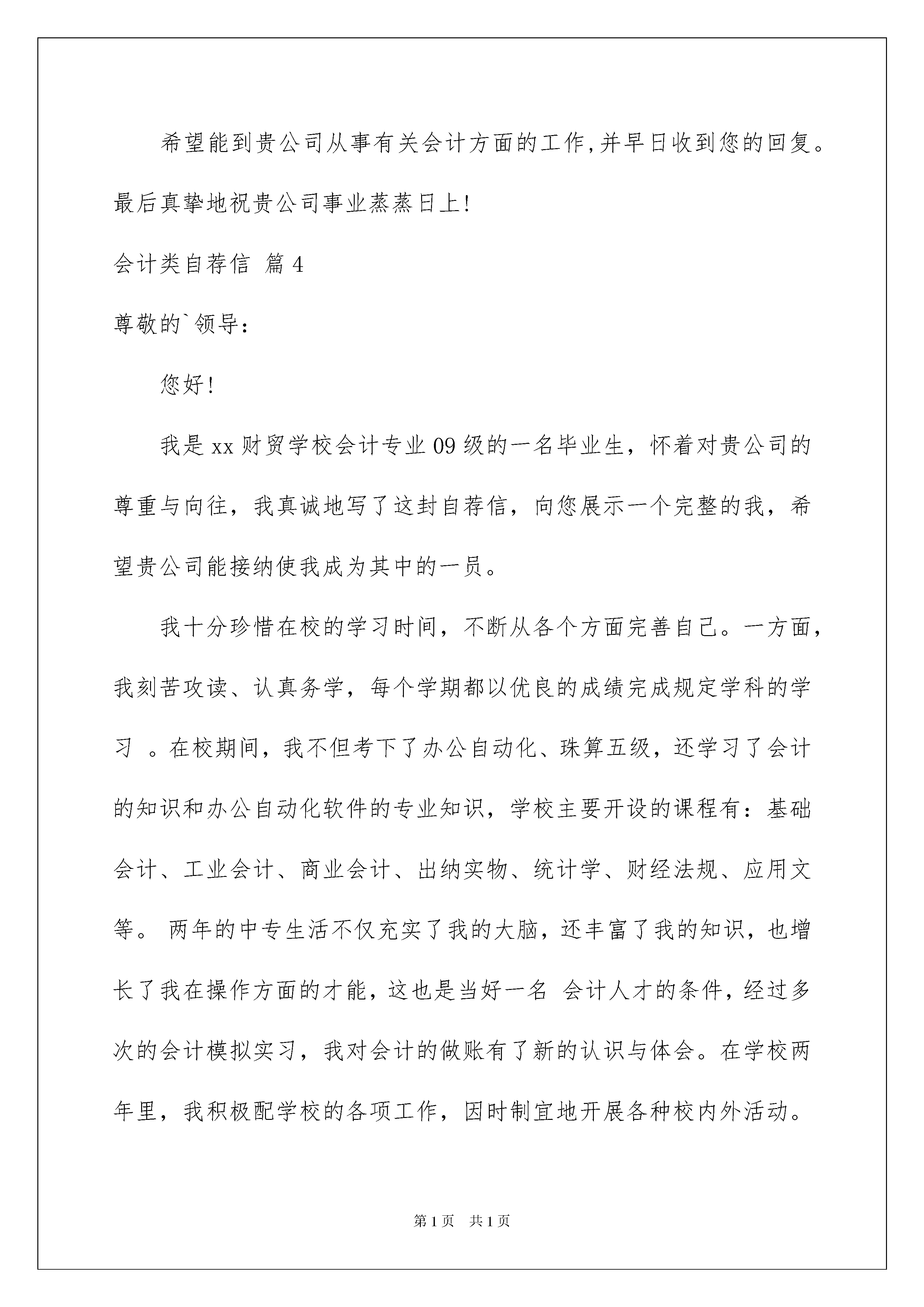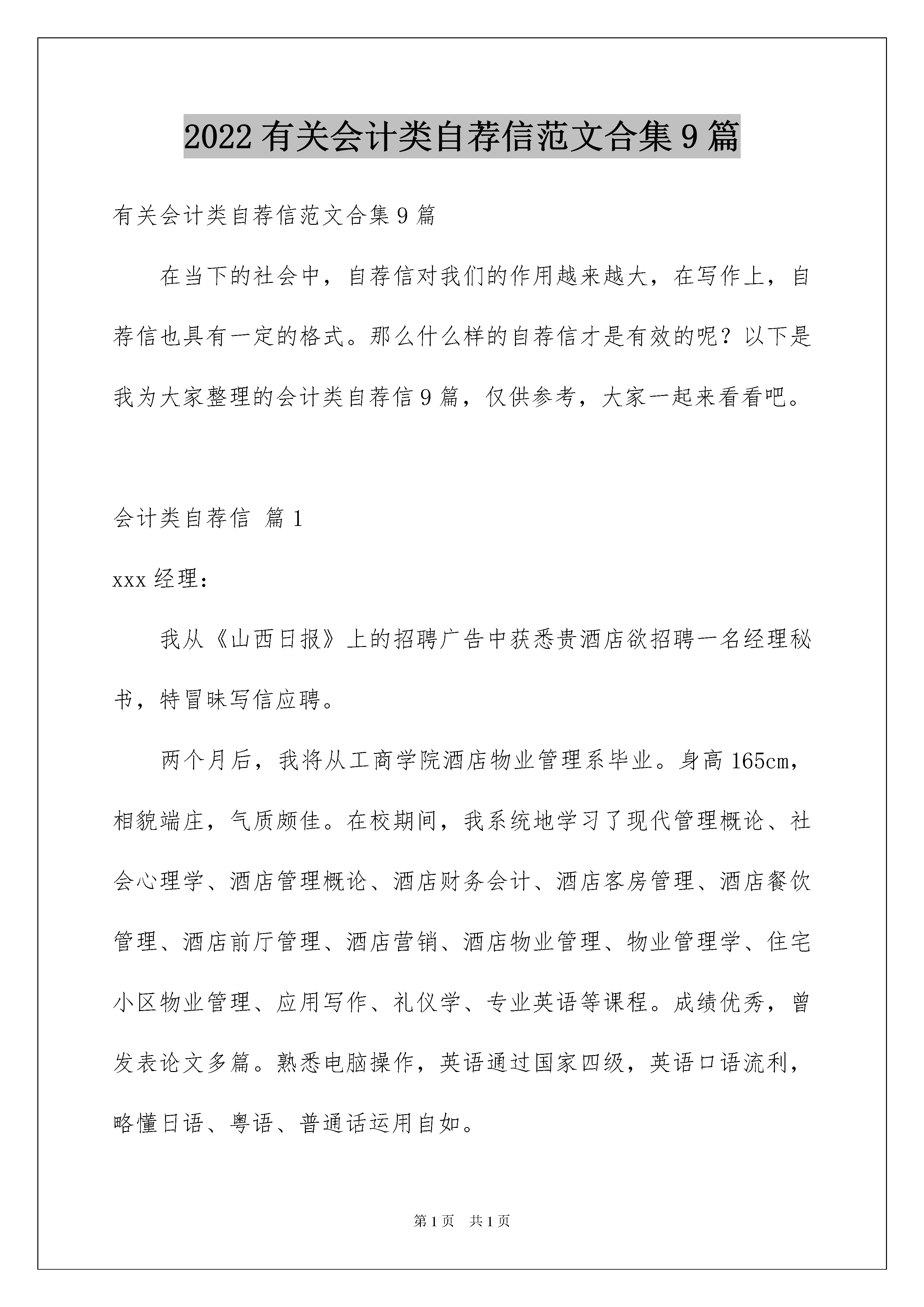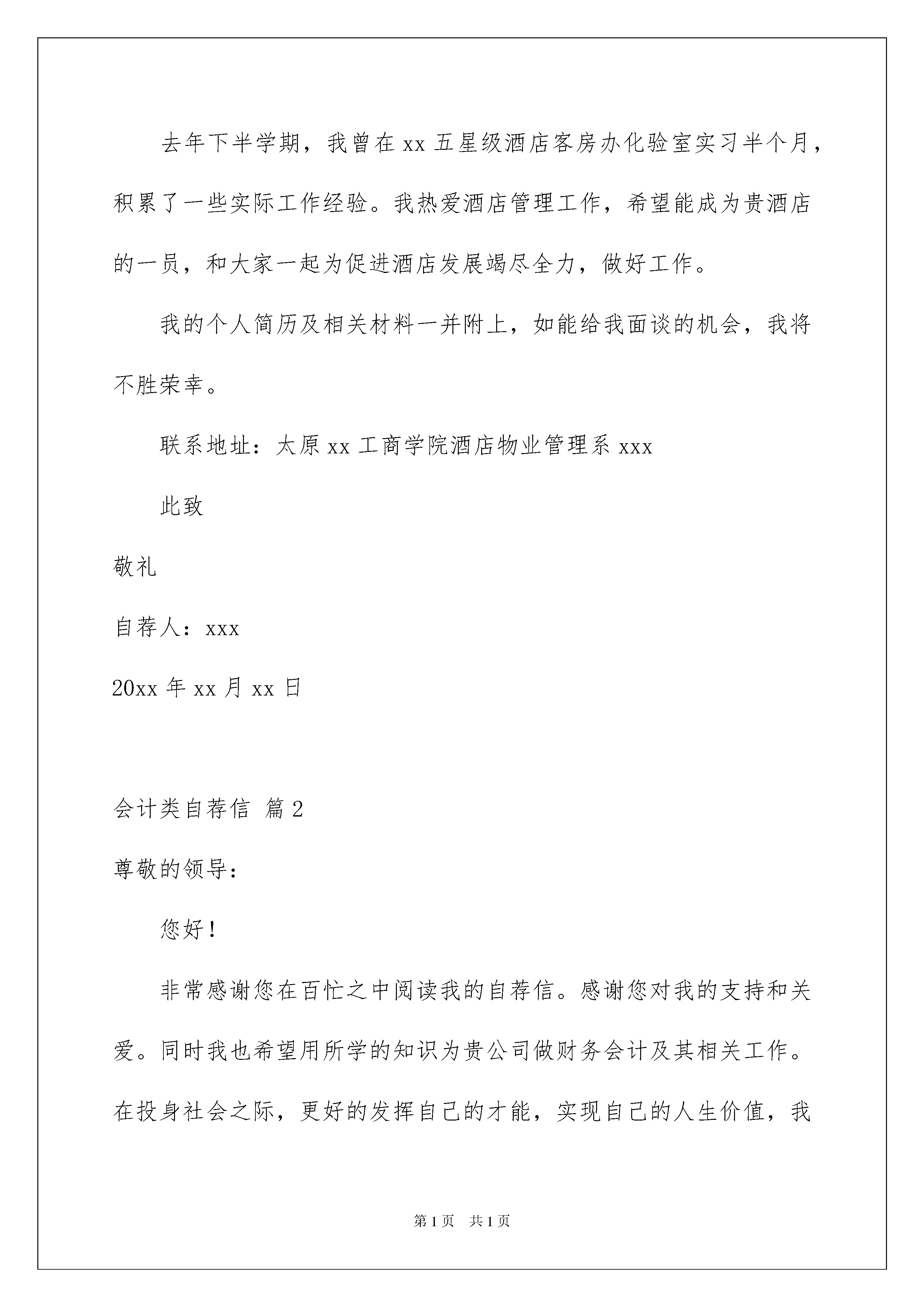 2022有关会计类自荐信范文合集9篇有关会计类自荐信范文合集9篇在当下的社会中,自荐信对我们的作用越来越大,在写作上,自荐信也具有一定的格式。那么什么样的自荐信才是有效的呢?以下是我为大家整理的会计类自荐信9篇,仅供参考,大家一起来看看吧。会计类自荐信篇1xxx经理:我从《山西日报》上的招聘广告中获悉贵酒店欲招聘一名经理秘书,特冒昧写信应聘。两个月后,我将从工商学院酒店物业管理系毕业。身高165cm,相貌端庄,气质颇佳。在校期间,我系统地学习了现代管理概论、社会心理学、酒店管理概论、酒店财务会计、酒店客房管理、酒店餐饮管理、酒店前厅管理、酒店营销、酒店物业管理、物业管理学、住宅小区物业管理、应用写作、礼仪学、专业英语等课程。成绩优秀,曾发表论文多篇。熟悉电脑操作,英语通过国家四级,英语口语流利,略懂日语、粤语、普通话运用自如。去年下半学期,我曾在xx五星级酒店客房办化验室实习半个月,积累了一些实际工作经验。我热爱酒店管理工作,希望能成为贵酒店的一员,和大家一起为促进酒店发展竭尽全力,做好工作。我的个人简历及相关材料一并附上,如能给我面谈的机会,我将不胜荣幸。联系地址:太原xx工商学院酒店物业管理系xxx此致敬礼自荐人:xxx20xx年xx月xx日会计类自荐信篇2尊敬的领导:您好!非常感谢您在百忙之中阅读我的自荐信。感谢您对我的支持和关爱。同时我也希望用所学的知识为贵公司做财务会计及其相关工作。在投身社会之际,更好的发挥自己的才能,实现自己的人生价值,我真诚的自荐。我是xx大学的一名应届毕业生,专业是财务会计,我希望能到您单位做会计及其相关的工作。大学四年,我既注重基础课的学习,又重视对能力的培养。在校期间,我抓紧时间,刻苦学习,以优异的成绩完成了基础理论课的学习。同时,我也有计划地抽出时间去阅读各种书刊、杂志,力求尽可能地扩大知识面,紧跟时代的步伐。学习之余,走出校门,我尽量去捕捉每一个可以锻炼的机会,与不同层次的人相处,让自己近距离地接触社会,感受人生,品味生活的酸、甜、苦、辣,使自己尽快地成熟。现在我渴求能到贵单位去工作,使所学的理论知识与实践有机地结合,能够使自己的人生有一个质的飞跃。选择单位,工资和待遇不是我考虑的首要条件。我更重视单位的整体形象、管理方式、员工的士气及工作气氛。我相信贵单位正是我所追求的理想目标。我很自信地向您承诺:选择我,您绝不会后悔!此致敬礼!求职人:xxx20xx年xx月xx日会计类自荐信篇3尊敬的领导:您好!我是xxxx,洛阳理工学院会计学系会计专业15届毕业生。在了解到贵公司的招聘信息后,我真挚地写了这封自荐信,向您展示真实的自我!我在大学期间努力学习理论知识,认真对待学校开设的每一门学科,励志做一个品学兼优的学生。系统的掌握了会计方面的专业知识,具备了扎实的理论功底。在掌握理论知识的同时,还注重实际操作能力的培养。在学校开设的基础会计实训、财务会计实训,以及成本会计实训的课程中均积极表现,并得到了老师的肯定,获得了良好的成绩。并且在通过对会计电算化的实践操作学习,能够熟练运用用友U-8财务操作软件。有熟练的电脑操作技能,并获得了计算机二级证书。能够熟练操作office办公操作系统。我个人性格热情大方,但又稳重执着、追求完美,心思慎密,有耐心,能够从事繁琐的账务处理工作。希望能到贵公司从事有关会计方面的工作,并早日收到您的回复。最后真挚地祝贵公司事业蒸蒸日上!会计类自荐信篇4尊敬的`领导:您好!我是xx财贸学校会计专业09级的一名毕业生,怀着对贵公司的尊重与向往,我真诚地写了这封自荐信,向您展示一个完整的我,希望贵公司能接纳使我成为其中的一员。我十分珍惜在校的学习时间,不断从各个方面完善自己。一方面,我刻苦攻读、认真务学,每个学期都以优良的成绩完成规定学科的学习。在校期间,我不但考下了办公自动化、珠算五级,还学习了会计的知识和办公自动化软件的专业知识,学校主要开设的课程有:基础会计、工业会计、商业会计、出纳实物、统计学、财经法规、应用文等。两年的中专生活不仅充实了我的大脑,还丰富了我的知识,也增长了我在操作方面的才能,这也是当好一名会计人才的条件,经过多次的会计模拟实习,我对会计的做账有了新的认识与体会。在学校两年里,我积极配学校的各项工作,因时制宜地开展各种校内外活动。如:参加校运会当拉拉队;参加班级大拔草等等,这不仅拓宽了我的视野,也丰富了我在校的生活。在课余时间里,我喜欢阅读各类书籍,从书中吸取养料来充实自己、更新观念、开拓胸怀,除了读书,适当的体育运动对我来说也是必不可少的,强健的身体是进行工作的前堤,因此,每天我都会进行适量的
