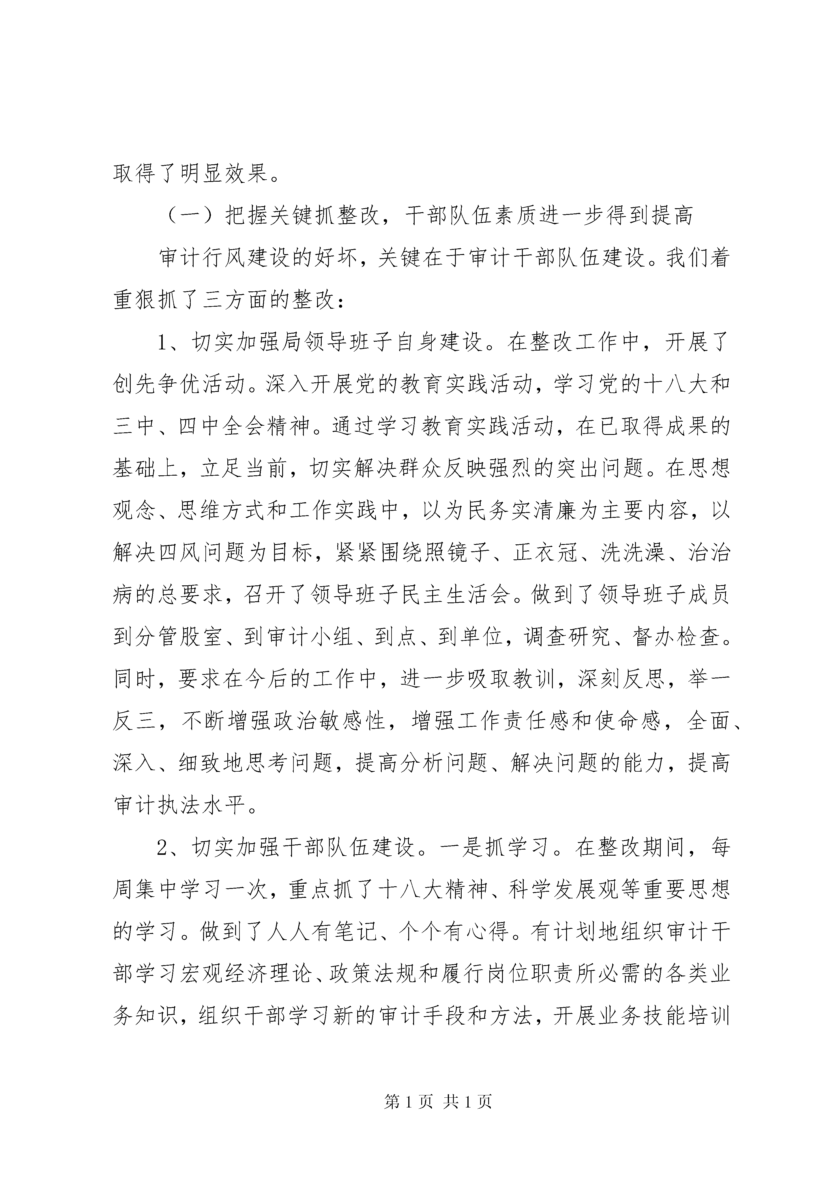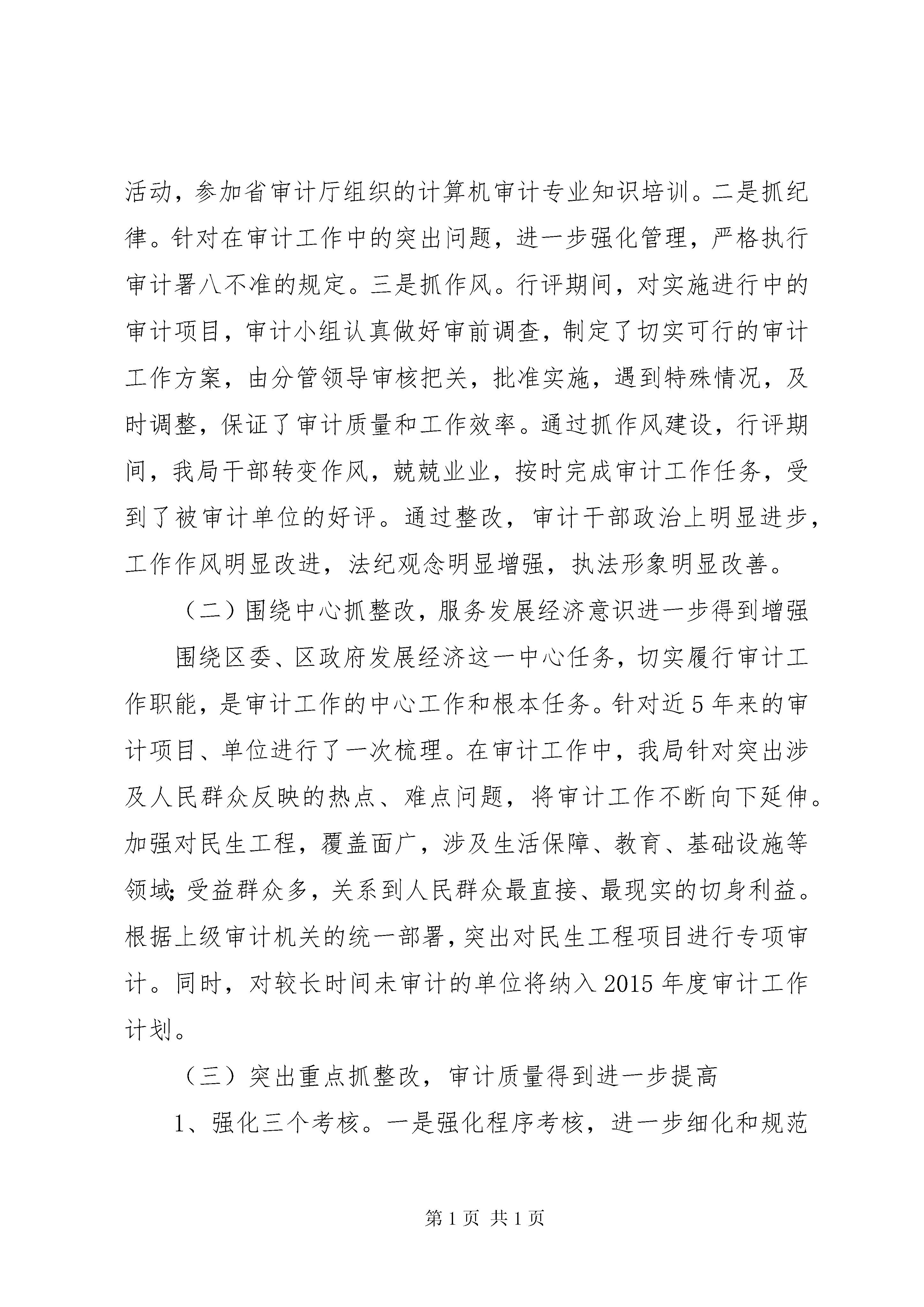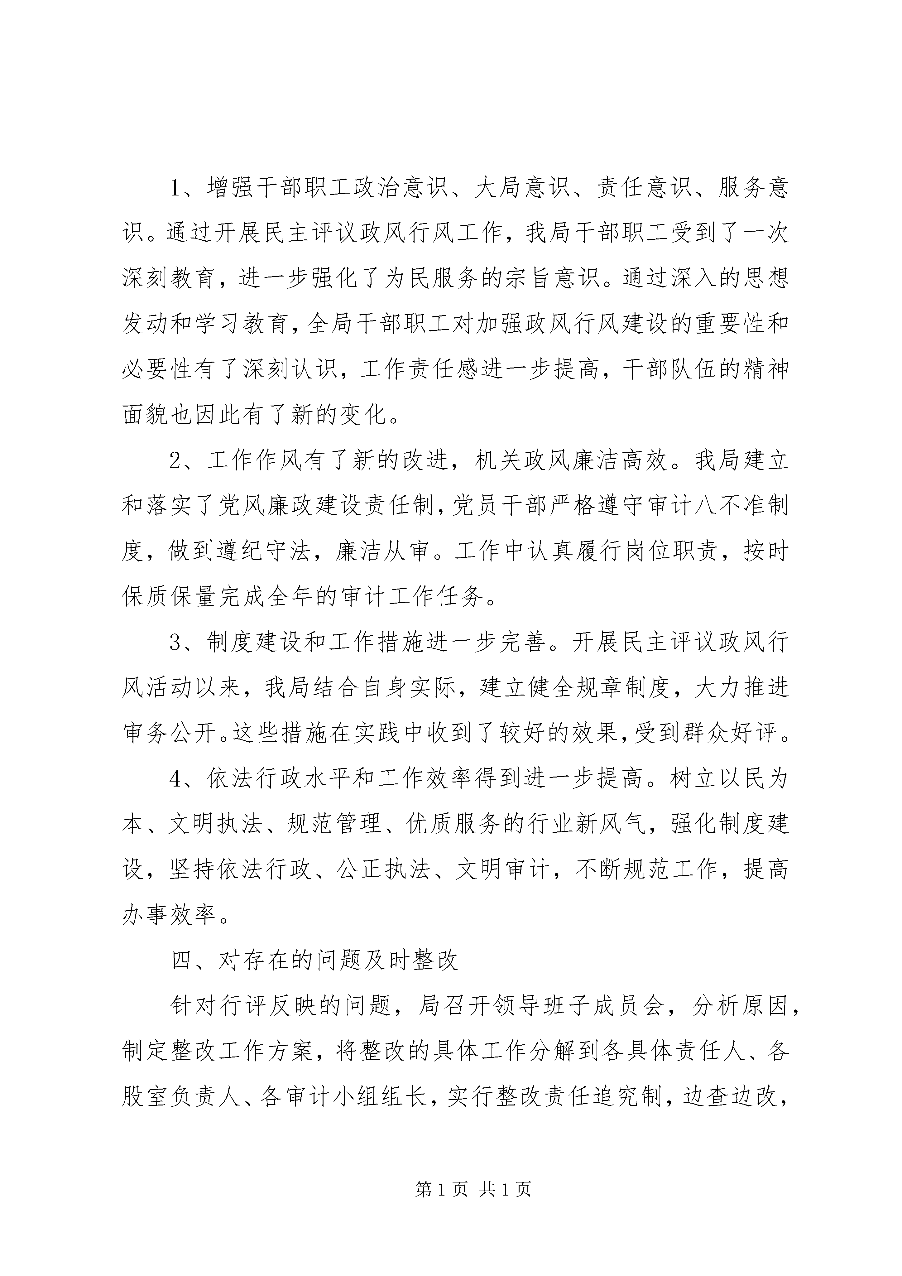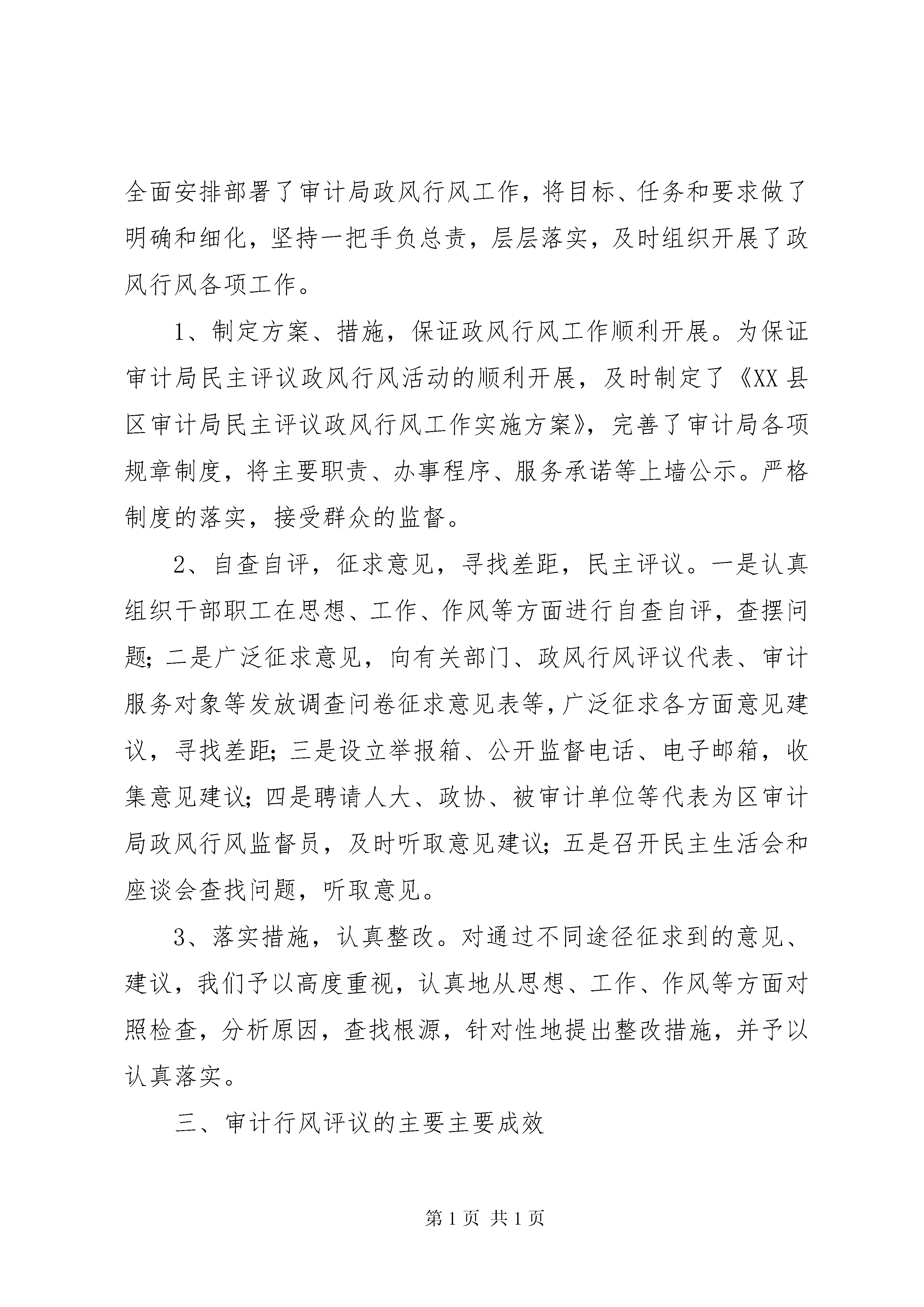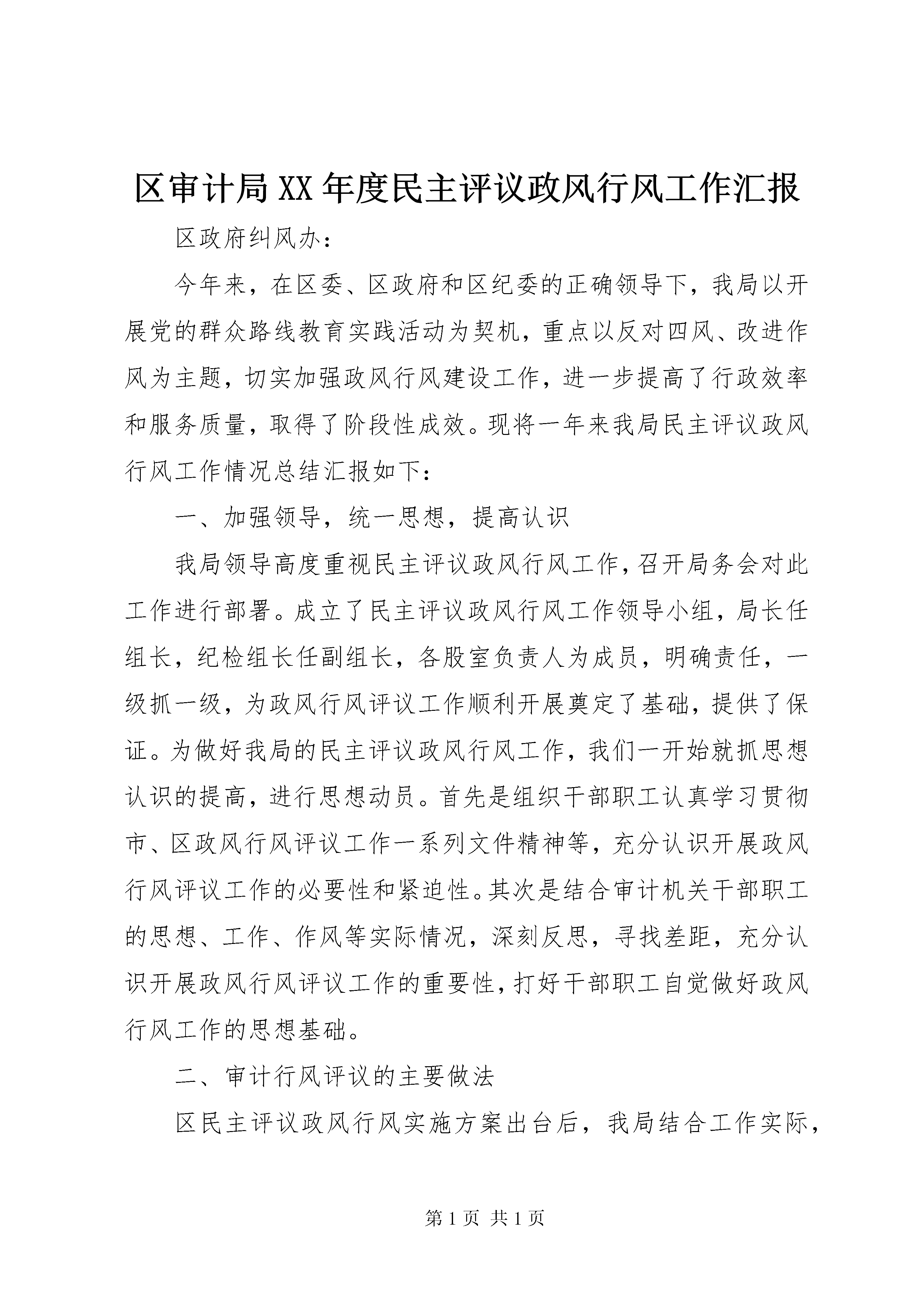 区审计局XX年度民主评议政风行风工作汇报区政府纠风办:今年来,在区委、区政府和区纪委的正确领导下,我局以开展党的群众路线教育实践活动为契机,重点以反对四风、改进作风为主题,切实加强政风行风建设工作,进一步提高了行政效率和服务质量,取得了阶段性成效。现将一年来我局民主评议政风行风工作情况总结汇报如下:一、加强领导,统一思想,提高认识我局领导高度重视民主评议政风行风工作,召开局务会对此工作进行部署。成立了民主评议政风行风工作领导小组,局长任组长,纪检组长任副组长,各股室负责人为成员,明确责任,一级抓一级,为政风行风评议工作顺利开展奠定了基础,提供了保证。为做好我局的民主评议政风行风工作,我们一开始就抓思想认识的提高,进行思想动员。首先是组织干部职工认真学习贯彻市、区政风行风评议工作一系列文件精神等,充分认识开展政风行风评议工作的必要性和紧迫性。其次是结合审计机关干部职工的思想、工作、作风等实际情况,深刻反思,寻找差距,充分认识开展政风行风评议工作的重要性,打好干部职工自觉做好政风行风工作的思想基础。二、审计行风评议的主要做法区民主评议政风行风实施方案出台后,我局结合工作实际,全面安排部署了审计局政风行风工作,将目标、任务和要求做了明确和细化,坚持一把手负总责,层层落实,及时组织开展了政风行风各项工作。1、制定方案、措施,保证政风行风工作顺利开展。为保证审计局民主评议政风行风活动的顺利开展,及时制定了《XX县区审计局民主评议政风行风工作实施方案》,完善了审计局各项规章制度,将主要职责、办事程序、服务承诺等上墙公示。严格制度的落实,接受群众的监督。2、自查自评,征求意见,寻找差距,民主评议。一是认真组织干部职工在思想、工作、作风等方面进行自查自评,查摆问题;二是广泛征求意见,向有关部门、政风行风评议代表、审计服务对象等发放调查问卷征求意见表等,广泛征求各方面意见建议,寻找差距;三是设立举报箱、公开监督电话、电子邮箱,收集意见建议;四是聘请人大、政协、被审计单位等代表为区审计局政风行风监督员,及时听取意见建议;五是召开民主生活会和座谈会查找问题,听取意见。3、落实措施,认真整改。对通过不同途径征求到的意见、建议,我们予以高度重视,认真地从思想、工作、作风等方面对照检查,分析原因,查找根源,针对性地提出整改措施,并予以认真落实。三、审计行风评议的主要主要成效1、增强干部职工政治意识、大局意识、责任意识、服务意识。通过开展民主评议政风行风工作,我局干部职工受到了一次深刻教育,进一步强化了为民服务的宗旨意识。通过深入的思想发动和学习教育,全局干部职工对加强政风行风建设的重要性和必要性有了深刻认识,工作责任感进一步提高,干部队伍的精神面貌也因此有了新的变化。2、工作作风有了新的改进,机关政风廉洁高效。我局建立和落实了党风廉政建设责任制,党员干部严格遵守审计八不准制度,做到遵纪守法,廉洁从审。工作中认真履行岗位职责,按时保质保量完成全年的审计工作任务。3、制度建设和工作措施进一步完善。开展民主评议政风行风活动以来,我局结合自身实际,建立健全规章制度,大力推进审务公开。这些措施在实践中收到了较好的效果,受到群众好评。4、依法行政水平和工作效率得到进一步提高。树立以民为本、文明执法、规范管理、优质服务的行业新风气,强化制度建设,坚持依法行政、公正执法、文明审计,不断规范工作,提高办事效率。四、对存在的问题及时整改针对行评反映的问题,局召开领导班子成员会,分析原因,制定整改工作方案,将整改的具体工作分解到各具体责任人、各股室负责人、各审计小组组长,实行整改责任追究制,边查边改,取得了明显效果。(一)把握关键抓整改,干部队伍素质进一步得到提高审计行风建设的好坏,关键在于审计干部队伍建设。我们着重狠抓了三方面的整改:1、切实加强局领导班子自身建设。在整改工作中,开展了创先争优活动。深入开展党的教育实践活动,学习党的十八大和三中、四中全会精神。通过学习教育实践活动,在已取得成果的基础上,立足当前,切实解决群众反映强烈的突出问题。在思想观念、思维方式和工作实践中,以为民务实清廉为主要内容,以解决四风问题为目标,紧紧围绕照镜子、正衣冠、洗洗澡、治治病的总要求,召开了领导班子民主生活会。做到了领导班子成员到分管股室、到审计小组、到点、到单位,调查研究、督办检查。同时,要求在今后的工作中,进一步吸取教训,深刻反思,举一反三,不断增强政治敏感性,增强工作责任感和使命感,全面、深入、细致地思考问题,提高分析问题、解决问题的能力,提高审计执法水平。2、切实加强干部队伍建设。一是抓学习。在整改期间,每周集中学习一次,重点抓了十八大精神、科学发展观等重要思想的学习。做到了人人有笔记、个个有心得。有计划地组织审计干部学习宏观经济理论、政策法规和履行岗位