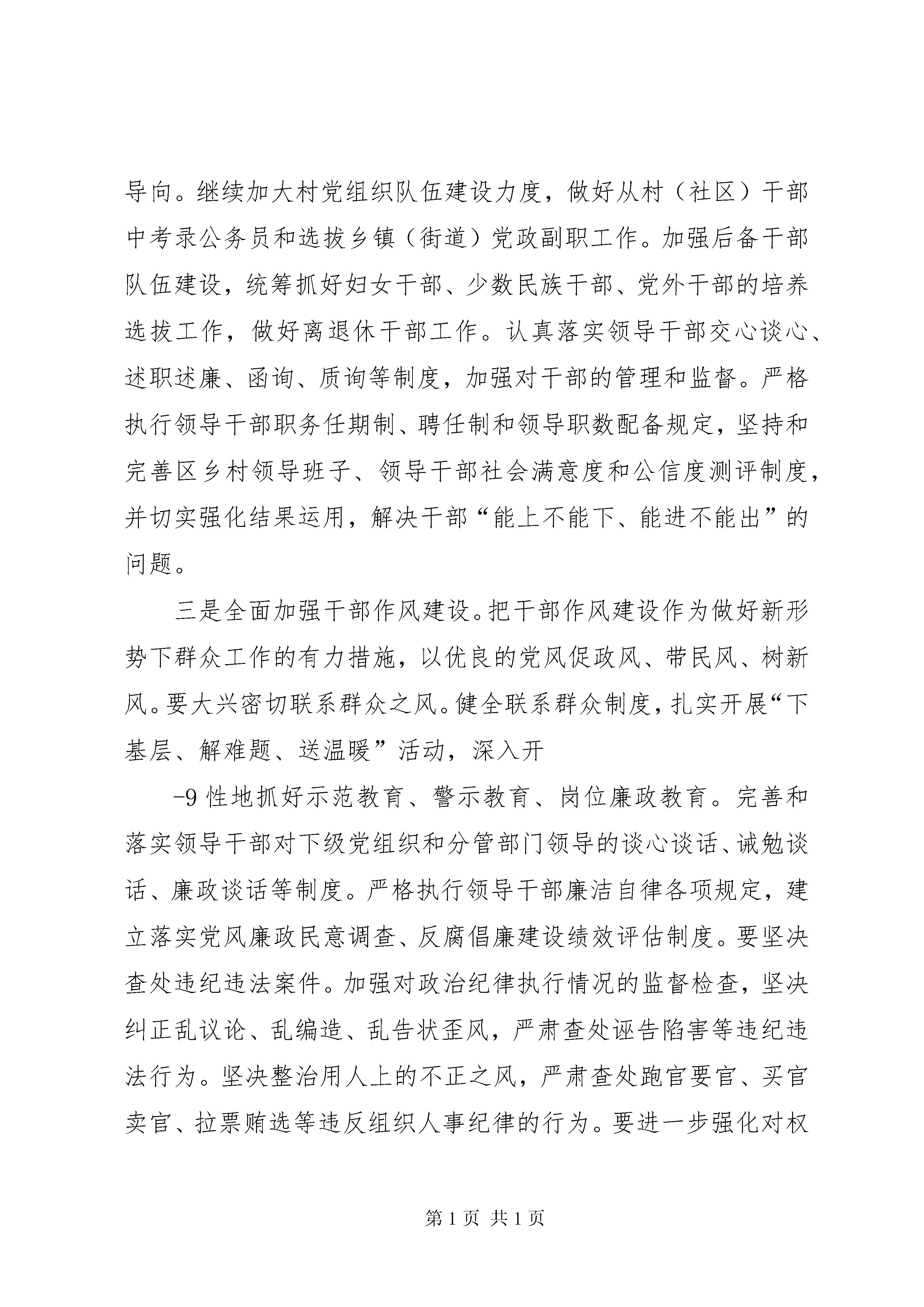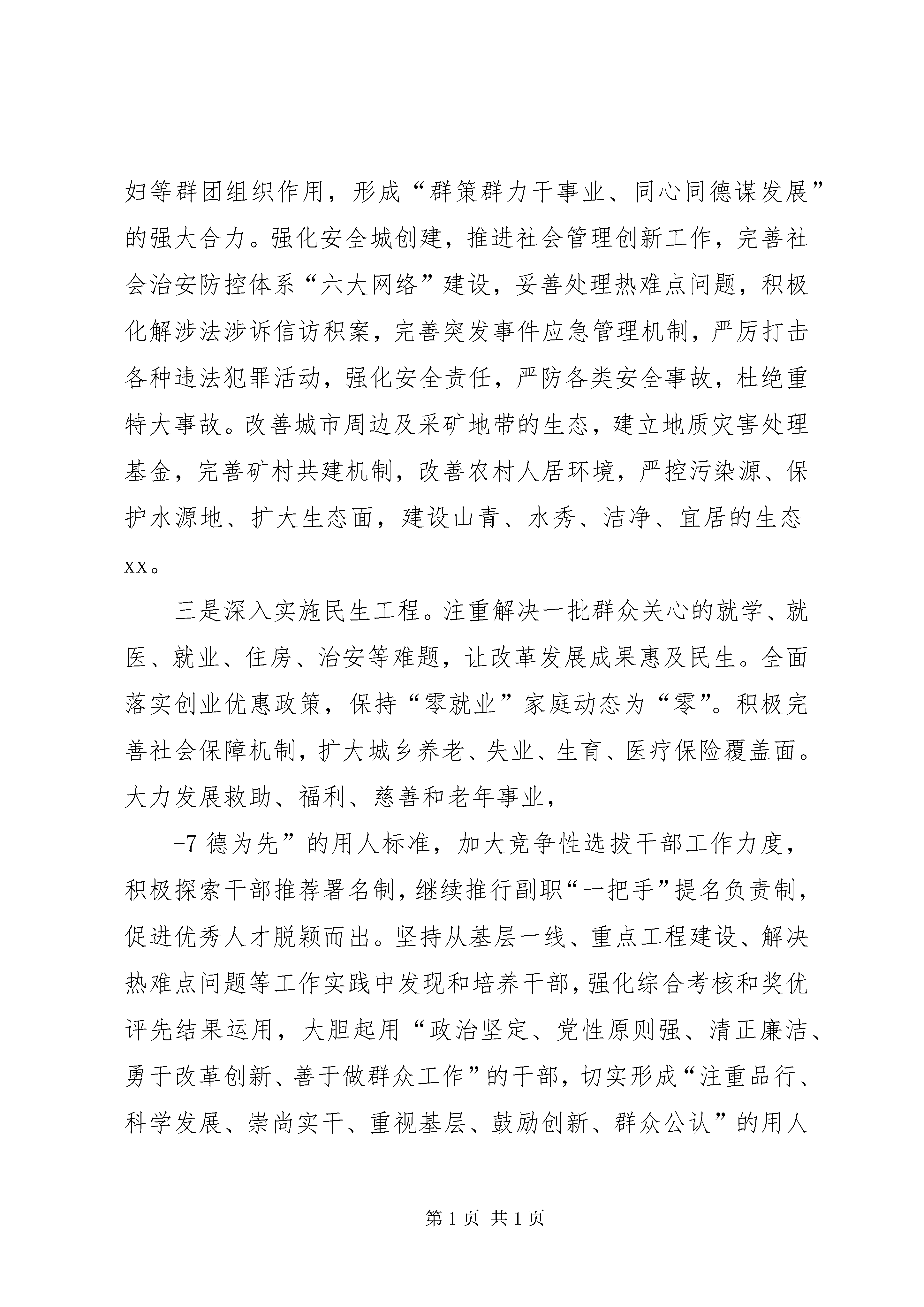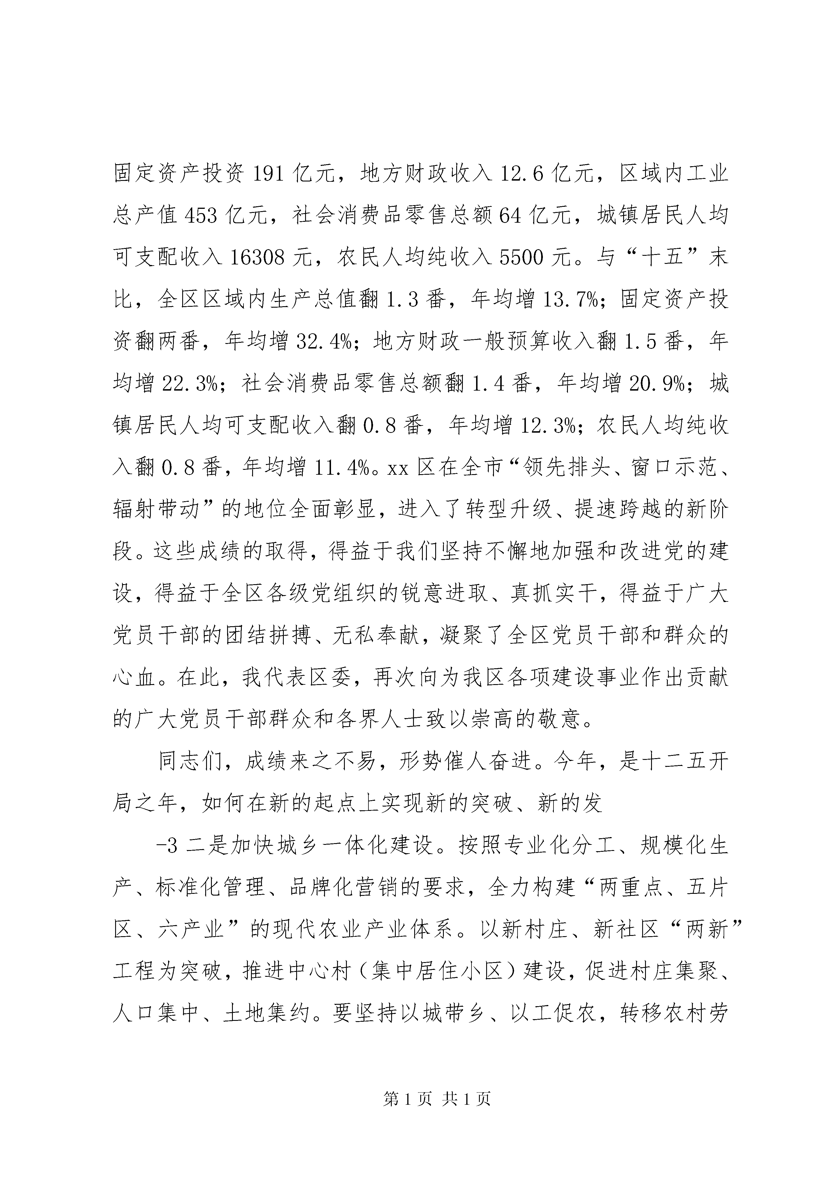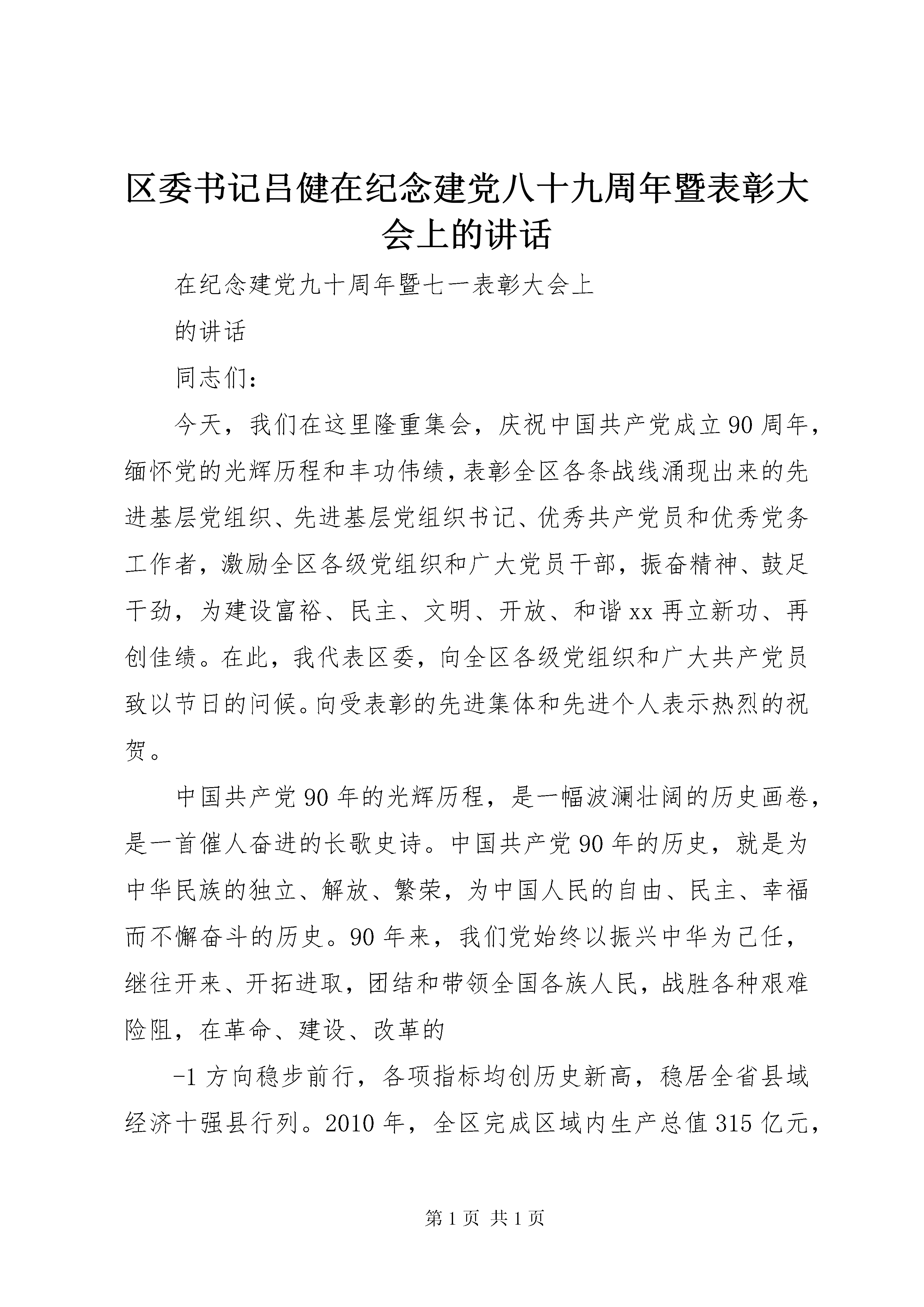 区委书记吕健在纪念建党八十九周年暨表彰大会上的讲话在纪念建党九十周年暨七一表彰大会上的讲话同志们:今天,我们在这里隆重集会,庆祝中国共产党成立90周年,缅怀党的光辉历程和丰功伟绩,表彰全区各条战线涌现出来的先进基层党组织、先进基层党组织书记、优秀共产党员和优秀党务工作者,激励全区各级党组织和广大党员干部,振奋精神、鼓足干劲,为建设富裕、民主、文明、开放、和谐xx再立新功、再创佳绩。在此,我代表区委,向全区各级党组织和广大共产党员致以节日的问候。向受表彰的先进集体和先进个人表示热烈的祝贺。中国共产党90年的光辉历程,是一幅波澜壮阔的历史画卷,是一首催人奋进的长歌史诗。中国共产党90年的历史,就是为中华民族的独立、解放、繁荣,为中国人民的自由、民主、幸福而不懈奋斗的历史。90年来,我们党始终以振兴中华为己任,继往开来、开拓进取,团结和带领全国各族人民,战胜各种艰难险阻,在革命、建设、改革的-1方向稳步前行,各项指标均创历史新高,稳居全省县域经济十强县行列。2010年,全区完成区域内生产总值315亿元,固定资产投资191亿元,地方财政收入12.6亿元,区域内工业总产值453亿元,社会消费品零售总额64亿元,城镇居民人均可支配收入16308元,农民人均纯收入5500元。与“十五”末比,全区区域内生产总值翻1.3番,年均增13.7%;固定资产投资翻两番,年均增32.4%;地方财政一般预算收入翻1.5番,年均增22.3%;社会消费品零售总额翻1.4番,年均增20.9%;城镇居民人均可支配收入翻0.8番,年均增12.3%;农民人均纯收入翻0.8番,年均增11.4%。xx区在全市“领先排头、窗口示范、辐射带动”的地位全面彰显,进入了转型升级、提速跨越的新阶段。这些成绩的取得,得益于我们坚持不懈地加强和改进党的建设,得益于全区各级党组织的锐意进取、真抓实干,得益于广大党员干部的团结拼搏、无私奉献,凝聚了全区党员干部和群众的心血。在此,我代表区委,再次向为我区各项建设事业作出贡献的广大党员干部群众和各界人士致以崇高的敬意。同志们,成绩来之不易,形势催人奋进。今年,是十二五开局之年,如何在新的起点上实现新的突破、新的发-3二是加快城乡一体化建设。按照专业化分工、规模化生产、标准化管理、品牌化营销的要求,全力构建“两重点、五片区、六产业”的现代农业产业体系。以新村庄、新社区“两新”工程为突破,推进中心村(集中居住小区)建设,促进村庄集聚、人口集中、土地集约。要坚持以城带乡、以工促农,转移农村劳动力,提高农村收入。积极争取上级政策和资金支持,加大固定资产投资力度,培育新的经济增长点。加强以水利为重点的农业基础设施建设,加快农村道路建设,实现全区行政村道路通畅化。加快城市基础设施建设,推进旧城改造,加快“东扩、西进、南拓、北延、中提升”进程,扶持中心集镇扩容增量,形成“一区、三组团、十集镇、百中心村”的辐射状发展格局,着力打造文明、安全、卫生、园林式宜居城市。三是做强现代服务业。加快构建与新型工业化相配套、与现代城市化相协调、与居民需求多元化相适应的现代服务业体系。重点打造“一圈、五中心”,构建传统服务业和现代服务业相融合的城市经济集群。重视发展新兴服务业,为金融保险业健康发展创造良好环境,推进金融保险业集聚发展。大力培育中介服务业,鼓励发展社区服务业,促进公益服务业加快发展。扶持发展休闲旅游业,力支持乡村、会展、生态等旅游项目开发,开创旅游“二次创业”新格-5完善收入分配制度,扩大就业和再就业,逐步提高城乡最低生活保障标准,稳步推进新型农村养老保险工作,扩大农村低保覆盖范围。二是全力营造和谐环境。认真贯彻落实区委人大、政协工作会议精神,积极支持人大、政协依法依章履职。认真做好人武、双拥、统战、民族宗教和离退休干部工作,更好地发挥工、青、妇等群团组织作用,形成“群策群力干事业、同心同德谋发展”的强大合力。强化安全城创建,推进社会管理创新工作,完善社会治安防控体系“六大网络”建设,妥善处理热难点问题,积极化解涉法涉诉信访积案,完善突发事件应急管理机制,严厉打击各种违法犯罪活动,强化安全责任,严防各类安全事故,杜绝重特大事故。改善城市周边及采矿地带的生态,建立地质灾害处理基金,完善矿村共建机制,改善农村人居环境,严控污染源、保护水源地、扩大生态面,建设山青、水秀、洁净、宜居的生态xx。三是深入实施民生工程。注重解决一批群众关心的就学、就医、就业、住房、治安等难题,让改革发展成果惠及民生。全面落实创业优惠政策,保持“零就业”家庭动态为“零”。积极完善社会保障机制,扩大城乡养老、失业、生育、医疗保险覆盖面。大力发展救助、福利、慈善和老年事业,-7德为先”的用人标准,加大竞争性选拔干部工作力度,积极探索干部推荐署名制,继续推行副职“一把手