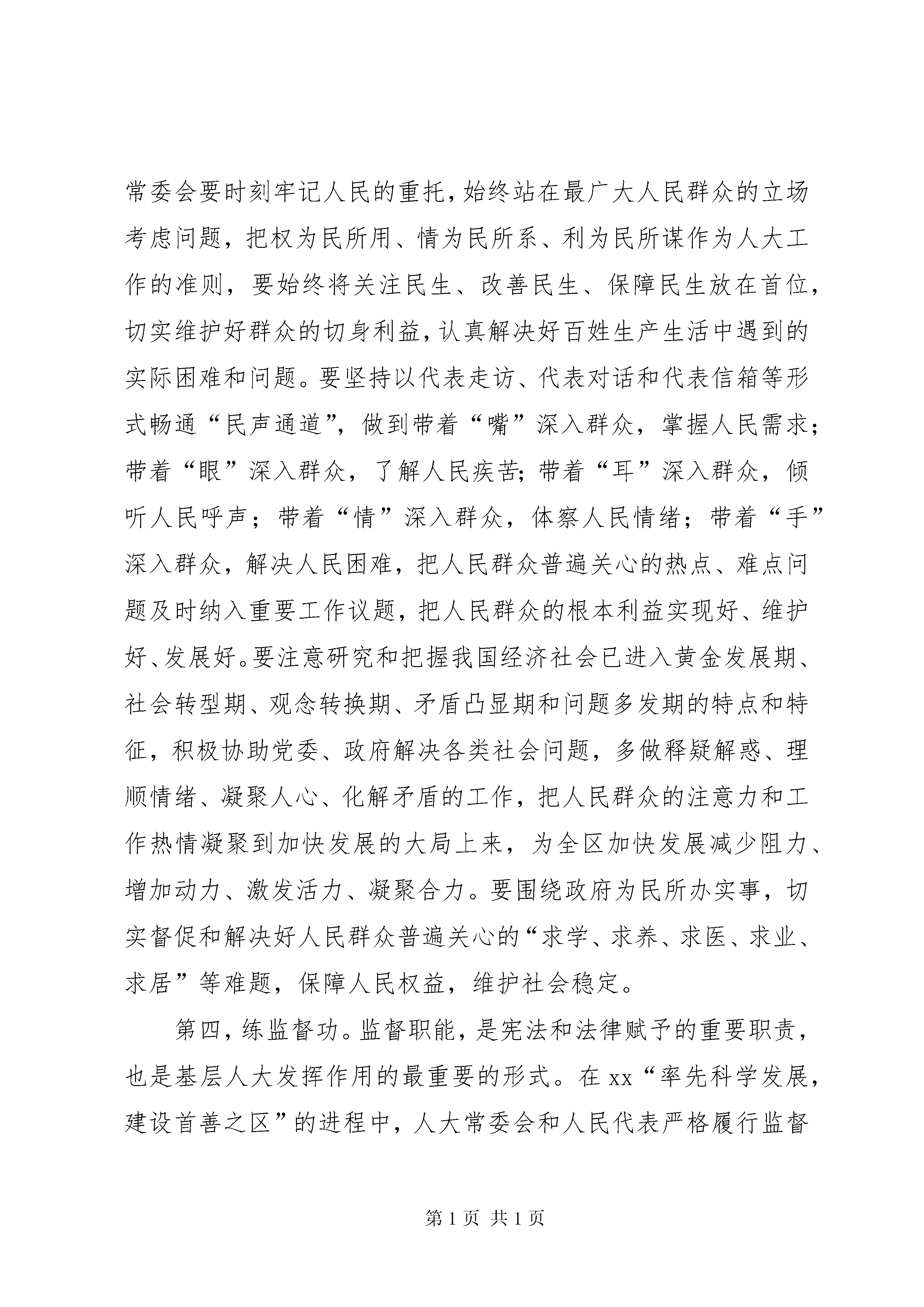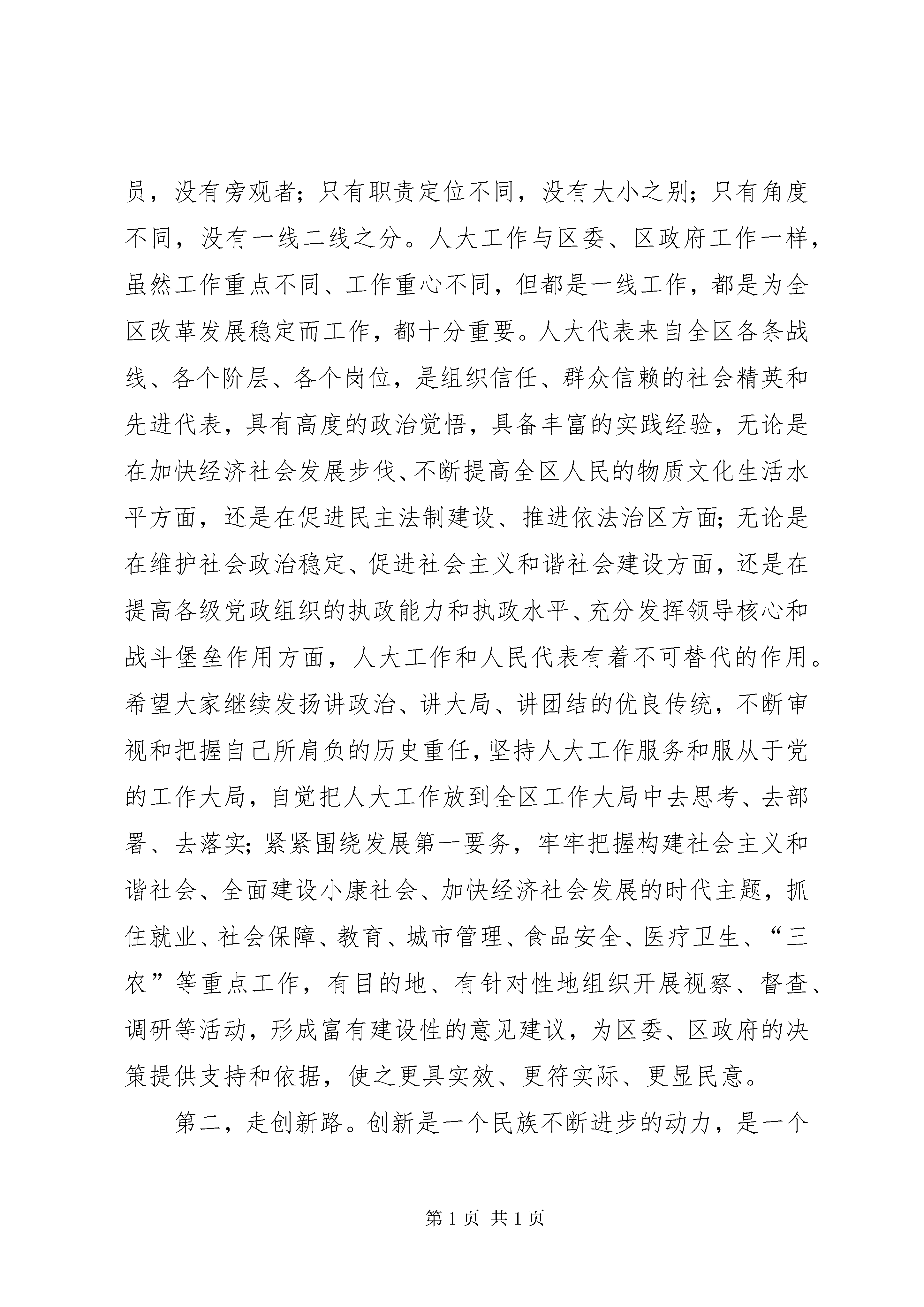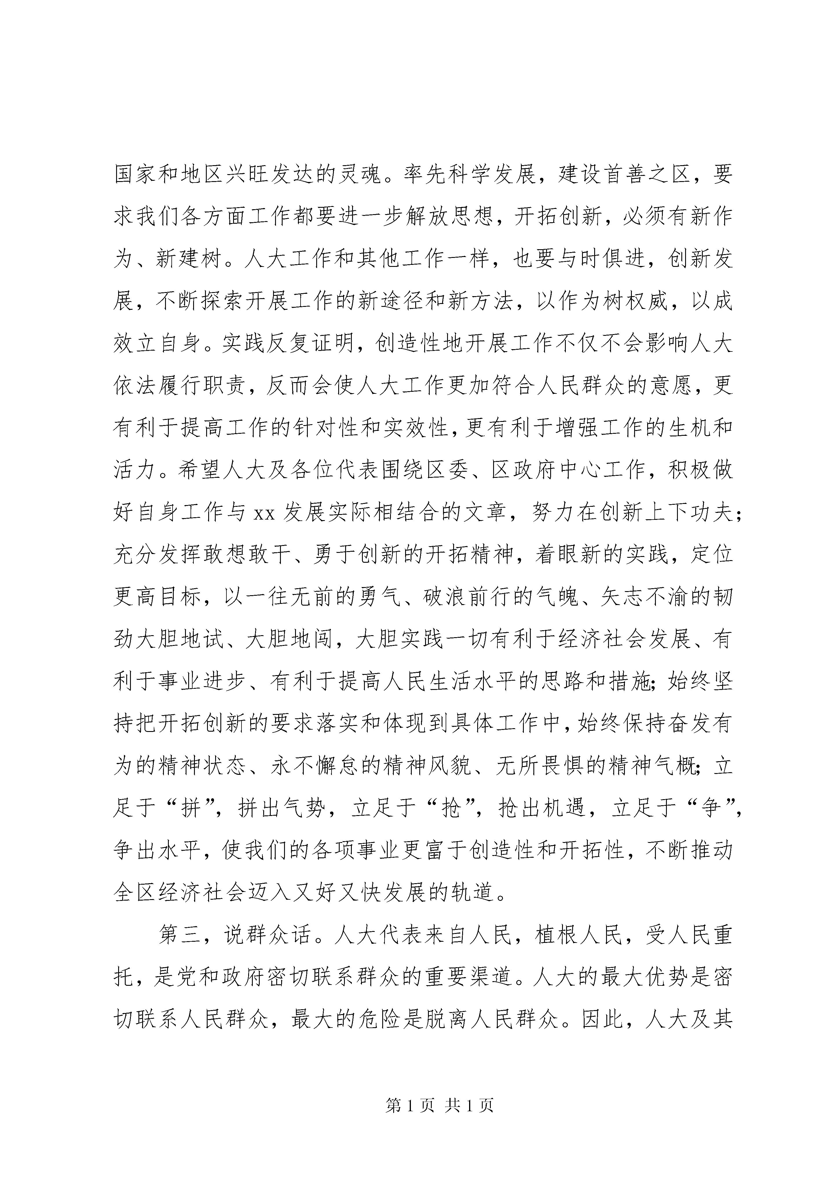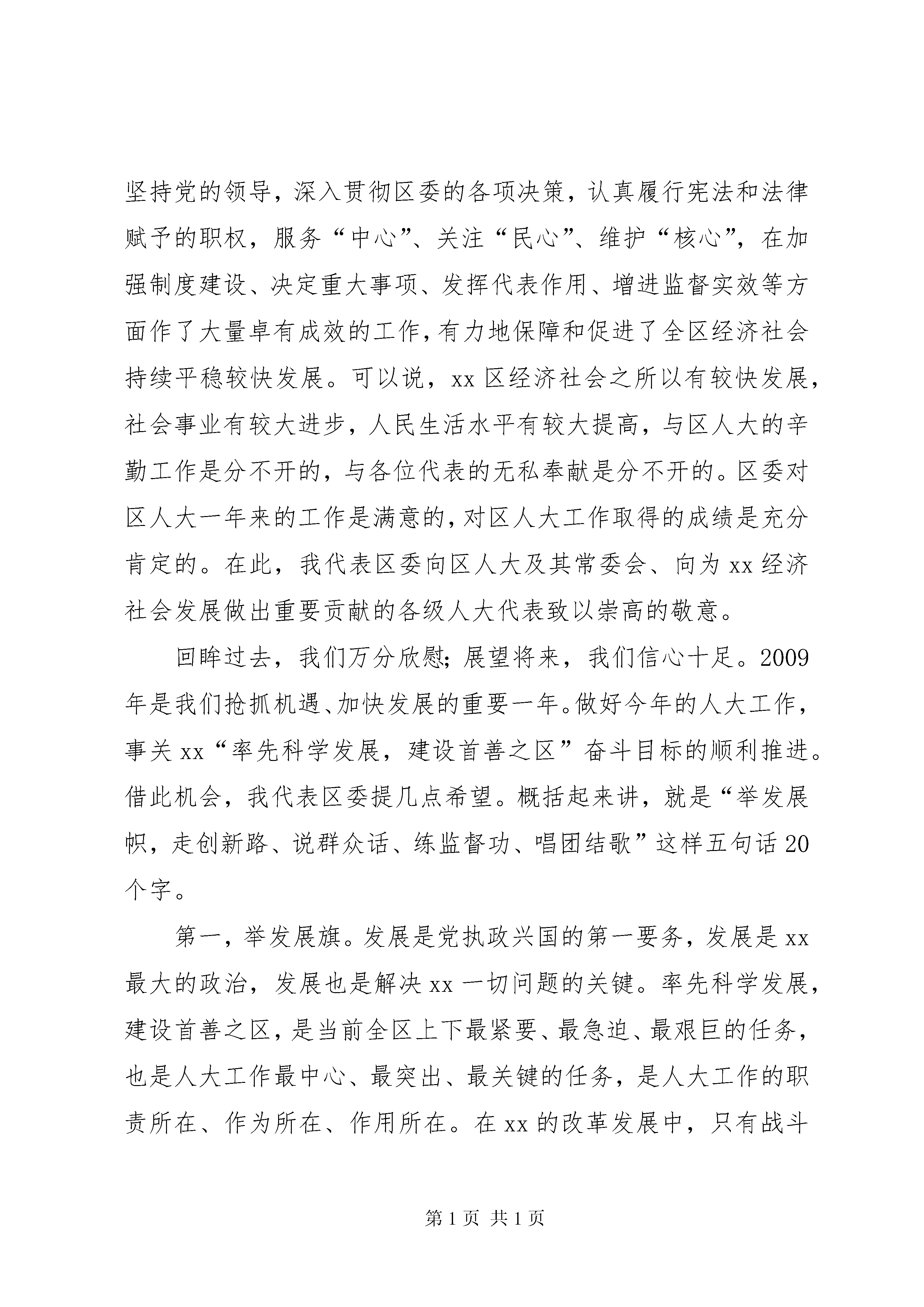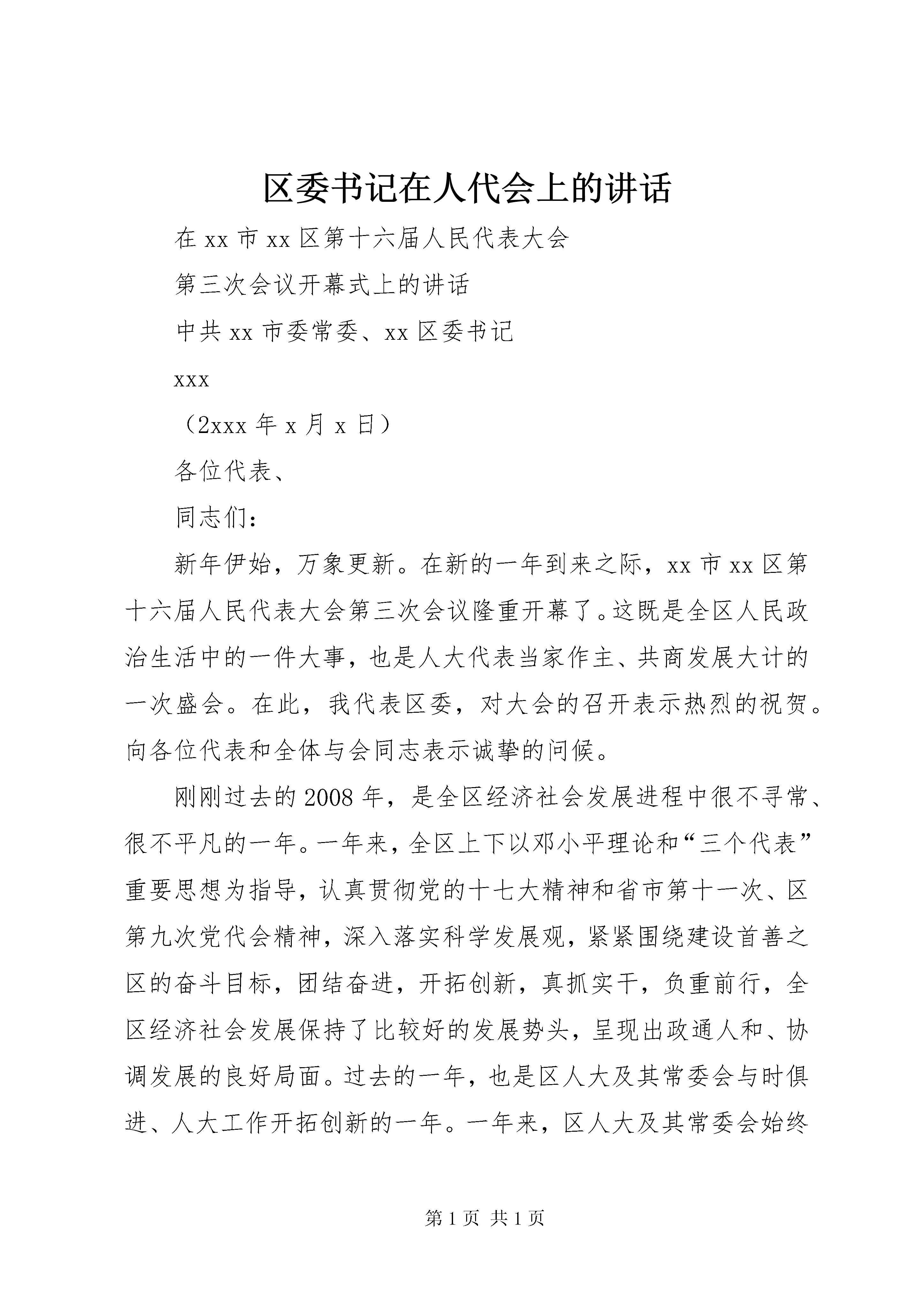 区委书记在人代会上的讲话在xx市xx区第十六届人民代表大会第三次会议开幕式上的讲话中共xx市委常委、xx区委书记xxx(2xxx年x月x日)各位代表、同志们:新年伊始,万象更新。在新的一年到来之际,xx市xx区第十六届人民代表大会第三次会议隆重开幕了。这既是全区人民政治生活中的一件大事,也是人大代表当家作主、共商发展大计的一次盛会。在此,我代表区委,对大会的召开表示热烈的祝贺。向各位代表和全体与会同志表示诚挚的问候。刚刚过去的2008年,是全区经济社会发展进程中很不寻常、很不平凡的一年。一年来,全区上下以邓小平理论和“三个代表”重要思想为指导,认真贯彻党的十七大精神和省市第十一次、区第九次党代会精神,深入落实科学发展观,紧紧围绕建设首善之区的奋斗目标,团结奋进,开拓创新,真抓实干,负重前行,全区经济社会发展保持了比较好的发展势头,呈现出政通人和、协调发展的良好局面。过去的一年,也是区人大及其常委会与时俱进、人大工作开拓创新的一年。一年来,区人大及其常委会始终坚持党的领导,深入贯彻区委的各项决策,认真履行宪法和法律赋予的职权,服务“中心”、关注“民心”、维护“核心”,在加强制度建设、决定重大事项、发挥代表作用、增进监督实效等方面作了大量卓有成效的工作,有力地保障和促进了全区经济社会持续平稳较快发展。可以说,xx区经济社会之所以有较快发展,社会事业有较大进步,人民生活水平有较大提高,与区人大的辛勤工作是分不开的,与各位代表的无私奉献是分不开的。区委对区人大一年来的工作是满意的,对区人大工作取得的成绩是充分肯定的。在此,我代表区委向区人大及其常委会、向为xx经济社会发展做出重要贡献的各级人大代表致以崇高的敬意。回眸过去,我们万分欣慰;展望将来,我们信心十足。2009年是我们抢抓机遇、加快发展的重要一年。做好今年的人大工作,事关xx“率先科学发展,建设首善之区”奋斗目标的顺利推进。借此机会,我代表区委提几点希望。概括起来讲,就是“举发展帜,走创新路、说群众话、练监督功、唱团结歌”这样五句话20个字。第一,举发展旗。发展是党执政兴国的第一要务,发展是xx最大的政治,发展也是解决xx一切问题的关键。率先科学发展,建设首善之区,是当前全区上下最紧要、最急迫、最艰巨的任务,也是人大工作最中心、最突出、最关键的任务,是人大工作的职责所在、作为所在、作用所在。在xx的改革发展中,只有战斗员,没有旁观者;只有职责定位不同,没有大小之别;只有角度不同,没有一线二线之分。人大工作与区委、区政府工作一样,虽然工作重点不同、工作重心不同,但都是一线工作,都是为全区改革发展稳定而工作,都十分重要。人大代表来自全区各条战线、各个阶层、各个岗位,是组织信任、群众信赖的社会精英和先进代表,具有高度的政治觉悟,具备丰富的实践经验,无论是在加快经济社会发展步伐、不断提高全区人民的物质文化生活水平方面,还是在促进民主法制建设、推进依法治区方面;无论是在维护社会政治稳定、促进社会主义和谐社会建设方面,还是在提高各级党政组织的执政能力和执政水平、充分发挥领导核心和战斗堡垒作用方面,人大工作和人民代表有着不可替代的作用。希望大家继续发扬讲政治、讲大局、讲团结的优良传统,不断审视和把握自己所肩负的历史重任,坚持人大工作服务和服从于党的工作大局,自觉把人大工作放到全区工作大局中去思考、去部署、去落实;紧紧围绕发展第一要务,牢牢把握构建社会主义和谐社会、全面建设小康社会、加快经济社会发展的时代主题,抓住就业、社会保障、教育、城市管理、食品安全、医疗卫生、“三农”等重点工作,有目的地、有针对性地组织开展视察、督查、调研等活动,形成富有建设性的意见建议,为区委、区政府的决策提供支持和依据,使之更具实效、更符实际、更显民意。第二,走创新路。创新是一个民族不断进步的动力,是一个国家和地区兴旺发达的灵魂。率先科学发展,建设首善之区,要求我们各方面工作都要进一步解放思想,开拓创新,必须有新作为、新建树。人大工作和其他工作一样,也要与时俱进,创新发展,不断探索开展工作的新途径和新方法,以作为树权威,以成效立自身。实践反复证明,创造性地开展工作不仅不会影响人大依法履行职责,反而会使人大工作更加符合人民群众的意愿,更有利于提高工作的针对性和实效性,更有利于增强工作的生机和活力。希望人大及各位代表围绕区委、区政府中心工作,积极做好自身工作与xx发展实际相结合的文章,努力在创新上下功夫;充分发挥敢想敢干、勇于创新的开拓精神,着眼新的实践,定位更高目标,以一往无前的勇气、破浪前行的气魄、矢志不渝的韧劲大胆地试、大胆地闯,大胆实践一切有利于经济社会发展、有利于事业进步、有利于提高人民生活水平的思路和措施;始终坚持把开拓创新的要求落实和体现到具体工作中,始终保持奋发有为的精神状态、永