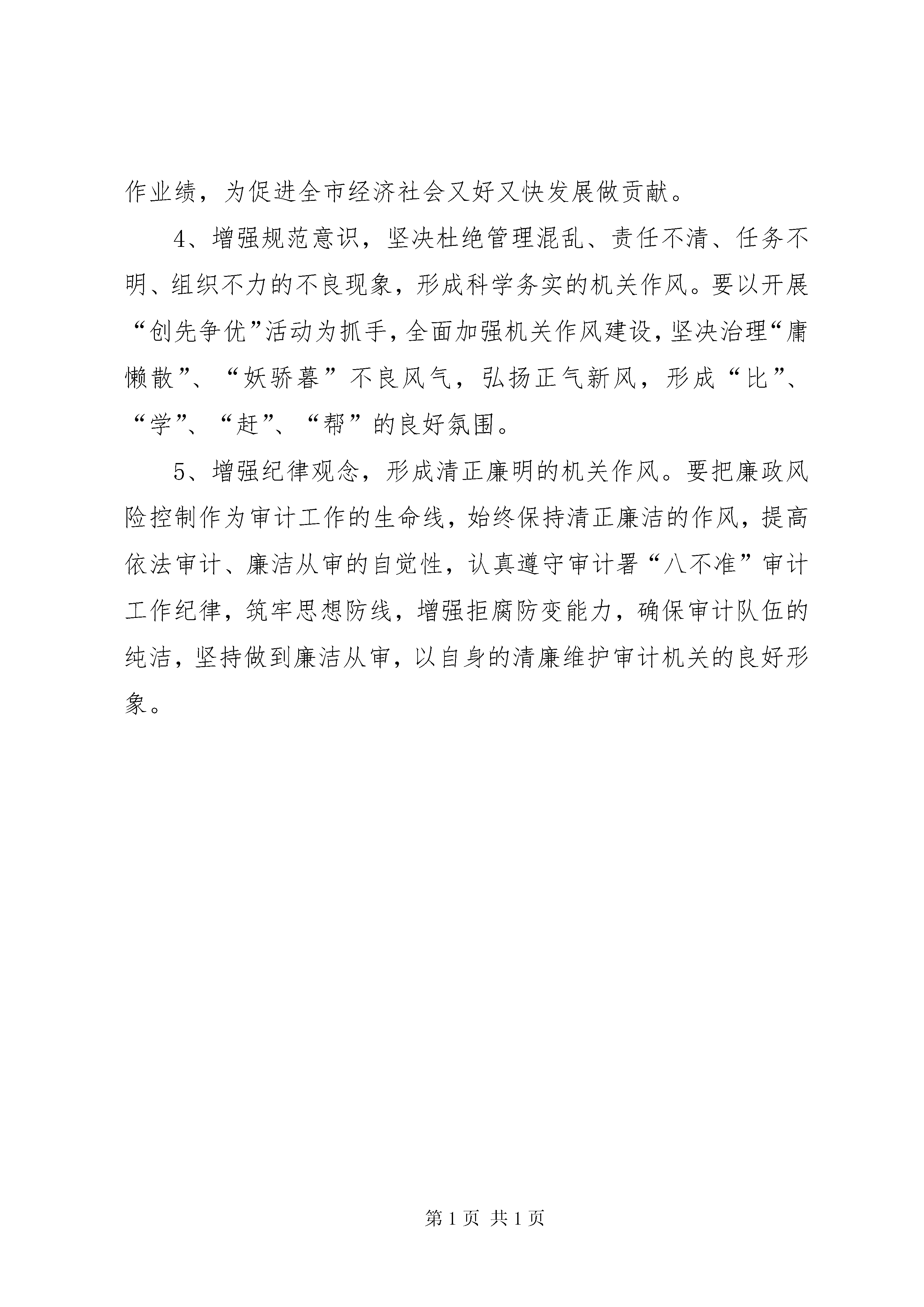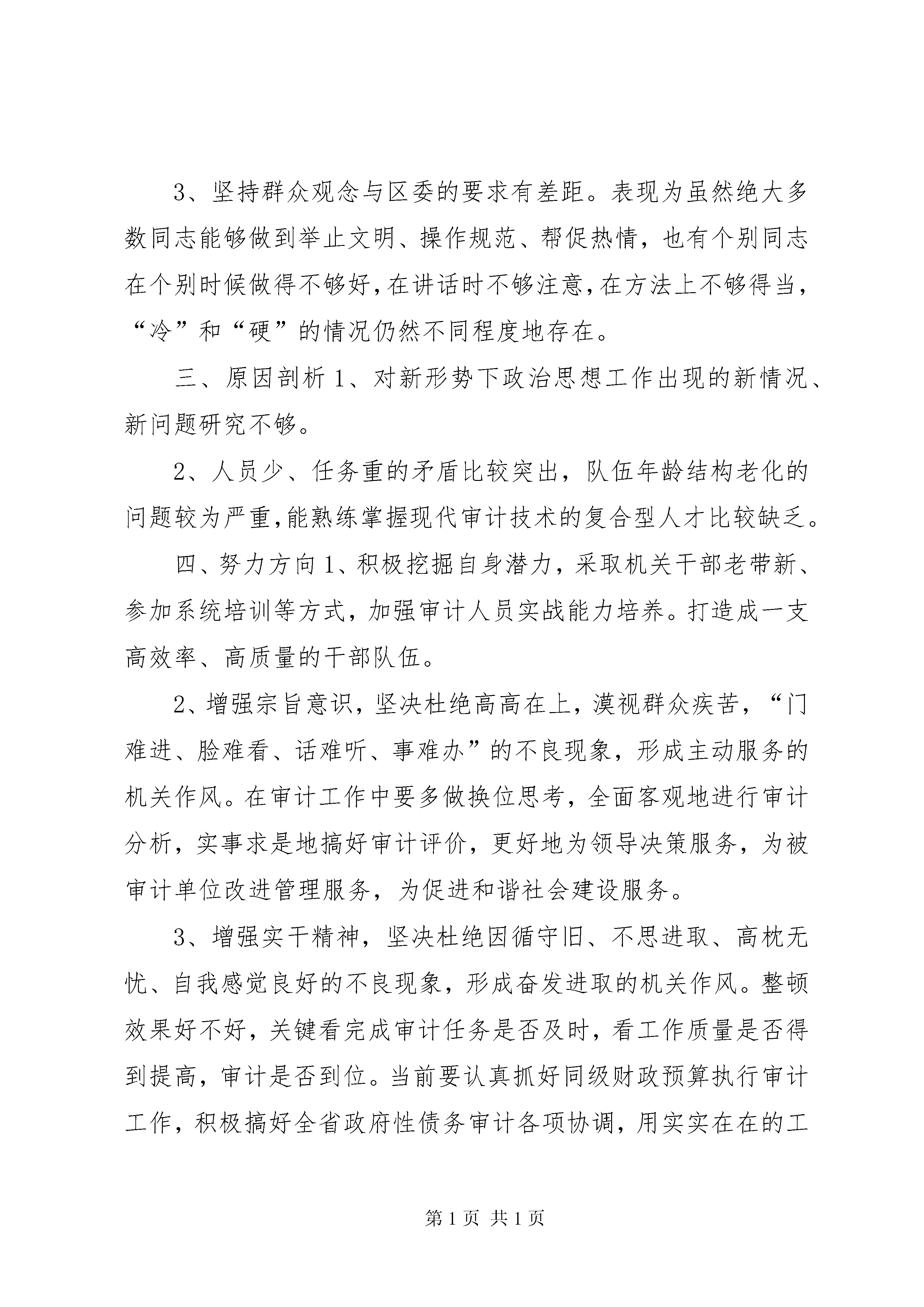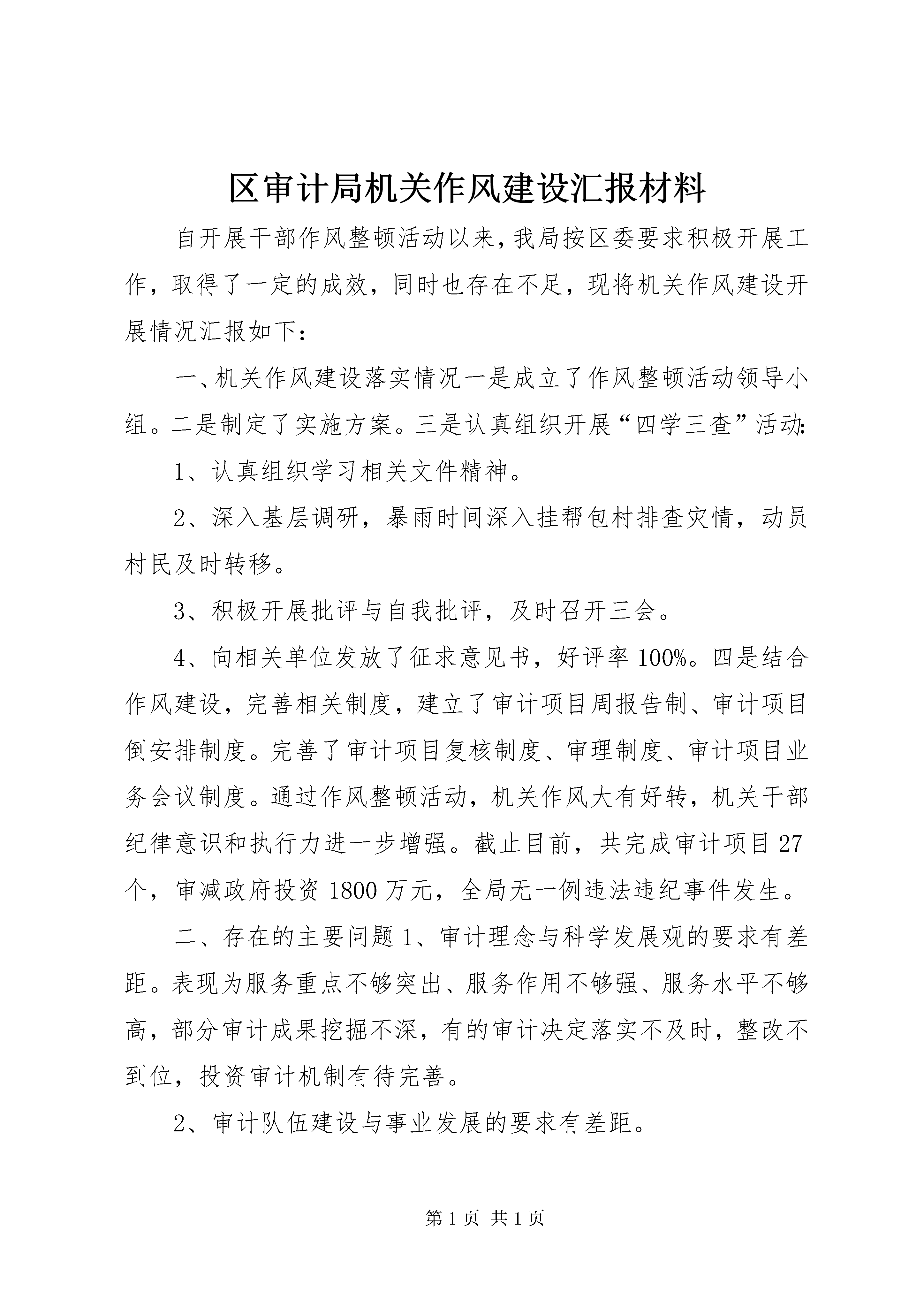 区审计局机关作风建设汇报材料自开展干部作风整顿活动以来,我局按区委要求积极开展工作,取得了一定的成效,同时也存在不足,现将机关作风建设开展情况汇报如下:一、机关作风建设落实情况一是成立了作风整顿活动领导小组。二是制定了实施方案。三是认真组织开展“四学三查”活动:1、认真组织学习相关文件精神。2、深入基层调研,暴雨时间深入挂帮包村排查灾情,动员村民及时转移。3、积极开展批评与自我批评,及时召开三会。4、向相关单位发放了征求意见书,好评率100%。四是结合作风建设,完善相关制度,建立了审计项目周报告制、审计项目倒安排制度。完善了审计项目复核制度、审理制度、审计项目业务会议制度。通过作风整顿活动,机关作风大有好转,机关干部纪律意识和执行力进一步增强。截止目前,共完成审计项目27个,审减政府投资1800万元,全局无一例违法违纪事件发生。二、存在的主要问题1、审计理念与科学发展观的要求有差距。表现为服务重点不够突出、服务作用不够强、服务水平不够高,部分审计成果挖掘不深,有的审计决定落实不及时,整改不到位,投资审计机制有待完善。2、审计队伍建设与事业发展的要求有差距。3、坚持群众观念与区委的要求有差距。表现为虽然绝大多数同志能够做到举止文明、操作规范、帮促热情,也有个别同志在个别时候做得不够好,在讲话时不够注意,在方法上不够得当,“冷”和“硬”的情况仍然不同程度地存在。三、原因剖析1、对新形势下政治思想工作出现的新情况、新问题研究不够。2、人员少、任务重的矛盾比较突出,队伍年龄结构老化的问题较为严重,能熟练掌握现代审计技术的复合型人才比较缺乏。四、努力方向1、积极挖掘自身潜力,采取机关干部老带新、参加系统培训等方式,加强审计人员实战能力培养。打造成一支高效率、高质量的干部队伍。2、增强宗旨意识,坚决杜绝高高在上,漠视群众疾苦,“门难进、脸难看、话难听、事难办”的不良现象,形成主动服务的机关作风。在审计工作中要多做换位思考,全面客观地进行审计分析,实事求是地搞好审计评价,更好地为领导决策服务,为被审计单位改进管理服务,为促进和谐社会建设服务。3、增强实干精神,坚决杜绝因循守旧、不思进取、高枕无忧、自我感觉良好的不良现象,形成奋发进取的机关作风。整顿效果好不好,关键看完成审计任务是否及时,看工作质量是否得到提高,审计是否到位。当前要认真抓好同级财政预算执行审计工作,积极搞好全省政府性债务审计各项协调,用实实在在的工作业绩,为促进全市经济社会又好又快发展做贡献。4、增强规范意识,坚决杜绝管理混乱、责任不清、任务不明、组织不力的不良现象,形成科学务实的机关作风。要以开展“创先争优”活动为抓手,全面加强机关作风建设,坚决治理“庸懒散”、“妖骄暮”不良风气,弘扬正气新风,形成“比”、“学”、“赶”、“帮”的良好氛围。5、增强纪律观念,形成清正廉明的机关作风。要把廉政风险控制作为审计工作的生命线,始终保持清正廉洁的作风,提高依法审计、廉洁从审的自觉性,认真遵守审计署“八不准”审计工作纪律,筑牢思想防线,增强拒腐防变能力,确保审计队伍的纯洁,坚持做到廉洁从审,以自身的清廉维护审计机关的良好形象。