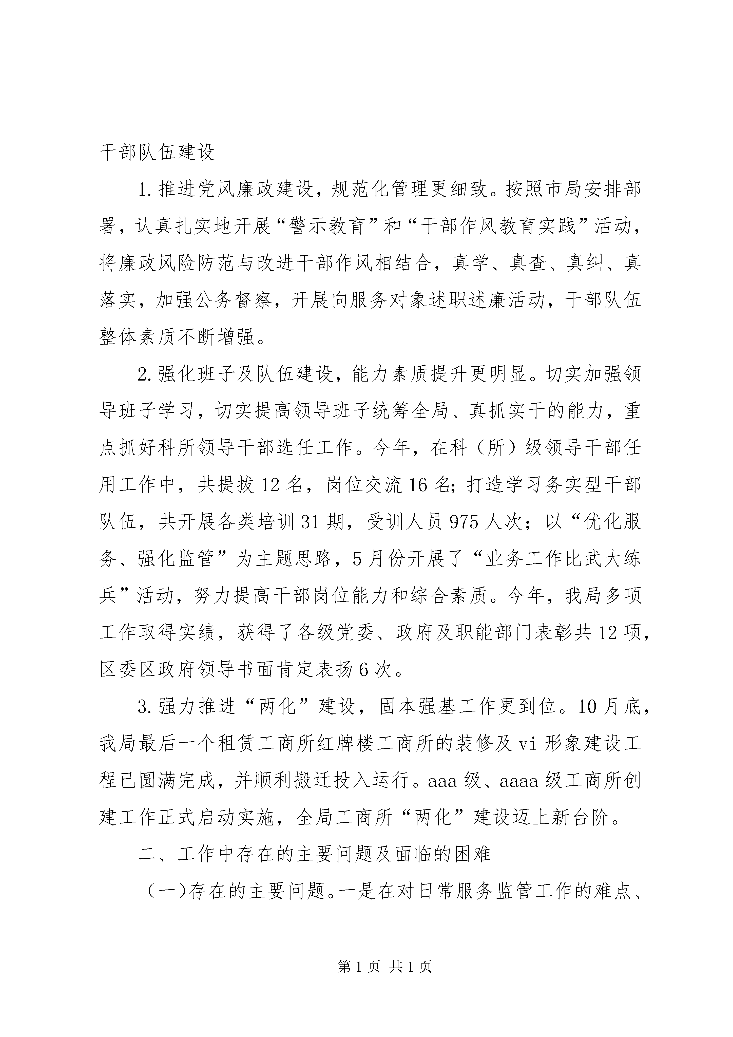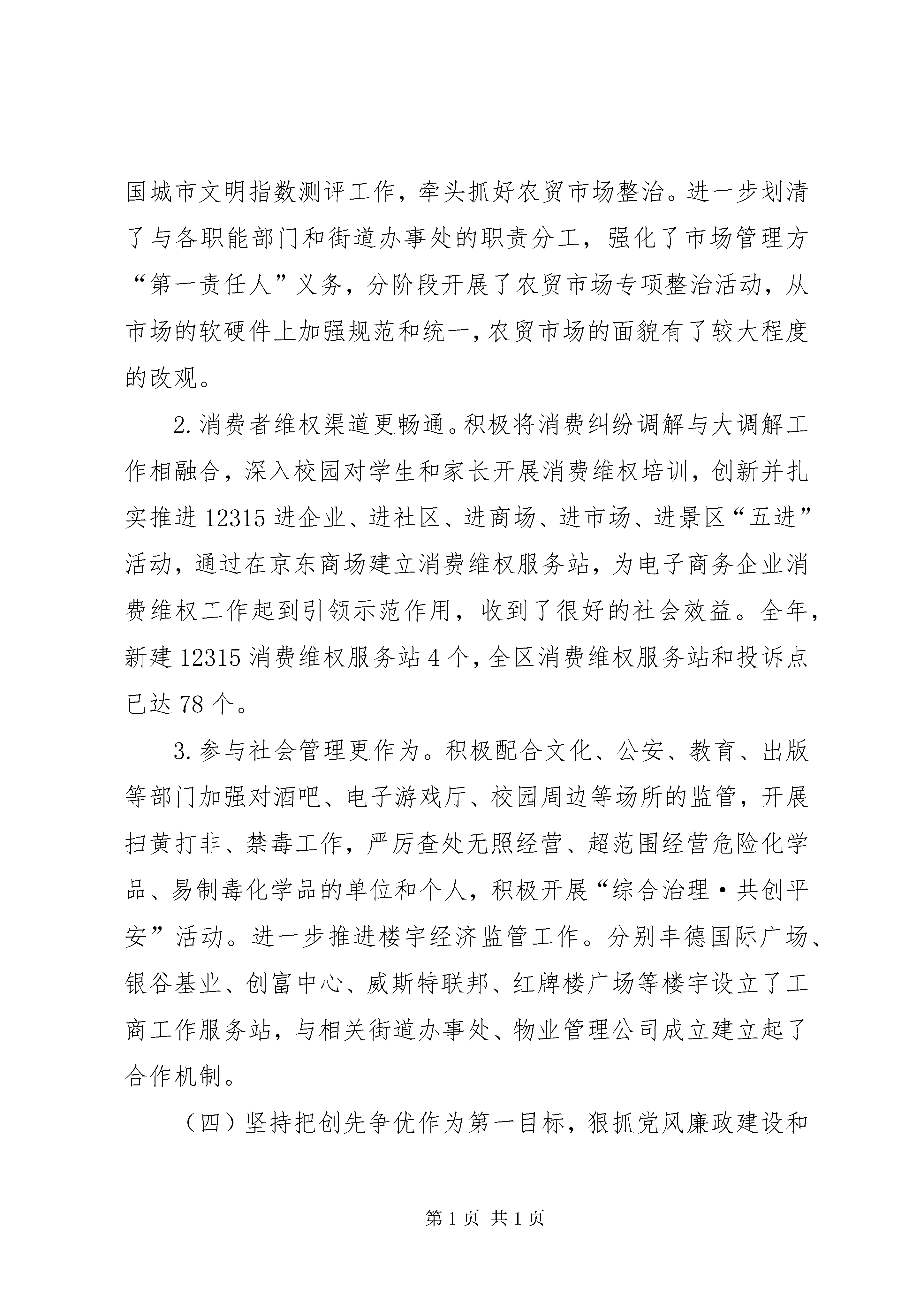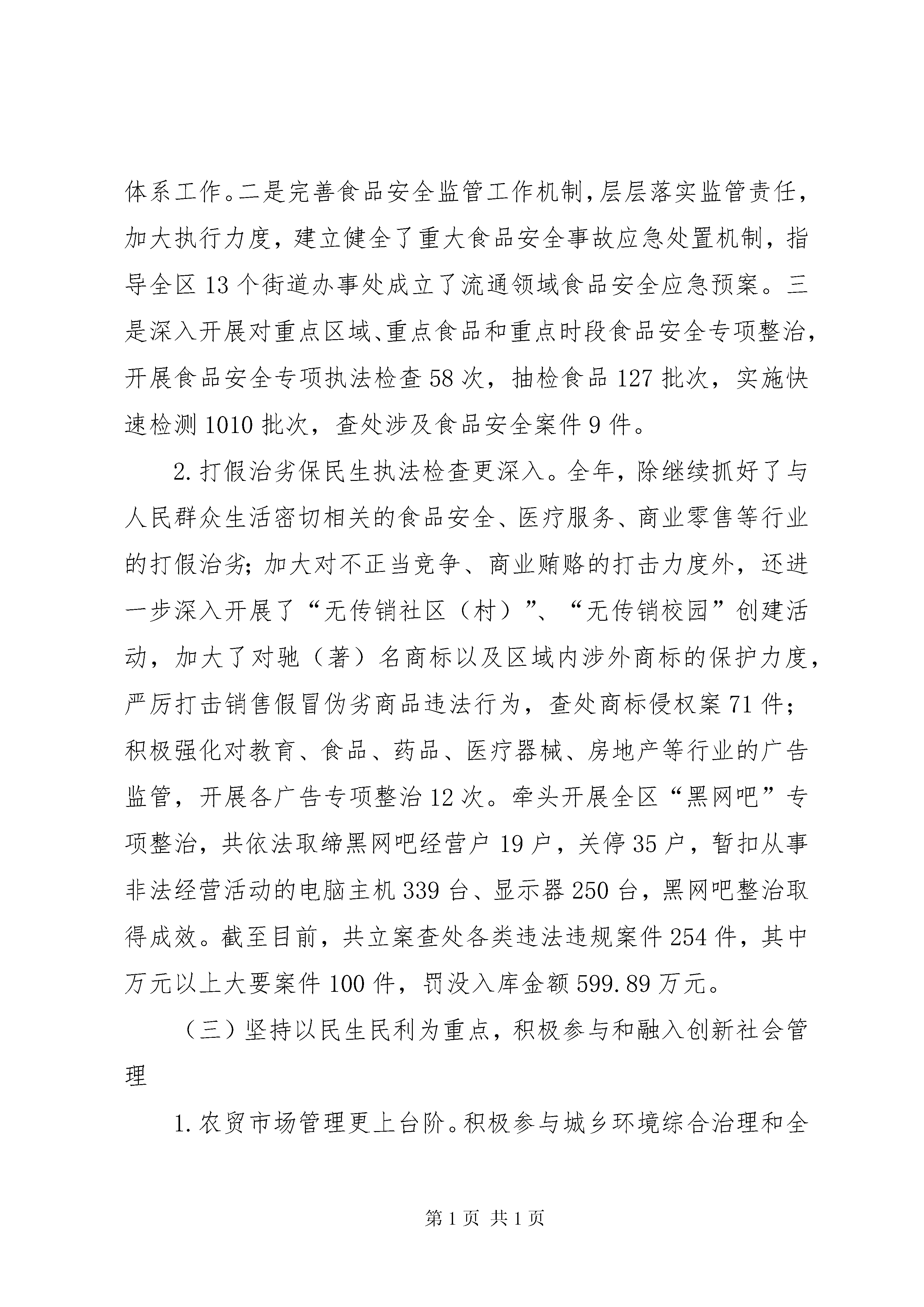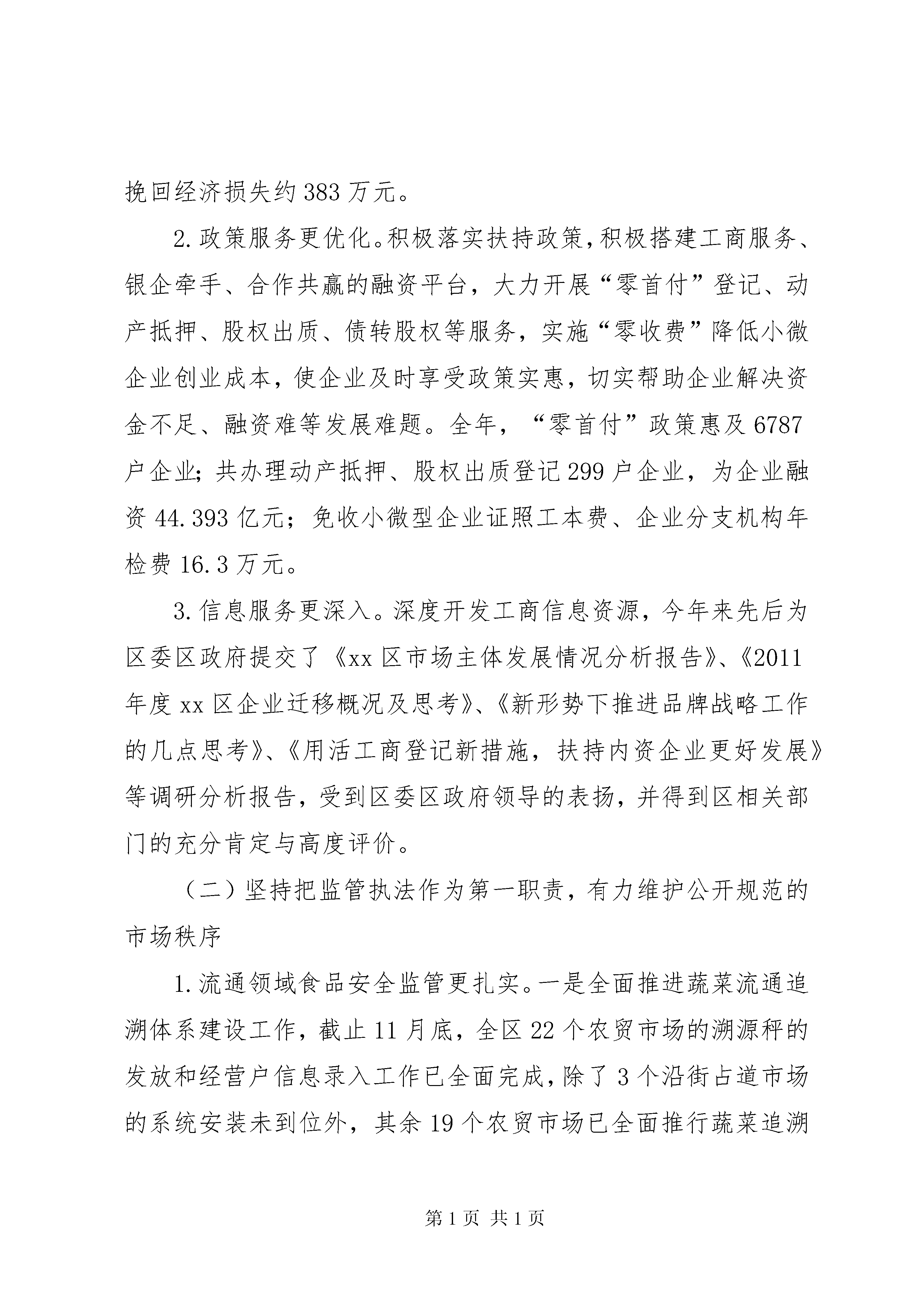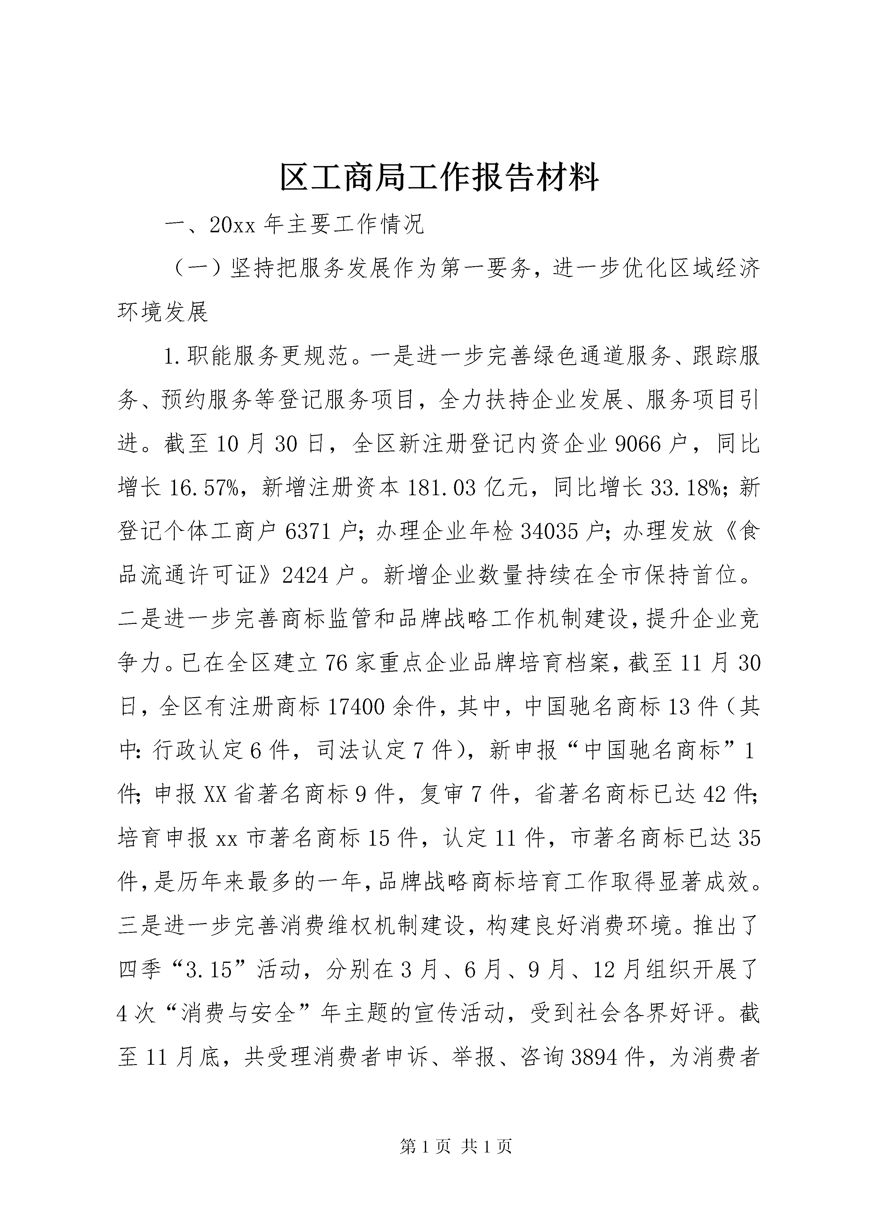 区工商局工作报告材料一、20xx年主要工作情况(一)坚持把服务发展作为第一要务,进一步优化区域经济环境发展1.职能服务更规范。一是进一步完善绿色通道服务、跟踪服务、预约服务等登记服务项目,全力扶持企业发展、服务项目引进。截至10月30日,全区新注册登记内资企业9066户,同比增长16.57%,新增注册资本181.03亿元,同比增长33.18%;新登记个体工商户6371户;办理企业年检34035户;办理发放《食品流通许可证》2424户。新增企业数量持续在全市保持首位。二是进一步完善商标监管和品牌战略工作机制建设,提升企业竞争力。已在全区建立76家重点企业品牌培育档案,截至11月30日,全区有注册商标17400余件,其中,中国驰名商标13件(其中:行政认定6件,司法认定7件),新申报“中国驰名商标”1件;申报XX省著名商标9件,复审7件,省著名商标已达42件;培育申报xx市著名商标15件,认定11件,市著名商标已达35件,是历年来最多的一年,品牌战略商标培育工作取得显著成效。三是进一步完善消费维权机制建设,构建良好消费环境。推出了四季“3.15”活动,分别在3月、6月、9月、12月组织开展了4次“消费与安全”年主题的宣传活动,受到社会各界好评。截至11月底,共受理消费者申诉、举报、咨询3894件,为消费者挽回经济损失约383万元。2.政策服务更优化。积极落实扶持政策,积极搭建工商服务、银企牵手、合作共赢的融资平台,大力开展“零首付”登记、动产抵押、股权出质、债转股权等服务,实施“零收费”降低小微企业创业成本,使企业及时享受政策实惠,切实帮助企业解决资金不足、融资难等发展难题。全年,“零首付”政策惠及6787户企业;共办理动产抵押、股权出质登记299户企业,为企业融资44.393亿元;免收小微型企业证照工本费、企业分支机构年检费16.3万元。3.信息服务更深入。深度开发工商信息资源,今年来先后为区委区政府提交了《xx区市场主体发展情况分析报告》、《2011年度xx区企业迁移概况及思考》、《新形势下推进品牌战略工作的几点思考》、《用活工商登记新措施,扶持内资企业更好发展》等调研分析报告,受到区委区政府领导的表扬,并得到区相关部门的充分肯定与高度评价。(二)坚持把监管执法作为第一职责,有力维护公开规范的市场秩序1.流通领域食品安全监管更扎实。一是全面推进蔬菜流通追溯体系建设工作,截止11月底,全区22个农贸市场的溯源秤的发放和经营户信息录入工作已全面完成,除了3个沿街占道市场的系统安装未到位外,其余19个农贸市场已全面推行蔬菜追溯体系工作。二是完善食品安全监管工作机制,层层落实监管责任,加大执行力度,建立健全了重大食品安全事故应急处置机制,指导全区13个街道办事处成立了流通领域食品安全应急预案。三是深入开展对重点区域、重点食品和重点时段食品安全专项整治,开展食品安全专项执法检查58次,抽检食品127批次,实施快速检测1010批次,查处涉及食品安全案件9件。2.打假治劣保民生执法检查更深入。全年,除继续抓好了与人民群众生活密切相关的食品安全、医疗服务、商业零售等行业的打假治劣;加大对不正当竞争、商业贿赂的打击力度外,还进一步深入开展了“无传销社区(村)”、“无传销校园”创建活动,加大了对驰(著)名商标以及区域内涉外商标的保护力度,严厉打击销售假冒伪劣商品违法行为,查处商标侵权案71件;积极强化对教育、食品、药品、医疗器械、房地产等行业的广告监管,开展各广告专项整治12次。牵头开展全区“黑网吧”专项整治,共依法取缔黑网吧经营户19户,关停35户,暂扣从事非法经营活动的电脑主机339台、显示器250台,黑网吧整治取得成效。截至目前,共立案查处各类违法违规案件254件,其中万元以上大要案件100件,罚没入库金额599.89万元。(三)坚持以民生民利为重点,积极参与和融入创新社会管理1.农贸市场管理更上台阶。积极参与城乡环境综合治理和全国城市文明指数测评工作,牵头抓好农贸市场整治。进一步划清了与各职能部门和街道办事处的职责分工,强化了市场管理方“第一责任人”义务,分阶段开展了农贸市场专项整治活动,从市场的软硬件上加强规范和统一,农贸市场的面貌有了较大程度的改观。2.消费者维权渠道更畅通。积极将消费纠纷调解与大调解工作相融合,深入校园对学生和家长开展消费维权培训,创新并扎实推进12315进企业、进社区、进商场、进市场、进景区“五进”活动,通过在京东商场建立消费维权服务站,为电子商务企业消费维权工作起到引领示范作用,收到了很好的社会效益。全年,新建12315消费维权服务站4个,全区消费维权服务站和投诉点已达78个。3.参与社会管理更作为。积极配合文化、公安、教育、出版等部门加强对酒吧、电子游戏厅、校园周边等场所的监管,开展扫