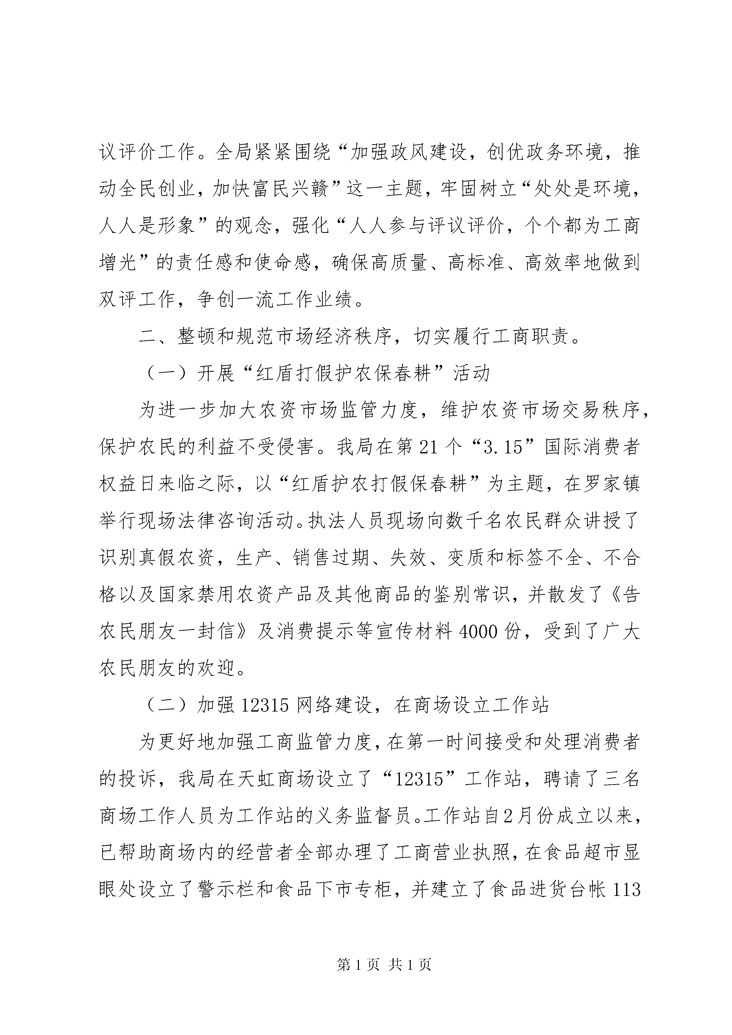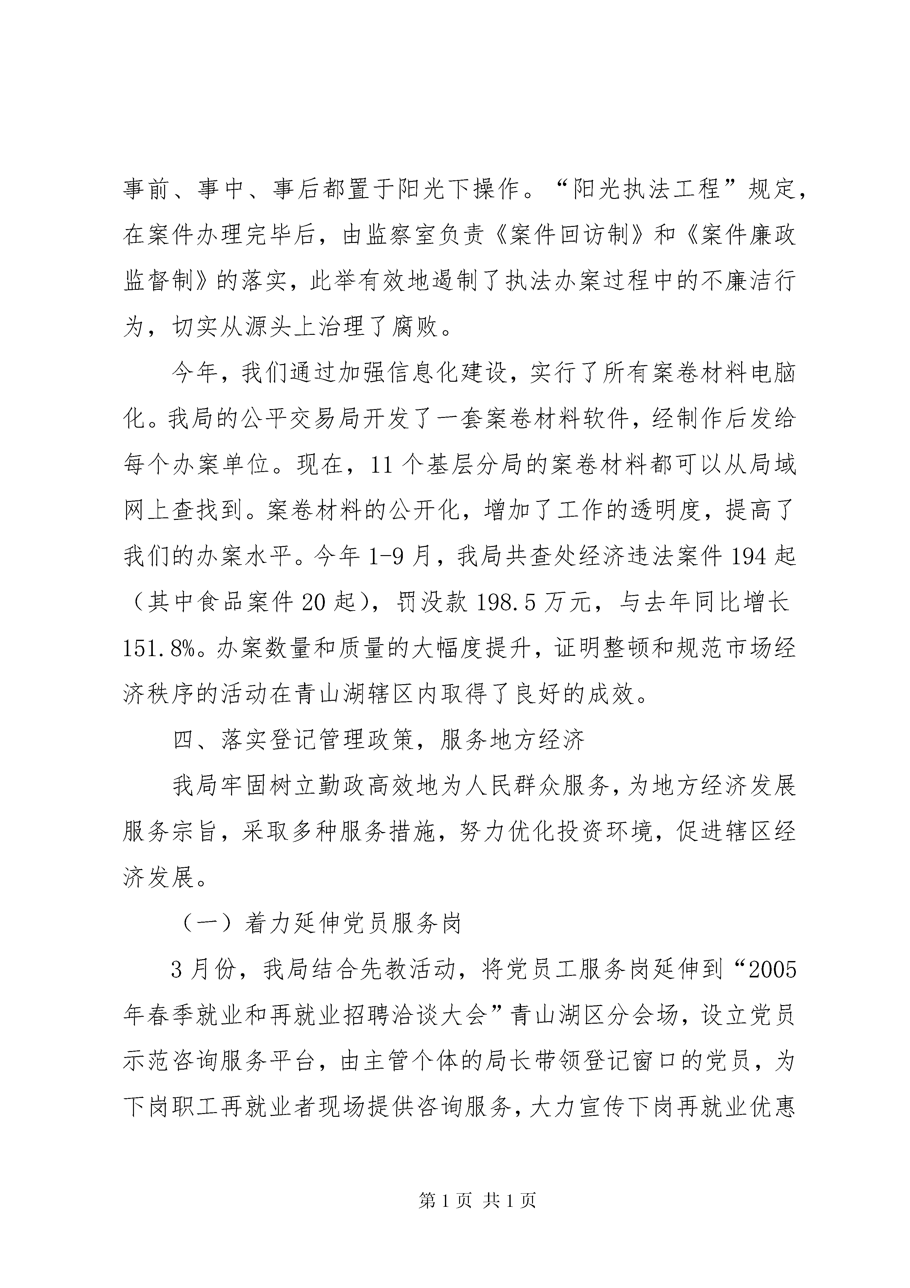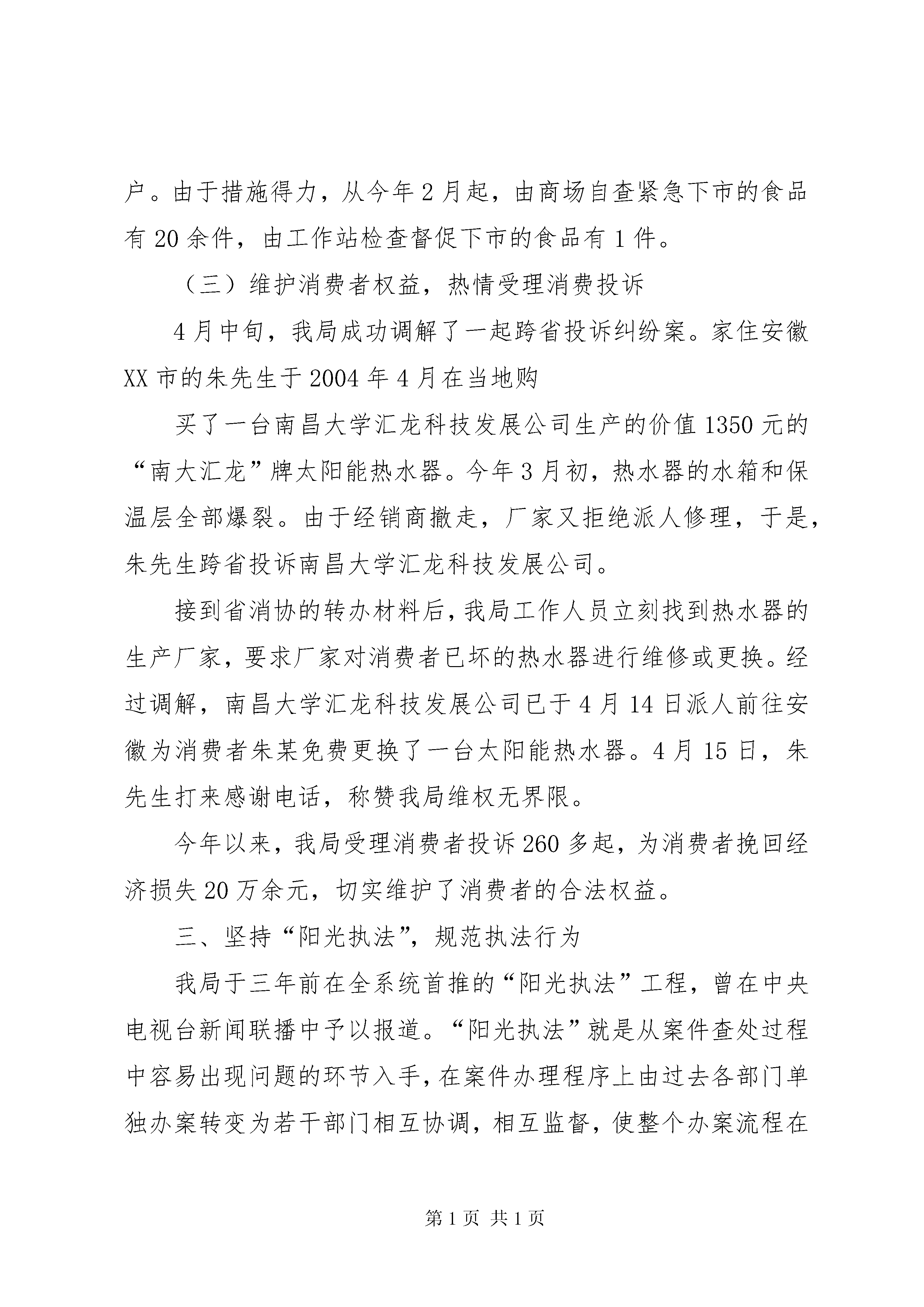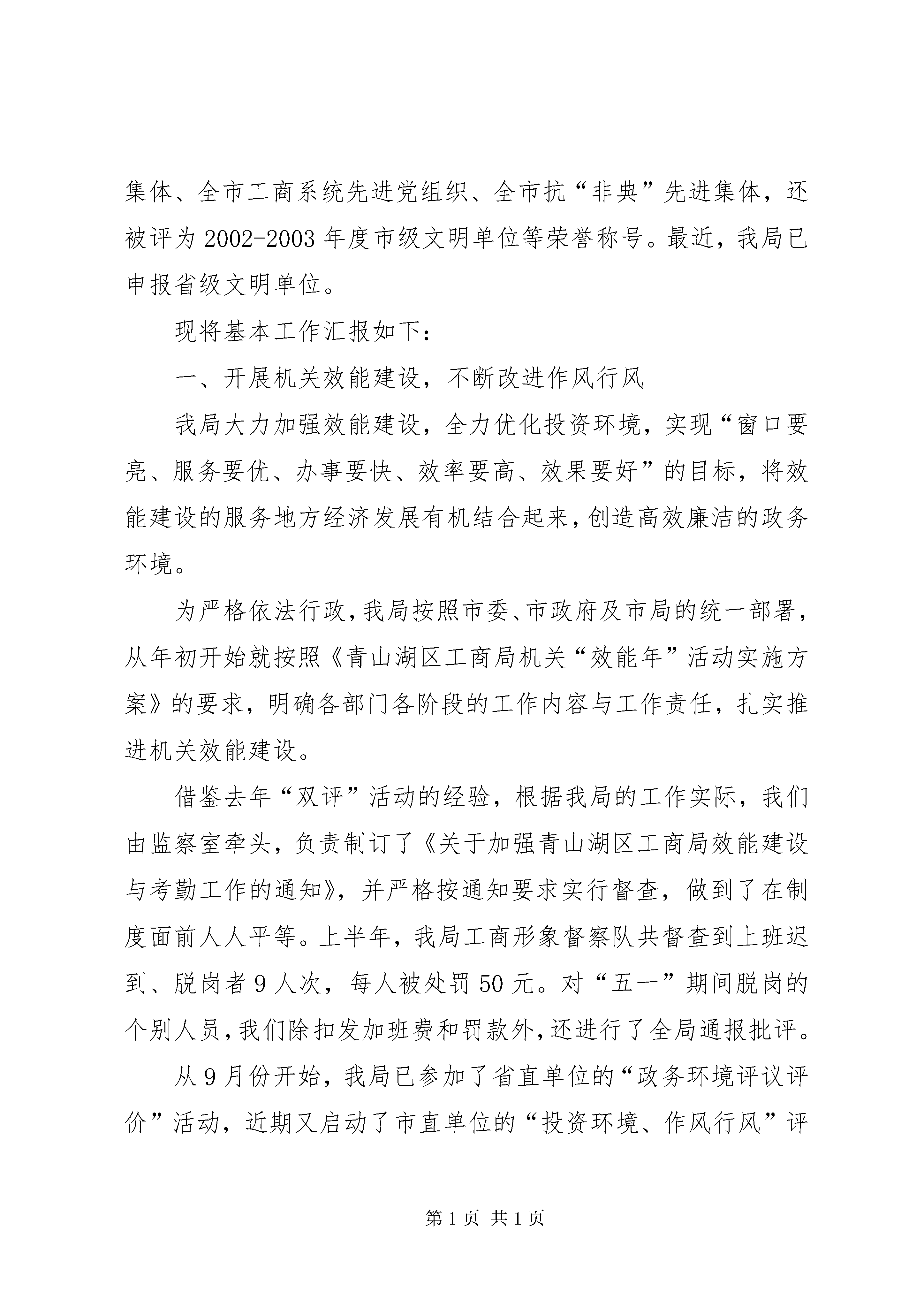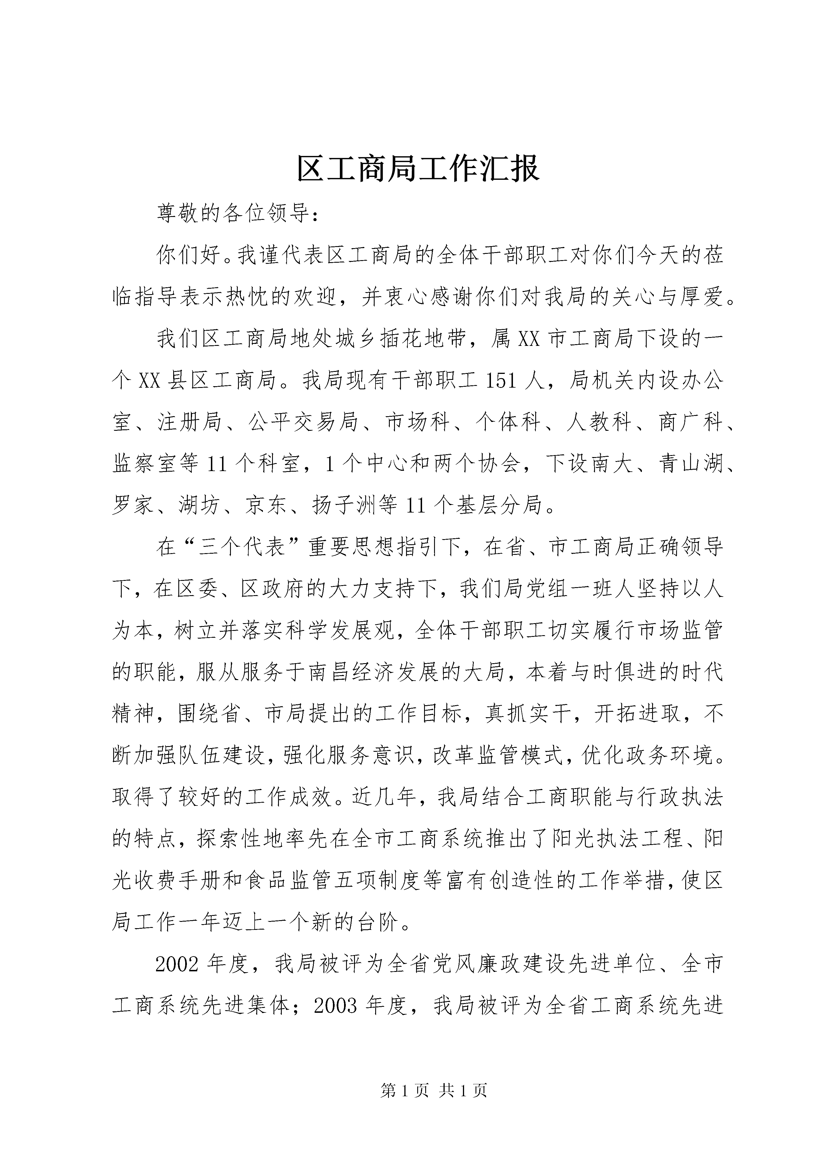 区工商局工作汇报尊敬的各位领导:你们好。我谨代表区工商局的全体干部职工对你们今天的莅临指导表示热忱的欢迎,并衷心感谢你们对我局的关心与厚爱。我们区工商局地处城乡插花地带,属XX市工商局下设的一个XX县区工商局。我局现有干部职工151人,局机关内设办公室、注册局、公平交易局、市场科、个体科、人教科、商广科、监察室等11个科室,1个中心和两个协会,下设南大、青山湖、罗家、湖坊、京东、扬子洲等11个基层分局。在“三个代表”重要思想指引下,在省、市工商局正确领导下,在区委、区政府的大力支持下,我们局党组一班人坚持以人为本,树立并落实科学发展观,全体干部职工切实履行市场监管的职能,服从服务于南昌经济发展的大局,本着与时俱进的时代精神,围绕省、市局提出的工作目标,真抓实干,开拓进取,不断加强队伍建设,强化服务意识,改革监管模式,优化政务环境。取得了较好的工作成效。近几年,我局结合工商职能与行政执法的特点,探索性地率先在全市工商系统推出了阳光执法工程、阳光收费手册和食品监管五项制度等富有创造性的工作举措,使区局工作一年迈上一个新的台阶。2002年度,我局被评为全省党风廉政建设先进单位、全市工商系统先进集体;2003年度,我局被评为全省工商系统先进集体、全市工商系统先进党组织、全市抗“非典”先进集体,还被评为2002-2003年度市级文明单位等荣誉称号。最近,我局已申报省级文明单位。现将基本工作汇报如下:一、开展机关效能建设,不断改进作风行风我局大力加强效能建设,全力优化投资环境,实现“窗口要亮、服务要优、办事要快、效率要高、效果要好”的目标,将效能建设的服务地方经济发展有机结合起来,创造高效廉洁的政务环境。为严格依法行政,我局按照市委、市政府及市局的统一部署,从年初开始就按照《青山湖区工商局机关“效能年”活动实施方案》的要求,明确各部门各阶段的工作内容与工作责任,扎实推进机关效能建设。借鉴去年“双评”活动的经验,根据我局的工作实际,我们由监察室牵头,负责制订了《关于加强青山湖区工商局效能建设与考勤工作的通知》,并严格按通知要求实行督查,做到了在制度面前人人平等。上半年,我局工商形象督察队共督查到上班迟到、脱岗者9人次,每人被处罚50元。对“五一”期间脱岗的个别人员,我们除扣发加班费和罚款外,还进行了全局通报批评。从9月份开始,我局已参加了省直单位的“政务环境评议评价”活动,近期又启动了市直单位的“投资环境、作风行风”评议评价工作。全局紧紧围绕“加强政风建设,创优政务环境,推动全民创业,加快富民兴赣”这一主题,牢固树立“处处是环境,人人是形象”的观念,强化“人人参与评议评价,个个都为工商增光”的责任感和使命感,确保高质量、高标准、高效率地做到双评工作,争创一流工作业绩。二、整顿和规范市场经济秩序,切实履行工商职责。(一)开展“红盾打假护农保春耕”活动为进一步加大农资市场监管力度,维护农资市场交易秩序,保护农民的利益不受侵害。我局在第21个“3.15”国际消费者权益日来临之际,以“红盾护农打假保春耕”为主题,在罗家镇举行现场法律咨询活动。执法人员现场向数千名农民群众讲授了识别真假农资,生产、销售过期、失效、变质和标签不全、不合格以及国家禁用农资产品及其他商品的鉴别常识,并散发了《告农民朋友一封信》及消费提示等宣传材料4000份,受到了广大农民朋友的欢迎。(二)加强12315网络建设,在商场设立工作站为更好地加强工商监管力度,在第一时间接受和处理消费者的投诉,我局在天虹商场设立了“12315”工作站,聘请了三名商场工作人员为工作站的义务监督员。工作站自2月份成立以来,已帮助商场内的经营者全部办理了工商营业执照,在食品超市显眼处设立了警示栏和食品下市专柜,并建立了食品进货台帐113户。由于措施得力,从今年2月起,由商场自查紧急下市的食品有20余件,由工作站检查督促下市的食品有1件。(三)维护消费者权益,热情受理消费投诉4月中旬,我局成功调解了一起跨省投诉纠纷案。家住安徽XX市的朱先生于2004年4月在当地购买了一台南昌大学汇龙科技发展公司生产的价值1350元的“南大汇龙”牌太阳能热水器。今年3月初,热水器的水箱和保温层全部爆裂。由于经销商撤走,厂家又拒绝派人修理,于是,朱先生跨省投诉南昌大学汇龙科技发展公司。接到省消协的转办材料后,我局工作人员立刻找到热水器的生产厂家,要求厂家对消费者已坏的热水器进行维修或更换。经过调解,南昌大学汇龙科技发展公司已于4月14日派人前往安徽为消费者朱某免费更换了一台太阳能热水器。4月15日,朱先生打来感谢电话,称赞我局维权无界限。今年以来,我局受理消费者投诉260多起,为消费者挽回经济损失20万余元,切实维护了消费者的合法权益。三、坚持“阳光执法”,规范执法行为我局于三年前在全系统首推的“阳