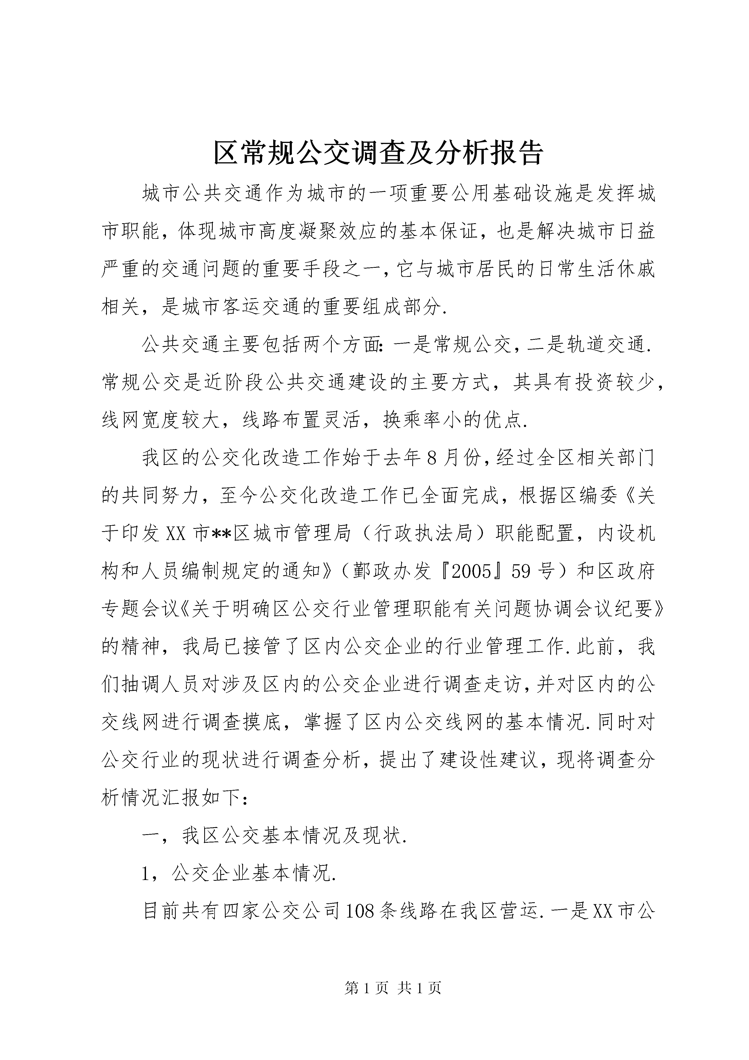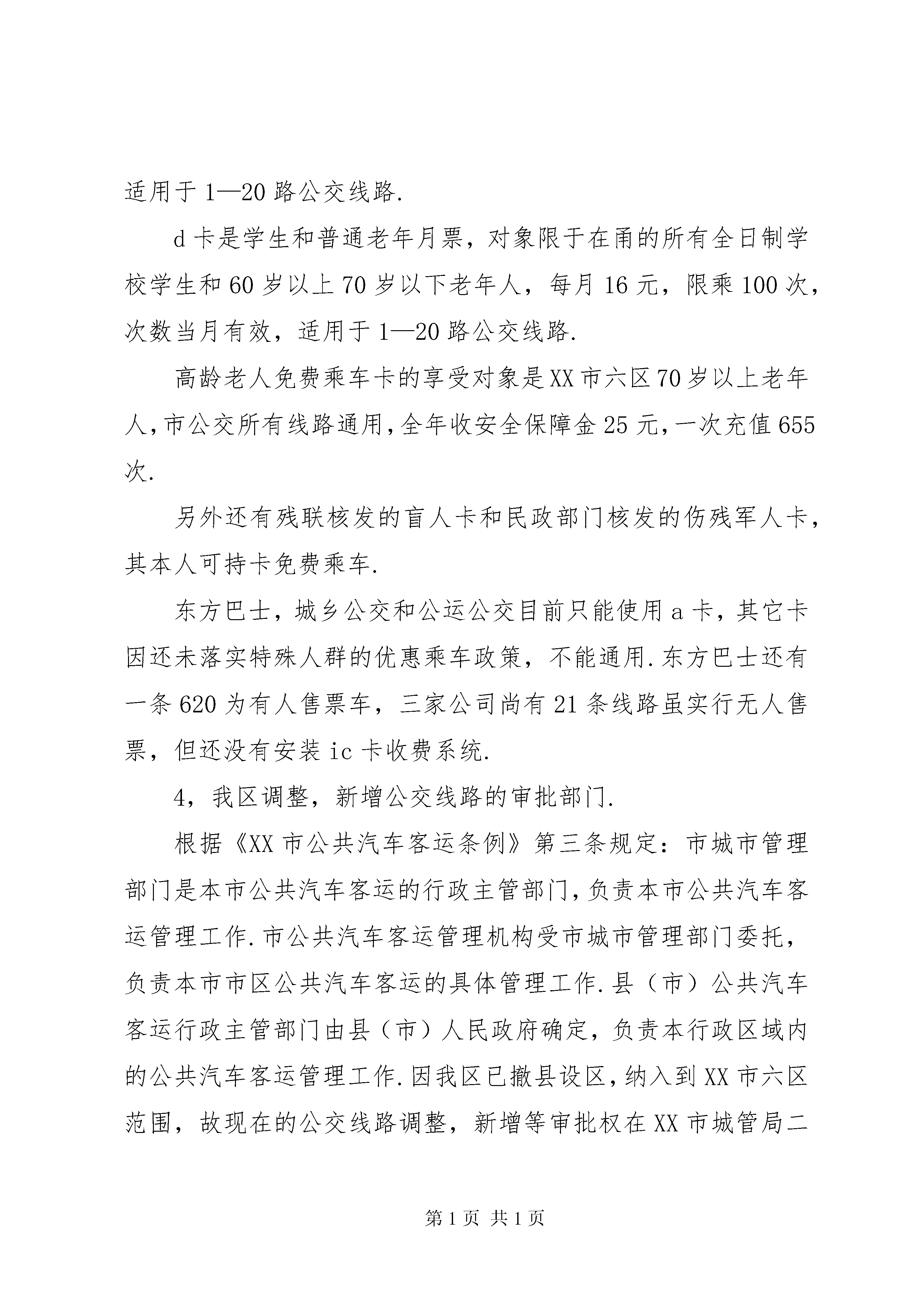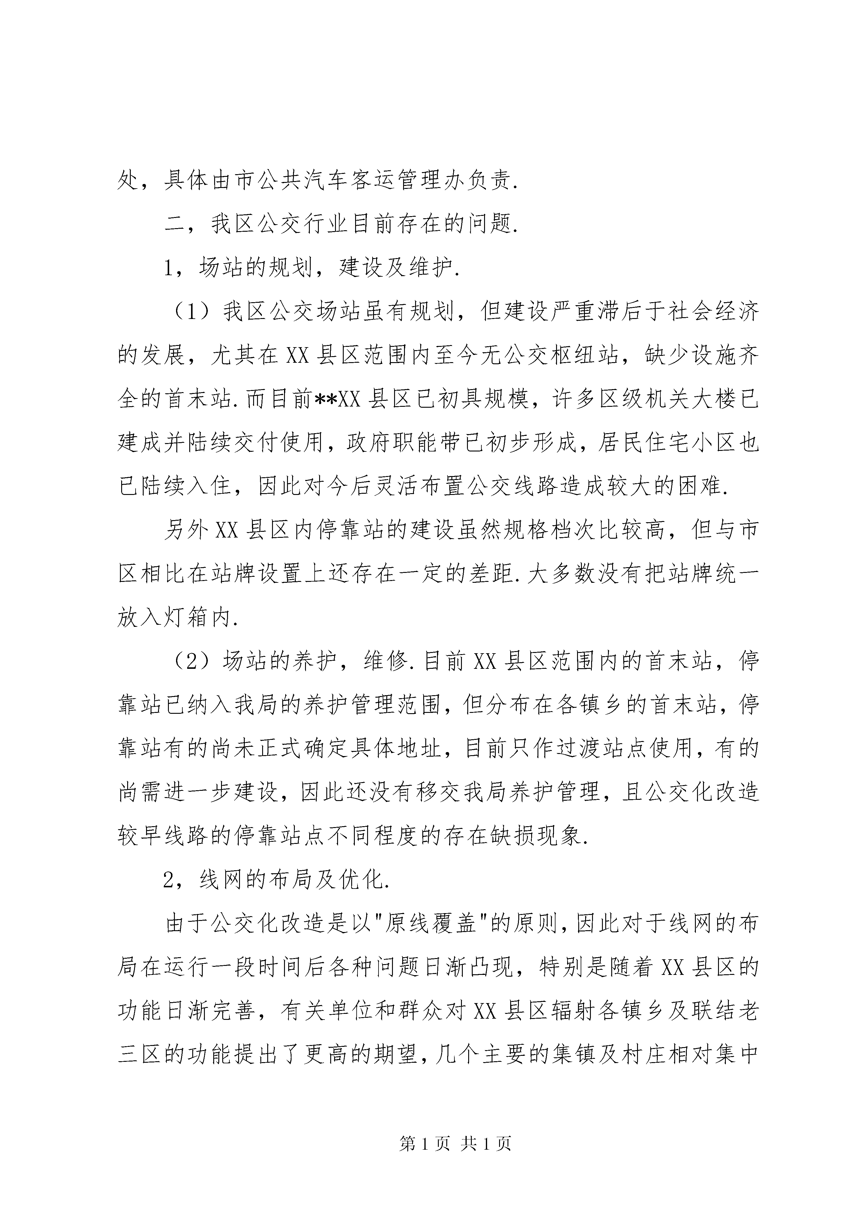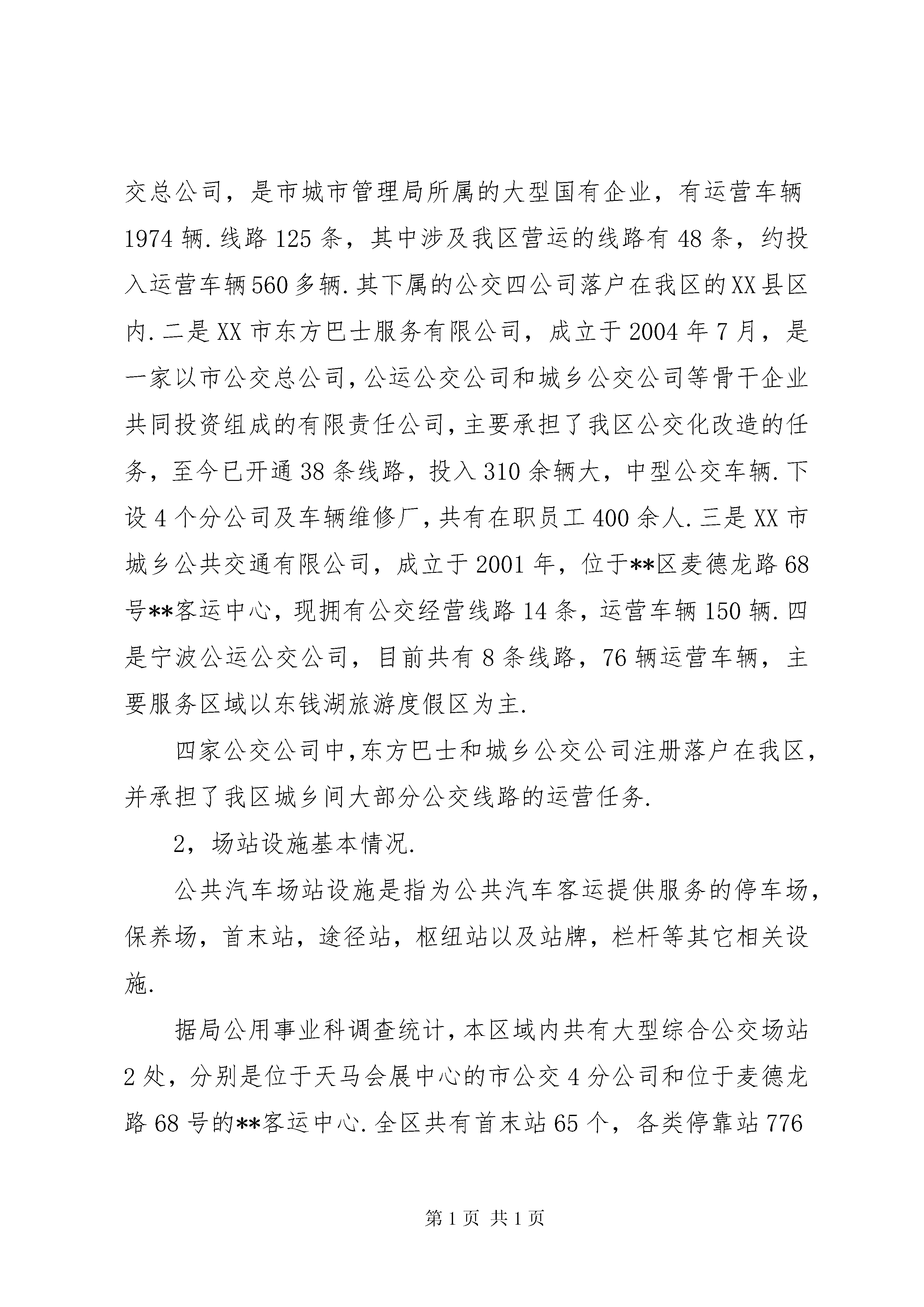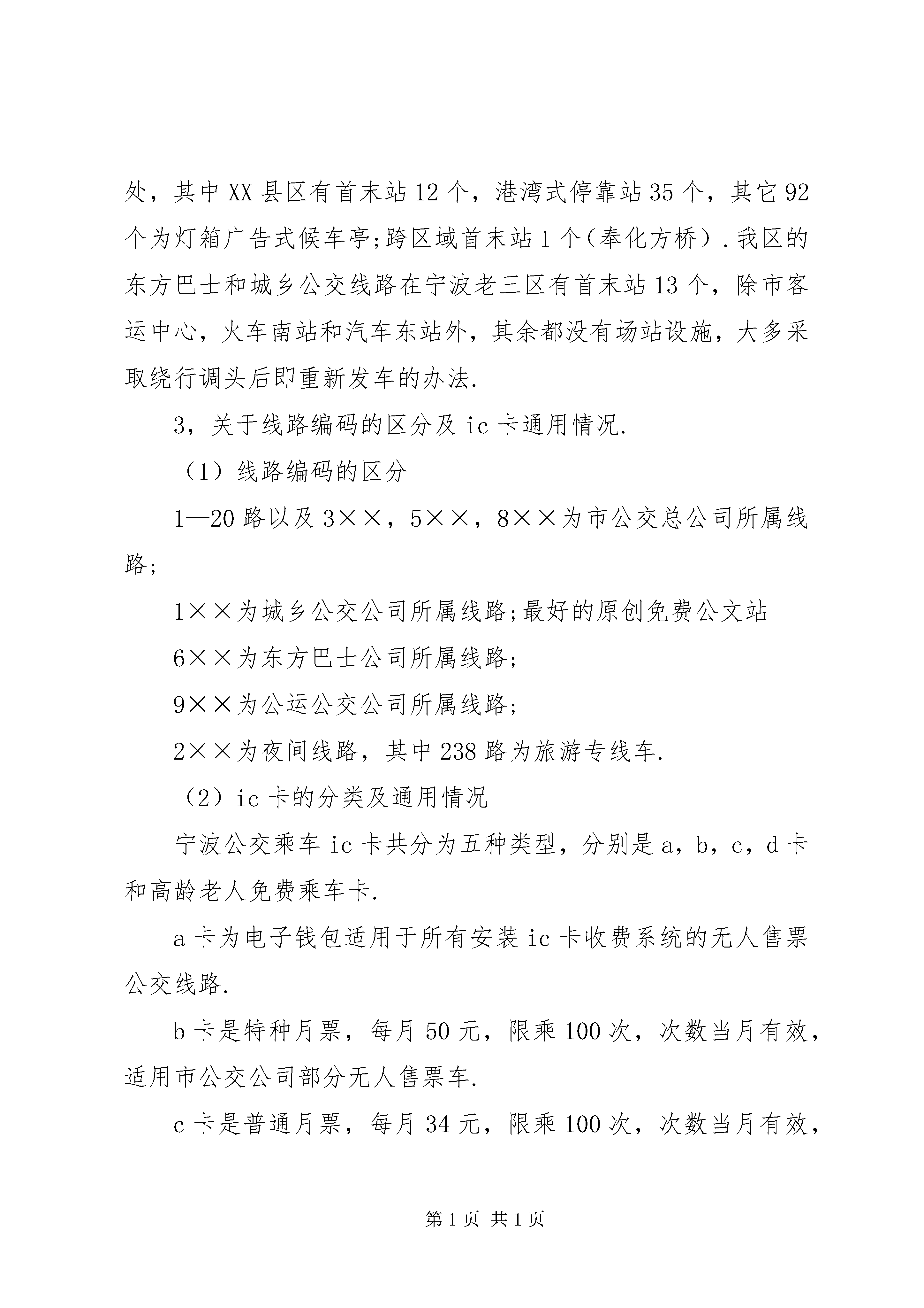 区常规公交调查及分析报告城市公共交通作为城市的一项重要公用基础设施是发挥城市职能,体现城市高度凝聚效应的基本保证,也是解决城市日益严重的交通问题的重要手段之一,它与城市居民的日常生活休戚相关,是城市客运交通的重要组成部分.公共交通主要包括两个方面:一是常规公交,二是轨道交通.常规公交是近阶段公共交通建设的主要方式,其具有投资较少,线网宽度较大,线路布置灵活,换乘率小的优点.我区的公交化改造工作始于去年8月份,经过全区相关部门的共同努力,至今公交化改造工作已全面完成,根据区编委《关于印发XX市**区城市管理局(行政执法局)职能配置,内设机构和人员编制规定的通知》(鄞政办发『2005』59号)和区政府专题会议《关于明确区公交行业管理职能有关问题协调会议纪要》的精神,我局已接管了区内公交企业的行业管理工作.此前,我们抽调人员对涉及区内的公交企业进行调查走访,并对区内的公交线网进行调查摸底,掌握了区内公交线网的基本情况.同时对公交行业的现状进行调查分析,提出了建设性建议,现将调查分析情况汇报如下:一,我区公交基本情况及现状.1,公交企业基本情况.目前共有四家公交公司108条线路在我区营运.一是XX市公交总公司,是市城市管理局所属的大型国有企业,有运营车辆1974辆.线路125条,其中涉及我区营运的线路有48条,约投入运营车辆560多辆.其下属的公交四公司落户在我区的XX县区内.二是XX市东方巴士服务有限公司,成立于2004年7月,是一家以市公交总公司,公运公交公司和城乡公交公司等骨干企业共同投资组成的有限责任公司,主要承担了我区公交化改造的任务,至今已开通38条线路,投入310余辆大,中型公交车辆.下设4个分公司及车辆维修厂,共有在职员工400余人.三是XX市城乡公共交通有限公司,成立于2001年,位于**区麦德龙路68号**客运中心,现拥有公交经营线路14条,运营车辆150辆.四是宁波公运公交公司,目前共有8条线路,76辆运营车辆,主要服务区域以东钱湖旅游度假区为主.四家公交公司中,东方巴士和城乡公交公司注册落户在我区,并承担了我区城乡间大部分公交线路的运营任务.2,场站设施基本情况.公共汽车场站设施是指为公共汽车客运提供服务的停车场,保养场,首末站,途径站,枢纽站以及站牌,栏杆等其它相关设施.据局公用事业科调查统计,本区域内共有大型综合公交场站2处,分别是位于天马会展中心的市公交4分公司和位于麦德龙路68号的**客运中心.全区共有首末站65个,各类停靠站776处,其中XX县区有首末站12个,港湾式停靠站35个,其它92个为灯箱广告式候车亭;跨区域首末站1个(奉化方桥).我区的东方巴士和城乡公交线路在宁波老三区有首末站13个,除市客运中心,火车南站和汽车东站外,其余都没有场站设施,大多采取绕行调头后即重新发车的办法.3,关于线路编码的区分及ic卡通用情况.(1)线路编码的区分1—20路以及3××,5××,8××为市公交总公司所属线路;1××为城乡公交公司所属线路;最好的原创免费公文站6××为东方巴士公司所属线路;9××为公运公交公司所属线路;2××为夜间线路,其中238路为旅游专线车.(2)ic卡的分类及通用情况宁波公交乘车ic卡共分为五种类型,分别是a,b,c,d卡和高龄老人免费乘车卡.a卡为电子钱包适用于所有安装ic卡收费系统的无人售票公交线路.b卡是特种月票,每月50元,限乘100次,次数当月有效,适用市公交公司部分无人售票车.c卡是普通月票,每月34元,限乘100次,次数当月有效,适用于1—20路公交线路.d卡是学生和普通老年月票,对象限于在甬的所有全日制学校学生和60岁以上70岁以下老年人,每月16元,限乘100次,次数当月有效,适用于1—20路公交线路.高龄老人免费乘车卡的享受对象是XX市六区70岁以上老年人,市公交所有线路通用,全年收安全保障金25元,一次充值655次.另外还有残联核发的盲人卡和民政部门核发的伤残军人卡,其本人可持卡免费乘车.东方巴士,城乡公交和公运公交目前只能使用a卡,其它卡因还未落实特殊人群的优惠乘车政策,不能通用.东方巴士还有一条620为有人售票车,三家公司尚有21条线路虽实行无人售票,但还没有安装ic卡收费系统.4,我区调整,新增公交线路的审批部门.根据《XX市公共汽车客运条例》第三条规定:市城市管理部门是本市公共汽车客运的行政主管部门,负责本市公共汽车客运管理工作.市公共汽车客运管理机构受市城市管理部门委托,负责本市市区公共汽车客运的具体管理工作.县(市)公共汽车客运行政主管部门由县(市)人民政府确定,负责本行政区域内的公共汽车客运管理工作.因我区已撤县设区,纳入到XX市六区范围,故现在的公交线路调整,新增等审批权在XX市城管局二处,具体由市公共汽车客运管理办负责.二