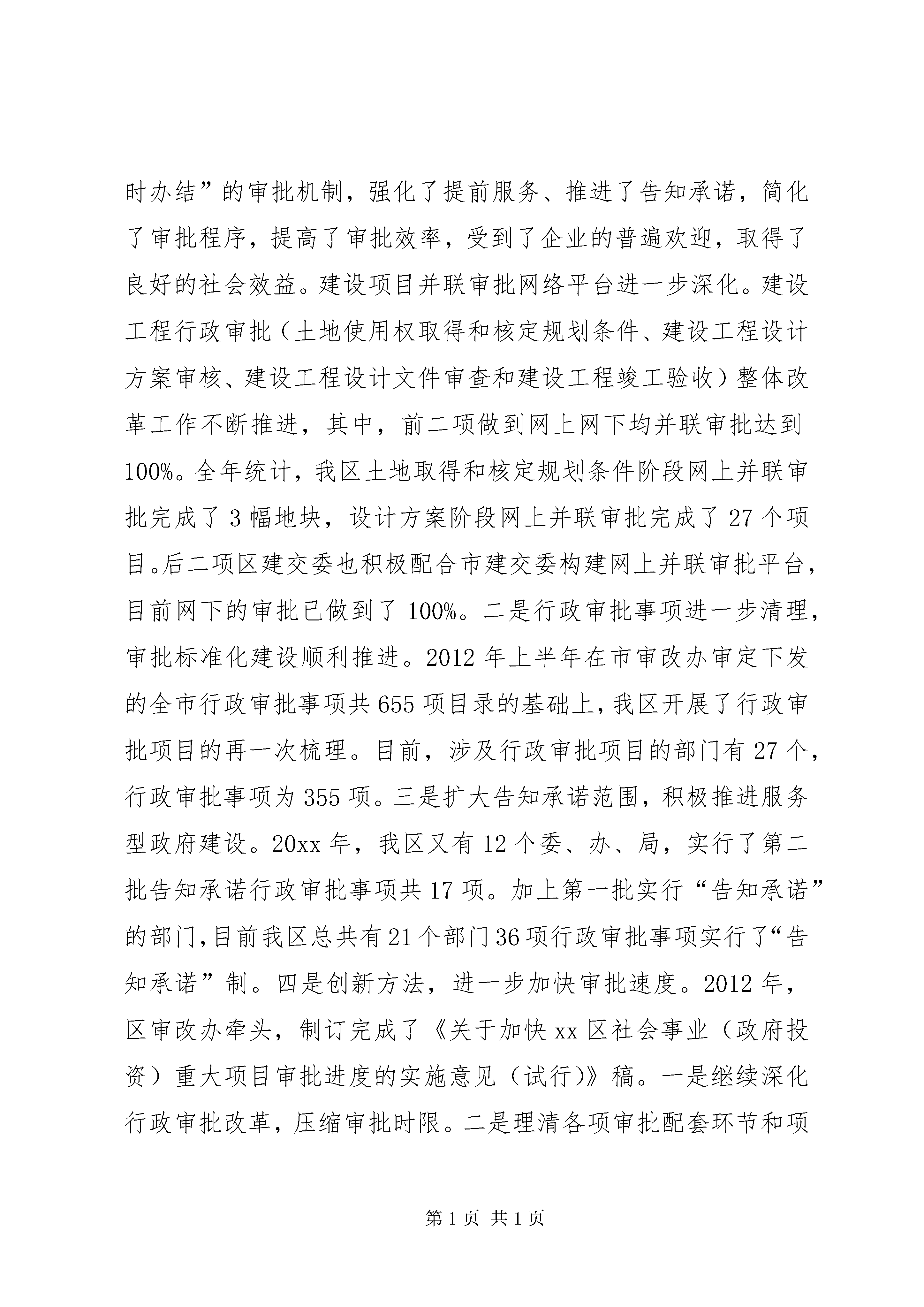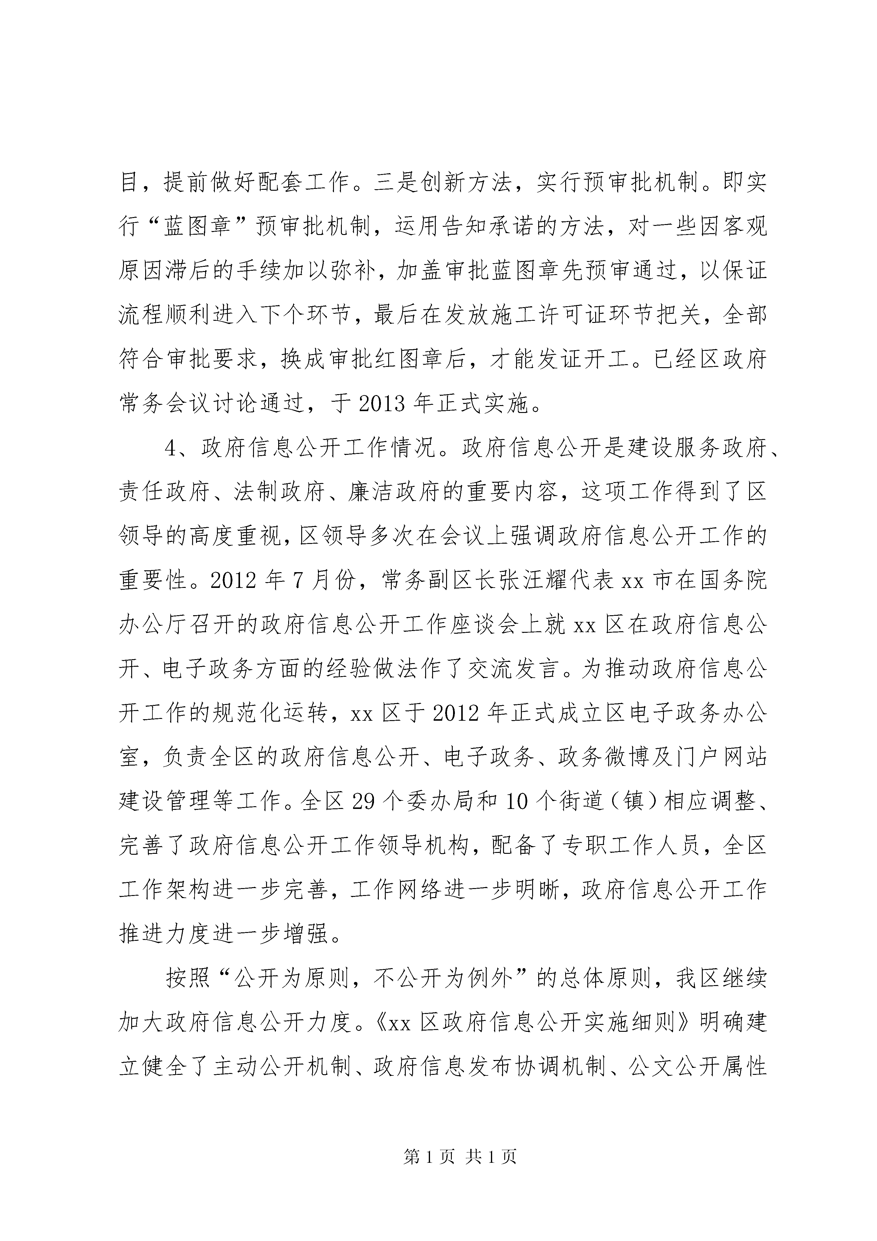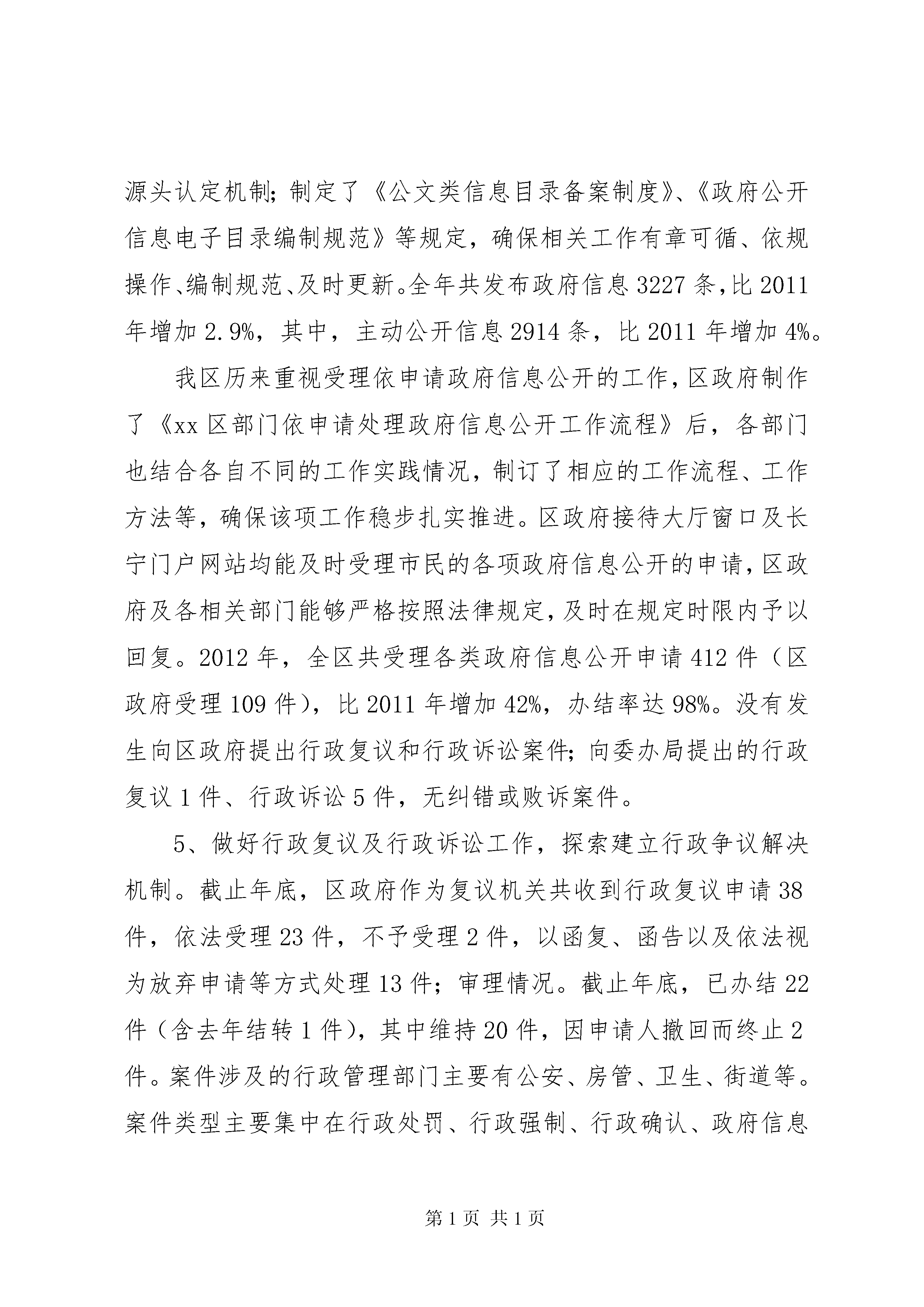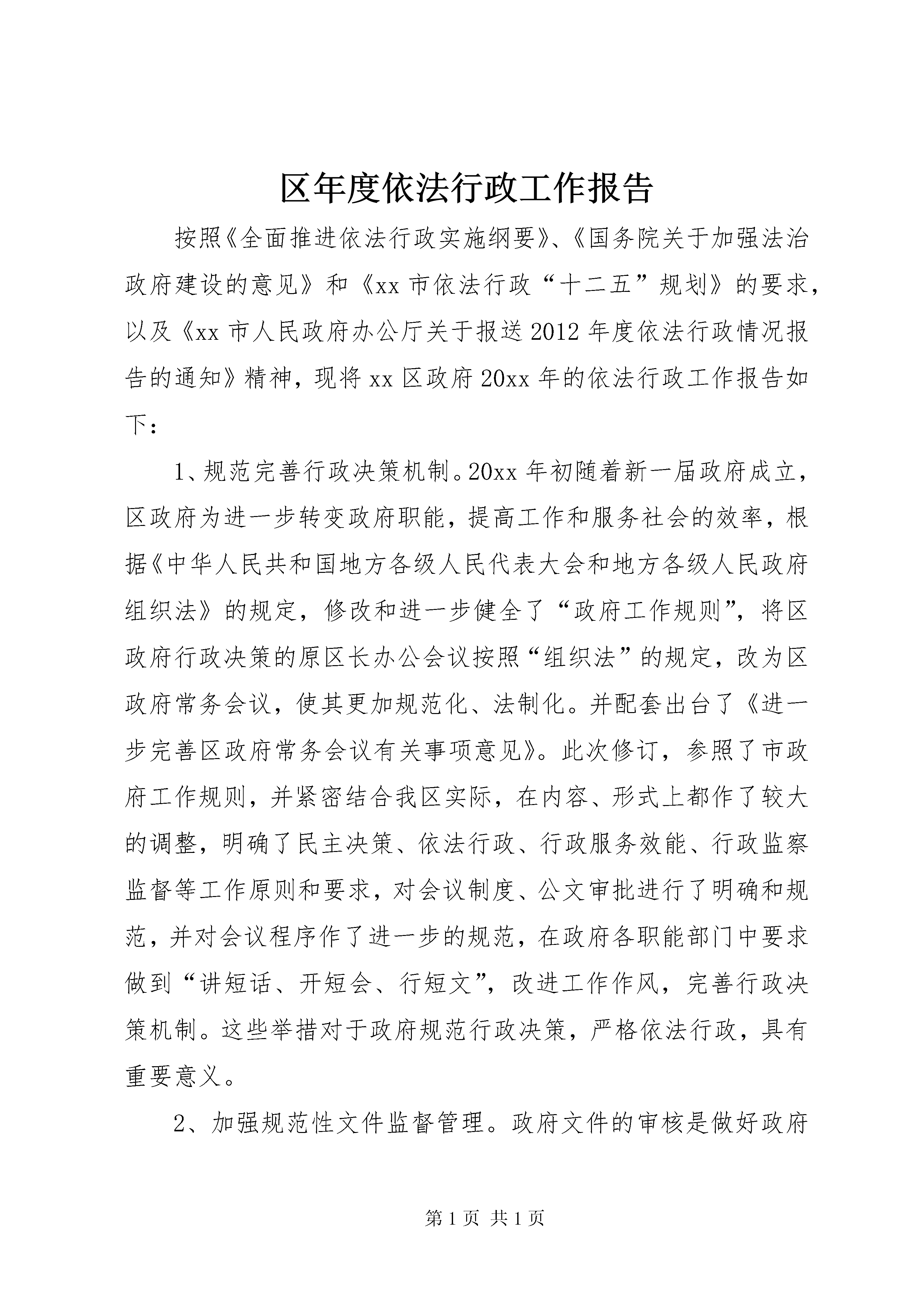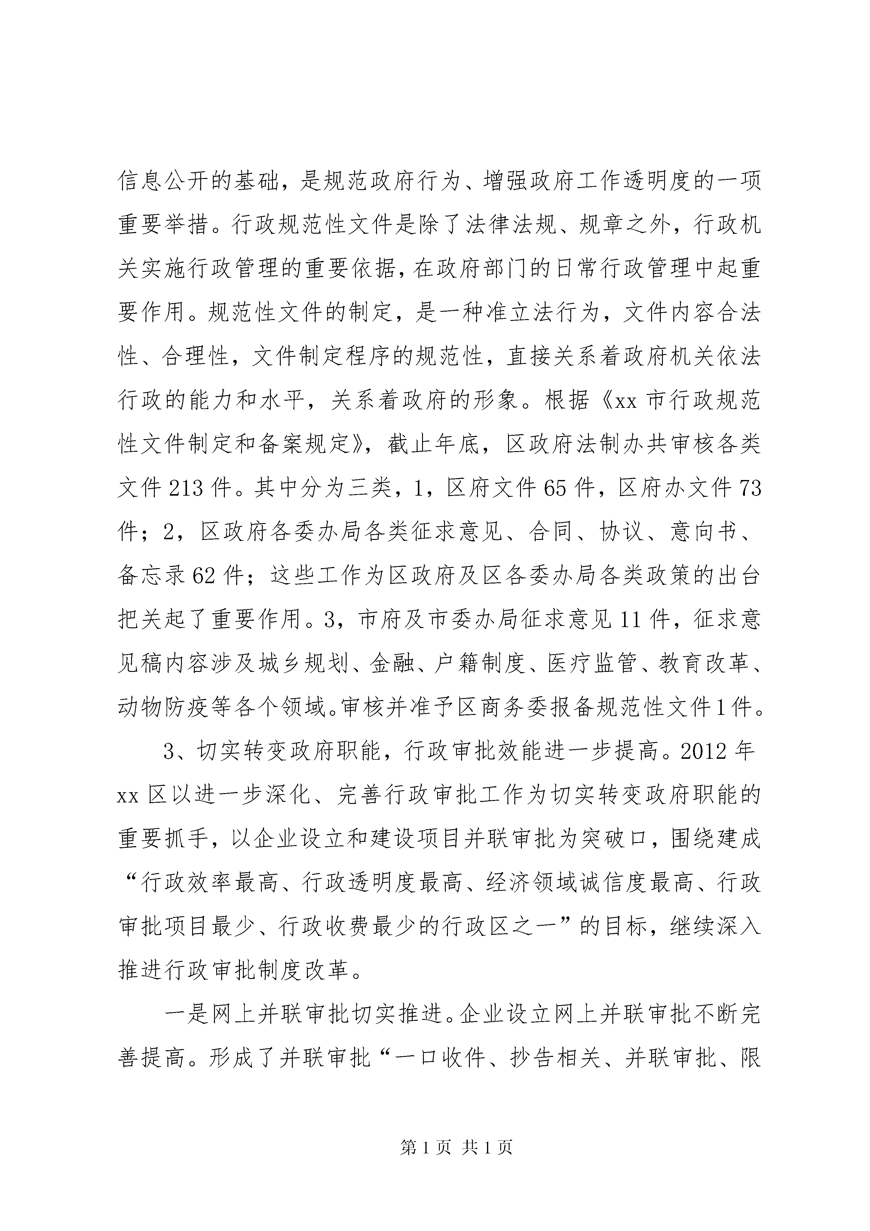 区年度依法行政工作报告按照《全面推进依法行政实施纲要》、《国务院关于加强法治政府建设的意见》和《xx市依法行政“十二五”规划》的要求,以及《xx市人民政府办公厅关于报送2012年度依法行政情况报告的通知》精神,现将xx区政府20xx年的依法行政工作报告如下:1、规范完善行政决策机制。20xx年初随着新一届政府成立,区政府为进一步转变政府职能,提高工作和服务社会的效率,根据《中华人民共和国地方各级人民代表大会和地方各级人民政府组织法》的规定,修改和进一步健全了“政府工作规则”,将区政府行政决策的原区长办公会议按照“组织法”的规定,改为区政府常务会议,使其更加规范化、法制化。并配套出台了《进一步完善区政府常务会议有关事项意见》。此次修订,参照了市政府工作规则,并紧密结合我区实际,在内容、形式上都作了较大的调整,明确了民主决策、依法行政、行政服务效能、行政监察监督等工作原则和要求,对会议制度、公文审批进行了明确和规范,并对会议程序作了进一步的规范,在政府各职能部门中要求做到“讲短话、开短会、行短文”,改进工作作风,完善行政决策机制。这些举措对于政府规范行政决策,严格依法行政,具有重要意义。2、加强规范性文件监督管理。政府文件的审核是做好政府信息公开的基础,是规范政府行为、增强政府工作透明度的一项重要举措。行政规范性文件是除了法律法规、规章之外,行政机关实施行政管理的重要依据,在政府部门的日常行政管理中起重要作用。规范性文件的制定,是一种准立法行为,文件内容合法性、合理性,文件制定程序的规范性,直接关系着政府机关依法行政的能力和水平,关系着政府的形象。根据《xx市行政规范性文件制定和备案规定》,截止年底,区政府法制办共审核各类文件213件。其中分为三类,1,区府文件65件,区府办文件73件;2,区政府各委办局各类征求意见、合同、协议、意向书、备忘录62件;这些工作为区政府及区各委办局各类政策的出台把关起了重要作用。3,市府及市委办局征求意见11件,征求意见稿内容涉及城乡规划、金融、户籍制度、医疗监管、教育改革、动物防疫等各个领域。审核并准予区商务委报备规范性文件1件。3、切实转变政府职能,行政审批效能进一步提高。2012年xx区以进一步深化、完善行政审批工作为切实转变政府职能的重要抓手,以企业设立和建设项目并联审批为突破口,围绕建成“行政效率最高、行政透明度最高、经济领域诚信度最高、行政审批项目最少、行政收费最少的行政区之一”的目标,继续深入推进行政审批制度改革。一是网上并联审批切实推进。企业设立网上并联审批不断完善提高。形成了并联审批“一口收件、抄告相关、并联审批、限时办结”的审批机制,强化了提前服务、推进了告知承诺,简化了审批程序,提高了审批效率,受到了企业的普遍欢迎,取得了良好的社会效益。建设项目并联审批网络平台进一步深化。建设工程行政审批(土地使用权取得和核定规划条件、建设工程设计方案审核、建设工程设计文件审查和建设工程竣工验收)整体改革工作不断推进,其中,前二项做到网上网下均并联审批达到100%。全年统计,我区土地取得和核定规划条件阶段网上并联审批完成了3幅地块,设计方案阶段网上并联审批完成了27个项目。后二项区建交委也积极配合市建交委构建网上并联审批平台,目前网下的审批已做到了100%。二是行政审批事项进一步清理,审批标准化建设顺利推进。2012年上半年在市审改办审定下发的全市行政审批事项共655项目录的基础上,我区开展了行政审批项目的再一次梳理。目前,涉及行政审批项目的部门有27个,行政审批事项为355项。三是扩大告知承诺范围,积极推进服务型政府建设。20xx年,我区又有12个委、办、局,实行了第二批告知承诺行政审批事项共17项。加上第一批实行“告知承诺”的部门,目前我区总共有21个部门36项行政审批事项实行了“告知承诺”制。四是创新方法,进一步加快审批速度。2012年,区审改办牵头,制订完成了《关于加快xx区社会事业(政府投资)重大项目审批进度的实施意见(试行)》稿。一是继续深化行政审批改革,压缩审批时限。二是理清各项审批配套环节和项目,提前做好配套工作。三是创新方法,实行预审批机制。即实行“蓝图章”预审批机制,运用告知承诺的方法,对一些因客观原因滞后的手续加以弥补,加盖审批蓝图章先预审通过,以保证流程顺利进入下个环节,最后在发放施工许可证环节把关,全部符合审批要求,换成审批红图章后,才能发证开工。已经区政府常务会议讨论通过,于2013年正式实施。4、政府信息公开工作情况。政府信息公开是建设服务政府、责任政府、法制政府、廉洁政府的重要内容,这项工作得到了区领导的高度重视,区领导多次在会议上强调政府信息公开工作的重要性。2012年7月份,常务副区长张汪耀代表xx市在国务院办公厅召开的政府信息公开