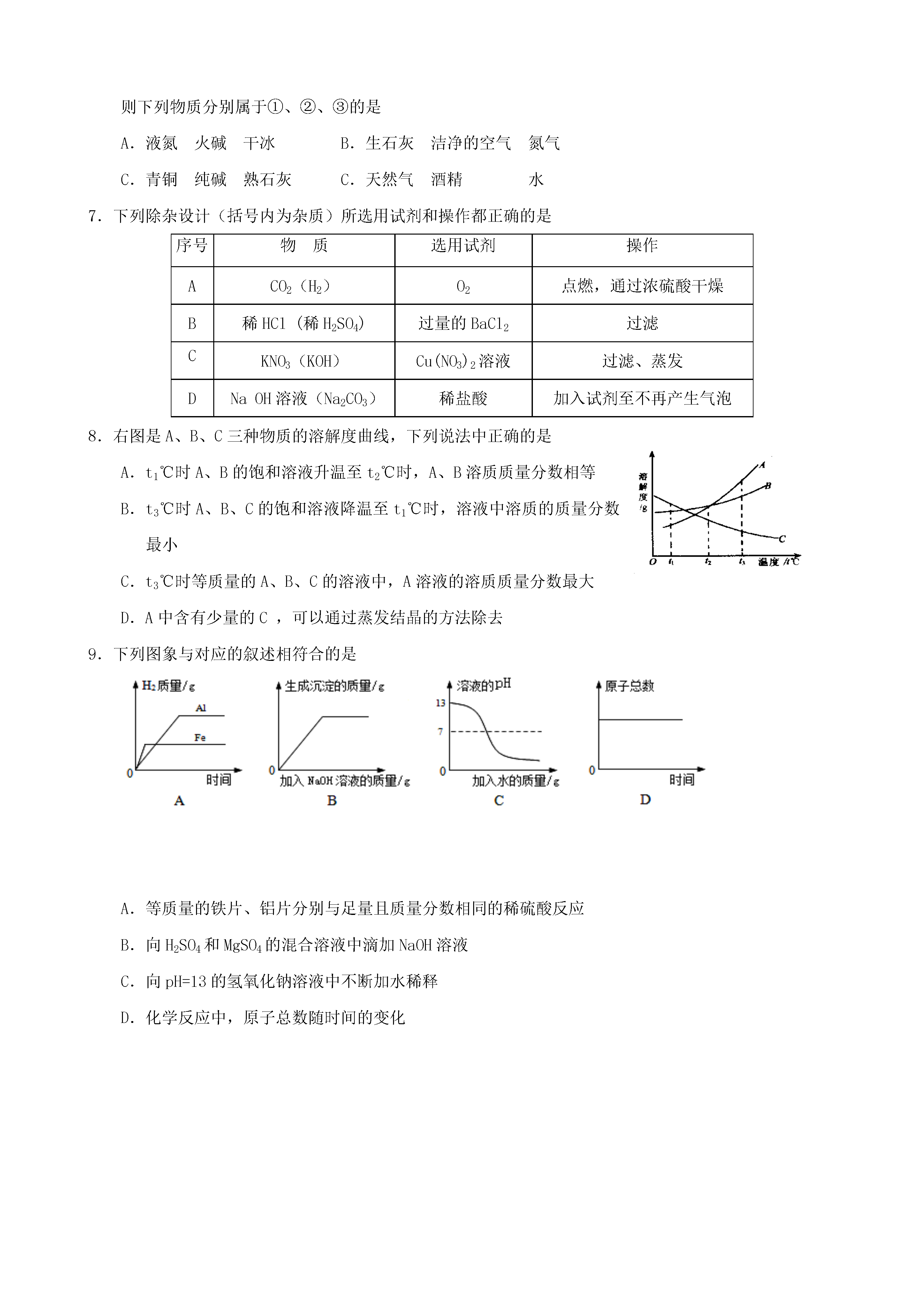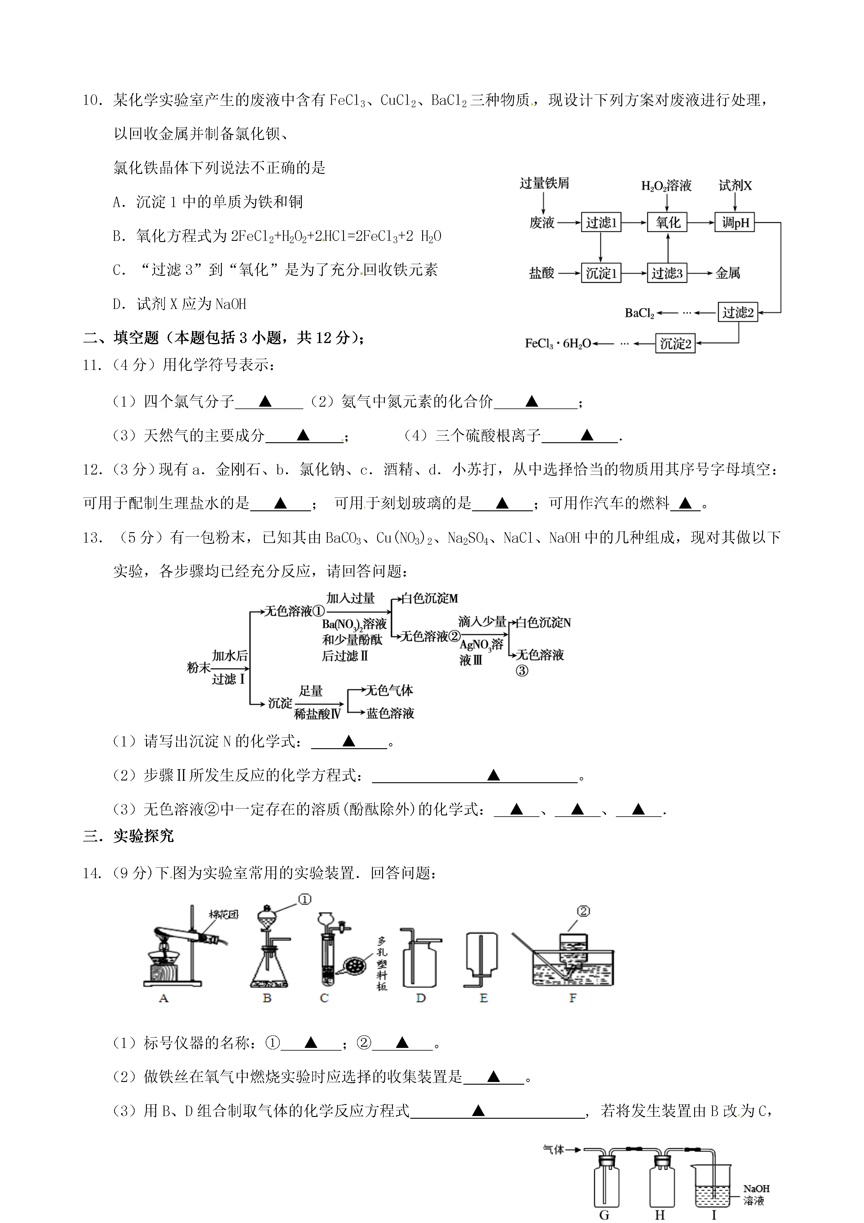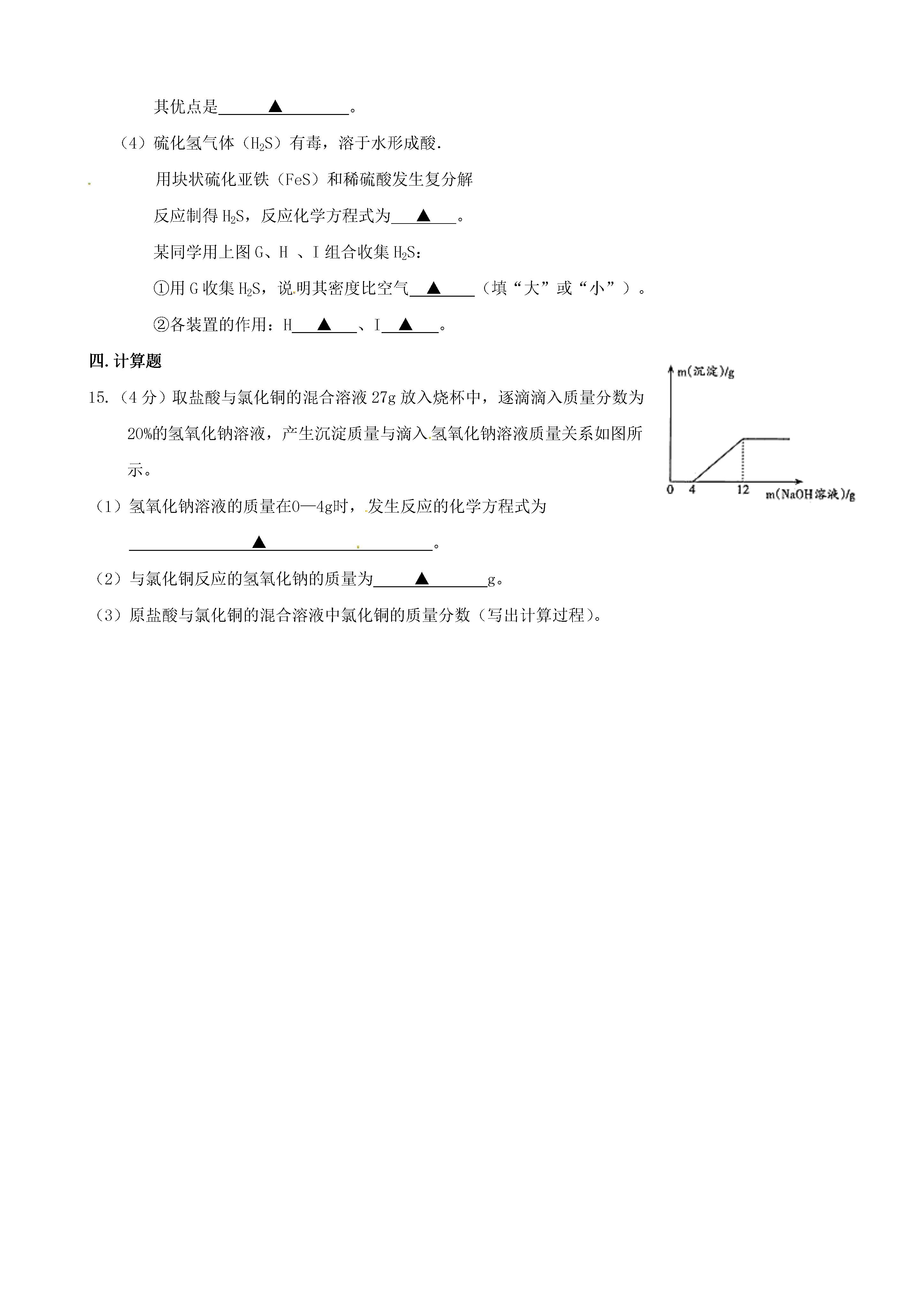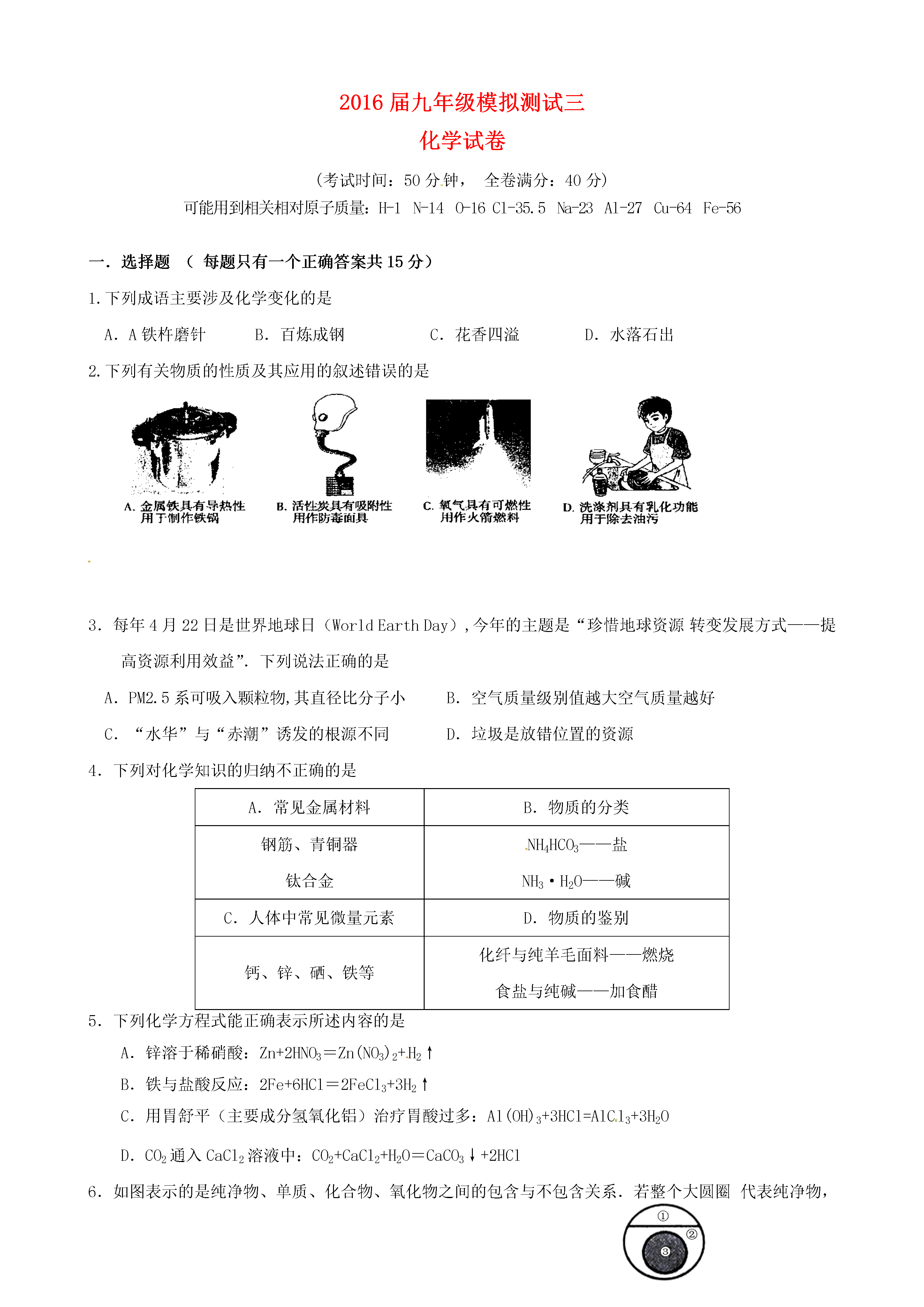 2016届九年级模拟测试三化学试卷(考试时间:50分钟,全卷满分:40分)可能用到相关相对原子质量:H-1N-14O-16Cl-35.5Na-23Al-27Cu-64Fe-56一.选择题(每题只有一个正确答案共15分)1.下列成语主要涉及化学变化的是A.A铁杵磨针B.百炼成钢C.花香四溢D.水落石出2.下列有关物质的性质及其应用的叙述错误的是3.每年4月22日是世界地球日(WorldEarthDay),今年的主题是“珍惜地球资源转变发展方式——提高资源利用效益”.下列说法正确的是A.PM2.5系可吸入颗粒物,其直径比分子小B.空气质量级别值越大空气质量越好C.“水华”与“赤潮”诱发的根源不同D.垃圾是放错位置的资源4.下列对化学知识的归纳不正确的是A.常见金属材料B.物质的分类钢筋、青铜器钛合金NH4HCO3——盐NH3·H2O——碱C.人体中常见微量元素D.物质的鉴别钙、锌、硒、铁等化纤与纯羊毛面料——燃烧食盐与纯碱——加食醋5.下列化学方程式能正确表示所述内容的是A.锌溶于稀硝酸:Zn+2HNO3=Zn(NO3)2+H2↑B.铁与盐酸反应:2Fe+6HCl=2FeCl3+3H2↑C.用胃舒平(主要成分氢氧化铝)治疗胃酸过多:Al(OH)3+3HCl=AlCl3+3H2OD.CO2通入CaCl2溶液中:CO2+CaCl2+H2O=CaCO3↓+2HCl6.如图表示的是纯净物、单质、化合物、氧化物之间的包含与不包含关系.若整个大圆圈代表纯净物,则下列物质分别属于①、②、③的是A.液氮火碱干冰B.生石灰洁净的空气氮气C.青铜纯碱熟石灰C.天然气酒精水7.下列除杂设计(括号内为杂质)所选用试剂和操作都正确的是序号物质选用试剂操作ACO2(H2)O2点燃,通过浓硫酸干燥B稀HCl(稀H2SO4)过量的BaCl2过滤CKNO3(KOH)Cu(NO3)2溶液过滤、蒸发DNaOH溶液(Na2CO3)稀盐酸加入试剂至不再产生气泡8.右图是A、B、C三种物质的溶解度曲线,下列说法中正确的是A.t1℃时A、B的饱和溶液升温至t2℃时,A、B溶质质量分数相等B.t3℃时A、B、C的饱和溶液降温至t1℃时,溶液中溶质的质量分数最小C.t3℃时等质量的A、B、C的溶液中,A溶液的溶质质量分数最大D.A中含有少量的C,可以通过蒸发结晶的方法除去9.下列图象与对应的叙述相符合的是A.等质量的铁片、铝片分别与足量且质量分数相同的稀硫酸反应B.向H2SO4和MgSO4的混合溶液中滴加NaOH溶液C.向pH=13的氢氧化钠溶液中不断加水稀释D.化学反应中,原子总数随时间的变化10.某化学实验室产生的废液中含有FeCl3、CuCl2、BaCl2三种物质,现设计下列方案对废液进行处理,以回收金属并制备氯化钡、氯化铁晶体下列说法不正确的是A.沉淀1中的单质为铁和铜B.氧化方程式为2FeCl2+H2O2+2HCl=2FeCl3+2H2OC.“过滤3”到“氧化”是为了充分回收铁元素D.试剂X应为NaOH二、填空题(本题包括3小题,共12分);11.(4分)用化学符号表示:(1)四个氯气分子▲(2)氨气中氮元素的化合价▲;(3)天然气的主要成分▲;(4)三个硫酸根离子▲.12.(3分)现有a.金刚石、b.氯化钠、c.酒精、d.小苏打,从中选择恰当的物质用其序号字母填空:可用于配制生理盐水的是▲;可用于刻划玻璃的是▲;可用作汽车的燃料▲。13.(5分)有一包粉末,已知其由BaCO3、Cu(NO3)2、Na2SO4、NaCl、NaOH中的几种组成,现对其做以下实验,各步骤均已经充分反应,请回答问题:(1)请写出沉淀N的化学式:▲。(2)步骤Ⅱ所发生反应的化学方程式:▲。(3)无色溶液②中一定存在的溶质(酚酞除外)的化学式:▲、▲、▲.三.实验探究14.(9分)下图为实验室常用的实验装置.回答问题:(1)标号仪器的名称:①▲;②▲。(2)做铁丝在氧气中燃烧实验时应选择的收集装置是▲。(3)用B、D组合制取气体的化学反应方程式▲,若将发生装置由B改为C,其优点是▲。(4)硫化氢气体(H2S)有毒,溶于水形成酸.用块状硫化亚铁(FeS)和稀硫酸发生复分解反应制得H2S,反应化学方程式为▲。某同学用上图G、H、I组合收集H2S:①用G收集H2S,说明其密度比空气▲(填“大”或“小”)。②各装置的作用:H▲、I▲。四.计算题15.(4分)取盐酸与氯化铜的混合溶液27g放入烧杯中,逐滴滴入质量分数为20%的氢氧化钠溶液,产生沉淀质量与滴入氢氧化钠溶液质量关系如图所示。(1)氢氧化钠溶液的质量在0—4g时,发生反应的化学方