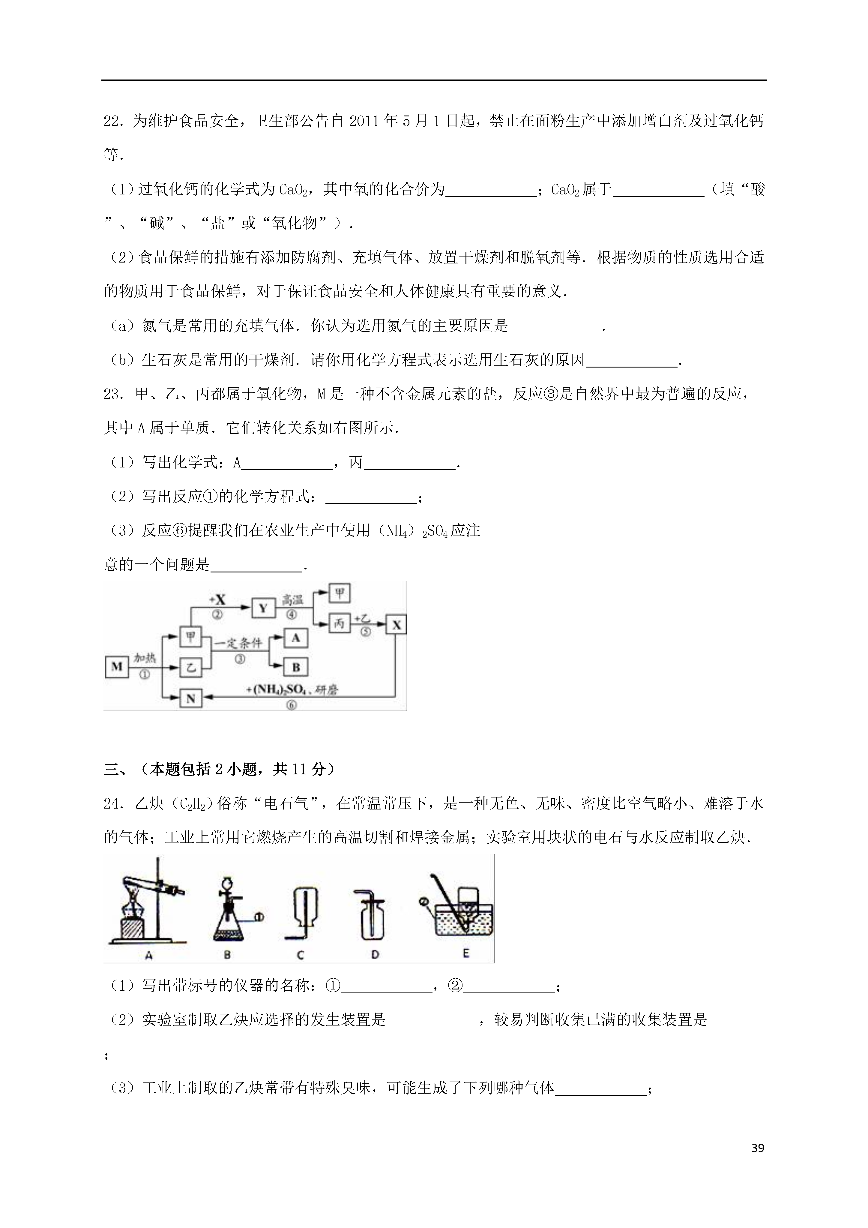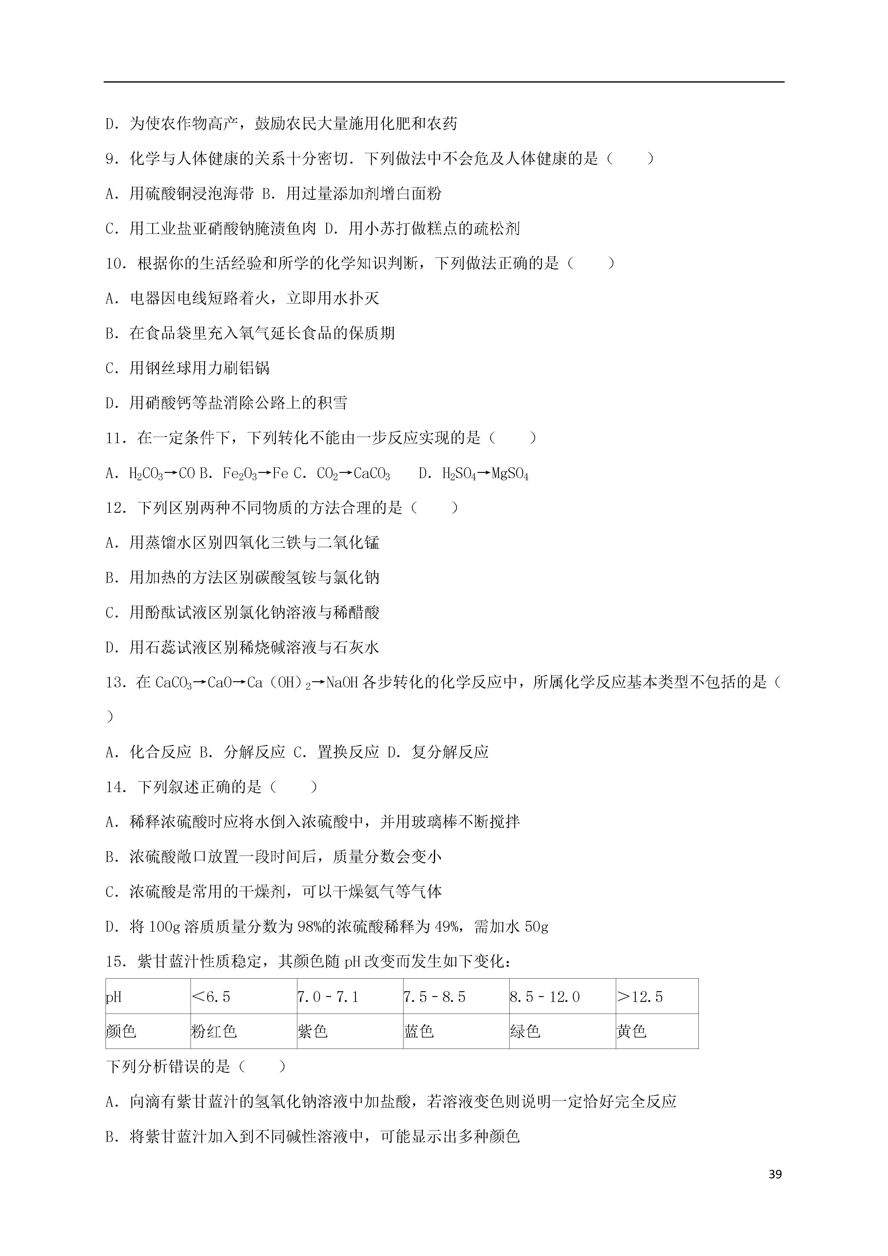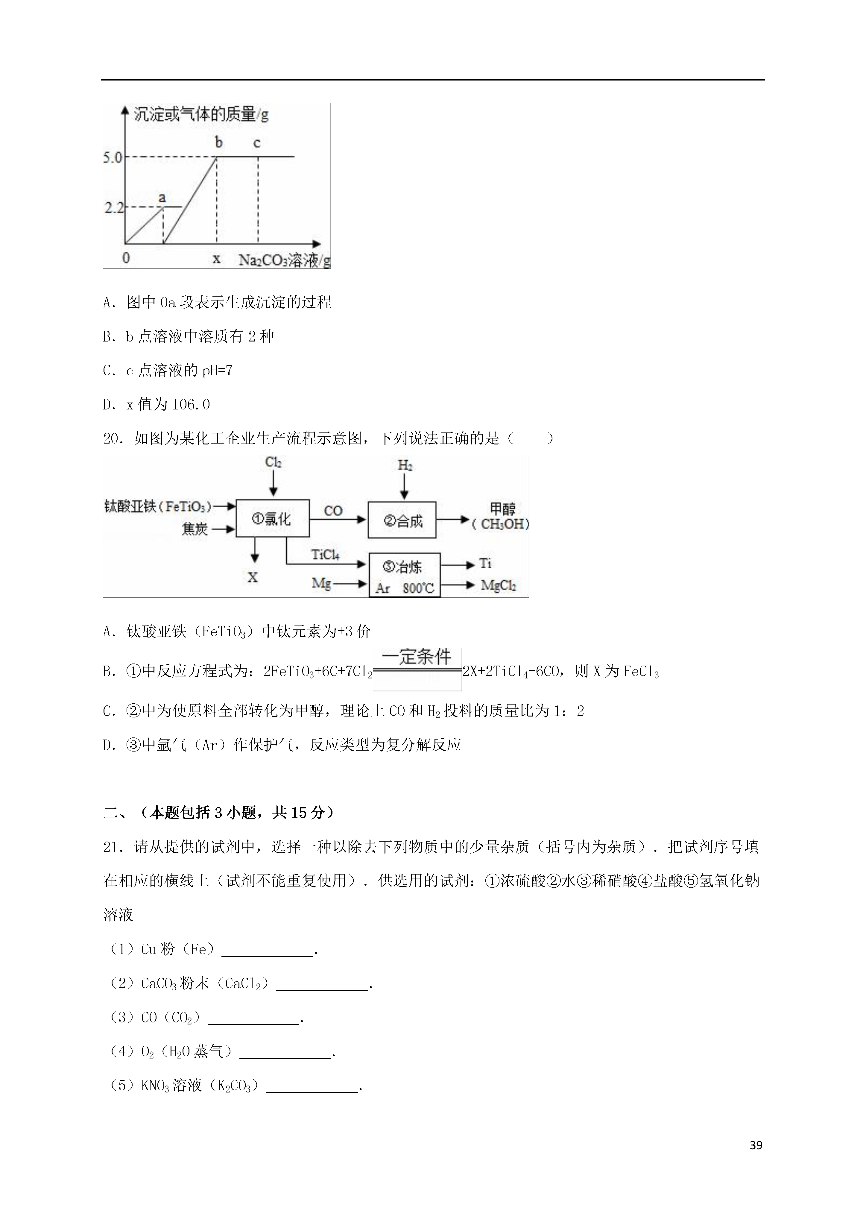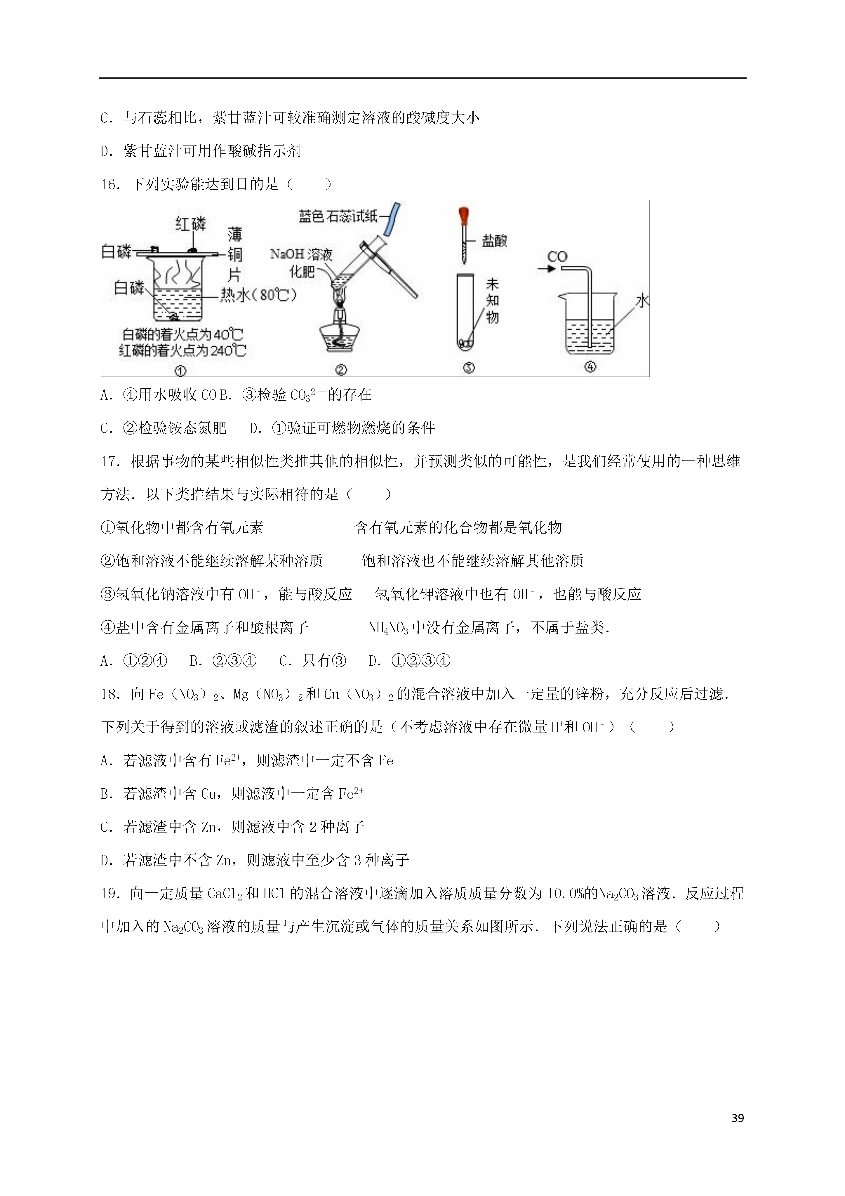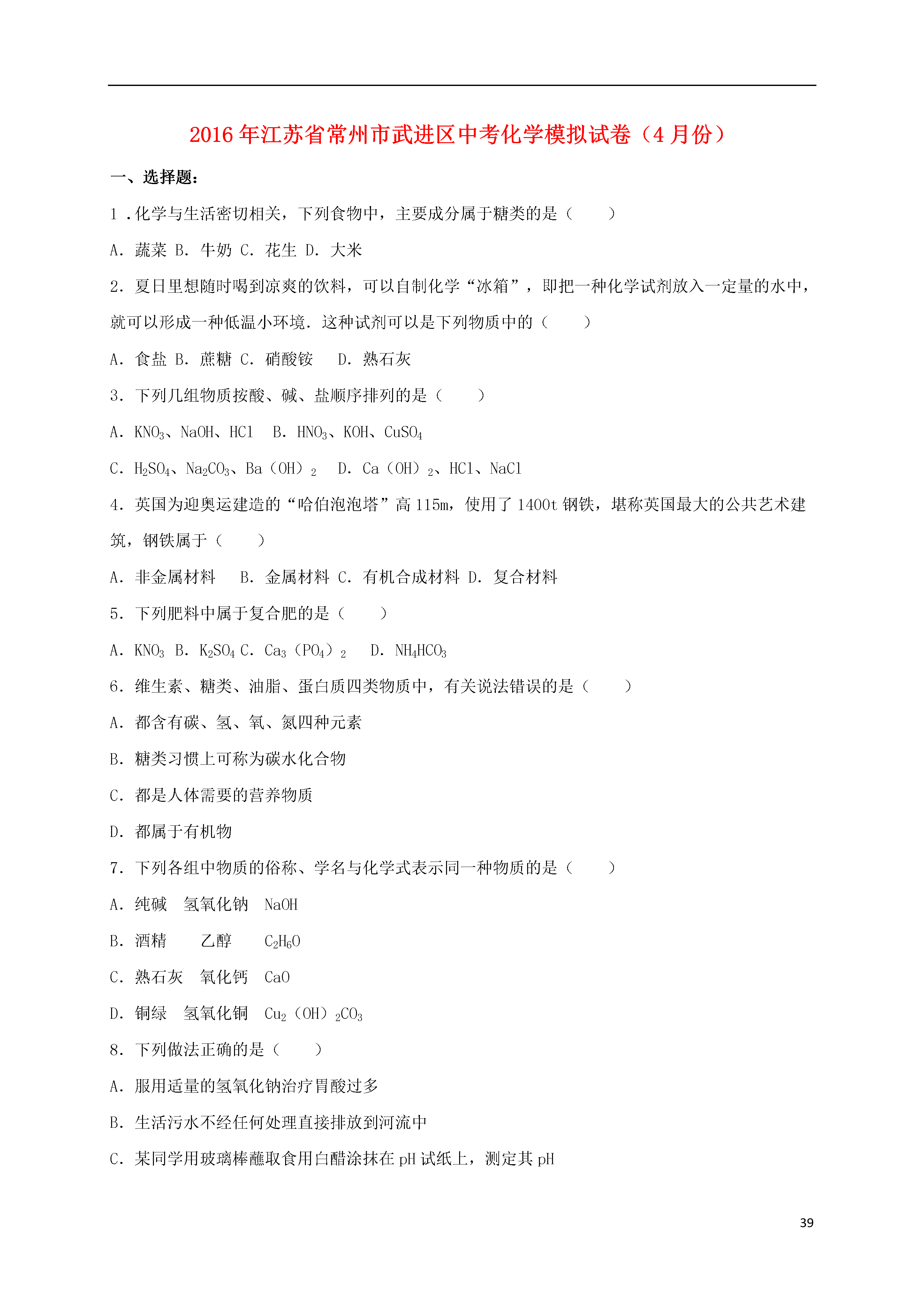 392016年江苏省常州市武进区中考化学模拟试卷(4月份)一、选择题:1.化学与生活密切相关,下列食物中,主要成分属于糖类的是()A.蔬菜B.牛奶C.花生D.大米2.夏日里想随时喝到凉爽的饮料,可以自制化学“冰箱”,即把一种化学试剂放入一定量的水中,就可以形成一种低温小环境.这种试剂可以是下列物质中的()A.食盐B.蔗糖C.硝酸铵D.熟石灰3.下列几组物质按酸、碱、盐顺序排列的是()A.KNO3、NaOH、HClB.HNO3、KOH、CuSO4C.H2SO4、Na2CO3、Ba(OH)2D.Ca(OH)2、HCl、NaCl4.英国为迎奥运建造的“哈伯泡泡塔”高115m,使用了1400t钢铁,堪称英国最大的公共艺术建筑,钢铁属于()A.非金属材料B.金属材料C.有机合成材料D.复合材料5.下列肥料中属于复合肥的是()A.KNO3B.K2SO4C.Ca3(PO4)2D.NH4HCO36.维生素、糖类、油脂、蛋白质四类物质中,有关说法错误的是()A.都含有碳、氢、氧、氮四种元素B.糖类习惯上可称为碳水化合物C.都是人体需要的营养物质D.都属于有机物7.下列各组中物质的俗称、学名与化学式表示同一种物质的是()A.纯碱氢氧化钠NaOHB.酒精乙醇C2H6OC.熟石灰氧化钙CaOD.铜绿氢氧化铜Cu2(OH)2CO38.下列做法正确的是()A.服用适量的氢氧化钠治疗胃酸过多B.生活污水不经任何处理直接排放到河流中C.某同学用玻璃棒蘸取食用白醋涂抹在pH试纸上,测定其pHD.为使农作物高产,鼓励农民大量施用化肥和农药9.化学与人体健康的关系十分密切.下列做法中不会危及人体健康的是()A.用硫酸铜浸泡海带B.用过量添加剂增白面粉C.用工业盐亚硝酸钠腌渍鱼肉D.用小苏打做糕点的疏松剂10.根据你的生活经验和所学的化学知识判断,下列做法正确的是()A.电器因电线短路着火,立即用水扑灭B.在食品袋里充入氧气延长食品的保质期C.用钢丝球用力刷铝锅D.用硝酸钙等盐消除公路上的积雪11.在一定条件下,下列转化不能由一步反应实现的是()A.H2CO3→COB.Fe2O3→FeC.CO2→CaCO3D.H2SO4→MgSO412.下列区别两种不同物质的方法合理的是()A.用蒸馏水区别四氧化三铁与二氧化锰B.用加热的方法区别碳酸氢铵与氯化钠C.用酚酞试液区别氯化钠溶液与稀醋酸D.用石蕊试液区别稀烧碱溶液与石灰水13.在CaCO3→CaO→Ca(OH)2→NaOH各步转化的化学反应中,所属化学反应基本类型不包括的是()A.化合反应B.分解反应C.置换反应D.复分解反应14.下列叙述正确的是()A.稀释浓硫酸时应将水倒入浓硫酸中,并用玻璃棒不断搅拌B.浓硫酸敞口放置一段时间后,质量分数会变小C.浓硫酸是常用的干燥剂,可以干燥氨气等气体D.将100g溶质质量分数为98%的浓硫酸稀释为49%,需加水50g15.紫甘蓝汁性质稳定,其颜色随pH改变而发生如下变化:pH<6.57.0﹣7.17.5﹣8.58.5﹣12.0>12.5颜色粉红色紫色蓝色绿色黄色下列分析错误的是()A.向滴有紫甘蓝汁的氢氧化钠溶液中加盐酸,若溶液变色则说明一定恰好完全反应B.将紫甘蓝汁加入到不同碱性溶液中,可能显示出多种颜色C.与石蕊相比,紫甘蓝汁可较准确测定溶液的酸碱度大小D.紫甘蓝汁可用作酸碱指示剂16.下列实验能达到目的是()A.④用水吸收COB.③检验CO32一的存在C.②检验铵态氮肥D.①验证可燃物燃烧的条件17.根据事物的某些相似性类推其他的相似性,并预测类似的可能性,是我们经常使用的一种思维方法.以下类推结果与实际相符的是()①氧化物中都含有氧元素含有氧元素的化合物都是氧化物②饱和溶液不能继续溶解某种溶质饱和溶液也不能继续溶解其他溶质③氢氧化钠溶液中有OH﹣,能与酸反应氢氧化钾溶液中也有OH﹣,也能与酸反应④盐中含有金属离子和酸根离子NH4NO3中没有金属离子,不属于盐类.A.①②④B.②③④C.只有③D.①②③④18.向Fe(NO3)2、Mg(NO3)2和Cu(NO3)2的混合溶液中加入一定量的锌粉,充分反应后过滤.下列关于得到的溶液或滤渣的叙述正确的是(不考虑溶液中存在微量H+和OH﹣)()A.若滤液中含有Fe2+,则滤渣中一定不含FeB.若滤渣中含Cu,则滤液中一定含Fe2+C.若滤渣中含Zn,则滤液中含2种离子D.若滤渣中不含Zn,则滤液中至少含3种离子19.向一定质量CaCl2和HCl的混合溶液中逐滴加入溶质质量分数为10.0%的Na2CO3溶液.反应过程中加入的Na2CO3溶液的质量与产生沉淀或气体的质量关系如图所示