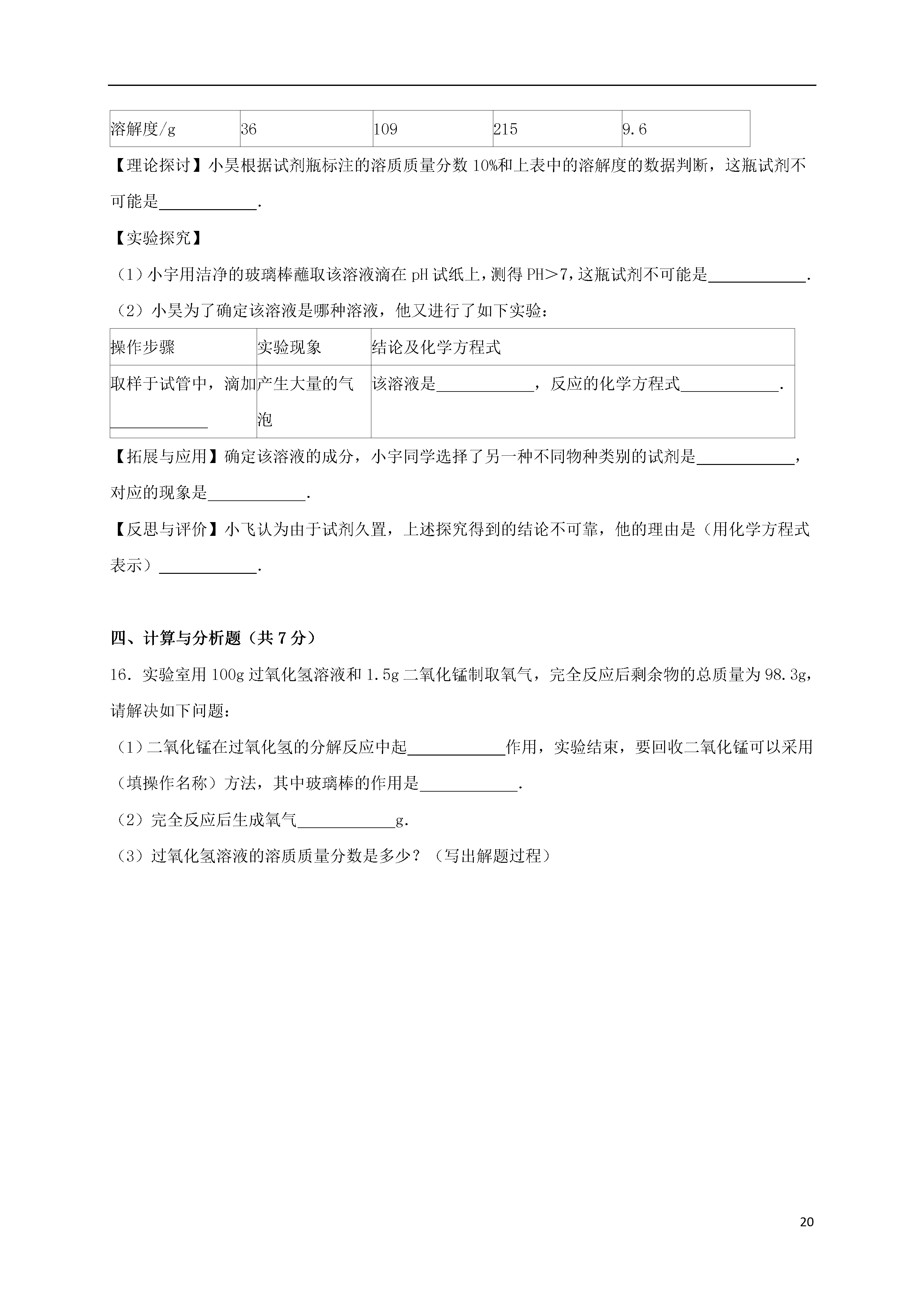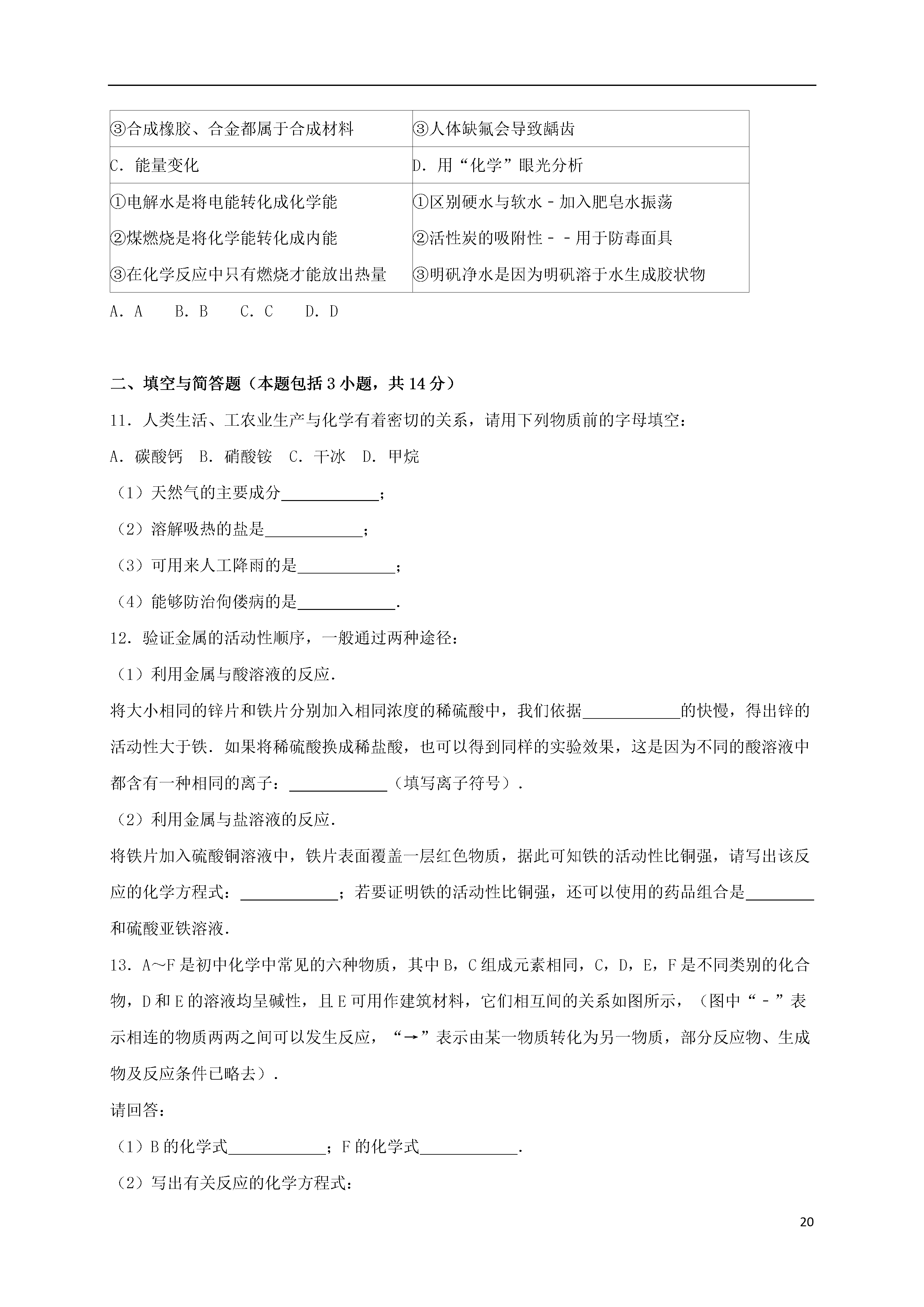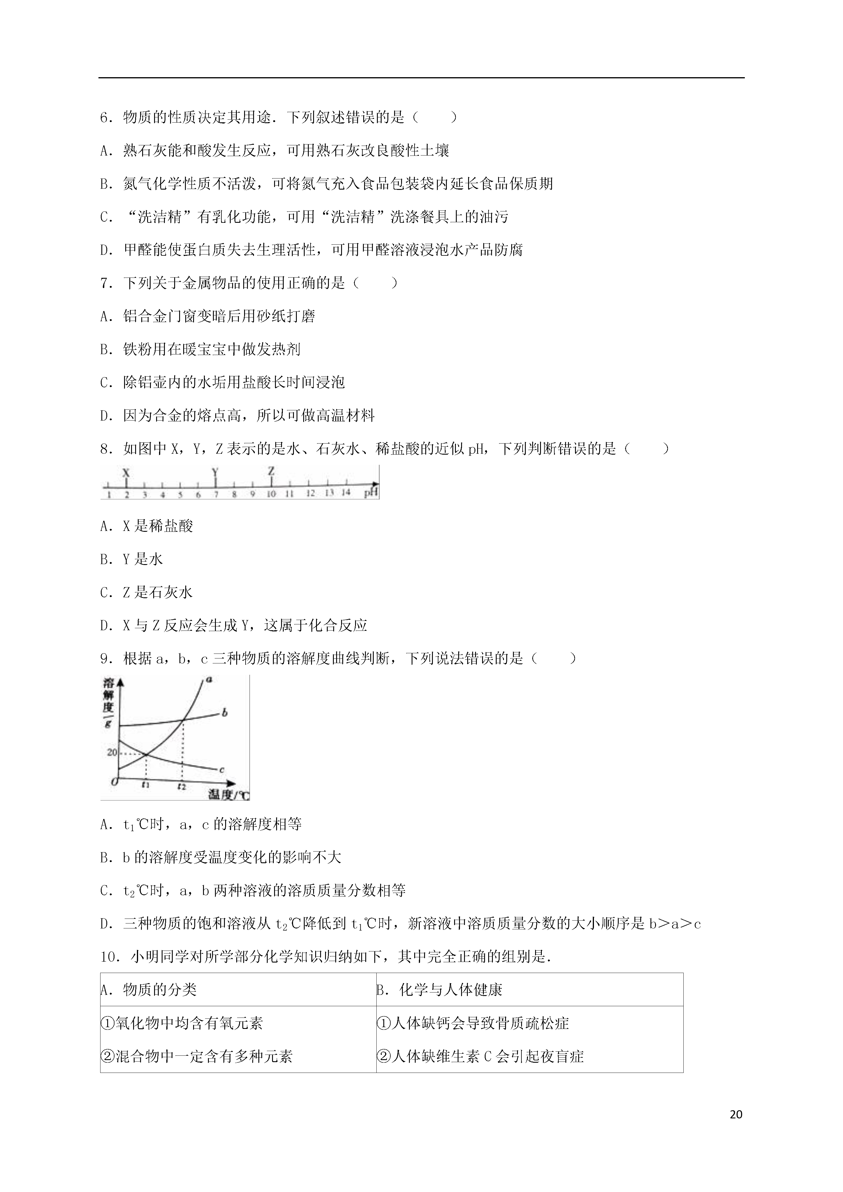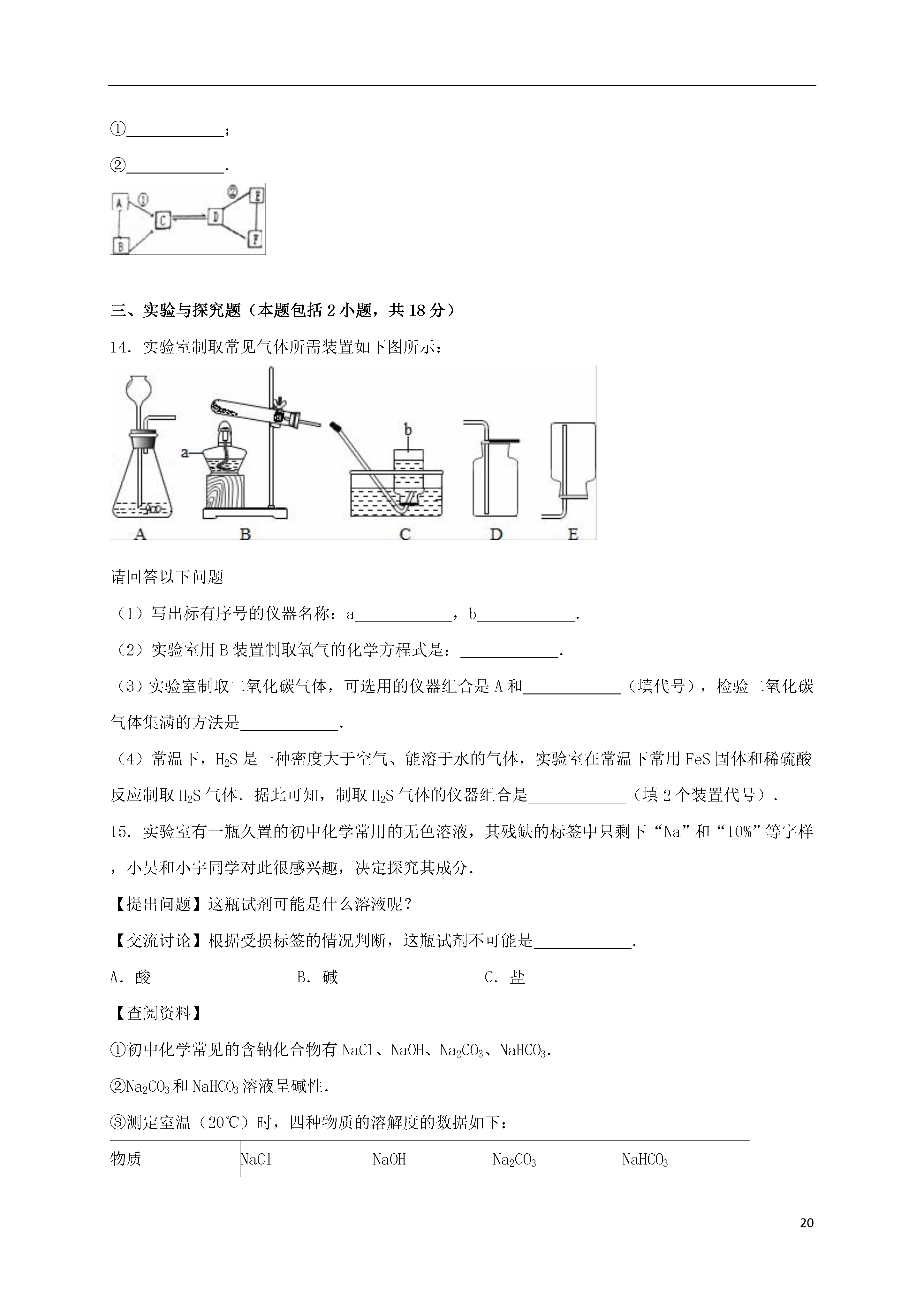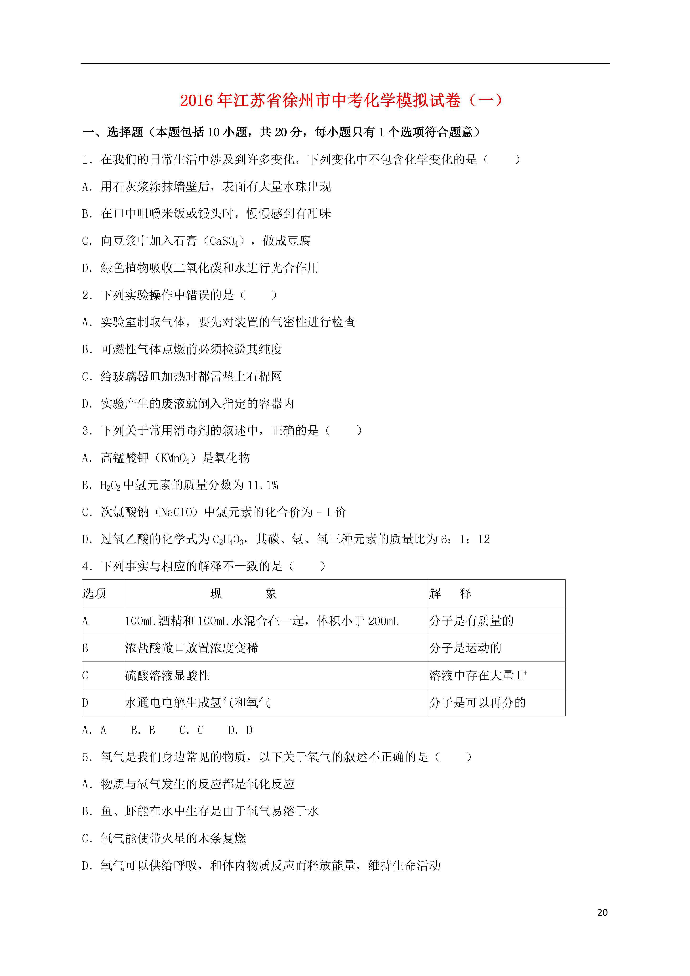 202016年江苏省徐州市中考化学模拟试卷(一)一、选择题(本题包括10小题,共20分,每小题只有1个选项符合题意)1.在我们的日常生活中涉及到许多变化,下列变化中不包含化学变化的是()A.用石灰浆涂抹墙壁后,表面有大量水珠出现B.在口中咀嚼米饭或馒头时,慢慢感到有甜味C.向豆浆中加入石膏(CaSO4),做成豆腐D.绿色植物吸收二氧化碳和水进行光合作用2.下列实验操作中错误的是()A.实验室制取气体,要先对装置的气密性进行检查B.可燃性气体点燃前必须检验其纯度C.给玻璃器皿加热时都需垫上石棉网D.实验产生的废液就倒入指定的容器内3.下列关于常用消毒剂的叙述中,正确的是()A.高锰酸钾(KMnO4)是氧化物B.H2O2中氢元素的质量分数为11.1%C.次氯酸钠(NaClO)中氯元素的化合价为﹣1价D.过氧乙酸的化学式为C2H4O3,其碳、氢、氧三种元素的质量比为6:1:124.下列事实与相应的解释不一致的是()选项现象解释A100mL酒精和100mL水混合在一起,体积小于200mL分子是有质量的B浓盐酸敞口放置浓度变稀分子是运动的C硫酸溶液显酸性溶液中存在大量H+D水通电电解生成氢气和氧气分子是可以再分的A.AB.BC.CD.D5.氧气是我们身边常见的物质,以下关于氧气的叙述不正确的是()A.物质与氧气发生的反应都是氧化反应B.鱼、虾能在水中生存是由于氧气易溶于水C.氧气能使带火星的木条复燃D.氧气可以供给呼吸,和体内物质反应而释放能量,维持生命活动6.物质的性质决定其用途.下列叙述错误的是()A.熟石灰能和酸发生反应,可用熟石灰改良酸性土壤B.氮气化学性质不活泼,可将氮气充入食品包装袋内延长食品保质期C.“洗洁精”有乳化功能,可用“洗洁精”洗涤餐具上的油污D.甲醛能使蛋白质失去生理活性,可用甲醛溶液浸泡水产品防腐7.下列关于金属物品的使用正确的是()A.铝合金门窗变暗后用砂纸打磨B.铁粉用在暖宝宝中做发热剂C.除铝壶内的水垢用盐酸长时间浸泡D.因为合金的熔点高,所以可做高温材料8.如图中X,Y,Z表示的是水、石灰水、稀盐酸的近似pH,下列判断错误的是()A.X是稀盐酸B.Y是水C.Z是石灰水D.X与Z反应会生成Y,这属于化合反应9.根据a,b,c三种物质的溶解度曲线判断,下列说法错误的是()A.t1℃时,a,c的溶解度相等B.b的溶解度受温度变化的影响不大C.t2℃时,a,b两种溶液的溶质质量分数相等D.三种物质的饱和溶液从t2℃降低到t1℃时,新溶液中溶质质量分数的大小顺序是b>a>c10.小明同学对所学部分化学知识归纳如下,其中完全正确的组别是.A.物质的分类B.化学与人体健康①氧化物中均含有氧元素②混合物中一定含有多种元素③合成橡胶、合金都属于合成材料①人体缺钙会导致骨质疏松症②人体缺维生素C会引起夜盲症③人体缺氟会导致龋齿C.能量变化D.用“化学”眼光分析①电解水是将电能转化成化学能②煤燃烧是将化学能转化成内能③在化学反应中只有燃烧才能放出热量①区别硬水与软水﹣加入肥皂水振荡②活性炭的吸附性﹣﹣用于防毒面具③明矾净水是因为明矾溶于水生成胶状物A.AB.BC.CD.D二、填空与简答题(本题包括3小题,共14分)11.人类生活、工农业生产与化学有着密切的关系,请用下列物质前的字母填空:A.碳酸钙B.硝酸铵C.干冰D.甲烷(1)天然气的主要成分;(2)溶解吸热的盐是;(3)可用来人工降雨的是;(4)能够防治佝偻病的是.12.验证金属的活动性顺序,一般通过两种途径:(1)利用金属与酸溶液的反应.将大小相同的锌片和铁片分别加入相同浓度的稀硫酸中,我们依据的快慢,得出锌的活动性大于铁.如果将稀硫酸换成稀盐酸,也可以得到同样的实验效果,这是因为不同的酸溶液中都含有一种相同的离子:(填写离子符号).(2)利用金属与盐溶液的反应.将铁片加入硫酸铜溶液中,铁片表面覆盖一层红色物质,据此可知铁的活动性比铜强,请写出该反应的化学方程式:;若要证明铁的活动性比铜强,还可以使用的药品组合是和硫酸亚铁溶液.13.A~F是初中化学中常见的六种物质,其中B,C组成元素相同,C,D,E,F是不同类别的化合物,D和E的溶液均呈碱性,且E可用作建筑材料,它们相互间的关系如图所示,(图中“﹣”表示相连的物质两两之间可以发生反应,“→”表示由某一物质转化为另一物质,部分反应物、生成物及反应条件已略去).请回答:(1)B的化学式;F的化学式.(2)写出有关反应的化学方程式:①;②.三、实验与探究题(本题包括2小题,共18分)14.实验室制取常见气体所需装置如下图所示:请回答以下问题(1)写出