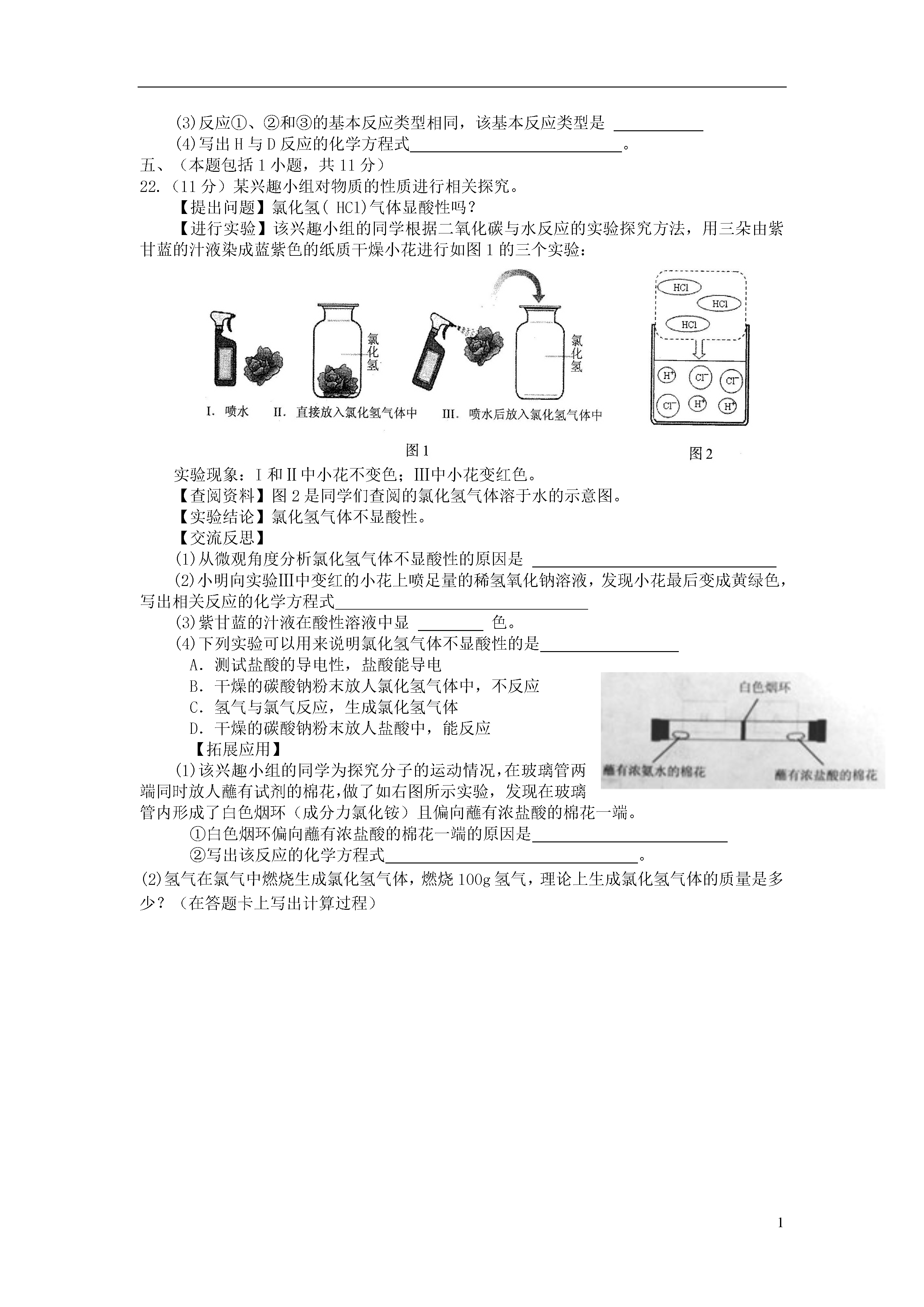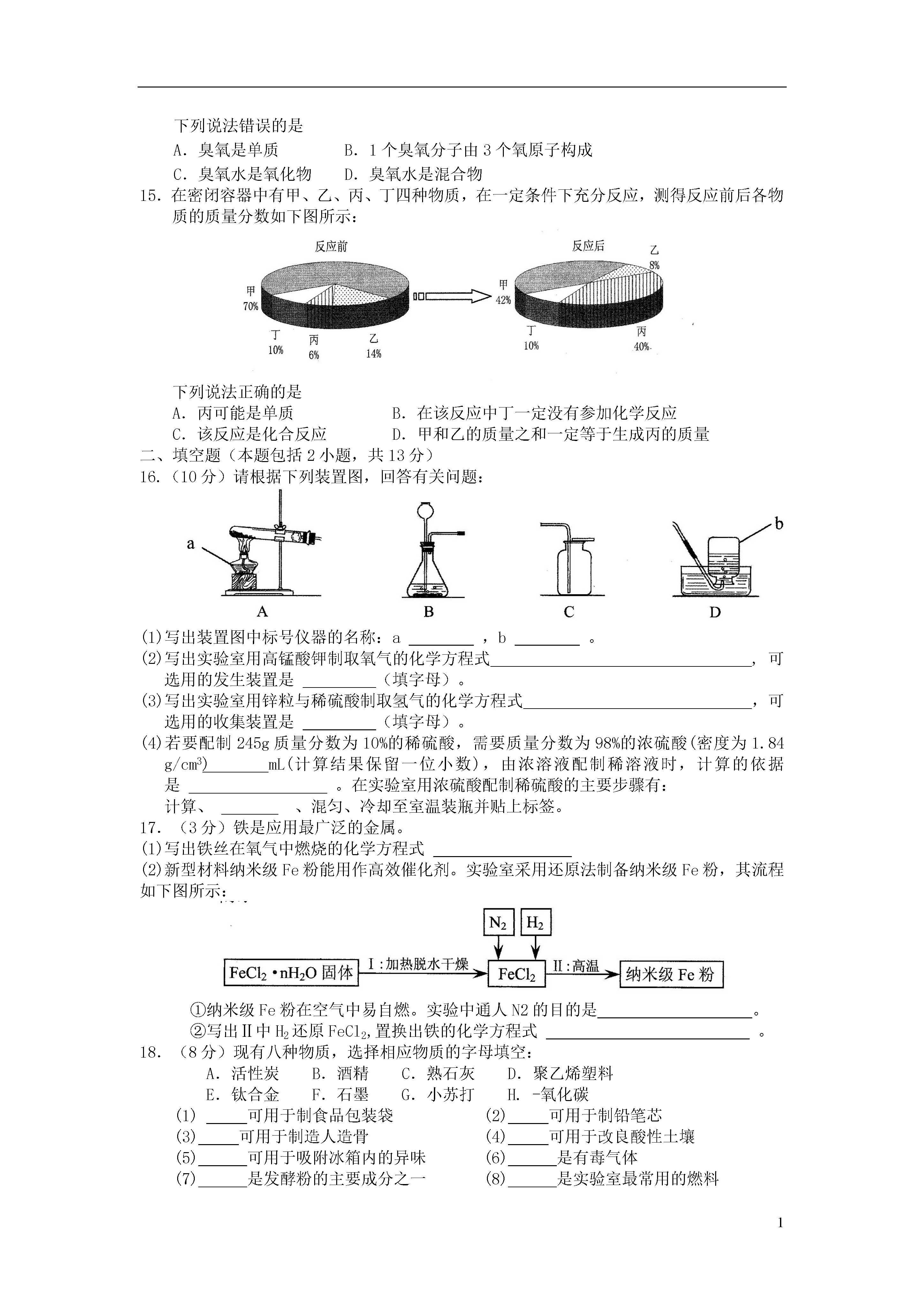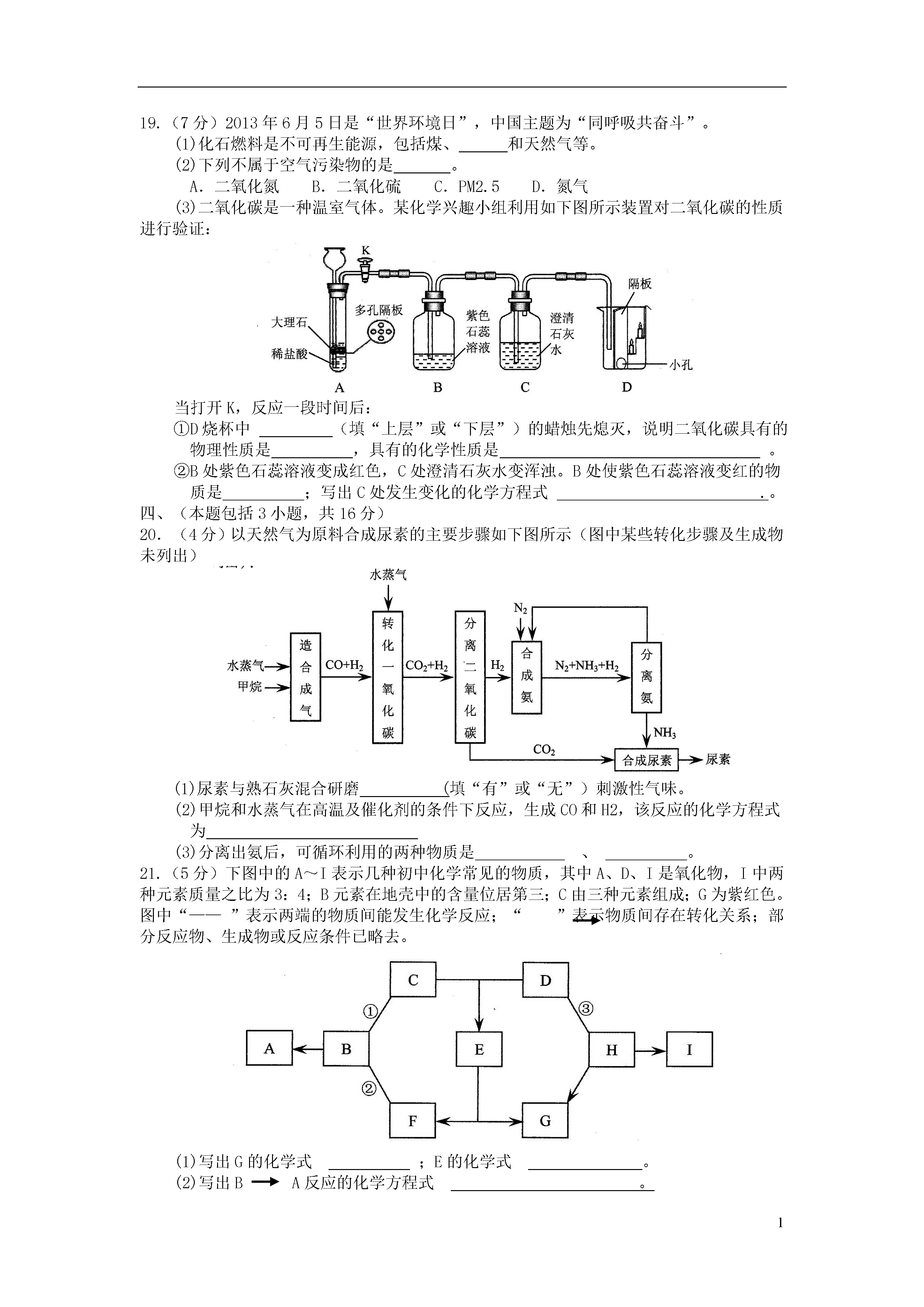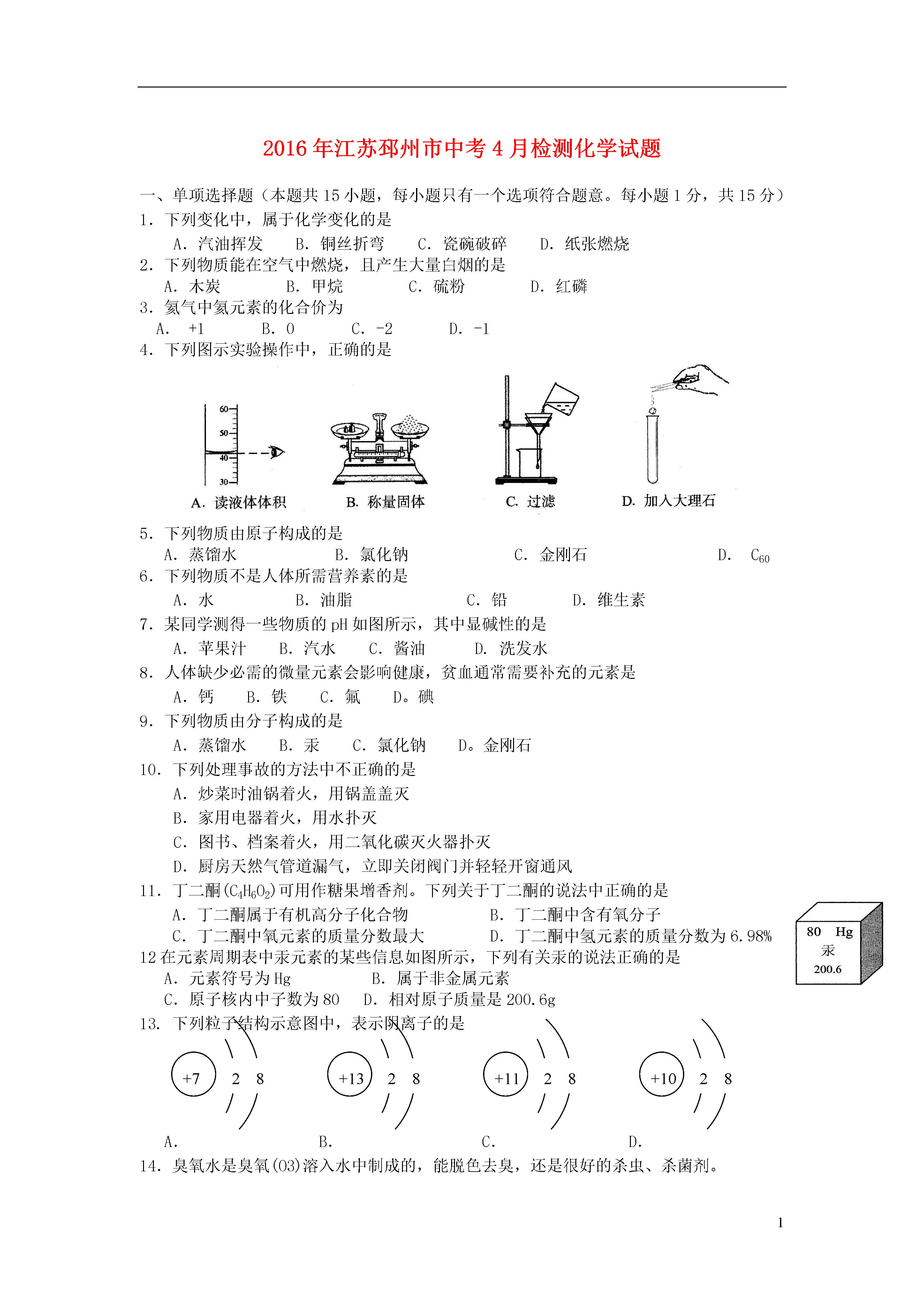 12016年江苏邳州市中考4月检测化学试题一、单项选择题(本题共15小题,每小题只有一个选项符合题意。每小题1分,共15分)1.下列变化中,属于化学变化的是A.汽油挥发B.铜丝折弯C.瓷碗破碎D.纸张燃烧2.下列物质能在空气中燃烧,且产生大量白烟的是A.木炭B.甲烷C.硫粉D.红磷3.氦气中氦元素的化合价为A.+1B.0C.-2D.-14.下列图示实验操作中,正确的是5.下列物质由原子构成的是A.蒸馏水B.氯化钠C.金刚石D.C606.下列物质不是人体所需营养素的是A.水B.油脂C.铅D.维生素7.某同学测得一些物质的pH如图所示,其中显碱性的是A.苹果汁B.汽水C.酱油D.洗发水8.人体缺少必需的微量元素会影响健康,贫血通常需要补充的元素是A.钙B.铁C.氟D。碘9.下列物质由分子构成的是A.蒸馏水B.汞C.氯化钠D。金刚石10.下列处理事故的方法中不正确的是A.炒菜时油锅着火,用锅盖盖灭B.家用电器着火,用水扑灭C.图书、档案着火,用二氧化碳灭火器扑灭D.厨房天然气管道漏气,立即关闭阀门并轻轻开窗通风11.丁二酮(C4H6O2)可用作糖果增香剂。下列关于丁二酮的说法中正确的是A.丁二酮属于有机高分子化合物B.丁二酮中含有氧分子C.丁二酮中氧元素的质量分数最大D.丁二酮中氢元素的质量分数为6.98%12在元素周期表中汞元素的某些信息如图所示,下列有关汞的说法正确的是A.元素符号为HgB.属于非金属元素C.原子核内中子数为80D.相对原子质量是200.6g13.下列粒子结构示意图中,表示阴离子的是+728+1328+1128+1028A.B.C.D.14.臭氧水是臭氧(O3)溶入水中制成的,能脱色去臭,还是很好的杀虫、杀菌剂。下列说法错误的是A.臭氧是单质B.1个臭氧分子由3个氧原子构成C.臭氧水是氧化物D.臭氧水是混合物15.在密闭容器中有甲、乙、丙、丁四种物质,在一定条件下充分反应,测得反应前后各物质的质量分数如下图所示:下列说法正确的是A.丙可能是单质B.在该反应中丁一定没有参加化学反应C.该反应是化合反应D.甲和乙的质量之和一定等于生成丙的质量二、填空题(本题包括2小题,共13分)16.(10分)请根据下列装置图,回答有关问题:(1)写出装置图中标号仪器的名称:a,b。(2)写出实验室用高锰酸钾制取氧气的化学方程式,可选用的发生装置是(填字母)。(3)写出实验室用锌粒与稀硫酸制取氢气的化学方程式,可选用的收集装置是(填字母)。(4)若要配制245g质量分数为10%的稀硫酸,需要质量分数为98%的浓硫酸(密度为1.84g/cm3)mL(计算结果保留一位小数),由浓溶液配制稀溶液时,计算的依据是。在实验室用浓硫酸配制稀硫酸的主要步骤有:计算、、混匀、冷却至室温装瓶并贴上标签。17.(3分)铁是应用最广泛的金属。(1)写出铁丝在氧气中燃烧的化学方程式(2)新型材料纳米级Fe粉能用作高效催化剂。实验室采用还原法制备纳米级Fe粉,其流程如下图所示:①纳米级Fe粉在空气中易自燃。实验中通人N2的目的是。②写出Ⅱ中H2还原FeCl2,置换出铁的化学方程式。18.(8分)现有八种物质,选择相应物质的字母填空:A.活性炭B.酒精C.熟石灰D.聚乙烯塑料E.钛合金F.石墨G.小苏打H.-氧化碳(1)可用于制食品包装袋(2)可用于制铅笔芯(3)可用于制造人造骨(4)可用于改良酸性土壤(5)可用于吸附冰箱内的异味(6)是有毒气体(7)是发酵粉的主要成分之一(8)是实验室最常用的燃料19.(7分)2013年6月5日是“世界环境日”,中国主题为“同呼吸共奋斗”。(1)化石燃料是不可再生能源,包括煤、和天然气等。(2)下列不属于空气污染物的是。A.二氧化氮B.二氧化硫C.PM2.5D.氮气(3)二氧化碳是一种温室气体。某化学兴趣小组利用如下图所示装置对二氧化碳的性质进行验证:当打开K,反应一段时间后:①D烧杯中(填“上层”或“下层”)的蜡烛先熄灭,说明二氧化碳具有的物理性质是,具有的化学性质是。②B处紫色石蕊溶液变成红色,C处澄清石灰水变浑浊。B处使紫色石蕊溶液变红的物质是;写出C处发生变化的化学方程式.。四、(本题包括3小题,共16分)20.(4分)以天然气为原料合成尿素的主要步骤如下图所示(图中某些转化步骤及生成物未列出)(1)尿素与熟石灰混合研磨(填“有”或“无”)刺激性气味。(2)甲烷和水蒸气在高温及催化剂的条件下反应,生成CO和H2,该反应的化学方程式为(3)分离出氨后,可循环利用的两种物质是、。21.(5分)下图中的A~I表示几种初中化学常见的物