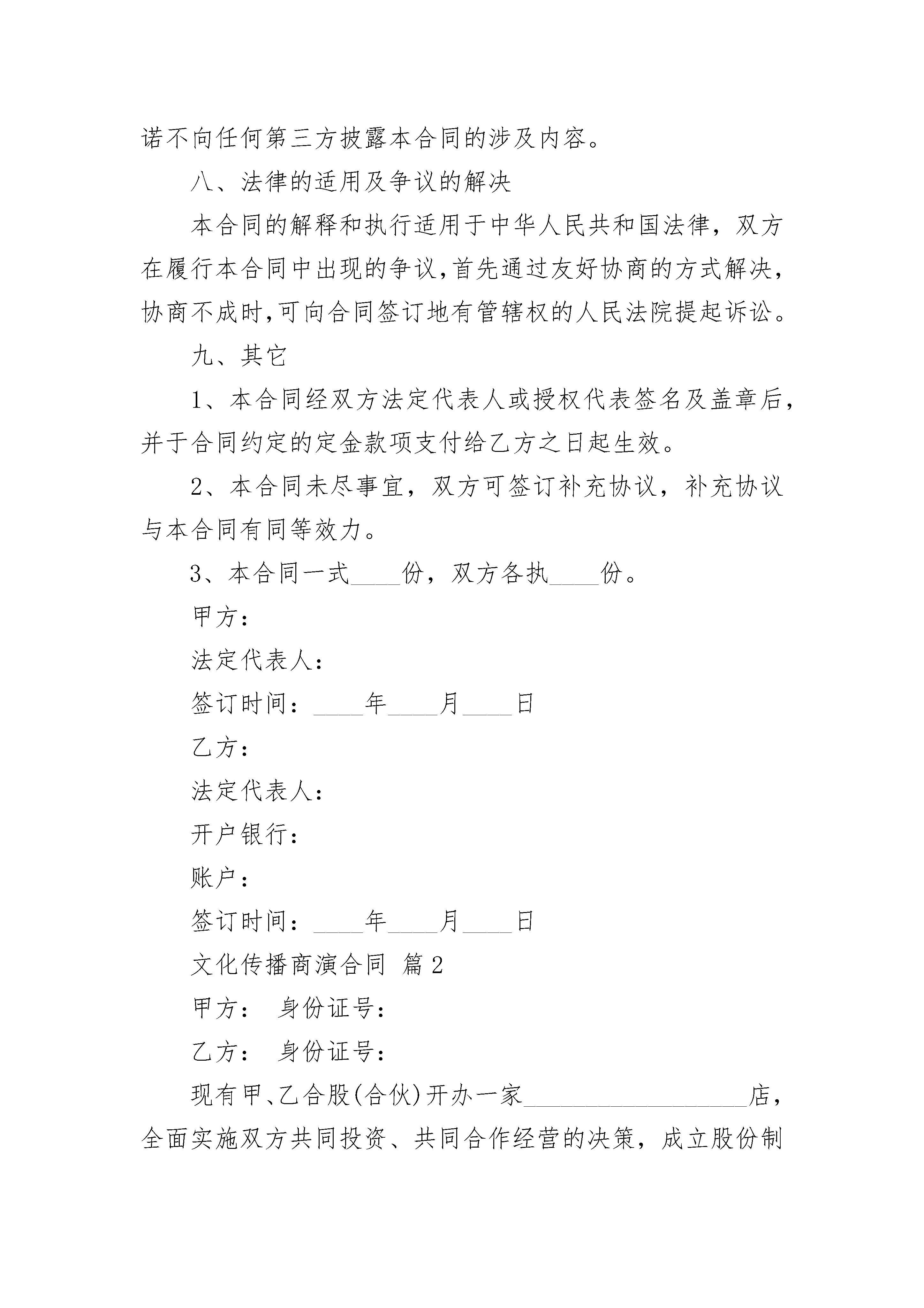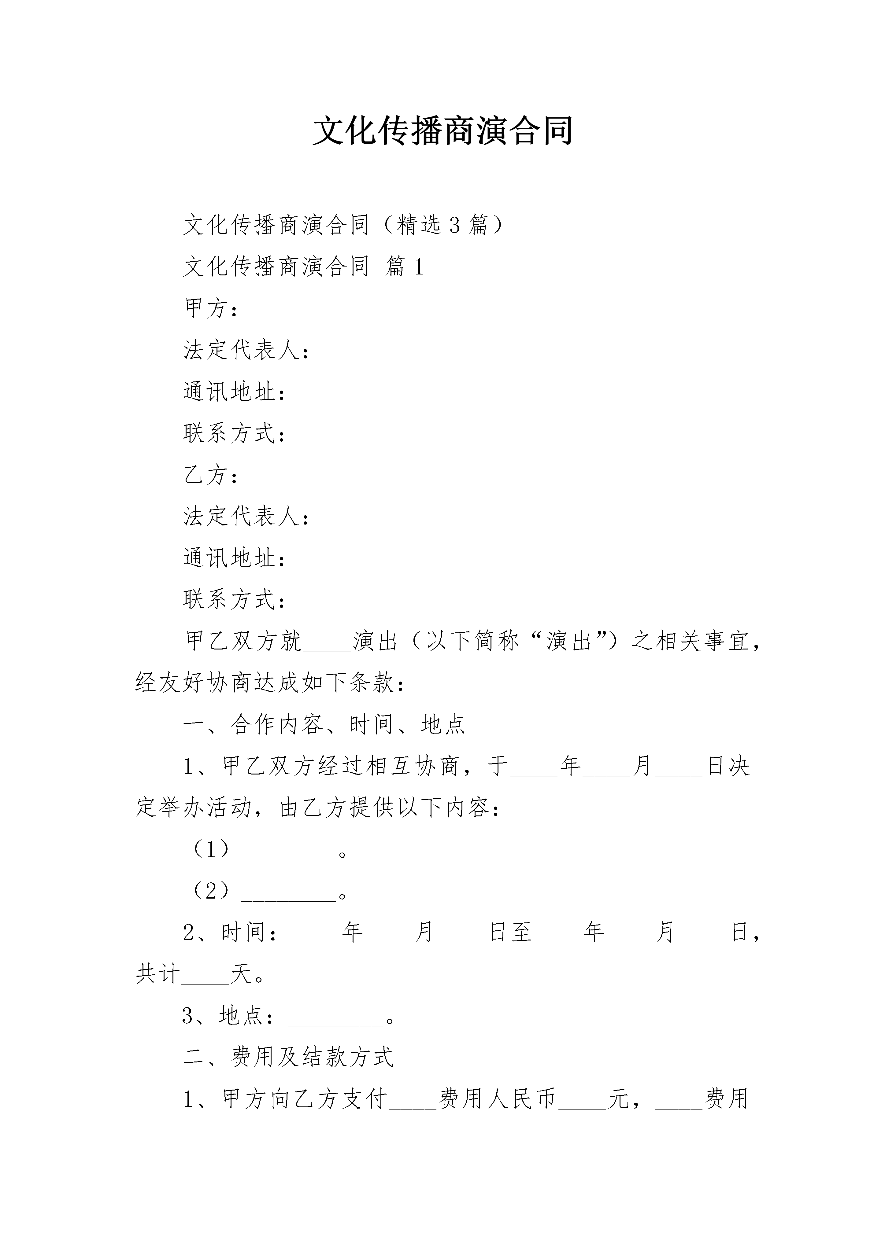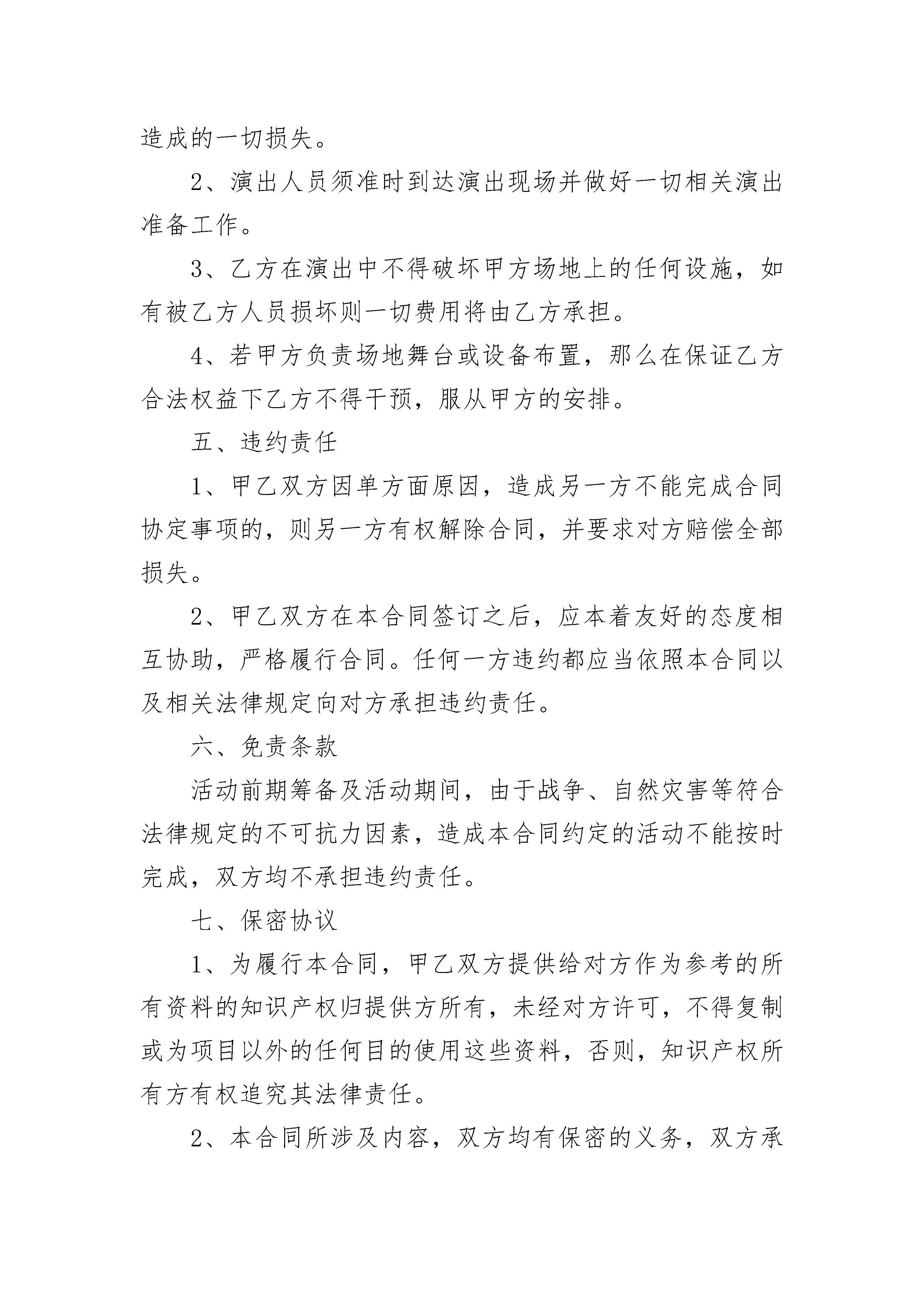 文化传播商演合同文化传播商演合同(精选3篇)文化传播商演合同篇1甲方:法定代表人:通讯地址:联系方式:乙方:法定代表人:通讯地址:联系方式:甲乙双方就____演出(以下简称“演出”)之相关事宜,经友好协商达成如下条款:一、合作内容、时间、地点1、甲乙双方经过相互协商,于____年____月____日决定举办活动,由乙方提供以下内容:(1)________。(2)________。2、时间:____年____月____日至____年____月____日,共计____天。3、地点:________。二、费用及结款方式1、甲方向乙方支付____费用人民币____元,____费用人民币____元,共计人民币____元,不含税金及住宿费。2、如甲方需乙方提供税票则须另外支付____%税金。3、甲乙双方签订本合同之日起____日内,甲方以____方式向乙方支付总额____%的定金。4、剩余____%的款项,甲方于活动结束之日起____日内以____方式结清。5、甲方需提前彩排的,须向乙方支付人员演出费用总额的____%/天。三、甲方责任1、甲方保证提供乙方演出场地时间的正常使用,且保证乙方在使用该场地(包括进、退场,以及排练)、舞台及设备布置期间不受任何非政府部门第三方的任何干扰,若因为此类因素造成乙方直接损失的由甲方负责。2、甲方负责协调有关该场地活动的一切相关部门的报批手续。3、甲方应负责乙方在甲方演出地点的人身安全(仅含演出时的其他人为因素,排练以及私人时间除外)。4、如因甲方原因导致本合同终止或未能如期进行或活动日期有所变动(不可抗力因素除外)、则视甲方违约,并赔偿乙方因此造成的一切损失。四、乙方责任1、乙方需在演出规定日期内进行本合同所规定之项目,若因乙方原因导致活动未能如期进行或活动日期有所变动(不可抗力因素除外),将视作乙方违约处理,并承担因此造成的一切损失。2、演出人员须准时到达演出现场并做好一切相关演出准备工作。3、乙方在演出中不得破坏甲方场地上的任何设施,如有被乙方人员损坏则一切费用将由乙方承担。4、若甲方负责场地舞台或设备布置,那么在保证乙方合法权益下乙方不得干预,服从甲方的安排。五、违约责任1、甲乙双方因单方面原因,造成另一方不能完成合同协定事项的,则另一方有权解除合同,并要求对方赔偿全部损失。2、甲乙双方在本合同签订之后,应本着友好的态度相互协助,严格履行合同。任何一方违约都应当依照本合同以及相关法律规定向对方承担违约责任。六、免责条款活动前期筹备及活动期间,由于战争、自然灾害等符合法律规定的不可抗力因素,造成本合同约定的活动不能按时完成,双方均不承担违约责任。七、保密协议1、为履行本合同,甲乙双方提供给对方作为参考的所有资料的知识产权归提供方所有,未经对方许可,不得复制或为项目以外的任何目的使用这些资料,否则,知识产权所有方有权追究其法律责任。2、本合同所涉及内容,双方均有保密的义务,双方承诺不向任何第三方披露本合同的涉及内容。八、法律的适用及争议的解决本合同的解释和执行适用于中华人民共和国法律,双方在履行本合同中出现的争议,首先通过友好协商的方式解决,协商不成时,可向合同签订地有管辖权的人民法院提起诉讼。九、其它1、本合同经双方法定代表人或授权代表签名及盖章后,并于合同约定的定金款项支付给乙方之日起生效。2、本合同未尽事宜,双方可签订补充协议,补充协议与本合同有同等效力。3、本合同一式____份,双方各执____份。甲方:法定代表人:签订时间:____年____月____日乙方:法定代表人:开户银行:账户:签订时间:____年____月____日文化传播商演合同篇2甲方:身份证号:乙方:身份证号:现有甲、乙合股(合伙)开办一家__________________店,全面实施双方共同投资、共同合作经营的决策,成立股份制合作经营。经双方合伙人平等协商,本着互利合作的原则,签订本协议,以供信守。一、出资的数额:甲方出资________出资的形式________出资的时间__________乙方出资________出资的形式________出资的时间__________二、股权份额及股利分配:双方约定甲方占有店铺股份____%;乙方占有股份____%;甲乙双方以上述占有合作股份的股权份额比例享有分配店铺股利,双方以实际股份入股比例作为分配股利的依据。店铺若产生利润后,甲乙可以提取可分得的利润的方式为:甲方可分得其中利润的____%,乙方可分得其中利润的____%,其中的利润___%,甲方作为现场管理费给以乙方。三、在合作期内的事项约定1、入伙、退伙,出资的转让A入伙:①需承认本合同;②需经甲乙双方同意;③执行合同规定的权利义务。B退伙:①正常经营不允许退伙;②如执意退伙,退伙后以退伙时的财产状况进行结算,不论何种