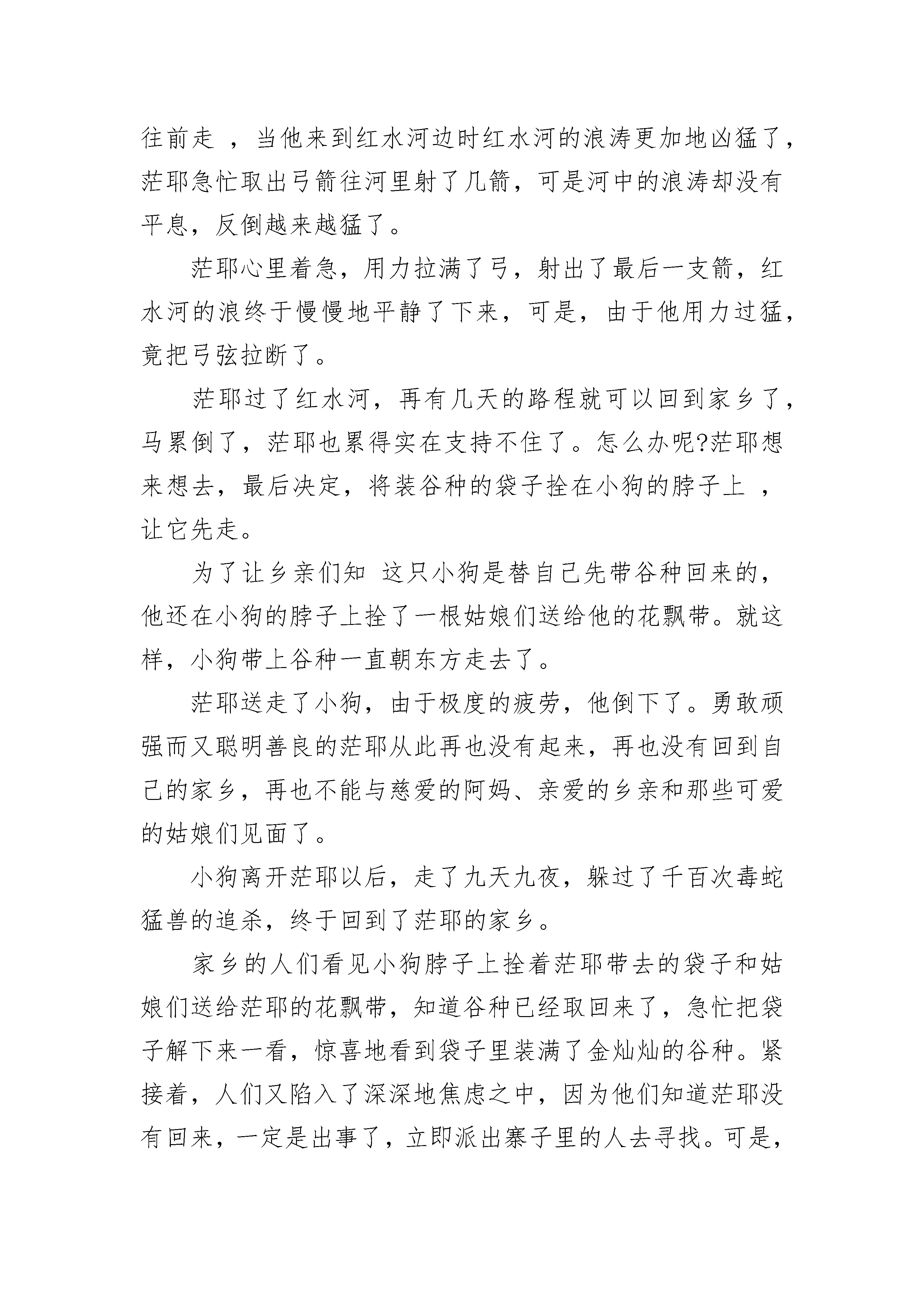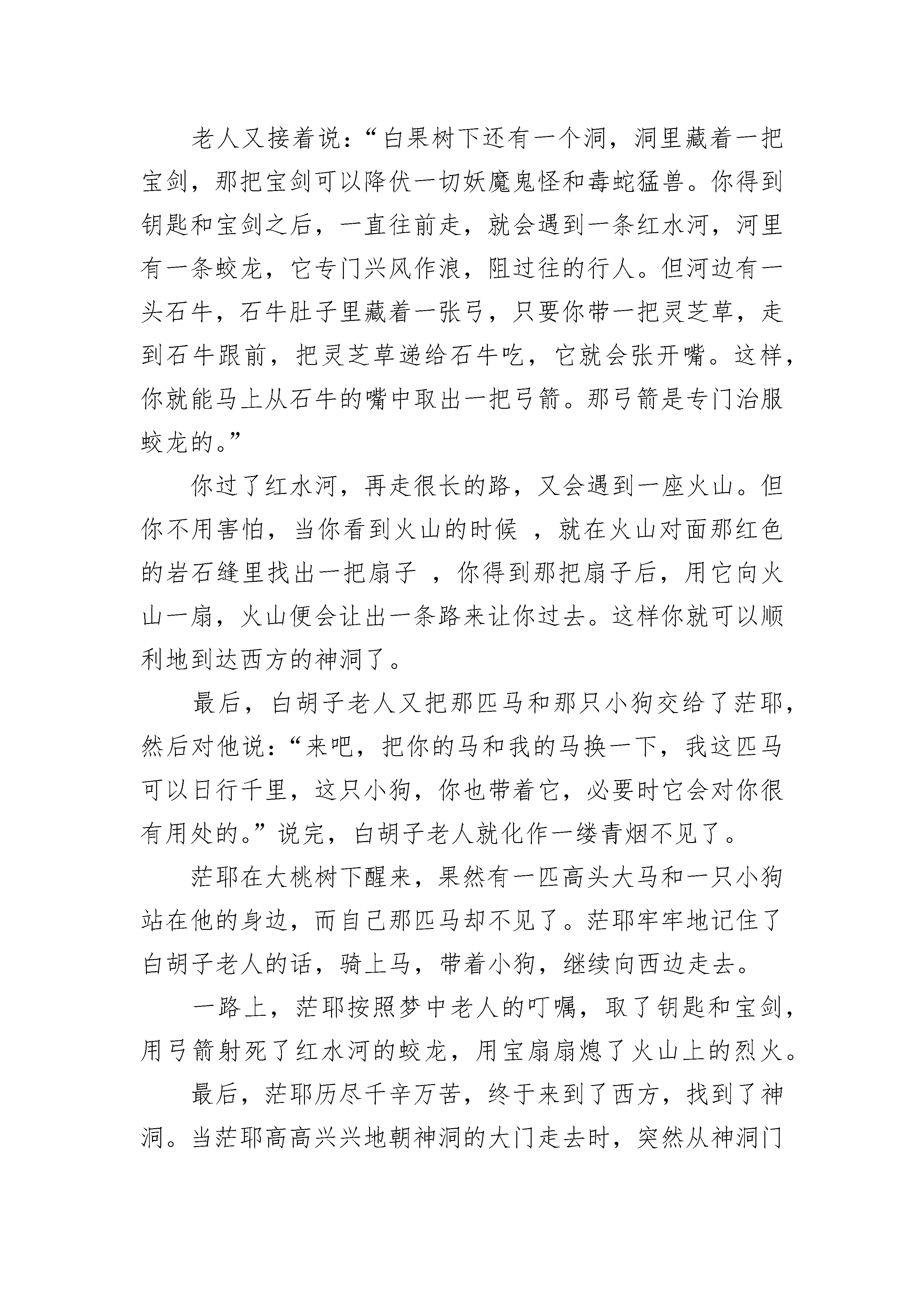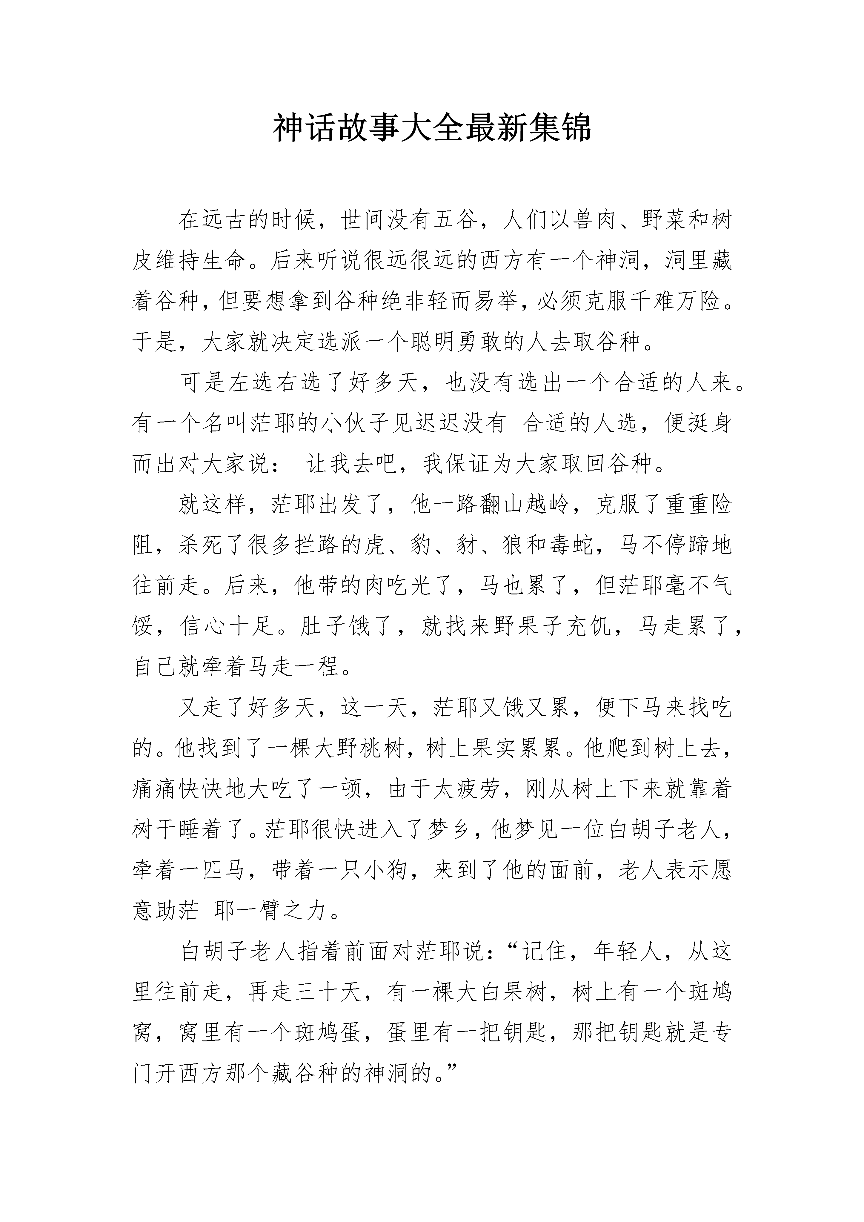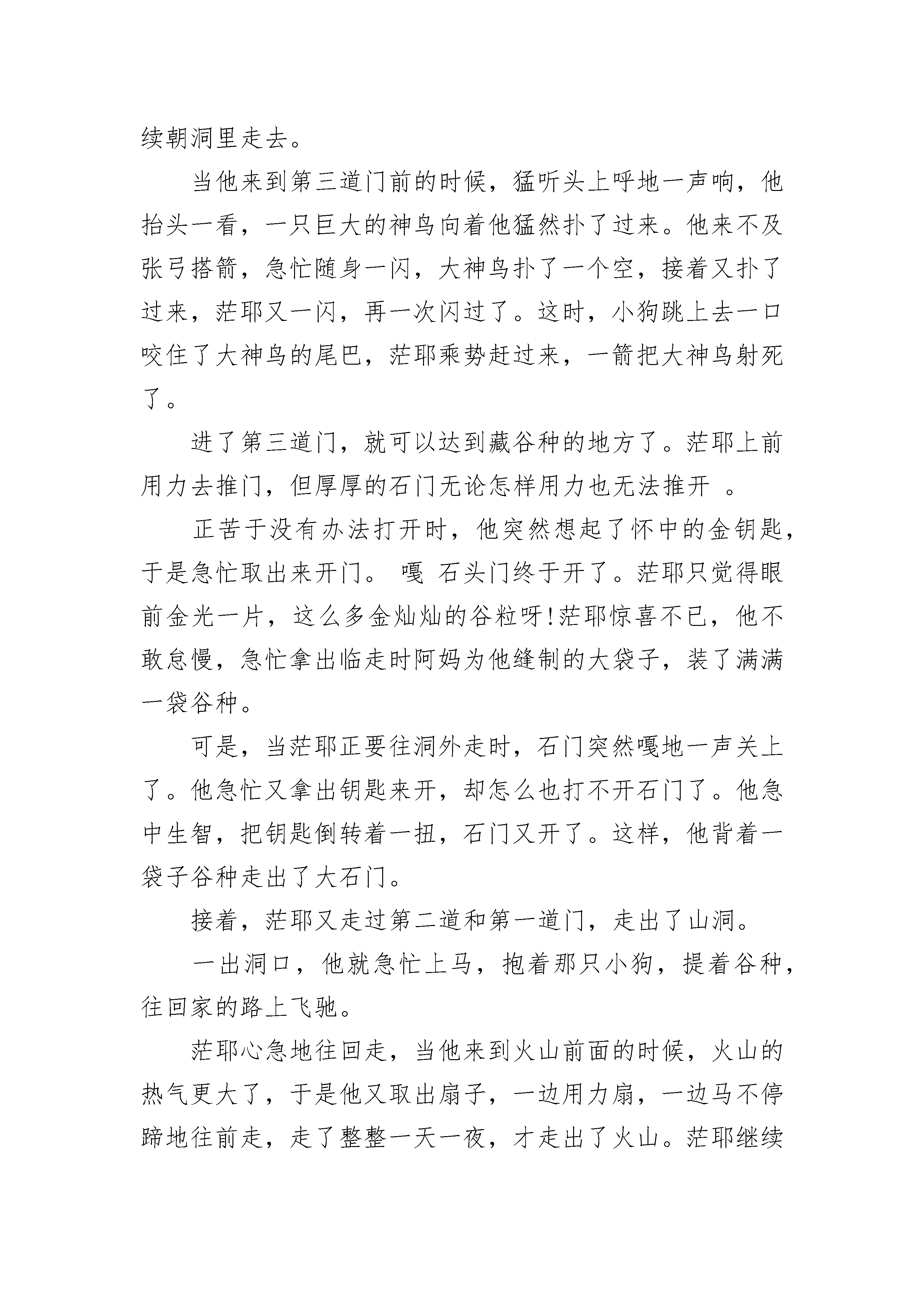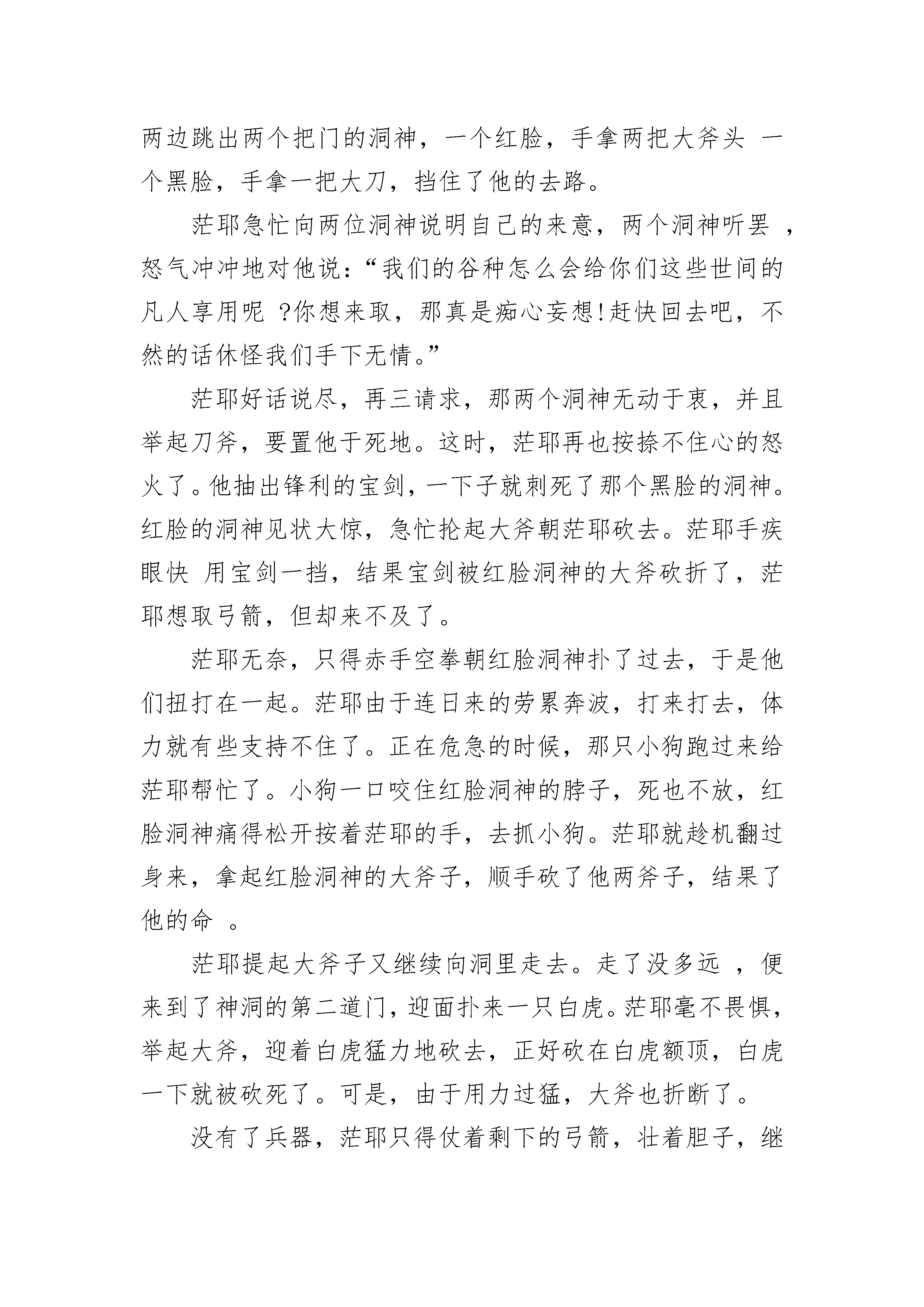 神话故事大全最新集锦在远古的时候,世间没有五谷,人们以兽肉、野菜和树皮维持生命。后来听说很远很远的西方有一个神洞,洞里藏着谷种,但要想拿到谷种绝非轻而易举,必须克服千难万险。于是,大家就决定选派一个聪明勇敢的人去取谷种。可是左选右选了好多天,也没有选出一个合适的人来。有一个名叫茫耶的小伙子见迟迟没有合适的人选,便挺身而出对大家说:让我去吧,我保证为大家取回谷种。就这样,茫耶出发了,他一路翻山越岭,克服了重重险阻,杀死了很多拦路的虎、豹、豺、狼和毒蛇,马不停蹄地往前走。后来,他带的肉吃光了,马也累了,但茫耶毫不气馁,信心十足。肚子饿了,就找来野果子充饥,马走累了,自己就牵着马走一程。又走了好多天,这一天,茫耶又饿又累,便下马来找吃的。他找到了一棵大野桃树,树上果实累累。他爬到树上去,痛痛快快地大吃了一顿,由于太疲劳,刚从树上下来就靠着树干睡着了。茫耶很快进入了梦乡,他梦见一位白胡子老人,牵着一匹马,带着一只小狗,来到了他的面前,老人表示愿意助茫耶一臂之力。白胡子老人指着前面对茫耶说:“记住,年轻人,从这里往前走,再走三十天,有一棵大白果树,树上有一个斑鸠窝,窝里有一个斑鸠蛋,蛋里有一把钥匙,那把钥匙就是专门开西方那个藏谷种的神洞的。”老人又接着说:“白果树下还有一个洞,洞里藏着一把宝剑,那把宝剑可以降伏一切妖魔鬼怪和毒蛇猛兽。你得到钥匙和宝剑之后,一直往前走,就会遇到一条红水河,河里有一条蛟龙,它专门兴风作浪,阻过往的行人。但河边有一头石牛,石牛肚子里藏着一张弓,只要你带一把灵芝草,走到石牛跟前,把灵芝草递给石牛吃,它就会张开嘴。这样,你就能马上从石牛的嘴中取出一把弓箭。那弓箭是专门治服蛟龙的。”你过了红水河,再走很长的路,又会遇到一座火山。但你不用害怕,当你看到火山的时候,就在火山对面那红色的岩石缝里找出一把扇子,你得到那把扇子后,用它向火山一扇,火山便会让出一条路来让你过去。这样你就可以顺利地到达西方的神洞了。最后,白胡子老人又把那匹马和那只小狗交给了茫耶,然后对他说:“来吧,把你的马和我的马换一下,我这匹马可以日行千里,这只小狗,你也带着它,必要时它会对你很有用处的。”说完,白胡子老人就化作一缕青烟不见了。茫耶在大桃树下醒来,果然有一匹高头大马和一只小狗站在他的身边,而自己那匹马却不见了。茫耶牢牢地记住了白胡子老人的话,骑上马,带着小狗,继续向西边走去。一路上,茫耶按照梦中老人的叮嘱,取了钥匙和宝剑,用弓箭射死了红水河的蛟龙,用宝扇扇熄了火山上的烈火。最后,茫耶历尽千辛万苦,终于来到了西方,找到了神洞。当茫耶高高兴兴地朝神洞的大门走去时,突然从神洞门两边跳出两个把门的洞神,一个红脸,手拿两把大斧头一个黑脸,手拿一把大刀,挡住了他的去路。茫耶急忙向两位洞神说明自己的来意,两个洞神听罢,怒气冲冲地对他说:“我们的谷种怎么会给你们这些世间的凡人享用呢?你想来取,那真是痴心妄想!赶快回去吧,不然的话休怪我们手下无情。”茫耶好话说尽,再三请求,那两个洞神无动于衷,并且举起刀斧,要置他于死地。这时,茫耶再也按捺不住心的怒火了。他抽出锋利的宝剑,一下子就刺死了那个黑脸的洞神。红脸的洞神见状大惊,急忙抡起大斧朝茫耶砍去。茫耶手疾眼快用宝剑一挡,结果宝剑被红脸洞神的大斧砍折了,茫耶想取弓箭,但却来不及了。茫耶无奈,只得赤手空拳朝红脸洞神扑了过去,于是他们扭打在一起。茫耶由于连日来的劳累奔波,打来打去,体力就有些支持不住了。正在危急的时候,那只小狗跑过来给茫耶帮忙了。小狗一口咬住红脸洞神的脖子,死也不放,红脸洞神痛得松开按着茫耶的手,去抓小狗。茫耶就趁机翻过身来,拿起红脸洞神的大斧子,顺手砍了他两斧子,结果了他的命。茫耶提起大斧子又继续向洞里走去。走了没多远,便来到了神洞的第二道门,迎面扑来一只白虎。茫耶毫不畏惧,举起大斧,迎着白虎猛力地砍去,正好砍在白虎额顶,白虎一下就被砍死了。可是,由于用力过猛,大斧也折断了。没有了兵器,茫耶只得仗着剩下的弓箭,壮着胆子,继续朝洞里走去。当他来到第三道门前的时候,猛听头上呼地一声响,他抬头一看,一只巨大的神鸟向着他猛然扑了过来。他来不及张弓搭箭,急忙随身一闪,大神鸟扑了一个空,接着又扑了过来,茫耶又一闪,再一次闪过了。这时,小狗跳上去一口咬住了大神鸟的尾巴,茫耶乘势赶过来,一箭把大神鸟射死了。进了第三道门,就可以达到藏谷种的地方了。茫耶上前用力去推门,但厚厚的石门无论怎样用力也无法推开。正苦于没有办法打开时,他突然想起了怀中的金钥匙,于是急忙取出来开门。嘎石头门终于开了。茫耶只觉得眼前金光一片,这么多金灿灿的谷粒呀!茫耶惊喜不已,他不敢怠慢,急忙拿出临走时阿妈为他缝制的大袋子,装了满满一袋谷种。可是,当茫耶正要往洞外走时,石门突然嘎地一声关上了。他急忙又拿出钥匙来开,却怎么也打不开石门了。他急中生智,