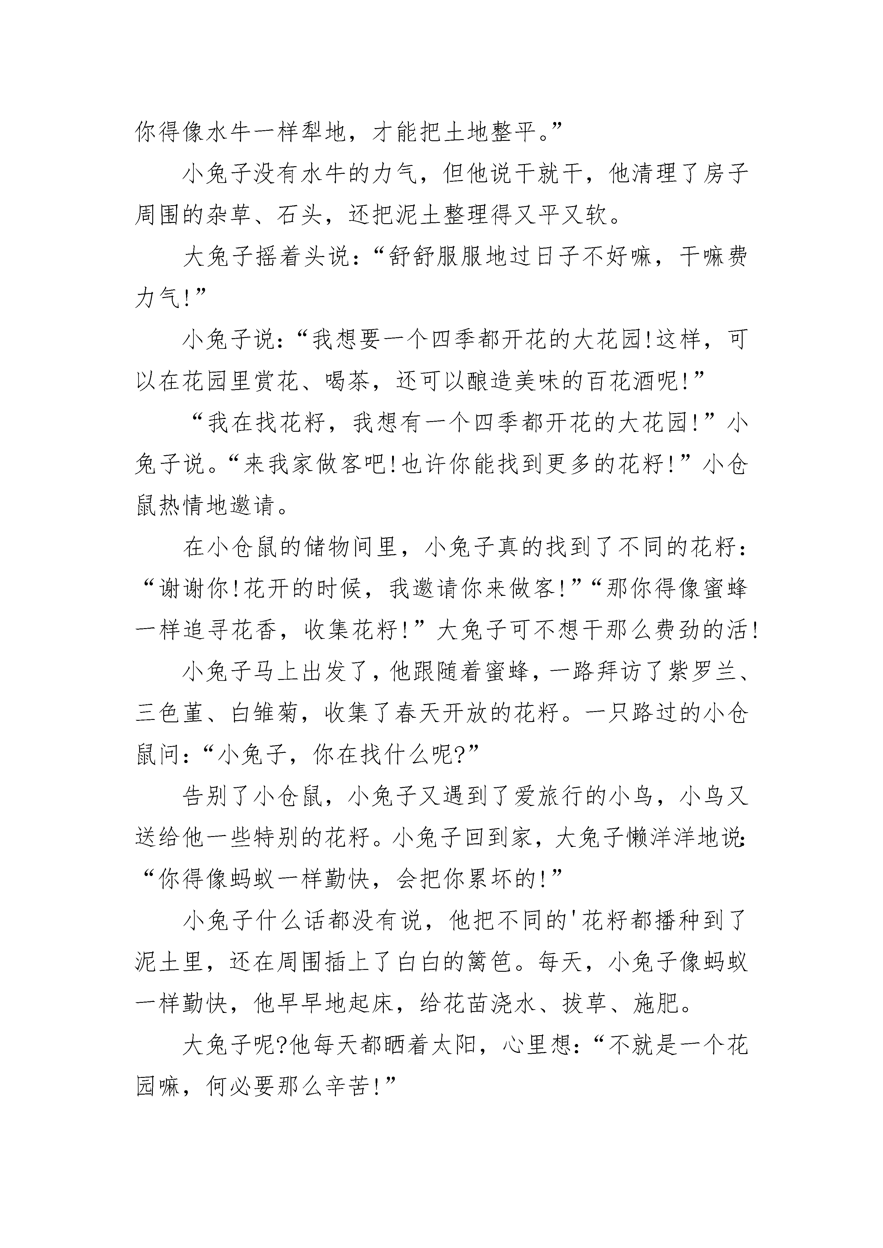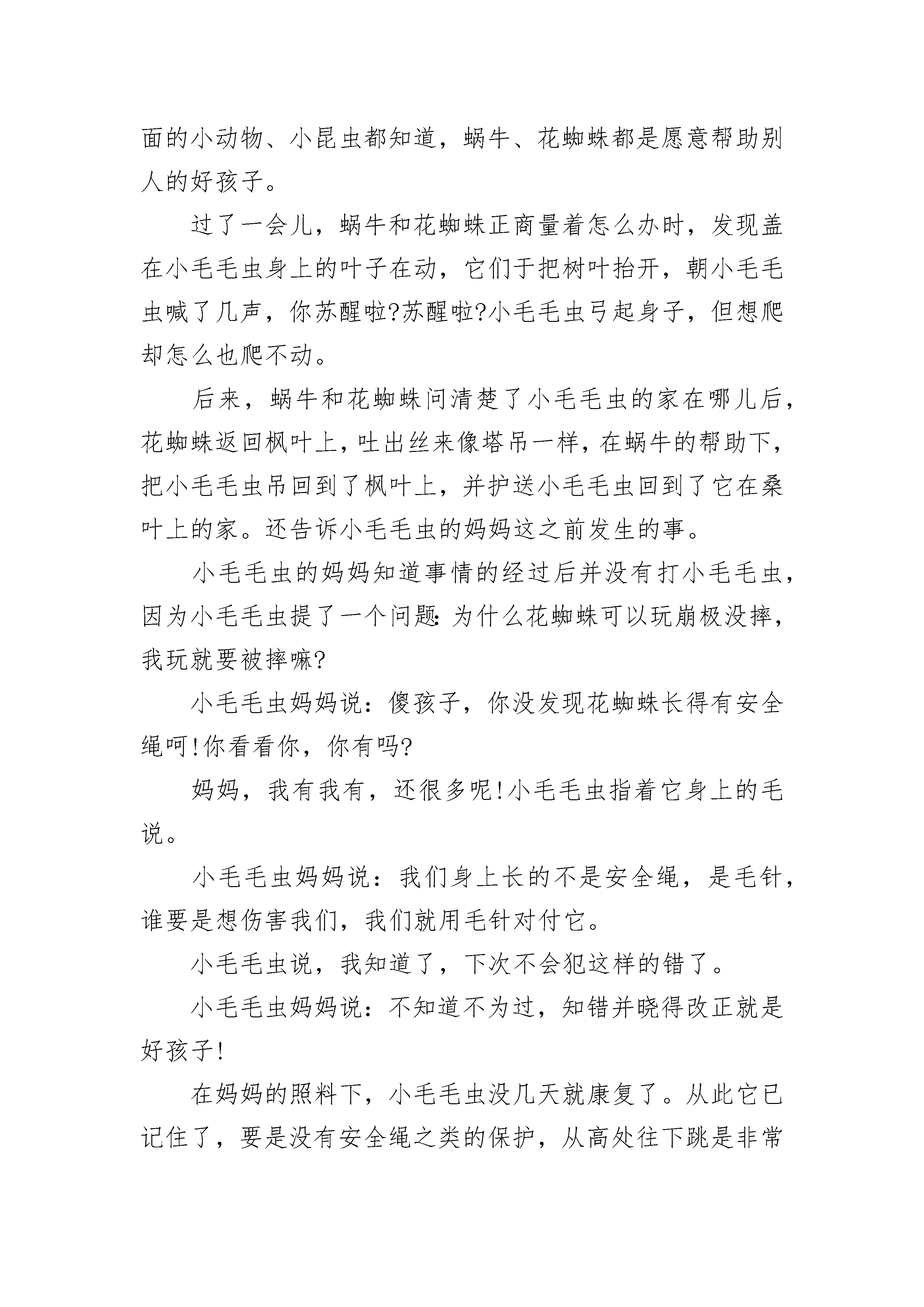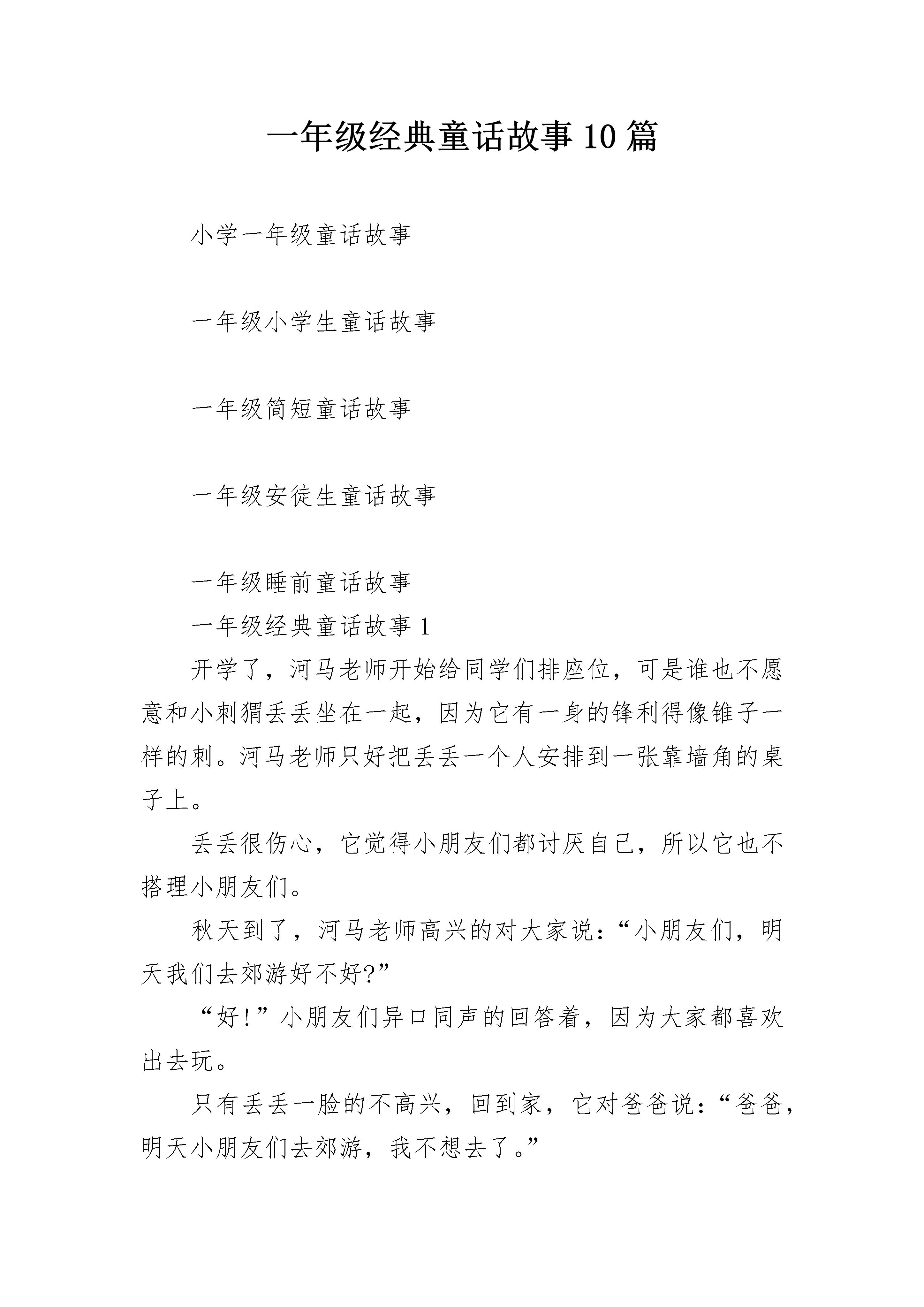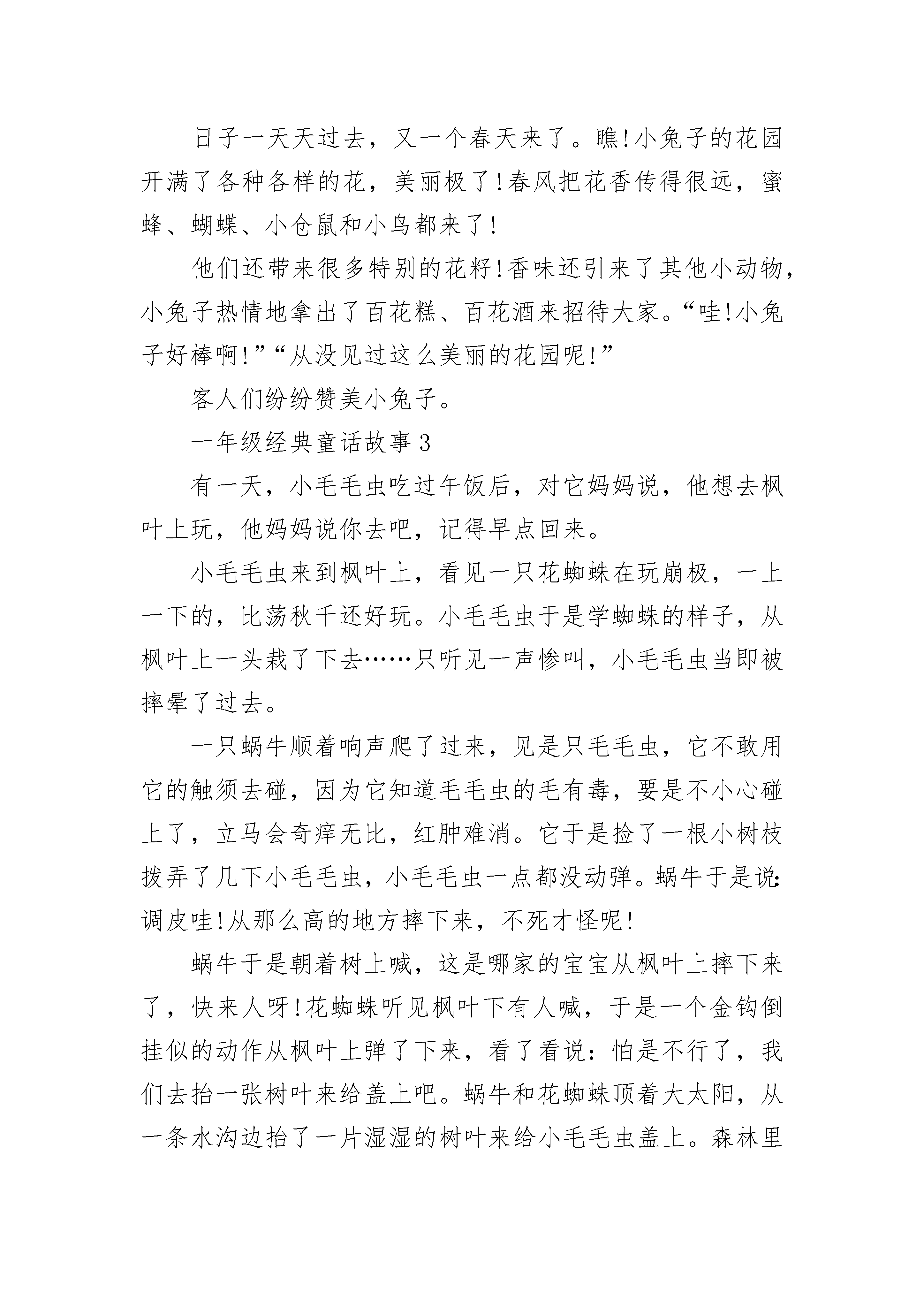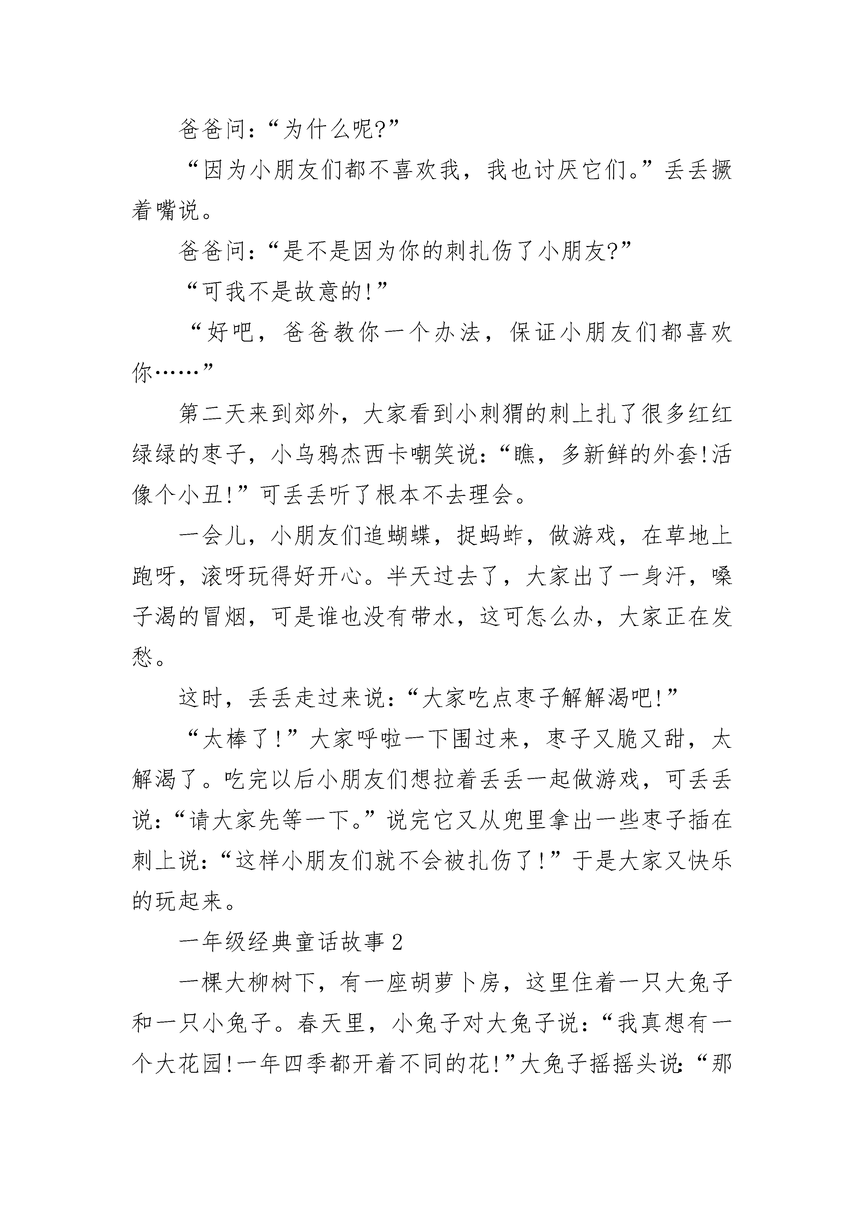 一年级经典童话故事10篇小学一年级童话故事一年级小学生童话故事一年级简短童话故事一年级安徒生童话故事一年级睡前童话故事一年级经典童话故事1开学了,河马老师开始给同学们排座位,可是谁也不愿意和小刺猬丢丢坐在一起,因为它有一身的锋利得像锥子一样的刺。河马老师只好把丢丢一个人安排到一张靠墙角的桌子上。丢丢很伤心,它觉得小朋友们都讨厌自己,所以它也不搭理小朋友们。秋天到了,河马老师高兴的对大家说:“小朋友们,明天我们去郊游好不好?”“好!”小朋友们异口同声的回答着,因为大家都喜欢出去玩。只有丢丢一脸的不高兴,回到家,它对爸爸说:“爸爸,明天小朋友们去郊游,我不想去了。”爸爸问:“为什么呢?”“因为小朋友们都不喜欢我,我也讨厌它们。”丢丢撅着嘴说。爸爸问:“是不是因为你的刺扎伤了小朋友?”“可我不是故意的!”“好吧,爸爸教你一个办法,保证小朋友们都喜欢你……”第二天来到郊外,大家看到小刺猬的刺上扎了很多红红绿绿的枣子,小乌鸦杰西卡嘲笑说:“瞧,多新鲜的外套!活像个小丑!”可丢丢听了根本不去理会。一会儿,小朋友们追蝴蝶,捉蚂蚱,做游戏,在草地上跑呀,滚呀玩得好开心。半天过去了,大家出了一身汗,嗓子渴的冒烟,可是谁也没有带水,这可怎么办,大家正在发愁。这时,丢丢走过来说:“大家吃点枣子解解渴吧!”“太棒了!”大家呼啦一下围过来,枣子又脆又甜,太解渴了。吃完以后小朋友们想拉着丢丢一起做游戏,可丢丢说:“请大家先等一下。”说完它又从兜里拿出一些枣子插在刺上说:“这样小朋友们就不会被扎伤了!”于是大家又快乐的玩起来。一年级经典童话故事2一棵大柳树下,有一座胡萝卜房,这里住着一只大兔子和一只小兔子。春天里,小兔子对大兔子说:“我真想有一个大花园!一年四季都开着不同的花!”大兔子摇摇头说:“那你得像水牛一样犁地,才能把土地整平。”小兔子没有水牛的力气,但他说干就干,他清理了房子周围的杂草、石头,还把泥土整理得又平又软。大兔子摇着头说:“舒舒服服地过日子不好嘛,干嘛费力气!”小兔子说:“我想要一个四季都开花的大花园!这样,可以在花园里赏花、喝茶,还可以酿造美味的百花酒呢!”“我在找花籽,我想有一个四季都开花的大花园!”小兔子说。“来我家做客吧!也许你能找到更多的花籽!”小仓鼠热情地邀请。在小仓鼠的储物间里,小兔子真的找到了不同的花籽:“谢谢你!花开的时候,我邀请你来做客!”“那你得像蜜蜂一样追寻花香,收集花籽!”大兔子可不想干那么费劲的活!小兔子马上出发了,他跟随着蜜蜂,一路拜访了紫罗兰、三色堇、白雏菊,收集了春天开放的花籽。一只路过的小仓鼠问:“小兔子,你在找什么呢?”告别了小仓鼠,小兔子又遇到了爱旅行的小鸟,小鸟又送给他一些特别的花籽。小兔子回到家,大兔子懒洋洋地说:“你得像蚂蚁一样勤快,会把你累坏的!”小兔子什么话都没有说,他把不同的'花籽都播种到了泥土里,还在周围插上了白白的篱笆。每天,小兔子像蚂蚁一样勤快,他早早地起床,给花苗浇水、拔草、施肥。大兔子呢?他每天都晒着太阳,心里想:“不就是一个花园嘛,何必要那么辛苦!”日子一天天过去,又一个春天来了。瞧!小兔子的花园开满了各种各样的花,美丽极了!春风把花香传得很远,蜜蜂、蝴蝶、小仓鼠和小鸟都来了!他们还带来很多特别的花籽!香味还引来了其他小动物,小兔子热情地拿出了百花糕、百花酒来招待大家。“哇!小兔子好棒啊!”“从没见过这么美丽的花园呢!”客人们纷纷赞美小兔子。一年级经典童话故事3有一天,小毛毛虫吃过午饭后,对它妈妈说,他想去枫叶上玩,他妈妈说你去吧,记得早点回来。小毛毛虫来到枫叶上,看见一只花蜘蛛在玩崩极,一上一下的,比荡秋千还好玩。小毛毛虫于是学蜘蛛的样子,从枫叶上一头栽了下去……只听见一声惨叫,小毛毛虫当即被摔晕了过去。一只蜗牛顺着响声爬了过来,见是只毛毛虫,它不敢用它的触须去碰,因为它知道毛毛虫的毛有毒,要是不小心碰上了,立马会奇痒无比,红肿难消。它于是捡了一根小树枝拨弄了几下小毛毛虫,小毛毛虫一点都没动弹。蜗牛于是说:调皮哇!从那么高的地方摔下来,不死才怪呢!蜗牛于是朝着树上喊,这是哪家的宝宝从枫叶上摔下来了,快来人呀!花蜘蛛听见枫叶下有人喊,于是一个金钩倒挂似的动作从枫叶上弹了下来,看了看说:怕是不行了,我们去抬一张树叶来给盖上吧。蜗牛和花蜘蛛顶着大太阳,从一条水沟边抬了一片湿湿的树叶来给小毛毛虫盖上。森林里面的小动物、小昆虫都知道,蜗牛、花蜘蛛都是愿意帮助别人的好孩子。过了一会儿,蜗牛和花蜘蛛正商量着怎么办时,发现盖在小毛毛虫身上的叶子在动,它们于把树叶抬开,朝小毛毛虫喊了几声,你苏醒啦?苏醒啦?小毛毛虫弓起身子,但想爬却怎么也爬不动。后来,蜗牛和花蜘蛛问清楚了小毛毛虫的家在哪儿后,花蜘蛛返回枫叶上,吐出丝来像塔吊一样,在蜗牛的帮助下,把小毛毛虫吊回到了枫叶上,并护送小毛毛虫回