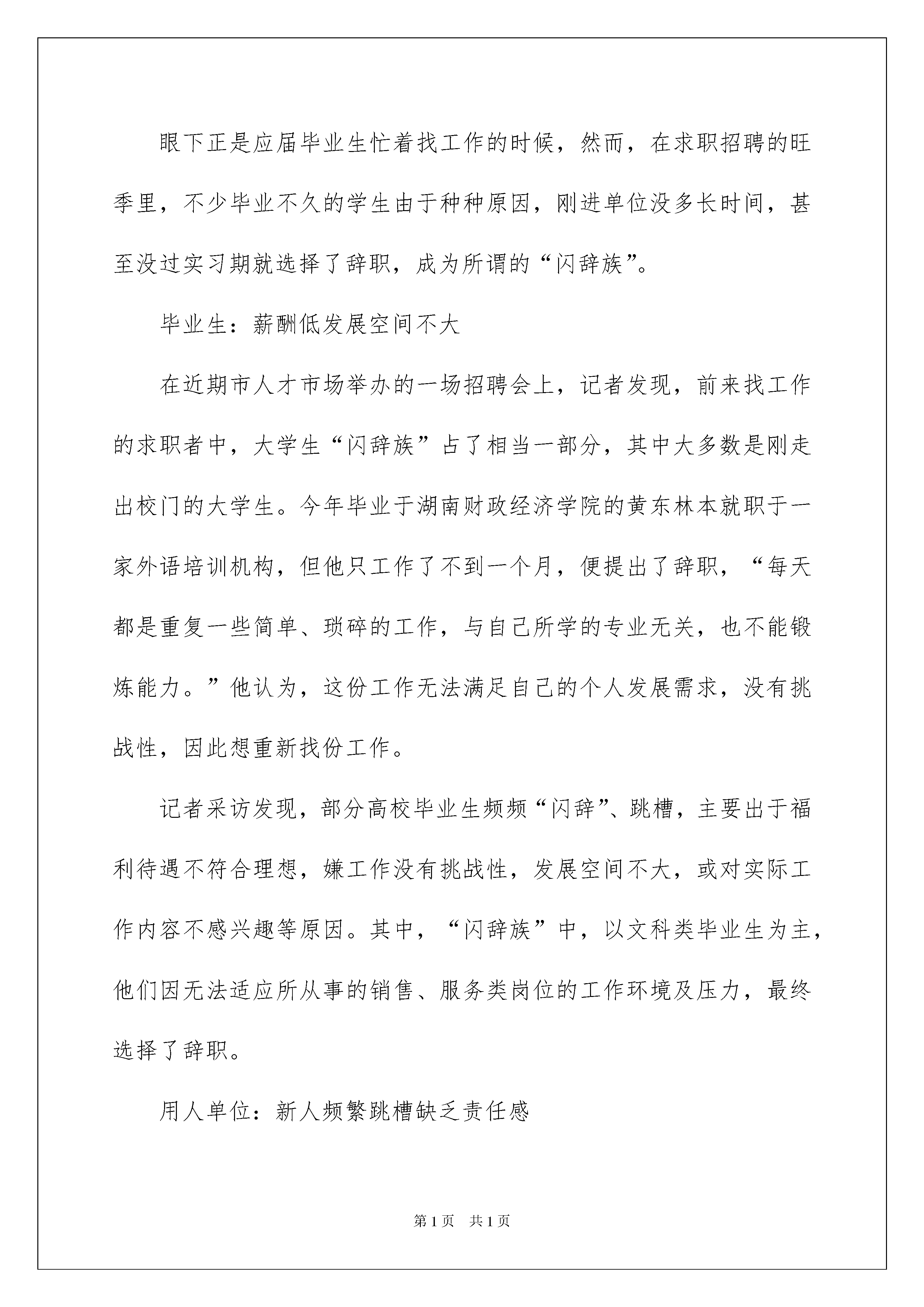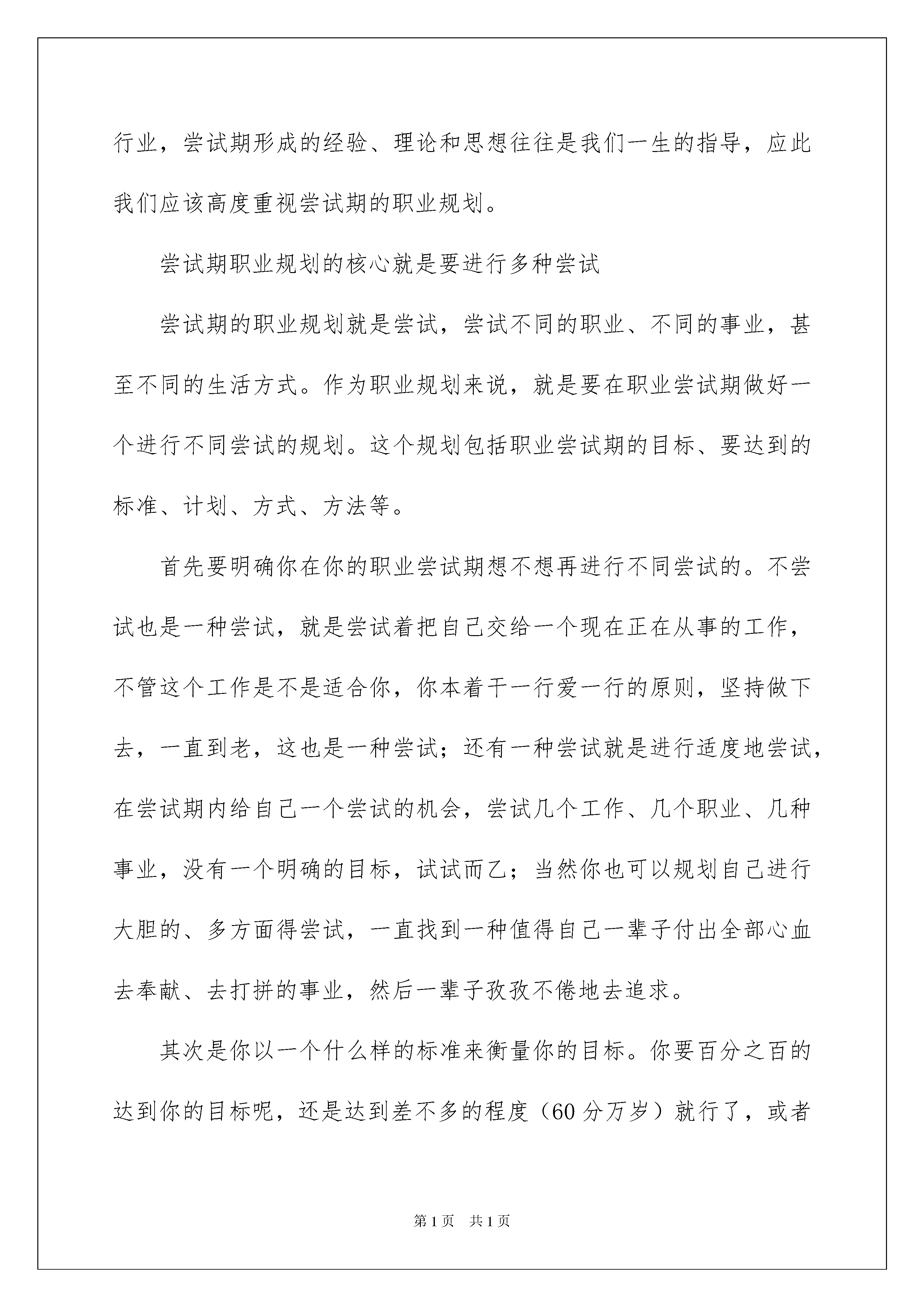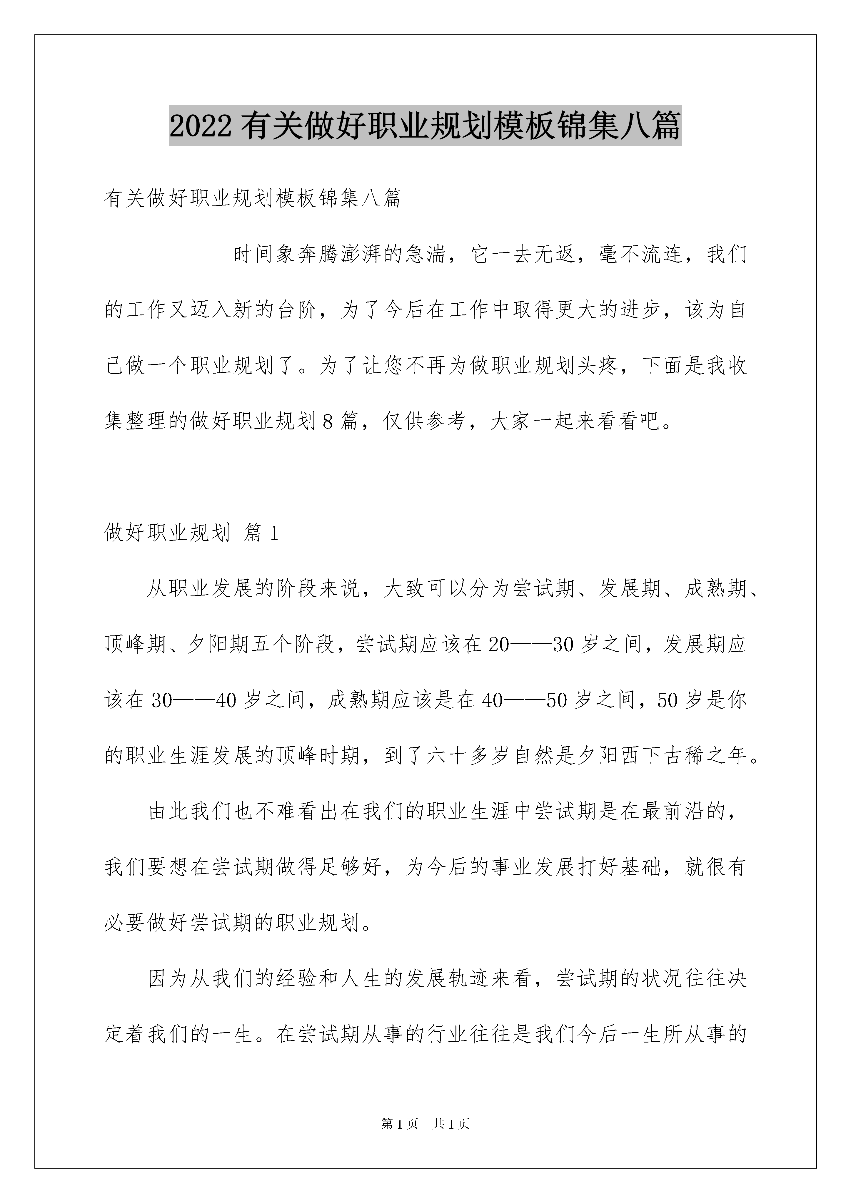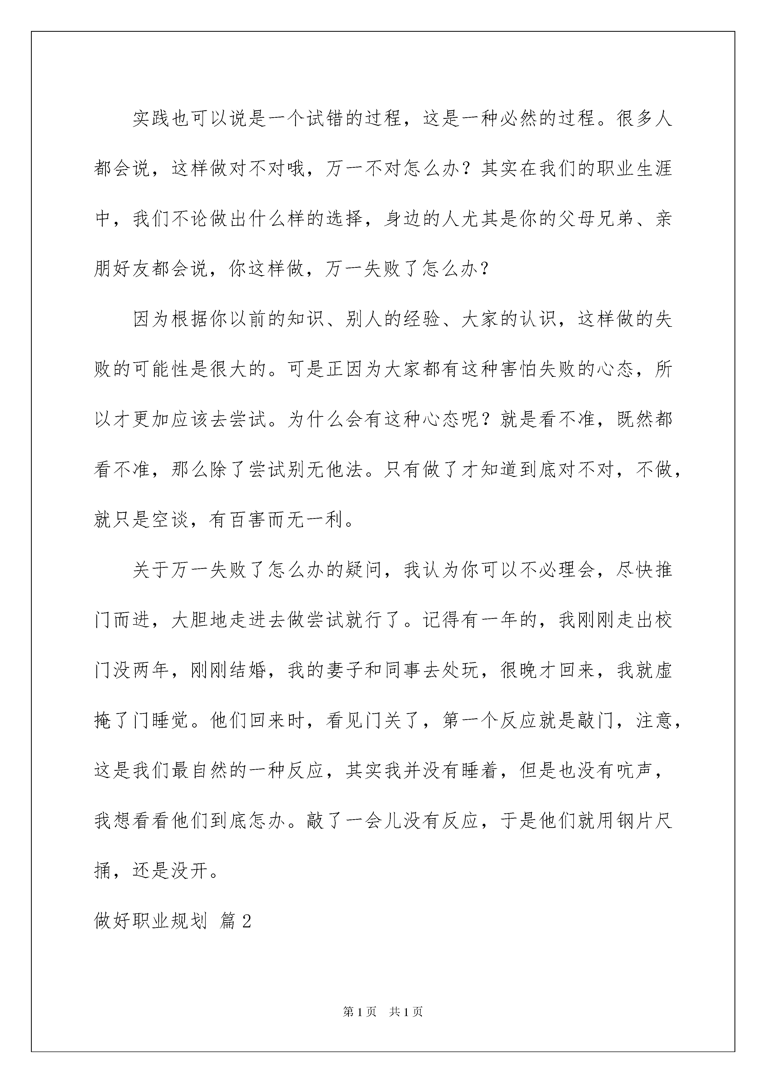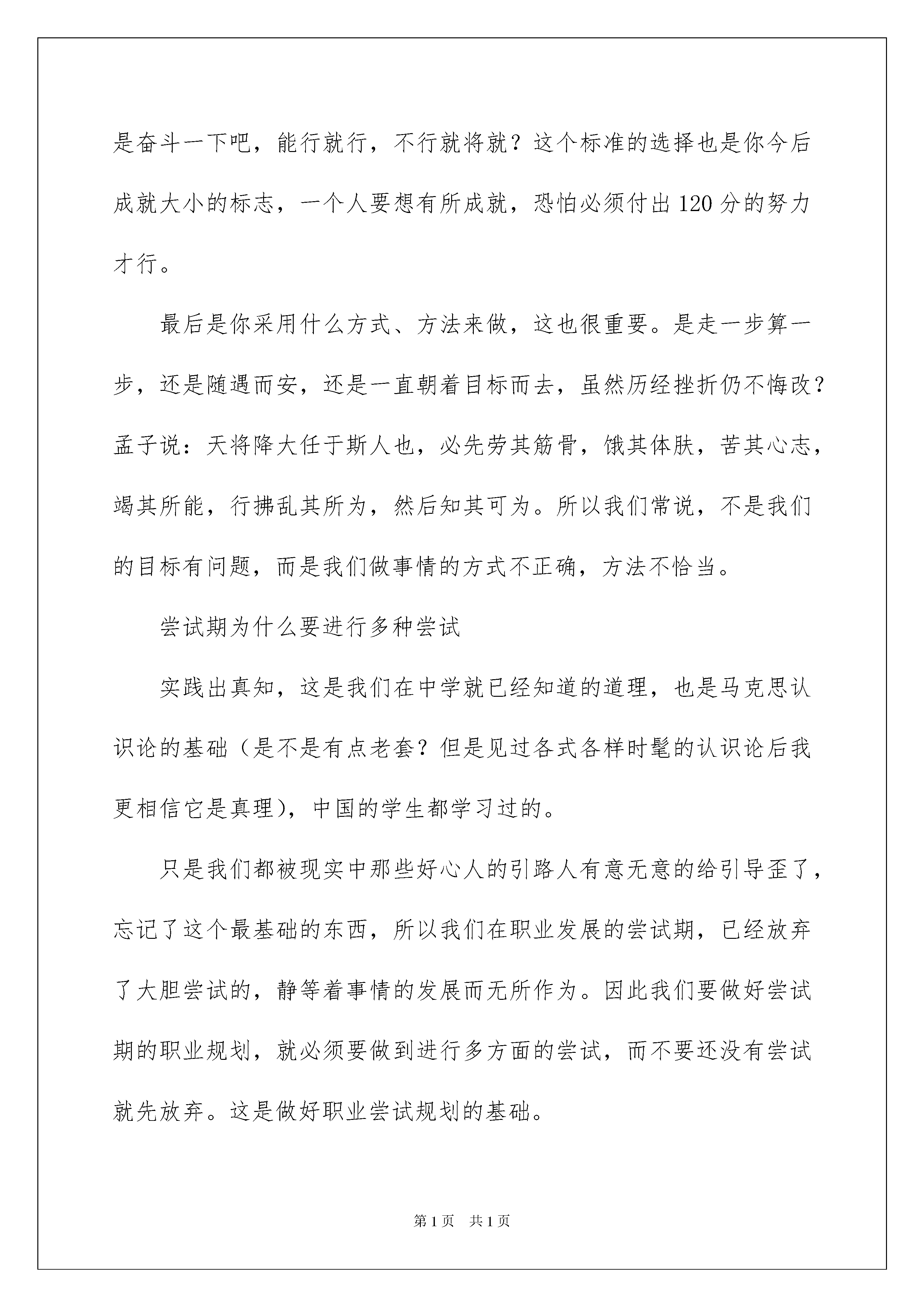 2022有关做好职业规划模板锦集八篇有关做好职业规划模板锦集八篇时间象奔腾澎湃的急湍,它一去无返,毫不流连,我们的工作又迈入新的台阶,为了今后在工作中取得更大的进步,该为自己做一个职业规划了。为了让您不再为做职业规划头疼,下面是我收集整理的做好职业规划8篇,仅供参考,大家一起来看看吧。做好职业规划篇1从职业发展的阶段来说,大致可以分为尝试期、发展期、成熟期、顶峰期、夕阳期五个阶段,尝试期应该在20——30岁之间,发展期应该在30——40岁之间,成熟期应该是在40——50岁之间,50岁是你的职业生涯发展的顶峰时期,到了六十多岁自然是夕阳西下古稀之年。由此我们也不难看出在我们的职业生涯中尝试期是在最前沿的,我们要想在尝试期做得足够好,为今后的事业发展打好基础,就很有必要做好尝试期的职业规划。因为从我们的经验和人生的发展轨迹来看,尝试期的状况往往决定着我们的一生。在尝试期从事的行业往往是我们今后一生所从事的行业,尝试期形成的经验、理论和思想往往是我们一生的指导,应此我们应该高度重视尝试期的职业规划。尝试期职业规划的核心就是要进行多种尝试尝试期的职业规划就是尝试,尝试不同的职业、不同的事业,甚至不同的生活方式。作为职业规划来说,就是要在职业尝试期做好一个进行不同尝试的规划。这个规划包括职业尝试期的目标、要达到的标准、计划、方式、方法等。首先要明确你在你的职业尝试期想不想再进行不同尝试的。不尝试也是一种尝试,就是尝试着把自己交给一个现在正在从事的工作,不管这个工作是不是适合你,你本着干一行爱一行的原则,坚持做下去,一直到老,这也是一种尝试;还有一种尝试就是进行适度地尝试,在尝试期内给自己一个尝试的机会,尝试几个工作、几个职业、几种事业,没有一个明确的目标,试试而乙;当然你也可以规划自己进行大胆的、多方面得尝试,一直找到一种值得自己一辈子付出全部心血去奉献、去打拼的事业,然后一辈子孜孜不倦地去追求。其次是你以一个什么样的标准来衡量你的目标。你要百分之百的达到你的目标呢,还是达到差不多的程度(60分万岁)就行了,或者是奋斗一下吧,能行就行,不行就将就?这个标准的选择也是你今后成就大小的标志,一个人要想有所成就,恐怕必须付出120分的努力才行。最后是你采用什么方式、方法来做,这也很重要。是走一步算一步,还是随遇而安,还是一直朝着目标而去,虽然历经挫折仍不悔改?孟子说:天将降大任于斯人也,必先劳其筋骨,饿其体肤,苦其心志,竭其所能,行拂乱其所为,然后知其可为。所以我们常说,不是我们的目标有问题,而是我们做事情的方式不正确,方法不恰当。尝试期为什么要进行多种尝试实践出真知,这是我们在中学就已经知道的道理,也是马克思认识论的基础(是不是有点老套?但是见过各式各样时髦的认识论后我更相信它是真理),中国的学生都学习过的。只是我们都被现实中那些好心人的引路人有意无意的给引导歪了,忘记了这个最基础的东西,所以我们在职业发展的尝试期,已经放弃了大胆尝试的,静等着事情的发展而无所作为。因此我们要做好尝试期的职业规划,就必须要做到进行多方面的尝试,而不要还没有尝试就先放弃。这是做好职业尝试规划的基础。实践也可以说是一个试错的过程,这是一种必然的过程。很多人都会说,这样做对不对哦,万一不对怎么办?其实在我们的职业生涯中,我们不论做出什么样的选择,身边的人尤其是你的父母兄弟、亲朋好友都会说,你这样做,万一失败了怎么办?因为根据你以前的知识、别人的经验、大家的认识,这样做的失败的可能性是很大的。可是正因为大家都有这种害怕失败的心态,所以才更加应该去尝试。为什么会有这种心态呢?就是看不准,既然都看不准,那么除了尝试别无他法。只有做了才知道到底对不对,不做,就只是空谈,有百害而无一利。关于万一失败了怎么办的疑问,我认为你可以不必理会,尽快推门而进,大胆地走进去做尝试就行了。记得有一年的,我刚刚走出校门没两年,刚刚结婚,我的妻子和同事去处玩,很晚才回来,我就虚掩了门睡觉。他们回来时,看见门关了,第一个反应就是敲门,注意,这是我们最自然的一种反应,其实我并没有睡着,但是也没有吭声,我想看看他们到底怎办。敲了一会儿没有反应,于是他们就用钢片尺捅,还是没开。做好职业规划篇2眼下正是应届毕业生忙着找工作的时候,然而,在求职招聘的旺季里,不少毕业不久的学生由于种种原因,刚进单位没多长时间,甚至没过实习期就选择了辞职,成为所谓的“闪辞族”。毕业生:薪酬低发展空间不大在近期市人才市场举办的一场招聘会上,记者发现,前来找工作的求职者中,大学生“闪辞族”占了相当一部分,其中大多数是刚走出校门的大学生。今年毕业于湖南财政经济学院的黄东林本