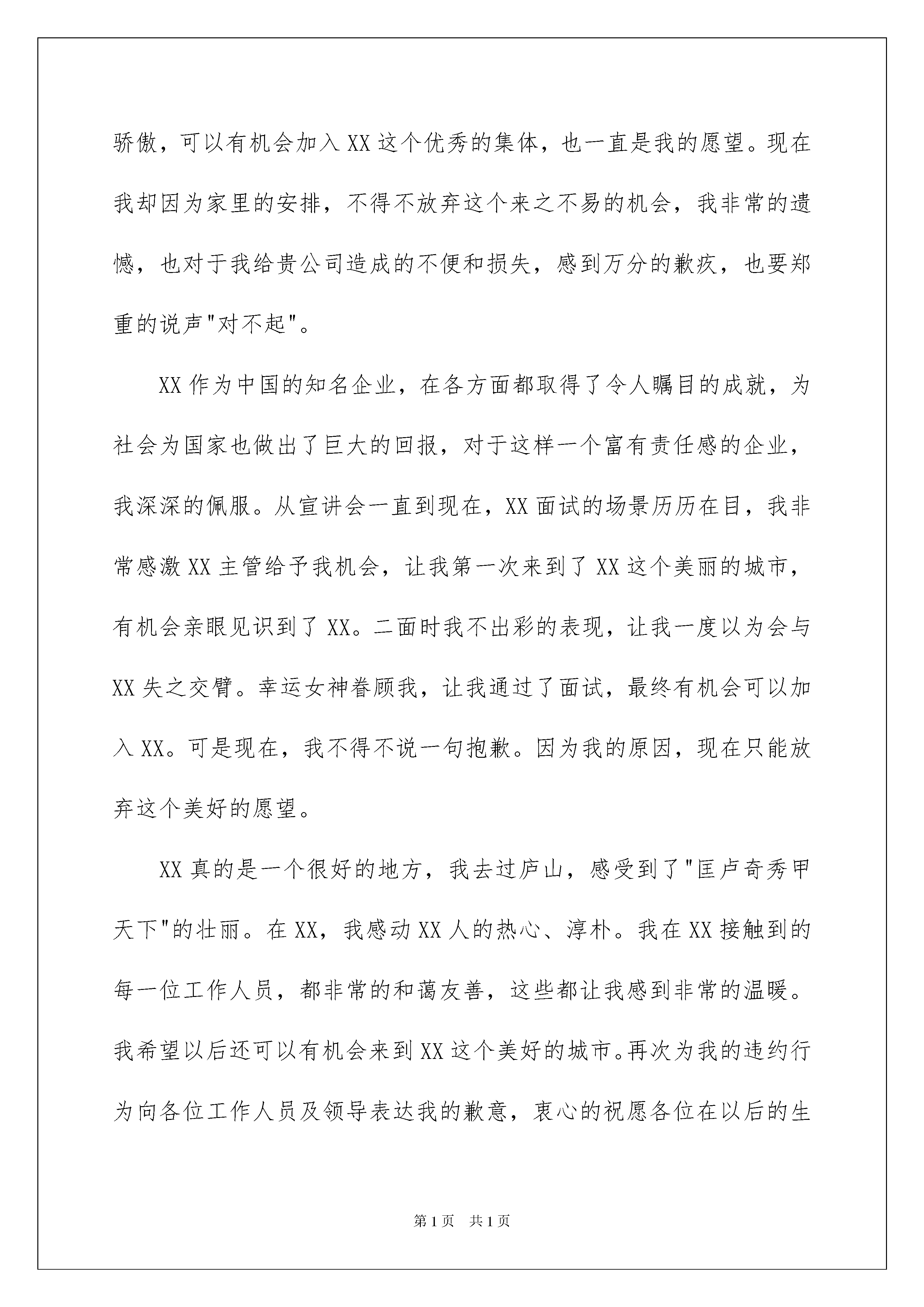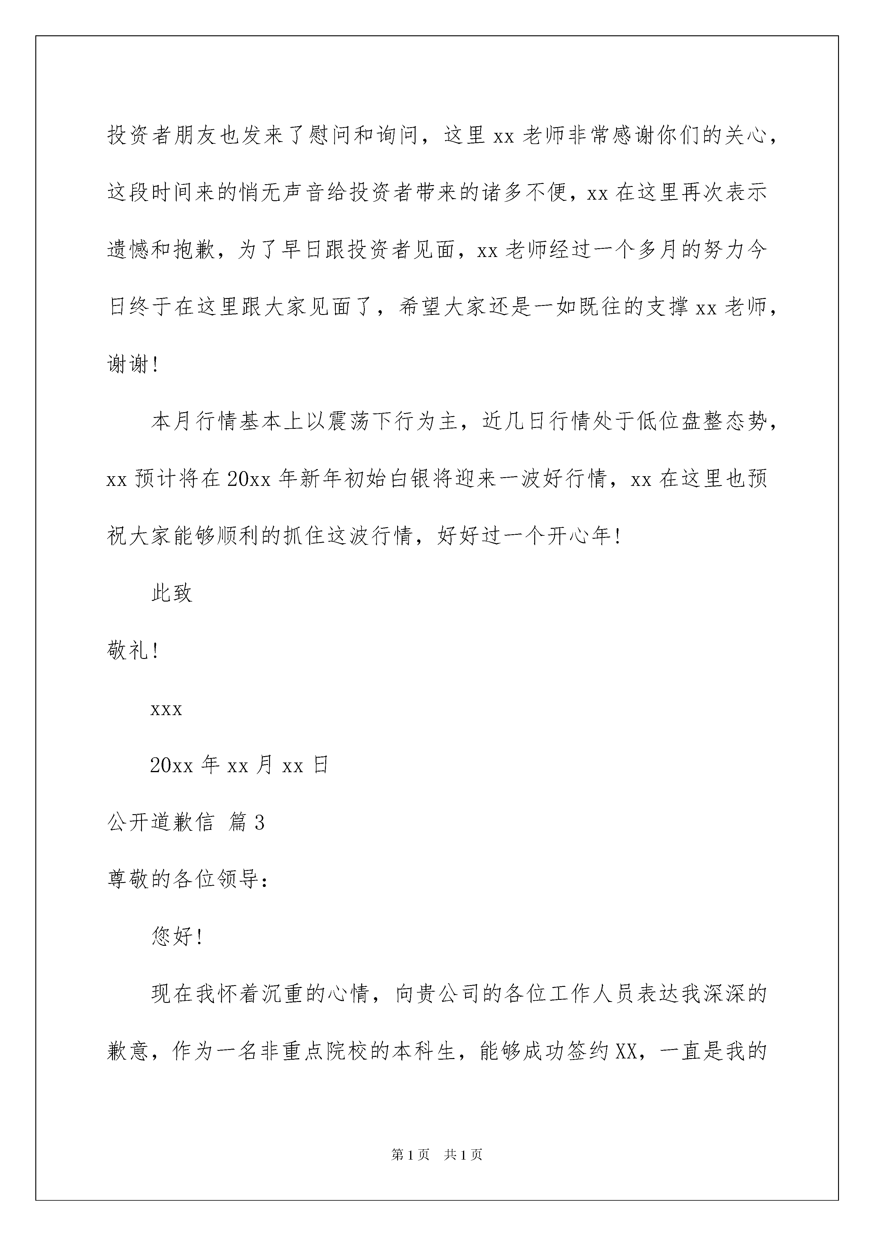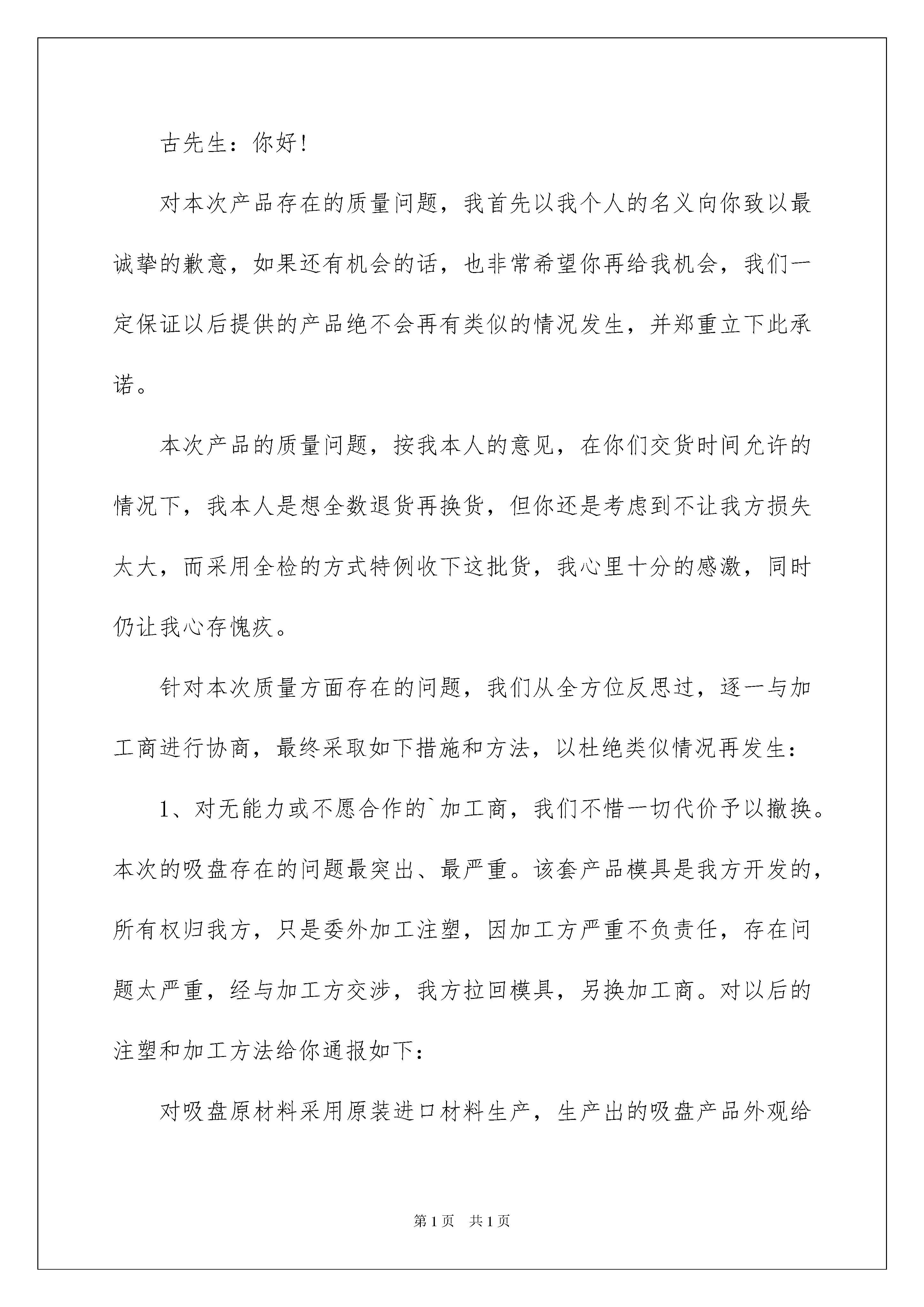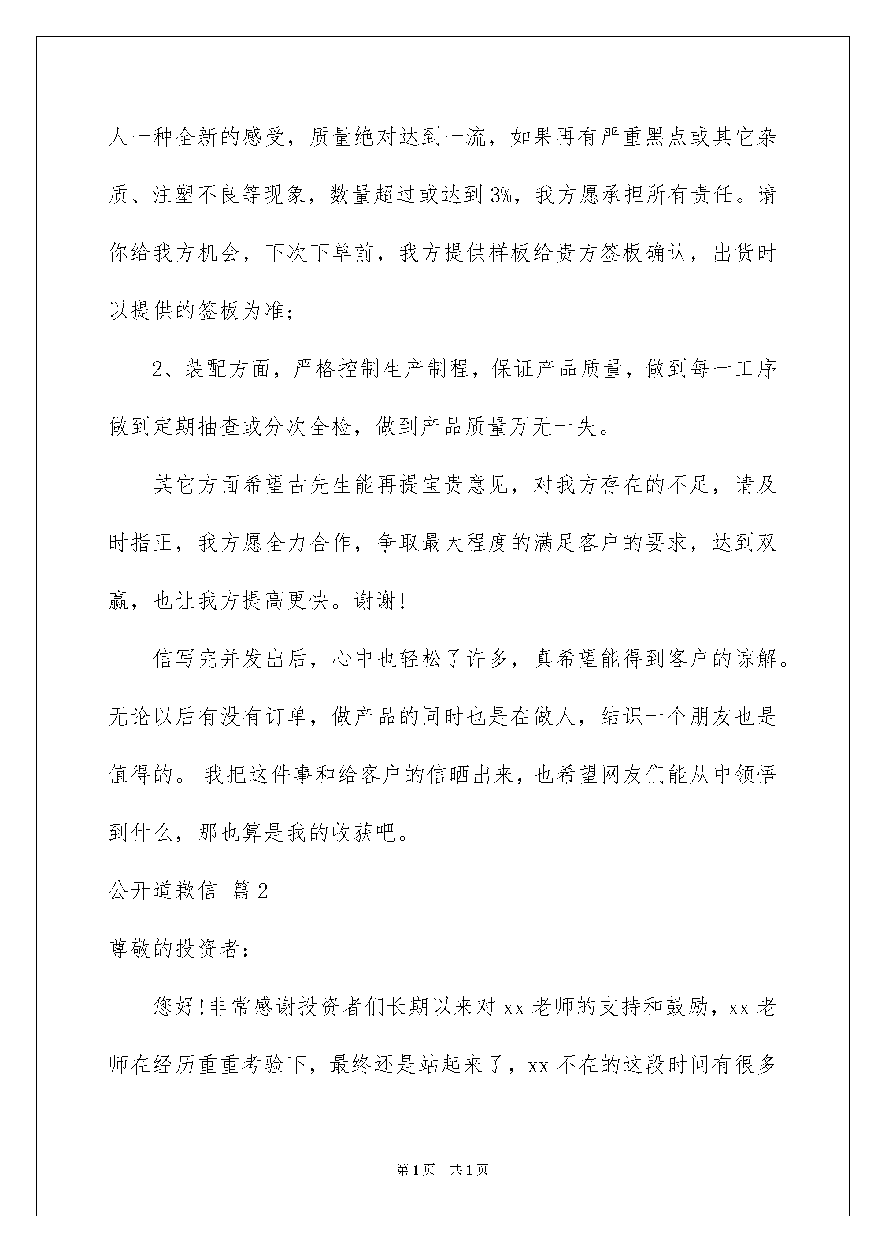 2022有关公开道歉信三篇有关公开道歉信三篇在我们平凡的日常里,道歉信的使用越来越广泛,道歉信可以帮助我们表示遗憾和歉意,表明愿意补救的愿望,提出建议或安排。相信许多人会觉得道歉信很难写吧,下面是我为大家整理的公开道歉信3篇,希望能够帮助到大家。公开道歉信篇1现在生意难做,拉到一个客户更应该倍加珍惜才对。而帮我的一个加工商(事实上就是我相处二十多年的朋友)却不为我珍惜这样的机会,或者说有一种故意拿我的订单来给我发难的意味,竟不把产品的质量当一回事,因此把我这个一向视信誉为生命的人拉到一个非常尴尬的境地,叫我好生为难。丢掉客户是小事,一个人的信誉一旦失去,想挽回却不是一朝一夕的时间就能做到的。心中的愧疚无以言说,第一要务就是给客户写信,表明自己的态度。以下是我给客户的致歉信和承诺,希望以此能减轻我心中的负担。信的内容全文照录如下:古先生:你好!对本次产品存在的质量问题,我首先以我个人的名义向你致以最诚挚的歉意,如果还有机会的话,也非常希望你再给我机会,我们一定保证以后提供的产品绝不会再有类似的情况发生,并郑重立下此承诺。本次产品的质量问题,按我本人的意见,在你们交货时间允许的情况下,我本人是想全数退货再换货,但你还是考虑到不让我方损失太大,而采用全检的方式特例收下这批货,我心里十分的感激,同时仍让我心存愧疚。针对本次质量方面存在的问题,我们从全方位反思过,逐一与加工商进行协商,最终采取如下措施和方法,以杜绝类似情况再发生:1、对无能力或不愿合作的`加工商,我们不惜一切代价予以撤换。本次的吸盘存在的问题最突出、最严重。该套产品模具是我方开发的,所有权归我方,只是委外加工注塑,因加工方严重不负责任,存在问题太严重,经与加工方交涉,我方拉回模具,另换加工商。对以后的注塑和加工方法给你通报如下:对吸盘原材料采用原装进口材料生产,生产出的吸盘产品外观给人一种全新的感受,质量绝对达到一流,如果再有严重黑点或其它杂质、注塑不良等现象,数量超过或达到3%,我方愿承担所有责任。请你给我方机会,下次下单前,我方提供样板给贵方签板确认,出货时以提供的签板为准;2、装配方面,严格控制生产制程,保证产品质量,做到每一工序做到定期抽查或分次全检,做到产品质量万无一失。其它方面希望古先生能再提宝贵意见,对我方存在的不足,请及时指正,我方愿全力合作,争取最大程度的满足客户的要求,达到双赢,也让我方提高更快。谢谢!信写完并发出后,心中也轻松了许多,真希望能得到客户的谅解。无论以后有没有订单,做产品的同时也是在做人,结识一个朋友也是值得的。我把这件事和给客户的信晒出来,也希望网友们能从中领悟到什么,那也算是我的收获吧。公开道歉信篇2尊敬的投资者:您好!非常感谢投资者们长期以来对xx老师的支持和鼓励,xx老师在经历重重考验下,最终还是站起来了,xx不在的这段时间有很多投资者朋友也发来了慰问和询问,这里xx老师非常感谢你们的关心,这段时间来的悄无声音给投资者带来的诸多不便,xx在这里再次表示遗憾和抱歉,为了早日跟投资者见面,xx老师经过一个多月的努力今日终于在这里跟大家见面了,希望大家还是一如既往的支撑xx老师,谢谢!本月行情基本上以震荡下行为主,近几日行情处于低位盘整态势,xx预计将在20xx年新年初始白银将迎来一波好行情,xx在这里也预祝大家能够顺利的抓住这波行情,好好过一个开心年!此致敬礼!xxx20xx年xx月xx日公开道歉信篇3尊敬的各位领导:您好!现在我怀着沉重的心情,向贵公司的各位工作人员表达我深深的歉意,作为一名非重点院校的本科生,能够成功签约XX,一直是我的骄傲,可以有机会加入XX这个优秀的集体,也一直是我的愿望。现在我却因为家里的安排,不得不放弃这个来之不易的机会,我非常的遗憾,也对于我给贵公司造成的不便和损失,感到万分的歉疚,也要郑重的说声"对不起"。XX作为中国的知名企业,在各方面都取得了令人瞩目的成就,为社会为国家也做出了巨大的回报,对于这样一个富有责任感的企业,我深深的佩服。从宣讲会一直到现在,XX面试的场景历历在目,我非常感激XX主管给予我机会,让我第一次来到了XX这个美丽的城市,有机会亲眼见识到了XX。二面时我不出彩的表现,让我一度以为会与XX失之交臂。幸运女神眷顾我,让我通过了面试,最终有机会可以加入XX。可是现在,我不得不说一句抱歉。因为我的原因,现在只能放弃这个美好的愿望。XX真的是一个很好的地方,我去过庐山,感受到了"匡卢奇秀甲天下"的壮丽。在XX,我感动XX人的热心、淳朴。我在XX接触到的每一位工作人员,都非常的和蔼友善,这些都让我感到非常的温暖。我希望以后还可以有机会来