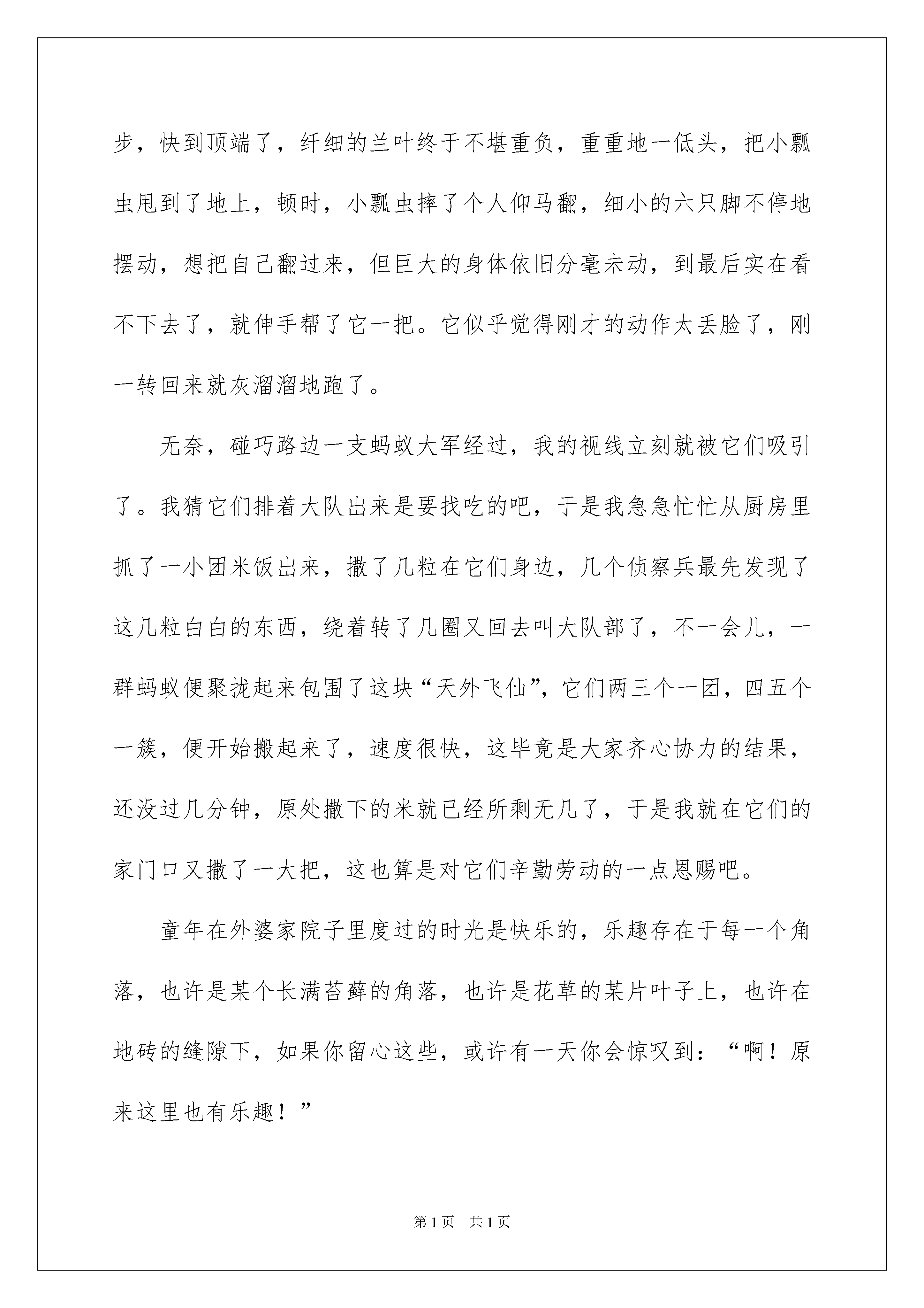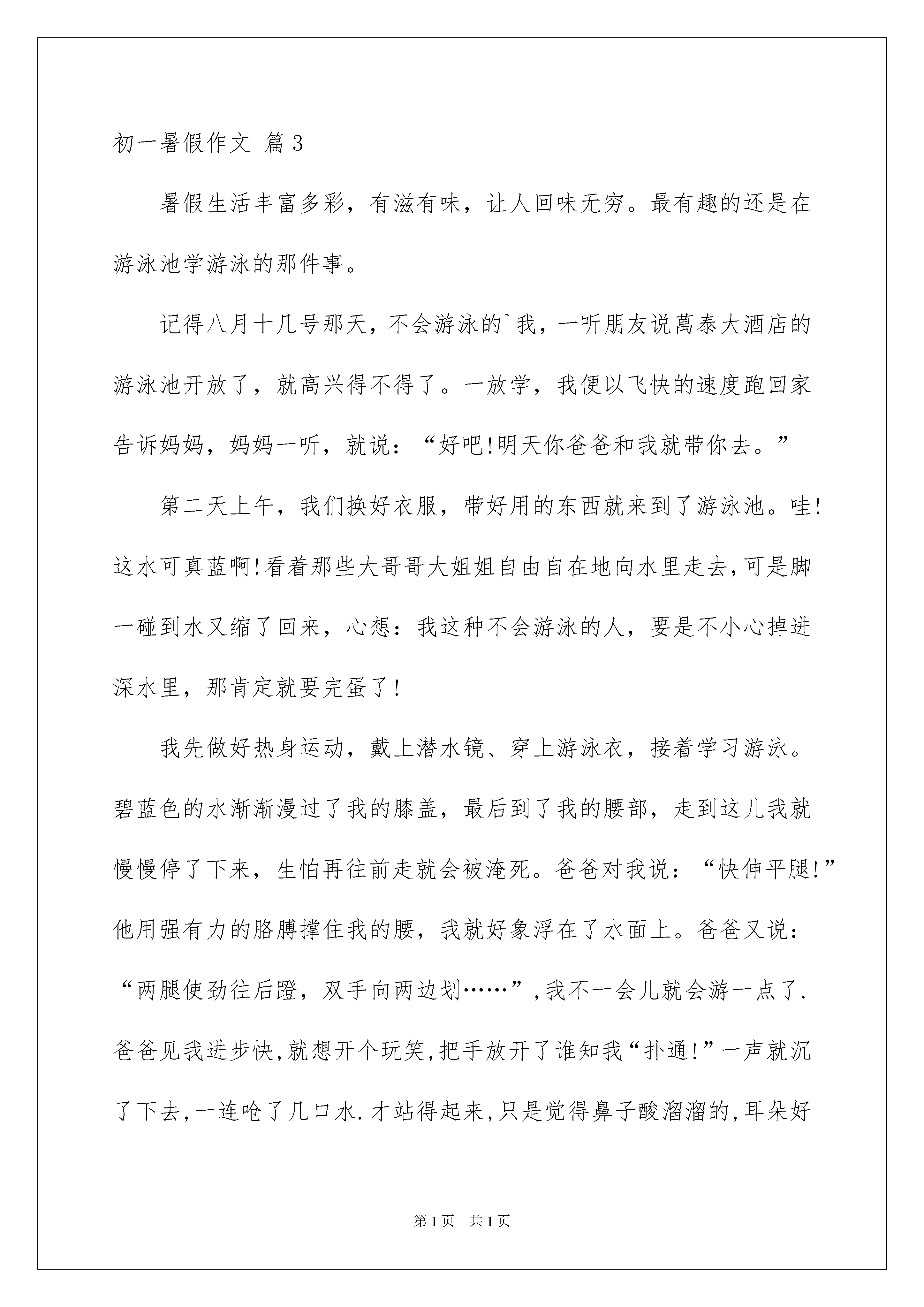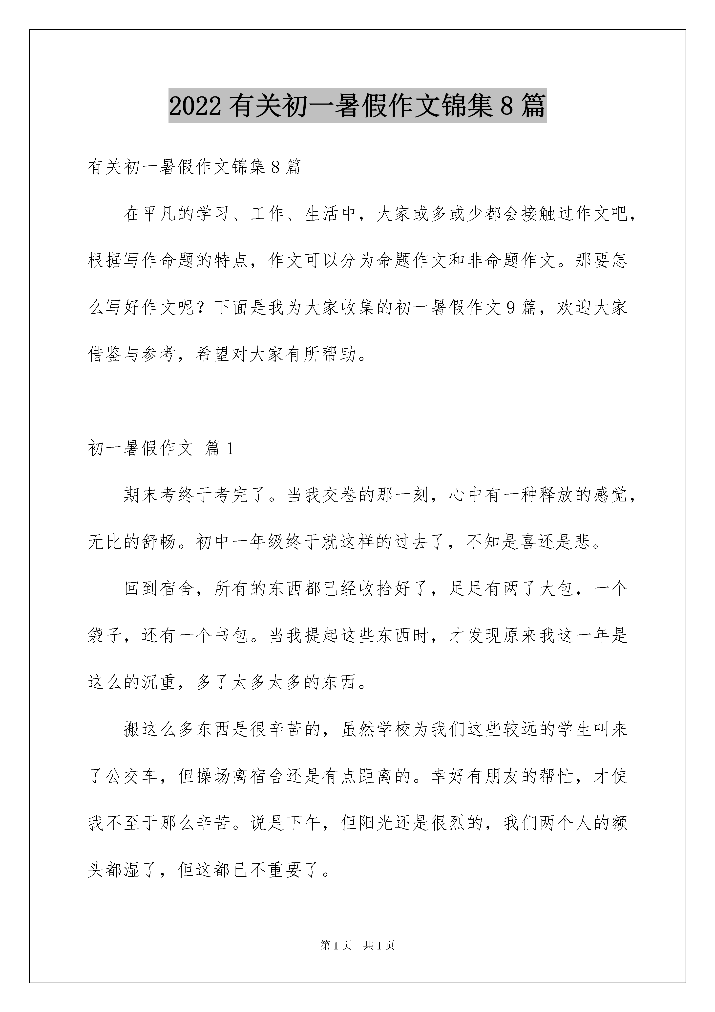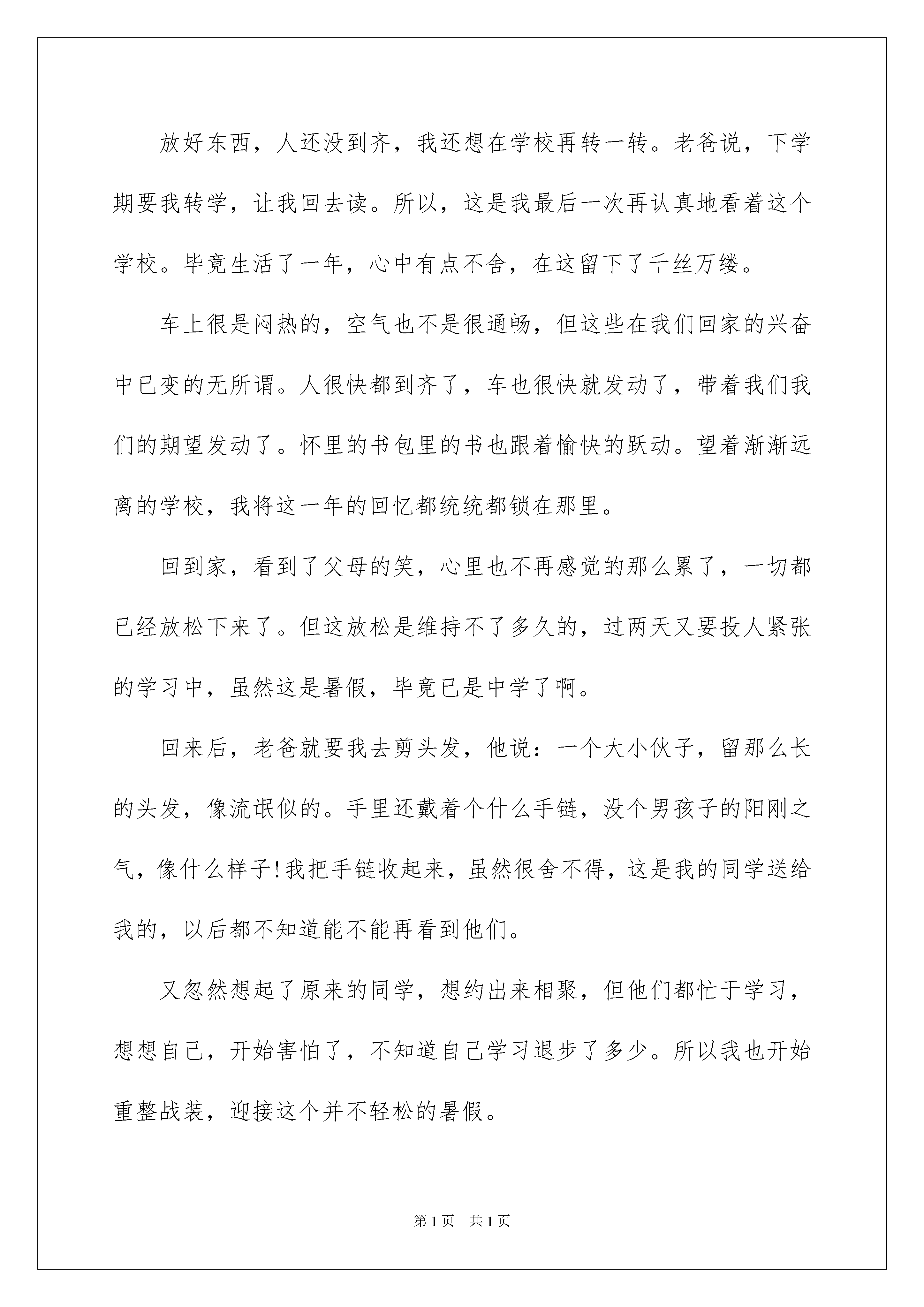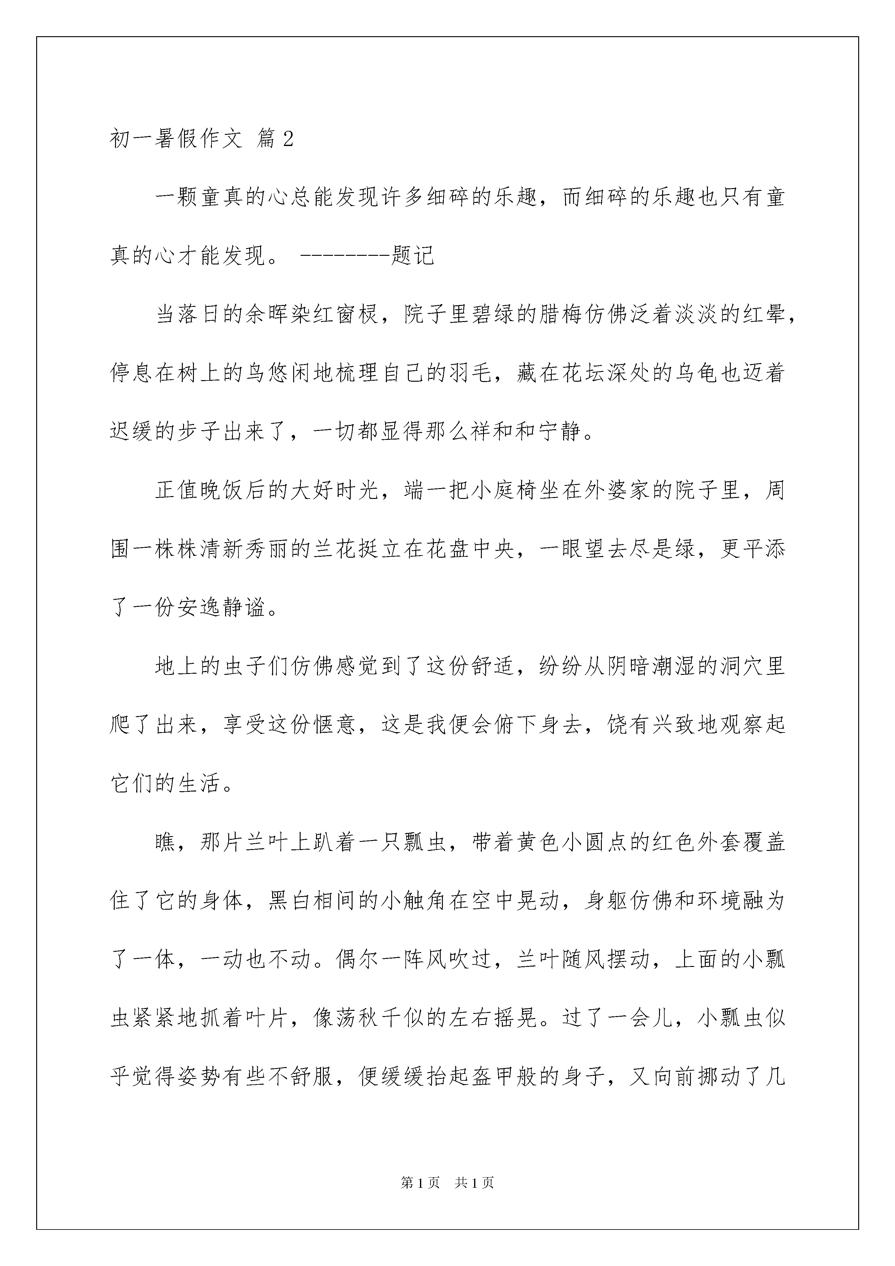 2022有关初一暑假作文锦集8篇有关初一暑假作文锦集8篇在平凡的学习、工作、生活中,大家或多或少都会接触过作文吧,根据写作命题的特点,作文可以分为命题作文和非命题作文。那要怎么写好作文呢?下面是我为大家收集的初一暑假作文9篇,欢迎大家借鉴与参考,希望对大家有所帮助。初一暑假作文篇1期末考终于考完了。当我交卷的那一刻,心中有一种释放的感觉,无比的舒畅。初中一年级终于就这样的过去了,不知是喜还是悲。回到宿舍,所有的东西都已经收拾好了,足足有两了大包,一个袋子,还有一个书包。当我提起这些东西时,才发现原来我这一年是这么的沉重,多了太多太多的东西。搬这么多东西是很辛苦的,虽然学校为我们这些较远的学生叫来了公交车,但操场离宿舍还是有点距离的。幸好有朋友的帮忙,才使我不至于那么辛苦。说是下午,但阳光还是很烈的,我们两个人的额头都湿了,但这都已不重要了。放好东西,人还没到齐,我还想在学校再转一转。老爸说,下学期要我转学,让我回去读。所以,这是我最后一次再认真地看着这个学校。毕竟生活了一年,心中有点不舍,在这留下了千丝万缕。车上很是闷热的,空气也不是很通畅,但这些在我们回家的兴奋中已变的无所谓。人很快都到齐了,车也很快就发动了,带着我们我们的期望发动了。怀里的书包里的书也跟着愉快的跃动。望着渐渐远离的学校,我将这一年的回忆都统统都锁在那里。回到家,看到了父母的笑,心里也不再感觉的那么累了,一切都已经放松下来了。但这放松是维持不了多久的,过两天又要投人紧张的学习中,虽然这是暑假,毕竟已是中学了啊。回来后,老爸就要我去剪头发,他说:一个大小伙子,留那么长的头发,像流氓似的。手里还戴着个什么手链,没个男孩子的阳刚之气,像什么样子!我把手链收起来,虽然很舍不得,这是我的同学送给我的,以后都不知道能不能再看到他们。又忽然想起了原来的同学,想约出来相聚,但他们都忙于学习,想想自己,开始害怕了,不知道自己学习退步了多少。所以我也开始重整战装,迎接这个并不轻松的暑假。初一暑假作文篇2一颗童真的心总能发现许多细碎的乐趣,而细碎的乐趣也只有童真的心才能发现。--------题记当落日的余晖染红窗棂,院子里碧绿的腊梅仿佛泛着淡淡的红晕,停息在树上的鸟悠闲地梳理自己的羽毛,藏在花坛深处的乌龟也迈着迟缓的步子出来了,一切都显得那么祥和和宁静。正值晚饭后的大好时光,端一把小庭椅坐在外婆家的院子里,周围一株株清新秀丽的兰花挺立在花盘中央,一眼望去尽是绿,更平添了一份安逸静谧。地上的虫子们仿佛感觉到了这份舒适,纷纷从阴暗潮湿的洞穴里爬了出来,享受这份惬意,这是我便会俯下身去,饶有兴致地观察起它们的生活。瞧,那片兰叶上趴着一只瓢虫,带着黄色小圆点的红色外套覆盖住了它的身体,黑白相间的小触角在空中晃动,身躯仿佛和环境融为了一体,一动也不动。偶尔一阵风吹过,兰叶随风摆动,上面的小瓢虫紧紧地抓着叶片,像荡秋千似的左右摇晃。过了一会儿,小瓢虫似乎觉得姿势有些不舒服,便缓缓抬起盔甲般的身子,又向前挪动了几步,快到顶端了,纤细的兰叶终于不堪重负,重重地一低头,把小瓢虫甩到了地上,顿时,小瓢虫摔了个人仰马翻,细小的六只脚不停地摆动,想把自己翻过来,但巨大的身体依旧分毫未动,到最后实在看不下去了,就伸手帮了它一把。它似乎觉得刚才的动作太丢脸了,刚一转回来就灰溜溜地跑了。无奈,碰巧路边一支蚂蚁大军经过,我的视线立刻就被它们吸引了。我猜它们排着大队出来是要找吃的吧,于是我急急忙忙从厨房里抓了一小团米饭出来,撒了几粒在它们身边,几个侦察兵最先发现了这几粒白白的东西,绕着转了几圈又回去叫大队部了,不一会儿,一群蚂蚁便聚拢起来包围了这块“天外飞仙”,它们两三个一团,四五个一簇,便开始搬起来了,速度很快,这毕竟是大家齐心协力的结果,还没过几分钟,原处撒下的米就已经所剩无几了,于是我就在它们的家门口又撒了一大把,这也算是对它们辛勤劳动的一点恩赐吧。童年在外婆家院子里度过的时光是快乐的,乐趣存在于每一个角落,也许是某个长满苔藓的角落,也许是花草的某片叶子上,也许在地砖的缝隙下,如果你留心这些,或许有一天你会惊叹到:“啊!原来这里也有乐趣!”初一暑假作文篇3暑假生活丰富多彩,有滋有味,让人回味无穷。最有趣的还是在游泳池学游泳的那件事。记得八月十几号那天,不会游泳的`我,一听朋友说萬泰大酒店的游泳池开放了,就高兴得不得了。一放学,我便以飞快的速度跑回家告诉妈妈,妈妈一听,就说:“好吧!明天你爸爸和我就带你去。”第二天上午,我们换好衣服,带好用的东西就来到了游泳池。哇!这水可真蓝啊!看着那些大哥哥大姐姐自由自在地向水里走去,可是脚一碰到水又缩了回来,心想:我