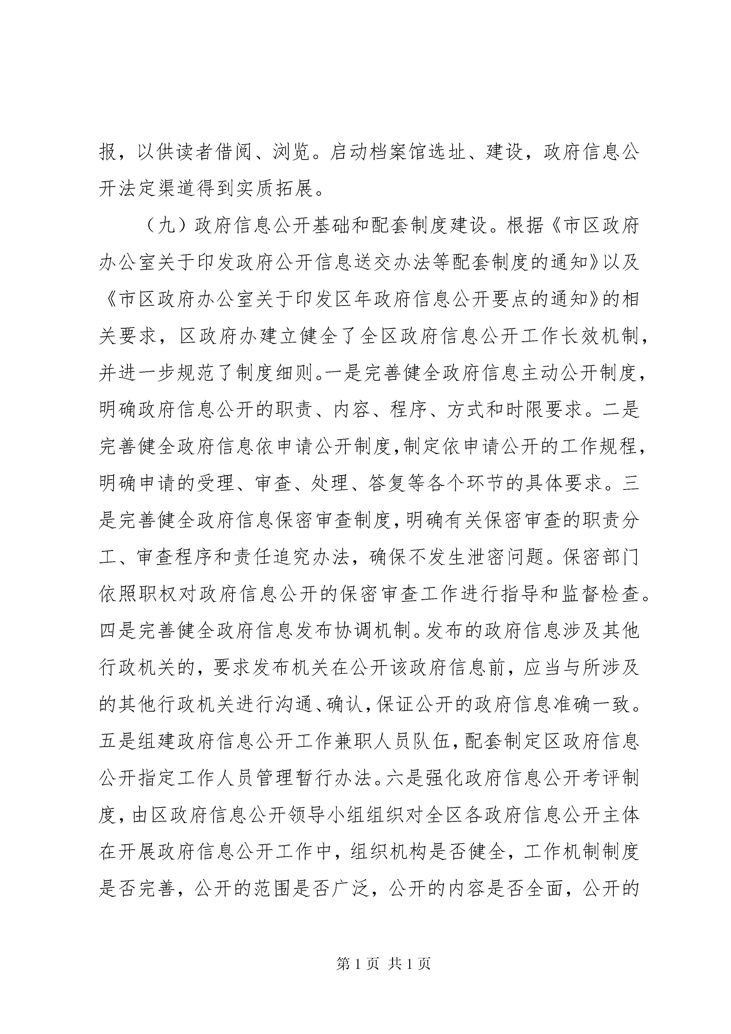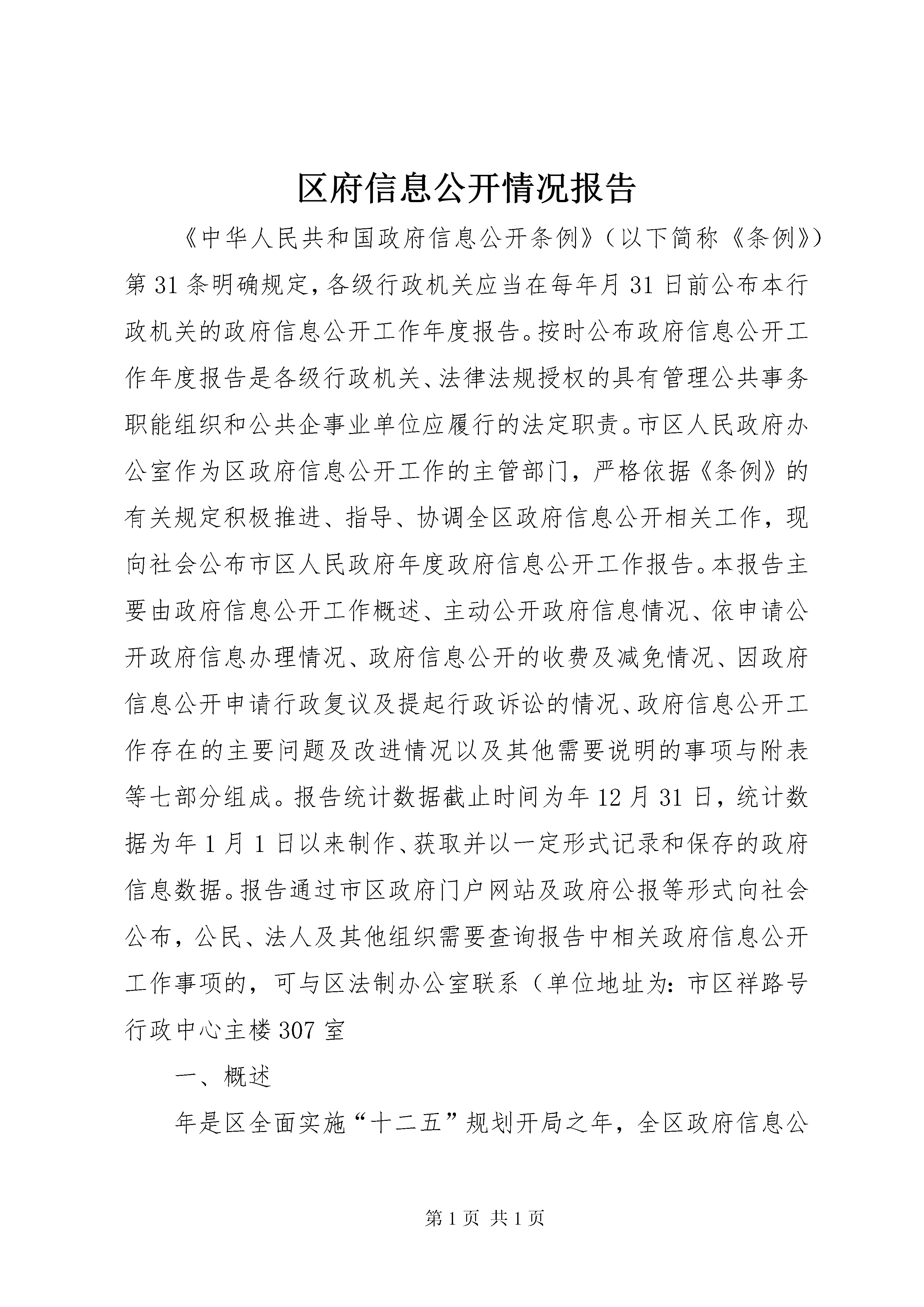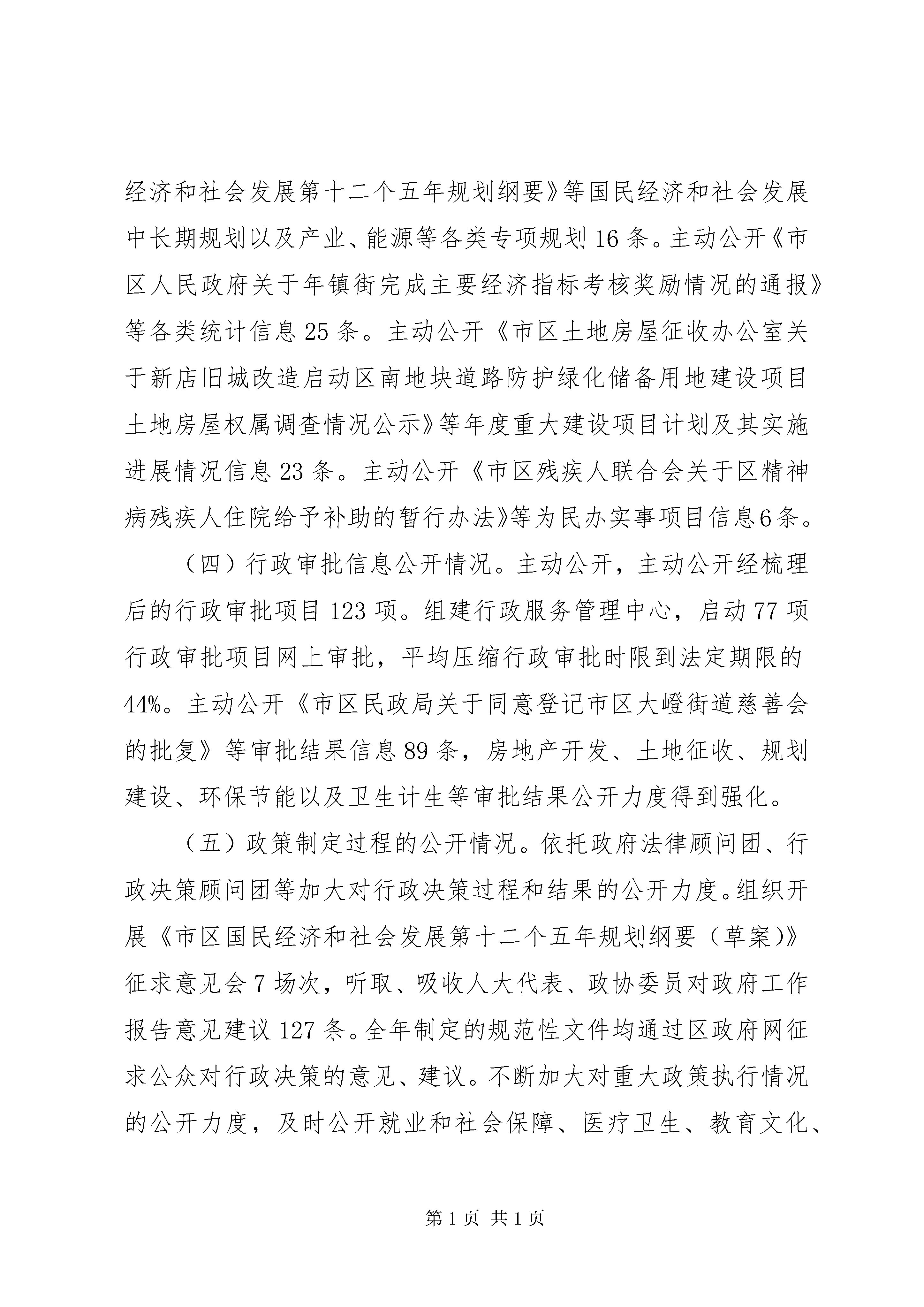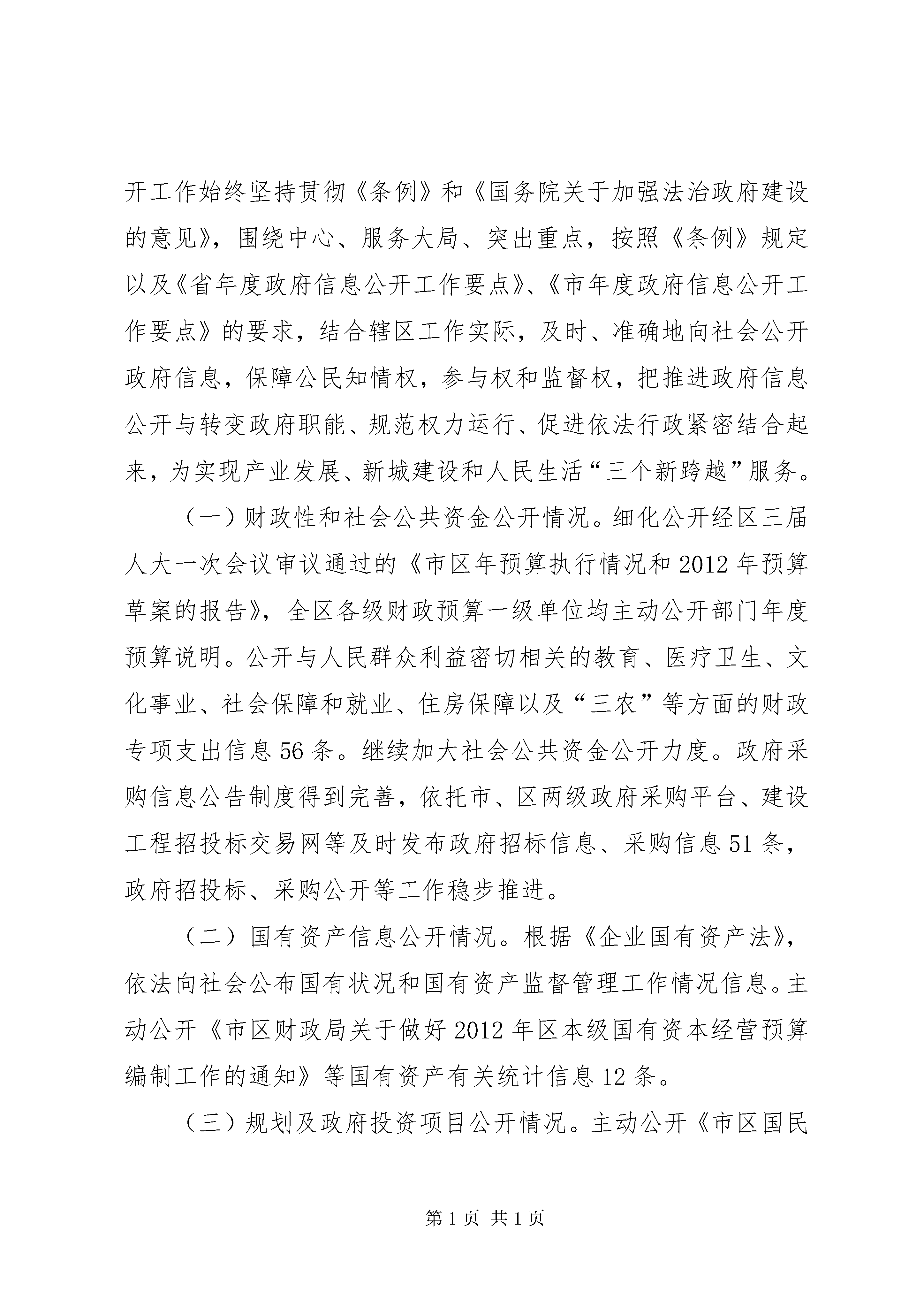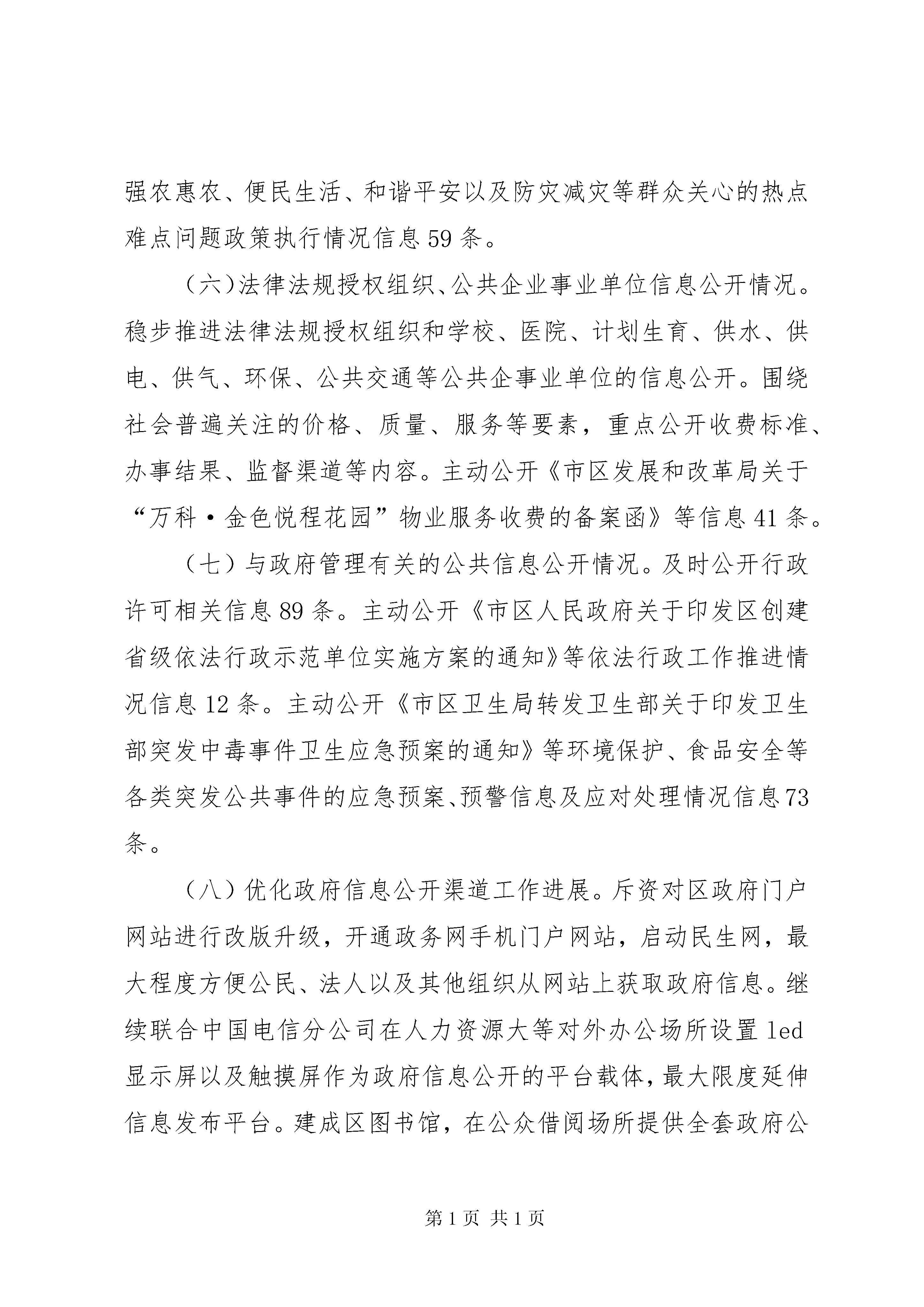 区府信息公开情况报告《中华人民共和国政府信息公开条例》(以下简称《条例》)第31条明确规定,各级行政机关应当在每年月31日前公布本行政机关的政府信息公开工作年度报告。按时公布政府信息公开工作年度报告是各级行政机关、法律法规授权的具有管理公共事务职能组织和公共企事业单位应履行的法定职责。市区人民政府办公室作为区政府信息公开工作的主管部门,严格依据《条例》的有关规定积极推进、指导、协调全区政府信息公开相关工作,现向社会公布市区人民政府年度政府信息公开工作报告。本报告主要由政府信息公开工作概述、主动公开政府信息情况、依申请公开政府信息办理情况、政府信息公开的收费及减免情况、因政府信息公开申请行政复议及提起行政诉讼的情况、政府信息公开工作存在的主要问题及改进情况以及其他需要说明的事项与附表等七部分组成。报告统计数据截止时间为年12月31日,统计数据为年1月1日以来制作、获取并以一定形式记录和保存的政府信息数据。报告通过市区政府门户网站及政府公报等形式向社会公布,公民、法人及其他组织需要查询报告中相关政府信息公开工作事项的,可与区法制办公室联系(单位地址为:市区祥路号行政中心主楼307室一、概述年是区全面实施“十二五”规划开局之年,全区政府信息公开工作始终坚持贯彻《条例》和《国务院关于加强法治政府建设的意见》,围绕中心、服务大局、突出重点,按照《条例》规定以及《省年度政府信息公开工作要点》、《市年度政府信息公开工作要点》的要求,结合辖区工作实际,及时、准确地向社会公开政府信息,保障公民知情权,参与权和监督权,把推进政府信息公开与转变政府职能、规范权力运行、促进依法行政紧密结合起来,为实现产业发展、新城建设和人民生活“三个新跨越”服务。(一)财政性和社会公共资金公开情况。细化公开经区三届人大一次会议审议通过的《市区年预算执行情况和2012年预算草案的报告》,全区各级财政预算一级单位均主动公开部门年度预算说明。公开与人民群众利益密切相关的教育、医疗卫生、文化事业、社会保障和就业、住房保障以及“三农”等方面的财政专项支出信息56条。继续加大社会公共资金公开力度。政府采购信息公告制度得到完善,依托市、区两级政府采购平台、建设工程招投标交易网等及时发布政府招标信息、采购信息51条,政府招投标、采购公开等工作稳步推进。(二)国有资产信息公开情况。根据《企业国有资产法》,依法向社会公布国有状况和国有资产监督管理工作情况信息。主动公开《市区财政局关于做好2012年区本级国有资本经营预算编制工作的通知》等国有资产有关统计信息12条。(三)规划及政府投资项目公开情况。主动公开《市区国民经济和社会发展第十二个五年规划纲要》等国民经济和社会发展中长期规划以及产业、能源等各类专项规划16条。主动公开《市区人民政府关于年镇街完成主要经济指标考核奖励情况的通报》等各类统计信息25条。主动公开《市区土地房屋征收办公室关于新店旧城改造启动区南地块道路防护绿化储备用地建设项目土地房屋权属调查情况公示》等年度重大建设项目计划及其实施进展情况信息23条。主动公开《市区残疾人联合会关于区精神病残疾人住院给予补助的暂行办法》等为民办实事项目信息6条。(四)行政审批信息公开情况。主动公开,主动公开经梳理后的行政审批项目123项。组建行政服务管理中心,启动77项行政审批项目网上审批,平均压缩行政审批时限到法定期限的44%。主动公开《市区民政局关于同意登记市区大嶝街道慈善会的批复》等审批结果信息89条,房地产开发、土地征收、规划建设、环保节能以及卫生计生等审批结果公开力度得到强化。(五)政策制定过程的公开情况。依托政府法律顾问团、行政决策顾问团等加大对行政决策过程和结果的公开力度。组织开展《市区国民经济和社会发展第十二个五年规划纲要(草案)》征求意见会7场次,听取、吸收人大代表、政协委员对政府工作报告意见建议127条。全年制定的规范性文件均通过区政府网征求公众对行政决策的意见、建议。不断加大对重大政策执行情况的公开力度,及时公开就业和社会保障、医疗卫生、教育文化、强农惠农、便民生活、和谐平安以及防灾减灾等群众关心的热点难点问题政策执行情况信息59条。(六)法律法规授权组织、公共企业事业单位信息公开情况。稳步推进法律法规授权组织和学校、医院、计划生育、供水、供电、供气、环保、公共交通等公共企事业单位的信息公开。围绕社会普遍关注的价格、质量、服务等要素,重点公开收费标准、办事结果、监督渠道等内容。主动公开《市区发展和改革局关于“万科·金色悦程花园”物业服务收费的备案函》等信息41条。(七)与政府管理有关的公共信息公开情况。及时公开行政许可相关信息89条。主动公开《市区人民政府关于印发区创建省级依法行政示范单位实施方案的通知》等依法行政工作推进情况信息12条。主动公