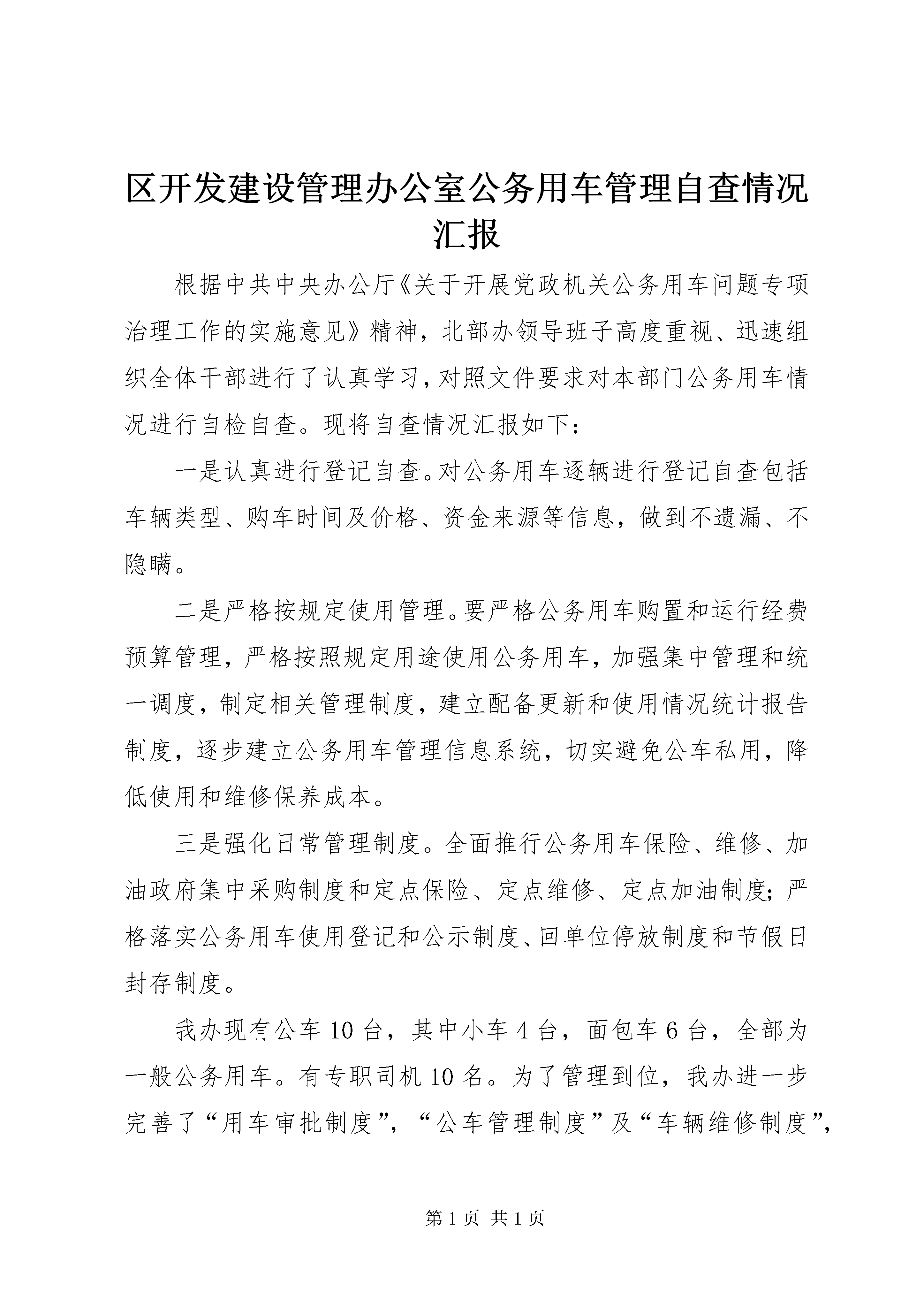 区开发建设管理办公室公务用车管理自查情况汇报根据中共中央办公厅《关于开展党政机关公务用车问题专项治理工作的实施意见》精神,北部办领导班子高度重视、迅速组织全体干部进行了认真学习,对照文件要求对本部门公务用车情况进行自检自查。现将自查情况汇报如下:一是认真进行登记自查。对公务用车逐辆进行登记自查包括车辆类型、购车时间及价格、资金来源等信息,做到不遗漏、不隐瞒。二是严格按规定使用管理。要严格公务用车购置和运行经费预算管理,严格按照规定用途使用公务用车,加强集中管理和统一调度,制定相关管理制度,建立配备更新和使用情况统计报告制度,逐步建立公务用车管理信息系统,切实避免公车私用,降低使用和维修保养成本。三是强化日常管理制度。全面推行公务用车保险、维修、加油政府集中采购制度和定点保险、定点维修、定点加油制度;严格落实公务用车使用登记和公示制度、回单位停放制度和节假日封存制度。我办现有公车10台,其中小车4台,面包车6台,全部为一般公务用车。有专职司机10名。为了管理到位,我办进一步完善了“用车审批制度”,“公车管理制度”及“车辆维修制度”,以加强对司机和车辆的管理。我办的公务用车管理工作由于领导重视、制度完善、管理到位,至目前为止未发生任何纰漏。今后,我们将按照有关规定,继续加强对公务用车管理。