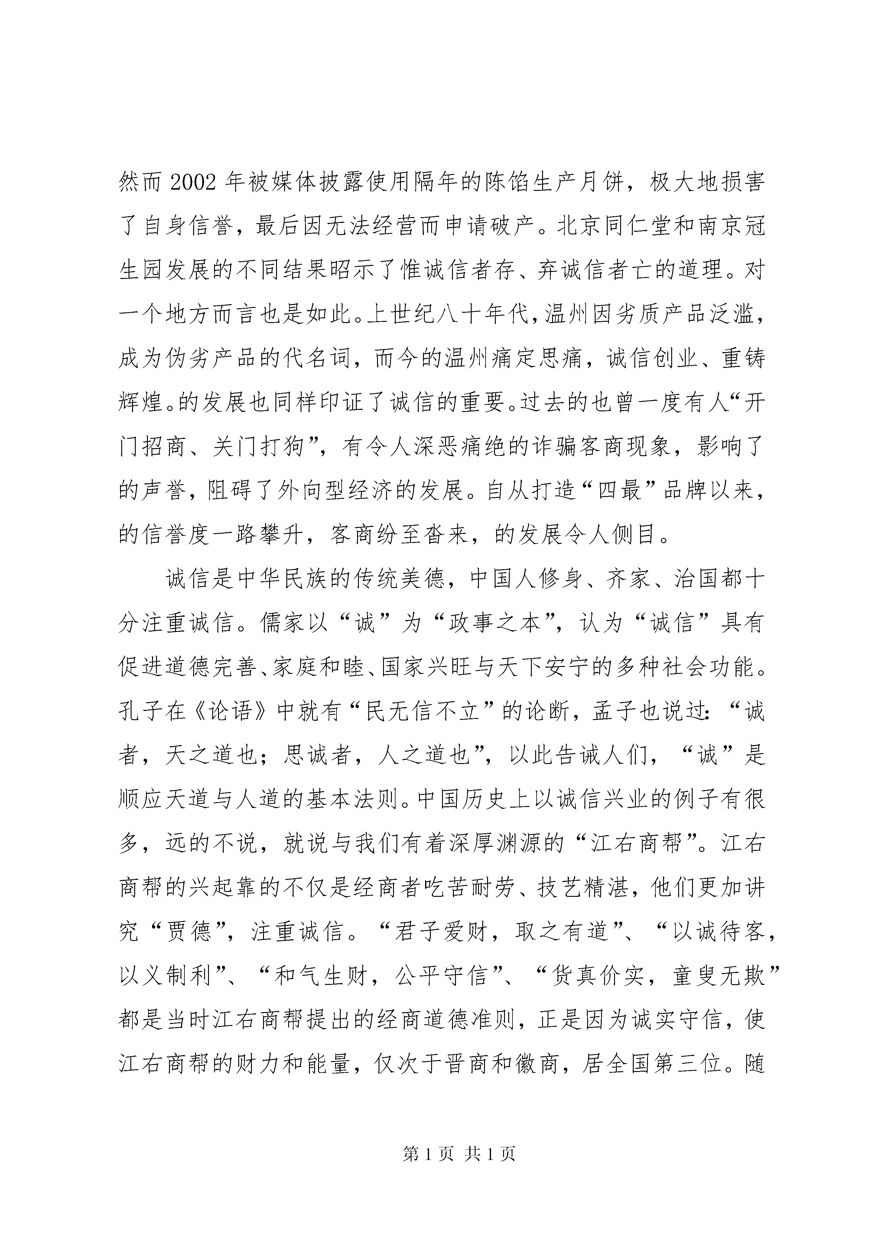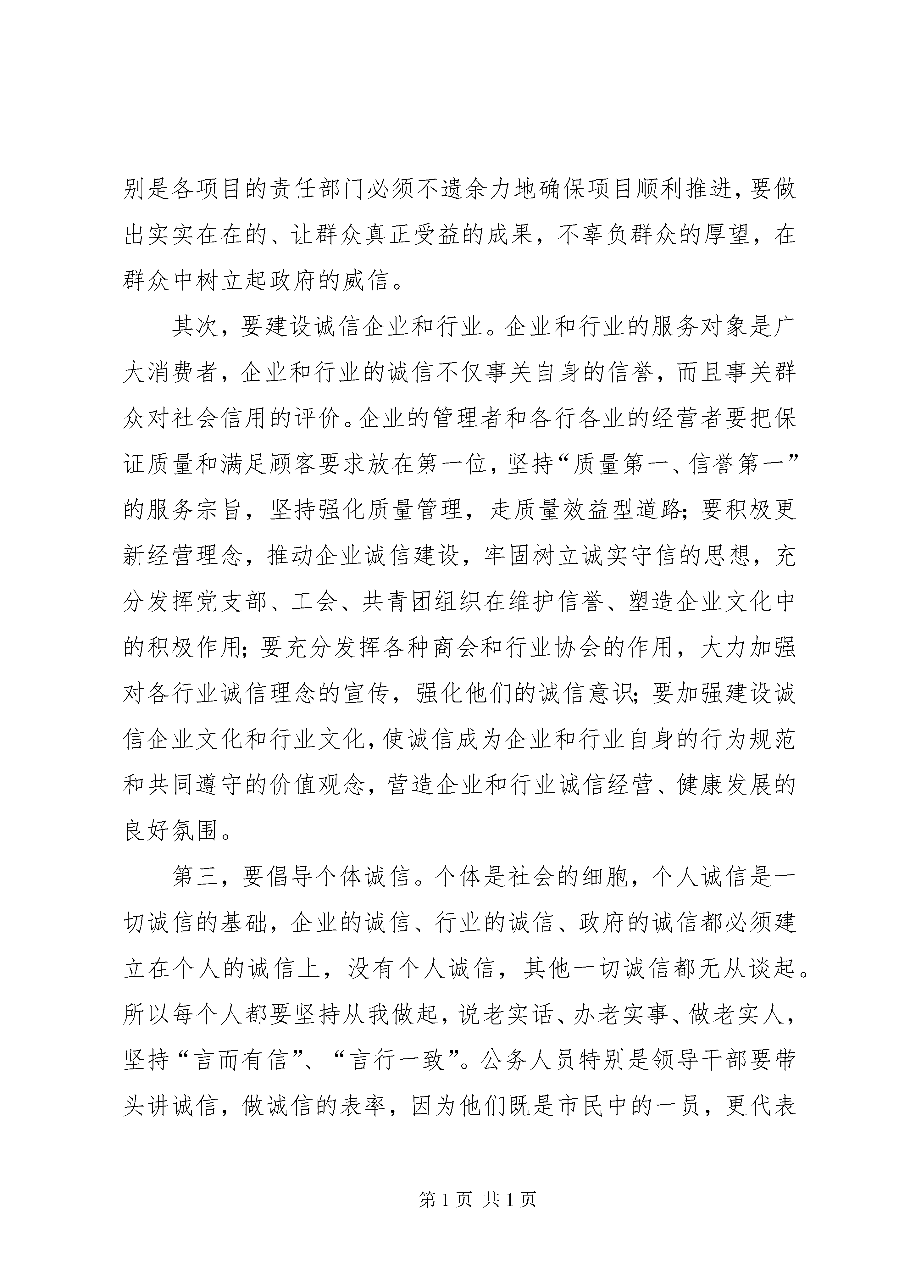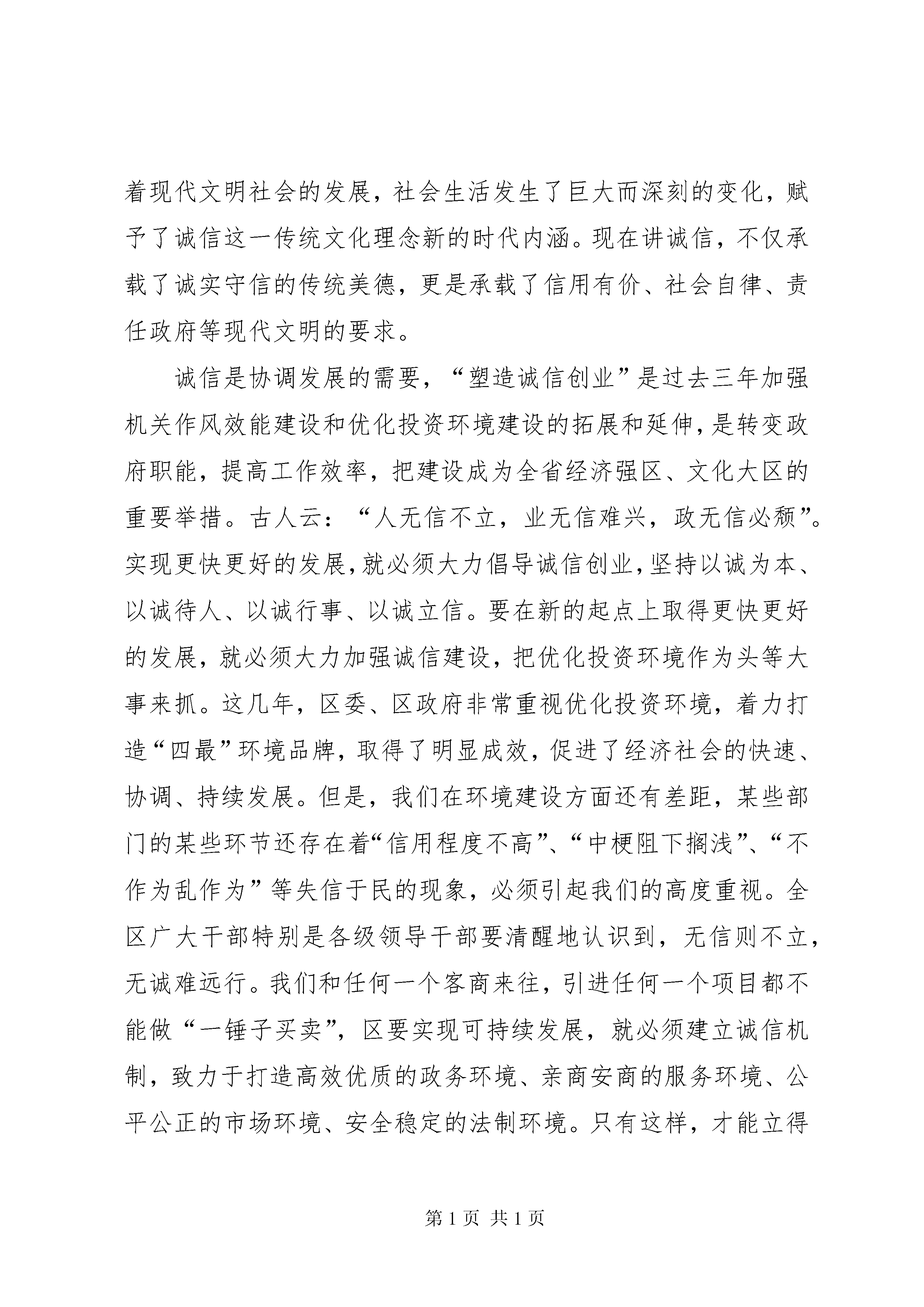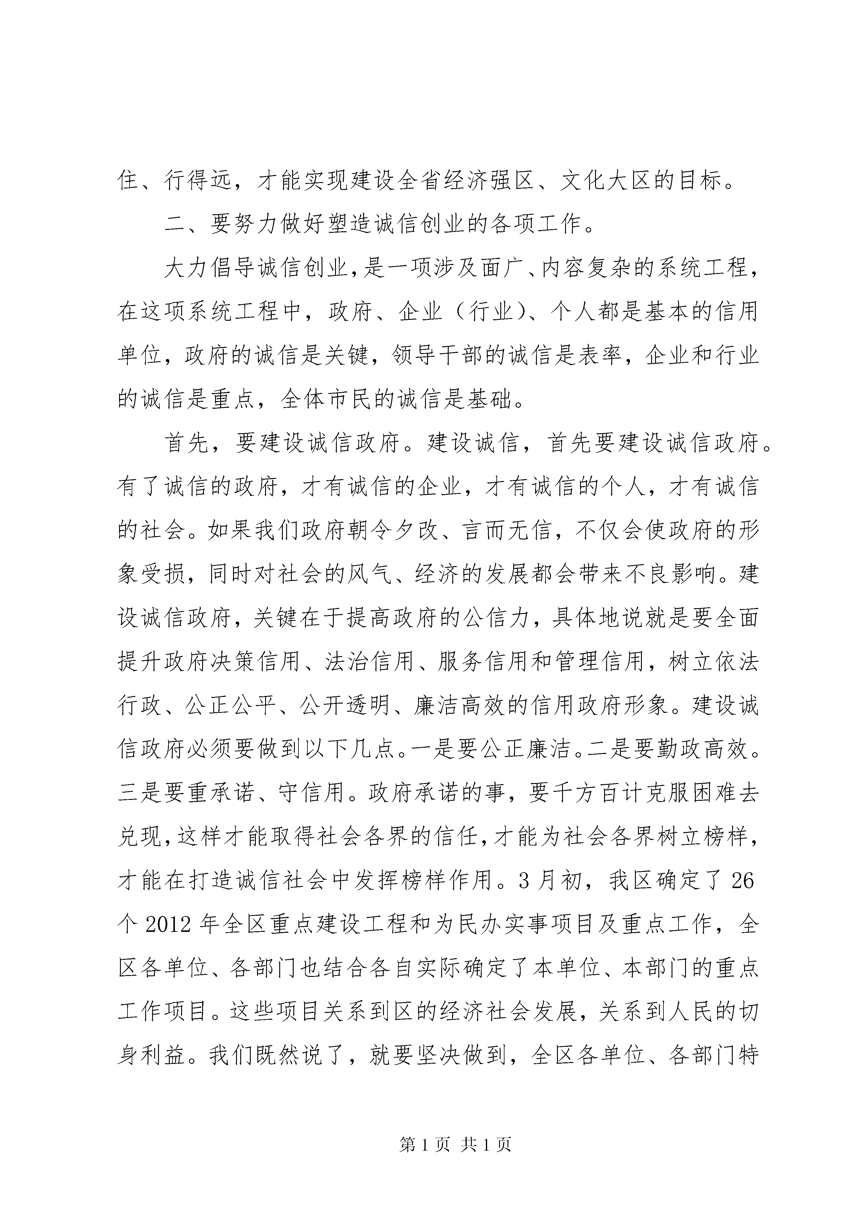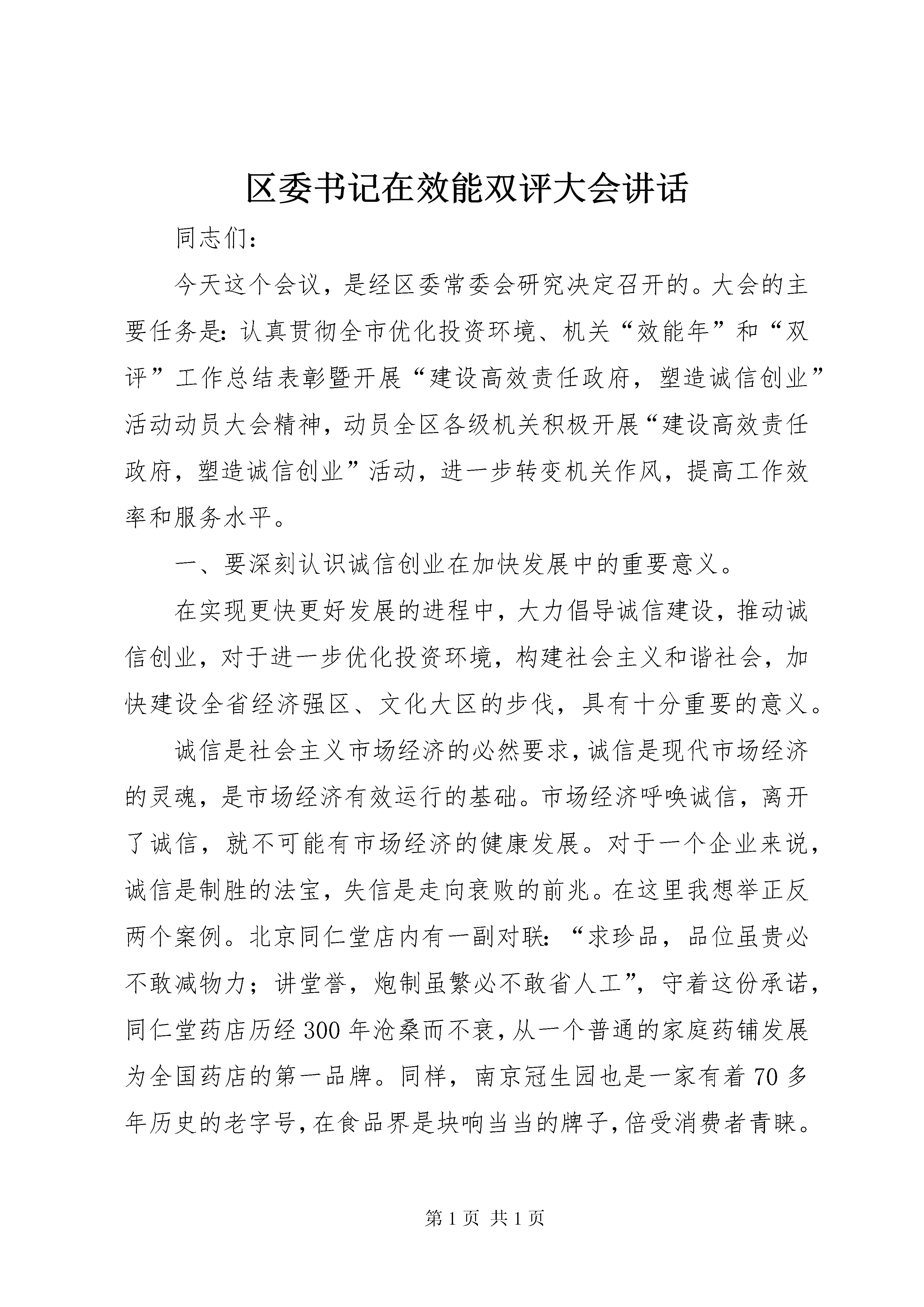 区委书记在效能双评大会讲话同志们:今天这个会议,是经区委常委会研究决定召开的。大会的主要任务是:认真贯彻全市优化投资环境、机关“效能年”和“双评”工作总结表彰暨开展“建设高效责任政府,塑造诚信创业”活动动员大会精神,动员全区各级机关积极开展“建设高效责任政府,塑造诚信创业”活动,进一步转变机关作风,提高工作效率和服务水平。一、要深刻认识诚信创业在加快发展中的重要意义。在实现更快更好发展的进程中,大力倡导诚信建设,推动诚信创业,对于进一步优化投资环境,构建社会主义和谐社会,加快建设全省经济强区、文化大区的步伐,具有十分重要的意义。诚信是社会主义市场经济的必然要求,诚信是现代市场经济的灵魂,是市场经济有效运行的基础。市场经济呼唤诚信,离开了诚信,就不可能有市场经济的健康发展。对于一个企业来说,诚信是制胜的法宝,失信是走向衰败的前兆。在这里我想举正反两个案例。北京同仁堂店内有一副对联:“求珍品,品位虽贵必不敢减物力;讲堂誉,炮制虽繁必不敢省人工”,守着这份承诺,同仁堂药店历经300年沧桑而不衰,从一个普通的家庭药铺发展为全国药店的第一品牌。同样,南京冠生园也是一家有着70多年历史的老字号,在食品界是块响当当的牌子,倍受消费者青睐。然而2002年被媒体披露使用隔年的陈馅生产月饼,极大地损害了自身信誉,最后因无法经营而申请破产。北京同仁堂和南京冠生园发展的不同结果昭示了惟诚信者存、弃诚信者亡的道理。对一个地方而言也是如此。上世纪八十年代,温州因劣质产品泛滥,成为伪劣产品的代名词,而今的温州痛定思痛,诚信创业、重铸辉煌。的发展也同样印证了诚信的重要。过去的也曾一度有人“开门招商、关门打狗”,有令人深恶痛绝的诈骗客商现象,影响了的声誉,阻碍了外向型经济的发展。自从打造“四最”品牌以来,的信誉度一路攀升,客商纷至沓来,的发展令人侧目。诚信是中华民族的传统美德,中国人修身、齐家、治国都十分注重诚信。儒家以“诚”为“政事之本”,认为“诚信”具有促进道德完善、家庭和睦、国家兴旺与天下安宁的多种社会功能。孔子在《论语》中就有“民无信不立”的论断,孟子也说过:“诚者,天之道也;思诚者,人之道也”,以此告诫人们,“诚”是顺应天道与人道的基本法则。中国历史上以诚信兴业的例子有很多,远的不说,就说与我们有着深厚渊源的“江右商帮”。江右商帮的兴起靠的不仅是经商者吃苦耐劳、技艺精湛,他们更加讲究“贾德”,注重诚信。“君子爱财,取之有道”、“以诚待客,以义制利”、“和气生财,公平守信”、“货真价实,童叟无欺”都是当时江右商帮提出的经商道德准则,正是因为诚实守信,使江右商帮的财力和能量,仅次于晋商和徽商,居全国第三位。随着现代文明社会的发展,社会生活发生了巨大而深刻的变化,赋予了诚信这一传统文化理念新的时代内涵。现在讲诚信,不仅承载了诚实守信的传统美德,更是承载了信用有价、社会自律、责任政府等现代文明的要求。诚信是协调发展的需要,“塑造诚信创业”是过去三年加强机关作风效能建设和优化投资环境建设的拓展和延伸,是转变政府职能,提高工作效率,把建设成为全省经济强区、文化大区的重要举措。古人云:“人无信不立,业无信难兴,政无信必颓”。实现更快更好的发展,就必须大力倡导诚信创业,坚持以诚为本、以诚待人、以诚行事、以诚立信。要在新的起点上取得更快更好的发展,就必须大力加强诚信建设,把优化投资环境作为头等大事来抓。这几年,区委、区政府非常重视优化投资环境,着力打造“四最”环境品牌,取得了明显成效,促进了经济社会的快速、协调、持续发展。但是,我们在环境建设方面还有差距,某些部门的某些环节还存在着“信用程度不高”、“中梗阻下搁浅”、“不作为乱作为”等失信于民的现象,必须引起我们的高度重视。全区广大干部特别是各级领导干部要清醒地认识到,无信则不立,无诚难远行。我们和任何一个客商来往,引进任何一个项目都不能做“一锤子买卖”,区要实现可持续发展,就必须建立诚信机制,致力于打造高效优质的政务环境、亲商安商的服务环境、公平公正的市场环境、安全稳定的法制环境。只有这样,才能立得住、行得远,才能实现建设全省经济强区、文化大区的目标。二、要努力做好塑造诚信创业的各项工作。大力倡导诚信创业,是一项涉及面广、内容复杂的系统工程,在这项系统工程中,政府、企业(行业)、个人都是基本的信用单位,政府的诚信是关键,领导干部的诚信是表率,企业和行业的诚信是重点,全体市民的诚信是基础。首先,要建设诚信政府。建设诚信,首先要建设诚信政府。有了诚信的政府,才有诚信的企业,才有诚信的个人,才有诚信的社会。如果我们政府朝令夕改、言而无信,不仅会使政府的形象受损,同时对社会的风气、经济的发展都会带来不良影响。建设诚信政府,关键在于提高政府的公信力,具体地说就是要全面提升政府决策信用、法治信用、服务信
