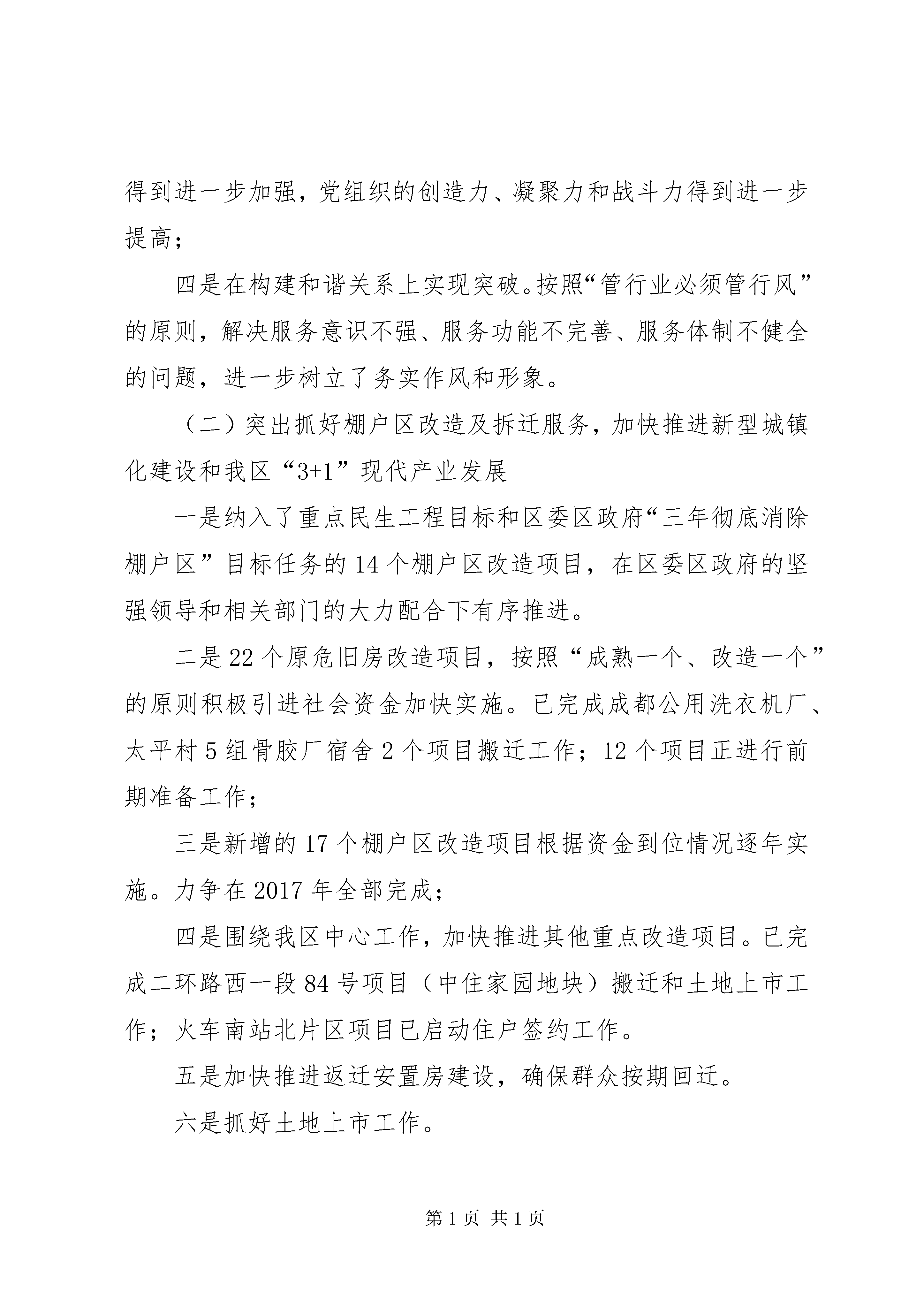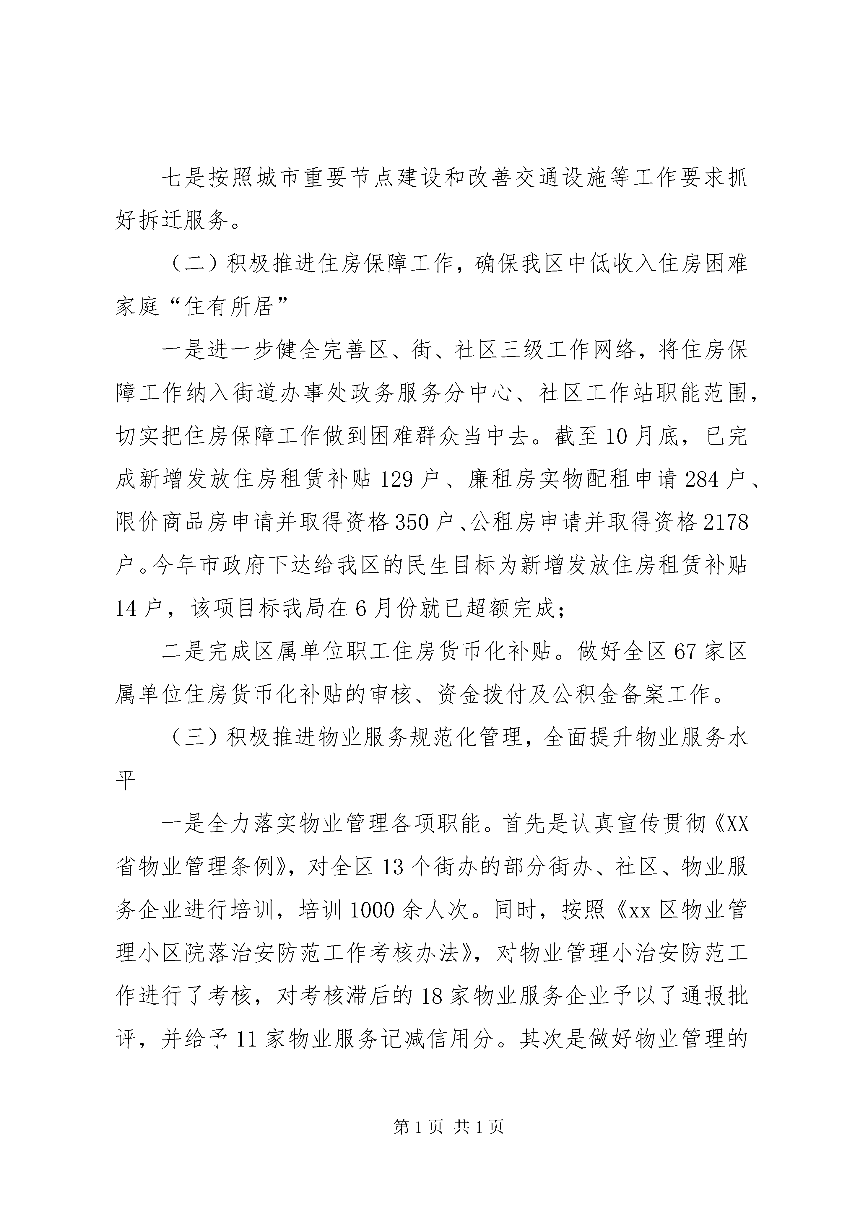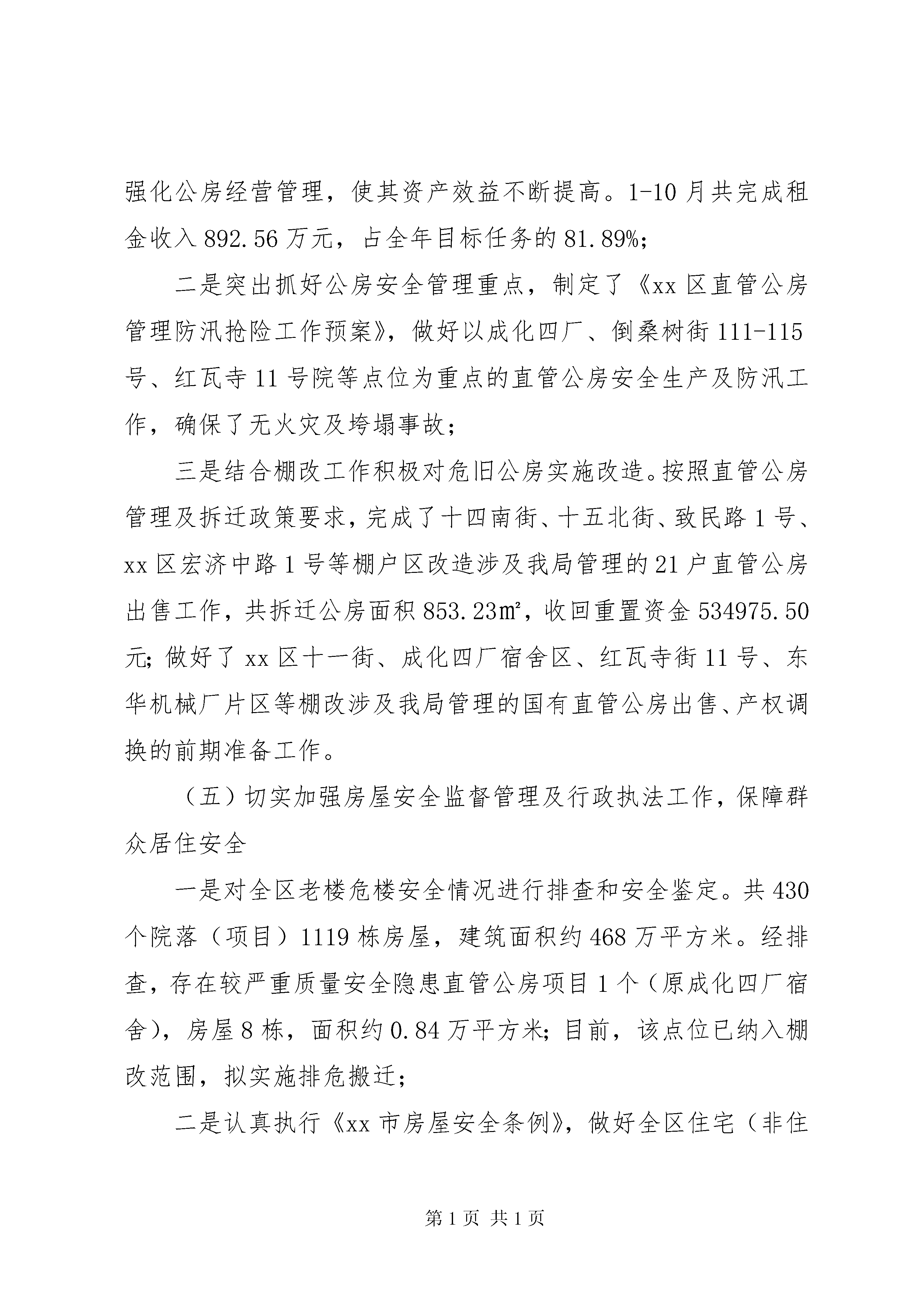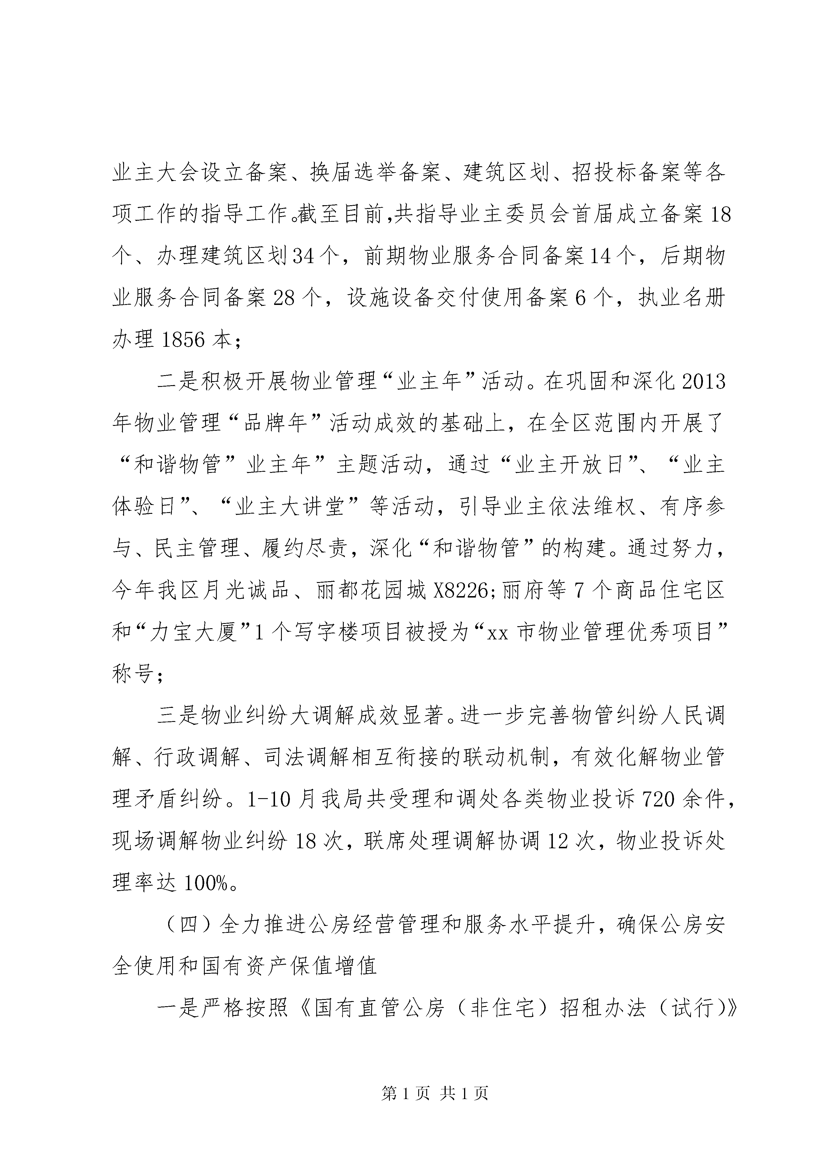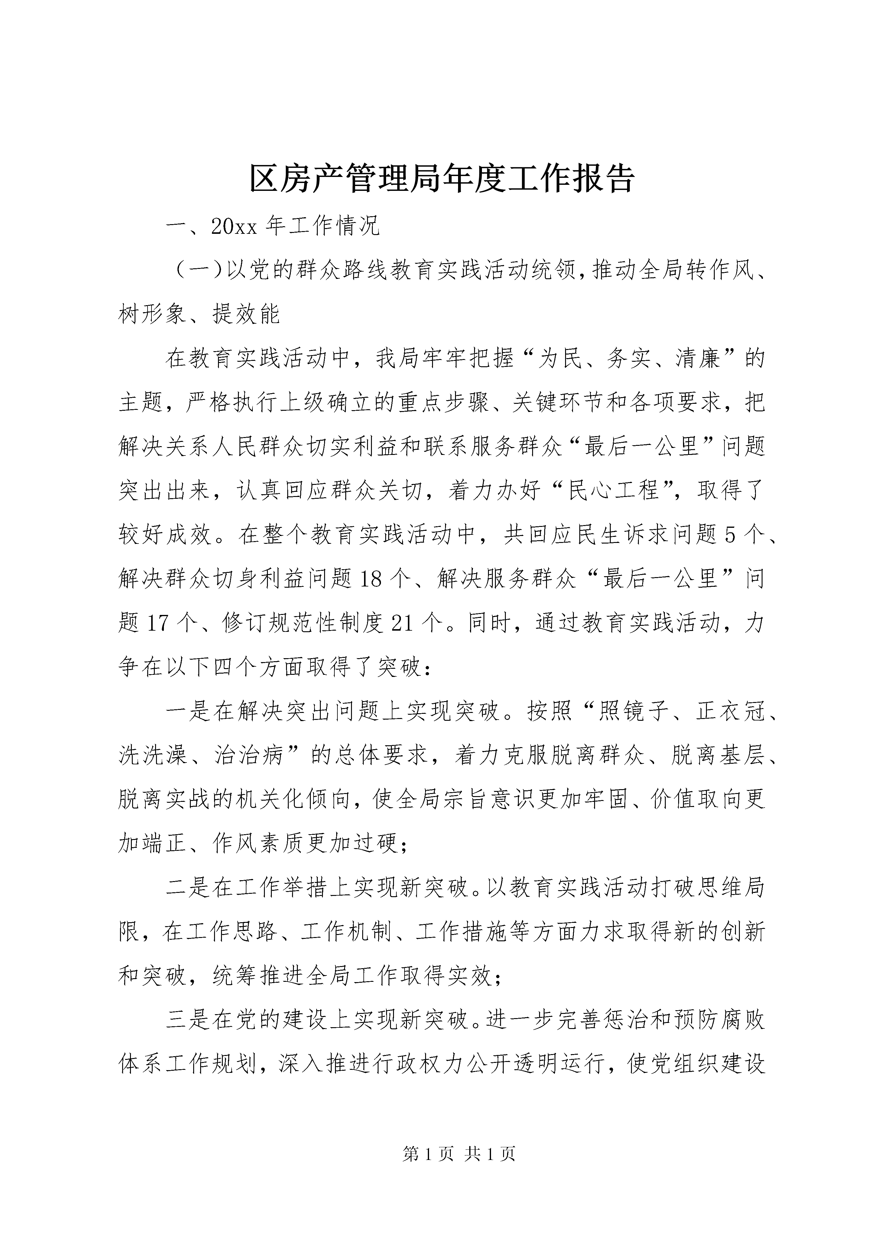 区房产管理局年度工作报告一、20xx年工作情况(一)以党的群众路线教育实践活动统领,推动全局转作风、树形象、提效能在教育实践活动中,我局牢牢把握“为民、务实、清廉”的主题,严格执行上级确立的重点步骤、关键环节和各项要求,把解决关系人民群众切实利益和联系服务群众“最后一公里”问题突出出来,认真回应群众关切,着力办好“民心工程”,取得了较好成效。在整个教育实践活动中,共回应民生诉求问题5个、解决群众切身利益问题18个、解决服务群众“最后一公里”问题17个、修订规范性制度21个。同时,通过教育实践活动,力争在以下四个方面取得了突破:一是在解决突出问题上实现突破。按照“照镜子、正衣冠、洗洗澡、治治病”的总体要求,着力克服脱离群众、脱离基层、脱离实战的机关化倾向,使全局宗旨意识更加牢固、价值取向更加端正、作风素质更加过硬;二是在工作举措上实现新突破。以教育实践活动打破思维局限,在工作思路、工作机制、工作措施等方面力求取得新的创新和突破,统筹推进全局工作取得实效;三是在党的建设上实现新突破。进一步完善惩治和预防腐败体系工作规划,深入推进行政权力公开透明运行,使党组织建设得到进一步加强,党组织的创造力、凝聚力和战斗力得到进一步提高;四是在构建和谐关系上实现突破。按照“管行业必须管行风”的原则,解决服务意识不强、服务功能不完善、服务体制不健全的问题,进一步树立了务实作风和形象。(二)突出抓好棚户区改造及拆迁服务,加快推进新型城镇化建设和我区“3+1”现代产业发展一是纳入了重点民生工程目标和区委区政府“三年彻底消除棚户区”目标任务的14个棚户区改造项目,在区委区政府的坚强领导和相关部门的大力配合下有序推进。二是22个原危旧房改造项目,按照“成熟一个、改造一个”的原则积极引进社会资金加快实施。已完成成都公用洗衣机厂、太平村5组骨胶厂宿舍2个项目搬迁工作;12个项目正进行前期准备工作;三是新增的17个棚户区改造项目根据资金到位情况逐年实施。力争在2017年全部完成;四是围绕我区中心工作,加快推进其他重点改造项目。已完成二环路西一段84号项目(中住家园地块)搬迁和土地上市工作;火车南站北片区项目已启动住户签约工作。五是加快推进返迁安置房建设,确保群众按期回迁。六是抓好土地上市工作。七是按照城市重要节点建设和改善交通设施等工作要求抓好拆迁服务。(二)积极推进住房保障工作,确保我区中低收入住房困难家庭“住有所居”一是进一步健全完善区、街、社区三级工作网络,将住房保障工作纳入街道办事处政务服务分中心、社区工作站职能范围,切实把住房保障工作做到困难群众当中去。截至10月底,已完成新增发放住房租赁补贴129户、廉租房实物配租申请284户、限价商品房申请并取得资格350户、公租房申请并取得资格2178户。今年市政府下达给我区的民生目标为新增发放住房租赁补贴14户,该项目标我局在6月份就已超额完成;二是完成区属单位职工住房货币化补贴。做好全区67家区属单位住房货币化补贴的审核、资金拨付及公积金备案工作。(三)积极推进物业服务规范化管理,全面提升物业服务水平一是全力落实物业管理各项职能。首先是认真宣传贯彻《XX省物业管理条例》,对全区13个街办的部分街办、社区、物业服务企业进行培训,培训1000余人次。同时,按照《xx区物业管理小区院落治安防范工作考核办法》,对物业管理小治安防范工作进行了考核,对考核滞后的18家物业服务企业予以了通报批评,并给予11家物业服务记减信用分。其次是做好物业管理的业主大会设立备案、换届选举备案、建筑区划、招投标备案等各项工作的指导工作。截至目前,共指导业主委员会首届成立备案18个、办理建筑区划34个,前期物业服务合同备案14个,后期物业服务合同备案28个,设施设备交付使用备案6个,执业名册办理1856本;二是积极开展物业管理“业主年”活动。在巩固和深化2013年物业管理“品牌年”活动成效的基础上,在全区范围内开展了“和谐物管”业主年”主题活动,通过“业主开放日”、“业主体验日”、“业主大讲堂”等活动,引导业主依法维权、有序参与、民主管理、履约尽责,深化“和谐物管”的构建。通过努力,今年我区月光诚品、丽都花园城X8226;丽府等7个商品住宅区和“力宝大厦”1个写字楼项目被授为“xx市物业管理优秀项目”称号;三是物业纠纷大调解成效显著。进一步完善物管纠纷人民调解、行政调解、司法调解相互衔接的联动机制,有效化解物业管理矛盾纠纷。1-10月我局共受理和调处各类物业投诉720余件,现场调解物业纠纷18次,联席处理调解协调12次,物业投诉处理率达100%。(四)全力推进公房经营管理和服务水平提升,确保公房安全使用和国有资产保值增值一是严格按照《国有直管公房(非住宅)招租办法(试行)》强化公房经营管理,使其资产效益不断提高。1