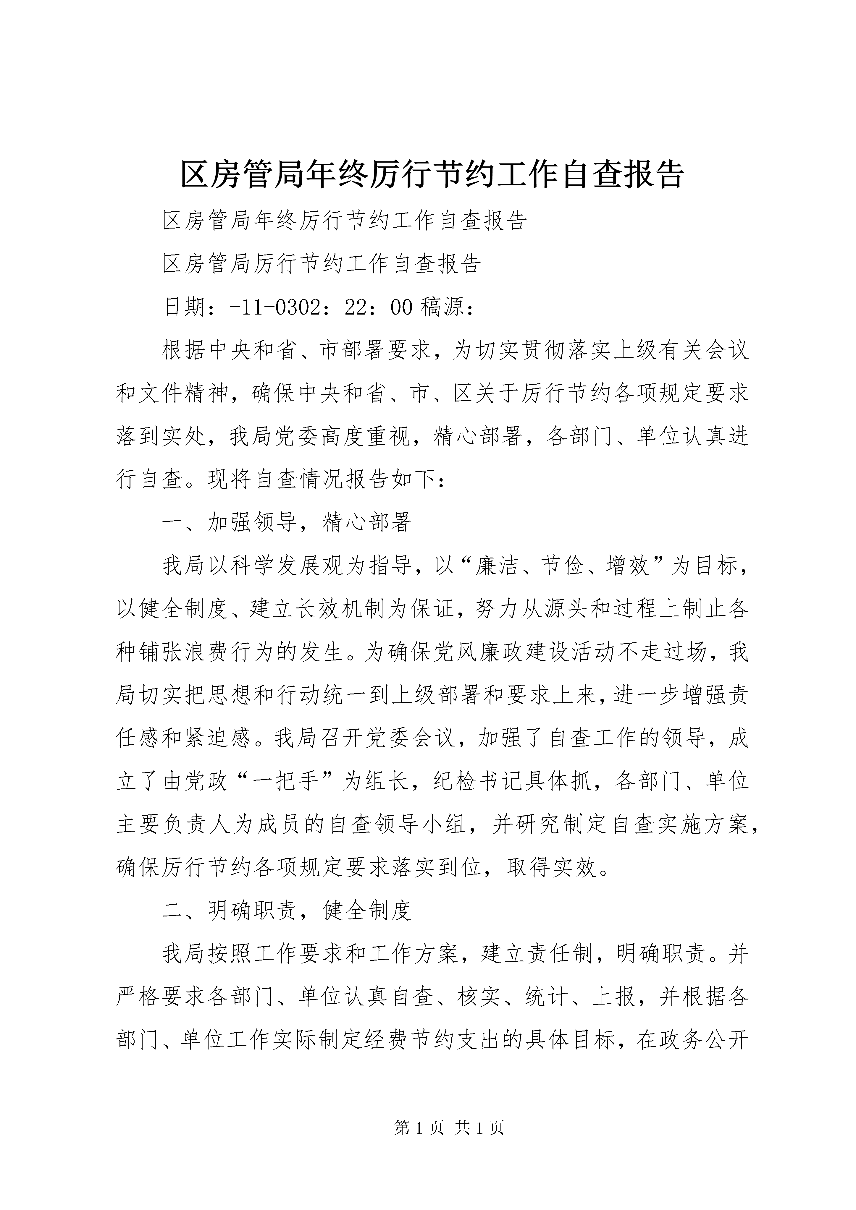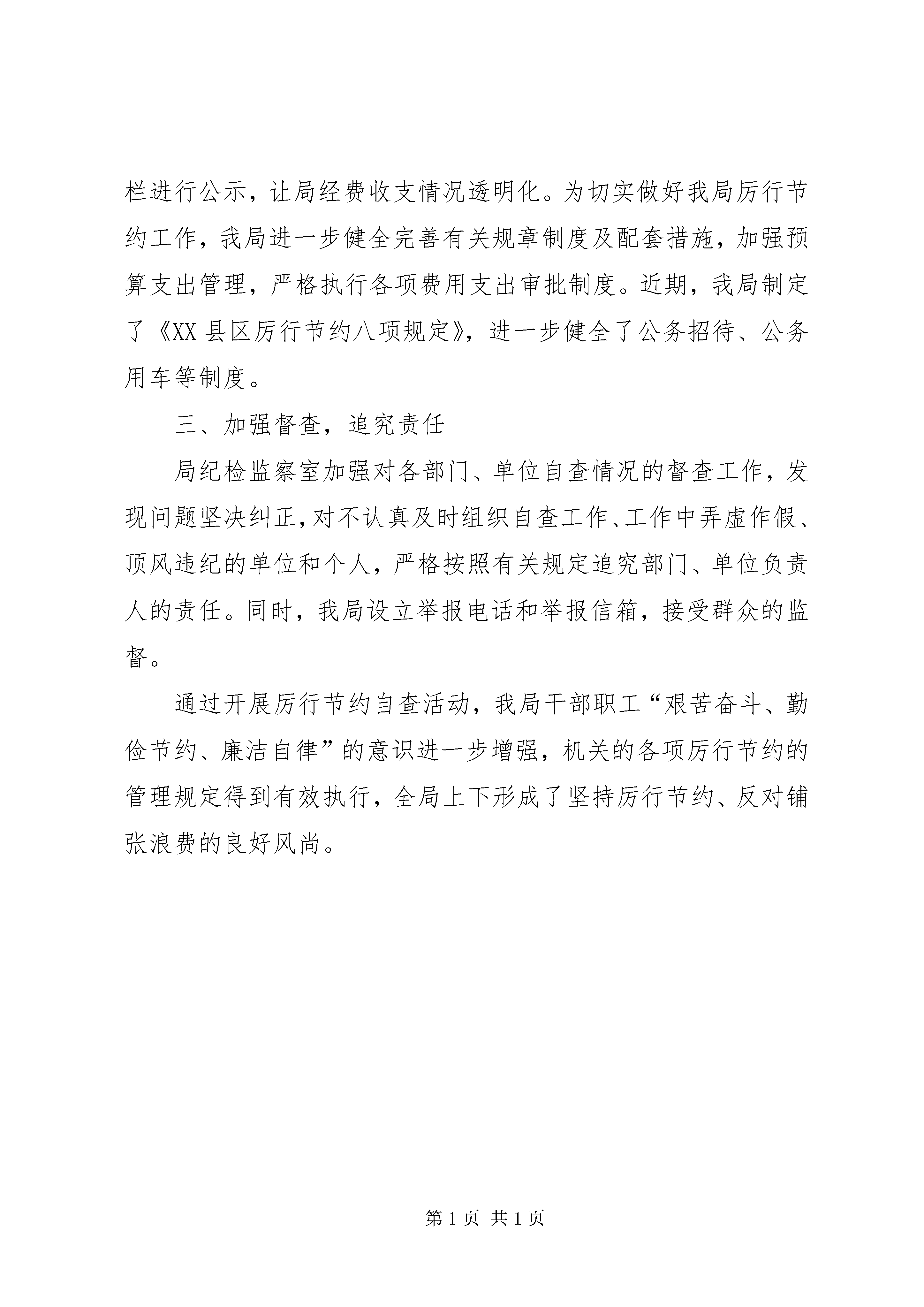 区房管局年终厉行节约工作自查报告区房管局年终厉行节约工作自查报告区房管局厉行节约工作自查报告日期:-11-0302:22:00稿源:根据中央和省、市部署要求,为切实贯彻落实上级有关会议和文件精神,确保中央和省、市、区关于厉行节约各项规定要求落到实处,我局党委高度重视,精心部署,各部门、单位认真进行自查。现将自查情况报告如下:一、加强领导,精心部署我局以科学发展观为指导,以“廉洁、节俭、增效”为目标,以健全制度、建立长效机制为保证,努力从源头和过程上制止各种铺张浪费行为的发生。为确保党风廉政建设活动不走过场,我局切实把思想和行动统一到上级部署和要求上来,进一步增强责任感和紧迫感。我局召开党委会议,加强了自查工作的领导,成立了由党政“一把手”为组长,纪检书记具体抓,各部门、单位主要负责人为成员的自查领导小组,并研究制定自查实施方案,确保厉行节约各项规定要求落实到位,取得实效。二、明确职责,健全制度我局按照工作要求和工作方案,建立责任制,明确职责。并严格要求各部门、单位认真自查、核实、统计、上报,并根据各部门、单位工作实际制定经费节约支出的具体目标,在政务公开栏进行公示,让局经费收支情况透明化。为切实做好我局厉行节约工作,我局进一步健全完善有关规章制度及配套措施,加强预算支出管理,严格执行各项费用支出审批制度。近期,我局制定了《XX县区厉行节约八项规定》,进一步健全了公务招待、公务用车等制度。三、加强督查,追究责任局纪检监察室加强对各部门、单位自查情况的督查工作,发现问题坚决纠正,对不认真及时组织自查工作、工作中弄虚作假、顶风违纪的单位和个人,严格按照有关规定追究部门、单位负责人的责任。同时,我局设立举报电话和举报信箱,接受群众的监督。通过开展厉行节约自查活动,我局干部职工“艰苦奋斗、勤俭节约、廉洁自律”的意识进一步增强,机关的各项厉行节约的管理规定得到有效执行,全局上下形成了坚持厉行节约、反对铺张浪费的良好风尚。