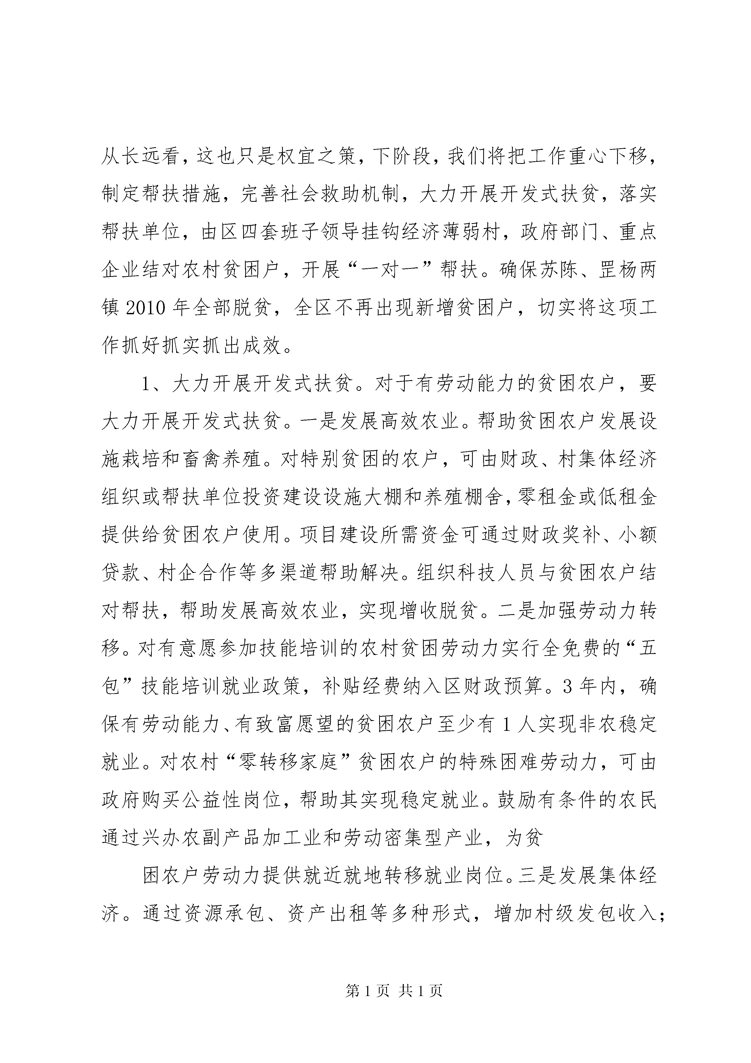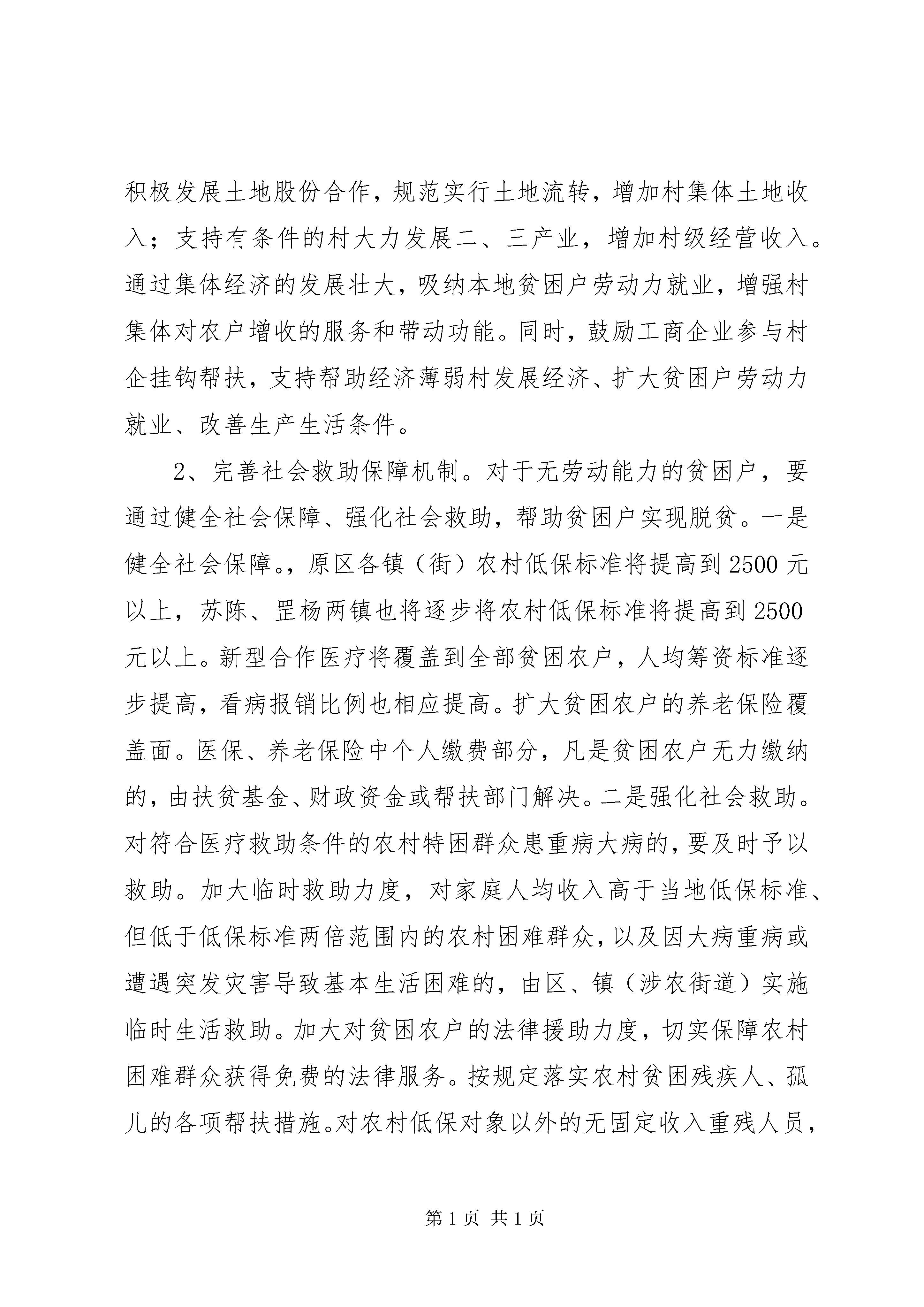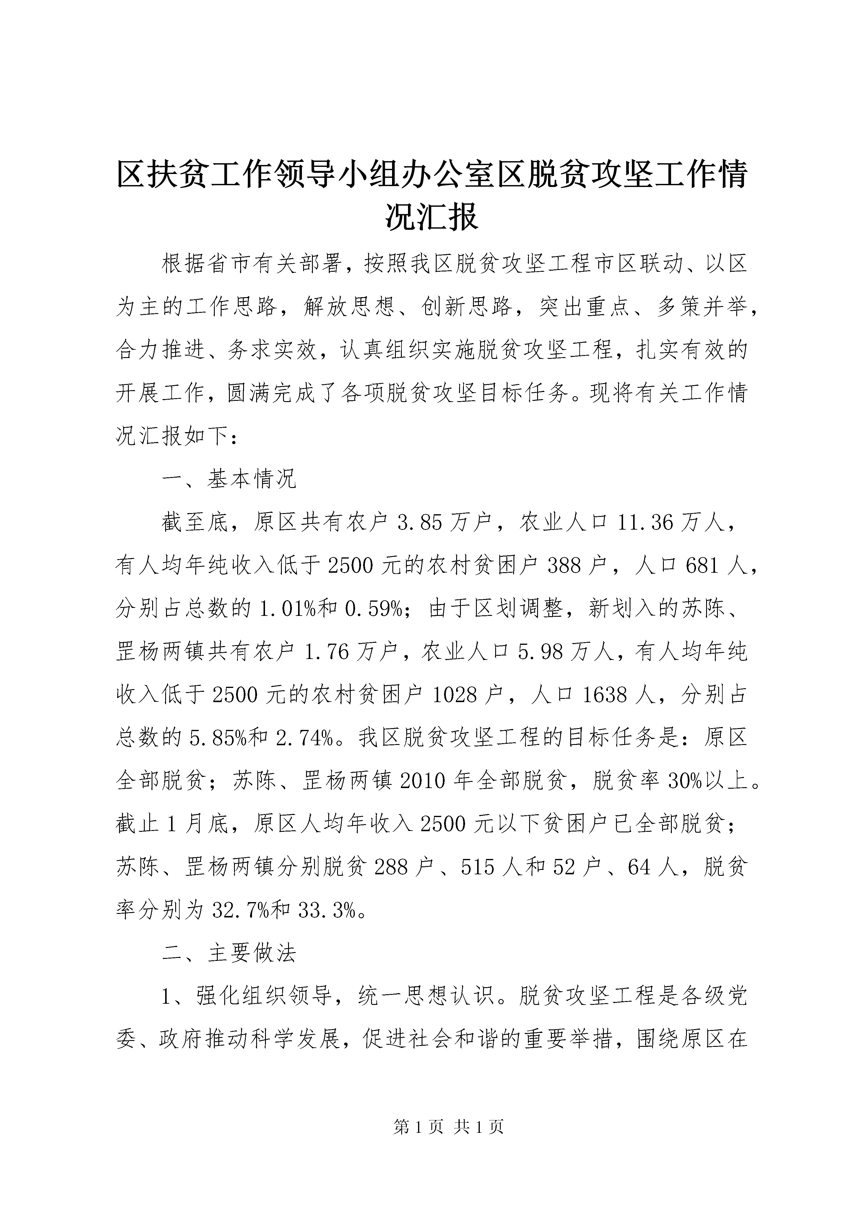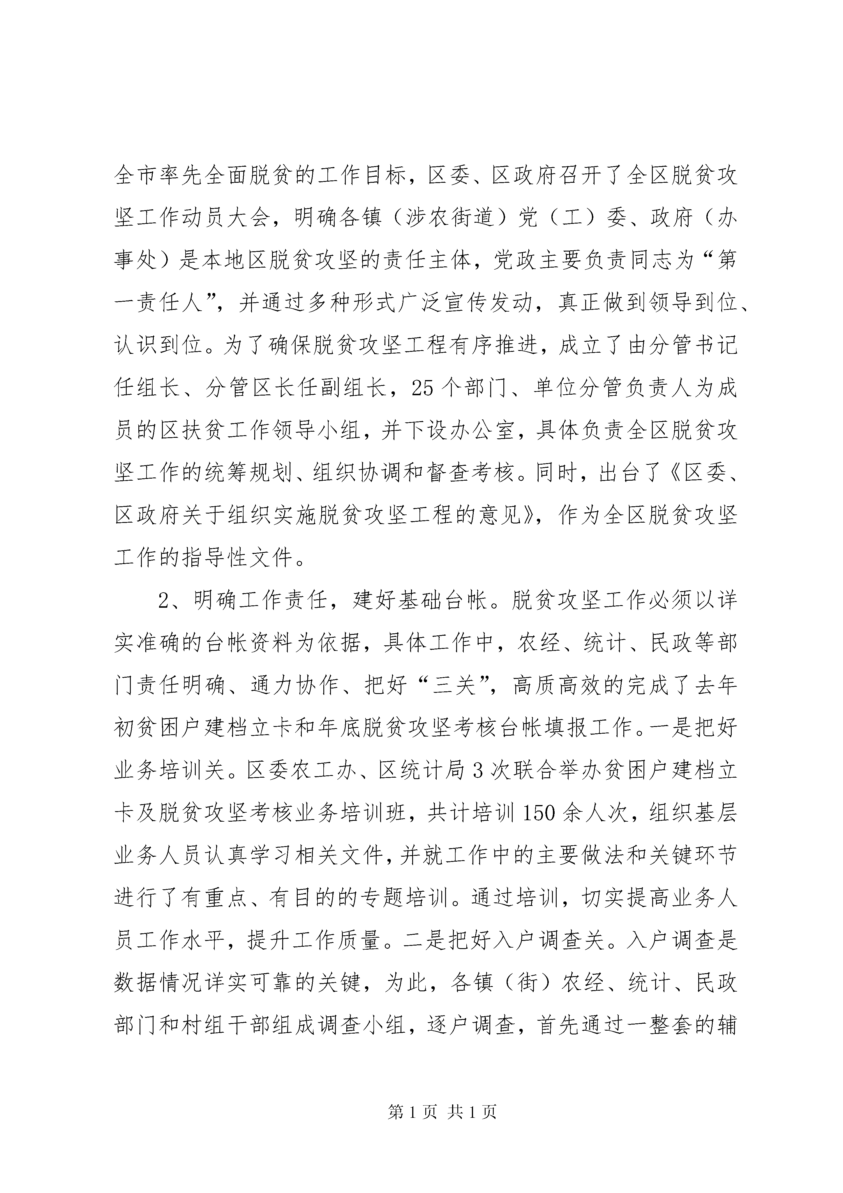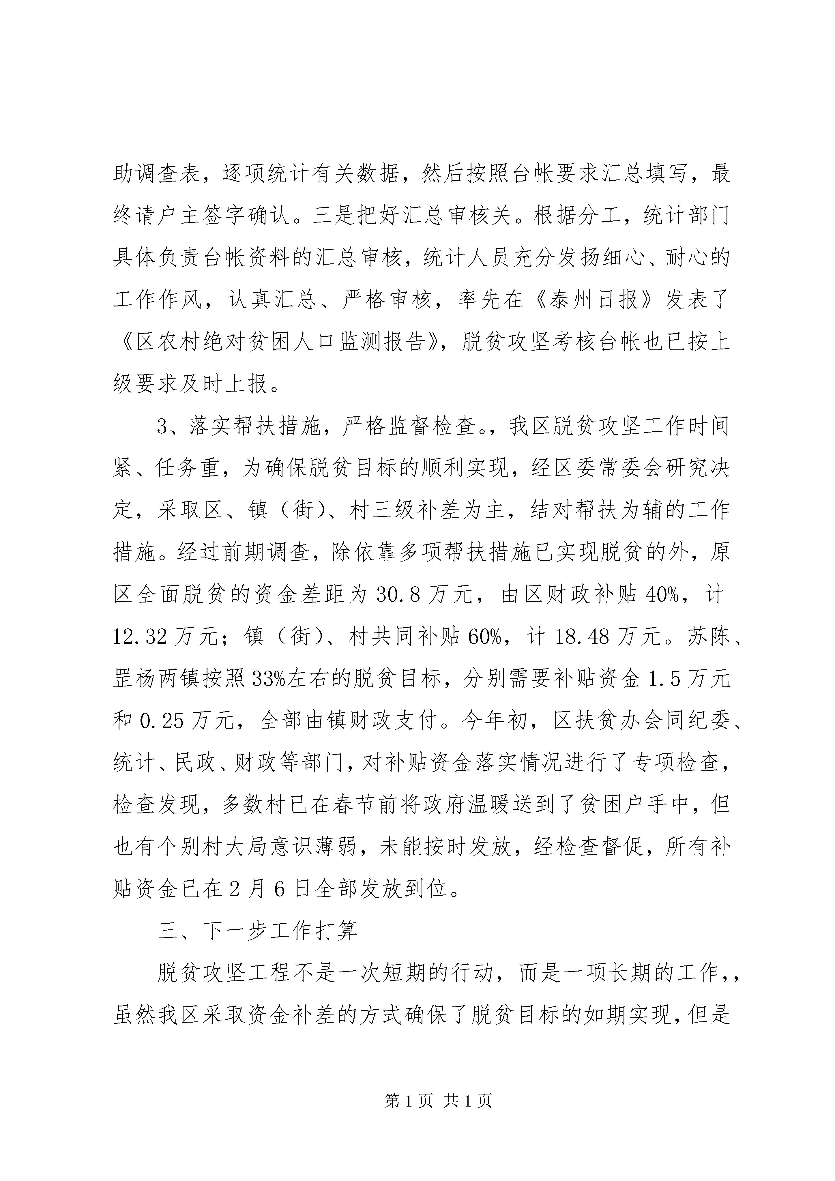 区扶贫工作领导小组办公室区脱贫攻坚工作情况汇报根据省市有关部署,按照我区脱贫攻坚工程市区联动、以区为主的工作思路,解放思想、创新思路,突出重点、多策并举,合力推进、务求实效,认真组织实施脱贫攻坚工程,扎实有效的开展工作,圆满完成了各项脱贫攻坚目标任务。现将有关工作情况汇报如下:一、基本情况截至底,原区共有农户3.85万户,农业人口11.36万人,有人均年纯收入低于2500元的农村贫困户388户,人口681人,分别占总数的1.01%和0.59%;由于区划调整,新划入的苏陈、罡杨两镇共有农户1.76万户,农业人口5.98万人,有人均年纯收入低于2500元的农村贫困户1028户,人口1638人,分别占总数的5.85%和2.74%。我区脱贫攻坚工程的目标任务是:原区全部脱贫;苏陈、罡杨两镇2010年全部脱贫,脱贫率30%以上。截止1月底,原区人均年收入2500元以下贫困户已全部脱贫;苏陈、罡杨两镇分别脱贫288户、515人和52户、64人,脱贫率分别为32.7%和33.3%。二、主要做法1、强化组织领导,统一思想认识。脱贫攻坚工程是各级党委、政府推动科学发展,促进社会和谐的重要举措,围绕原区在全市率先全面脱贫的工作目标,区委、区政府召开了全区脱贫攻坚工作动员大会,明确各镇(涉农街道)党(工)委、政府(办事处)是本地区脱贫攻坚的责任主体,党政主要负责同志为“第一责任人”,并通过多种形式广泛宣传发动,真正做到领导到位、认识到位。为了确保脱贫攻坚工程有序推进,成立了由分管书记任组长、分管区长任副组长,25个部门、单位分管负责人为成员的区扶贫工作领导小组,并下设办公室,具体负责全区脱贫攻坚工作的统筹规划、组织协调和督查考核。同时,出台了《区委、区政府关于组织实施脱贫攻坚工程的意见》,作为全区脱贫攻坚工作的指导性文件。2、明确工作责任,建好基础台帐。脱贫攻坚工作必须以详实准确的台帐资料为依据,具体工作中,农经、统计、民政等部门责任明确、通力协作、把好“三关”,高质高效的完成了去年初贫困户建档立卡和年底脱贫攻坚考核台帐填报工作。一是把好业务培训关。区委农工办、区统计局3次联合举办贫困户建档立卡及脱贫攻坚考核业务培训班,共计培训150余人次,组织基层业务人员认真学习相关文件,并就工作中的主要做法和关键环节进行了有重点、有目的的专题培训。通过培训,切实提高业务人员工作水平,提升工作质量。二是把好入户调查关。入户调查是数据情况详实可靠的关键,为此,各镇(街)农经、统计、民政部门和村组干部组成调查小组,逐户调查,首先通过一整套的辅助调查表,逐项统计有关数据,然后按照台帐要求汇总填写,最终请户主签字确认。三是把好汇总审核关。根据分工,统计部门具体负责台帐资料的汇总审核,统计人员充分发扬细心、耐心的工作作风,认真汇总、严格审核,率先在《泰州日报》发表了《区农村绝对贫困人口监测报告》,脱贫攻坚考核台帐也已按上级要求及时上报。3、落实帮扶措施,严格监督检查。,我区脱贫攻坚工作时间紧、任务重,为确保脱贫目标的顺利实现,经区委常委会研究决定,采取区、镇(街)、村三级补差为主,结对帮扶为辅的工作措施。经过前期调查,除依靠多项帮扶措施已实现脱贫的外,原区全面脱贫的资金差距为30.8万元,由区财政补贴40%,计12.32万元;镇(街)、村共同补贴60%,计18.48万元。苏陈、罡杨两镇按照33%左右的脱贫目标,分别需要补贴资金1.5万元和0.25万元,全部由镇财政支付。今年初,区扶贫办会同纪委、统计、民政、财政等部门,对补贴资金落实情况进行了专项检查,检查发现,多数村已在春节前将政府温暖送到了贫困户手中,但也有个别村大局意识薄弱,未能按时发放,经检查督促,所有补贴资金已在2月6日全部发放到位。三、下一步工作打算脱贫攻坚工程不是一次短期的行动,而是一项长期的工作,,虽然我区采取资金补差的方式确保了脱贫目标的如期实现,但是从长远看,这也只是权宜之策,下阶段,我们将把工作重心下移,制定帮扶措施,完善社会救助机制,大力开展开发式扶贫,落实帮扶单位,由区四套班子领导挂钩经济薄弱村,政府部门、重点企业结对农村贫困户,开展“一对一”帮扶。确保苏陈、罡杨两镇2010年全部脱贫,全区不再出现新增贫困户,切实将这项工作抓好抓实抓出成效。1、大力开展开发式扶贫。对于有劳动能力的贫困农户,要大力开展开发式扶贫。一是发展高效农业。帮助贫困农户发展设施栽培和畜禽养殖。对特别贫困的农户,可由财政、村集体经济组织或帮扶单位投资建设设施大棚和养殖棚舍,零租金或低租金提供给贫困农户使用。项目建设所需资金可通过财政奖补、小额贷款、村企合作等多渠道帮助解决。组织科技人员与贫困农户结对帮扶,帮助发展高效农业,实现增收脱贫。二是加强劳动力转移。对有意愿参加技能培训的农村贫困劳动力实行全免费