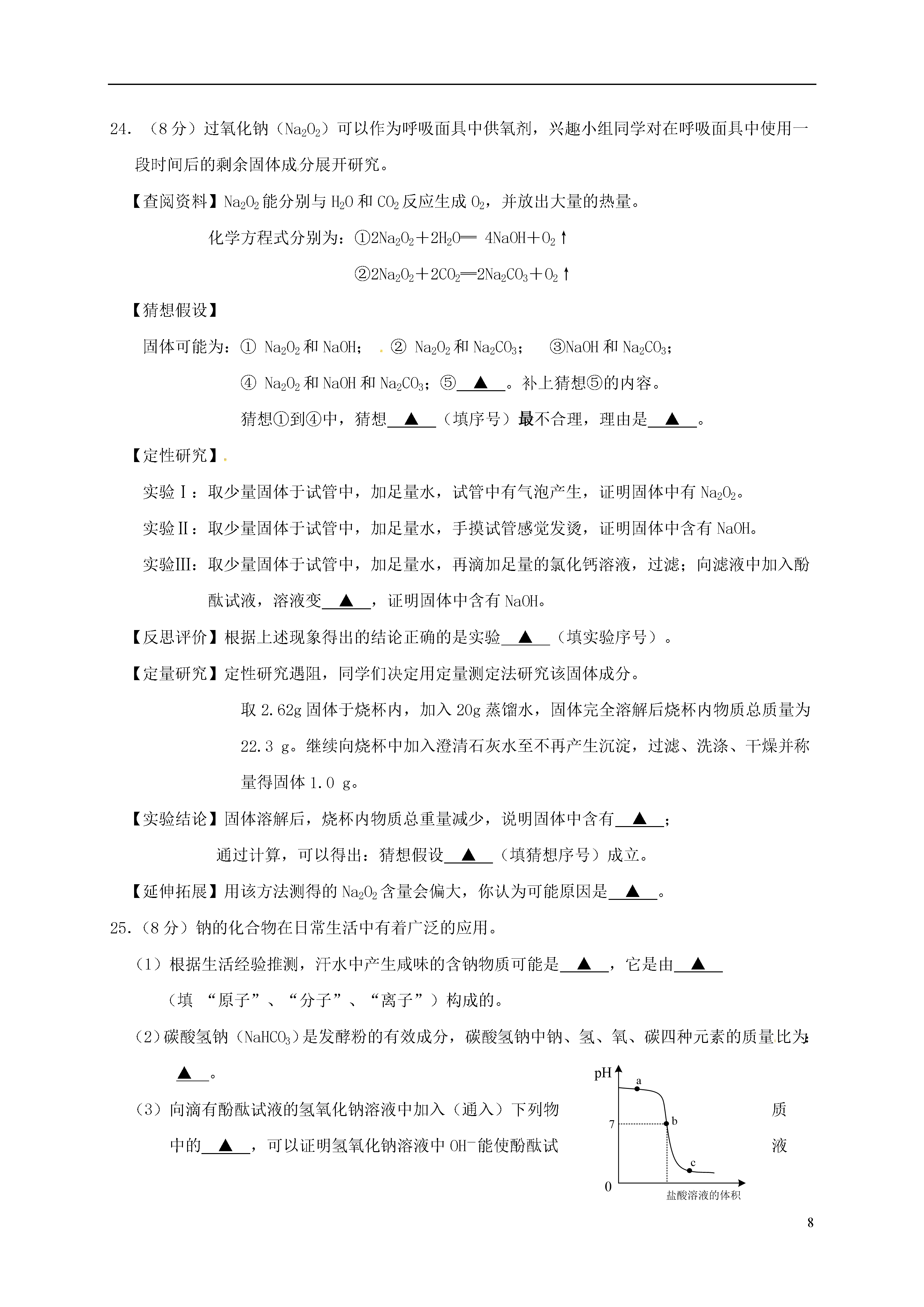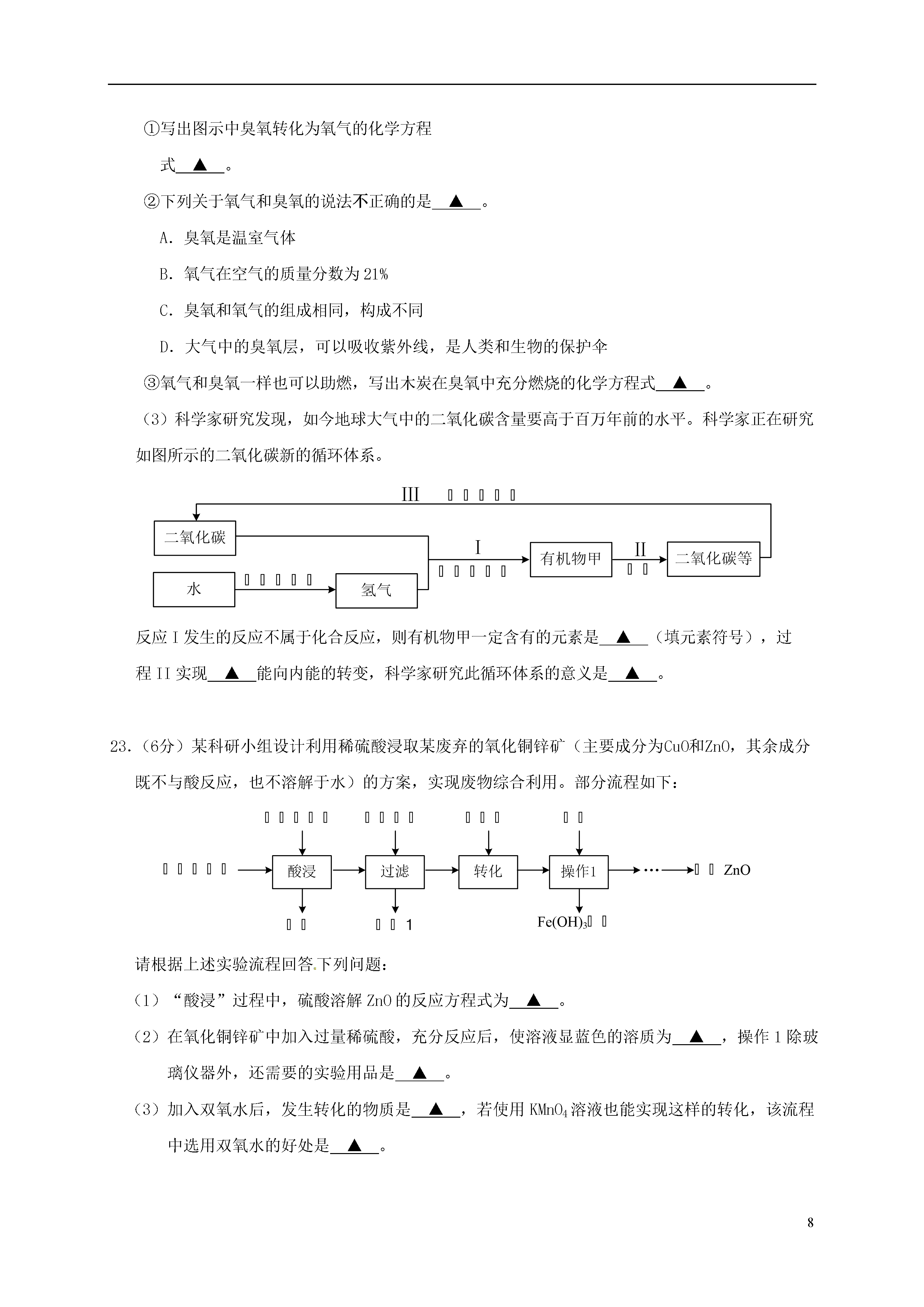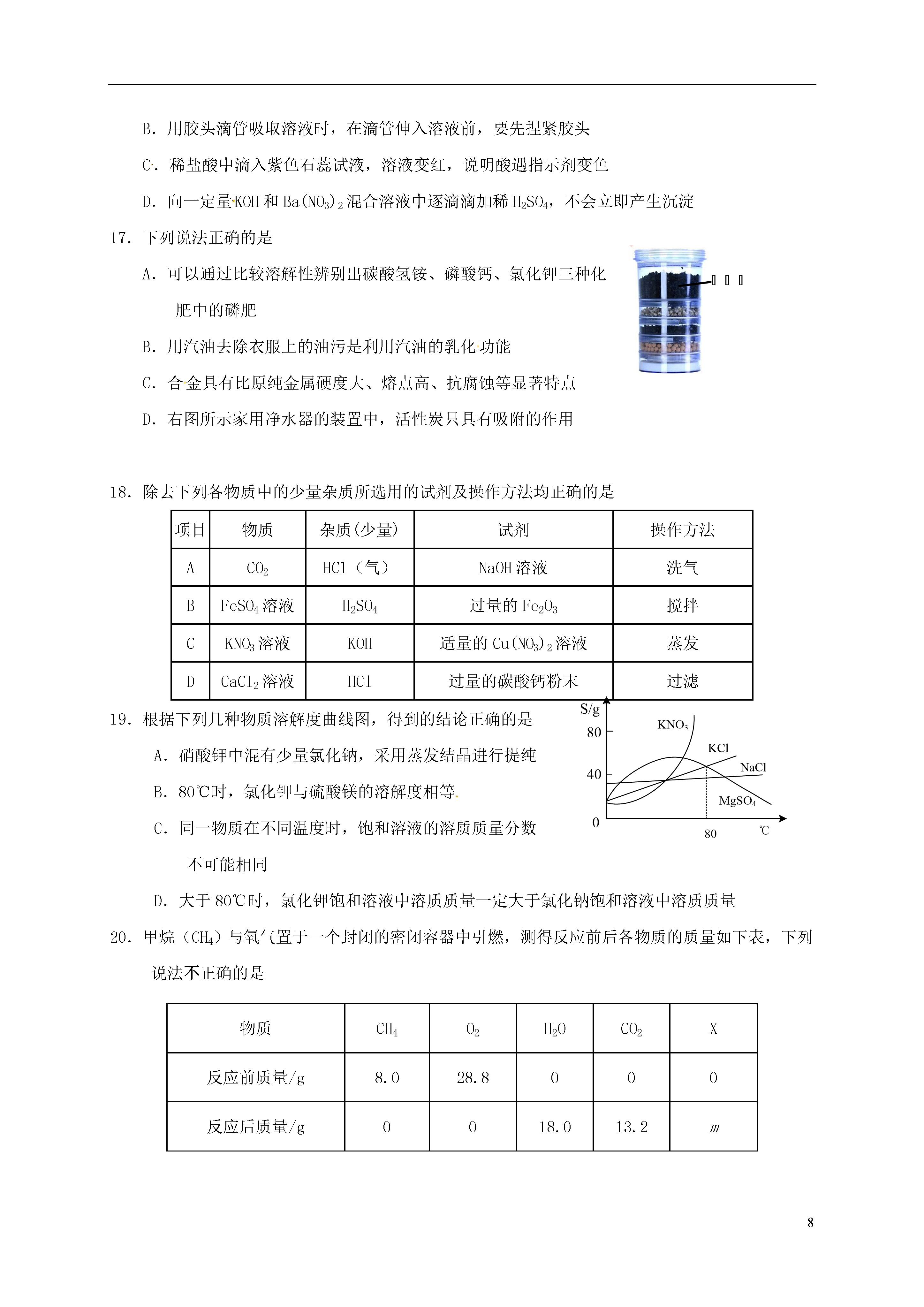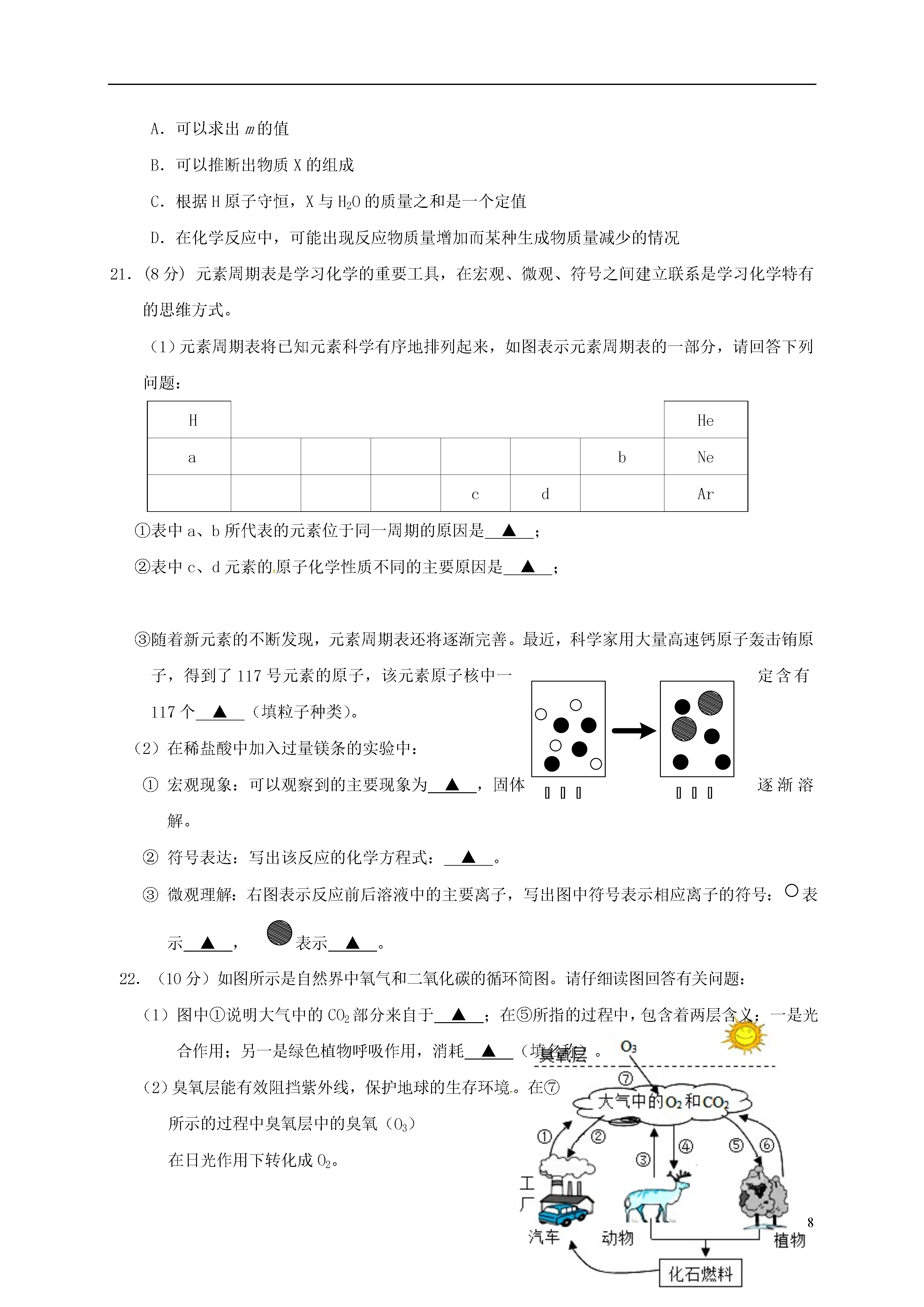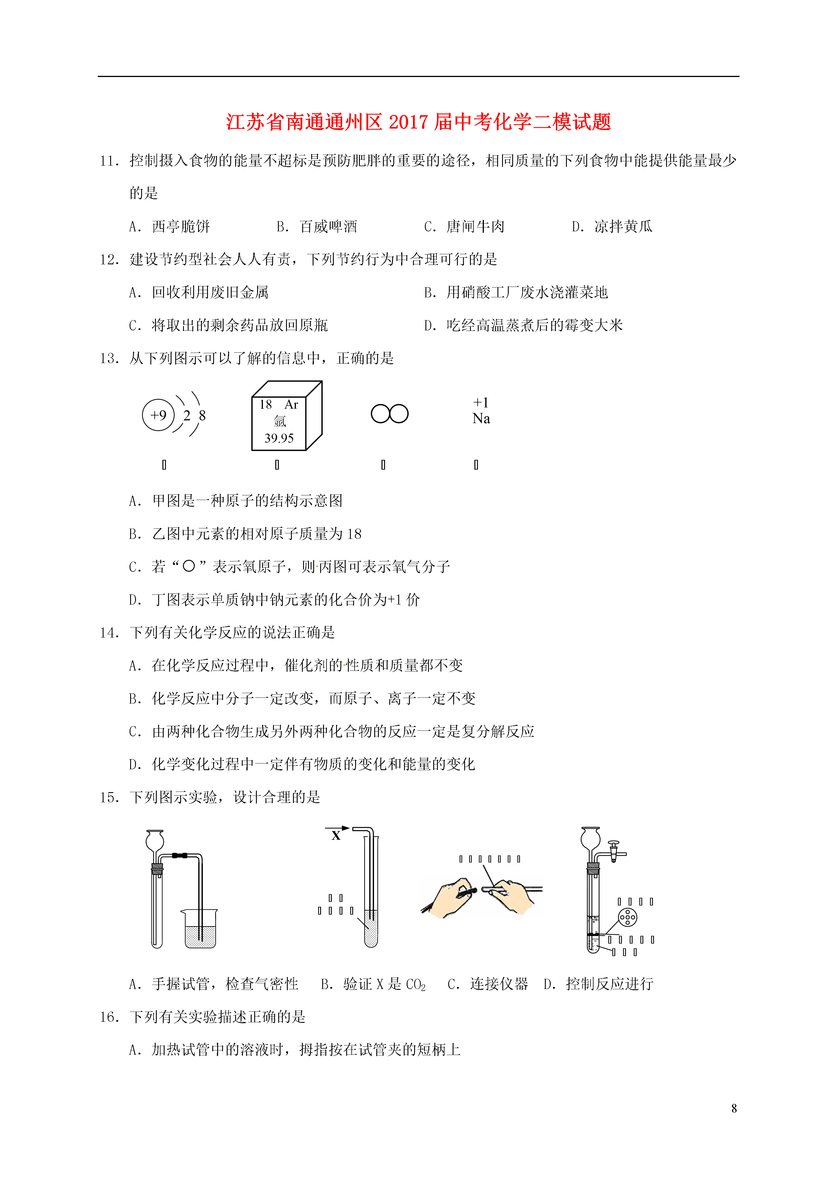 8江苏省南通通州区2017届中考化学二模试题11.控制摄入食物的能量不超标是预防肥胖的重要的途径,相同质量的下列食物中能提供能量最少的是A.西亭脆饼B.百威啤酒C.唐闸牛肉D.凉拌黄瓜12.建设节约型社会人人有责,下列节约行为中合理可行的是A.回收利用废旧金属B.用硝酸工厂废水浇灌菜地C.将取出的剩余药品放回原瓶D.吃经高温蒸煮后的霉变大米13.从下列图示可以了解的信息中,正确的是A.甲图是一种原子的结构示意图B.乙图中元素的相对原子质量为18C.若“”表示氧原子,则丙图可表示氧气分子D.丁图表示单质钠中钠元素的化合价为+1价14.下列有关化学反应的说法正确是A.在化学反应过程中,催化剂的性质和质量都不变B.化学反应中分子一定改变,而原子、离子一定不变C.由两种化合物生成另外两种化合物的反应一定是复分解反应D.化学变化过程中一定伴有物质的变化和能量的变化15.下列图示实验,设计合理的是A.手握试管,检查气密性B.验证X是CO2C.连接仪器D.控制反应进行16.下列有关实验描述正确的是A.加热试管中的溶液时,拇指按在试管夹的短柄上B.用胶头滴管吸取溶液时,在滴管伸入溶液前,要先捏紧胶头C.稀盐酸中滴入紫色石蕊试液,溶液变红,说明酸遇指示剂变色D.向一定量KOH和Ba(NO3)2混合溶液中逐滴滴加稀H2SO4,不会立即产生沉淀17.下列说法正确的是A.可以通过比较溶解性辨别出碳酸氢铵、磷酸钙、氯化钾三种化肥中的磷肥B.用汽油去除衣服上的油污是利用汽油的乳化功能C.合金具有比原纯金属硬度大、熔点高、抗腐蚀等显著特点D.右图所示家用净水器的装置中,活性炭只具有吸附的作用18.除去下列各物质中的少量杂质所选用的试剂及操作方法均正确的是项目物质杂质(少量)试剂操作方法ACO2HCl(气)NaOH溶液洗气BFeSO4溶液H2SO4过量的Fe2O3搅拌CKNO3溶液KOH适量的Cu(NO3)2溶液蒸发DCaCl2溶液HCl过量的碳酸钙粉末过滤19.根据下列几种物质溶解度曲线图,得到的结论正确的是A.硝酸钾中混有少量氯化钠,采用蒸发结晶进行提纯B.80℃时,氯化钾与硫酸镁的溶解度相等C.同一物质在不同温度时,饱和溶液的溶质质量分数不可能相同D.大于80℃时,氯化钾饱和溶液中溶质质量一定大于氯化钠饱和溶液中溶质质量20.甲烷(CH4)与氧气置于一个封闭的密闭容器中引燃,测得反应前后各物质的质量如下表,下列说法不正确的是物质CH4O2H2OCO2X反应前质量/g8.028.8000反应后质量/g0018.013.2mA.可以求出m的值B.可以推断出物质X的组成C.根据H原子守恒,X与H2O的质量之和是一个定值D.在化学反应中,可能出现反应物质量增加而某种生成物质量减少的情况21.(8分)元素周期表是学习化学的重要工具,在宏观、微观、符号之间建立联系是学习化学特有的思维方式。(1)元素周期表将已知元素科学有序地排列起来,如图表示元素周期表的一部分,请回答下列问题:HHeabNecdAr①表中a、b所代表的元素位于同一周期的原因是▲;②表中c、d元素的原子化学性质不同的主要原因是▲;③随着新元素的不断发现,元素周期表还将逐渐完善。最近,科学家用大量高速钙原子轰击铕原子,得到了117号元素的原子,该元素原子核中一定含有117个▲(填粒子种类)。(2)在稀盐酸中加入过量镁条的实验中:①宏观现象:可以观察到的主要现象为▲,固体逐渐溶解。②符号表达:写出该反应的化学方程式:▲。③微观理解:右图表示反应前后溶液中的主要离子,写出图中符号表示相应离子的符号:表示▲,表示▲。22.(10分)如图所示是自然界中氧气和二氧化碳的循环简图。请仔细读图回答有关问题:(1)图中①说明大气中的CO2部分来自于▲;在⑤所指的过程中,包含着两层含义:一是光合作用;另一是绿色植物呼吸作用,消耗▲(填名称)。(2)臭氧层能有效阻挡紫外线,保护地球的生存环境。在⑦所示的过程中臭氧层中的臭氧(O3)在日光作用下转化成O2。①写出图示中臭氧转化为氧气的化学方程式▲。②下列关于氧气和臭氧的说法不正确的是▲。A.臭氧是温室气体B.氧气在空气的质量分数为21%C.臭氧和氧气的组成相同,构成不同D.大气中的臭氧层,可以吸收紫外线,是人类和生物的保护伞③氧气和臭氧一样也可以助燃,写出木炭在臭氧中充分燃烧的化学方程式▲。(3)科学家研究发现,如今地球大气中的二氧化碳含量要高于百万年前的水平。科学家正在研究如图所示的二氧化碳新的循环体系。反应I发生的反应不属于化合反应,则有机物甲一定含有的元素是▲(填元素符号),过程II实现▲能向内能的转变,科学家研究此循