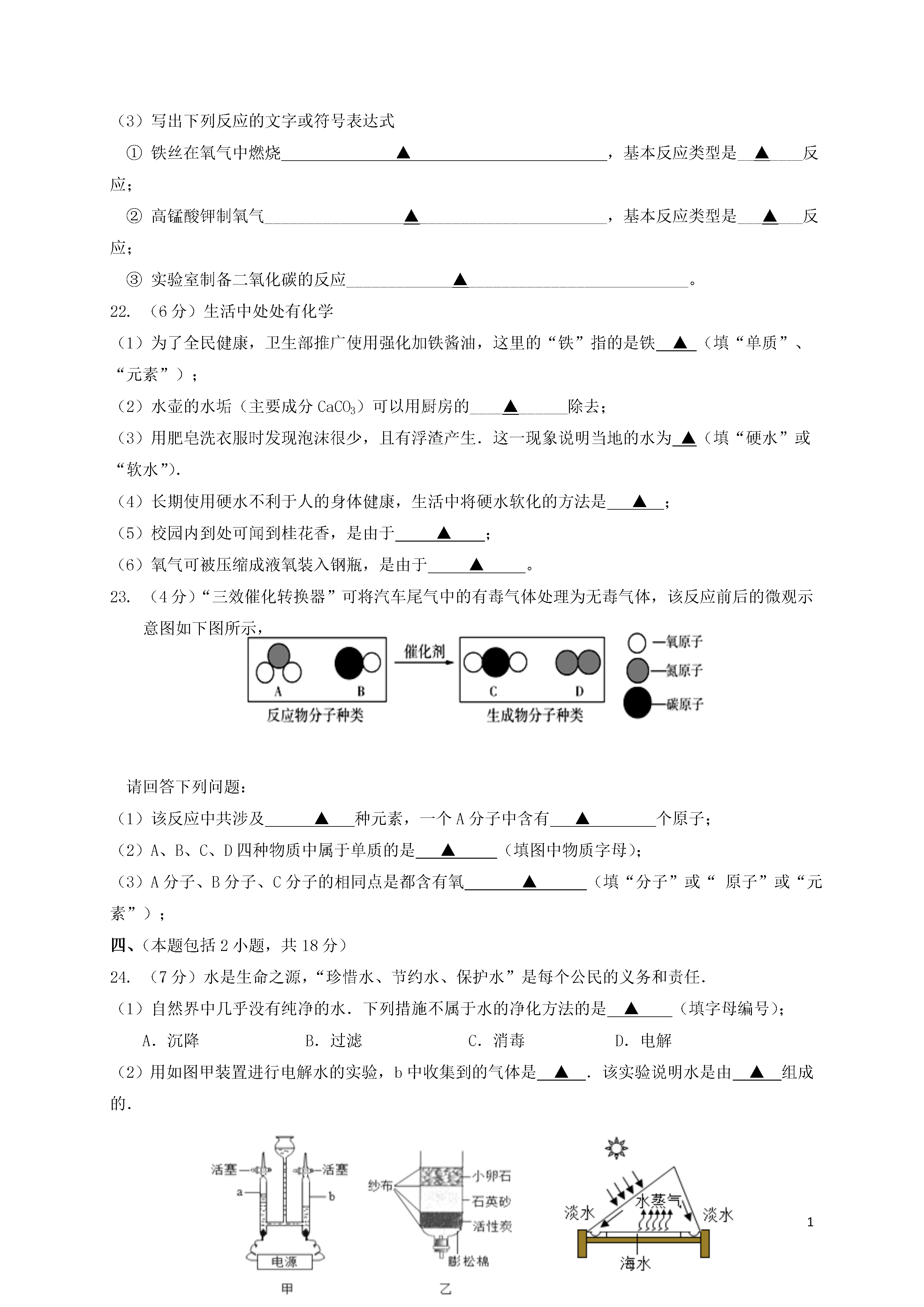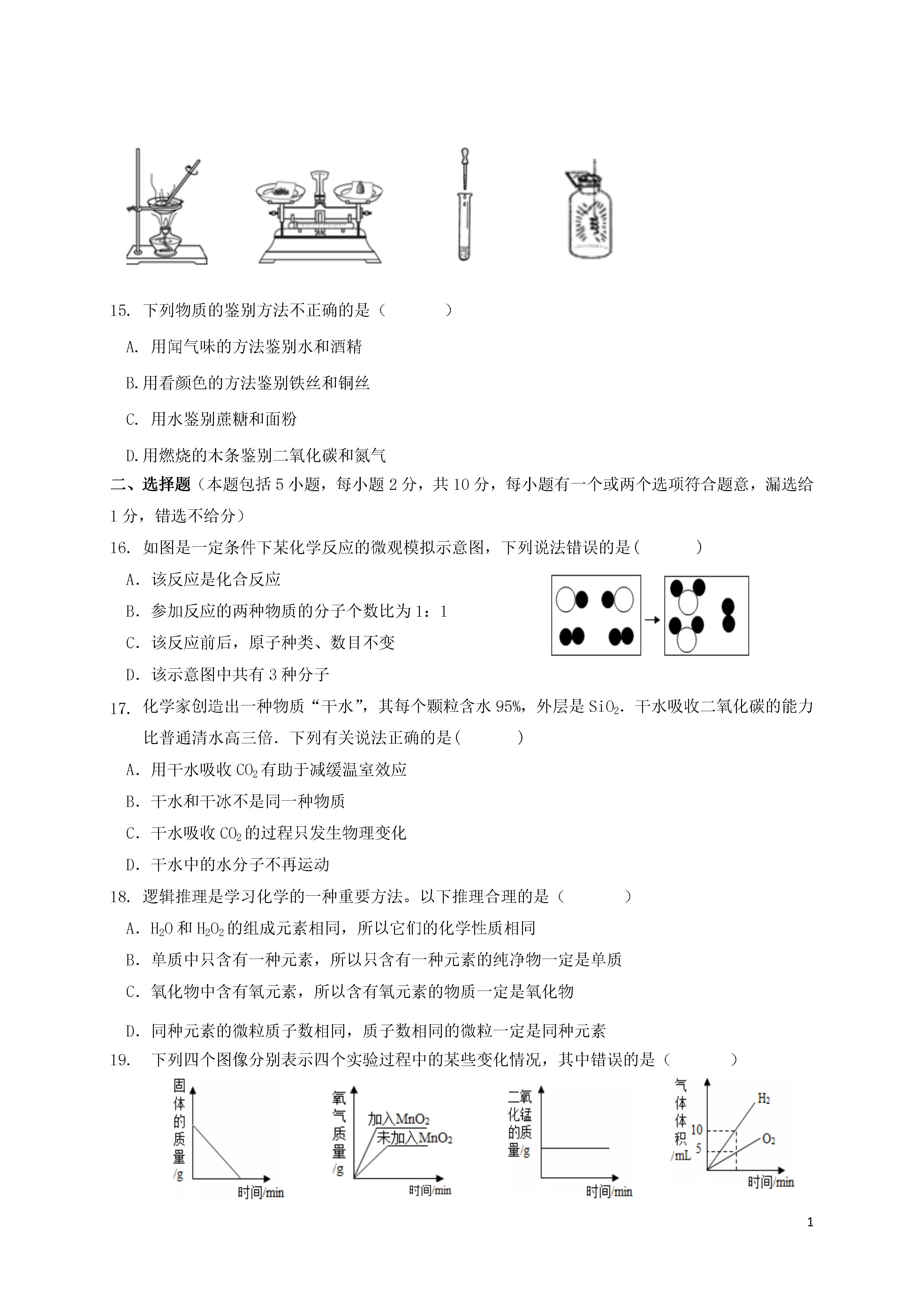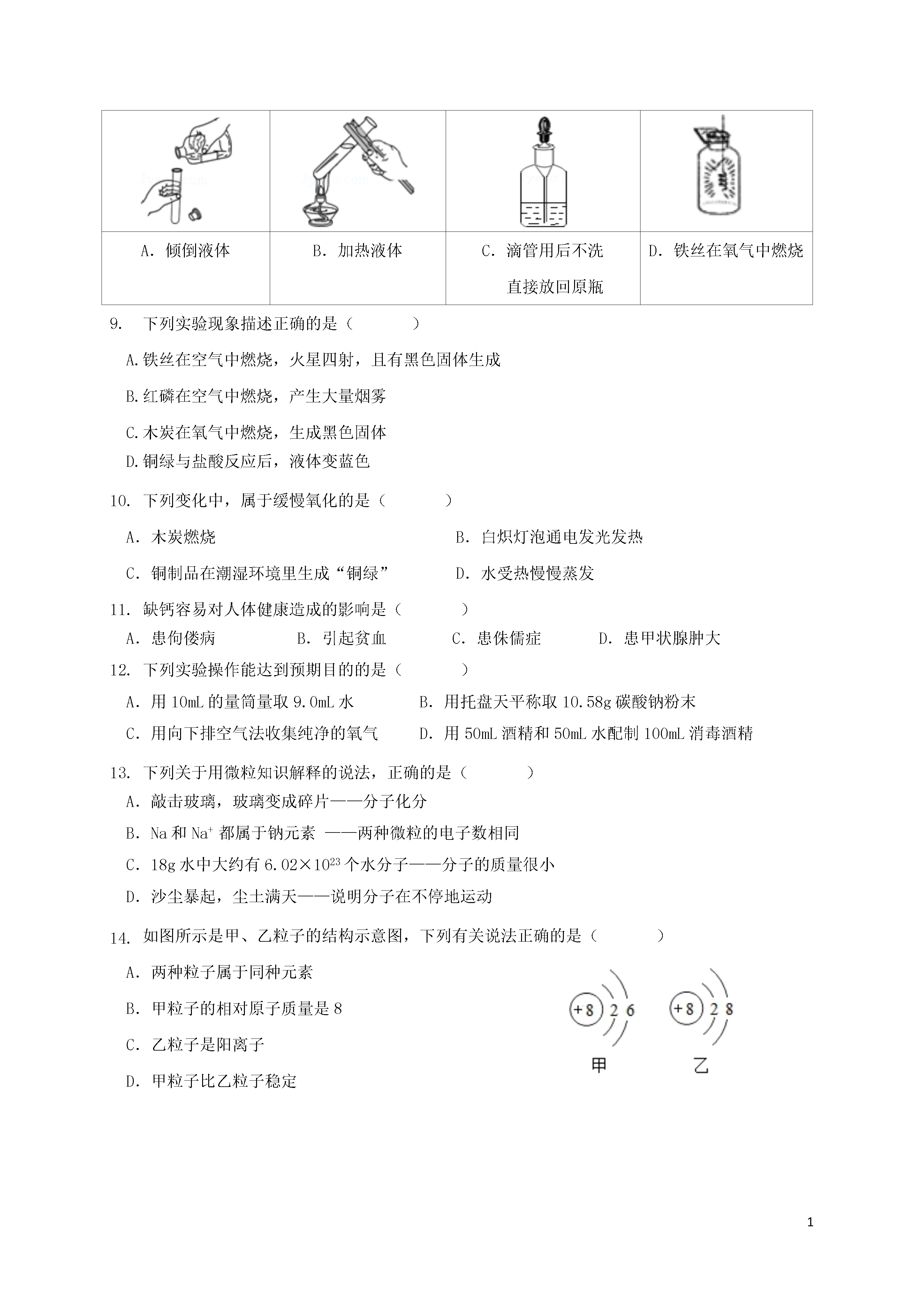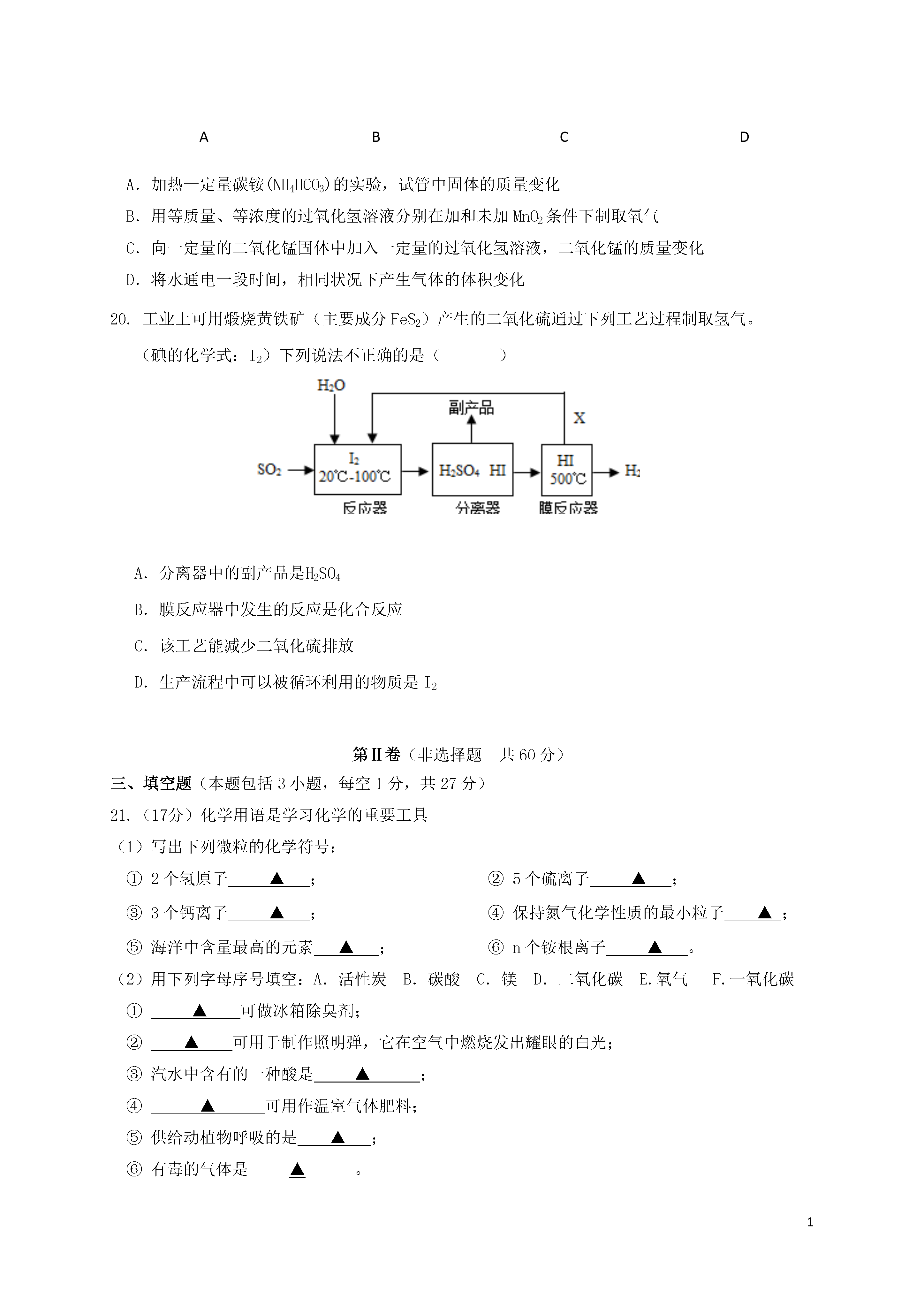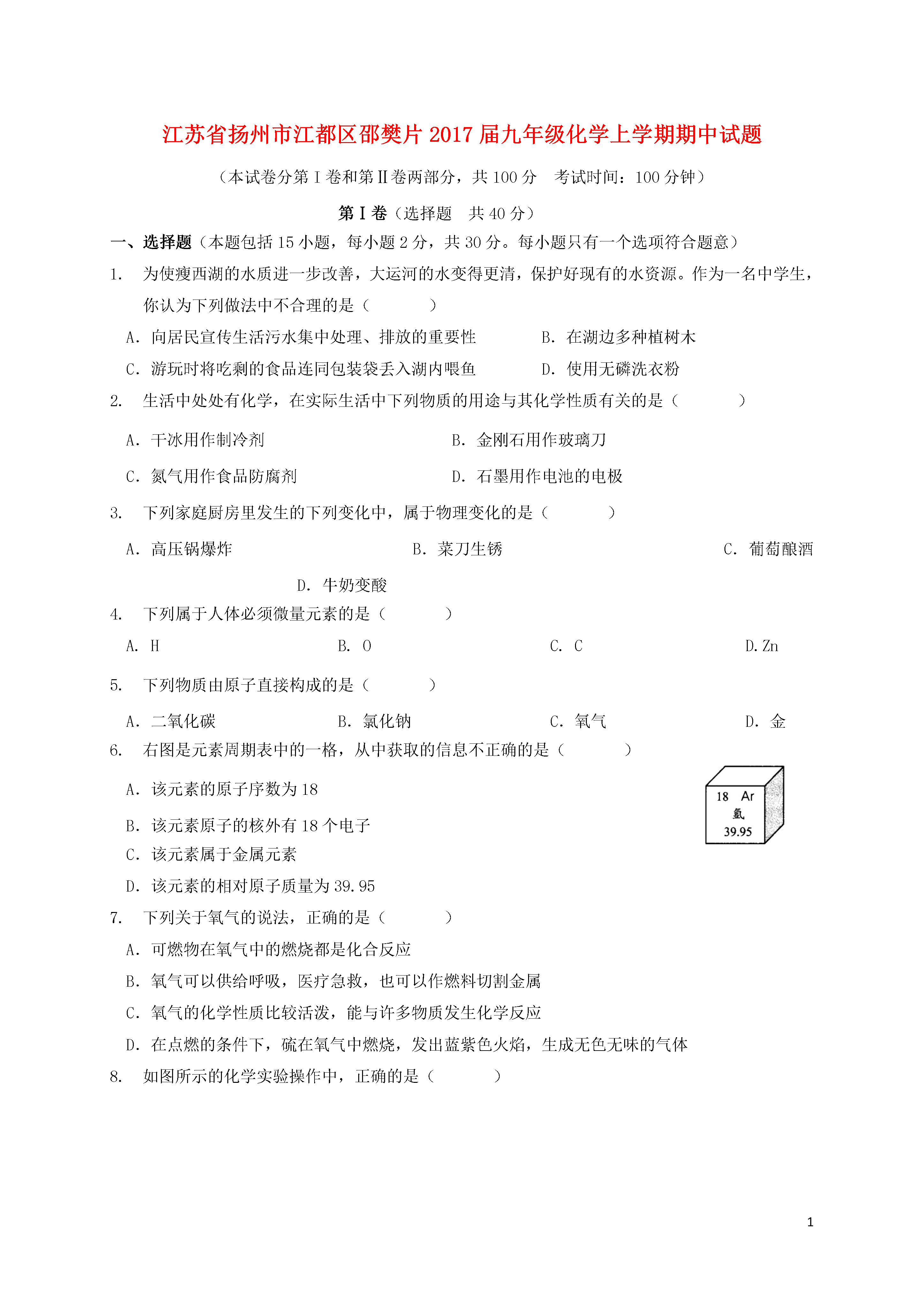 1江苏省扬州市江都区邵樊片2017届九年级化学上学期期中试题(本试卷分第I卷和第Ⅱ卷两部分,共100分考试时间:100分钟)第Ⅰ卷(选择题共40分)一、选择题(本题包括15小题,每小题2分,共30分。每小题只有一个选项符合题意)为使瘦西湖的水质进一步改善,大运河的水变得更清,保护好现有的水资源。作为一名中学生,你认为下列做法中不合理的是()A.向居民宣传生活污水集中处理、排放的重要性B.在湖边多种植树木C.游玩时将吃剩的食品连同包装袋丢入湖内喂鱼D.使用无磷洗衣粉生活中处处有化学,在实际生活中下列物质的用途与其化学性质有关的是()A.干冰用作制冷剂B.金刚石用作玻璃刀C.氮气用作食品防腐剂D.石墨用作电池的电极下列家庭厨房里发生的下列变化中,属于物理变化的是()A.高压锅爆炸B.菜刀生锈C.葡萄酿酒D.牛奶变酸下列属于人体必须微量元素的是()A.HB.OC.CD.Zn下列物质由原子直接构成的是()A.二氧化碳B.氯化钠C.氧气D.金右图是元素周期表中的一格,从中获取的信息不正确的是()A.该元素的原子序数为18B.该元素原子的核外有18个电子C.该元素属于金属元素D.该元素的相对原子质量为39.95下列关于氧气的说法,正确的是()A.可燃物在氧气中的燃烧都是化合反应B.氧气可以供给呼吸,医疗急救,也可以作燃料切割金属C.氧气的化学性质比较活泼,能与许多物质发生化学反应D.在点燃的条件下,硫在氧气中燃烧,发出蓝紫色火焰,生成无色无味的气体如图所示的化学实验操作中,正确的是()A.倾倒液体B.加热液体C.滴管用后不洗直接放回原瓶D.铁丝在氧气中燃烧下列实验现象描述正确的是()A.铁丝在空气中燃烧,火星四射,且有黑色固体生成B.红磷在空气中燃烧,产生大量烟雾C.木炭在氧气中燃烧,生成黑色固体D.铜绿与盐酸反应后,液体变蓝色下列变化中,属于缓慢氧化的是()A.木炭燃烧B.白炽灯泡通电发光发热C.铜制品在潮湿环境里生成“铜绿”D.水受热慢慢蒸发缺钙容易对人体健康造成的影响是()A.患佝偻病B.引起贫血C.患侏儒症D.患甲状腺肿大下列实验操作能达到预期目的的是()A.用10mL的量筒量取9.0mL水B.用托盘天平称取10.58g碳酸钠粉末C.用向下排空气法收集纯净的氧气D.用50mL酒精和50mL水配制100mL消毒酒精下列关于用微粒知识解释的说法,正确的是()A.敲击玻璃,玻璃变成碎片——分子化分B.Na和Na+都属于钠元素——两种微粒的电子数相同C.18g水中大约有6.02×1023个水分子——分子的质量很小D.沙尘暴起,尘土满天——说明分子在不停地运动如图所示是甲、乙粒子的结构示意图,下列有关说法正确的是()A.两种粒子属于同种元素B.甲粒子的相对原子质量是8C.乙粒子是阳离子D.甲粒子比乙粒子稳定下列物质的鉴别方法不正确的是()A.用闻气味的方法鉴别水和酒精B.用看颜色的方法鉴别铁丝和铜丝C.用水鉴别蔗糖和面粉D.用燃烧的木条鉴别二氧化碳和氮气二、选择题(本题包括5小题,每小题2分,共10分,每小题有一个或两个选项符合题意,漏选给1分,错选不给分)如图是一定条件下某化学反应的微观模拟示意图,下列说法错误的是()A.该反应是化合反应B.参加反应的两种物质的分子个数比为1:1C.该反应前后,原子种类、数目不变D.该示意图中共有3种分子化学家创造出一种物质“干水”,其每个颗粒含水95%,外层是SiO2.干水吸收二氧化碳的能力比普通清水高三倍.下列有关说法正确的是()A.用干水吸收CO2有助于减缓温室效应B.干水和干冰不是同一种物质C.干水吸收CO2的过程只发生物理变化D.干水中的水分子不再运动逻辑推理是学习化学的一种重要方法。以下推理合理的是()A.H2O和H2O2的组成元素相同,所以它们的化学性质相同B.单质中只含有一种元素,所以只含有一种元素的纯净物一定是单质C.氧化物中含有氧元素,所以含有氧元素的物质一定是氧化物D.同种元素的微粒质子数相同,质子数相同的微粒一定是同种元素下列四个图像分别表示四个实验过程中的某些变化情况,其中错误的是()ABCDA.加热一定量碳铵(NH4HCO3)的实验,试管中固体的质量变化B.用等质量、等浓度的过氧化氢溶液分别在加和未加MnO2条件下制取氧气C.向一定量的二氧化锰固体中加入一定量的过氧化氢溶液,二氧化锰的质量变化D.将水通电一段时间,相同状况下产生气体的体积变化工业上可用煅烧黄铁矿(主要成分FeS2)产生的二氧化硫通过下列工艺过程制取氢气。(碘的化