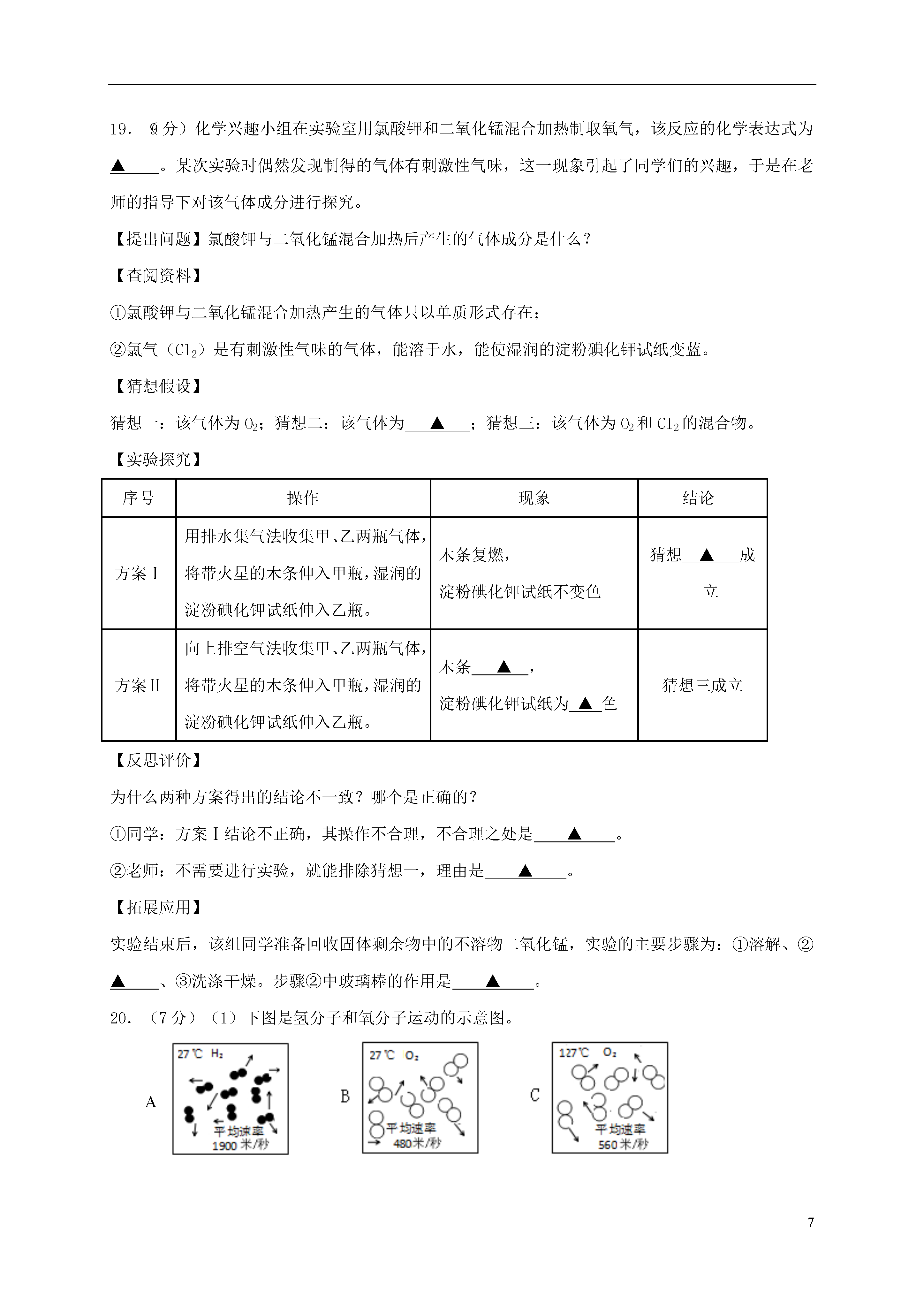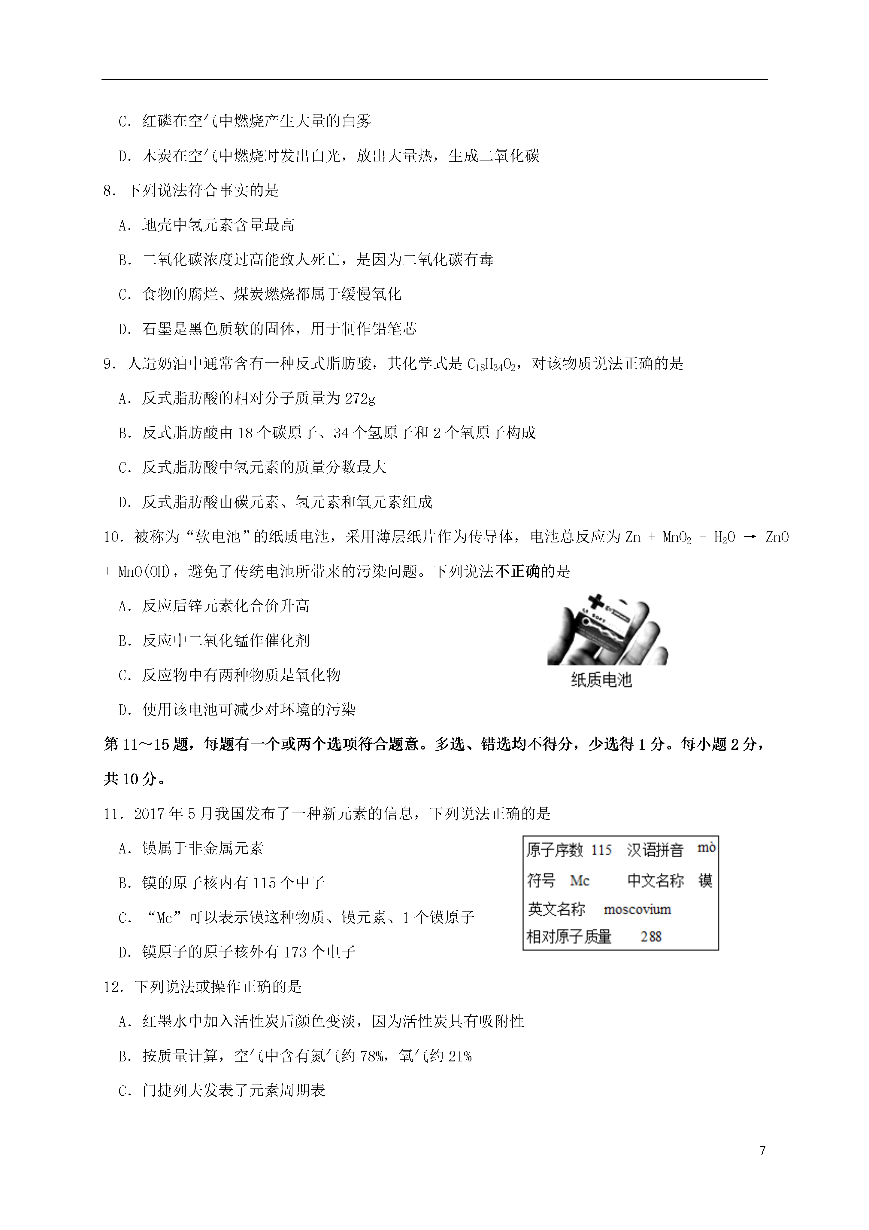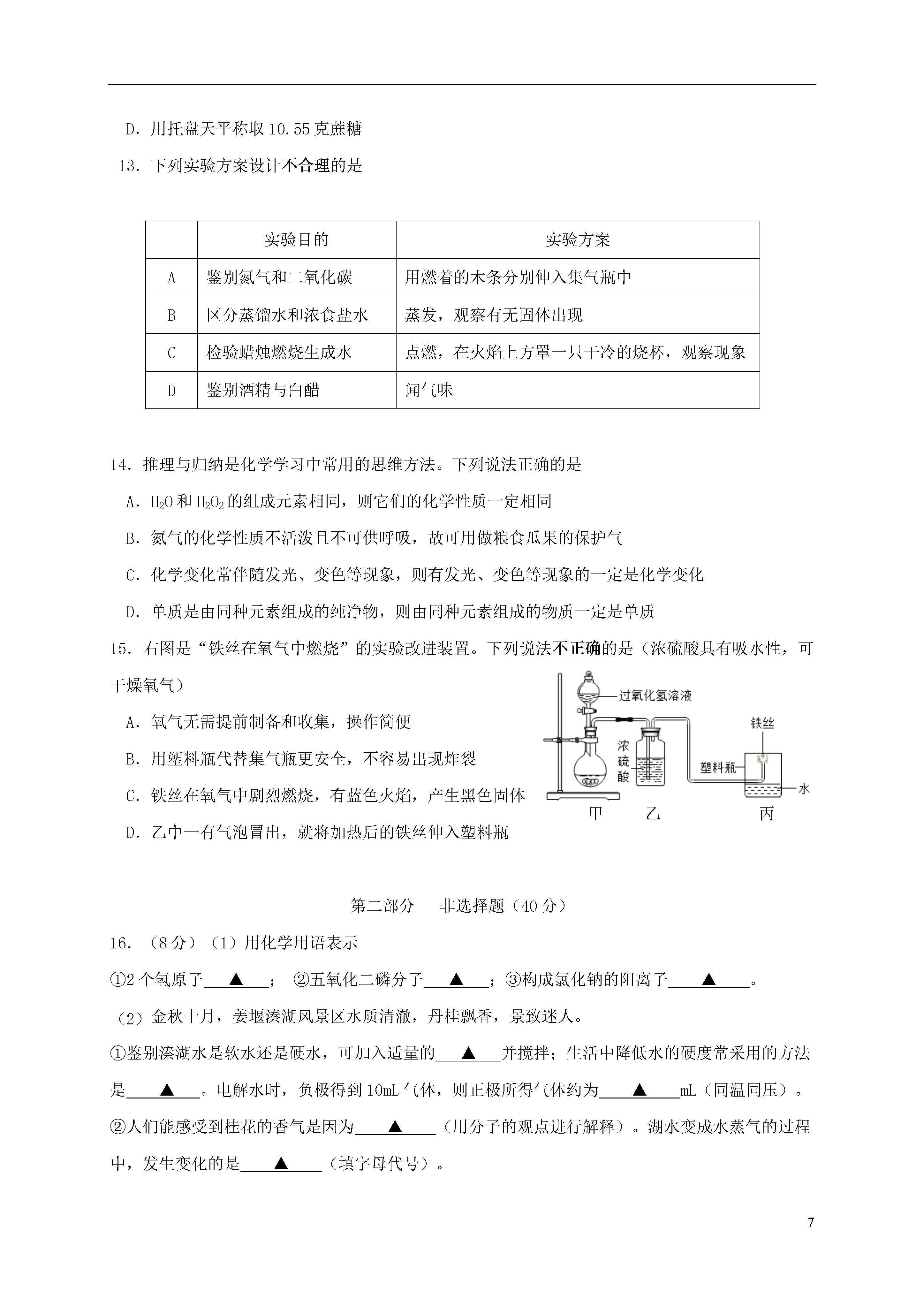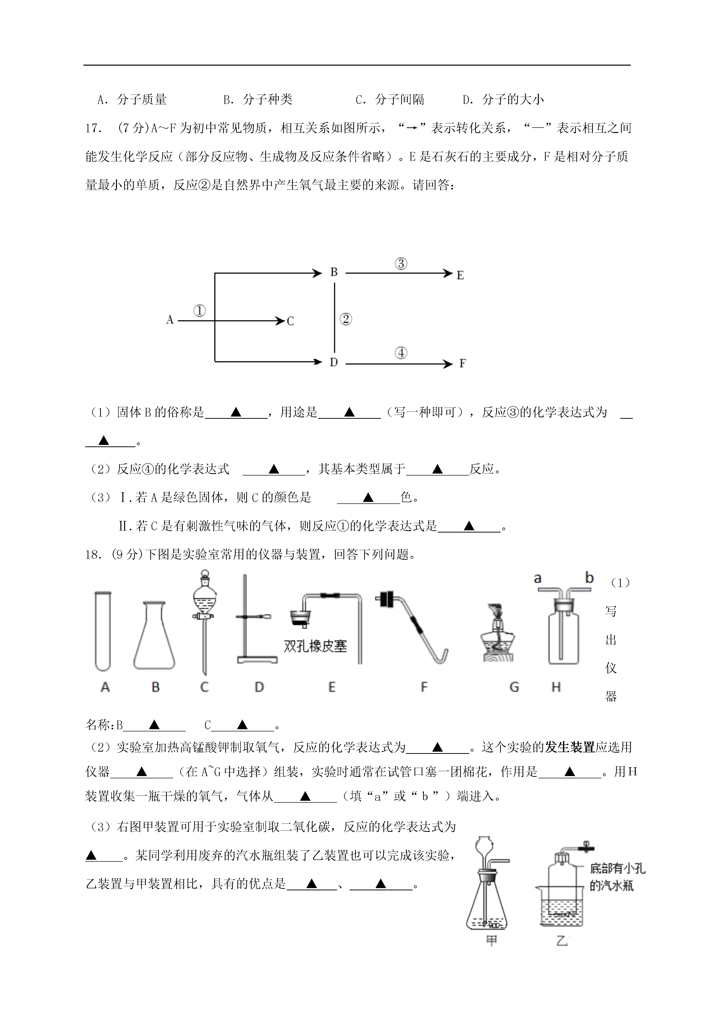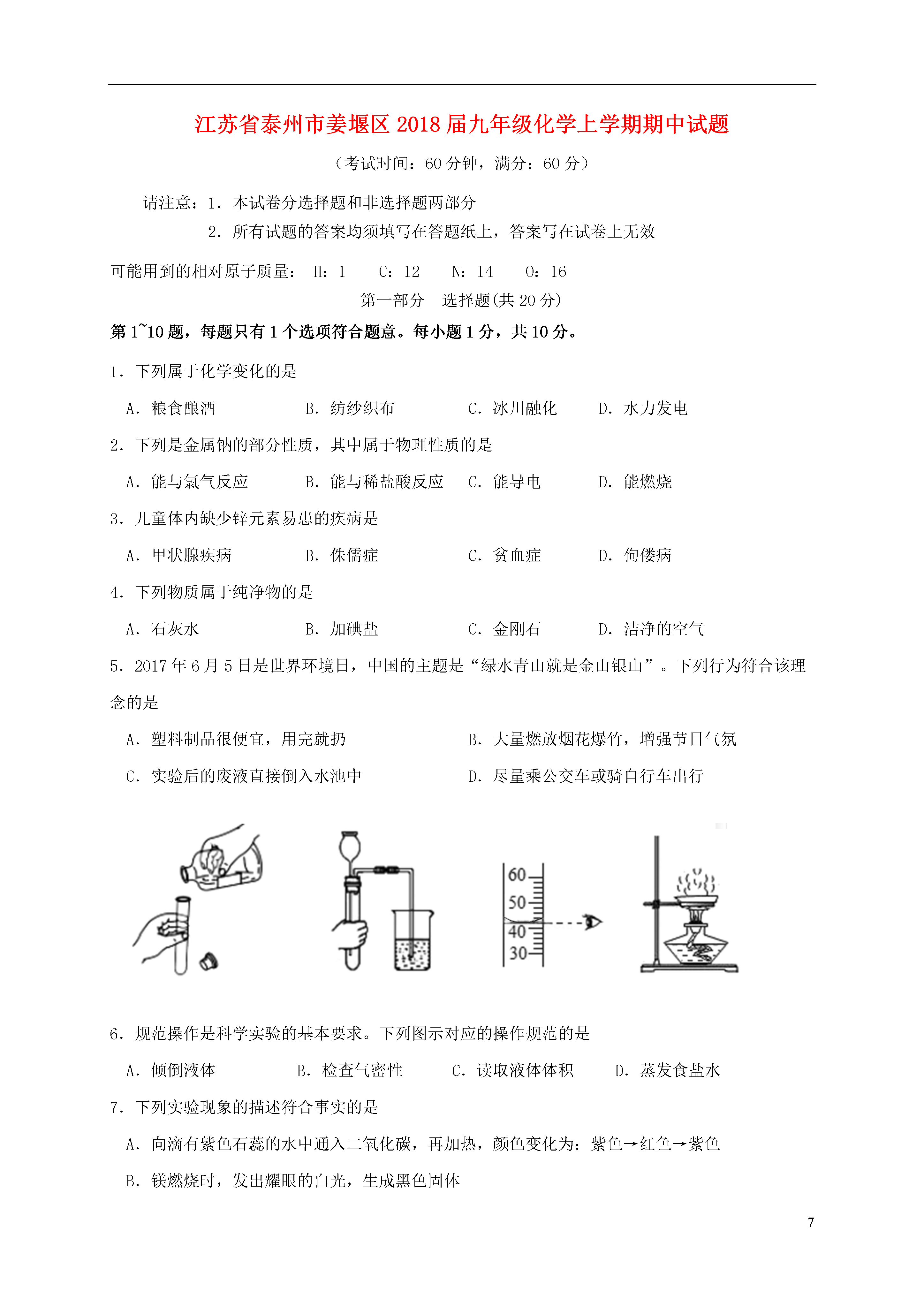 7江苏省泰州市姜堰区2018届九年级化学上学期期中试题(考试时间:60分钟,满分:60分)请注意:1.本试卷分选择题和非选择题两部分2.所有试题的答案均须填写在答题纸上,答案写在试卷上无效可能用到的相对原子质量:H:1C:12N:14O:16第一部分选择题(共20分)第1~10题,每题只有1个选项符合题意。每小题1分,共10分。1.下列属于化学变化的是A.粮食酿酒B.纺纱织布C.冰川融化D.水力发电2.下列是金属钠的部分性质,其中属于物理性质的是A.能与氯气反应B.能与稀盐酸反应C.能导电D.能燃烧3.儿童体内缺少锌元素易患的疾病是A.甲状腺疾病B.侏儒症C.贫血症D.佝偻病4.下列物质属于纯净物的是A.石灰水B.加碘盐C.金刚石D.洁净的空气5.2017年6月5日是世界环境日,中国的主题是“绿水青山就是金山银山”。下列行为符合该理念的是A.塑料制品很便宜,用完就扔B.大量燃放烟花爆竹,增强节日气氛C.实验后的废液直接倒入水池中D.尽量乘公交车或骑自行车出行6.规范操作是科学实验的基本要求。下列图示对应的操作规范的是A.倾倒液体B.检查气密性C.读取液体体积D.蒸发食盐水7.下列实验现象的描述符合事实的是A.向滴有紫色石蕊的水中通入二氧化碳,再加热,颜色变化为:紫色→红色→紫色B.镁燃烧时,发出耀眼的白光,生成黑色固体C.红磷在空气中燃烧产生大量的白雾D.木炭在空气中燃烧时发出白光,放出大量热,生成二氧化碳8.下列说法符合事实的是A.地壳中氢元素含量最高B.二氧化碳浓度过高能致人死亡,是因为二氧化碳有毒C.食物的腐烂、煤炭燃烧都属于缓慢氧化D.石墨是黑色质软的固体,用于制作铅笔芯9.人造奶油中通常含有一种反式脂肪酸,其化学式是C18H34O2,对该物质说法正确的是A.反式脂肪酸的相对分子质量为272gB.反式脂肪酸由18个碳原子、34个氢原子和2个氧原子构成C.反式脂肪酸中氢元素的质量分数最大D.反式脂肪酸由碳元素、氢元素和氧元素组成10.被称为“软电池”的纸质电池,采用薄层纸片作为传导体,电池总反应为Zn+MnO2+H2O→ZnO+MnO(OH),避免了传统电池所带来的污染问题。下列说法不正确的是反应后锌元素化合价升高反应中二氧化锰作催化剂C.反应物中有两种物质是氧化物D.使用该电池可减少对环境的污染第11~15题,每题有一个或两个选项符合题意。多选、错选均不得分,少选得1分。每小题2分,共10分。11.2017年5月我国发布了一种新元素的信息,下列说法正确的是A.镆属于非金属元素B.镆的原子核内有115个中子C.“Mc”可以表示镆这种物质、镆元素、1个镆原子D.镆原子的原子核外有173个电子12.下列说法或操作正确的是A.红墨水中加入活性炭后颜色变淡,因为活性炭具有吸附性B.按质量计算,空气中含有氮气约78%,氧气约21%C.门捷列夫发表了元素周期表D.用托盘天平称取10.55克蔗糖13.下列实验方案设计不合理的是实验目的实验方案A鉴别氮气和二氧化碳用燃着的木条分别伸入集气瓶中B区分蒸馏水和浓食盐水蒸发,观察有无固体出现C检验蜡烛燃烧生成水点燃,在火焰上方罩一只干冷的烧杯,观察现象D鉴别酒精与白醋闻气味14.推理与归纳是化学学习中常用的思维方法。下列说法正确的是A.H2O和H2O2的组成元素相同,则它们的化学性质一定相同B.氮气的化学性质不活泼且不可供呼吸,故可用做粮食瓜果的保护气C.化学变化常伴随发光、变色等现象,则有发光、变色等现象的一定是化学变化D.单质是由同种元素组成的纯净物,则由同种元素组成的物质一定是单质甲乙丙15.右图是“铁丝在氧气中燃烧”的实验改进装置。下列说法不正确的是(浓硫酸具有吸水性,可干燥氧气)A.氧气无需提前制备和收集,操作简便B.用塑料瓶代替集气瓶更安全,不容易出现炸裂C.铁丝在氧气中剧烈燃烧,有蓝色火焰,产生黑色固体D.乙中一有气泡冒出,就将加热后的铁丝伸入塑料瓶第二部分非选择题(40分)16.(8分)(1)用化学用语表示①2个氢原子▲;②五氧化二磷分子▲;③构成氯化钠的阳离子▲。金秋十月,姜堰溱湖风景区水质清澈,丹桂飘香,景致迷人。①鉴别溱湖水是软水还是硬水,可加入适量的▲并搅拌;生活中降低水的硬度常采用的方法是▲。电解水时,负极得到10mL气体,则正极所得气体约为▲mL(同温同压)。②人们能感受到桂花的香气是因为▲(用分子的观点进行解释)。湖水变成水蒸气的过程中,发生变化的是▲(填字母代号)。A.分子质量B.分子种类C.分子间隔D.分子的大小17.(7分)A~F为初中常见物质,相互关系如图所示,“→”表示转化关系,“—