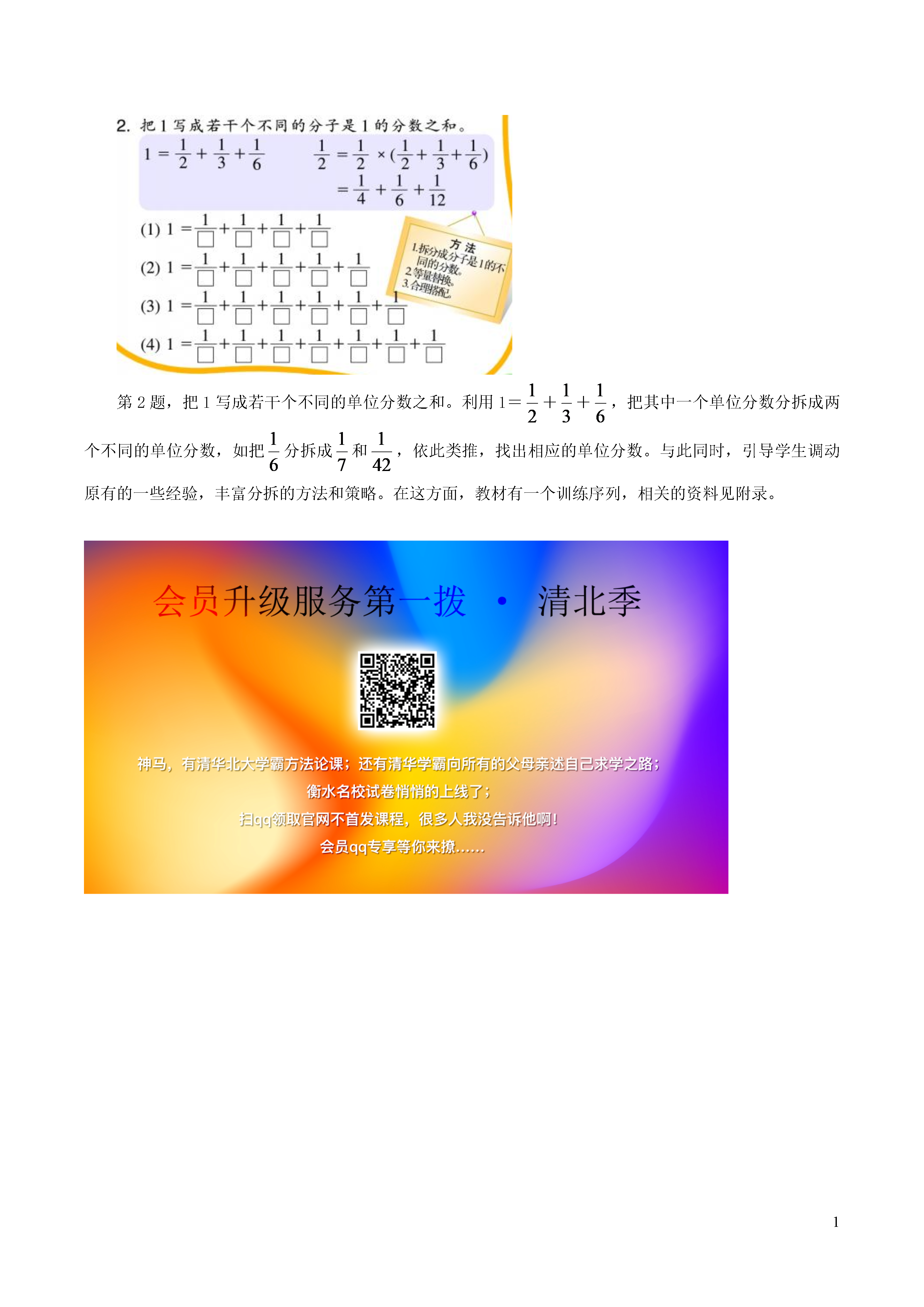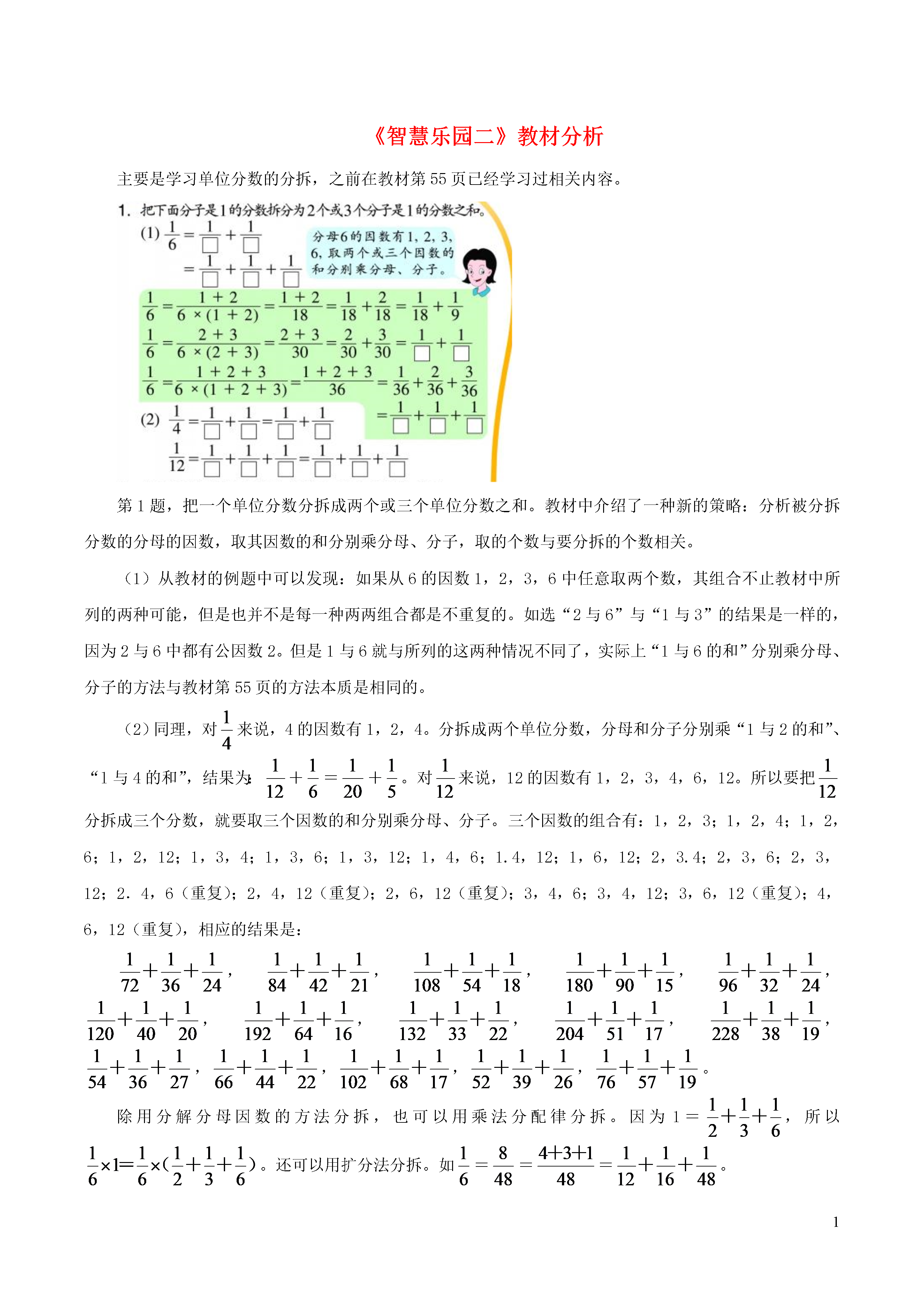 1《智慧乐园二》教材分析主要是学习单位分数的分拆,之前在教材已经学习过相关内容。第1题,把一个单位分数分拆成两个或三个单位分数之和。教材中介绍了一种新的策略:分析被分拆分数的分母的因数,取其因数的和分别乘分母、分子,取的个数与要分拆的个数相关。(1)从教材的例题中可以发现:如果从6的因数1,2,3,6中任意取两个数,其组合不止教材中所列的两种可能,但是也并不是每一种两两组合都是不重复的。如选“2与6”与“1与3”的结果是一样的,因为2与6中都有公因数2。但是1与6就与所列的这两种情况不同了,实际上“1与6的和”分别乘分母、分子的方法与教材的方法本质是相同的。(2)同理,对来说,4的因数有1,2,4。分拆成两个单位分数,分母和分子分别乘“1与2的和”、“l与4的和”,结果为:+=+。对来说,12的因数有1,2,3,4,6,12。所以要把分拆成三个分数,就要取三个因数的和分别乘分母、分子。三个因数的组合有:1,2,3;1,2,4;1,2,6;1,2,12;1,3,4;1,3,6;1,3,12;1,4,6;1.4,12;1,6,12;2,3.4;2,3,6;2,3,12;2.4,6(重复);2,4,12(重复);2,6,12(重复);3,4,6;3,4,12;3,6,12(重复);4,6,12(重复),相应的结果是:,,,,,,,,,,,,,,。除用分解分母因数的方法分拆,也可以用乘法分配律分拆。因为1=,所以。还可以用扩分法分拆。如===。第2题,把1写成若干个不同的单位分数之和。利用1=++,把其中一个单位分数分拆成两个不同的单位分数,如把分拆成和,依此类推,找出相应的单位分数。与此同时,引导学生调动原有的一些经验,丰富分拆的方法和策略。在这方面,教材有一个训练序列,相关的资料见附录。