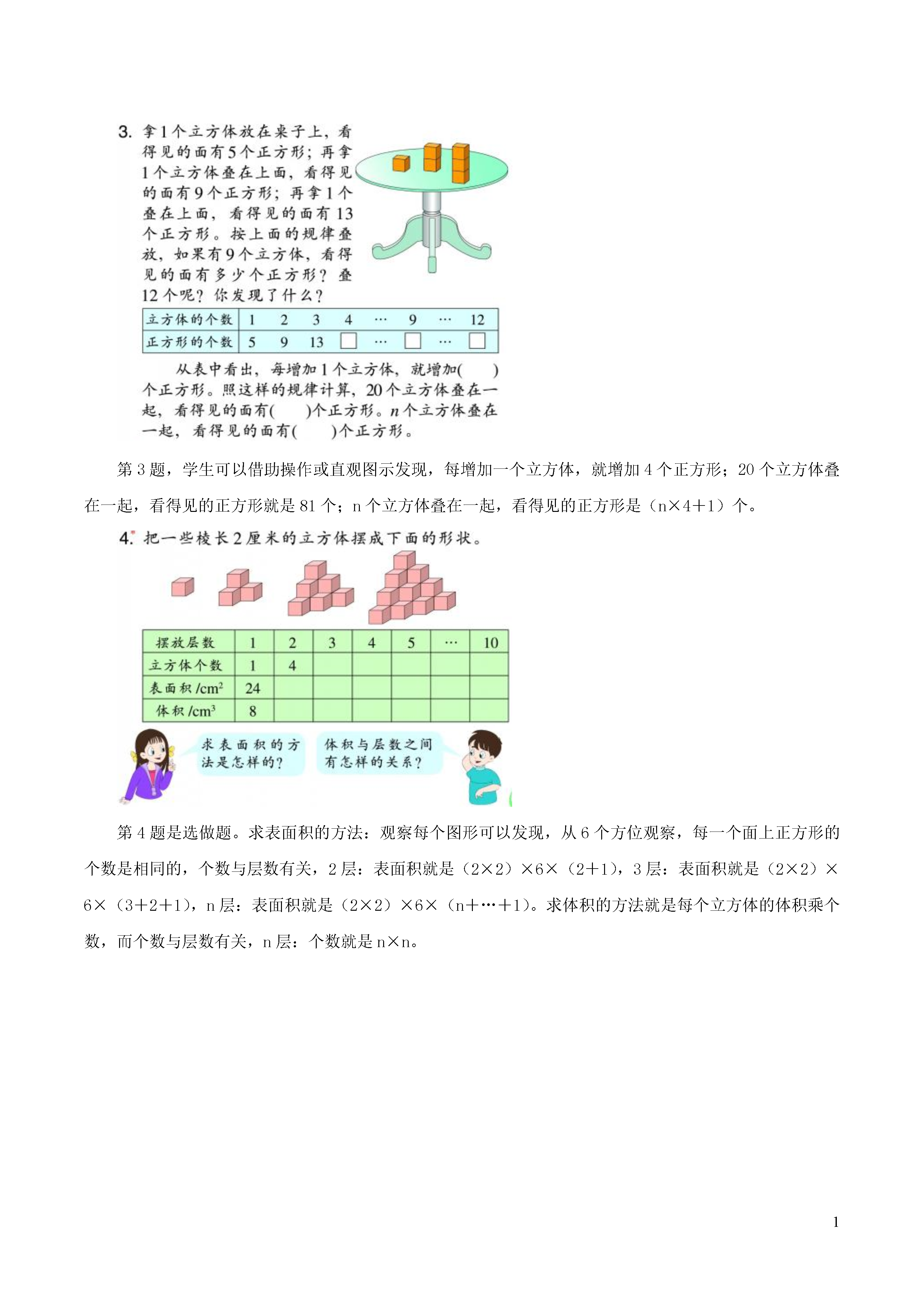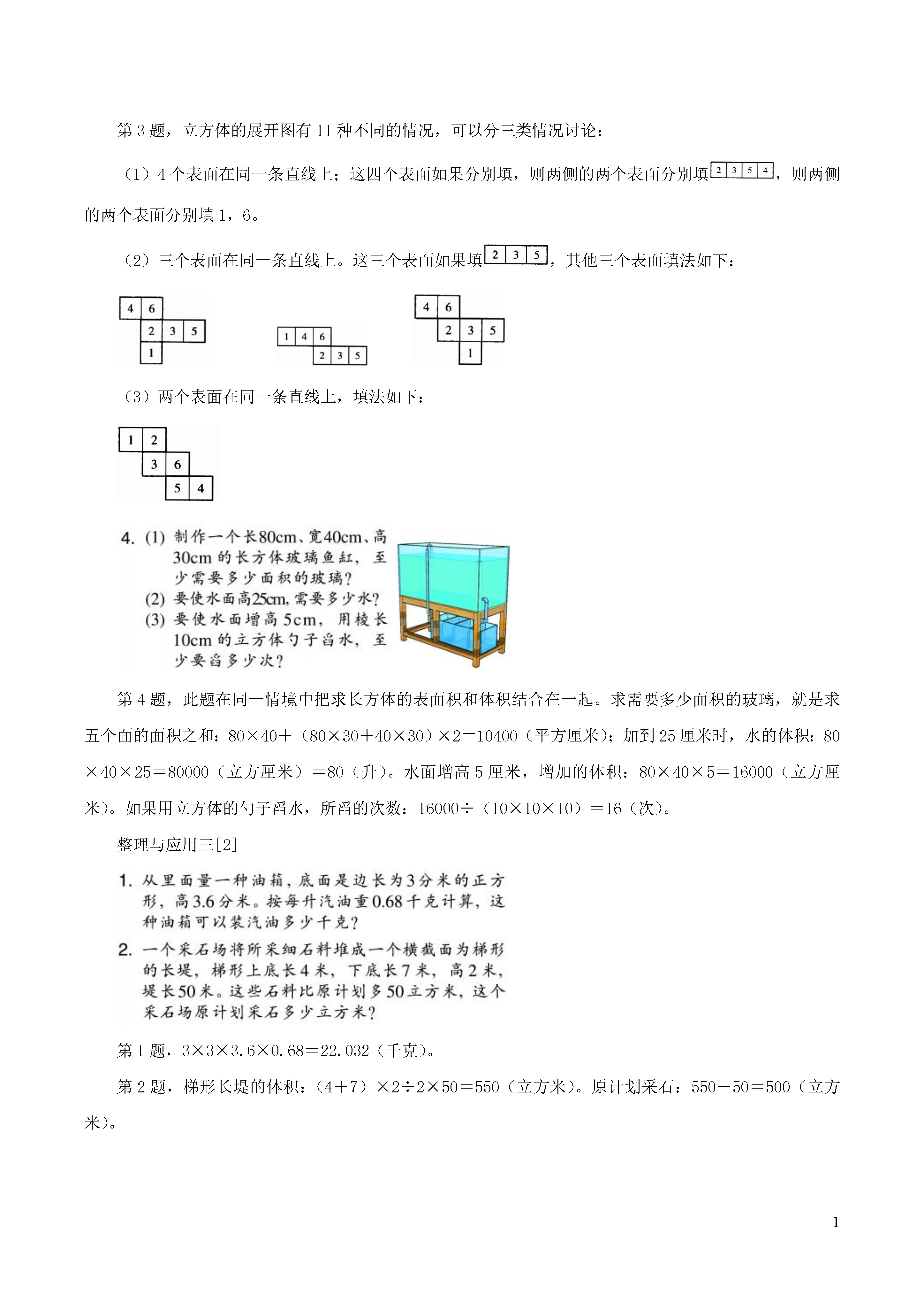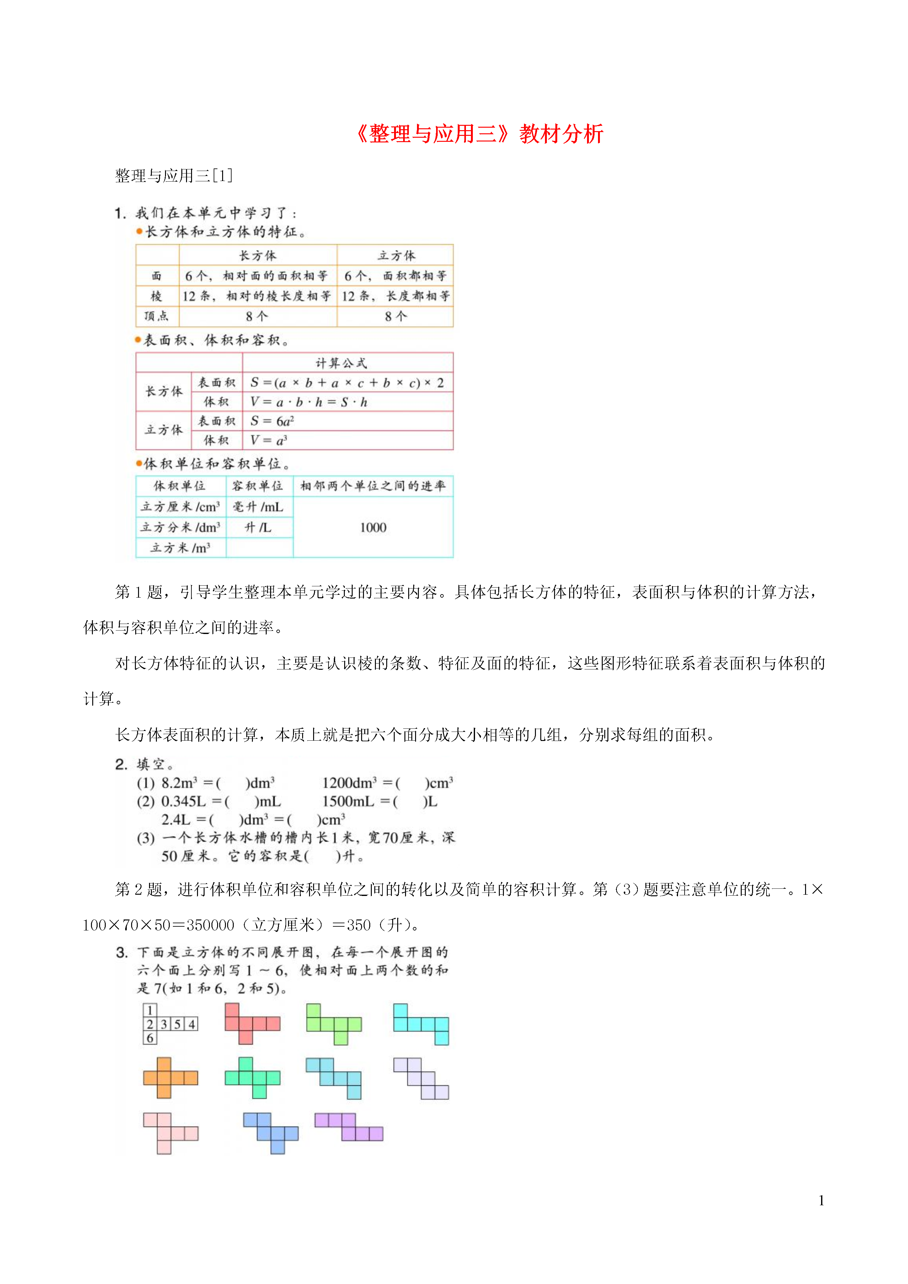 1《整理与应用三》教材分析整理与应用三[1]第1题,引导学生整理本单元学过的主要内容。具体包括长方体的特征,表面积与体积的计算方法,体积与容积单位之间的进率。对长方体特征的认识,主要是认识棱的条数、特征及面的特征,这些图形特征联系着表面积与体积的计算。长方体表面积的计算,本质上就是把六个面分成大小相等的几组,分别求每组的面积。第2题,进行体积单位和容积单位之间的转化以及简单的容积计算。第(3)题要注意单位的统一。1×100×70×50=350000(立方厘米)=350(升)。第3题,立方体的展开图有11种不同的情况,可以分三类情况讨论:(1)4个表面在同一条直线上;这四个表面如果分别填,则两侧的两个表面分别填,则两侧的两个表面分别填1,6。(2)三个表面在同一条直线上。这三个表面如果填,其他三个表面填法如下:(3)两个表面在同一条直线上,填法如下:第4题,此题在同一情境中把求长方体的表面积和体积结合在一起。求需要多少面积的玻璃,就是求五个面的面积之和:80×40+(80×30+40×30)×2=10400(平方厘米);加到25厘米时,水的体积:80×40×25=80000(立方厘米)=80(升)。水面增高5厘米,增加的体积:80×40×5=16000(立方厘米)。如果用立方体的勺子舀水,所舀的次数:16000÷(10×10×10)=16(次)。整理与应用三[2]第1题,3×3×3.6×0.68=22.032(千克)。第2题,梯形长堤的体积:(4+7)×2÷2×50=550(立方米)。原计划采石:550-50=500(立方米)。第3题,学生可以借助操作或直观图示发现,每增加一个立方体,就增加4个正方形;20个立方体叠在一起,看得见的正方形就是81个;n个立方体叠在一起,看得见的正方形是(n×4+1)个。第4题是选做题。求表面积的方法:观察每个图形可以发现,从6个方位观察,每一个面上正方形的个数是相同的,个数与层数有关,2层:表面积就是(2×2)×6×(2+1),3层:表面积就是(2×2)×6×(3+2+1),n层:表面积就是(2×2)×6×(n+…+1)。求体积的方法就是每个立方体的体积乘个数,而个数与层数有关,n层:个数就是n×n。