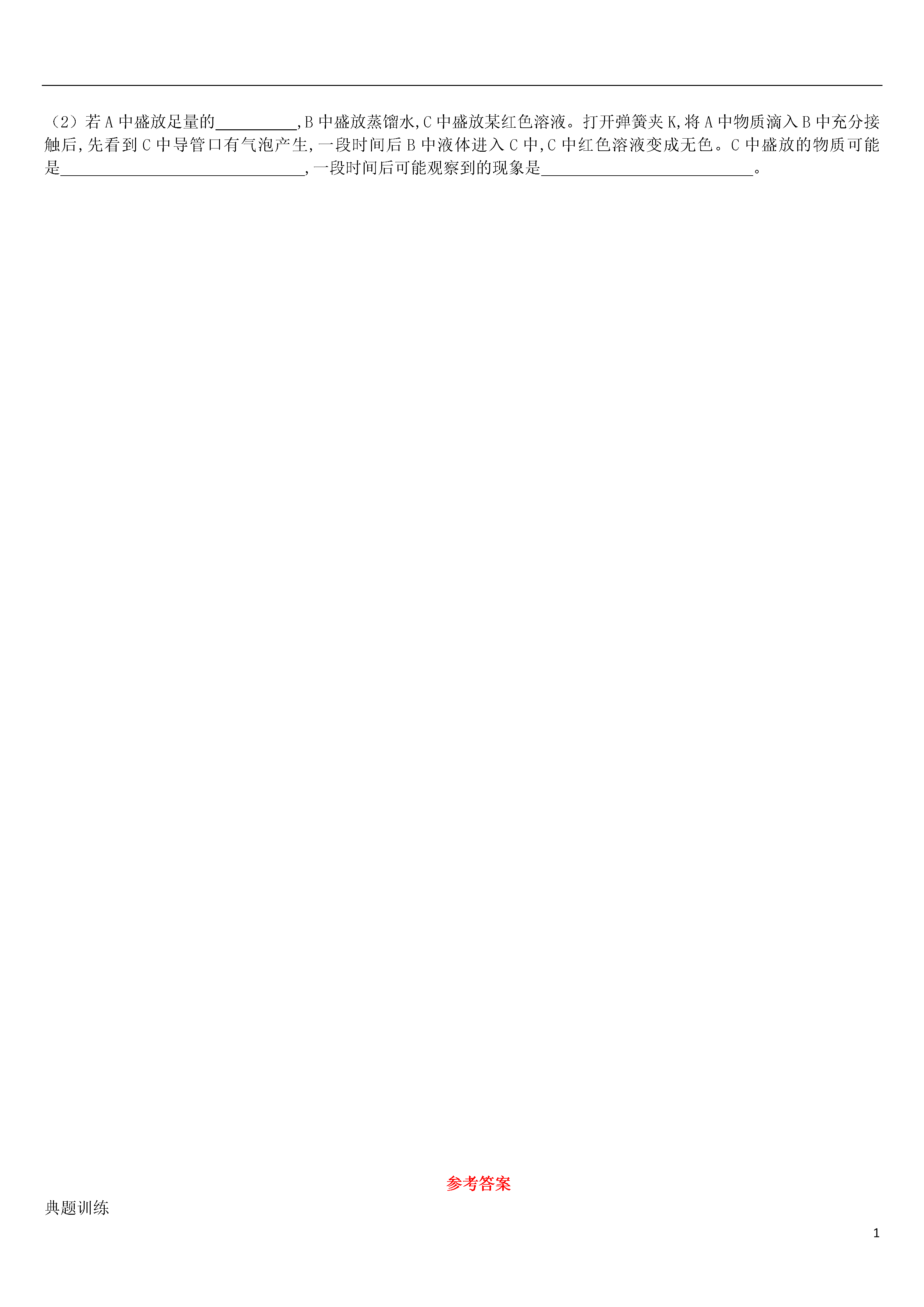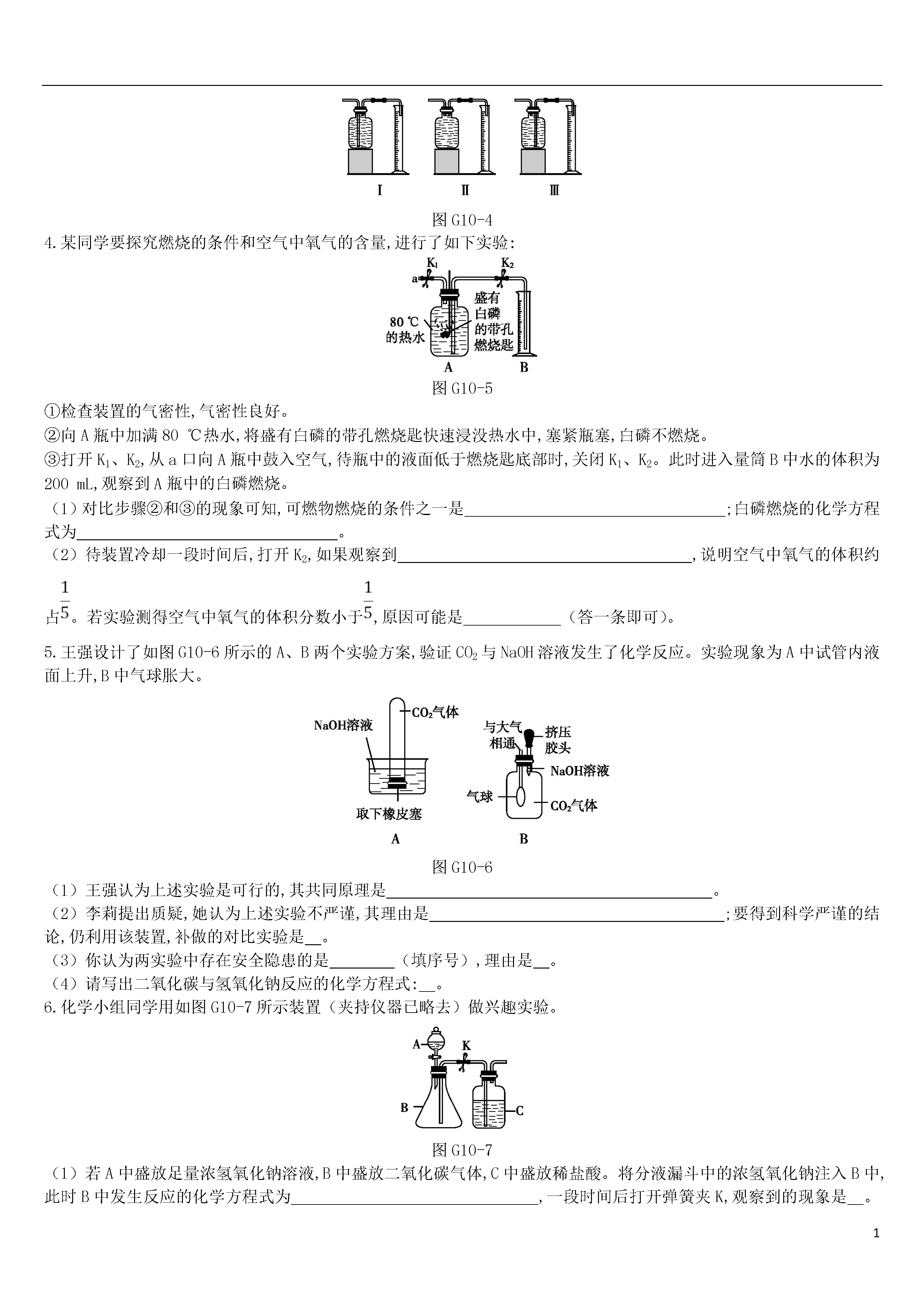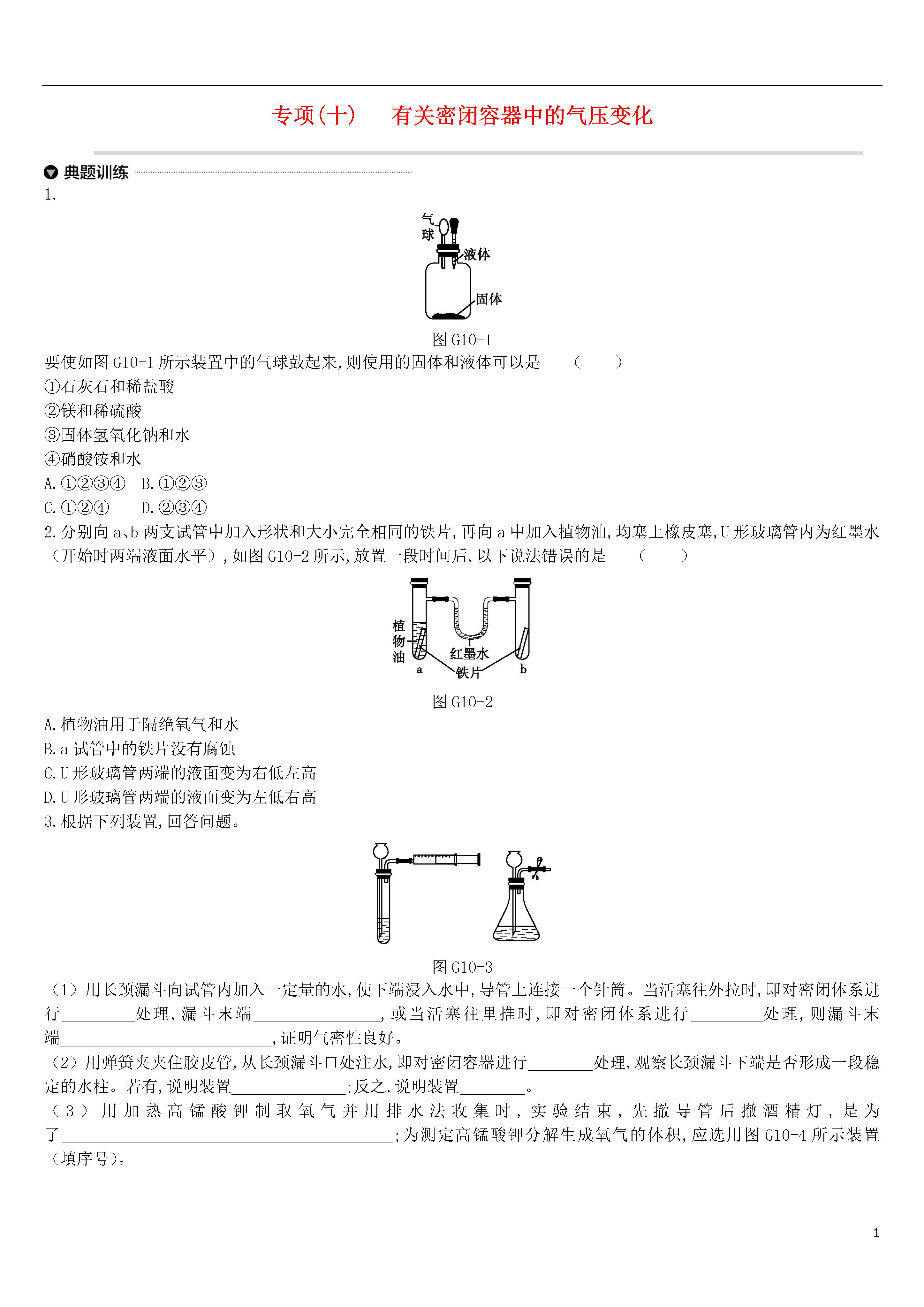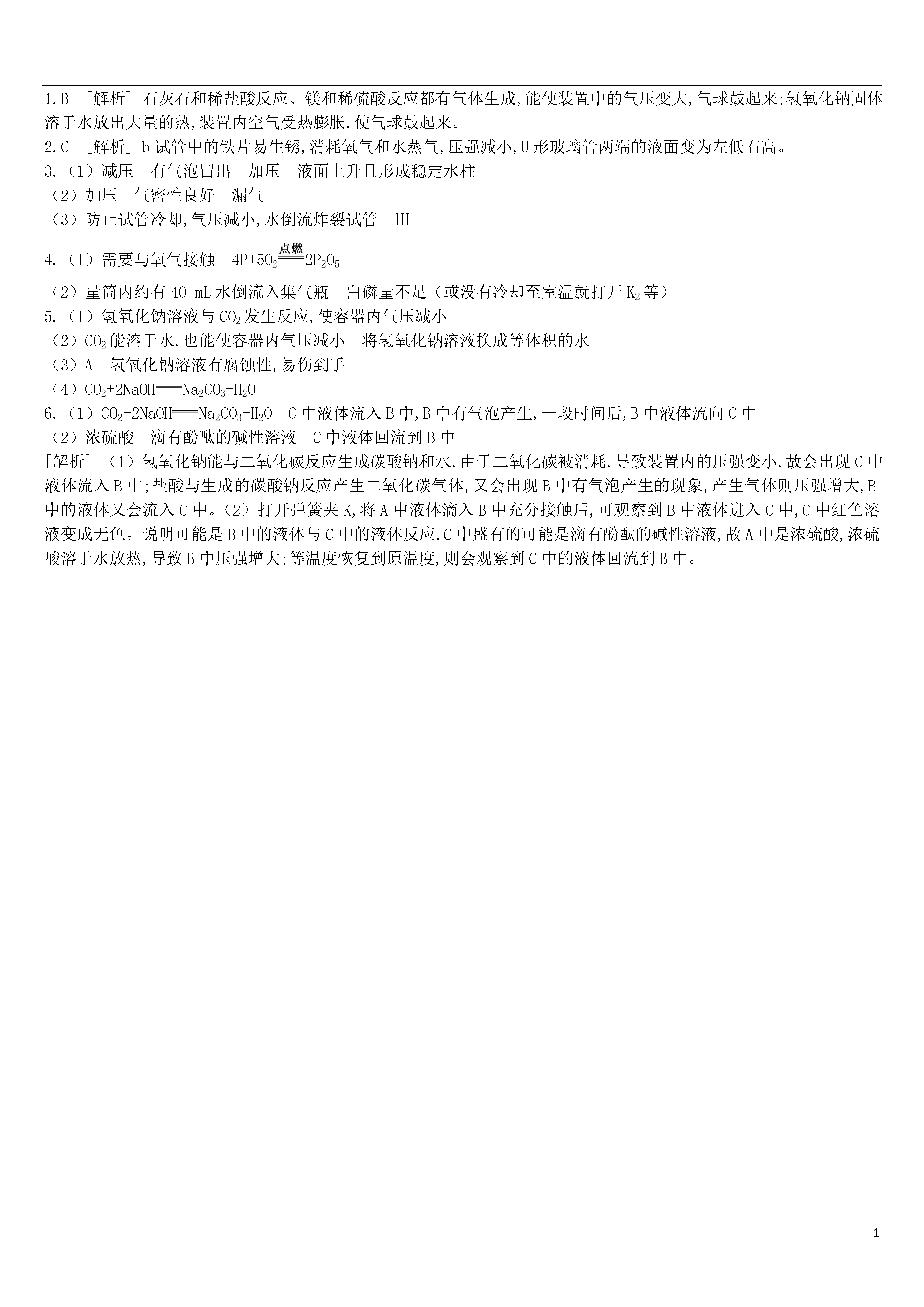 1专项(十)有关密闭容器中的气压变化1.图G10-1要使如图G10-1所示装置中的气球鼓起来,则使用的固体和液体可以是()①石灰石和稀盐酸②镁和稀硫酸③固体氢氧化钠和水④硝酸铵和水A.①②③④B.①②③C.①②④D.②③④2.分别向a、b两支试管中加入形状和大小完全相同的铁片,再向a中加入植物油,均塞上橡皮塞,U形玻璃管内为红墨水(开始时两端液面水平),如图G10-2所示,放置一段时间后,以下说法错误的是()图G10-2A.植物油用于隔绝氧气和水B.a试管中的铁片没有腐蚀C.U形玻璃管两端的液面变为右低左高D.U形玻璃管两端的液面变为左低右高3.根据下列装置,回答问题。图G10-3(1)用长颈漏斗向试管内加入一定量的水,使下端浸入水中,导管上连接一个针筒。当活塞往外拉时,即对密闭体系进行处理,漏斗末端,或当活塞往里推时,即对密闭体系进行处理,则漏斗末端,证明气密性良好。(2)用弹簧夹夹住胶皮管,从长颈漏斗口处注水,即对密闭容器进行处理,观察长颈漏斗下端是否形成一段稳定的水柱。若有,说明装置;反之,说明装置。(3)用加热高锰酸钾制取氧气并用排水法收集时,实验结束,先撤导管后撤酒精灯,是为了;为测定高锰酸钾分解生成氧气的体积,应选用图G10-4所示装置(填序号)。图G10-44.某同学要探究燃烧的条件和空气中氧气的含量,进行了如下实验:图G10-5①检查装置的气密性,气密性良好。②向A瓶中加满80℃热水,将盛有白磷的带孔燃烧匙快速浸没热水中,塞紧瓶塞,白磷不燃烧。③打开K1、K2,从a口向A瓶中鼓入空气,待瓶中的液面低于燃烧匙底部时,关闭K1、K2。此时进入量筒B中水的体积为200mL,观察到A瓶中的白磷燃烧。(1)对比步骤②和③的现象可知,可燃物燃烧的条件之一是;白磷燃烧的化学方程式为。(2)待装置冷却一段时间后,打开K2,如果观察到,说明空气中氧气的体积约占。若实验测得空气中氧气的体积分数小于,原因可能是(答一条即可)。5.王强设计了如图G10-6所示的A、B两个实验方案,验证CO2与NaOH溶液发生了化学反应。实验现象为A中试管内液面上升,B中气球胀大。图G10-6(1)王强认为上述实验是可行的,其共同原理是。(2)李莉提出质疑,她认为上述实验不严谨,其理由是;要得到科学严谨的结论,仍利用该装置,补做的对比实验是。(3)你认为两实验中存在安全隐患的是(填序号),理由是。(4)请写出二氧化碳与氢氧化钠反应的化学方程式:。6.化学小组同学用如图G10-7所示装置(夹持仪器已略去)做兴趣实验。图G10-7(1)若A中盛放足量浓氢氧化钠溶液,B中盛放二氧化碳气体,C中盛放稀盐酸。将分液漏斗中的浓氢氧化钠注入B中,此时B中发生反应的化学方程式为,一段时间后打开弹簧夹K,观察到的现象是。(2)若A中盛放足量的,B中盛放蒸馏水,C中盛放某红色溶液。打开弹簧夹K,将A中物质滴入B中充分接触后,先看到C中导管口有气泡产生,一段时间后B中液体进入C中,C中红色溶液变成无色。C中盛放的物质可能是,一段时间后可能观察到的现象是。参考答案典题训练1.B[解析]石灰石和稀盐酸反应、镁和稀硫酸反应都有气体生成,能使装置中的气压变大,气球鼓起来;氢氧化钠固体溶于水放出大量的热,装置内空气受热膨胀,使气球鼓起来。2.C[解析]b试管中的铁片易生锈,消耗氧气和水蒸气,压强减小,U形玻璃管两端的液面变为左低右高。3.(1)减压有气泡冒出加压液面上升且形成稳定水柱(2)加压气密性良好漏气(3)防止试管冷却,气压减小,水倒流炸裂试管Ⅲ4.(1)需要与氧气接触4P+5O22P2O5(2)量筒内约有40mL水倒流入集气瓶白磷量不足(或没有冷却至室温就打开K2等)5.(1)氢氧化钠溶液与CO2发生反应,使容器内气压减小(2)CO2能溶于水,也能使容器内气压减小将氢氧化钠溶液换成等体积的水(3)A氢氧化钠溶液有腐蚀性,易伤到手(4)CO2+2NaOHNa2CO3+H2O6.(1)CO2+2NaOHNa2CO3+H2OC中液体流入B中,B中有气泡产生,一段时间后,B中液体流向C中(2)浓硫酸滴有酚酞的碱性溶液C中液体回流到B中[解析](1)氢氧化钠能与二氧化碳反应生成碳酸钠和水,由于二氧化碳被消耗,导致装置内的压强变小,故会出现C中液体流入B中;盐酸与生成的碳酸钠反应产生二氧化碳气体,又会出现B中有气泡产生的现象,产生气体则压强增大,B中的液体又会流入C中。(2)打开弹簧夹K,将A中液体滴入B中充分接触后,可观察到B中液体进入C中,C