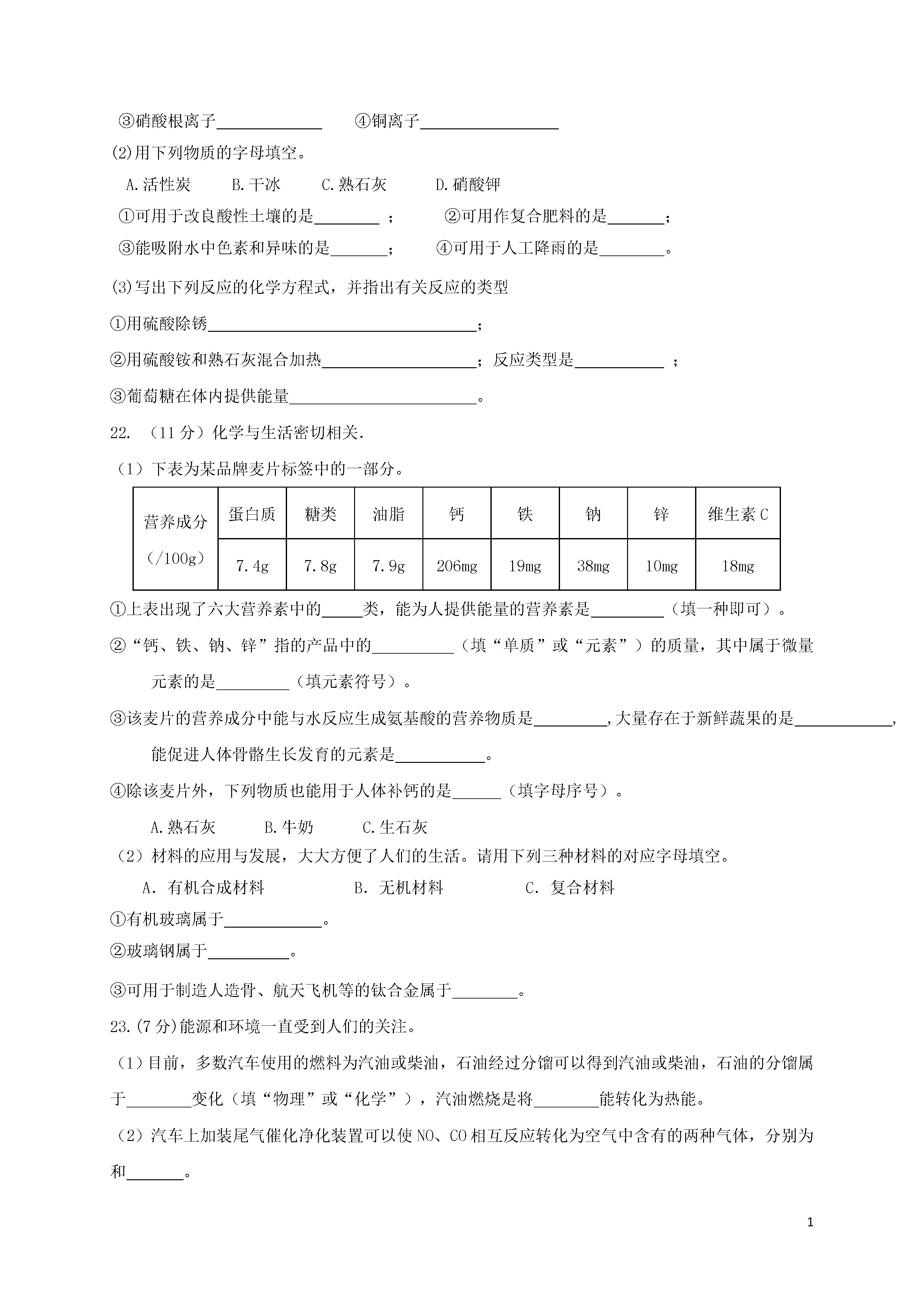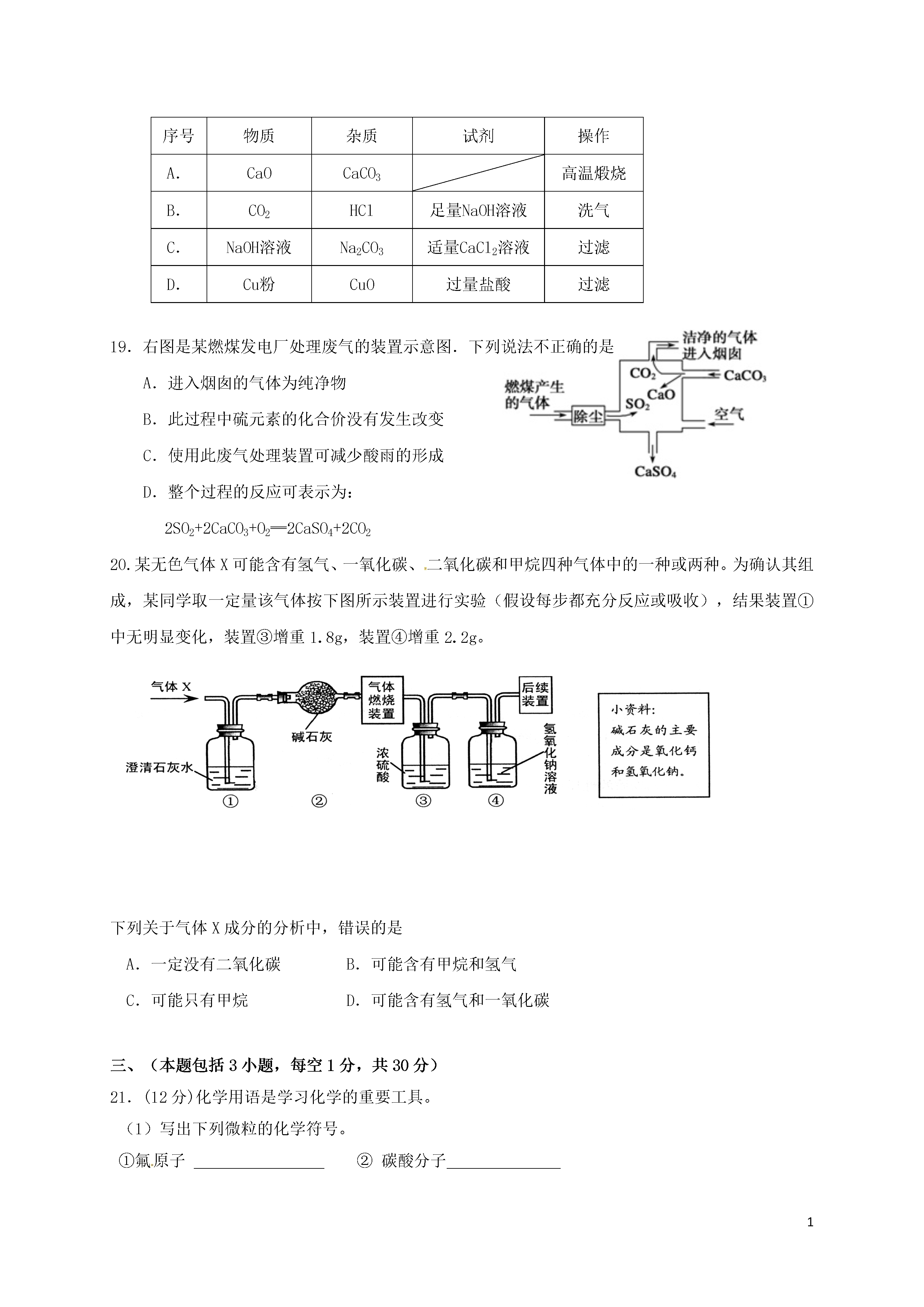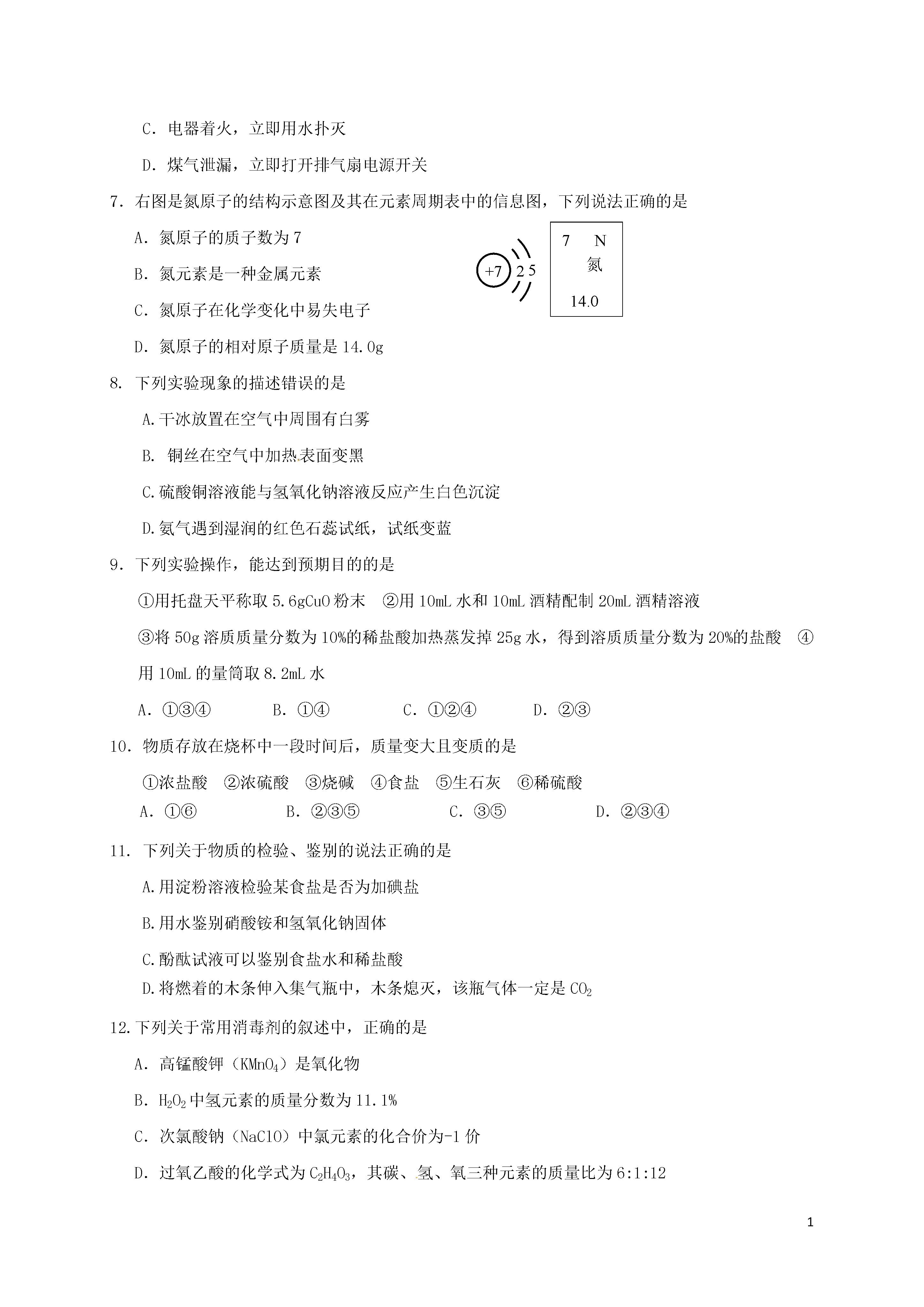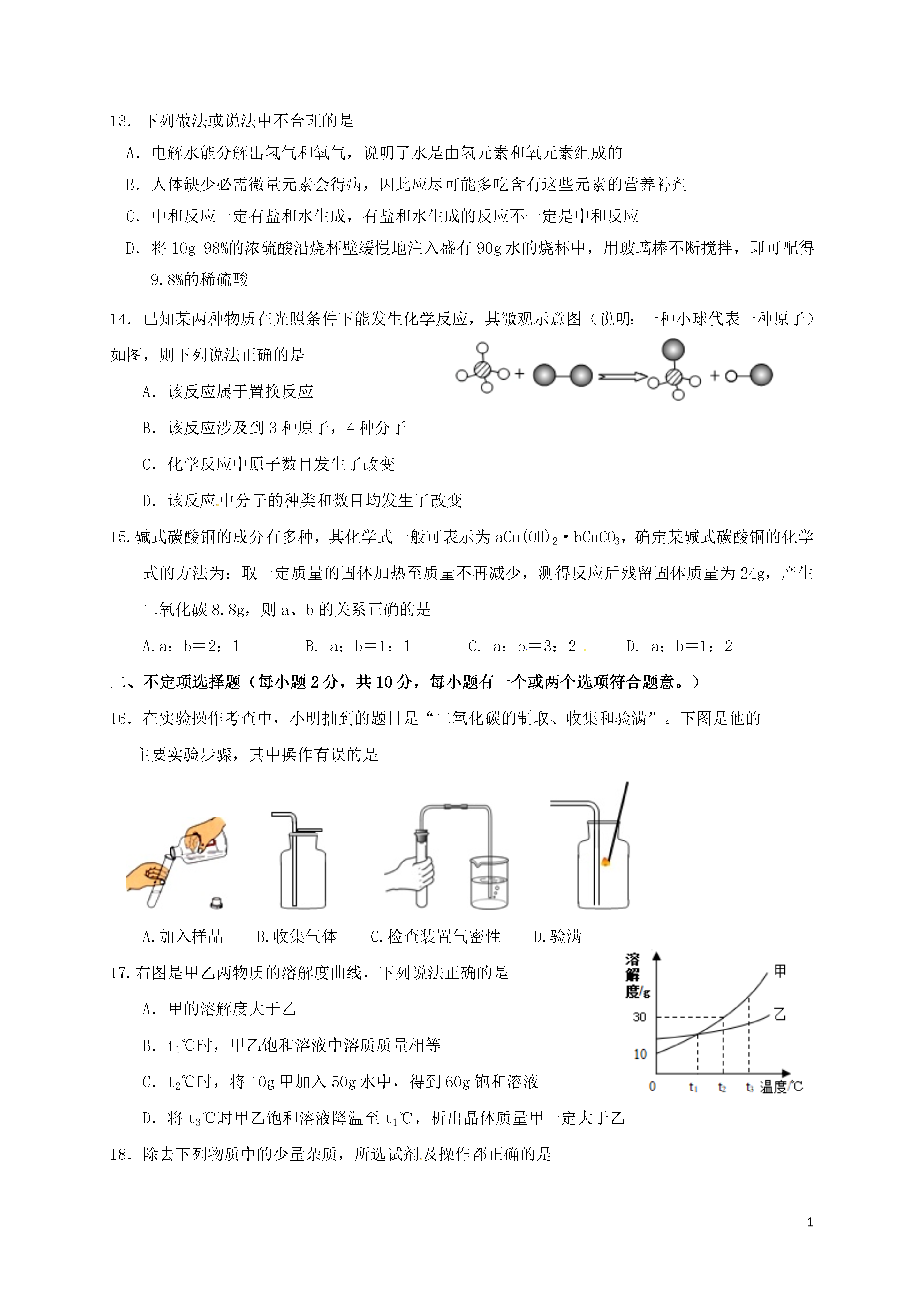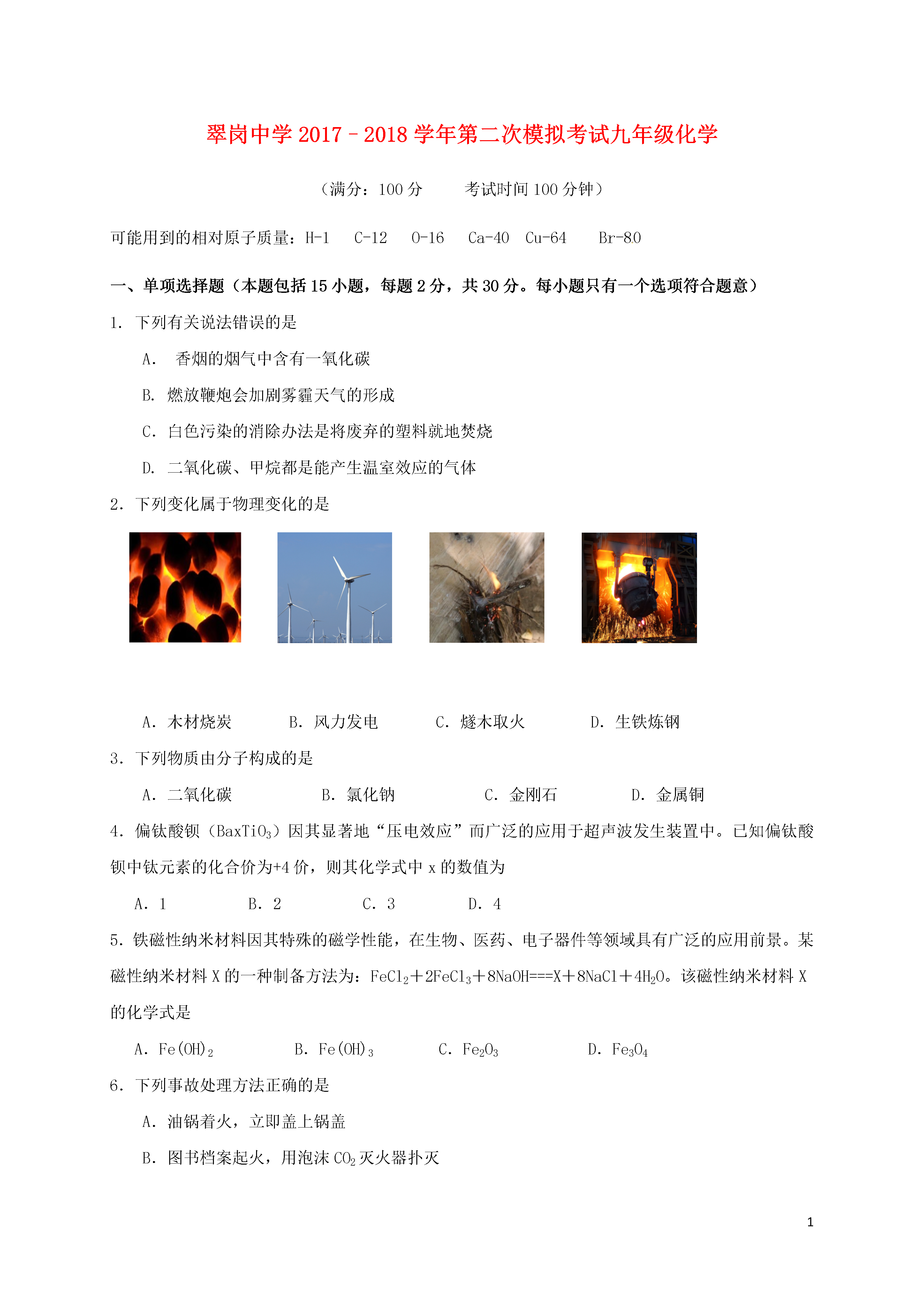 1翠岗中学2017–2018学年第二次模拟考试九年级化学(满分:100分考试时间100分钟)可能用到的相对原子质量:H-1C-12O-16Ca-40Cu-64Br-80一、单项选择题(本题包括15小题,每题2分,共30分。每小题只有一个选项符合题意)1.下列有关说法错误的是A.香烟的烟气中含有一氧化碳B.燃放鞭炮会加剧雾霾天气的形成C.白色污染的消除办法是将废弃的塑料就地焚烧D.二氧化碳、甲烷都是能产生温室效应的气体2.下列变化属于物理变化的是A.木材烧炭B.风力发电C.燧木取火D.生铁炼钢3.下列物质由分子构成的是A.二氧化碳B.氯化钠C.金刚石D.金属铜4.偏钛酸钡(BaxTiO3)因其显著地“压电效应”而广泛的应用于超声波发生装置中。已知偏钛酸钡中钛元素的化合价为+4价,则其化学式中x的数值为A.1B.2C.3D.45.铁磁性纳米材料因其特殊的磁学性能,在生物、医药、电子器件等领域具有广泛的应用前景。某磁性纳米材料X的一种制备方法为:FeCl2+2FeCl3+8NaOH===X+8NaCl+4H2O。该磁性纳米材料X的化学式是A.Fe(OH)2B.Fe(OH)3C.Fe2O3D.Fe3O46.下列事故处理方法正确的是A.油锅着火,立即盖上锅盖B.图书档案起火,用泡沫CO2灭火器扑灭C.电器着火,立即用水扑灭D.煤气泄漏,立即打开排气扇电源开关7.右图是氮原子的结构示意图及其在元素周期表中的信息图,下列说法正确的是7N氮14.0+725A.氮原子的质子数为7B.氮元素是一种金属元素C.氮原子在化学变化中易失电子D.氮原子的相对原子质量是14.0g8.下列实验现象的描述错误的是A.干冰放置在空气中周围有白雾B.铜丝在空气中加热表面变黑C.硫酸铜溶液能与氢氧化钠溶液反应产生白色沉淀D.氨气遇到湿润的红色石蕊试纸,试纸变蓝9.下列实验操作,能达到预期目的的是①用托盘天平称取5.6gCuO粉末②用10mL水和10mL酒精配制20mL酒精溶液③将50g溶质质量分数为10%的稀盐酸加热蒸发掉25g水,得到溶质质量分数为20%的盐酸④用10mL的量筒取8.2mL水①③④B.①④C.①②④D.②③10.物质存放在烧杯中一段时间后,质量变大且变质的是①浓盐酸②浓硫酸③烧碱④食盐⑤生石灰⑥稀硫酸A.①⑥B.②③⑤C.③⑤D.②③④11.下列关于物质的检验、鉴别的说法正确的是A.用淀粉溶液检验某食盐是否为加碘盐B.用水鉴别硝酸铵和氢氧化钠固体C.酚酞试液可以鉴别食盐水和稀盐酸D.将燃着的木条伸入集气瓶中,木条熄灭,该瓶气体一定是CO212.下列关于常用消毒剂的叙述中,正确的是A.高锰酸钾(KMnO4)是氧化物B.H2O2中氢元素的质量分数为11.1%C.次氯酸钠(NaClO)中氯元素的化合价为-1价D.过氧乙酸的化学式为C2H4O3,其碳、氢、氧三种元素的质量比为6:1:1213.下列做法或说法中不合理的是A.电解水能分解出氢气和氧气,说明了水是由氢元素和氧元素组成的B.人体缺少必需微量元素会得病,因此应尽可能多吃含有这些元素的营养补剂C.中和反应一定有盐和水生成,有盐和水生成的反应不一定是中和反应D.将10g98%的浓硫酸沿烧杯壁缓慢地注入盛有90g水的烧杯中,用玻璃棒不断搅拌,即可配得9.8%的稀硫酸14.已知某两种物质在光照条件下能发生化学反应,其微观示意图(说明:一种小球代表一种原子)如图,则下列说法正确的是A.该反应属于置换反应B.该反应涉及到3种原子,4种分子C.化学反应中原子数目发生了改变D.该反应中分子的种类和数目均发生了改变15.碱式碳酸铜的成分有多种,其化学式一般可表示为aCu(OH)2·bCuCO3,确定某碱式碳酸铜的化学式的方法为:取一定质量的固体加热至质量不再减少,测得反应后残留固体质量为24g,产生二氧化碳8.8g,则a、b的关系正确的是A.a:b=2:1B.a:b=1:1C.a:b=3:2D.a:b=1:2二、不定项选择题(每小题2分,共10分,每小题有一个或两个选项符合题意。)16.在实验操作考查中,小明抽到的题目是“二氧化碳的制取、收集和验满”。下图是他的主要实验步骤,其中操作有误的是A.加入样品B.收集气体C.检查装置气密性D.验满17.右图是甲乙两物质的溶解度曲线,下列说法正确的是A.甲的溶解度大于乙B.t1℃时,甲乙饱和溶液中溶质质量相等C.t2℃时,将10g甲加入50g水中,得到60g饱和溶液D.将t3℃时甲乙饱和溶液降温至t1℃,析出晶体质量甲一定大于乙18.除去下列物质中的少量杂质,所选试剂及操作都正确的是序号物质杂质