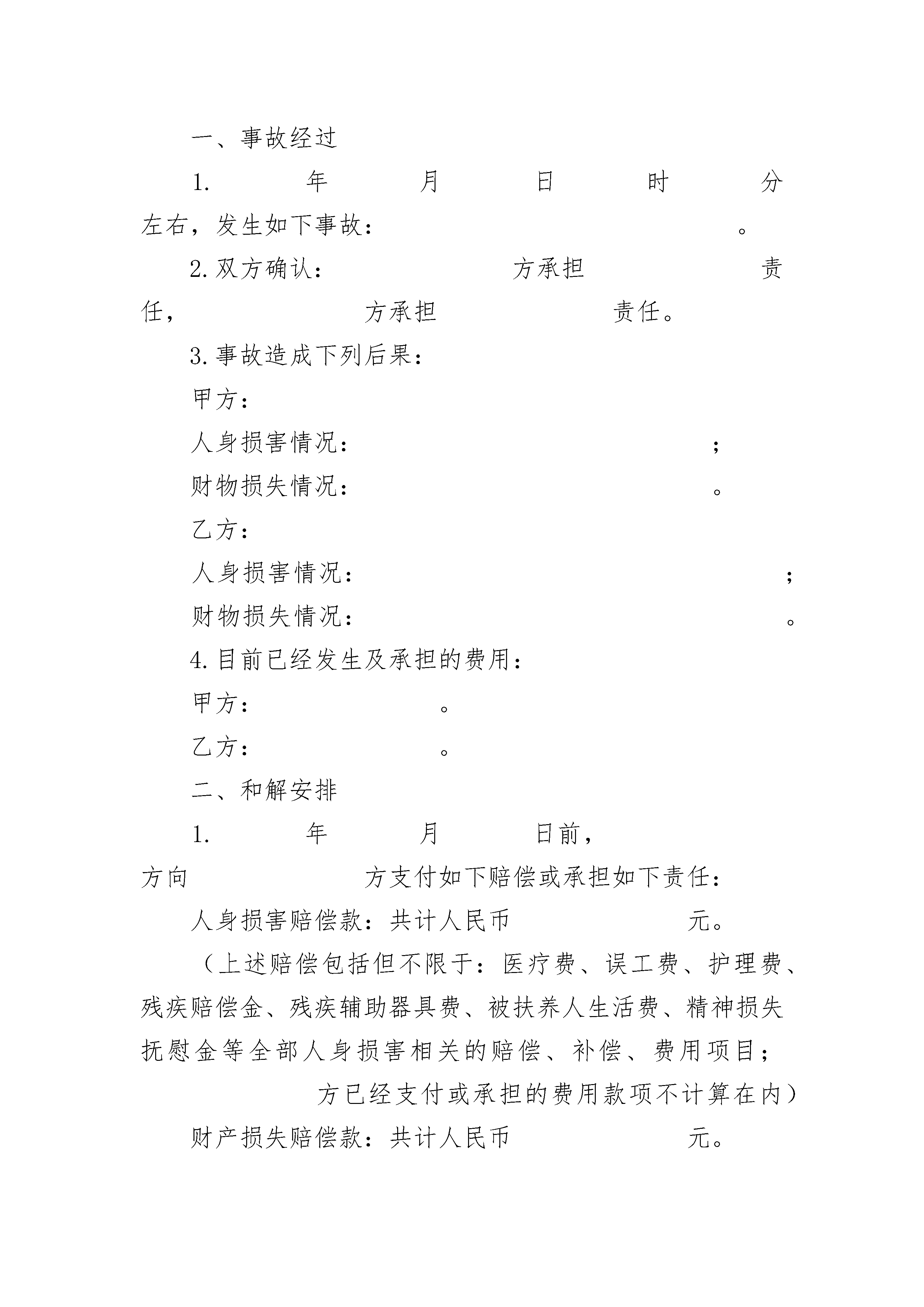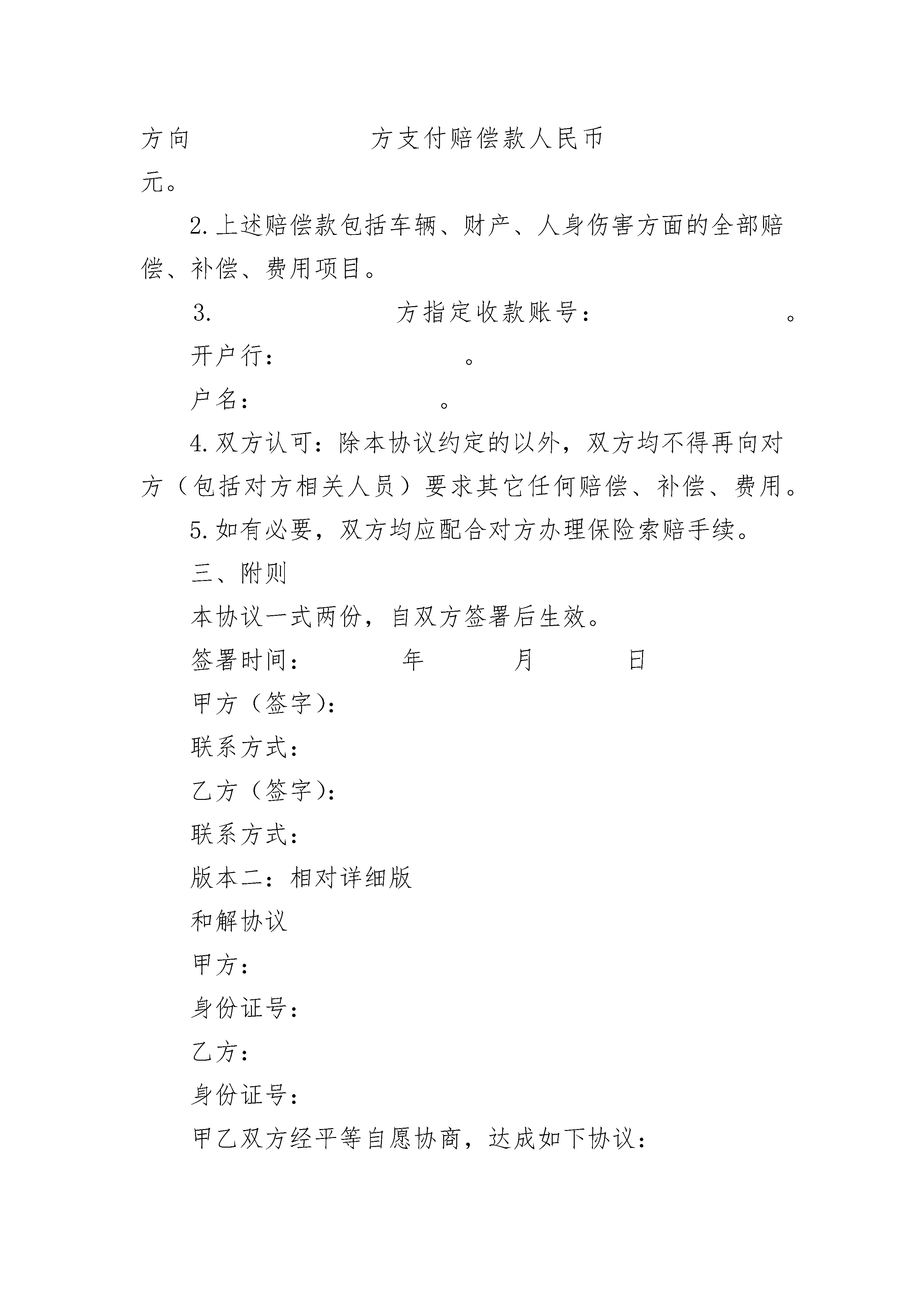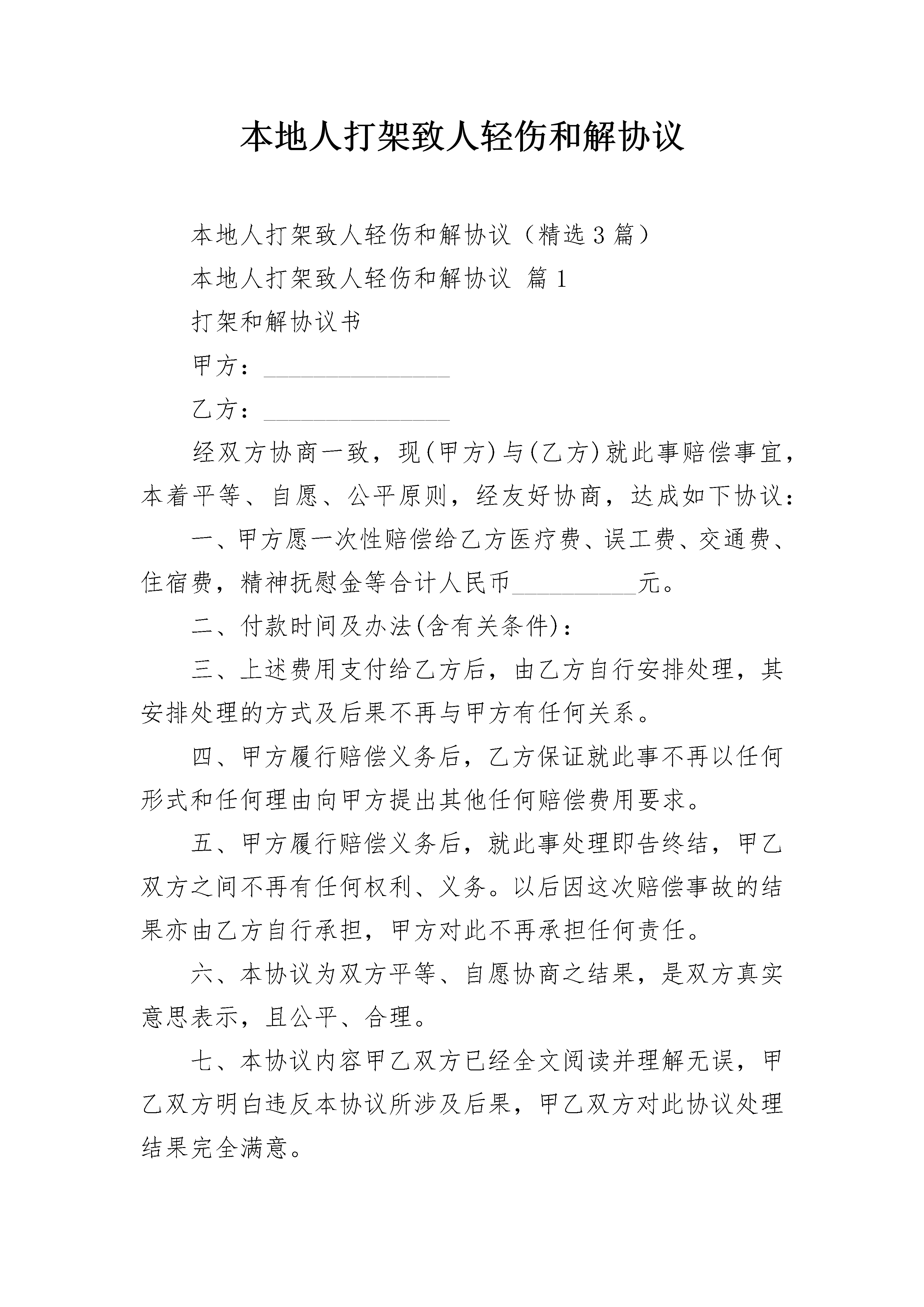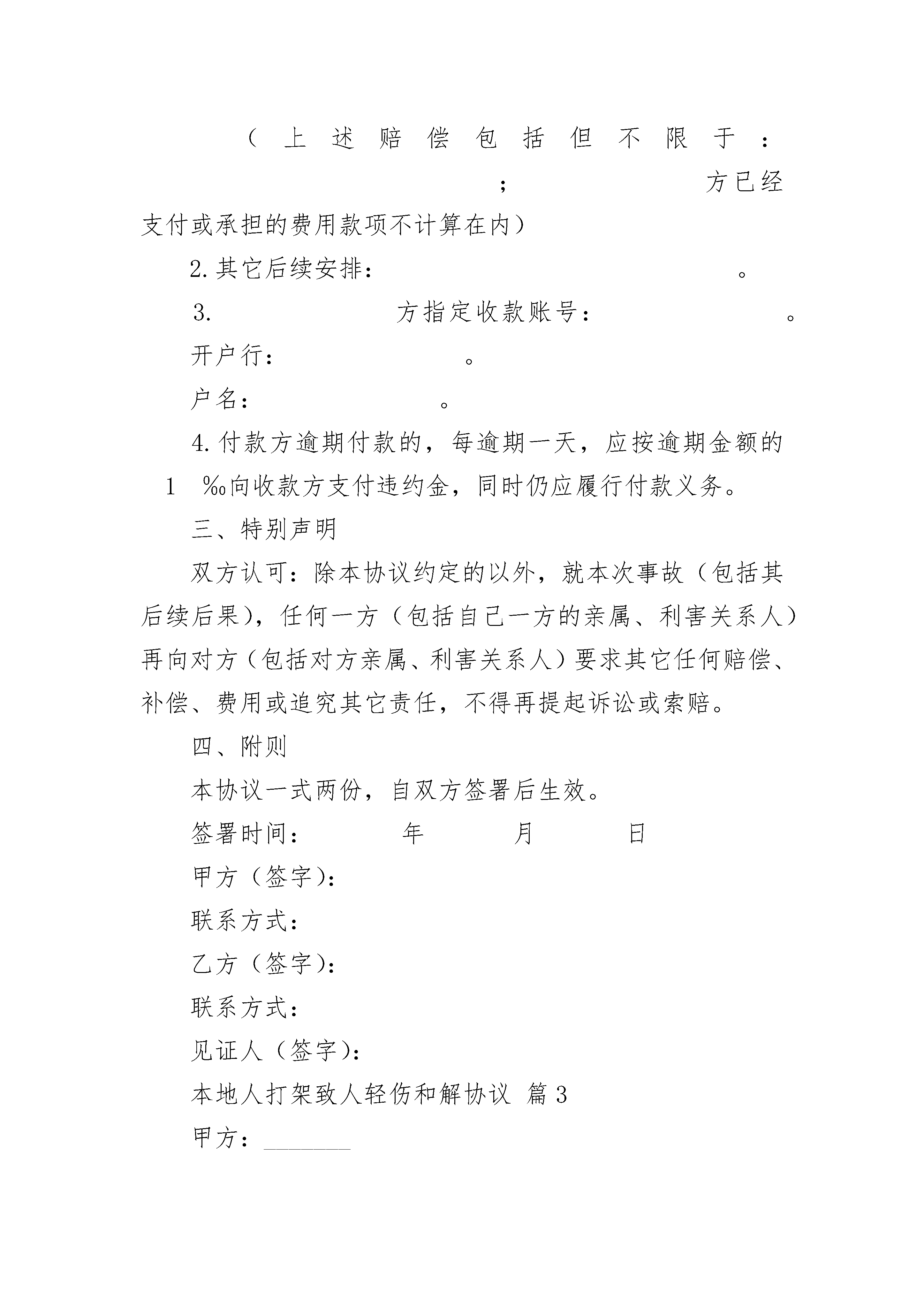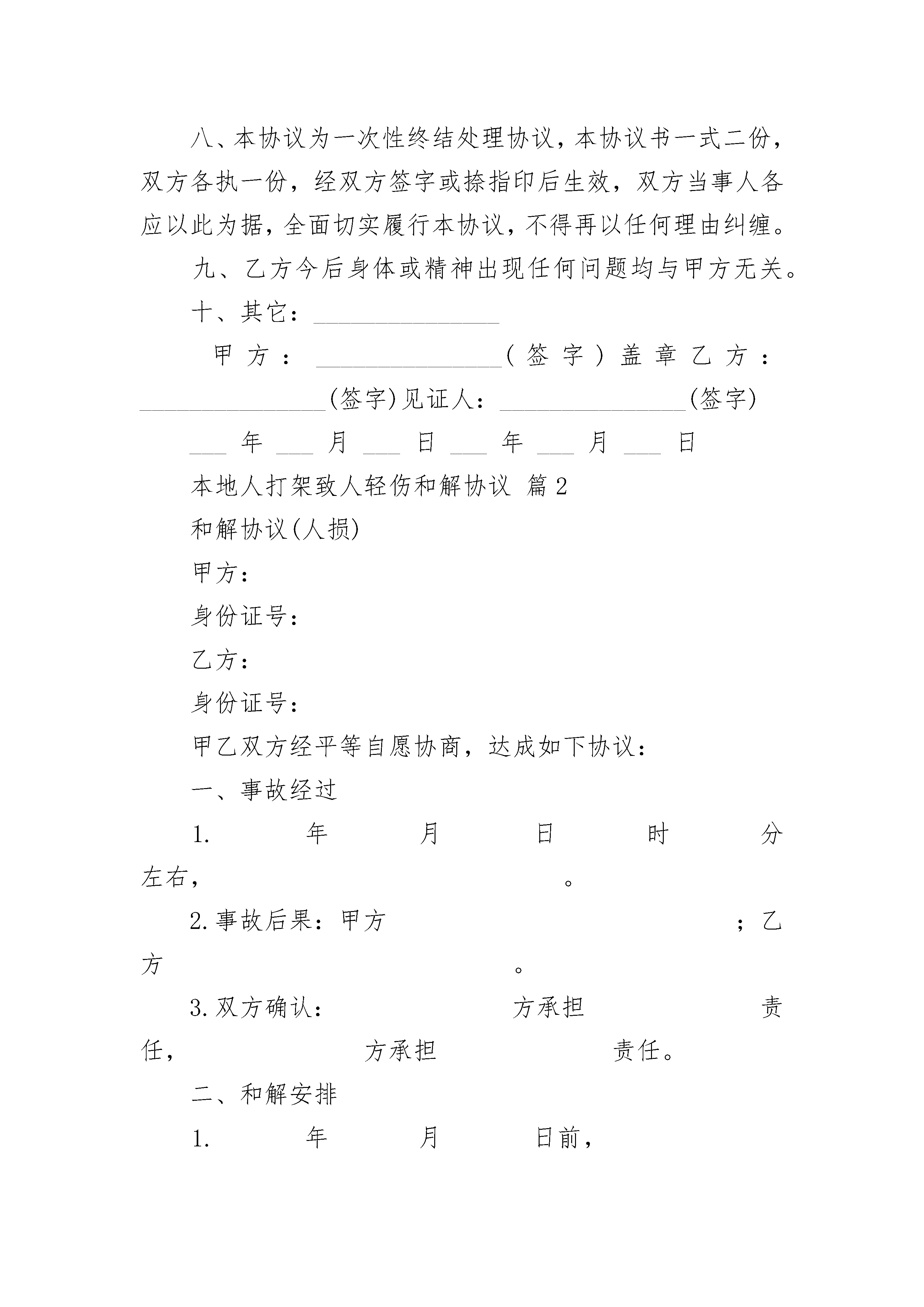 本地人打架致人轻伤和解协议本地人打架致人轻伤和解协议(精选3篇)本地人打架致人轻伤和解协议篇1打架和解协议书甲方:_______________乙方:_______________经双方协商一致,现(甲方)与(乙方)就此事赔偿事宜,本着平等、自愿、公平原则,经友好协商,达成如下协议:一、甲方愿一次性赔偿给乙方医疗费、误工费、交通费、住宿费,精神抚慰金等合计人民币__________元。二、付款时间及办法(含有关条件):三、上述费用支付给乙方后,由乙方自行安排处理,其安排处理的方式及后果不再与甲方有任何关系。四、甲方履行赔偿义务后,乙方保证就此事不再以任何形式和任何理由向甲方提出其他任何赔偿费用要求。五、甲方履行赔偿义务后,就此事处理即告终结,甲乙双方之间不再有任何权利、义务。以后因这次赔偿事故的结果亦由乙方自行承担,甲方对此不再承担任何责任。六、本协议为双方平等、自愿协商之结果,是双方真实意思表示,且公平、合理。七、本协议内容甲乙双方已经全文阅读并理解无误,甲乙双方明白违反本协议所涉及后果,甲乙双方对此协议处理结果完全满意。八、本协议为一次性终结处理协议,本协议书一式二份,双方各执一份,经双方签字或捺指印后生效,双方当事人各应以此为据,全面切实履行本协议,不得再以任何理由纠缠。九、乙方今后身体或精神出现任何问题均与甲方无关。十、其它:_______________甲方:_______________(签字)盖章乙方:_______________(签字)见证人:_______________(签字)___年___月___日___年___月___日本地人打架致人轻伤和解协议篇2和解协议(人损)甲方:身份证号:乙方:身份证号:甲乙双方经平等自愿协商,达成如下协议:一、事故经过1.年月日时分左右,。2.事故后果:甲方;乙方。3.双方确认:方承担责任,方承担责任。二、和解安排1.年月日前,方向方支付赔偿款人民币元。2.上述赔偿款包括车辆、财产、人身伤害方面的全部赔偿、补偿、费用项目。3.方指定收款账号:。开户行:。户名:。4.双方认可:除本协议约定的以外,双方均不得再向对方(包括对方相关人员)要求其它任何赔偿、补偿、费用。5.如有必要,双方均应配合对方办理保险索赔手续。三、附则本协议一式两份,自双方签署后生效。签署时间:年月日甲方(签字):联系方式:乙方(签字):联系方式:版本二:相对详细版和解协议甲方:身份证号:乙方:身份证号:甲乙双方经平等自愿协商,达成如下协议:一、事故经过1.年月日时分左右,发生如下事故:。2.双方确认:方承担责任,方承担责任。3.事故造成下列后果:甲方:人身损害情况:;财物损失情况:。乙方:人身损害情况:;财物损失情况:。4.目前已经发生及承担的费用:甲方:。乙方:。二、和解安排1.年月日前,方向方支付如下赔偿或承担如下责任:人身损害赔偿款:共计人民币元。(上述赔偿包括但不限于:医疗费、误工费、护理费、残疾赔偿金、残疾辅助器具费、被扶养人生活费、精神损失抚慰金等全部人身损害相关的赔偿、补偿、费用项目;方已经支付或承担的费用款项不计算在内)财产损失赔偿款:共计人民币元。(上述赔偿包括但不限于:;方已经支付或承担的费用款项不计算在内)2.其它后续安排:。3.方指定收款账号:。开户行:。户名:。4.付款方逾期付款的,每逾期一天,应按逾期金额的1‰向收款方支付违约金,同时仍应履行付款义务。三、特别声明双方认可:除本协议约定的以外,就本次事故(包括其后续后果),任何一方(包括自己一方的亲属、利害关系人)再向对方(包括对方亲属、利害关系人)要求其它任何赔偿、补偿、费用或追究其它责任,不得再提起诉讼或索赔。四、附则本协议一式两份,自双方签署后生效。签署时间:年月日甲方(签字):联系方式:乙方(签字):联系方式:见证人(签字):本地人打架致人轻伤和解协议篇3甲方:_______乙方:_______甲乙双方就_______年______