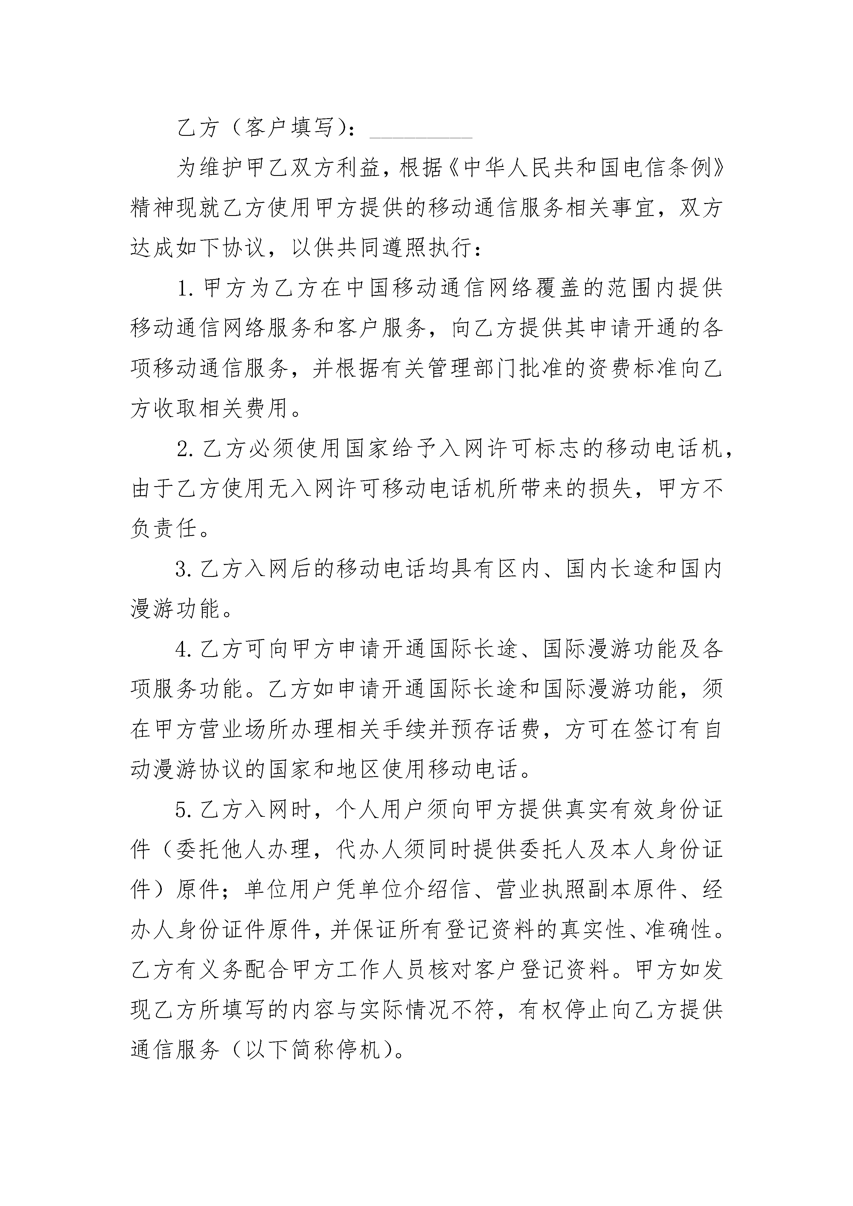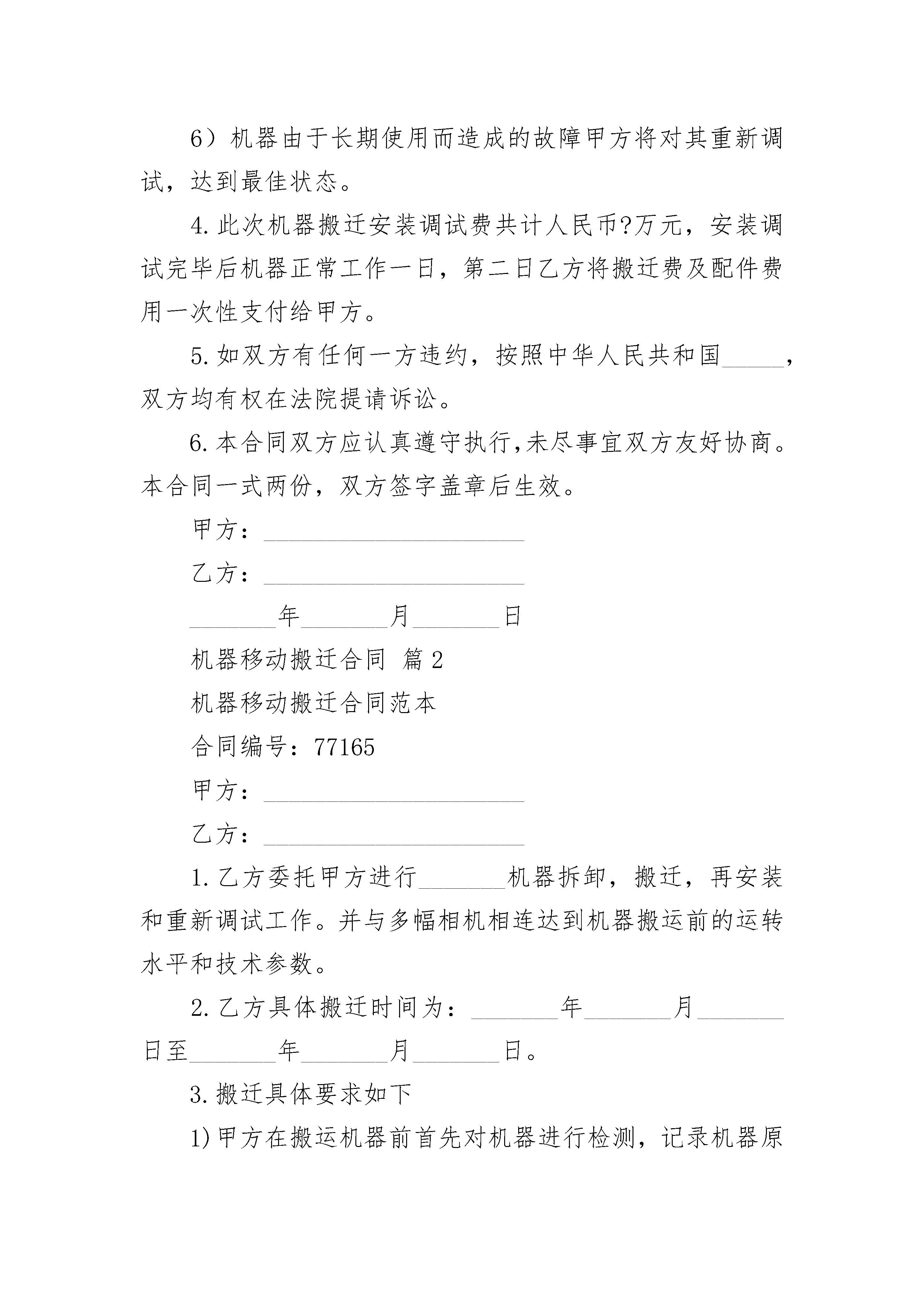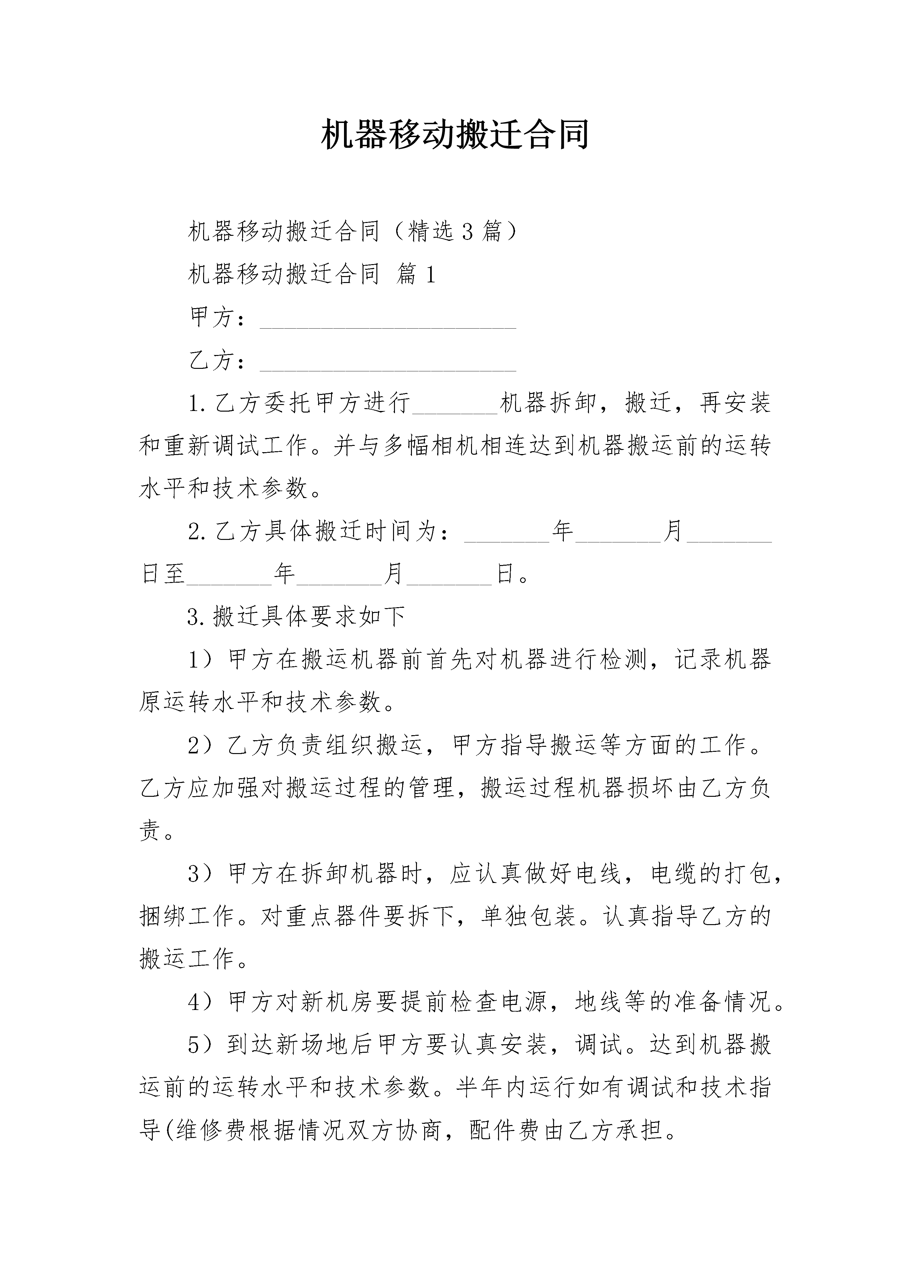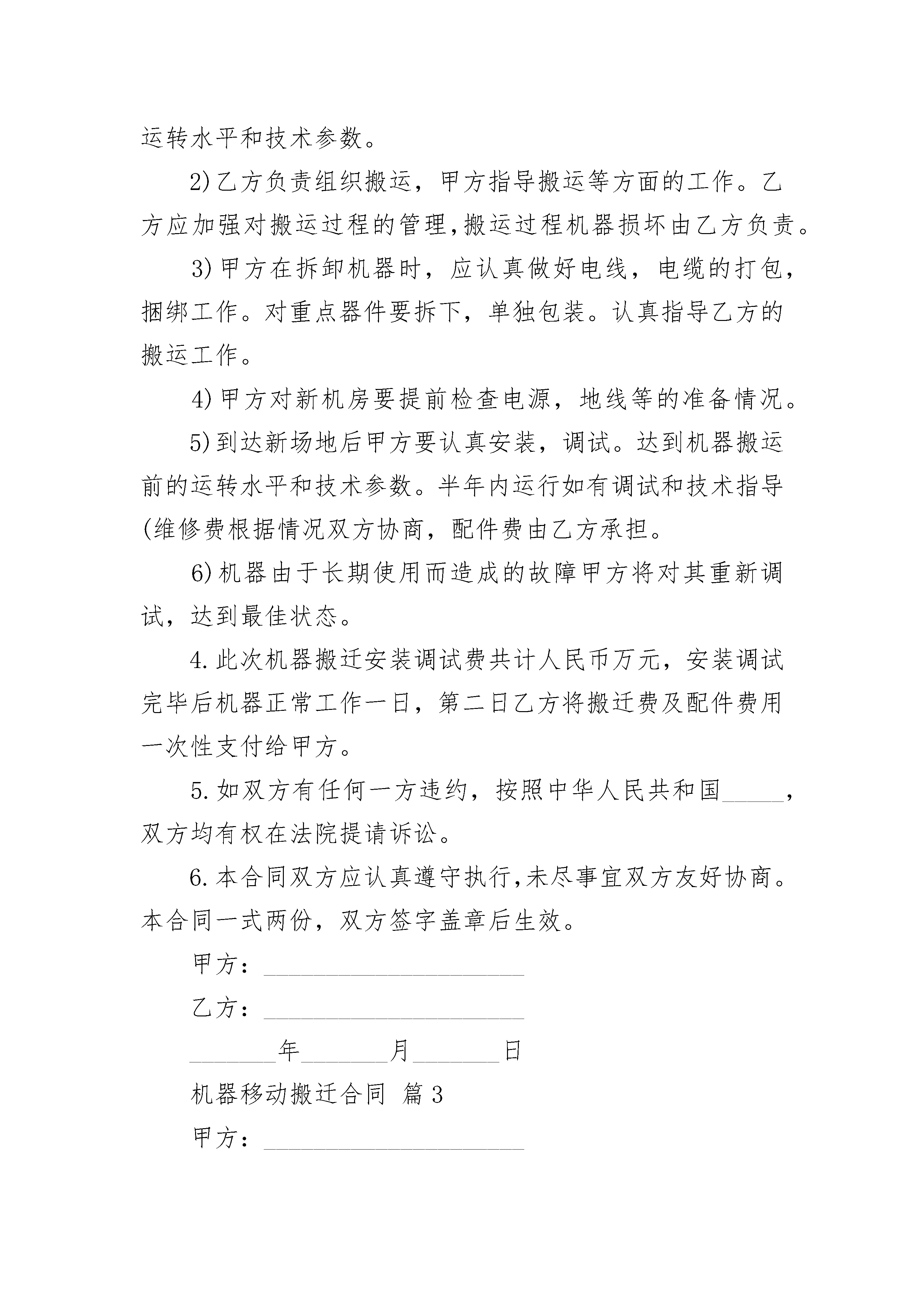 机器移动搬迁合同机器移动搬迁合同(精选3篇)机器移动搬迁合同篇1甲方:_____________________乙方:_____________________1.乙方委托甲方进行_______机器拆卸,搬迁,再安装和重新调试工作。并与多幅相机相连达到机器搬运前的运转水平和技术参数。2.乙方具体搬迁时间为:_______年_______月_______日至_______年_______月_______日。3.搬迁具体要求如下1)甲方在搬运机器前首先对机器进行检测,记录机器原运转水平和技术参数。2)乙方负责组织搬运,甲方指导搬运等方面的工作。乙方应加强对搬运过程的管理,搬运过程机器损坏由乙方负责。3)甲方在拆卸机器时,应认真做好电线,电缆的打包,捆绑工作。对重点器件要拆下,单独包装。认真指导乙方的搬运工作。4)甲方对新机房要提前检查电源,地线等的准备情况。5)到达新场地后甲方要认真安装,调试。达到机器搬运前的运转水平和技术参数。半年内运行如有调试和技术指导(维修费根据情况双方协商,配件费由乙方承担。6)机器由于长期使用而造成的故障甲方将对其重新调试,达到最佳状态。4.此次机器搬迁安装调试费共计人民币?万元,安装调试完毕后机器正常工作一日,第二日乙方将搬迁费及配件费用一次性支付给甲方。5.如双方有任何一方违约,按照中华人民共和国_____,双方均有权在法院提请诉讼。6.本合同双方应认真遵守执行,未尽事宜双方友好协商。本合同一式两份,双方签字盖章后生效。甲方:_____________________乙方:____________________________年_______月_______日机器移动搬迁合同篇2机器移动搬迁合同范本合同编号:77165甲方:_____________________乙方:_____________________1.乙方委托甲方进行_______机器拆卸,搬迁,再安装和重新调试工作。并与多幅相机相连达到机器搬运前的运转水平和技术参数。2.乙方具体搬迁时间为:_______年_______月_______日至_______年_______月_______日。3.搬迁具体要求如下1)甲方在搬运机器前首先对机器进行检测,记录机器原运转水平和技术参数。2)乙方负责组织搬运,甲方指导搬运等方面的工作。乙方应加强对搬运过程的管理,搬运过程机器损坏由乙方负责。3)甲方在拆卸机器时,应认真做好电线,电缆的打包,捆绑工作。对重点器件要拆下,单独包装。认真指导乙方的搬运工作。4)甲方对新机房要提前检查电源,地线等的准备情况。5)到达新场地后甲方要认真安装,调试。达到机器搬运前的运转水平和技术参数。半年内运行如有调试和技术指导(维修费根据情况双方协商,配件费由乙方承担。6)机器由于长期使用而造成的故障甲方将对其重新调试,达到最佳状态。4.此次机器搬迁安装调试费共计人民币万元,安装调试完毕后机器正常工作一日,第二日乙方将搬迁费及配件费用一次性支付给甲方。5.如双方有任何一方违约,按照中华人民共和国_____,双方均有权在法院提请诉讼。6.本合同双方应认真遵守执行,未尽事宜双方友好协商。本合同一式两份,双方签字盖章后生效。甲方:_____________________乙方:____________________________年_______月_______日机器移动搬迁合同篇3甲方:_____________________乙方(客户填写):_________为维护甲乙双方利益,根据《中华人民共和国电信条例》精神现就乙方使用甲方提供的移动通信服务相关事宜,双方达成如下协议,以供共同遵照执行:1.甲方为乙方在中国移动通信网络覆盖的范围内提供移动通信网络服务和客户服务,向乙方提供其申请开通的各项移动通信服务,并根据有关管理部门批准的资费标准向乙方收取相关费用。2.乙方必须使用国家给予入网许可标志的移动电话机,由于乙方使用无入网许可移动电话机所带来的损失,甲方不负责任。3.乙方入网后的移动电话均具有区内、国内长途和国内漫游功能。4.乙方可向甲方申请开通国际长途、国际漫游功能及各项服务功能。乙方如申请开通国际长途和国际漫游功能,须在甲方营业场所办理相关手续并预存话费,方可在签订有自动漫游协议的国家和地区使用移动电话。5.乙方入网时,个人用户须向甲方提供真实有效身份证件(委托他人办理,代办人须同时提供委托人及本人身份证件)原件;单位用户凭单位介绍信、营业执照副本原件、经办人身份证件原件,并保证所有登记资料的真实性、准确性。乙方有义务配合甲方工作人员核对客户登记资料。甲方如发现乙方所填写的内容与实际情况不符,有权停止向乙方提供通信服务(以下简称停机)。6.乙方入网登记资料信息发生变化,须及时通知甲方。凡因乙方通信地址不详,编