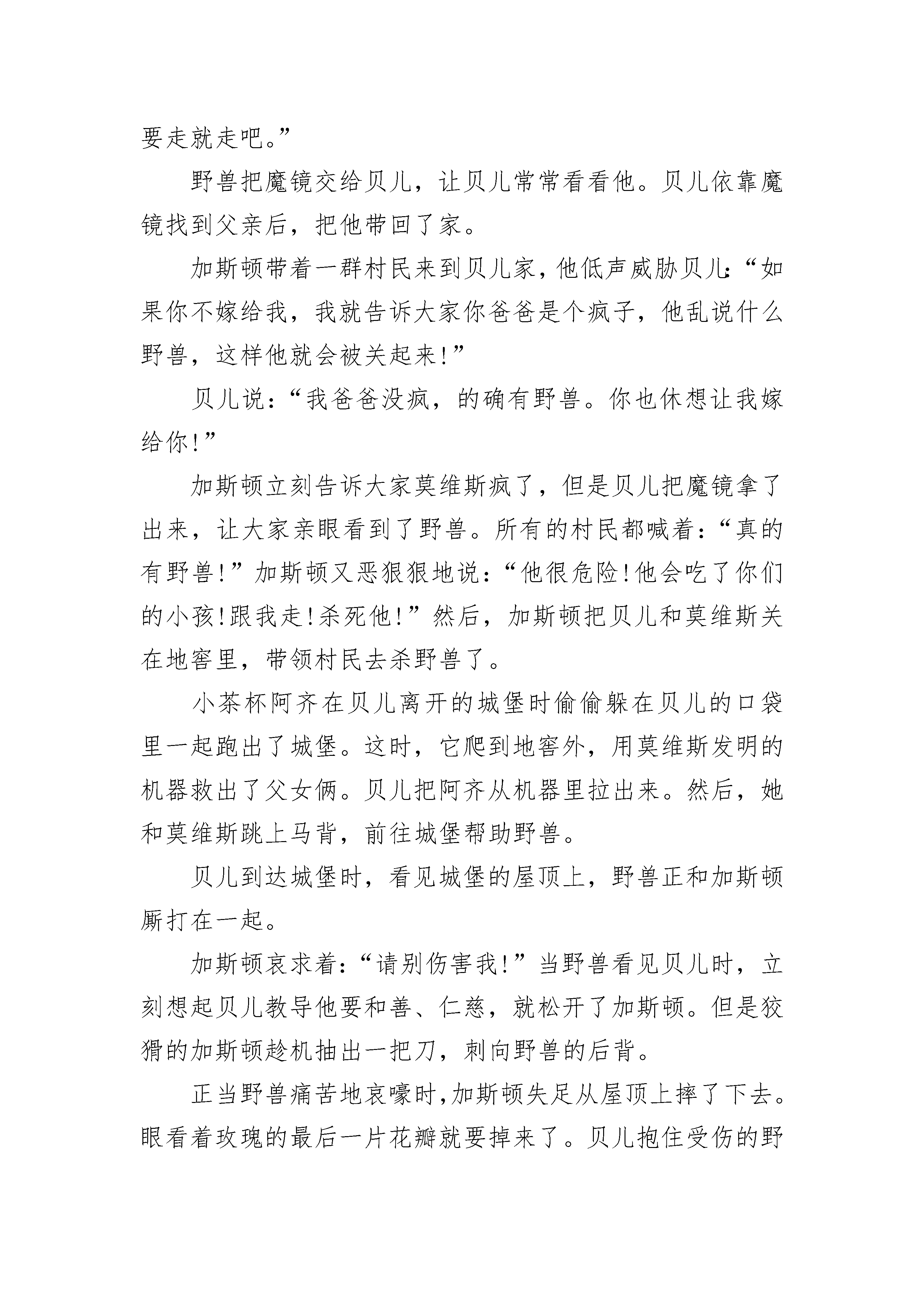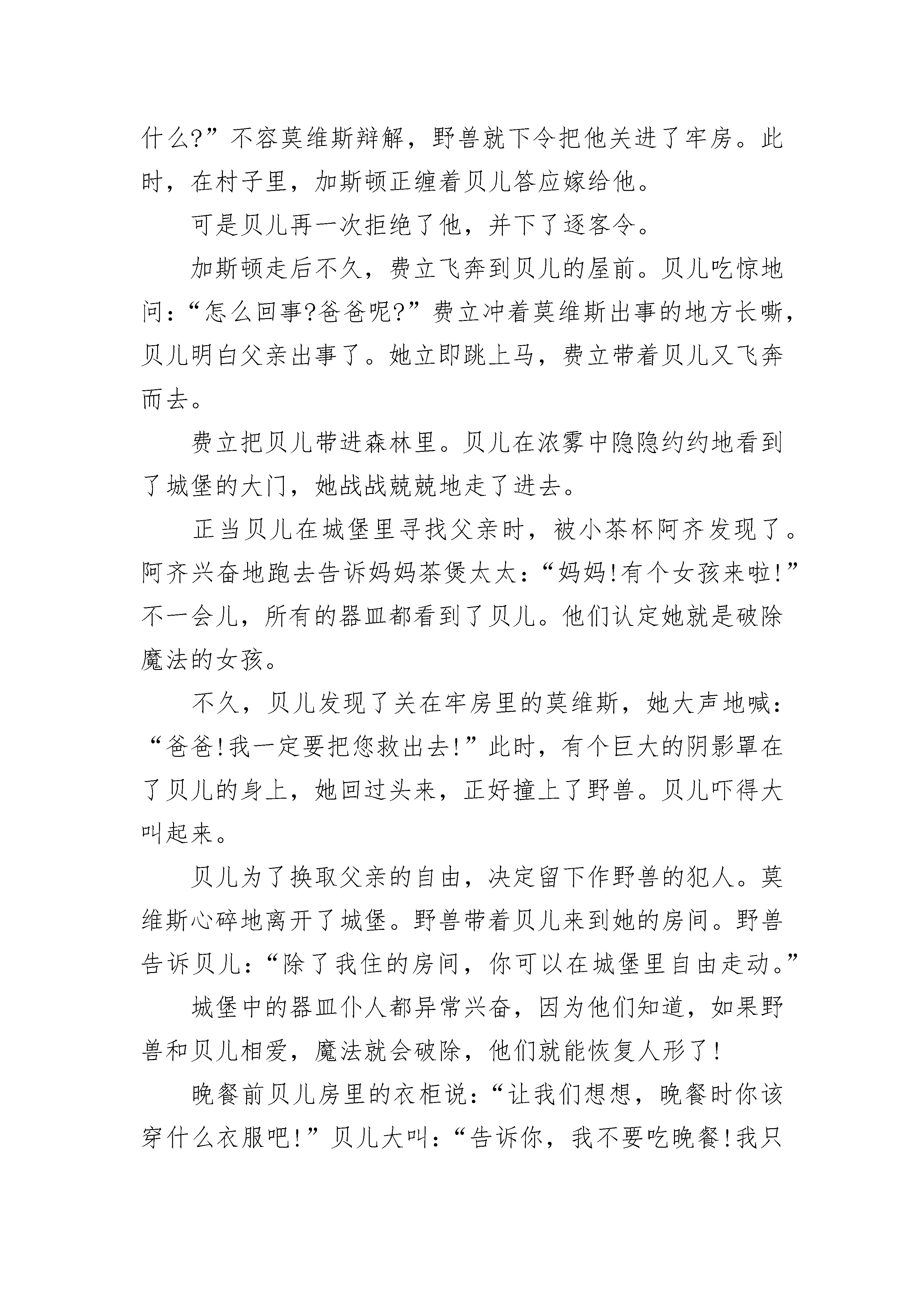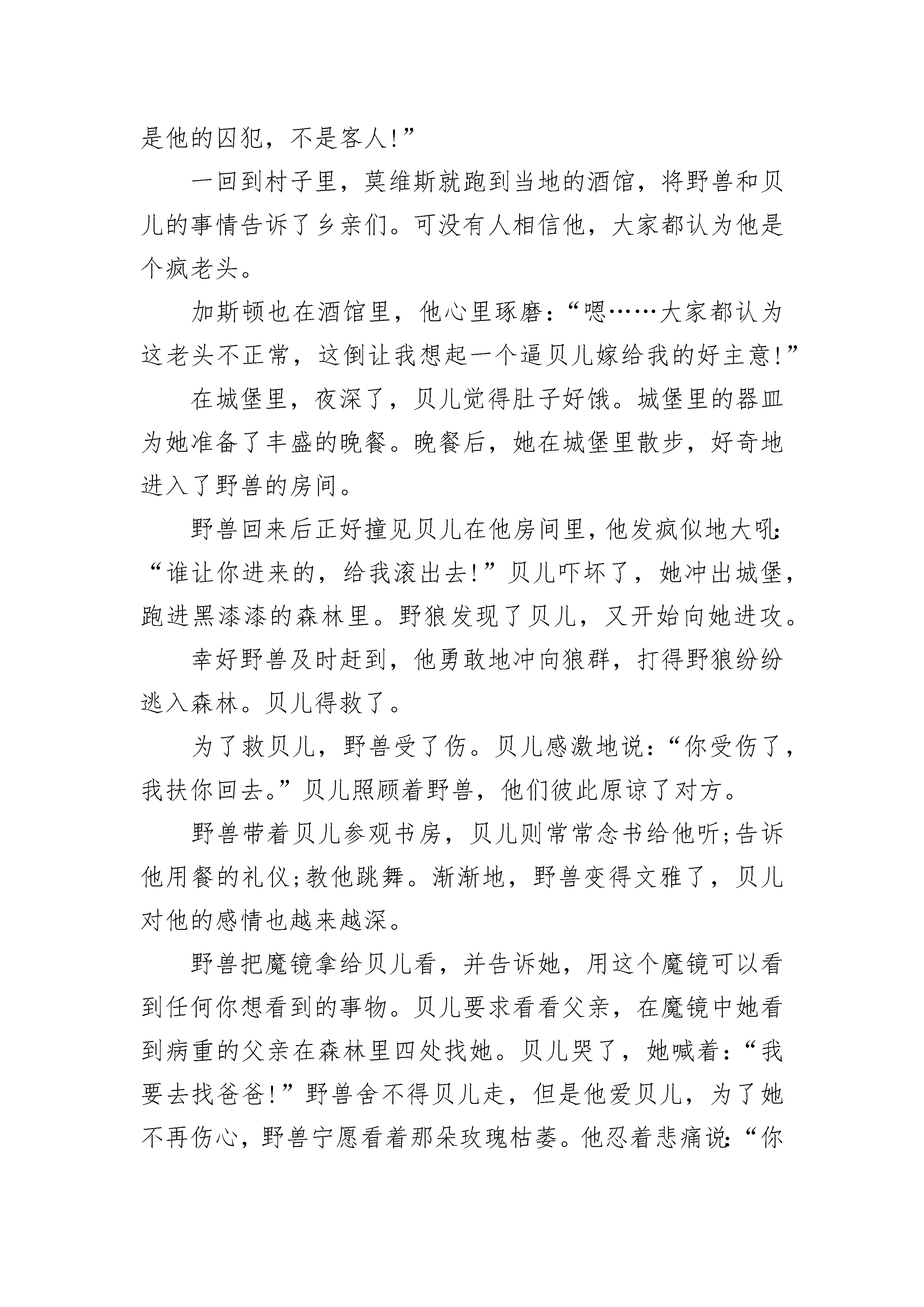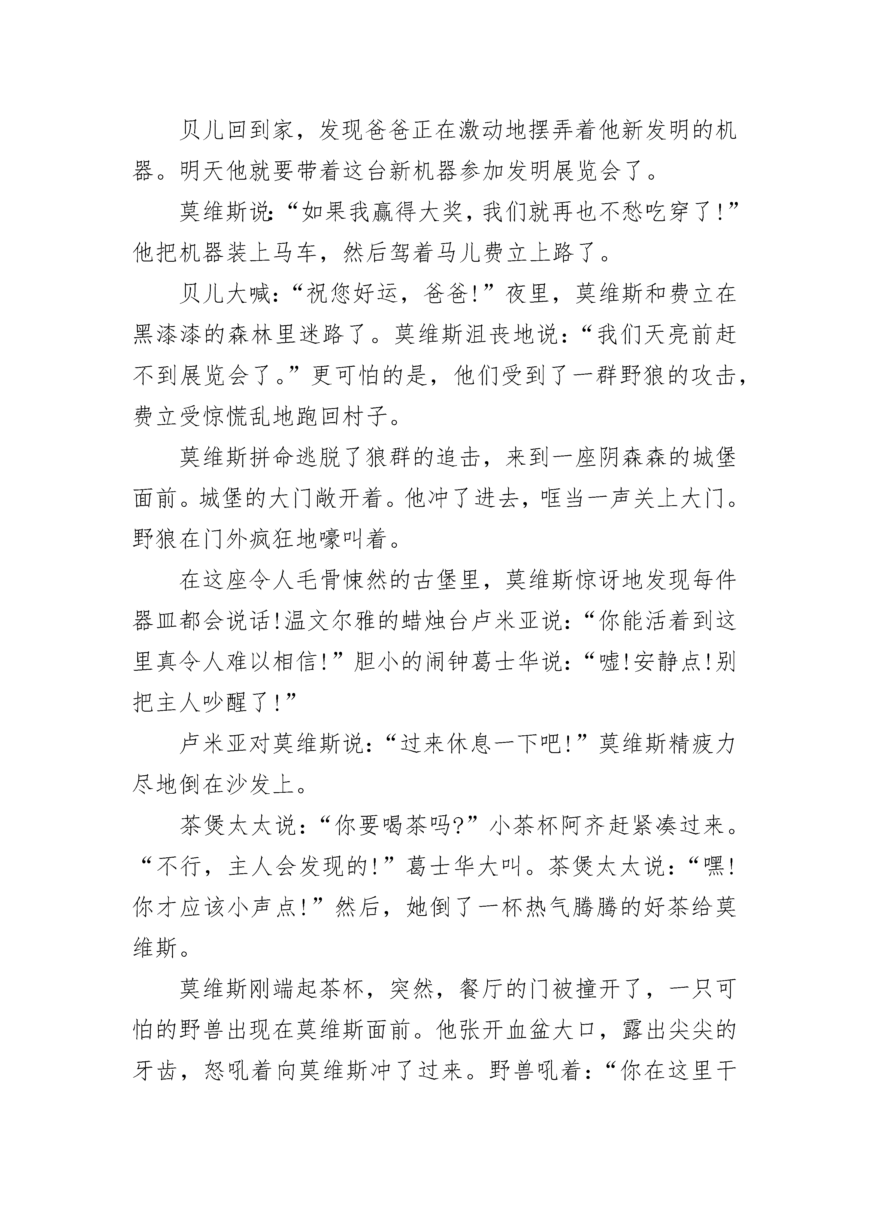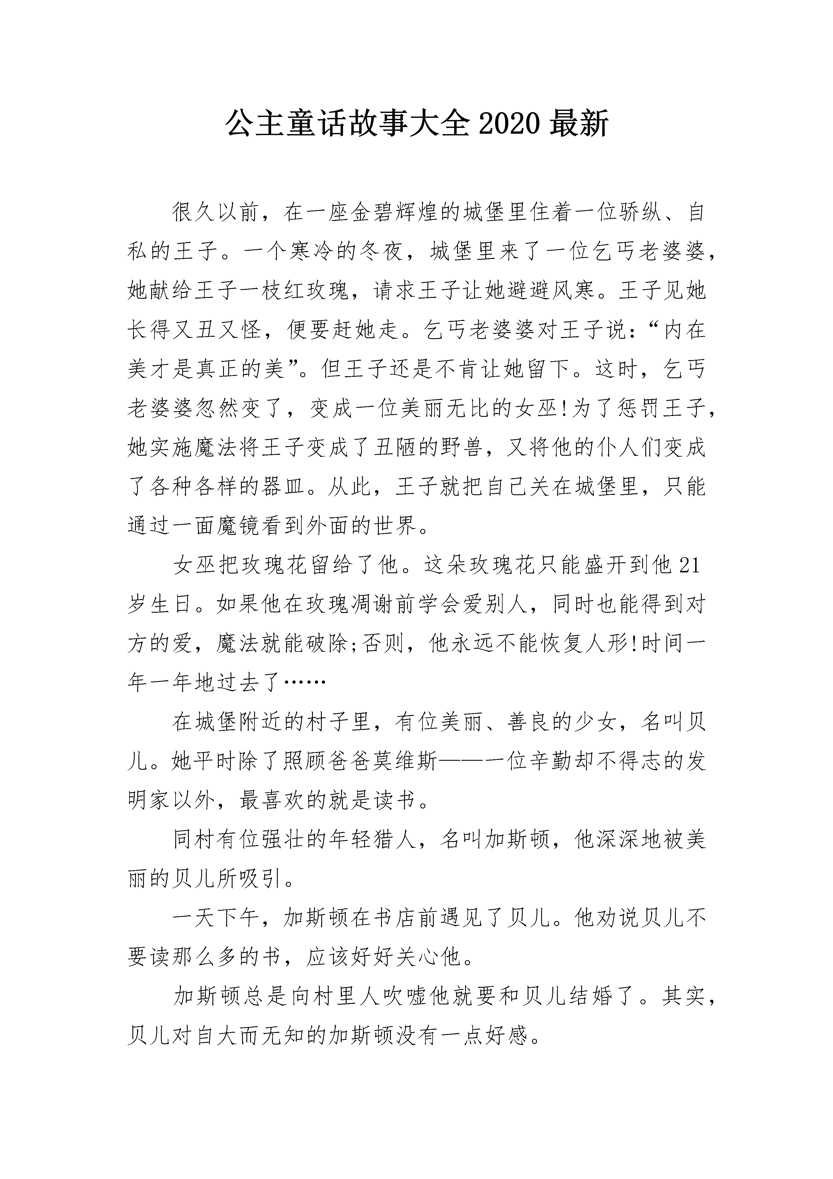 公主童话故事大全2020最新很久以前,在一座金碧辉煌的城堡里住着一位骄纵、自私的王子。一个寒冷的冬夜,城堡里来了一位乞丐老婆婆,她献给王子一枝红玫瑰,请求王子让她避避风寒。王子见她长得又丑又怪,便要赶她走。乞丐老婆婆对王子说:“内在美才是真正的美”。但王子还是不肯让她留下。这时,乞丐老婆婆忽然变了,变成一位美丽无比的女巫!为了惩罚王子,她实施魔法将王子变成了丑陋的野兽,又将他的仆人们变成了各种各样的器皿。从此,王子就把自己关在城堡里,只能通过一面魔镜看到外面的世界。女巫把玫瑰花留给了他。这朵玫瑰花只能盛开到他21岁生日。如果他在玫瑰凋谢前学会爱别人,同时也能得到对方的爱,魔法就能破除;否则,他永远不能恢复人形!时间一年一年地过去了……在城堡附近的村子里,有位美丽、善良的少女,名叫贝儿。她平时除了照顾爸爸莫维斯——一位辛勤却不得志的发明家以外,最喜欢的就是读书。同村有位强壮的年轻猎人,名叫加斯顿,他深深地被美丽的贝儿所吸引。一天下午,加斯顿在书店前遇见了贝儿。他劝说贝儿不要读那么多的书,应该好好关心他。加斯顿总是向村里人吹嘘他就要和贝儿结婚了。其实,贝儿对自大而无知的加斯顿没有一点好感。贝儿回到家,发现爸爸正在激动地摆弄着他新发明的机器。明天他就要带着这台新机器参加发明展览会了。莫维斯说:“如果我赢得大奖,我们就再也不愁吃穿了!”他把机器装上马车,然后驾着马儿费立上路了。贝儿大喊:“祝您好运,爸爸!”夜里,莫维斯和费立在黑漆漆的森林里迷路了。莫维斯沮丧地说:“我们天亮前赶不到展览会了。”更可怕的是,他们受到了一群野狼的攻击,费立受惊慌乱地跑回村子。莫维斯拼命逃脱了狼群的追击,来到一座阴森森的城堡面前。城堡的大门敞开着。他冲了进去,哐当一声关上大门。野狼在门外疯狂地嚎叫着。在这座令人毛骨悚然的古堡里,莫维斯惊讶地发现每件器皿都会说话!温文尔雅的蜡烛台卢米亚说:“你能活着到这里真令人难以相信!”胆小的闹钟葛士华说:“嘘!安静点!别把主人吵醒了!”卢米亚对莫维斯说:“过来休息一下吧!”莫维斯精疲力尽地倒在沙发上。茶煲太太说:“你要喝茶吗?”小茶杯阿齐赶紧凑过来。“不行,主人会发现的!”葛士华大叫。茶煲太太说:“嘿!你才应该小声点!”然后,她倒了一杯热气腾腾的好茶给莫维斯。莫维斯刚端起茶杯,突然,餐厅的门被撞开了,一只可怕的野兽出现在莫维斯面前。他张开血盆大口,露出尖尖的牙齿,怒吼着向莫维斯冲了过来。野兽吼着:“你在这里干什么?”不容莫维斯辩解,野兽就下令把他关进了牢房。此时,在村子里,加斯顿正缠着贝儿答应嫁给他。可是贝儿再一次拒绝了他,并下了逐客令。加斯顿走后不久,费立飞奔到贝儿的屋前。贝儿吃惊地问:“怎么回事?爸爸呢?”费立冲着莫维斯出事的地方长嘶,贝儿明白父亲出事了。她立即跳上马,费立带着贝儿又飞奔而去。费立把贝儿带进森林里。贝儿在浓雾中隐隐约约地看到了城堡的大门,她战战兢兢地走了进去。正当贝儿在城堡里寻找父亲时,被小茶杯阿齐发现了。阿齐兴奋地跑去告诉妈妈茶煲太太:“妈妈!有个女孩来啦!”不一会儿,所有的器皿都看到了贝儿。他们认定她就是破除魔法的女孩。不久,贝儿发现了关在牢房里的莫维斯,她大声地喊:“爸爸!我一定要把您救出去!”此时,有个巨大的阴影罩在了贝儿的身上,她回过头来,正好撞上了野兽。贝儿吓得大叫起来。贝儿为了换取父亲的自由,决定留下作野兽的犯人。莫维斯心碎地离开了城堡。野兽带着贝儿来到她的房间。野兽告诉贝儿:“除了我住的房间,你可以在城堡里自由走动。”城堡中的器皿仆人都异常兴奋,因为他们知道,如果野兽和贝儿相爱,魔法就会破除,他们就能恢复人形了!晚餐前贝儿房里的衣柜说:“让我们想想,晚餐时你该穿什么衣服吧!”贝儿大叫:“告诉你,我不要吃晚餐!我只是他的囚犯,不是客人!”一回到村子里,莫维斯就跑到当地的酒馆,将野兽和贝儿的事情告诉了乡亲们。可没有人相信他,大家都认为他是个疯老头。加斯顿也在酒馆里,他心里琢磨:“嗯……大家都认为这老头不正常,这倒让我想起一个逼贝儿嫁给我的好主意!”在城堡里,夜深了,贝儿觉得肚子好饿。城堡里的器皿为她准备了丰盛的晚餐。晚餐后,她在城堡里散步,好奇地进入了野兽的房间。野兽回来后正好撞见贝儿在他房间里,他发疯似地大吼:“谁让你进来的,给我滚出去!”贝儿吓坏了,她冲出城堡,跑进黑漆漆的森林里。野狼发现了贝儿,又开始向她进攻。幸好野兽及时赶到,他勇敢地冲向狼群,打得野狼纷纷逃入森林。贝儿得救了。为了救贝儿,野兽受了伤。贝儿感激地说:“你受伤了,我扶你回去。”贝儿照顾着野兽,他们彼此原谅了对方。野兽带着贝儿参观书房,贝儿则常常念书给他听;告诉他用餐的礼仪;教他跳舞。渐渐地,野兽变得文雅了,贝儿对他的感情也越来越深。野兽把魔镜拿给贝儿看,并告诉她,用这个魔镜可以看到任何你想看到的事物。贝儿要求看看父亲