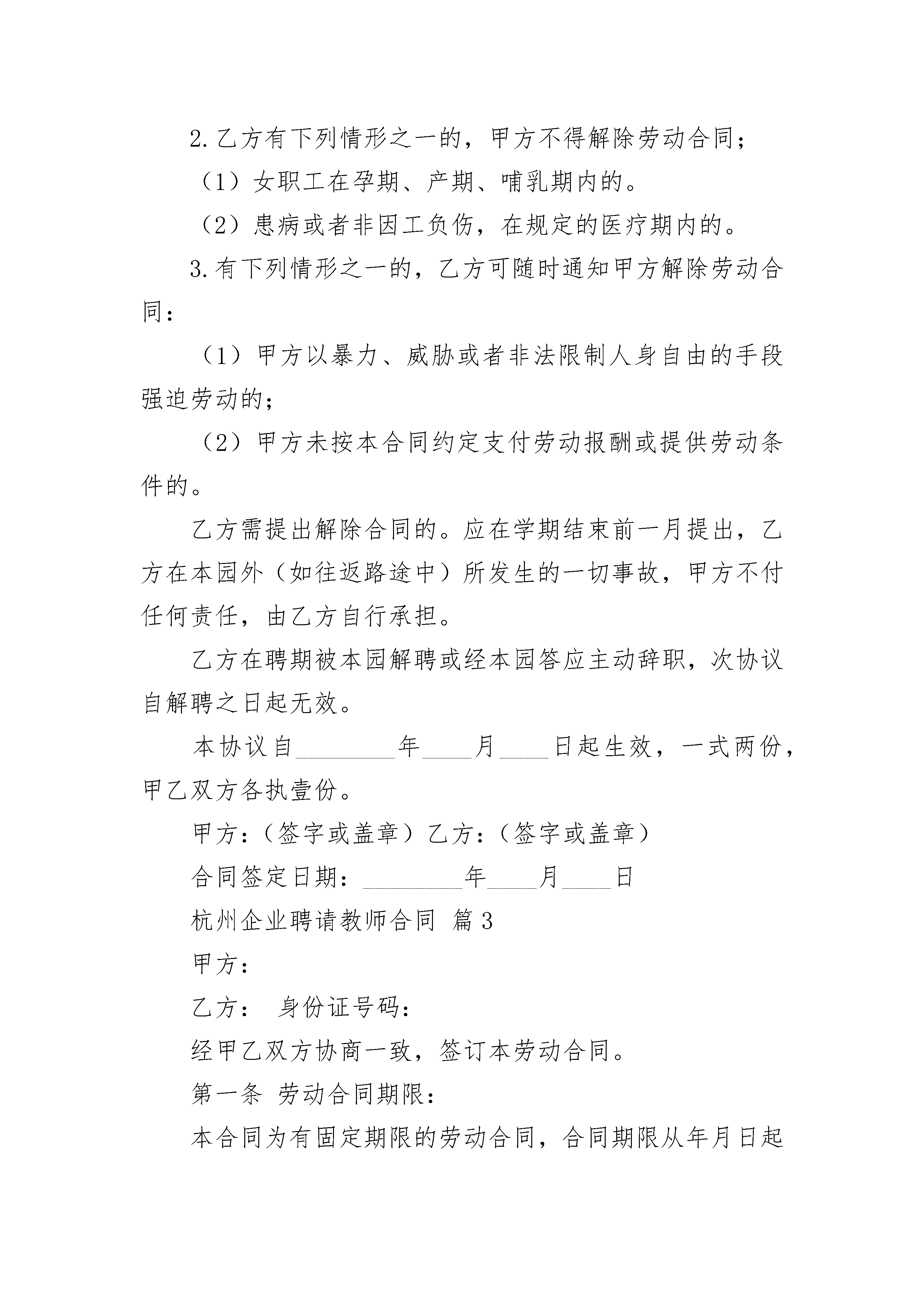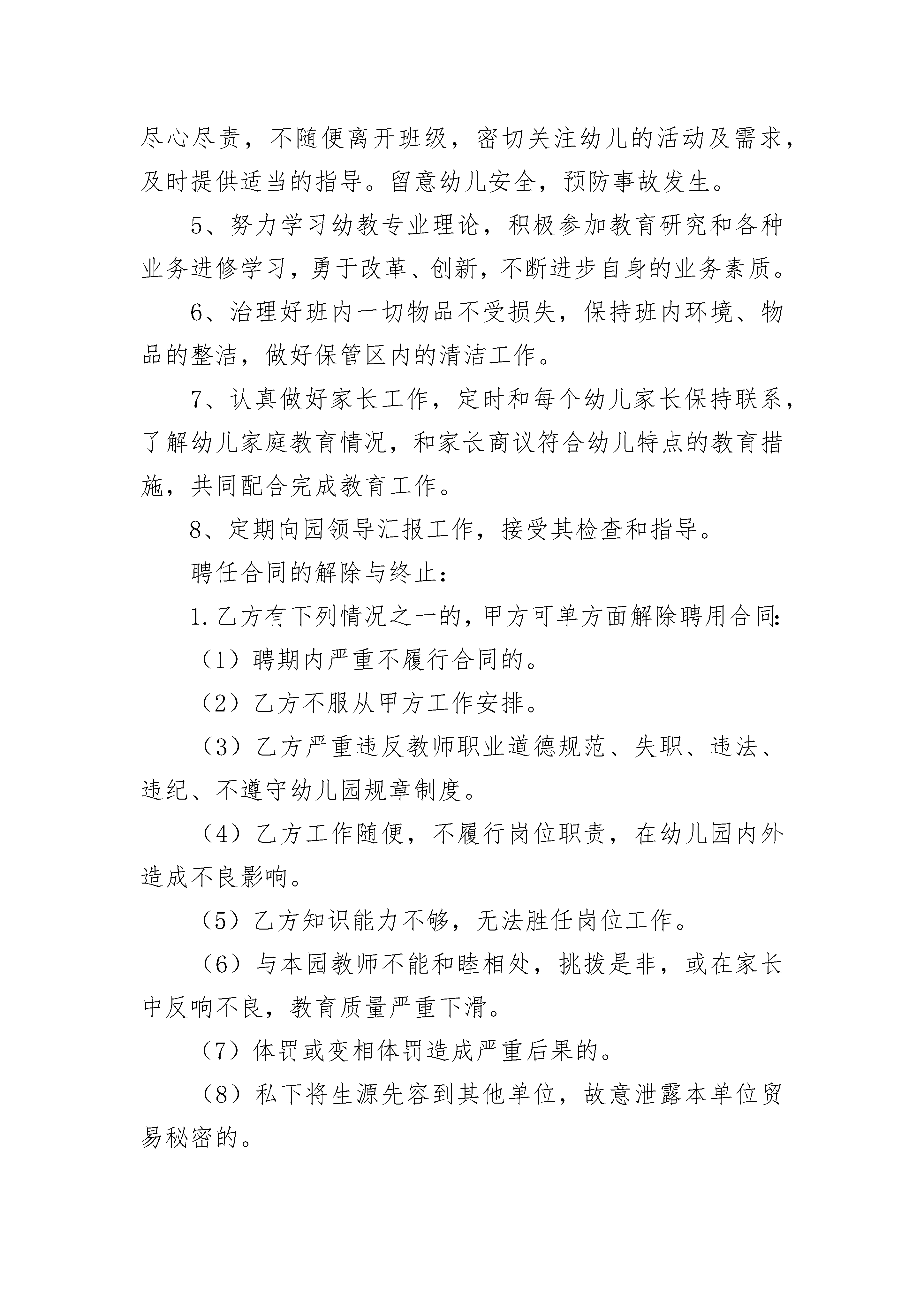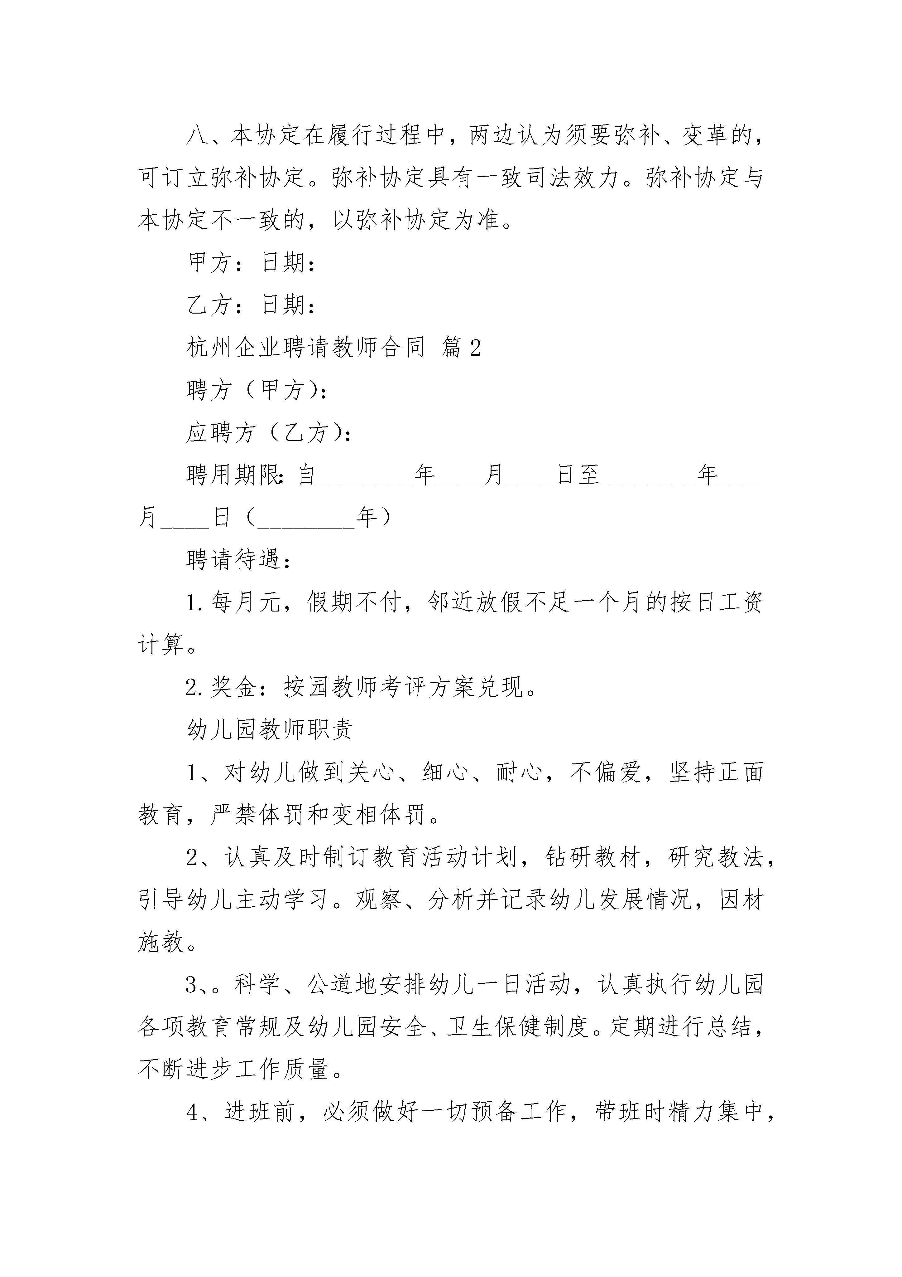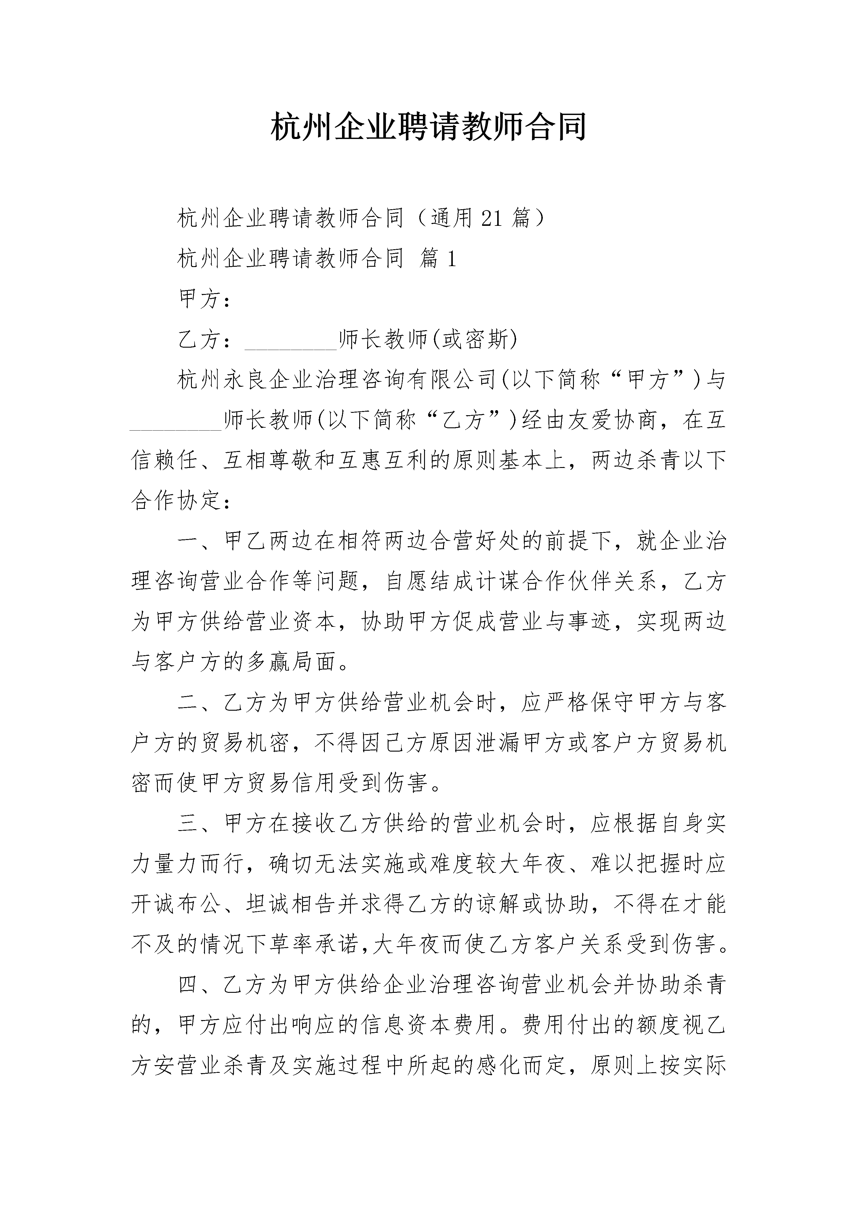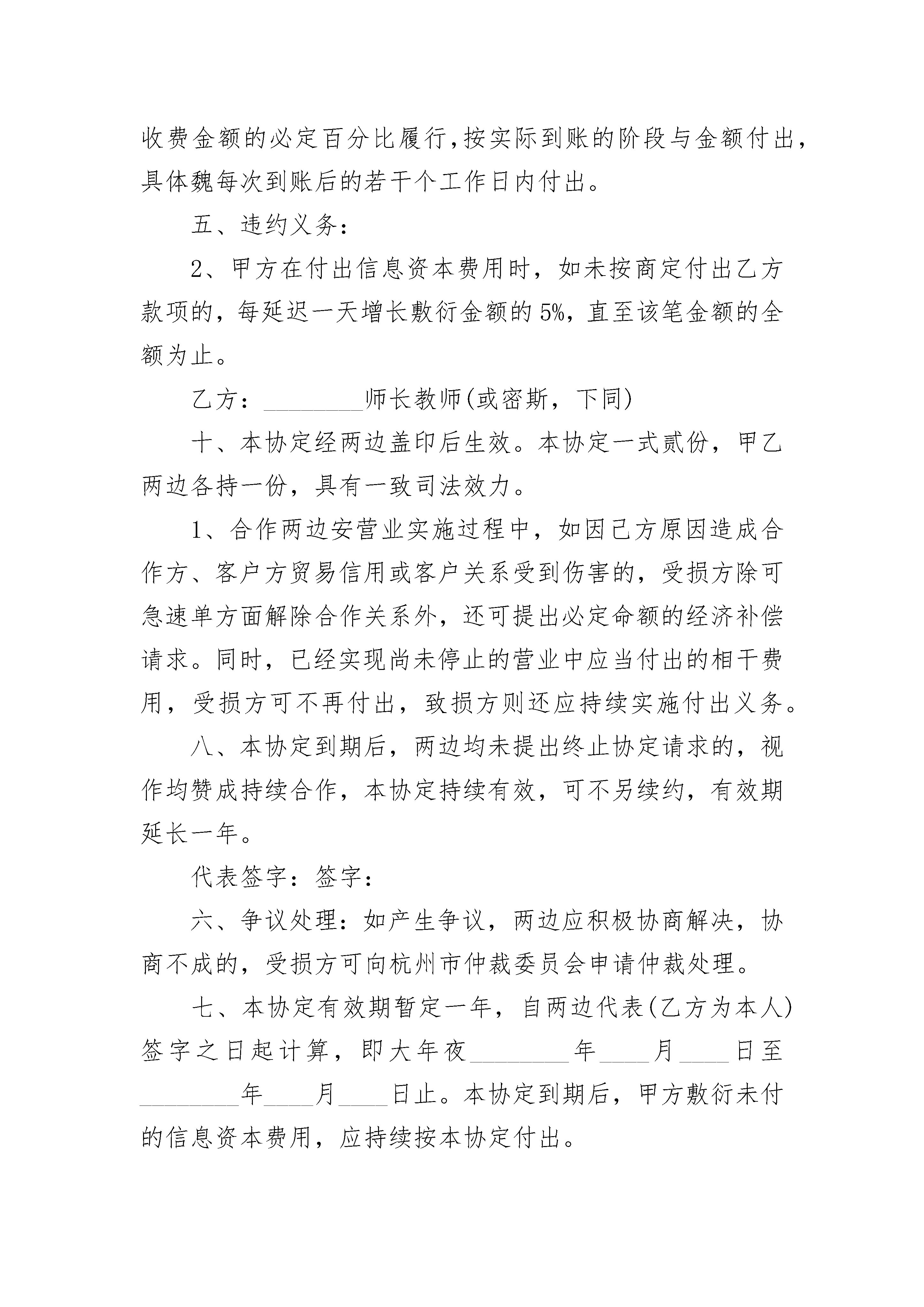 杭州企业聘请教师合同杭州企业聘请教师合同(通用21篇)杭州企业聘请教师合同篇1甲方:乙方:________师长教师(或密斯)杭州永良企业治理咨询有限公司(以下简称“甲方”)与________师长教师(以下简称“乙方”)经由友爱协商,在互信赖任、互相尊敬和互惠互利的原则基本上,两边杀青以下合作协定:一、甲乙两边在相符两边合营好处的前提下,就企业治理咨询营业合作等问题,自愿结成计谋合作伙伴关系,乙方为甲方供给营业资本,协助甲方促成营业与事迹,实现两边与客户方的多赢局面。二、乙方为甲方供给营业机会时,应严格保守甲方与客户方的贸易机密,不得因己方原因泄漏甲方或客户方贸易机密而使甲方贸易信用受到伤害。三、甲方在接收乙方供给的营业机会时,应根据自身实力量力而行,确切无法实施或难度较大年夜、难以把握时应开诚布公、坦诚相告并求得乙方的谅解或协助,不得在才能不及的情况下草率承诺,大年夜而使乙方客户关系受到伤害。四、乙方为甲方供给企业治理咨询营业机会并协助杀青的,甲方应付出响应的信息资本费用。费用付出的额度视乙方安营业杀青及实施过程中所起的感化而定,原则上按实际收费金额的必定百分比履行,按实际到账的阶段与金额付出,具体魏每次到账后的若干个工作日内付出。五、违约义务:2、甲方在付出信息资本费用时,如未按商定付出乙方款项的,每延迟一天增长敷衍金额的5%,直至该笔金额的全额为止。乙方:________师长教师(或密斯,下同)十、本协定经两边盖印后生效。本协定一式贰份,甲乙两边各持一份,具有一致司法效力。1、合作两边安营业实施过程中,如因己方原因造成合作方、客户方贸易信用或客户关系受到伤害的,受损方除可急速单方面解除合作关系外,还可提出必定命额的经济补偿请求。同时,已经实现尚未停止的营业中应当付出的相干费用,受损方可不再付出,致损方则还应持续实施付出义务。八、本协定到期后,两边均未提出终止协定请求的,视作均赞成持续合作,本协定持续有效,可不另续约,有效期延长一年。代表签字:签字:六、争议处理:如产生争议,两边应积极协商解决,协商不成的,受损方可向杭州市仲裁委员会申请仲裁处理。七、本协定有效期暂定一年,自两边代表(乙方为本人)签字之日起计算,即大年夜________年____月____日至________年____月____日止。本协定到期后,甲方敷衍未付的信息资本费用,应持续按本协定付出。八、本协定在履行过程中,两边认为须要弥补、变革的,可订立弥补协定。弥补协定具有一致司法效力。弥补协定与本协定不一致的,以弥补协定为准。甲方:日期:乙方:日期:杭州企业聘请教师合同篇2聘方(甲方):应聘方(乙方):聘用期限:自________年____月____日至________年____月____日(________年)聘请待遇:1.每月元,假期不付,邻近放假不足一个月的按日工资计算。2.奖金:按园教师考评方案兑现。幼儿园教师职责1、对幼儿做到关心、细心、耐心,不偏爱,坚持正面教育,严禁体罚和变相体罚。2、认真及时制订教育活动计划,钻研教材,研究教法,引导幼儿主动学习。观察、分析并记录幼儿发展情况,因材施教。3、。科学、公道地安排幼儿一日活动,认真执行幼儿园各项教育常规及幼儿园安全、卫生保健制度。定期进行总结,不断进步工作质量。4、进班前,必须做好一切预备工作,带班时精力集中,尽心尽责,不随便离开班级,密切关注幼儿的活动及需求,及时提供适当的指导。留意幼儿安全,预防事故发生。5、努力学习幼教专业理论,积极参加教育研究和各种业务进修学习,勇于改革、创新,不断进步自身的业务素质。6、治理好班内一切物品不受损失,保持班内环境、物品的整洁,做好保管区内的清洁工作。7、认真做好家长工作,定时和每个幼儿家长保持联系,了解幼儿家庭教育情况,和家长商议符合幼儿特点的教育措施,共同配合完成教育工作。8、定期向园领导汇报工作,接受其检查和指导。聘任合同的解除与终止:1.乙方有下列情况之一的,甲方可单方面解除聘用合同:(1)聘期内严重不履行合同的。(2)乙方不服从甲方工作安排。(3)乙方严重违反教师职业道德规范、失职、违法、违纪、不遵守幼儿园规章制度。(4)乙方工作随便,不履行岗位职责,在幼儿园内外造成不良影响。(5)乙方知识能力不够,无法胜任岗位工作。(6)与本园教师不能和睦相处,挑拨是非,或在家长中反响不良,教育质量严重下滑。(7)体罚或变相体罚造成严重后果的。(8)私下将生源先容到其他单位,故意泄露本单位贸易秘密的。2.乙方有下列情形之一的,甲方不得解除劳动合同;(1)女职工在孕期、产期、哺乳期内的。(2)患病或者非因工负伤,在规定的医疗期内的。3.有下列情形之一的,乙方可随时通知甲方解除劳动合同:(1)甲方以暴力、威胁或者非法限制人身自由的手段强迫劳动的;(2)甲方未按本合同约