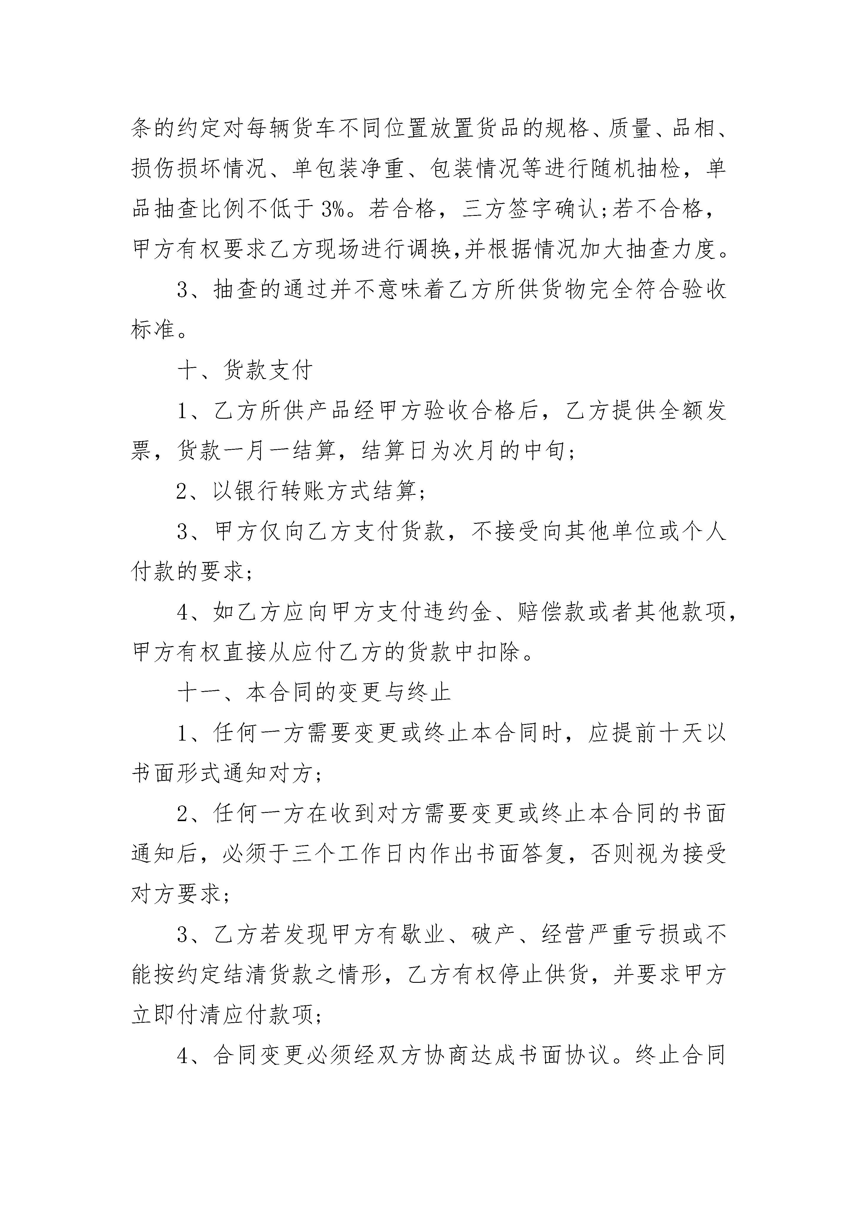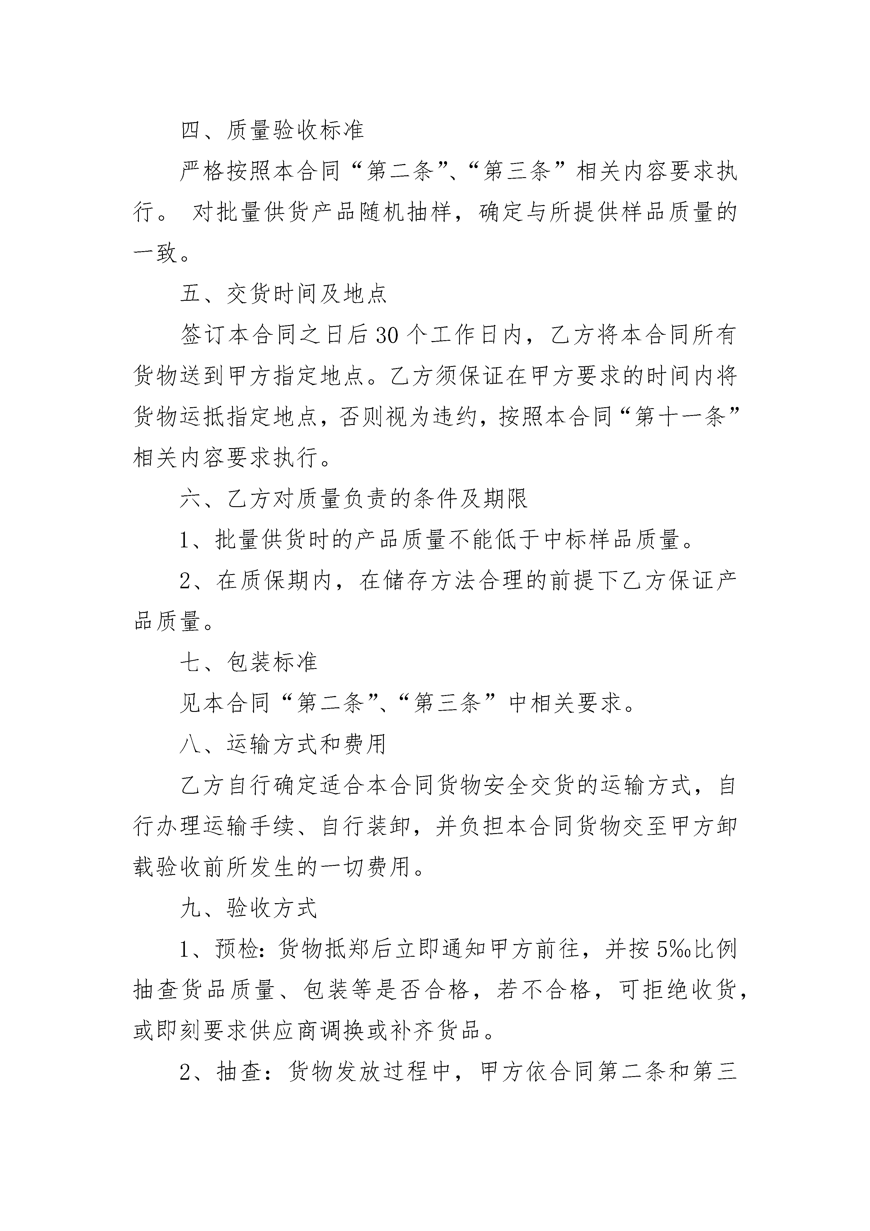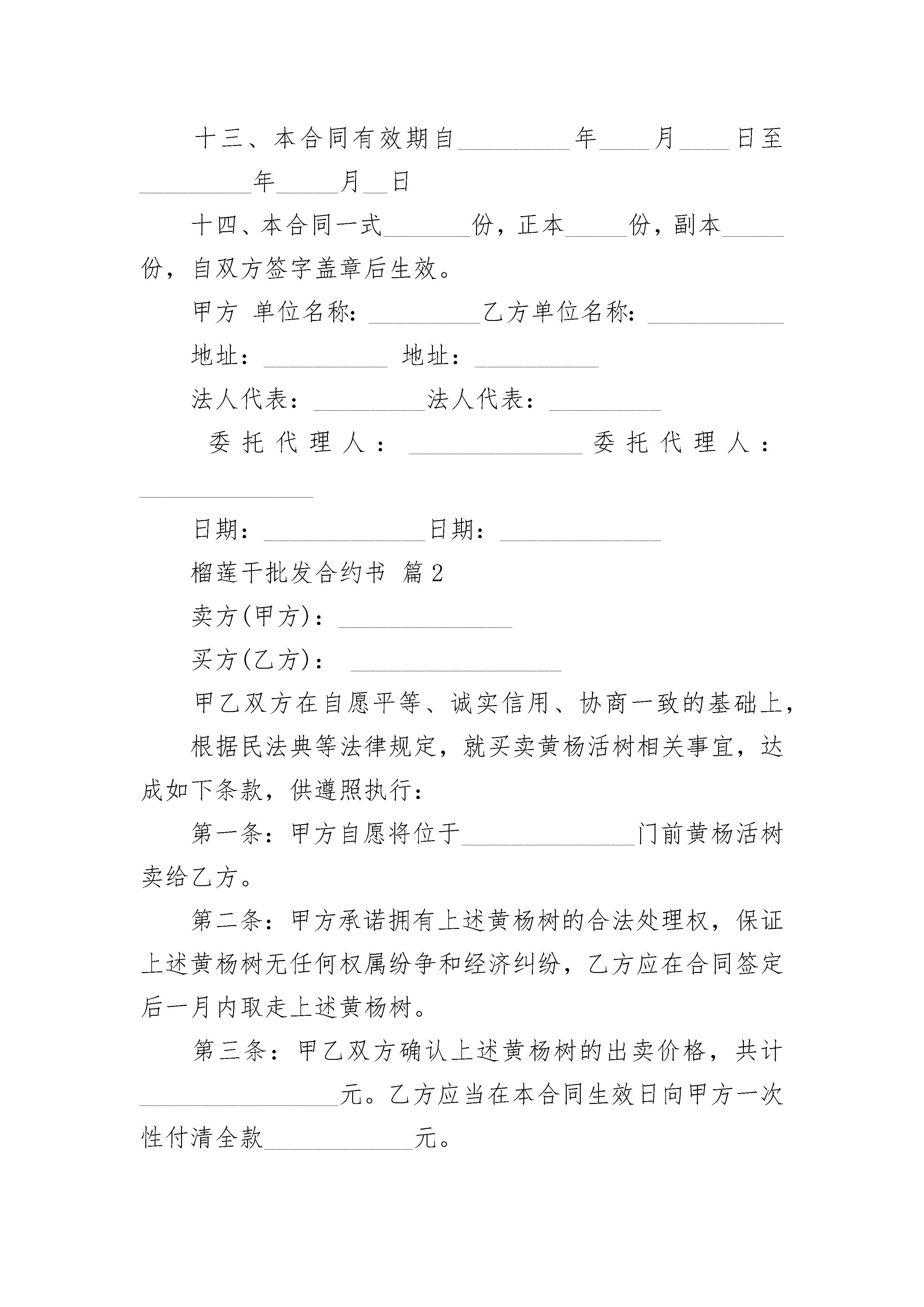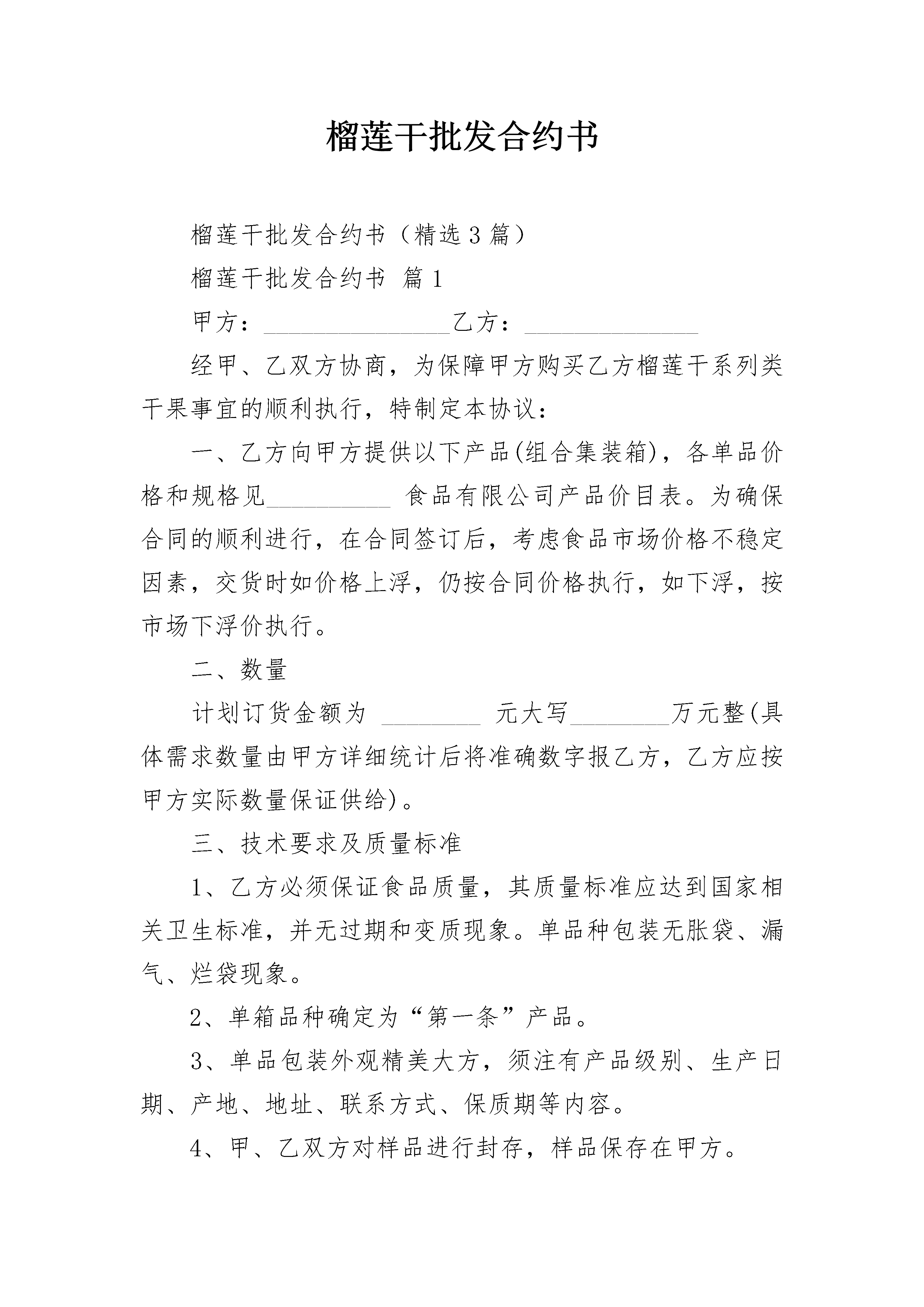 榴莲干批发合约书榴莲干批发合约书(精选3篇)榴莲干批发合约书篇1甲方:_______________乙方:______________经甲、乙双方协商,为保障甲方购买乙方榴莲干系列类干果事宜的顺利执行,特制定本协议:一、乙方向甲方提供以下产品(组合集装箱),各单品价格和规格见__________食品有限公司产品价目表。为确保合同的顺利进行,在合同签订后,考虑食品市场价格不稳定因素,交货时如价格上浮,仍按合同价格执行,如下浮,按市场下浮价执行。二、数量计划订货金额为________元大写________万元整(具体需求数量由甲方详细统计后将准确数字报乙方,乙方应按甲方实际数量保证供给)。三、技术要求及质量标准1、乙方必须保证食品质量,其质量标准应达到国家相关卫生标准,并无过期和变质现象。单品种包装无胀袋、漏气、烂袋现象。2、单箱品种确定为“第一条”产品。3、单品包装外观精美大方,须注有产品级别、生产日期、产地、地址、联系方式、保质期等内容。4、甲、乙双方对样品进行封存,样品保存在甲方。四、质量验收标准严格按照本合同“第二条”、“第三条”相关内容要求执行。对批量供货产品随机抽样,确定与所提供样品质量的一致。五、交货时间及地点签订本合同之日后30个工作日内,乙方将本合同所有货物送到甲方指定地点。乙方须保证在甲方要求的时间内将货物运抵指定地点,否则视为违约,按照本合同“第十一条”相关内容要求执行。六、乙方对质量负责的条件及期限1、批量供货时的产品质量不能低于中标样品质量。2、在质保期内,在储存方法合理的前提下乙方保证产品质量。七、包装标准见本合同“第二条”、“第三条”中相关要求。八、运输方式和费用乙方自行确定适合本合同货物安全交货的运输方式,自行办理运输手续、自行装卸,并负担本合同货物交至甲方卸载验收前所发生的一切费用。九、验收方式1、预检:货物抵郑后立即通知甲方前往,并按5‰比例抽查货品质量、包装等是否合格,若不合格,可拒绝收货,或即刻要求供应商调换或补齐货品。2、抽查:货物发放过程中,甲方依合同第二条和第三条的约定对每辆货车不同位置放置货品的规格、质量、品相、损伤损坏情况、单包装净重、包装情况等进行随机抽检,单品抽查比例不低于3%。若合格,三方签字确认;若不合格,甲方有权要求乙方现场进行调换,并根据情况加大抽查力度。3、抽查的通过并不意味着乙方所供货物完全符合验收标准。十、货款支付1、乙方所供产品经甲方验收合格后,乙方提供全额发票,货款一月一结算,结算日为次月的中旬;2、以银行转账方式结算;3、甲方仅向乙方支付货款,不接受向其他单位或个人付款的要求;4、如乙方应向甲方支付违约金、赔偿款或者其他款项,甲方有权直接从应付乙方的货款中扣除。十一、本合同的变更与终止1、任何一方需要变更或终止本合同时,应提前十天以书面形式通知对方;2、任何一方在收到对方需要变更或终止本合同的书面通知后,必须于三个工作日内作出书面答复,否则视为接受对方要求;3、乙方若发现甲方有歇业、破产、经营严重亏损或不能按约定结清货款之情形,乙方有权停止供货,并要求甲方立即付清应付款项;4、合同变更必须经双方协商达成书面协议。终止合同时双方必须结清全部货款后方为有效;5、乙方的业务人员未经公司书面授权,其作出的任何承诺均为无效。十二、违约责任1、乙方未在约定期限内交付产品的,每逾期一日,按每天伍佰元罚款,罚款总价不超过总货款的10%;2、乙方未在约定期限内通过甲方实质验收的,每逾期一日,按每天_______元罚款,罚款总价不得超过总货款的________%;3、上述各项违约金可以累计,违约金不足以弥补守约方损失的,应当补足损失。十三、解决纠纷的方式合同履行过程中如发生争议,双方友好协商;协商不成,应向甲方所在地人民法院起诉。十四、其它约定事项1、未尽事宜,双方协商形成补充协议;2、未经双方一致同意,任何一方不得变更合同(供货数量除外)。对本合同正文或附件作任何更改,必须以书面形式详细说明更改对价格、验收日期以及本合同的其他重大事项的影响,而且应由双方公司签字盖章;3、附件作为本合同的组成部分,与本合同具有同等效力4、本合同中所记载的地址为双方真实有效的地址,一方地址发生变动应当于10日内告知对方。十三、本合同有效期自_________年____月____日至_________年_____月__日十四、本合同一式_______份,正本_____份,副本_____份,自双方签字盖章后生效。甲方单位名称:_________乙方单位名称:___________地址:__________地址:__________法人代表:_________法人代表:_________委托代理人:______________委托代理人:______________日期:_____________