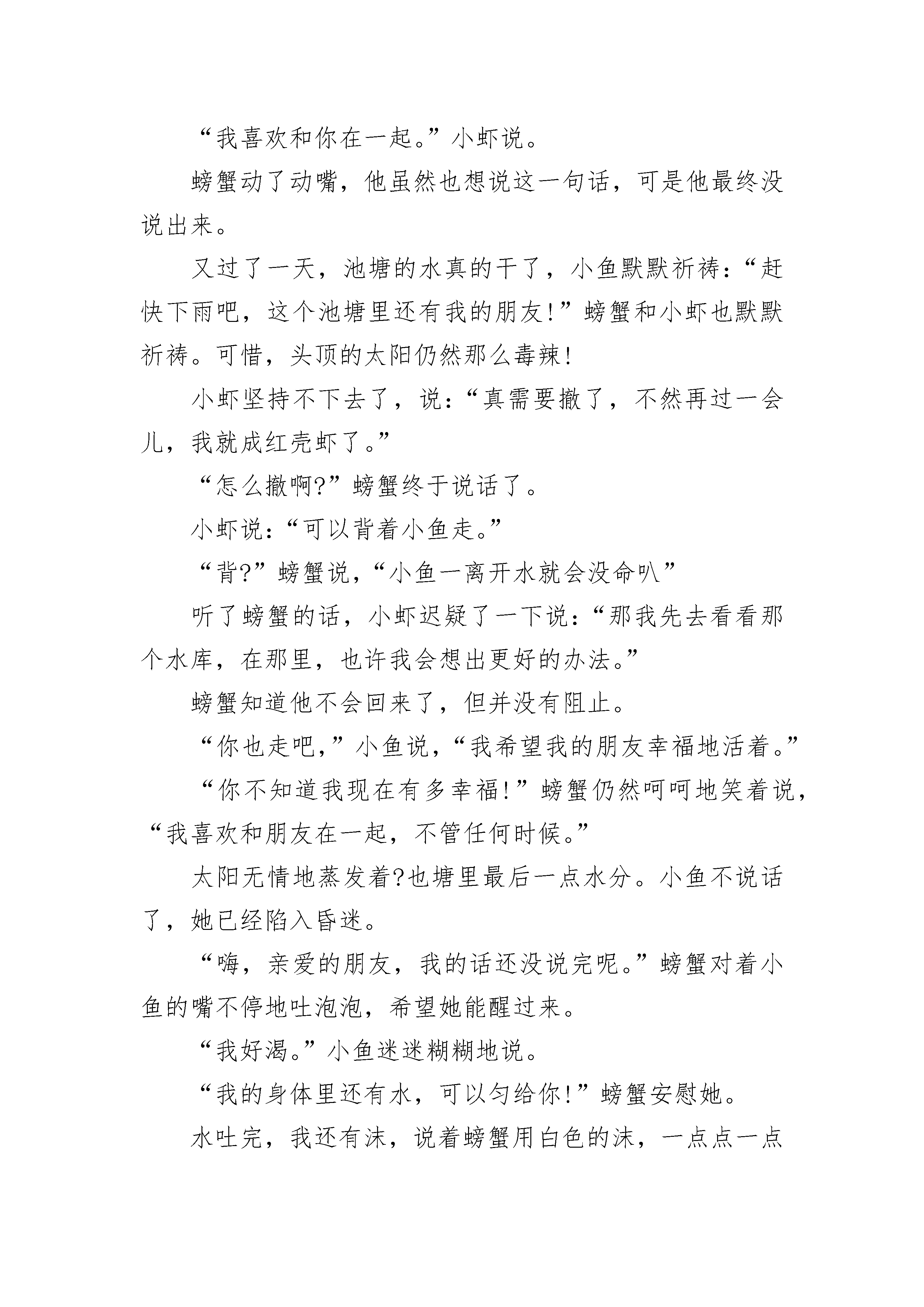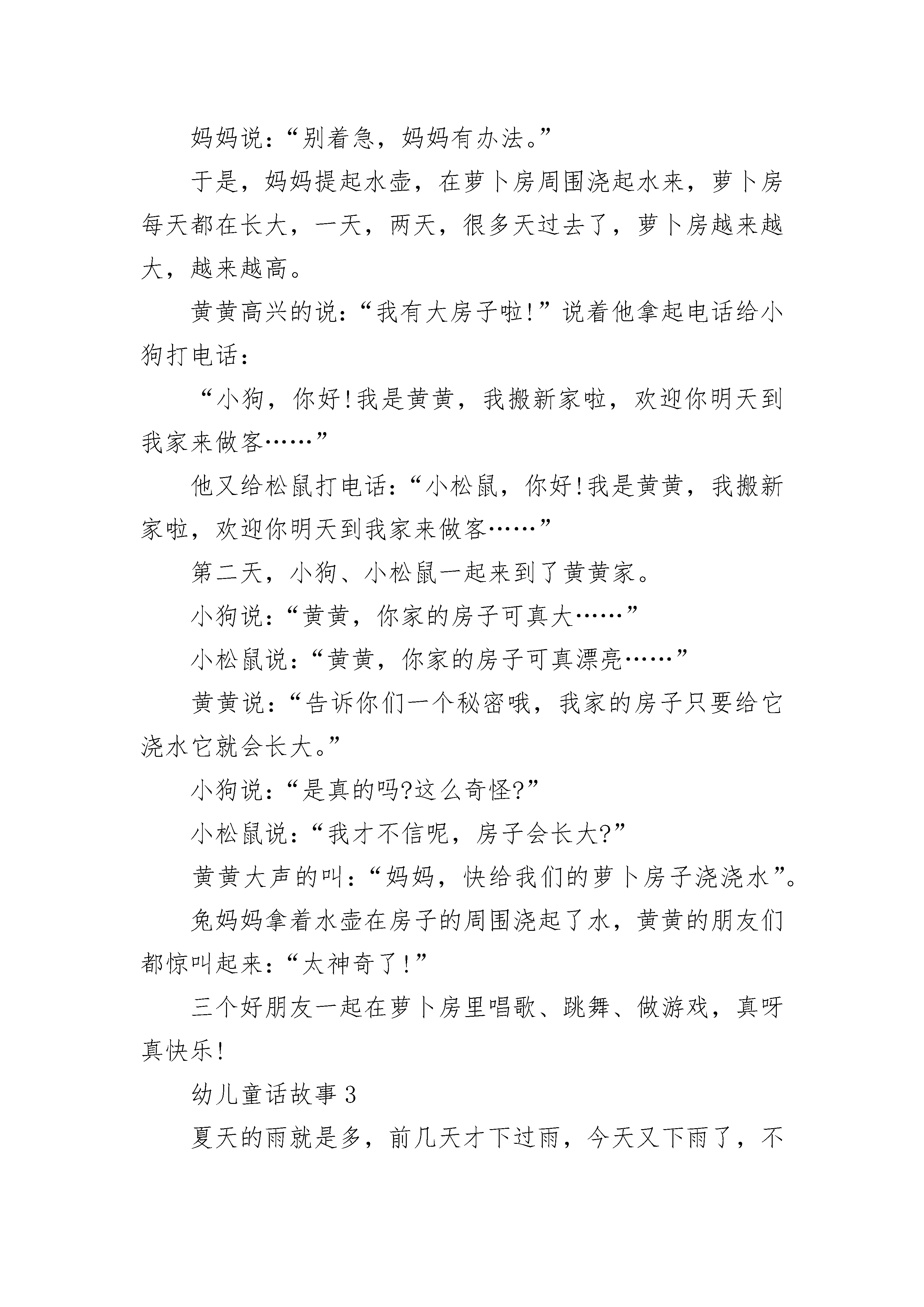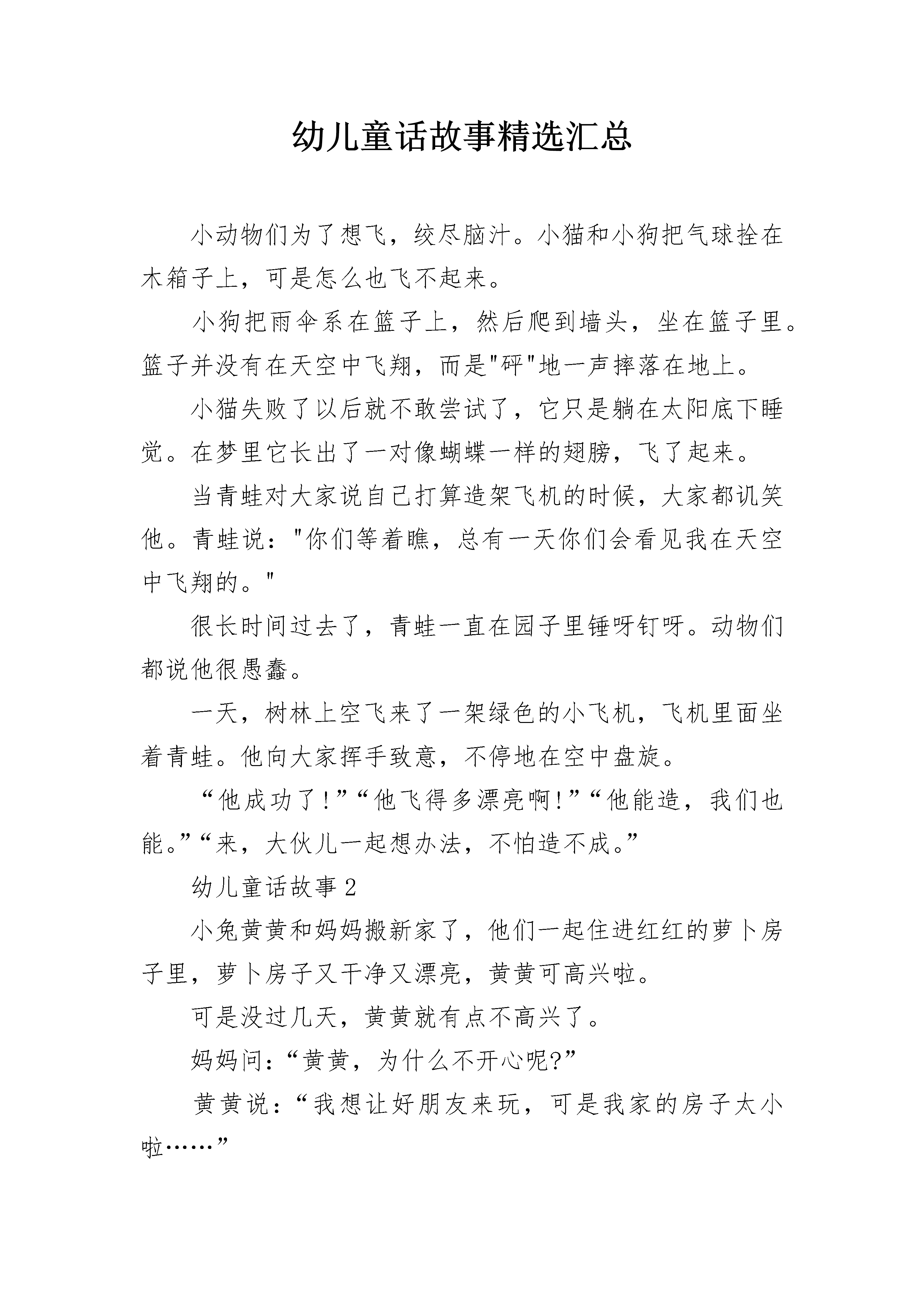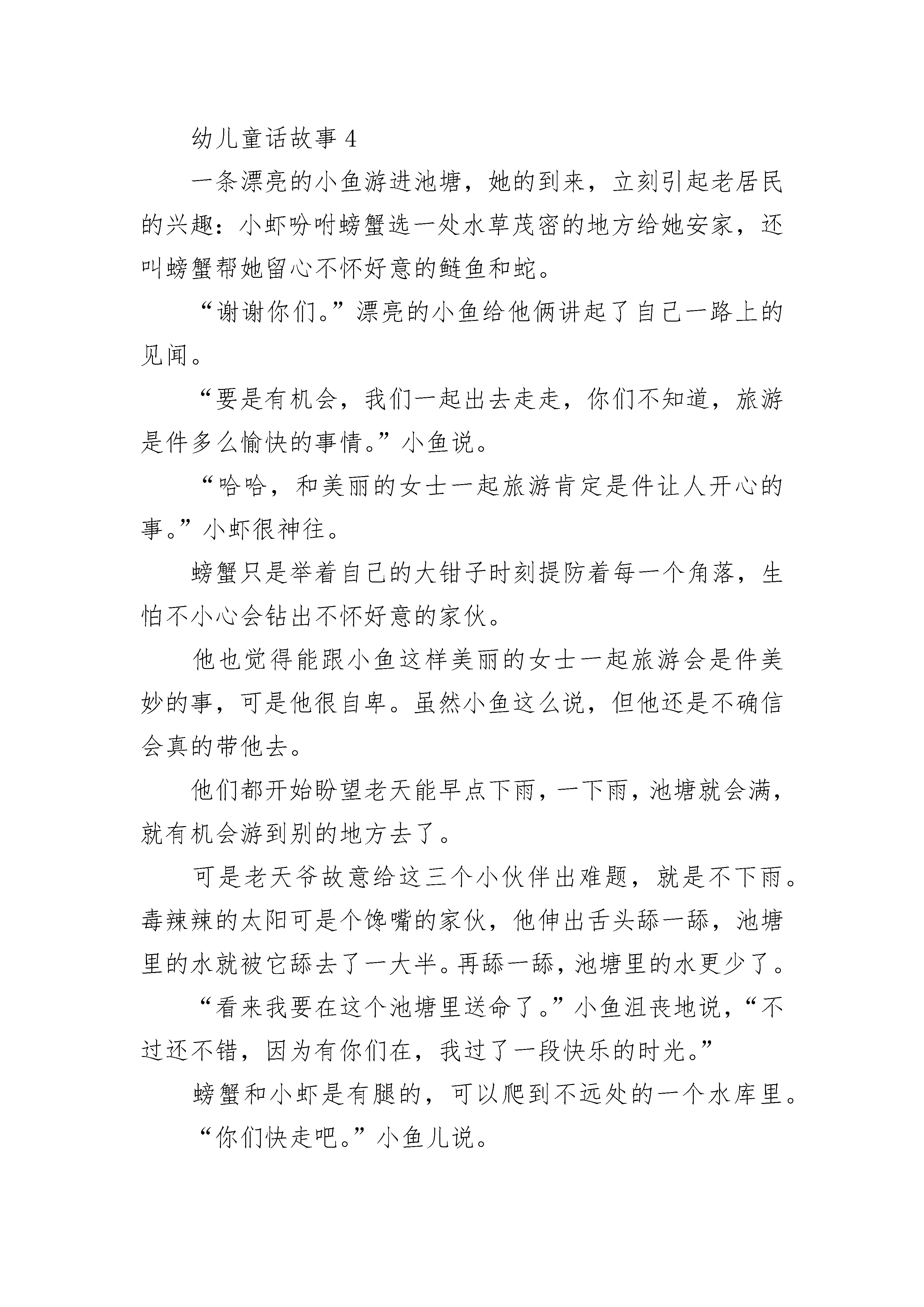 幼儿童话故事精选汇总小动物们为了想飞,绞尽脑汁。小猫和小狗把气球拴在木箱子上,可是怎么也飞不起来。小狗把雨伞系在篮子上,然后爬到墙头,坐在篮子里。篮子并没有在天空中飞翔,而是"砰"地一声摔落在地上。小猫失败了以后就不敢尝试了,它只是躺在太阳底下睡觉。在梦里它长出了一对像蝴蝶一样的翅膀,飞了起来。当青蛙对大家说自己打算造架飞机的时候,大家都讥笑他。青蛙说:"你们等着瞧,总有一天你们会看见我在天空中飞翔的。"很长时间过去了,青蛙一直在园子里锤呀钉呀。动物们都说他很愚蠢。一天,树林上空飞来了一架绿色的小飞机,飞机里面坐着青蛙。他向大家挥手致意,不停地在空中盘旋。“他成功了!”“他飞得多漂亮啊!”“他能造,我们也能。”“来,大伙儿一起想办法,不怕造不成。”幼儿童话故事2小兔黄黄和妈妈搬新家了,他们一起住进红红的萝卜房子里,萝卜房子又干净又漂亮,黄黄可高兴啦。可是没过几天,黄黄就有点不高兴了。妈妈问:“黄黄,为什么不开心呢?”黄黄说:“我想让好朋友来玩,可是我家的房子太小啦……”妈妈说:“别着急,妈妈有办法。”于是,妈妈提起水壶,在萝卜房周围浇起水来,萝卜房每天都在长大,一天,两天,很多天过去了,萝卜房越来越大,越来越高。黄黄高兴的说:“我有大房子啦!”说着他拿起电话给小狗打电话:“小狗,你好!我是黄黄,我搬新家啦,欢迎你明天到我家来做客……”他又给松鼠打电话:“小松鼠,你好!我是黄黄,我搬新家啦,欢迎你明天到我家来做客……”第二天,小狗、小松鼠一起来到了黄黄家。小狗说:“黄黄,你家的房子可真大……”小松鼠说:“黄黄,你家的房子可真漂亮……”黄黄说:“告诉你们一个秘密哦,我家的房子只要给它浇水它就会长大。”小狗说:“是真的吗?这么奇怪?”小松鼠说:“我才不信呢,房子会长大?”黄黄大声的叫:“妈妈,快给我们的萝卜房子浇浇水”。兔妈妈拿着水壶在房子的周围浇起了水,黄黄的朋友们都惊叫起来:“太神奇了!”三个好朋友一起在萝卜房里唱歌、跳舞、做游戏,真呀真快乐!幼儿童话故事3夏天的雨就是多,前几天才下过雨,今天又下雨了,不过唯一的好处是,雨后会很凉快。这也是小熊不那么讨厌雨的原因。很快,雨就停了,天空放晴了。“好漂亮啊!快看!。”小熊仿佛发现了什么宝贝。“什么呀,大惊小怪的!”小猴顺着小熊手指的方向看去,原来是一道彩虹。”“好漂亮的彩虹啊!”小熊说,“走,咱们去找彩虹吧!”“什么,找彩虹?”小猴觉得很新鲜。“那彩虹离我们一定不是很远!”于是,小熊和小猴便出发去找彩虹了,跑了好多路,他们终于看到彩虹了,七种色彩,闪闪发光,小熊和小猴走到彩虹边,伸手摸了摸彩虹,胖乎乎的彩虹真可爱。“嘿嘿!”彩虹的身子忽然扭了扭,“别摸我了,好痒痒呀!”原来是彩虹在说话。“真有意思!”小熊很开心,“彩虹还怕痒痒呀!哈哈哈!”“你们是不是非常喜欢雨呀?”小猴问,“为什么每次下雨后经常会见到你们!”彩虹又扭了扭身子:“不是我们喜欢雨,而是大雨过后的天气条件,有利于我们出现呀!所以我们和雨是分不开的好伙伴呢!”原来,彩虹是气象中的一种光学现象。当阳光照射到半空中的雨点,光线被折射及反射,在天空中形成拱形的七色光谱,彩虹的七彩颜色一般为:红、橙、黄、绿、青、蓝、紫。幼儿童话故事4一条漂亮的小鱼游进池塘,她的到来,立刻引起老居民的兴趣:小虾吩咐螃蟹选一处水草茂密的地方给她安家,还叫螃蟹帮她留心不怀好意的鲢鱼和蛇。“谢谢你们。”漂亮的小鱼给他俩讲起了自己一路上的见闻。“要是有机会,我们一起出去走走,你们不知道,旅游是件多么愉快的事情。”小鱼说。“哈哈,和美丽的女士一起旅游肯定是件让人开心的事。”小虾很神往。螃蟹只是举着自己的大钳子时刻提防着每一个角落,生怕不小心会钻出不怀好意的家伙。他也觉得能跟小鱼这样美丽的女士一起旅游会是件美妙的事,可是他很自卑。虽然小鱼这么说,但他还是不确信会真的带他去。他们都开始盼望老天能早点下雨,一下雨,池塘就会满,就有机会游到别的地方去了。可是老天爷故意给这三个小伙伴出难题,就是不下雨。毒辣辣的太阳可是个馋嘴的家伙,他伸出舌头舔一舔,池塘里的水就被它舔去了一大半。再舔一舔,池塘里的水更少了。“看来我要在这个池塘里送命了。”小鱼沮丧地说,“不过还不错,因为有你们在,我过了一段快乐的时光。”螃蟹和小虾是有腿的,可以爬到不远处的一个水库里。“你们快走吧。”小鱼儿说。“我喜欢和你在一起。”小虾说。螃蟹动了动嘴,他虽然也想说这一句话,可是他最终没说出来。又过了一天,池塘的水真的干了,小鱼默默祈祷:“赶快下雨吧,这个池塘里还有我的朋友!”螃蟹和小虾也默默祈祷。可惜,头顶的太阳仍然那么毒辣!小虾坚持不下去了,说:“真需要撤了,不然再过一会儿,我就成红壳虾了。”“怎么撤啊?”螃蟹终于说话了。小虾说:“可以背着小鱼走。”“背?”螃蟹说,“小鱼一离开水就会没命叭”听了