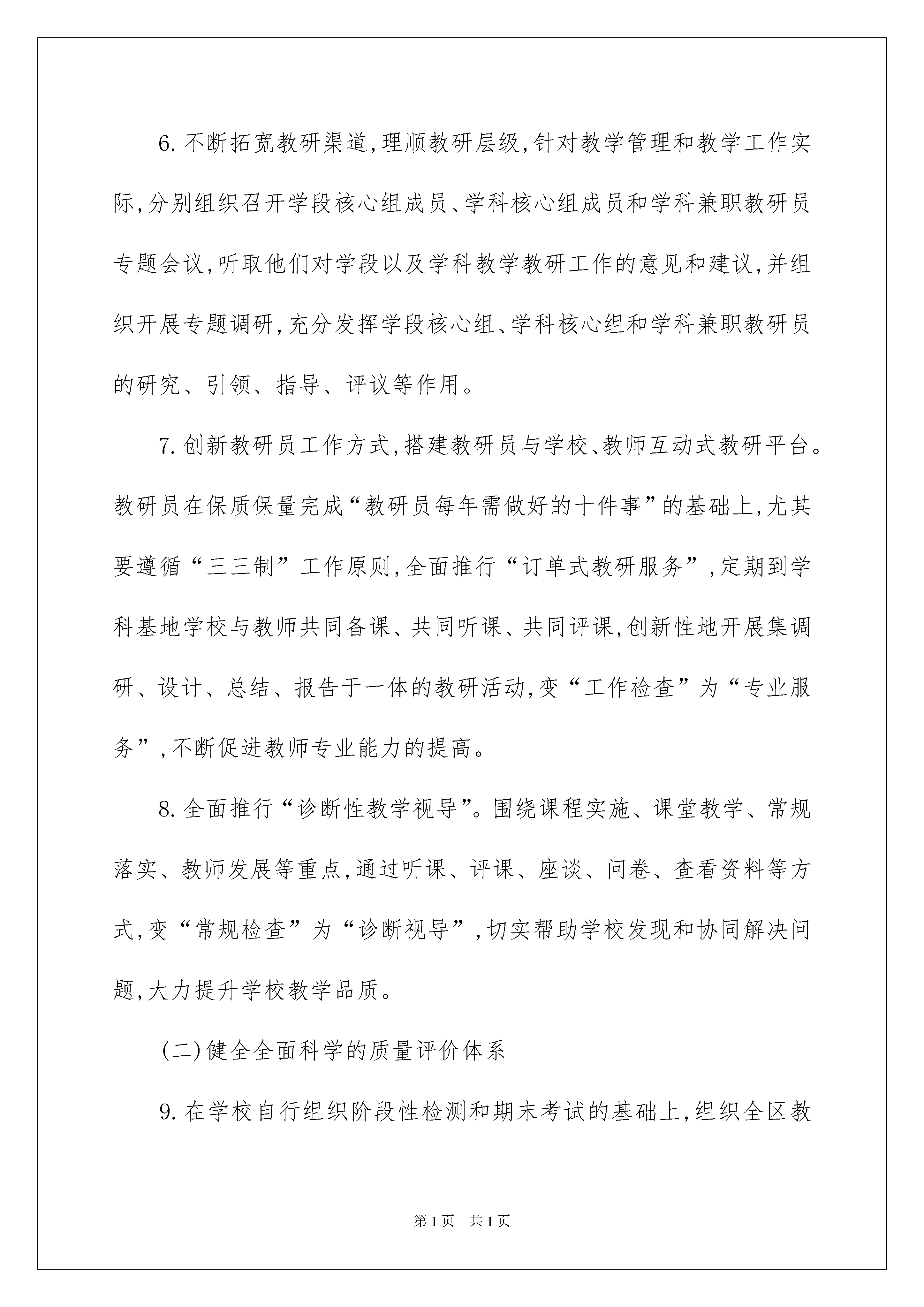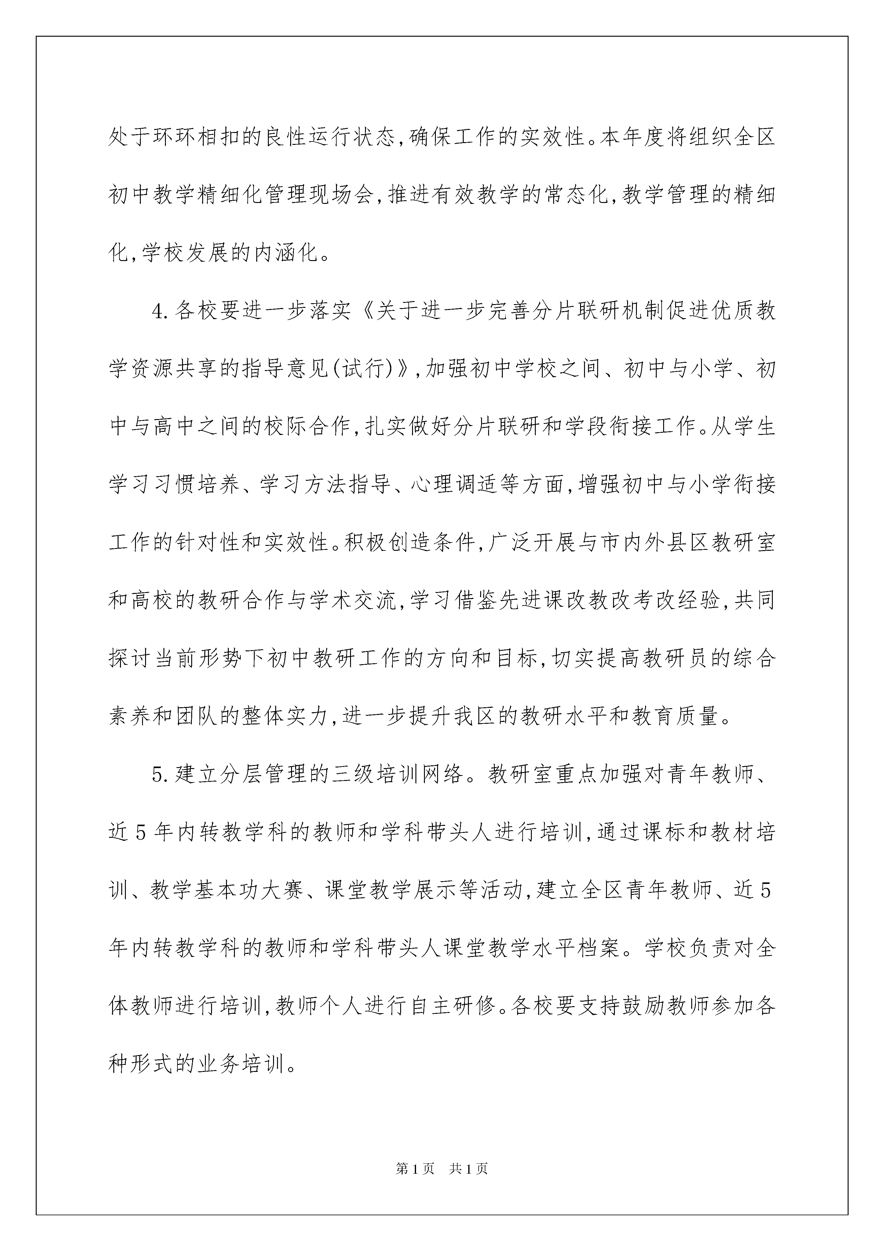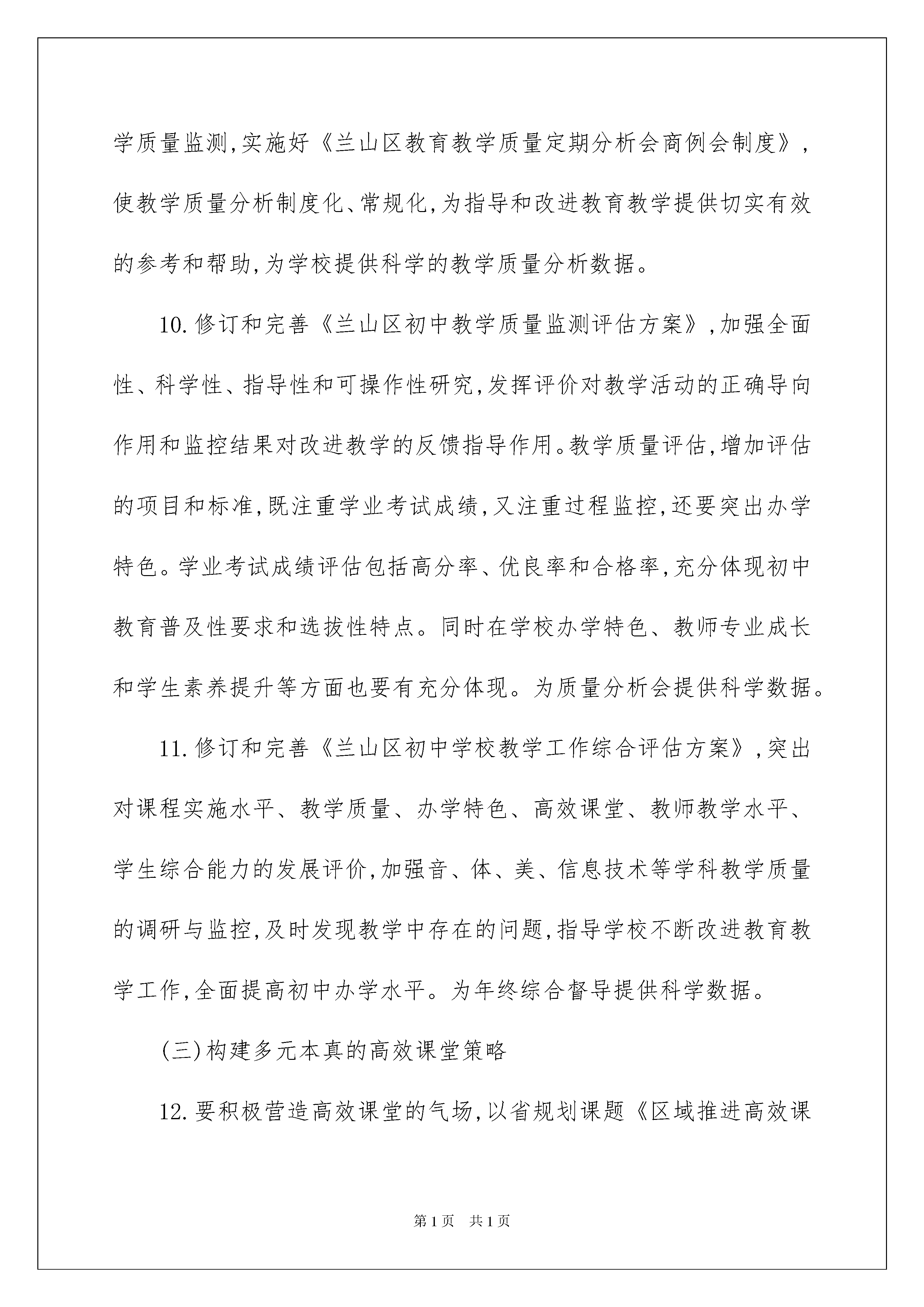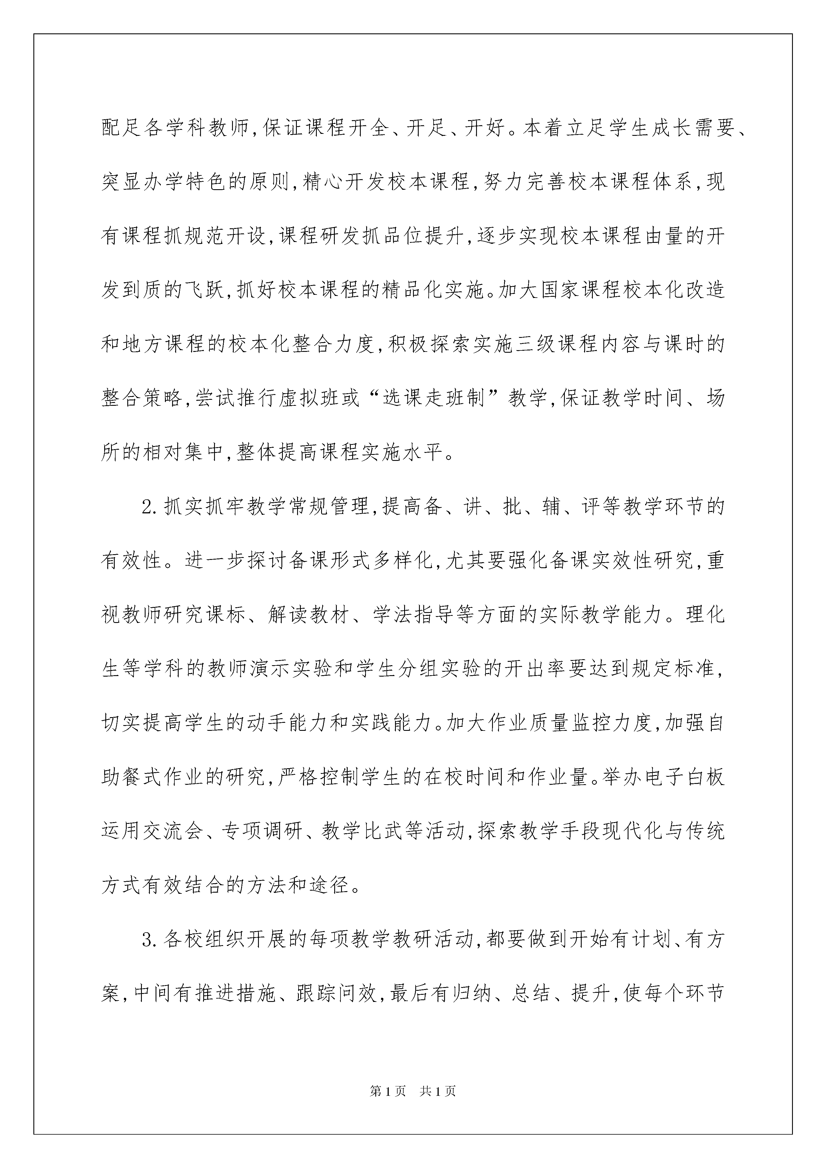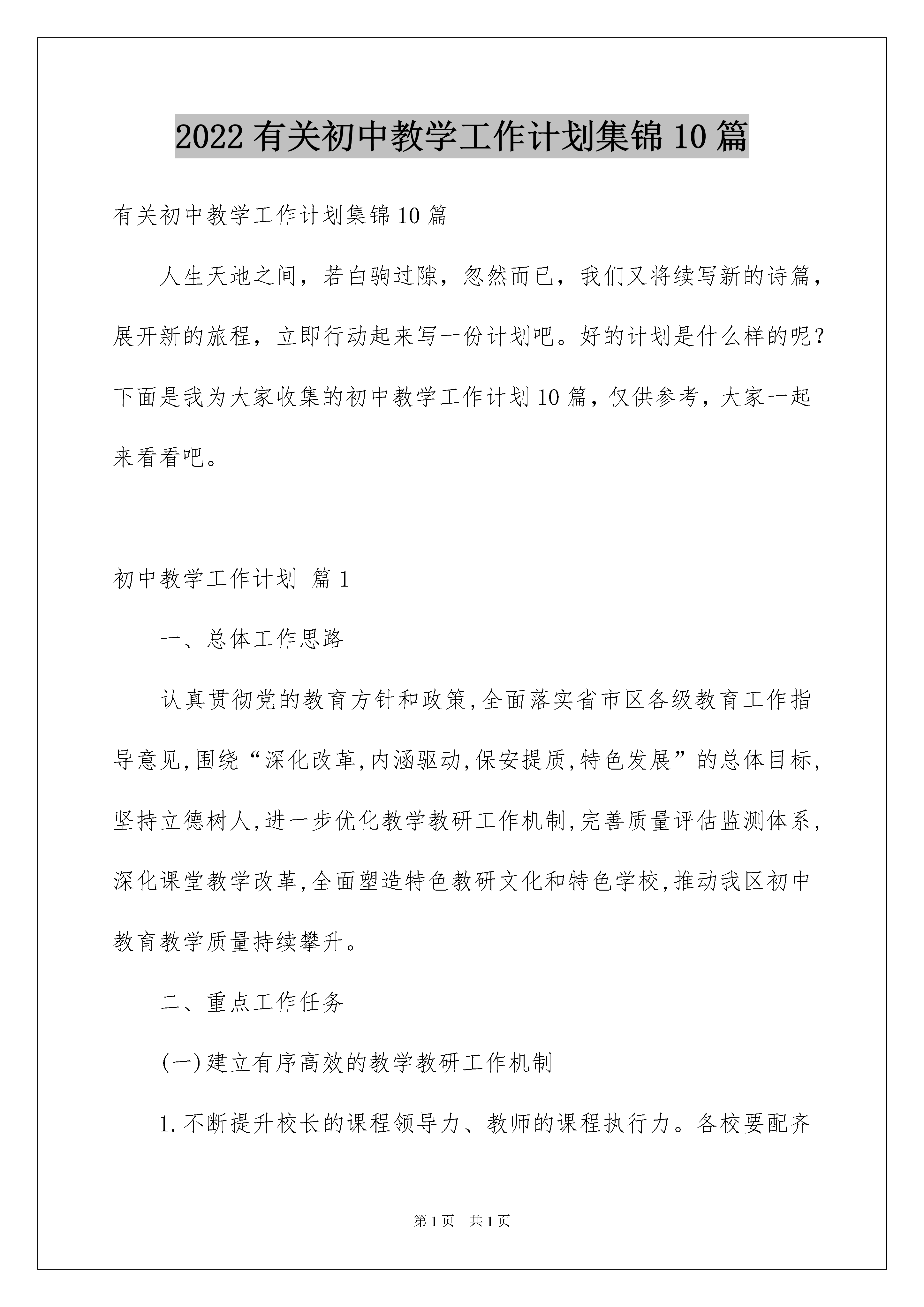 2022有关初中教学工作计划集锦10篇有关初中教学工作计划集锦10篇人生天地之间,若白驹过隙,忽然而已,我们又将续写新的诗篇,展开新的旅程,立即行动起来写一份计划吧。好的计划是什么样的呢?下面是我为大家收集的初中教学工作计划10篇,仅供参考,大家一起来看看吧。初中教学工作计划篇1一、总体工作思路认真贯彻党的教育方针和政策,全面落实省市区各级教育工作指导意见,围绕“深化改革,内涵驱动,保安提质,特色发展”的总体目标,坚持立德树人,进一步优化教学教研工作机制,完善质量评估监测体系,深化课堂教学改革,全面塑造特色教研文化和特色学校,推动我区初中教育教学质量持续攀升。二、重点工作任务(一)建立有序高效的教学教研工作机制1.不断提升校长的课程领导力、教师的课程执行力。各校要配齐配足各学科教师,保证课程开全、开足、开好。本着立足学生成长需要、突显办学特色的原则,精心开发校本课程,努力完善校本课程体系,现有课程抓规范开设,课程研发抓品位提升,逐步实现校本课程由量的开发到质的飞跃,抓好校本课程的精品化实施。加大国家课程校本化改造和地方课程的校本化整合力度,积极探索实施三级课程内容与课时的整合策略,尝试推行虚拟班或“选课走班制”教学,保证教学时间、场所的相对集中,整体提高课程实施水平。2.抓实抓牢教学常规管理,提高备、讲、批、辅、评等教学环节的有效性。进一步探讨备课形式多样化,尤其要强化备课实效性研究,重视教师研究课标、解读教材、学法指导等方面的实际教学能力。理化生等学科的教师演示实验和学生分组实验的开出率要达到规定标准,切实提高学生的动手能力和实践能力。加大作业质量监控力度,加强自助餐式作业的研究,严格控制学生的在校时间和作业量。举办电子白板运用交流会、专项调研、教学比武等活动,探索教学手段现代化与传统方式有效结合的方法和途径。3.各校组织开展的每项教学教研活动,都要做到开始有计划、有方案,中间有推进措施、跟踪问效,最后有归纳、总结、提升,使每个环节处于环环相扣的良性运行状态,确保工作的实效性。本年度将组织全区初中教学精细化管理现场会,推进有效教学的常态化,教学管理的精细化,学校发展的内涵化。4.各校要进一步落实《关于进一步完善分片联研机制促进优质教学资源共享的指导意见(试行)》,加强初中学校之间、初中与小学、初中与高中之间的校际合作,扎实做好分片联研和学段衔接工作。从学生学习习惯培养、学习方法指导、心理调适等方面,增强初中与小学衔接工作的针对性和实效性。积极创造条件,广泛开展与市内外县区教研室和高校的教研合作与学术交流,学习借鉴先进课改教改考改经验,共同探讨当前形势下初中教研工作的方向和目标,切实提高教研员的综合素养和团队的整体实力,进一步提升我区的教研水平和教育质量。5.建立分层管理的三级培训网络。教研室重点加强对青年教师、近5年内转教学科的教师和学科带头人进行培训,通过课标和教材培训、教学基本功大赛、课堂教学展示等活动,建立全区青年教师、近5年内转教学科的教师和学科带头人课堂教学水平档案。学校负责对全体教师进行培训,教师个人进行自主研修。各校要支持鼓励教师参加各种形式的业务培训。6.不断拓宽教研渠道,理顺教研层级,针对教学管理和教学工作实际,分别组织召开学段核心组成员、学科核心组成员和学科兼职教研员专题会议,听取他们对学段以及学科教学教研工作的意见和建议,并组织开展专题调研,充分发挥学段核心组、学科核心组和学科兼职教研员的研究、引领、指导、评议等作用。7.创新教研员工作方式,搭建教研员与学校、教师互动式教研平台。教研员在保质保量完成“教研员每年需做好的十件事”的基础上,尤其要遵循“三三制”工作原则,全面推行“订单式教研服务”,定期到学科基地学校与教师共同备课、共同听课、共同评课,创新性地开展集调研、设计、总结、报告于一体的教研活动,变“工作检查”为“专业服务”,不断促进教师专业能力的提高。8.全面推行“诊断性教学视导”。围绕课程实施、课堂教学、常规落实、教师发展等重点,通过听课、评课、座谈、问卷、查看资料等方式,变“常规检查”为“诊断视导”,切实帮助学校发现和协同解决问题,大力提升学校教学品质。(二)健全全面科学的质量评价体系9.在学校自行组织阶段性检测和期末考试的基础上,组织全区教学质量监测,实施好《兰山区教育教学质量定期分析会商例会制度》,使教学质量分析制度化、常规化,为指导和改进教育教学提供切实有效的参考和帮助,为学校提供科学的教学质量分析数据。10.修订和完善《兰山区初中教学质量监测评估方案》,加强全面性、科学性、指导性和可操作性研究,发挥评价对教学活动的正确导向作用和监控