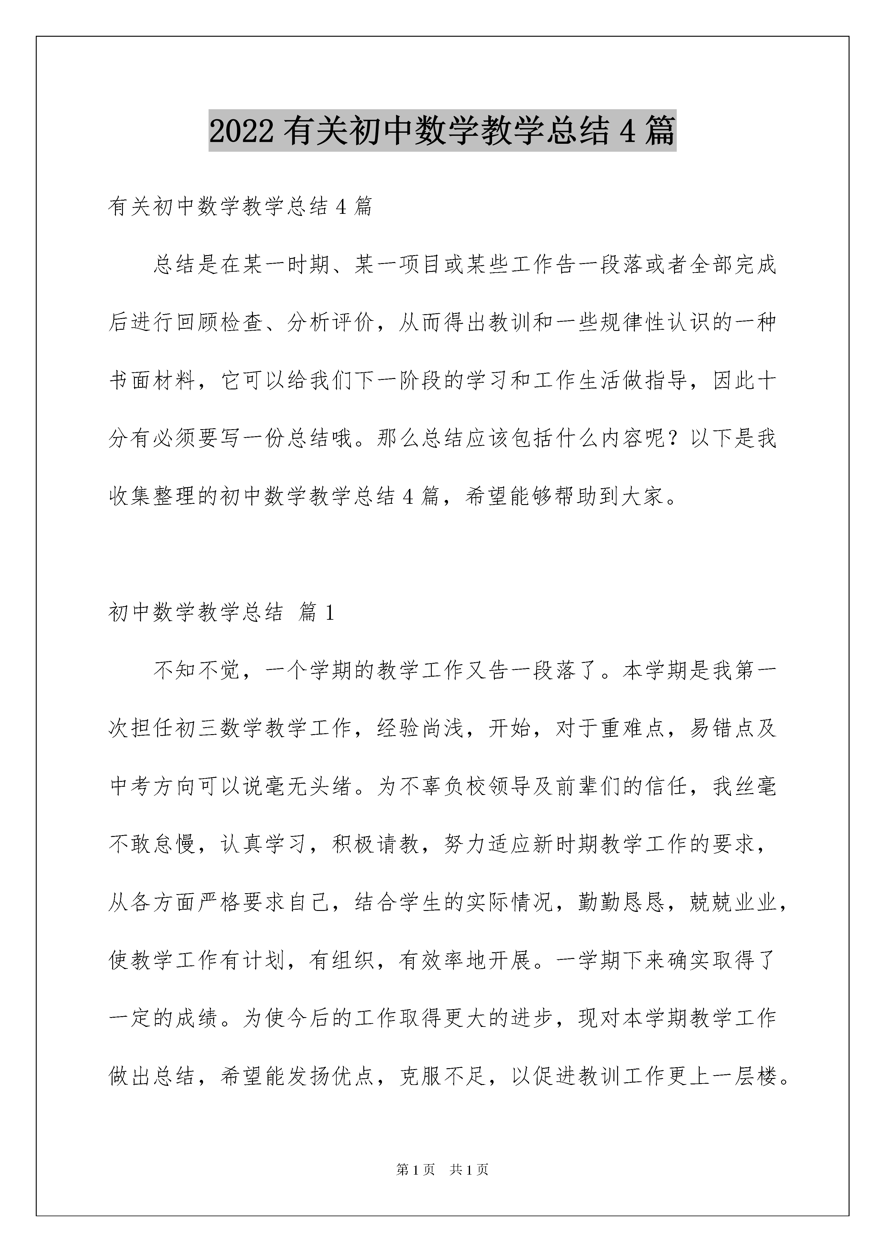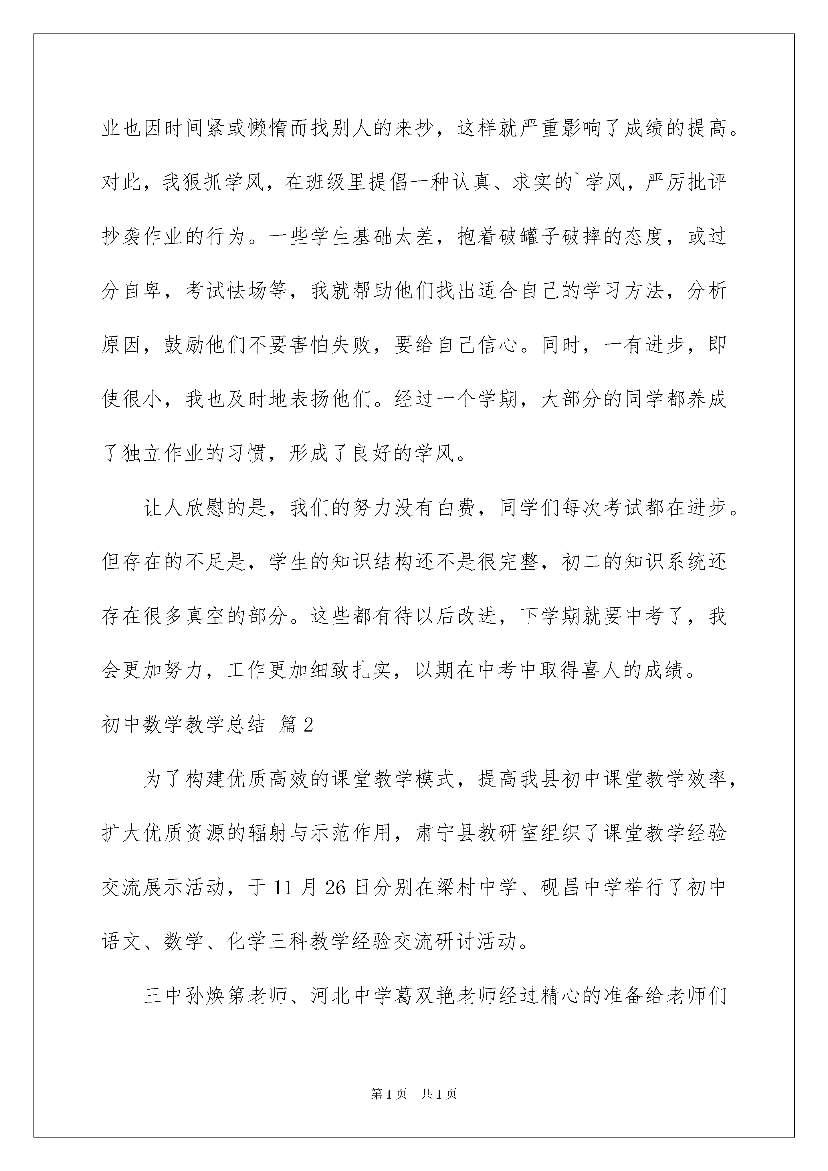 2022有关初中数学教学总结4篇有关初中数学教学总结4篇总结是在某一时期、某一项目或某些工作告一段落或者全部完成后进行回顾检查、分析评价,从而得出教训和一些规律性认识的一种书面材料,它可以给我们下一阶段的学习和工作生活做指导,因此十分有必须要写一份总结哦。那么总结应该包括什么内容呢?以下是我收集整理的初中数学教学总结4篇,希望能够帮助到大家。初中数学教学总结篇1不知不觉,一个学期的教学工作又告一段落了。本学期是我第一次担任初三数学教学工作,经验尚浅,开始,对于重难点,易错点及中考方向可以说毫无头绪。为不辜负校领导及前辈们的信任,我丝毫不敢怠慢,认真学习,积极请教,努力适应新时期教学工作的要求,从各方面严格要求自己,结合学生的实际情况,勤勤恳恳,兢兢业业,使教学工作有计划,有组织,有效率地开展。一学期下来确实取得了一定的成绩。为使今后的工作取得更大的进步,现对本学期教学工作做出总结,希望能发扬优点,克服不足,以促进教训工作更上一层楼。一、认真备课,不但备学生而且备教材备教法,根据教材内容及学生的实际,设计课的类型,选择教学方法,认真写好教案。每一课都做到“有备而来”,每堂课都在课前做好充分的准备,课后及时对该课作出总结,写好教学后记,并认真按搜集每课书的知识要点,归纳成集。二、增强上课技能,提高教学质量,做到线索清晰,层次分明,言简意赅,深入浅出。在课堂上特别注意调动学生的积极性,加强师生交流,充分体现学生的主作用,让学生学得容易,学得轻松,学得愉快;注意精讲精练,在课堂上老师讲得尽量少,学生动口动手动脑尽量多;同时在每一堂课上都充分考虑每一个层次的学生学习需求和学习能力,让各个层次的学生都得到提高。现在很多学生反映喜欢上数学课了。三、虚心请教其他老师。在教学上,有疑必问。在各个章节的学习上都积极征求其他老师的意见,学习他们的方法,同时,多听老师的课,做到边听边讲,学习别人的优点,克服自己的不足,征求他们的意见,改进工作。四、认真批改作业:布置作业做到精选精练。有针对性,有层次性。为了做到这点,我常常到各大书店去搜集资料,对各种辅助资料进行筛选,力求每一次练习都得一定的效果。同时对学生的作业批改及时、认真,分析并记录学生的作业情况,将他们在作业过程出现的问题做出分类总结,进行透切的评讲,并针对有关情况及时改进教学方法,做到有的放矢。五、做好课后辅导工作,注意分层教学。在课后,为不同层次的学生进行相应的辅导,以满足不同层次的学生的需求,避免了一刀切的弊端,同时加大了后进生的辅导力度。对后进生的辅导,并不限于学习知识性的辅导,要通过各种途径激发他们的求知欲和上进心,让他们意识到学习是充满乐趣的。在此基础上,再教给他们学习的方法,提高他们的技能。并认真细致地做好查漏补缺工作。后进生通常存在很多知识断层,这些都是后进生转化过程中的绊脚石,在做好后进生的转化工作时,要特别注意给他们补课,把他们以前学习的知识断层补充完整,这样他们就会学得轻松,进步也快,兴趣和求知欲也会随之增加。六、狠抓学风。我所教的班,大部分同学对该课很感兴趣,但有为数不少的学生,因为怕被责备,学习上存在的问题不敢问老师,作业也因时间紧或懒惰而找别人的来抄,这样就严重影响了成绩的提高。对此,我狠抓学风,在班级里提倡一种认真、求实的`学风,严厉批评抄袭作业的行为。一些学生基础太差,抱着破罐子破摔的态度,或过分自卑,考试怯场等,我就帮助他们找出适合自己的学习方法,分析原因,鼓励他们不要害怕失败,要给自己信心。同时,一有进步,即使很小,我也及时地表扬他们。经过一个学期,大部分的同学都养成了独立作业的习惯,形成了良好的学风。让人欣慰的是,我们的努力没有白费,同学们每次考试都在进步。但存在的不足是,学生的知识结构还不是很完整,初二的知识系统还存在很多真空的部分。这些都有待以后改进,下学期就要中考了,我会更加努力,工作更加细致扎实,以期在中考中取得喜人的成绩。初中数学教学总结篇2为了构建优质高效的课堂教学模式,提高我县初中课堂教学效率,扩大优质资源的辐射与示范作用,肃宁县教研室组织了课堂教学经验交流展示活动,于11月26日分别在梁村中学、砚昌中学举行了初中语文、数学、化学三科教学经验交流研讨活动。三中孙焕第老师、河北中学葛双艳老师经过精心的准备给老师们带来了两节学案课,通过课堂观摩、交流研讨使老师们对比较陌生的学案课有了真实的认识——(1)、增大课堂容量,提高课堂效率;(2)弥补没有多媒体教学设备的缺憾,教学环节紧凑;(3)充分体现学生的主体作用以及教师的引导作用。观摩课后,进行了交流研讨活动,首先由两位上课教师进行说课,然后各