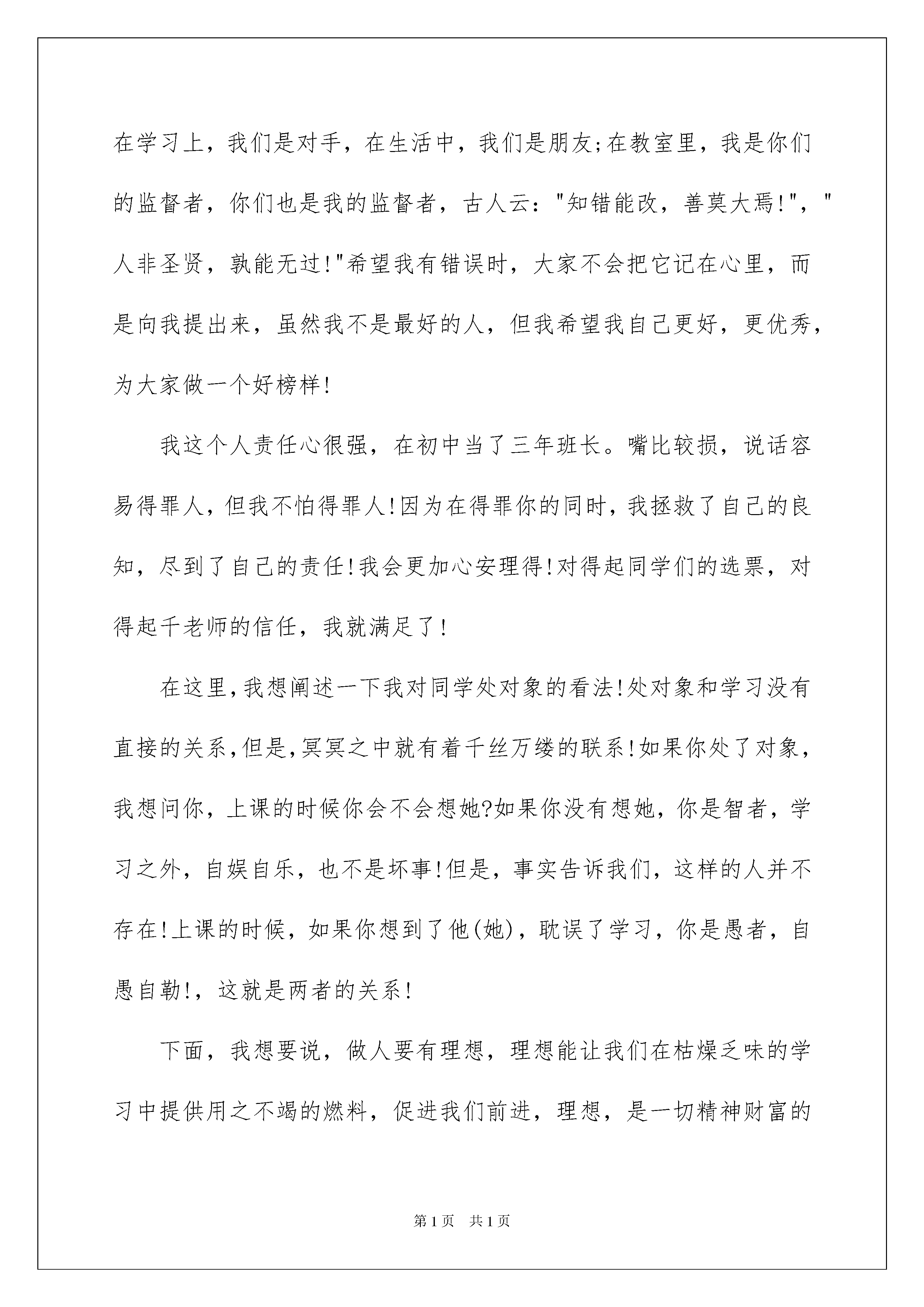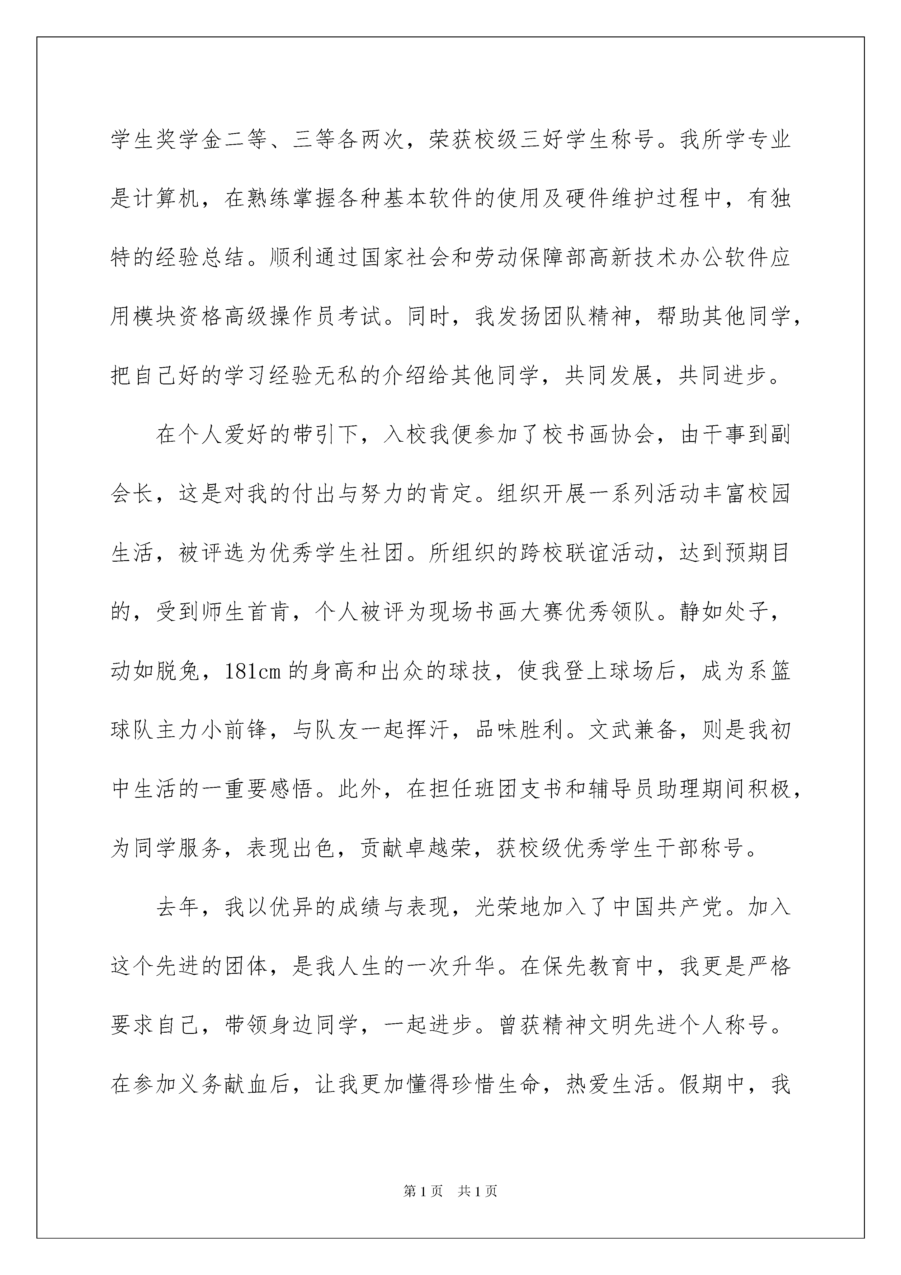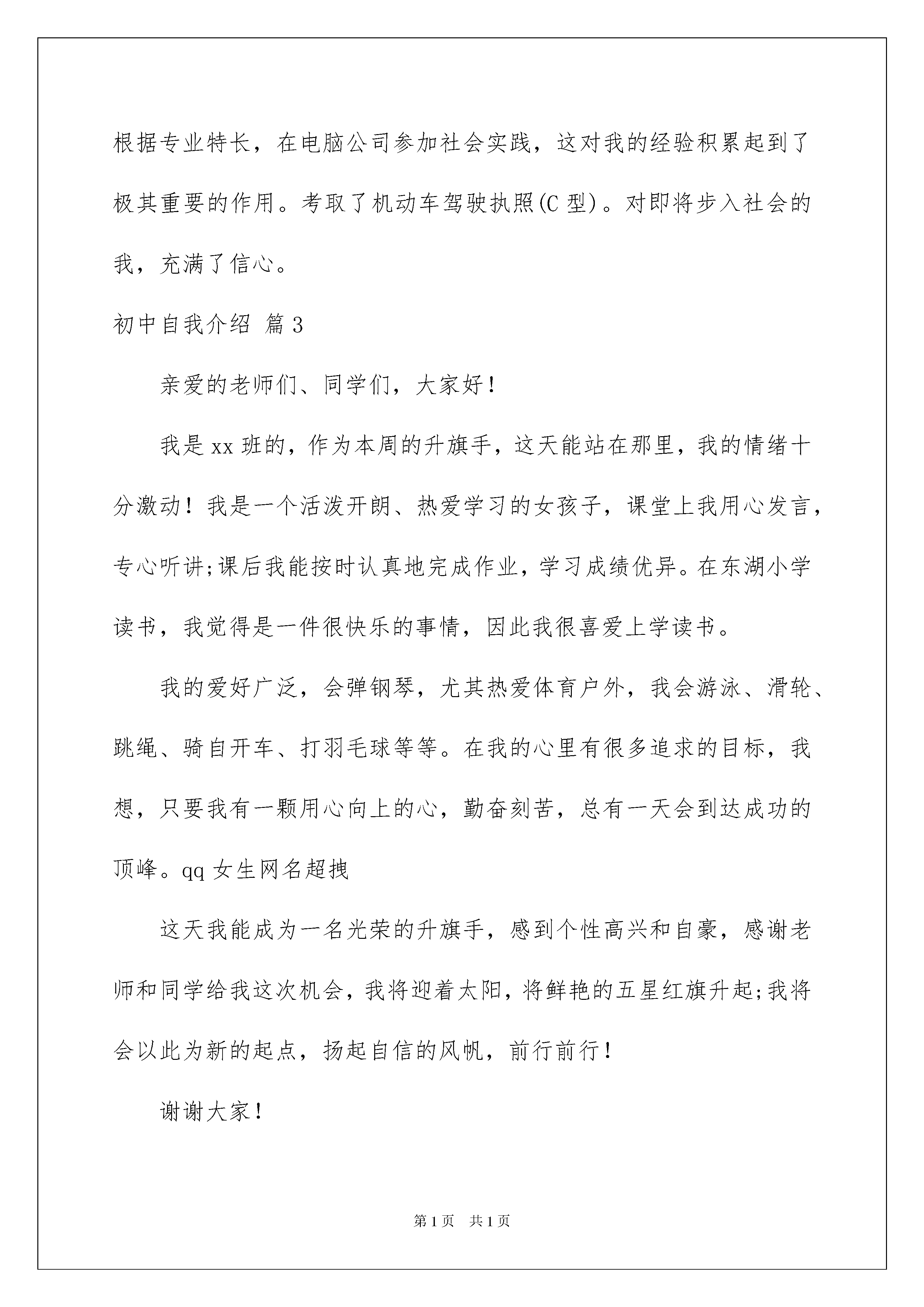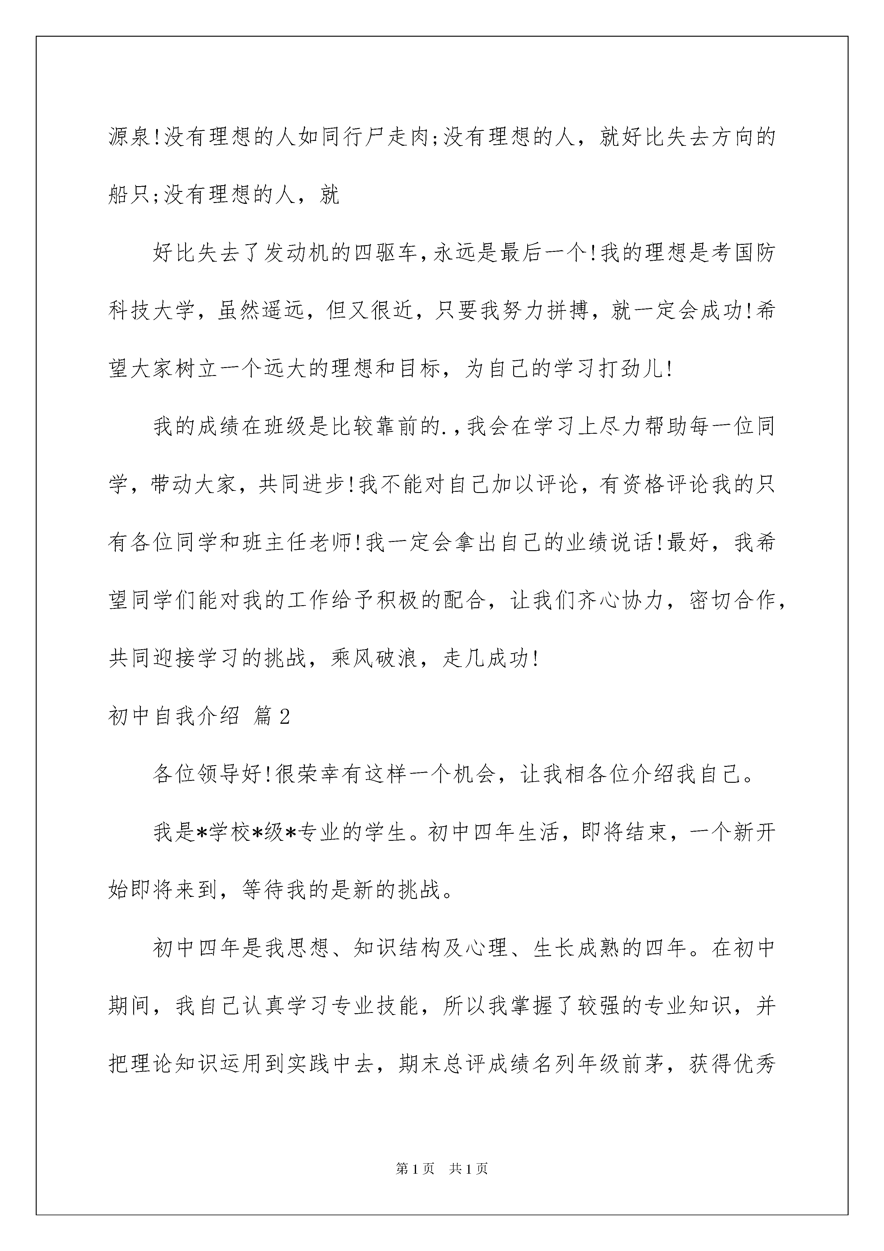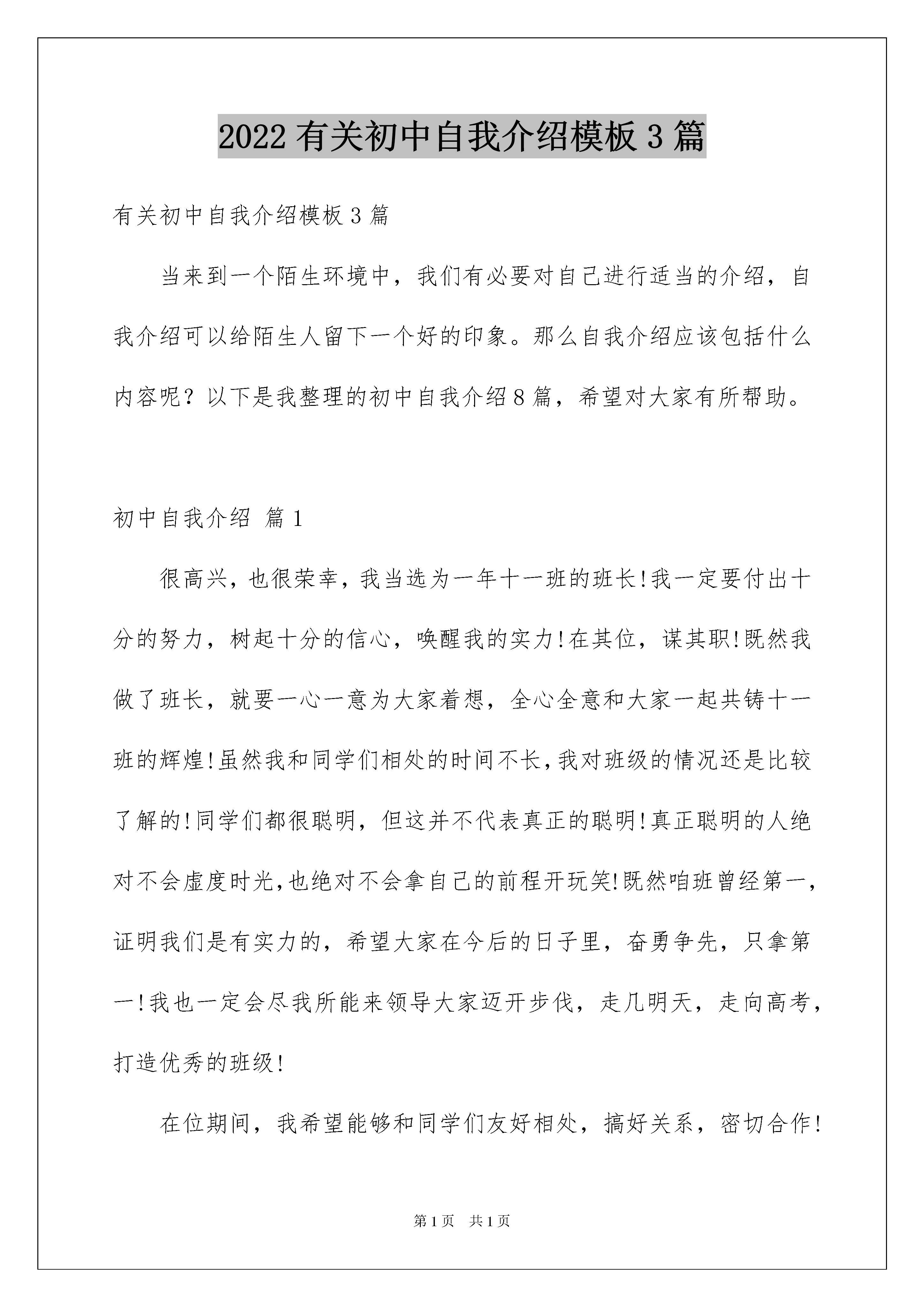 2022有关初中自我介绍模板3篇有关初中自我介绍模板3篇当来到一个陌生环境中,我们有必要对自己进行适当的介绍,自我介绍可以给陌生人留下一个好的印象。那么自我介绍应该包括什么内容呢?以下是我整理的初中自我介绍8篇,希望对大家有所帮助。初中自我介绍篇1很高兴,也很荣幸,我当选为一年十一班的班长!我一定要付出十分的努力,树起十分的信心,唤醒我的实力!在其位,谋其职!既然我做了班长,就要一心一意为大家着想,全心全意和大家一起共铸十一班的辉煌!虽然我和同学们相处的时间不长,我对班级的情况还是比较了解的!同学们都很聪明,但这并不代表真正的聪明!真正聪明的人绝对不会虚度时光,也绝对不会拿自己的前程开玩笑!既然咱班曾经第一,证明我们是有实力的,希望大家在今后的日子里,奋勇争先,只拿第一!我也一定会尽我所能来领导大家迈开步伐,走几明天,走向高考,打造优秀的班级!在位期间,我希望能够和同学们友好相处,搞好关系,密切合作!在学习上,我们是对手,在生活中,我们是朋友;在教室里,我是你们的监督者,你们也是我的监督者,古人云:"知错能改,善莫大焉!","人非圣贤,孰能无过!"希望我有错误时,大家不会把它记在心里,而是向我提出来,虽然我不是最好的人,但我希望我自己更好,更优秀,为大家做一个好榜样!我这个人责任心很强,在初中当了三年班长。嘴比较损,说话容易得罪人,但我不怕得罪人!因为在得罪你的同时,我拯救了自己的良知,尽到了自己的责任!我会更加心安理得!对得起同学们的选票,对得起千老师的信任,我就满足了!在这里,我想阐述一下我对同学处对象的看法!处对象和学习没有直接的关系,但是,冥冥之中就有着千丝万缕的联系!如果你处了对象,我想问你,上课的时候你会不会想她?如果你没有想她,你是智者,学习之外,自娱自乐,也不是坏事!但是,事实告诉我们,这样的人并不存在!上课的时候,如果你想到了他(她),耽误了学习,你是愚者,自愚自勒!,这就是两者的关系!下面,我想要说,做人要有理想,理想能让我们在枯燥乏味的学习中提供用之不竭的燃料,促进我们前进,理想,是一切精神财富的源泉!没有理想的人如同行尸走肉;没有理想的人,就好比失去方向的船只;没有理想的人,就好比失去了发动机的四驱车,永远是最后一个!我的理想是考国防科技大学,虽然遥远,但又很近,只要我努力拼搏,就一定会成功!希望大家树立一个远大的理想和目标,为自己的学习打劲儿!我的成绩在班级是比较靠前的.,我会在学习上尽力帮助每一位同学,带动大家,共同进步!我不能对自己加以评论,有资格评论我的只有各位同学和班主任老师!我一定会拿出自己的业绩说话!最好,我希望同学们能对我的工作给予积极的配合,让我们齐心协力,密切合作,共同迎接学习的挑战,乘风破浪,走几成功!初中自我介绍篇2各位领导好!很荣幸有这样一个机会,让我相各位介绍我自己。我是*学校*级*专业的学生。初中四年生活,即将结束,一个新开始即将来到,等待我的是新的挑战。初中四年是我思想、知识结构及心理、生长成熟的四年。在初中期间,我自己认真学习专业技能,所以我掌握了较强的专业知识,并把理论知识运用到实践中去,期末总评成绩名列年级前茅,获得优秀学生奖学金二等、三等各两次,荣获校级三好学生称号。我所学专业是计算机,在熟练掌握各种基本软件的使用及硬件维护过程中,有独特的经验总结。顺利通过国家社会和劳动保障部高新技术办公软件应用模块资格高级操作员考试。同时,我发扬团队精神,帮助其他同学,把自己好的学习经验无私的介绍给其他同学,共同发展,共同进步。在个人爱好的带引下,入校我便参加了校书画协会,由干事到副会长,这是对我的付出与努力的肯定。组织开展一系列活动丰富校园生活,被评选为优秀学生社团。所组织的跨校联谊活动,达到预期目的,受到师生首肯,个人被评为现场书画大赛优秀领队。静如处子,动如脱兔,181cm的身高和出众的球技,使我登上球场后,成为系篮球队主力小前锋,与队友一起挥汗,品味胜利。文武兼备,则是我初中生活的一重要感悟。此外,在担任班团支书和辅导员助理期间积极,为同学服务,表现出色,贡献卓越荣,获校级优秀学生干部称号。去年,我以优异的成绩与表现,光荣地加入了中国共产党。加入这个先进的团体,是我人生的一次升华。在保先教育中,我更是严格要求自己,带领身边同学,一起进步。曾获精神文明先进个人称号。在参加义务献血后,让我更加懂得珍惜生命,热爱生活。假期中,我根据专业特长,在电脑公司参加社会实践,这对我的经验积累起到了极其重要的作用。考取了机动车驾驶执照(C型)。对即将步入社会的我,充满了信心。初中自我介绍篇3亲爱的老师们、同学们,大家好!我是xx班的