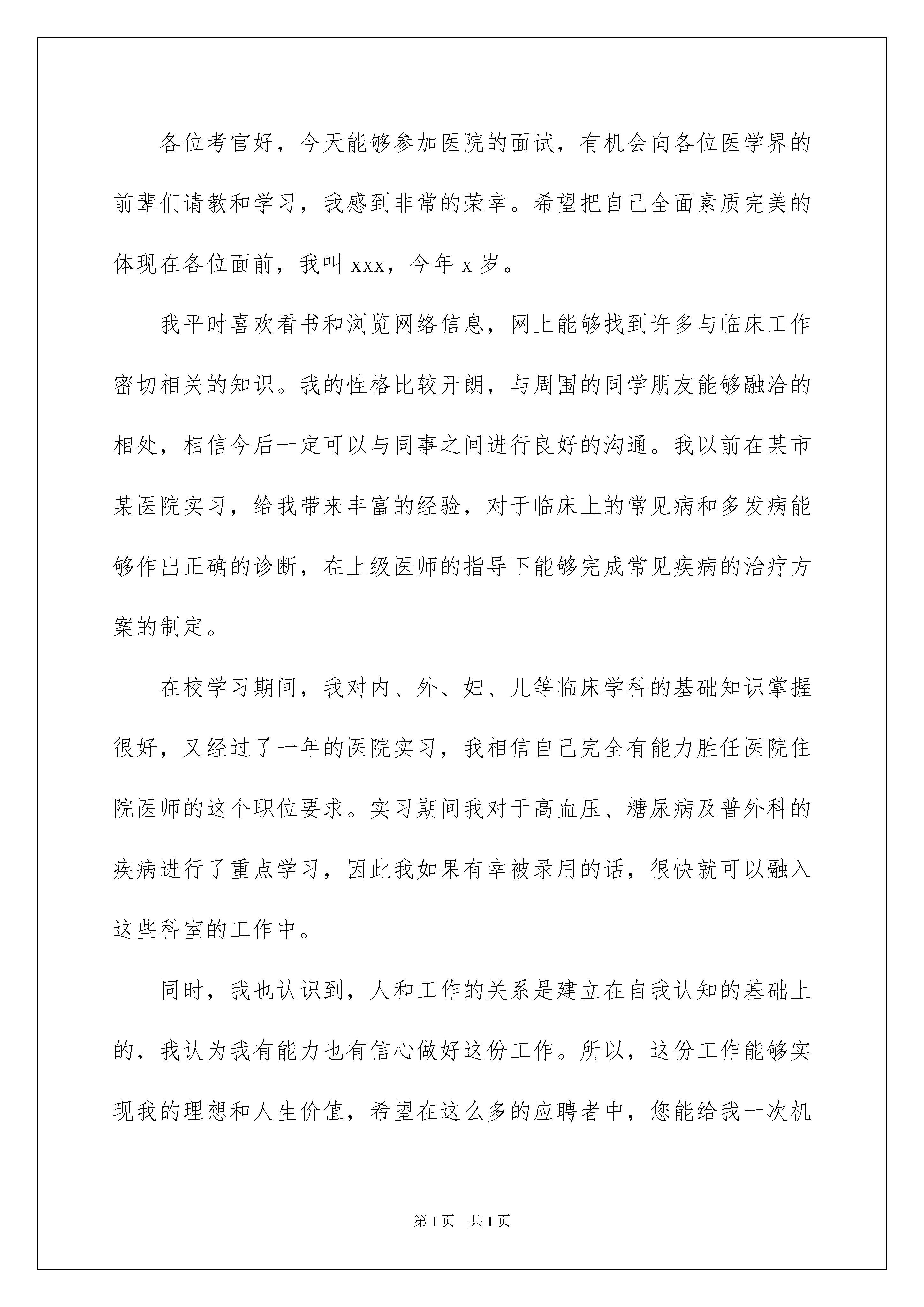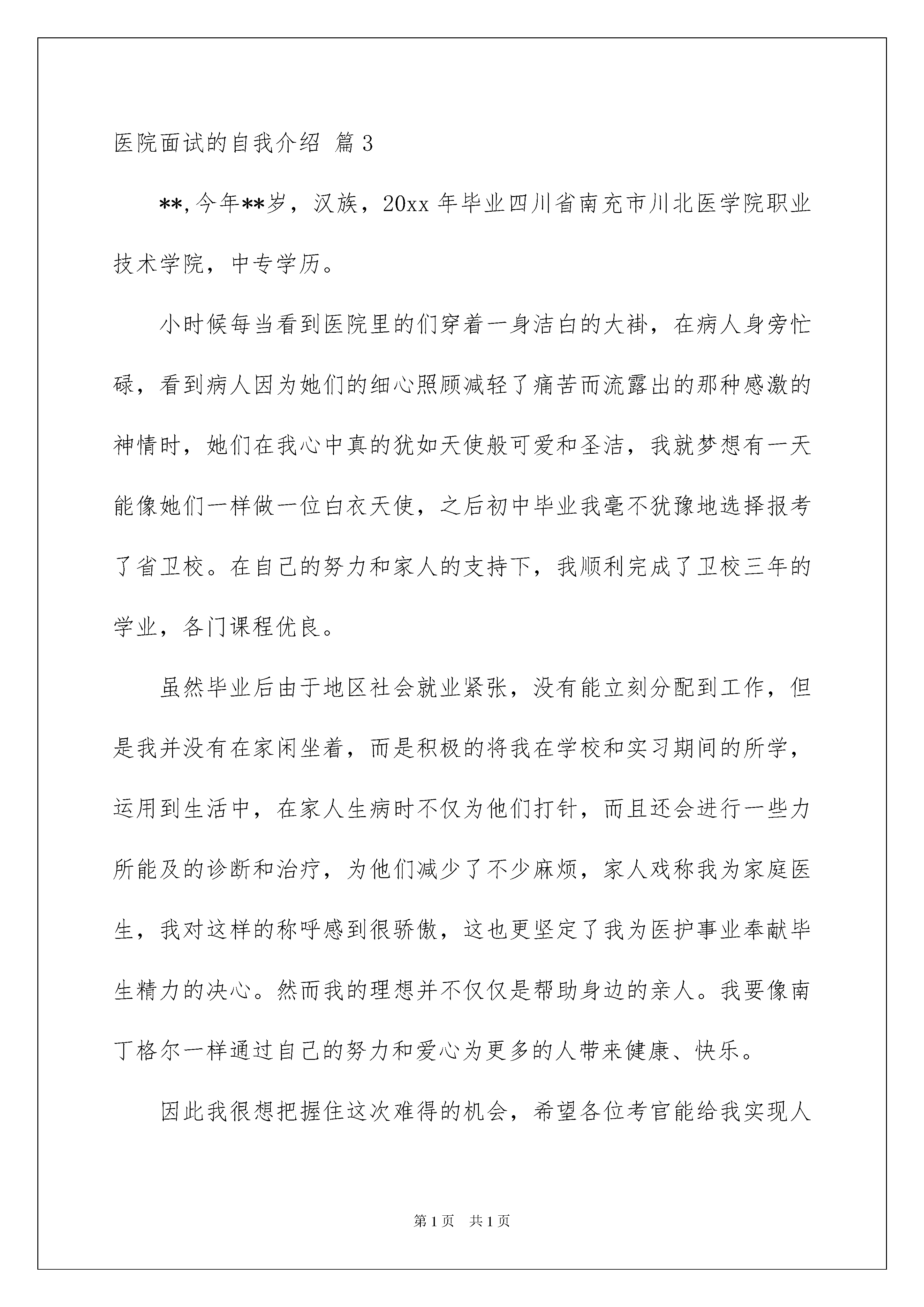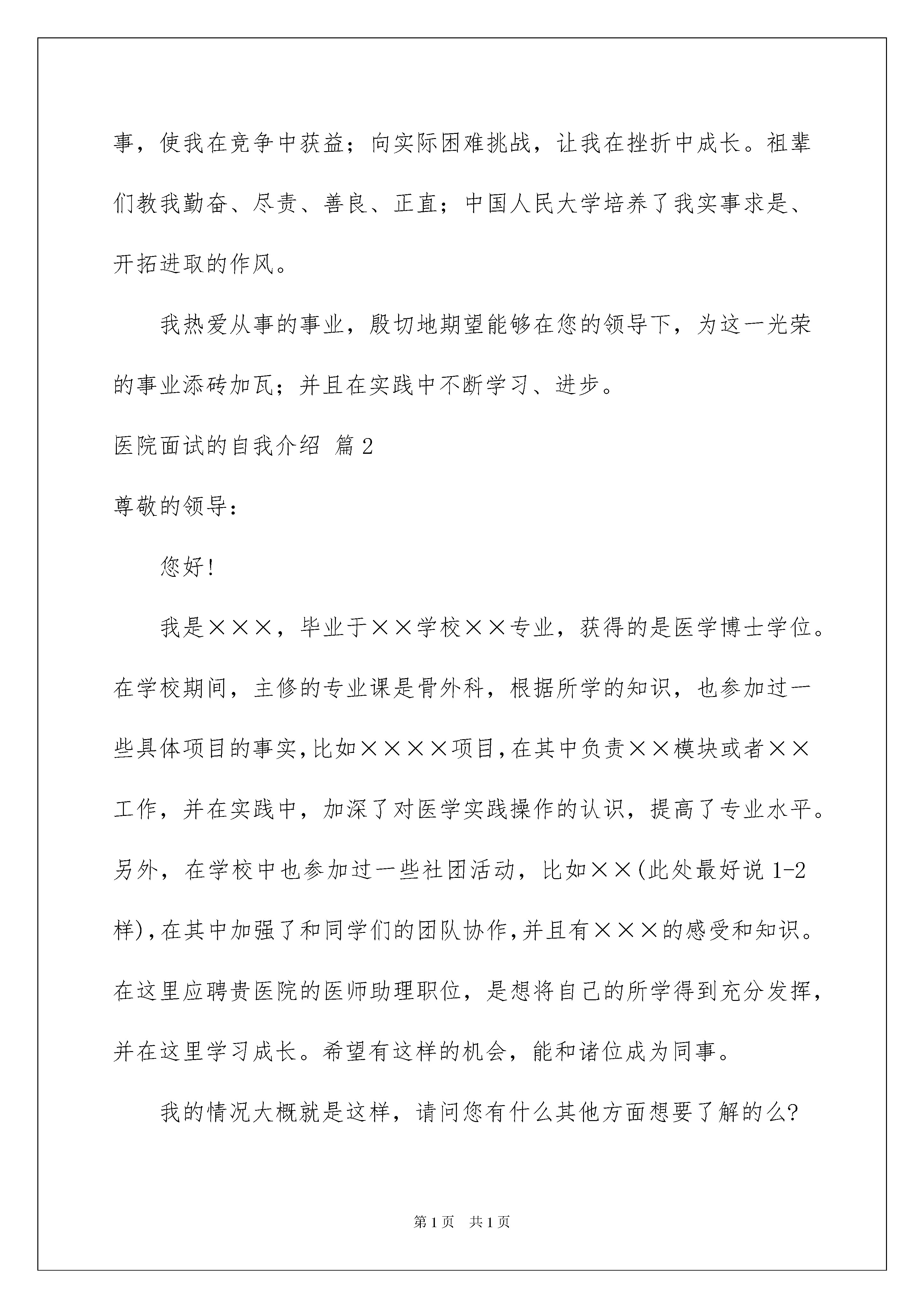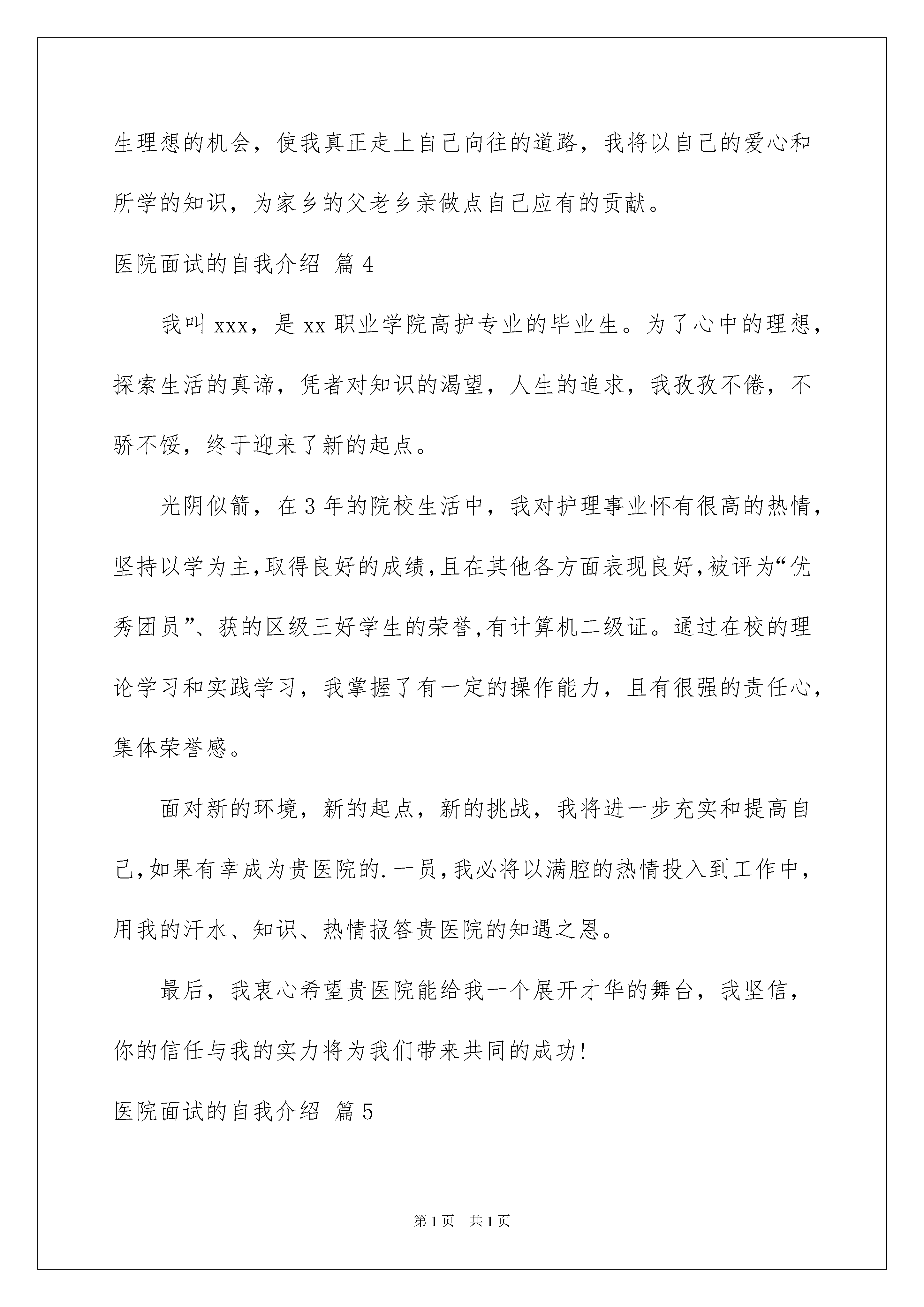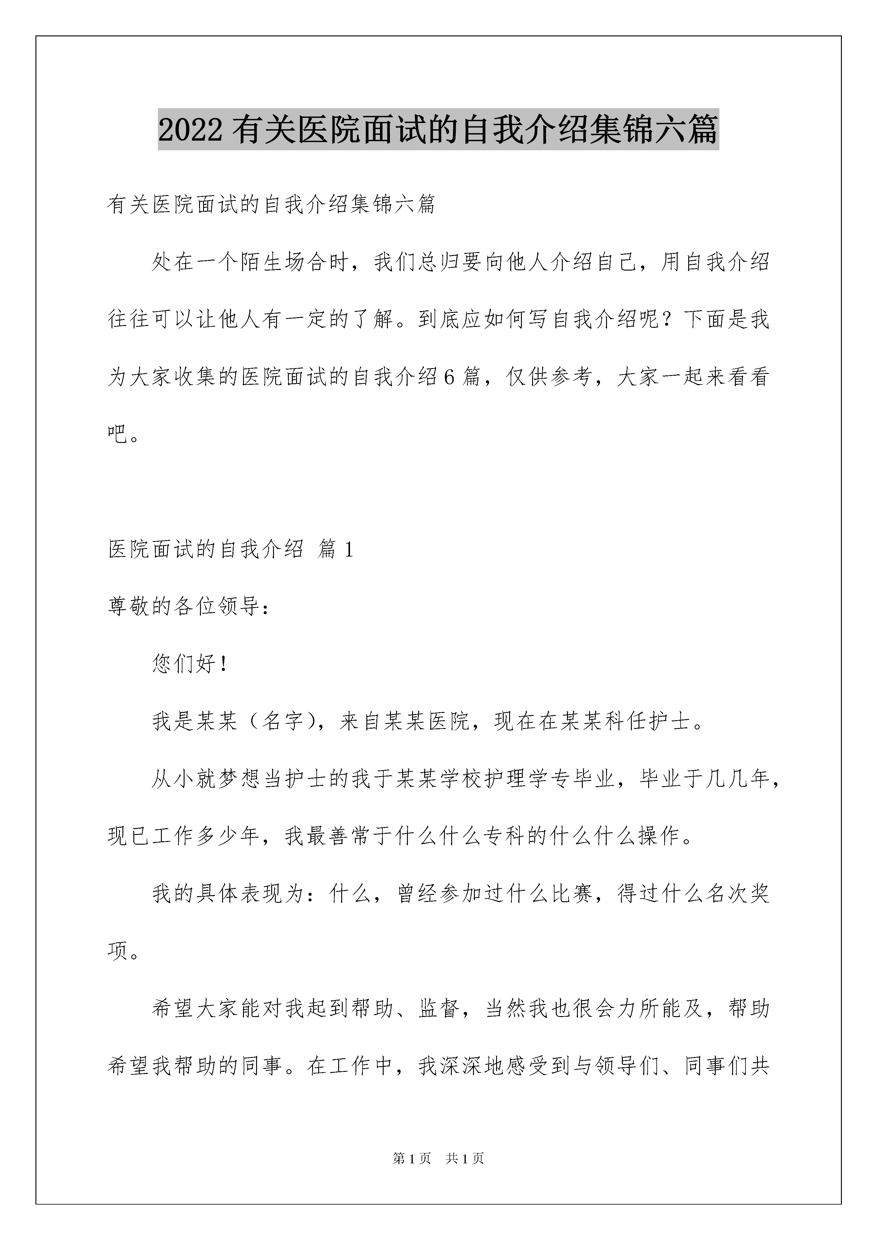 2022有关医院面试的自我介绍集锦六篇有关医院面试的自我介绍集锦六篇处在一个陌生场合时,我们总归要向他人介绍自己,用自我介绍往往可以让他人有一定的了解。到底应如何写自我介绍呢?下面是我为大家收集的医院面试的自我介绍6篇,仅供参考,大家一起来看看吧。医院面试的自我介绍篇1尊敬的各位领导:您们好!我是某某(名字),来自某某医院,现在在某某科任护士。从小就梦想当护士的我于某某学校护理学专毕业,毕业于几几年,现已工作多少年,我最善常于什么什么专科的什么什么操作。我的具体表现为:什么,曾经参加过什么比赛,得过什么名次奖项。希望大家能对我起到帮助、监督,当然我也很会力所能及,帮助希望我帮助的同事。在工作中,我深深地感受到与领导们、同事们共事,使我在竞争中获益;向实际困难挑战,让我在挫折中成长。祖辈们教我勤奋、尽责、善良、正直;中国人民大学培养了我实事求是、开拓进取的作风。我热爱从事的事业,殷切地期望能够在您的领导下,为这一光荣的事业添砖加瓦;并且在实践中不断学习、进步。医院面试的自我介绍篇2尊敬的领导:您好!我是×××,毕业于××学校××专业,获得的是医学博士学位。在学校期间,主修的专业课是骨外科,根据所学的知识,也参加过一些具体项目的事实,比如××××项目,在其中负责××模块或者××工作,并在实践中,加深了对医学实践操作的认识,提高了专业水平。另外,在学校中也参加过一些社团活动,比如××(此处最好说1-2样),在其中加强了和同学们的团队协作,并且有×××的感受和知识。在这里应聘贵医院的医师助理职位,是想将自己的所学得到充分发挥,并在这里学习成长。希望有这样的机会,能和诸位成为同事。我的情况大概就是这样,请问您有什么其他方面想要了解的么?医院面试的自我介绍篇3**,今年**岁,汉族,20xx年毕业四川省南充市川北医学院职业技术学院,中专学历。小时候每当看到医院里的们穿着一身洁白的大褂,在病人身旁忙碌,看到病人因为她们的细心照顾减轻了痛苦而流露出的那种感激的神情时,她们在我心中真的犹如天使般可爱和圣洁,我就梦想有一天能像她们一样做一位白衣天使,之后初中毕业我毫不犹豫地选择报考了省卫校。在自己的努力和家人的支持下,我顺利完成了卫校三年的学业,各门课程优良。虽然毕业后由于地区社会就业紧张,没有能立刻分配到工作,但是我并没有在家闲坐着,而是积极的将我在学校和实习期间的所学,运用到生活中,在家人生病时不仅为他们打针,而且还会进行一些力所能及的诊断和治疗,为他们减少了不少麻烦,家人戏称我为家庭医生,我对这样的称呼感到很骄傲,这也更坚定了我为医护事业奉献毕生精力的决心。然而我的理想并不仅仅是帮助身边的亲人。我要像南丁格尔一样通过自己的努力和爱心为更多的人带来健康、快乐。因此我很想把握住这次难得的机会,希望各位考官能给我实现人生理想的机会,使我真正走上自己向往的道路,我将以自己的爱心和所学的知识,为家乡的父老乡亲做点自己应有的贡献。医院面试的自我介绍篇4我叫xxx,是xx职业学院高护专业的毕业生。为了心中的理想,探索生活的真谛,凭者对知识的渴望,人生的追求,我孜孜不倦,不骄不馁,终于迎来了新的起点。光阴似箭,在3年的院校生活中,我对护理事业怀有很高的热情,坚持以学为主,取得良好的成绩,且在其他各方面表现良好,被评为“优秀团员”、获的区级三好学生的荣誉,有计算机二级证。通过在校的理论学习和实践学习,我掌握了有一定的操作能力,且有很强的责任心,集体荣誉感。面对新的环境,新的起点,新的挑战,我将进一步充实和提高自己,如果有幸成为贵医院的.一员,我必将以满腔的热情投入到工作中,用我的汗水、知识、热情报答贵医院的知遇之恩。最后,我衷心希望贵医院能给我一个展开才华的舞台,我坚信,你的信任与我的实力将为我们带来共同的成功!医院面试的自我介绍篇5各位考官好,今天能够参加医院的面试,有机会向各位医学界的前辈们请教和学习,我感到非常的荣幸。希望把自己全面素质完美的体现在各位面前,我叫xxx,今年x岁。我平时喜欢看书和浏览网络信息,网上能够找到许多与临床工作密切相关的知识。我的性格比较开朗,与周围的同学朋友能够融洽的相处,相信今后一定可以与同事之间进行良好的沟通。我以前在某市某医院实习,给我带来丰富的经验,对于临床上的常见病和多发病能够作出正确的诊断,在上级医师的指导下能够完成常见疾病的治疗方案的制定。在校学习期间,我对内、外、妇、儿等临床学科的基础知识掌握很好,又经过了一年的医院实习,我相信自己完全有能力胜任医院住院医师的这个职位要求。实习期间我对于高血压、糖尿病及普外科的疾病进行了重点学习,因此我如果有幸被录用的话,