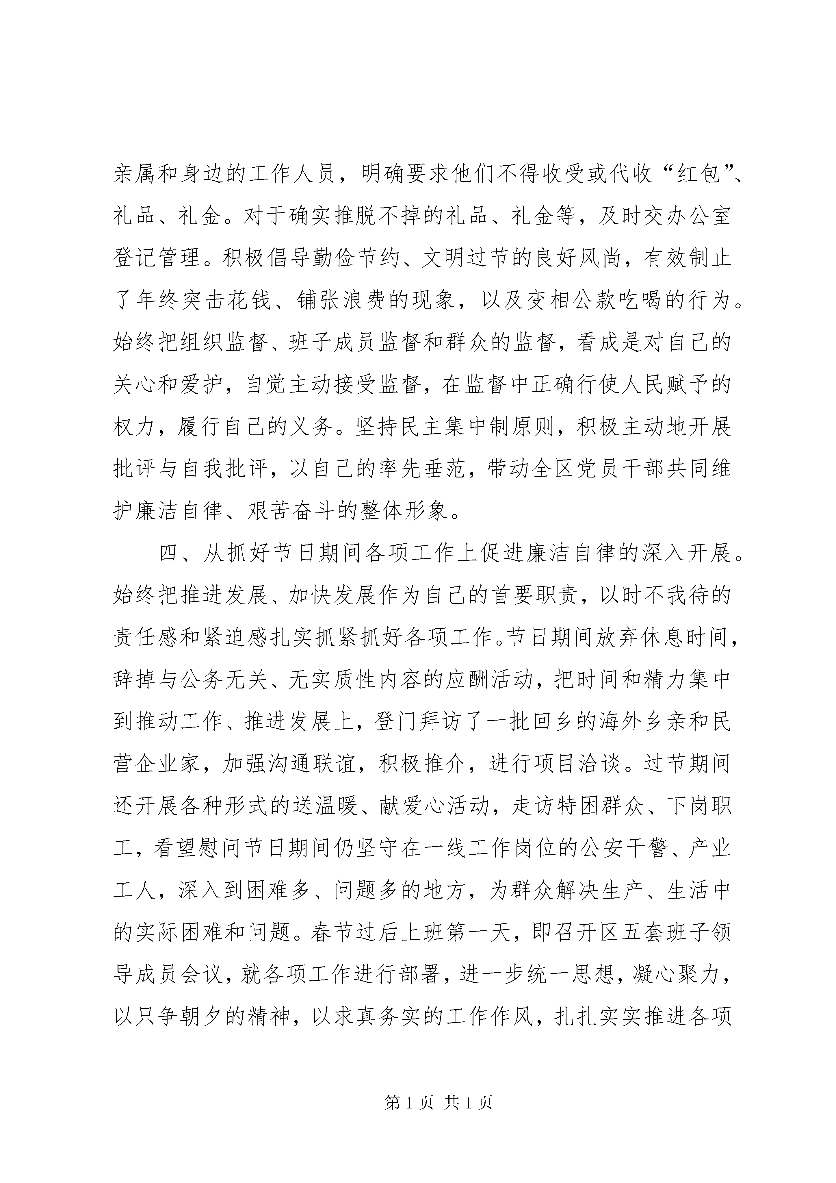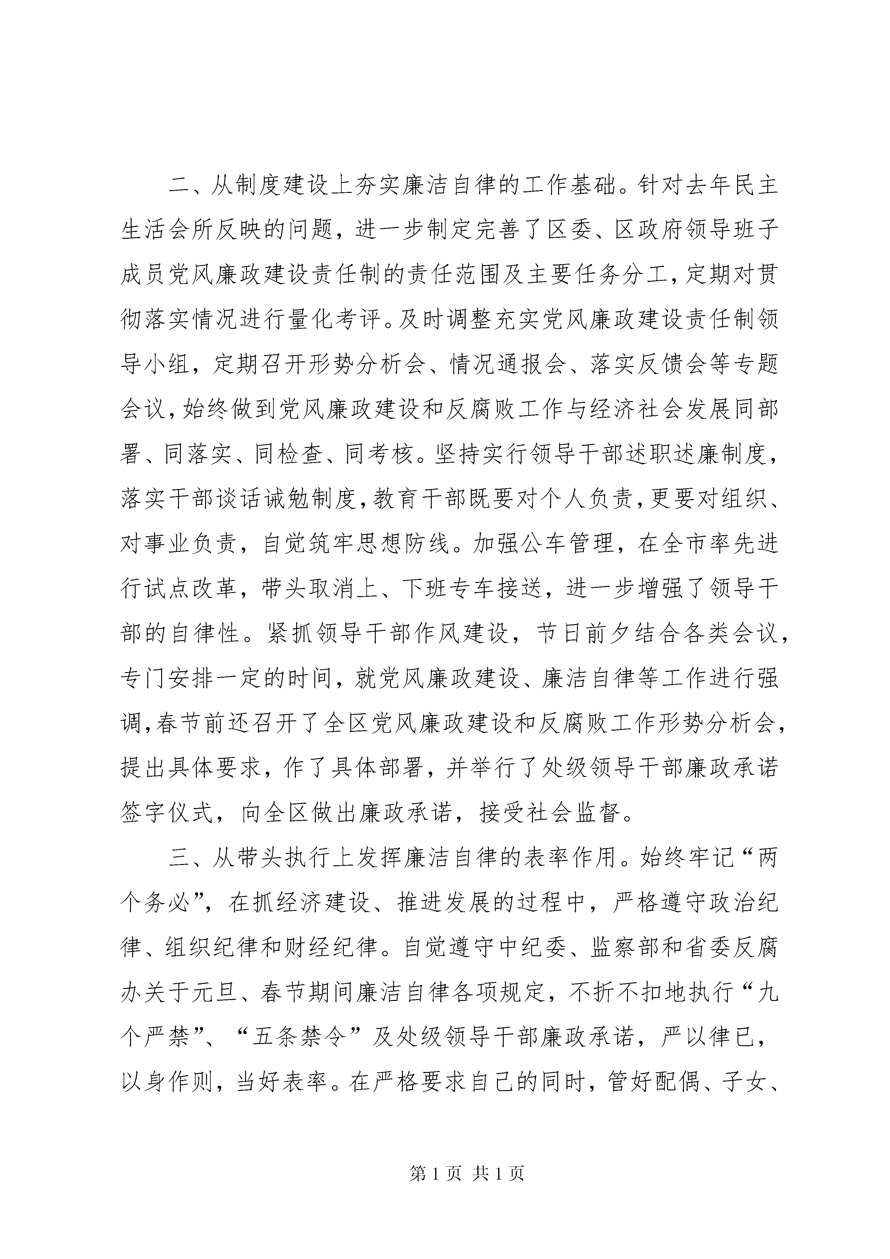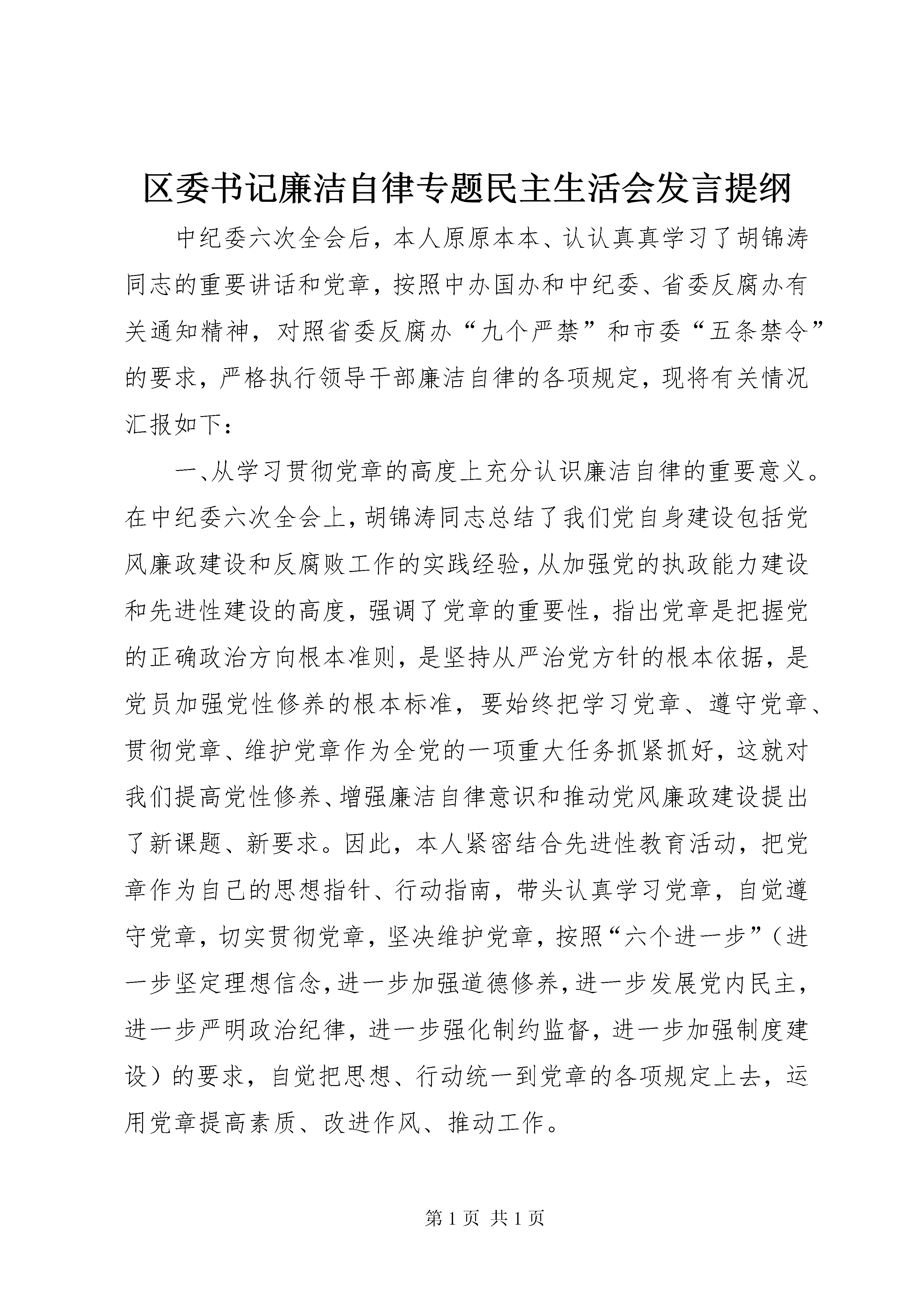 区委书记廉洁自律专题民主生活会发言提纲中纪委六次全会后,本人原原本本、认认真真学习了胡锦涛同志的重要讲话和党章,按照中办国办和中纪委、省委反腐办有关通知精神,对照省委反腐办“九个严禁”和市委“五条禁令”的要求,严格执行领导干部廉洁自律的各项规定,现将有关情况汇报如下:一、从学习贯彻党章的高度上充分认识廉洁自律的重要意义。在中纪委六次全会上,胡锦涛同志总结了我们党自身建设包括党风廉政建设和反腐败工作的实践经验,从加强党的执政能力建设和先进性建设的高度,强调了党章的重要性,指出党章是把握党的正确政治方向根本准则,是坚持从严治党方针的根本依据,是党员加强党性修养的根本标准,要始终把学习党章、遵守党章、贯彻党章、维护党章作为全党的一项重大任务抓紧抓好,这就对我们提高党性修养、增强廉洁自律意识和推动党风廉政建设提出了新课题、新要求。因此,本人紧密结合先进性教育活动,把党章作为自己的思想指针、行动指南,带头认真学习党章,自觉遵守党章,切实贯彻党章,坚决维护党章,按照“六个进一步”(进一步坚定理想信念,进一步加强道德修养,进一步发展党内民主,进一步严明政治纪律,进一步强化制约监督,进一步加强制度建设)的要求,自觉把思想、行动统一到党章的各项规定上去,运用党章提高素质、改进作风、推动工作。二、从制度建设上夯实廉洁自律的工作基础。针对去年民主生活会所反映的问题,进一步制定完善了区委、区政府领导班子成员党风廉政建设责任制的责任范围及主要任务分工,定期对贯彻落实情况进行量化考评。及时调整充实党风廉政建设责任制领导小组,定期召开形势分析会、情况通报会、落实反馈会等专题会议,始终做到党风廉政建设和反腐败工作与经济社会发展同部署、同落实、同检查、同考核。坚持实行领导干部述职述廉制度,落实干部谈话诫勉制度,教育干部既要对个人负责,更要对组织、对事业负责,自觉筑牢思想防线。加强公车管理,在全市率先进行试点改革,带头取消上、下班专车接送,进一步增强了领导干部的自律性。紧抓领导干部作风建设,节日前夕结合各类会议,专门安排一定的时间,就党风廉政建设、廉洁自律等工作进行强调,春节前还召开了全区党风廉政建设和反腐败工作形势分析会,提出具体要求,作了具体部署,并举行了处级领导干部廉政承诺签字仪式,向全区做出廉政承诺,接受社会监督。三、从带头执行上发挥廉洁自律的表率作用。始终牢记“两个务必”,在抓经济建设、推进发展的过程中,严格遵守政治纪律、组织纪律和财经纪律。自觉遵守中纪委、监察部和省委反腐办关于元旦、春节期间廉洁自律各项规定,不折不扣地执行“九个严禁”、“五条禁令”及处级领导干部廉政承诺,严以律已,以身作则,当好表率。在严格要求自己的同时,管好配偶、子女、亲属和身边的工作人员,明确要求他们不得收受或代收“红包”、礼品、礼金。对于确实推脱不掉的礼品、礼金等,及时交办公室登记管理。积极倡导勤俭节约、文明过节的良好风尚,有效制止了年终突击花钱、铺张浪费的现象,以及变相公款吃喝的行为。始终把组织监督、班子成员监督和群众的监督,看成是对自己的关心和爱护,自觉主动接受监督,在监督中正确行使人民赋予的权力,履行自己的义务。坚持民主集中制原则,积极主动地开展批评与自我批评,以自己的率先垂范,带动全区党员干部共同维护廉洁自律、艰苦奋斗的整体形象。四、从抓好节日期间各项工作上促进廉洁自律的深入开展。始终把推进发展、加快发展作为自己的首要职责,以时不我待的责任感和紧迫感扎实抓紧抓好各项工作。节日期间放弃休息时间,辞掉与公务无关、无实质性内容的应酬活动,把时间和精力集中到推动工作、推进发展上,登门拜访了一批回乡的海外乡亲和民营企业家,加强沟通联谊,积极推介,进行项目洽谈。过节期间还开展各种形式的送温暖、献爱心活动,走访特困群众、下岗职工,看望慰问节日期间仍坚守在一线工作岗位的公安干警、产业工人,深入到困难多、问题多的地方,为群众解决生产、生活中的实际困难和问题。春节过后上班第一天,即召开区五套班子领导成员会议,就各项工作进行部署,进一步统一思想,凝心聚力,以只争朝夕的精神,以求真务实的工作作风,扎扎实实推进各项工作的开展,确保顺利实现今年全区的各项发展目标。总之,本人虽然在廉洁自律中取得一定成效,但对照上级的严格要求以及群众的更高期望,还存在一些不足。下一步,本人将紧抓发展第一要务,牢固树立执政为民、廉政为民的理念,以党风廉政建设和个人廉洁自律的实绩,为涵江实现更快更好发展作出新的更大的贡献。20xx年4月
