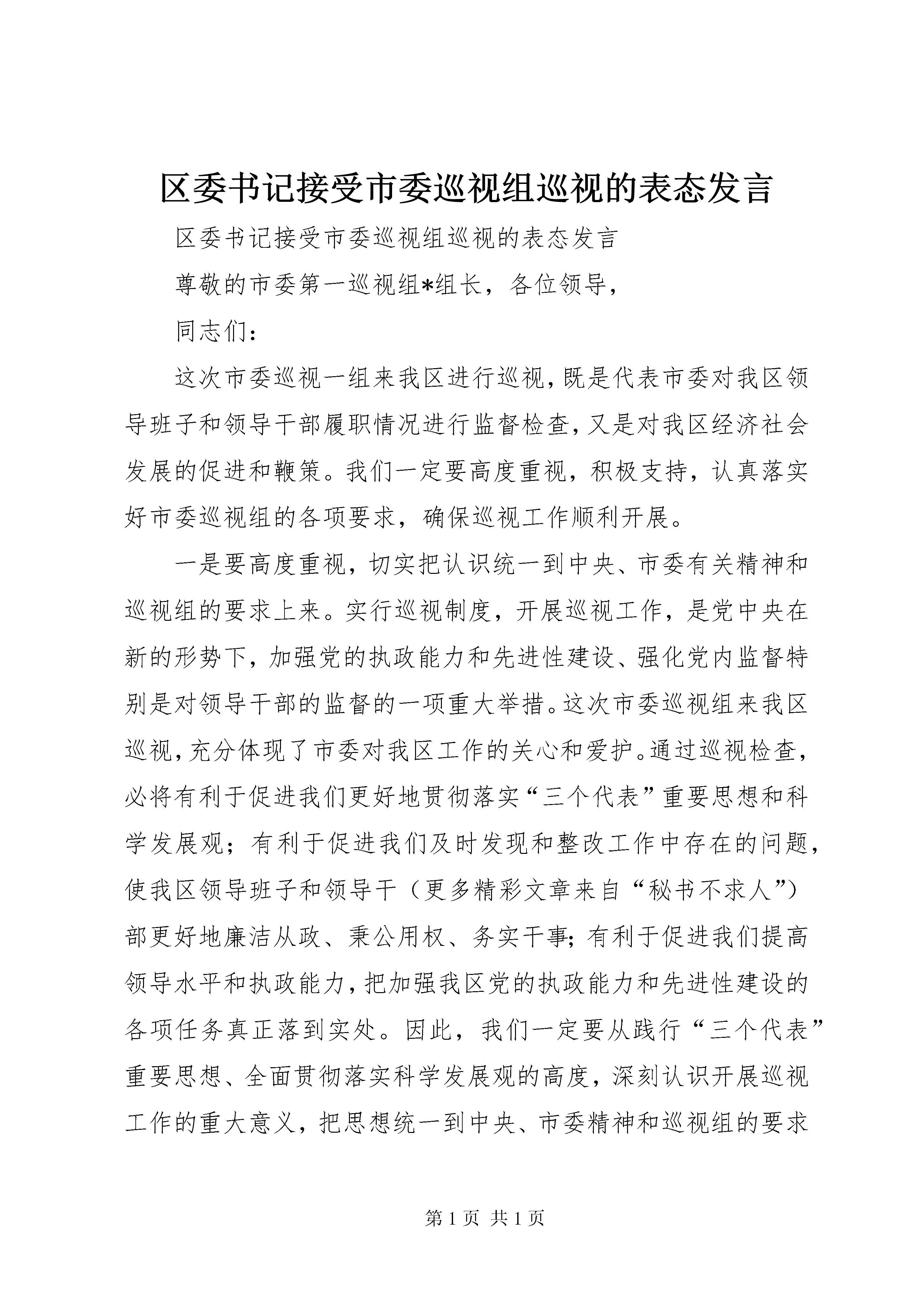 区委书记接受市委巡视组巡视的表态发言区委书记接受市委巡视组巡视的表态发言尊敬的市委第一巡视组*组长,各位领导,同志们:这次市委巡视一组来我区进行巡视,既是代表市委对我区领导班子和领导干部履职情况进行监督检查,又是对我区经济社会发展的促进和鞭策。我们一定要高度重视,积极支持,认真落实好市委巡视组的各项要求,确保巡视工作顺利开展。一是要高度重视,切实把认识统一到中央、市委有关精神和巡视组的要求上来。实行巡视制度,开展巡视工作,是党中央在新的形势下,加强党的执政能力和先进性建设、强化党内监督特别是对领导干部的监督的一项重大举措。这次市委巡视组来我区巡视,充分体现了市委对我区工作的关心和爱护。通过巡视检查,必将有利于促进我们更好地贯彻落实“三个代表”重要思想和科学发展观;有利于促进我们及时发现和整改工作中存在的问题,使我区领导班子和领导干(更多精彩文章来自“秘书不求人”)部更好地廉洁从政、秉公用权、务实干事;有利于促进我们提高领导水平和执政能力,把加强我区党的执政能力和先进性建设的各项任务真正落到实处。因此,我们一定要从践行“三个代表”重要思想、全面贯彻落实科学发展观的高度,深刻认识开展巡视工作的重大意义,把思想统一到中央、市委精神和巡视组的要求上来,切实增强接受市委巡视组监督检查的自觉性和责任感。二是要严守纪律,保证巡视工作顺利进行。巡视工作是一项监督工作,政治性和政策性都很强。因此,能否积极配合市委巡视组做好巡视检查工作,是对我们的政治意识、大局意识、责任意识的一次重要检验。我们一定要按照中央和市委有关巡视工作纪律的要求,实事求是地反映情况和问题,客观公正地提出意见和看法,确保巡视组了解真实情况,发现真正问题。全区各被巡视部门和单位也一定要坚持党性原则,严守组织纪律,一切服从巡视组巡视检查的需要,确保巡视工作顺利开展。在此,我作为区委书记,同时也代表区委常委班子表个态:诚恳接受巡视组的监督检查,并恳切希望巡视组多提批评意见,对巡视组指出的问题虚心接受,及时整改,绝不回避敷衍。三是要积极支持,认真配合巡视组做好巡视检查工作。巡视工作是党的一项十分重要的工作。我们一定要按照市委和市委巡视办廖专员、巡视组魏组长的要求,精心组织,妥善安排,积极配合并全力做好各方面的服务工作,努力为巡视组开展巡视检查提供有力保障。如果巡视组在工作中有什么要求,在生活上有什么不方便的地方,请长述组长、分友副组长和各位领导随时向我们提出,我们一定尽最大努力及时加以解决。四是要对照检查,确保巡视工作取得实效。当前,我区正面临着光荣而艰巨的发展任务。这次市委巡视组来我区开展巡视检查工作,给我们提供了一个学习和请教的极好机会。我们恳请巡视组在对我区领导班子和成员开展巡视检查的同时,对我区各方面的工作给予及时的指导,提出宝贵的意见和建议。我们将在巡视组的指导和帮助下,进一步理清发展思路,完善工作措施,健全工作制度,推动全区各项工作取得新的更大成绩。最后,祝市委巡视组的各位领导和同志们在××期间身体健康,工作顺利,生活愉快。谢谢大家。