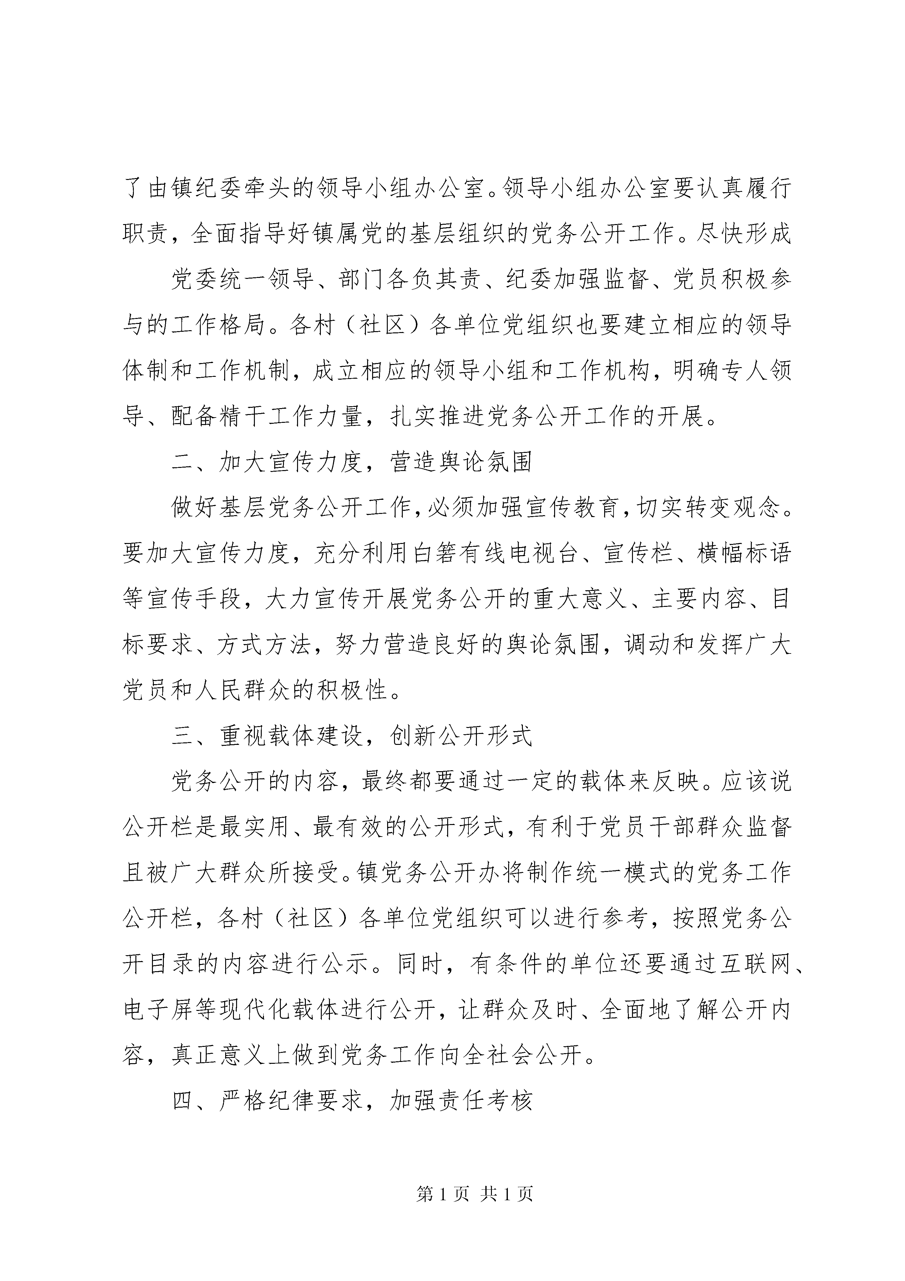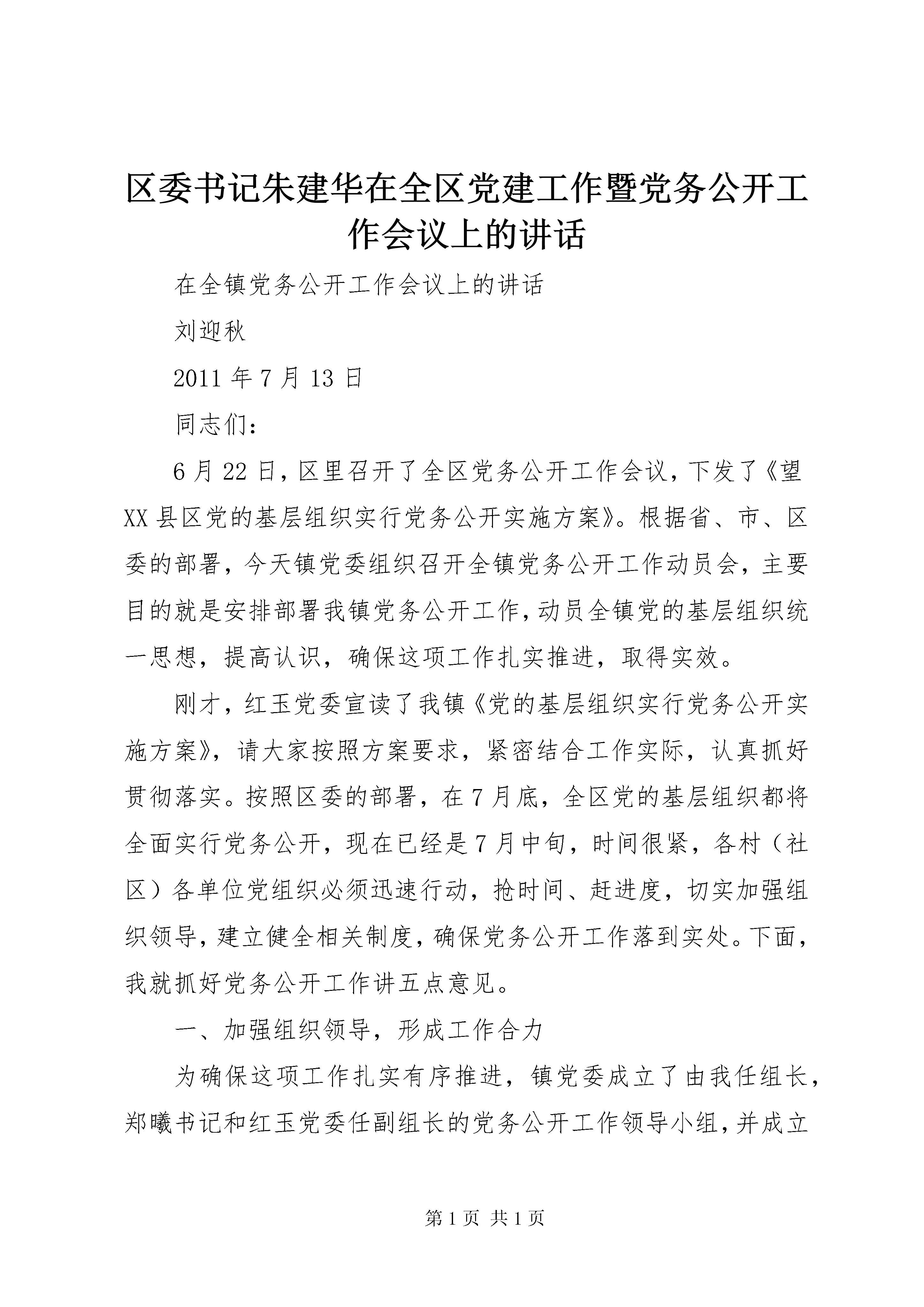 区委书记朱建华在全区党建工作暨党务公开工作会议上的讲话在全镇党务公开工作会议上的讲话刘迎秋2011年7月13日同志们:6月22日,区里召开了全区党务公开工作会议,下发了《望XX县区党的基层组织实行党务公开实施方案》。根据省、市、区委的部署,今天镇党委组织召开全镇党务公开工作动员会,主要目的就是安排部署我镇党务公开工作,动员全镇党的基层组织统一思想,提高认识,确保这项工作扎实推进,取得实效。刚才,红玉党委宣读了我镇《党的基层组织实行党务公开实施方案》,请大家按照方案要求,紧密结合工作实际,认真抓好贯彻落实。按照区委的部署,在7月底,全区党的基层组织都将全面实行党务公开,现在已经是7月中旬,时间很紧,各村(社区)各单位党组织必须迅速行动,抢时间、赶进度,切实加强组织领导,建立健全相关制度,确保党务公开工作落到实处。下面,我就抓好党务公开工作讲五点意见。一、加强组织领导,形成工作合力为确保这项工作扎实有序推进,镇党委成立了由我任组长,郑曦书记和红玉党委任副组长的党务公开工作领导小组,并成立了由镇纪委牵头的领导小组办公室。领导小组办公室要认真履行职责,全面指导好镇属党的基层组织的党务公开工作。尽快形成党委统一领导、部门各负其责、纪委加强监督、党员积极参与的工作格局。各村(社区)各单位党组织也要建立相应的领导体制和工作机制,成立相应的领导小组和工作机构,明确专人领导、配备精干工作力量,扎实推进党务公开工作的开展。二、加大宣传力度,营造舆论氛围做好基层党务公开工作,必须加强宣传教育,切实转变观念。要加大宣传力度,充分利用白箬有线电视台、宣传栏、横幅标语等宣传手段,大力宣传开展党务公开的重大意义、主要内容、目标要求、方式方法,努力营造良好的舆论氛围,调动和发挥广大党员和人民群众的积极性。三、重视载体建设,创新公开形式党务公开的内容,最终都要通过一定的载体来反映。应该说公开栏是最实用、最有效的公开形式,有利于党员干部群众监督且被广大群众所接受。镇党务公开办将制作统一模式的党务工作公开栏,各村(社区)各单位党组织可以进行参考,按照党务公开目录的内容进行公示。同时,有条件的单位还要通过互联网、电子屏等现代化载体进行公开,让群众及时、全面地了解公开内容,真正意义上做到党务工作向全社会公开。四、严格纪律要求,加强责任考核党务公开既是党风廉政建设的重要制度,也是党的建设的一项经常性的工作。镇党委将加强对各村(社区)各单位党组织党务公开工作的监督检查,把党务公开工作情况纳入落实党风廉政建设责任制检查考核范围,作为支部及支部书记年度工作考核和党建工作者考核的重要内容,列入创先争优活动考核评价内容,考核结果纳入年度绩效考核体系。各党支部书记要对党务公开工作负总责,对公开不到位、内容不准确、群众反映意见答复不及时的,要严肃追究有关人员的责任;对推行党务公开工作不力、应当公开拒不公开,严重侵犯党员民主权利,不及时、不认真解决党员群众反映的问题的,该批评的要批评,该诫勉谈话的要诫勉谈话,情节严重的要追究纪律责任;对走过场、不及时推行党务公开或在党务公开工作中弄虚作假的,要严肃追究纪律责任,切实维护党的形象,取信于民。五、注重制度建设,形成长效机制制度建设具有根本性、全局性、稳定性和长期性,是做好工作的基本保障。党务公开工作也要建立健全相关制度,形成长效机制,为工作的开展提供有力的保障。各村(社区)各单位党组织要建立例行公开制度、监督检查制度、考核评价制度、民主评议制度和意见收集处理反馈制度。在这些基础上,还要根据实际情况,在实践中不断总结完善,对存在的新情况和新问题,要及时总结新经验、探索新机制,推进党务公开工作规范有序开展。同志们,党务公开是在深入开展保持共产党员先进性教育活动期间推进的一项重要工作,必将对进一步加强和改进党的建设起到极大的促进和推动作用。各村(社区)、单位党组织要以饱满的政治热情、良好的精神状态、严明的工作纪律、求实的工作态度、创新的工作思路、高效的工作作风,从讲政治、讲党性的高度,积极稳妥、扎实有效地开展好这项工作,为构建“生态白箬、实力白箬、和谐白箬、幸福白箬”作出新的更大贡献。