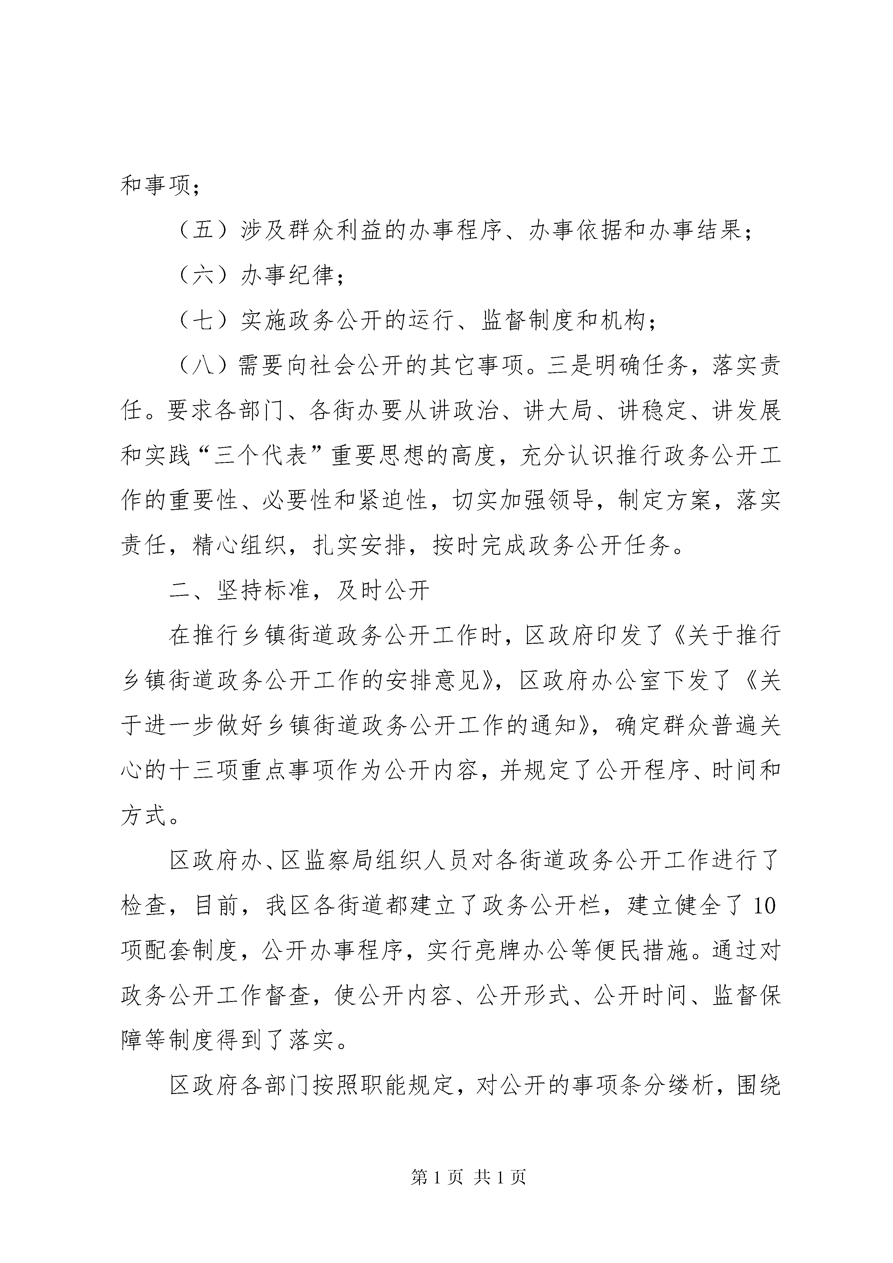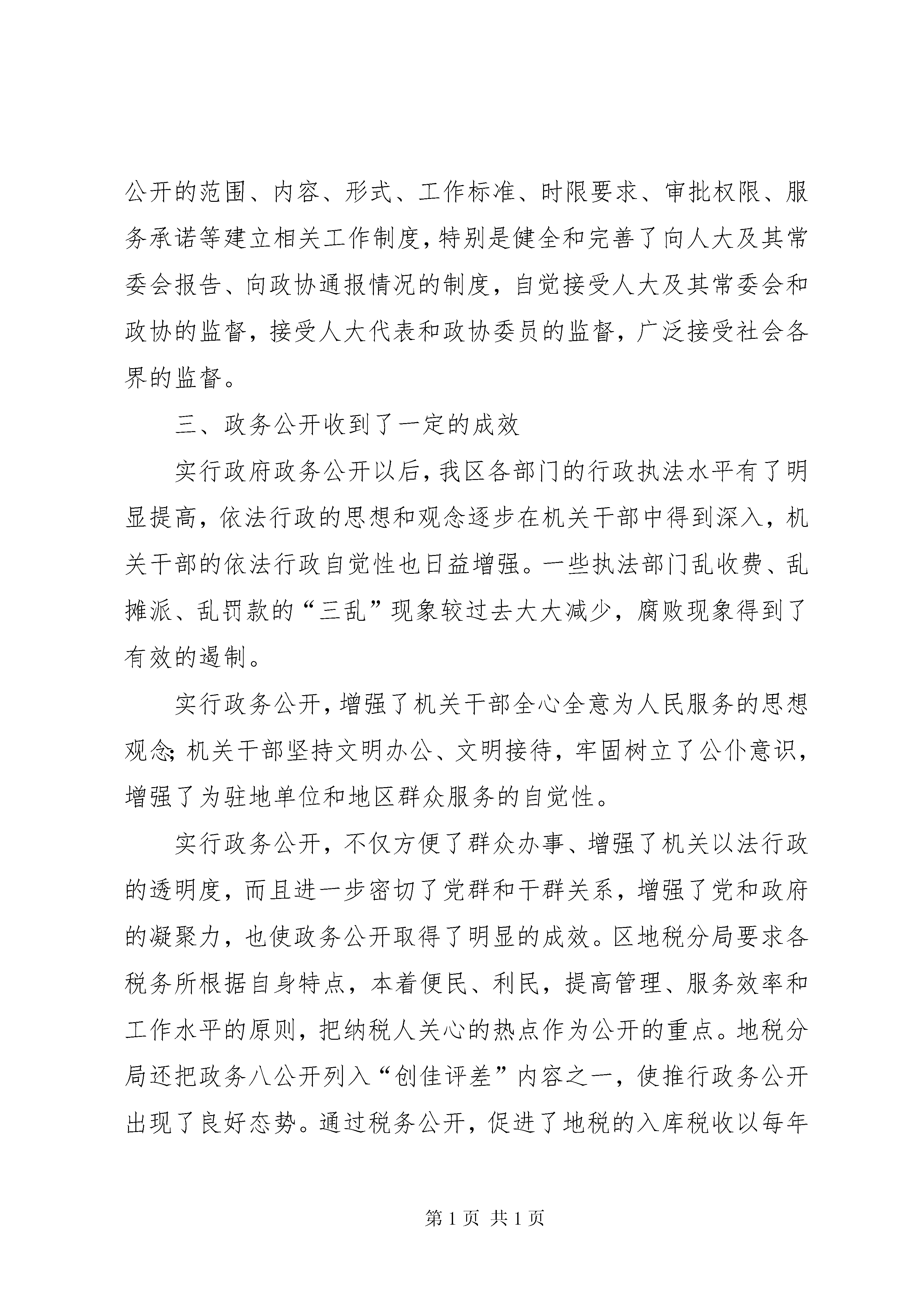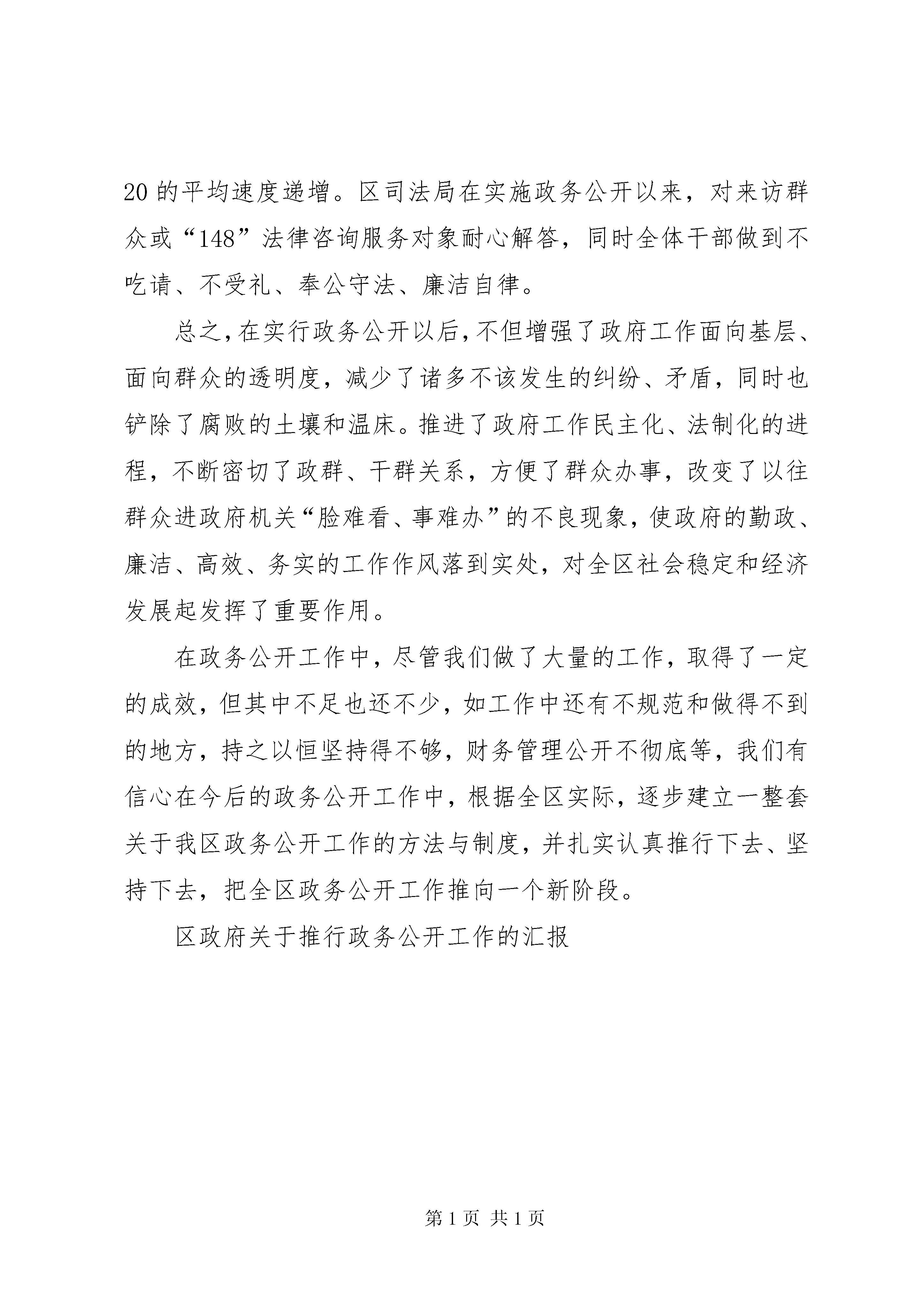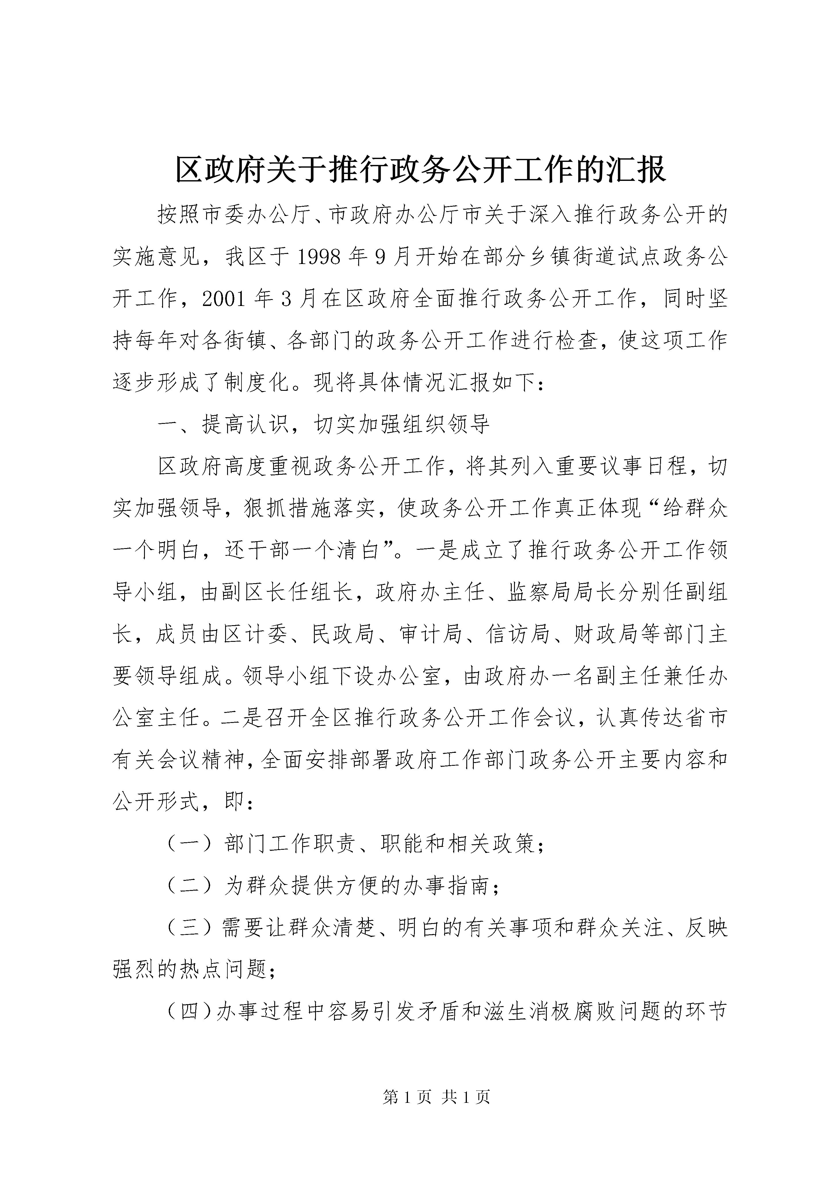 区政府关于推行政务公开工作的汇报按照市委办公厅、市政府办公厅市关于深入推行政务公开的实施意见,我区于1998年9月开始在部分乡镇街道试点政务公开工作,2001年3月在区政府全面推行政务公开工作,同时坚持每年对各街镇、各部门的政务公开工作进行检查,使这项工作逐步形成了制度化。现将具体情况汇报如下:一、提高认识,切实加强组织领导区政府高度重视政务公开工作,将其列入重要议事日程,切实加强领导,狠抓措施落实,使政务公开工作真正体现“给群众一个明白,还干部一个清白”。一是成立了推行政务公开工作领导小组,由副区长任组长,政府办主任、监察局局长分别任副组长,成员由区计委、民政局、审计局、信访局、财政局等部门主要领导组成。领导小组下设办公室,由政府办一名副主任兼任办公室主任。二是召开全区推行政务公开工作会议,认真传达省市有关会议精神,全面安排部署政府工作部门政务公开主要内容和公开形式,即:(一)部门工作职责、职能和相关政策;(二)为群众提供方便的办事指南;(三)需要让群众清楚、明白的有关事项和群众关注、反映强烈的热点问题;(四)办事过程中容易引发矛盾和滋生消极腐败问题的环节和事项;(五)涉及群众利益的办事程序、办事依据和办事结果;(六)办事纪律;(七)实施政务公开的运行、监督制度和机构;(八)需要向社会公开的其它事项。三是明确任务,落实责任。要求各部门、各街办要从讲政治、讲大局、讲稳定、讲发展和实践“三个代表”重要思想的高度,充分认识推行政务公开工作的重要性、必要性和紧迫性,切实加强领导,制定方案,落实责任,精心组织,扎实安排,按时完成政务公开任务。二、坚持标准,及时公开在推行乡镇街道政务公开工作时,区政府印发了《关于推行乡镇街道政务公开工作的安排意见》,区政府办公室下发了《关于进一步做好乡镇街道政务公开工作的通知》,确定群众普遍关心的十三项重点事项作为公开内容,并规定了公开程序、时间和方式。区政府办、区监察局组织人员对各街道政务公开工作进行了检查,目前,我区各街道都建立了政务公开栏,建立健全了10项配套制度,公开办事程序,实行亮牌办公等便民措施。通过对政务公开工作督查,使公开内容、公开形式、公开时间、监督保障等制度得到了落实。区政府各部门按照职能规定,对公开的事项条分缕析,围绕公开的范围、内容、形式、工作标准、时限要求、审批权限、服务承诺等建立相关工作制度,特别是健全和完善了向人大及其常委会报告、向政协通报情况的制度,自觉接受人大及其常委会和政协的监督,接受人大代表和政协委员的监督,广泛接受社会各界的监督。三、政务公开收到了一定的成效实行政府政务公开以后,我区各部门的行政执法水平有了明显提高,依法行政的思想和观念逐步在机关干部中得到深入,机关干部的依法行政自觉性也日益增强。一些执法部门乱收费、乱摊派、乱罚款的“三乱”现象较过去大大减少,腐败现象得到了有效的遏制。实行政务公开,增强了机关干部全心全意为人民服务的思想观念;机关干部坚持文明办公、文明接待,牢固树立了公仆意识,增强了为驻地单位和地区群众服务的自觉性。实行政务公开,不仅方便了群众办事、增强了机关以法行政的透明度,而且进一步密切了党群和干群关系,增强了党和政府的凝聚力,也使政务公开取得了明显的成效。区地税分局要求各税务所根据自身特点,本着便民、利民,提高管理、服务效率和工作水平的原则,把纳税人关心的热点作为公开的重点。地税分局还把政务八公开列入“创佳评差”内容之一,使推行政务公开出现了良好态势。通过税务公开,促进了地税的入库税收以每年20的平均速度递增。区司法局在实施政务公开以来,对来访群众或“148”法律咨询服务对象耐心解答,同时全体干部做到不吃请、不受礼、奉公守法、廉洁自律。总之,在实行政务公开以后,不但增强了政府工作面向基层、面向群众的透明度,减少了诸多不该发生的纠纷、矛盾,同时也铲除了腐败的土壤和温床。推进了政府工作民主化、法制化的进程,不断密切了政群、干群关系,方便了群众办事,改变了以往群众进政府机关“脸难看、事难办”的不良现象,使政府的勤政、廉洁、高效、务实的工作作风落到实处,对全区社会稳定和经济发展起发挥了重要作用。在政务公开工作中,尽管我们做了大量的工作,取得了一定的成效,但其中不足也还不少,如工作中还有不规范和做得不到的地方,持之以恒坚持得不够,财务管理公开不彻底等,我们有信心在今后的政务公开工作中,根据全区实际,逐步建立一整套关于我区政务公开工作的方法与制度,并扎实认真推行下去、坚持下去,把全区政务公开工作推向一个新阶段。区政府关于推行政务公开工作的汇报