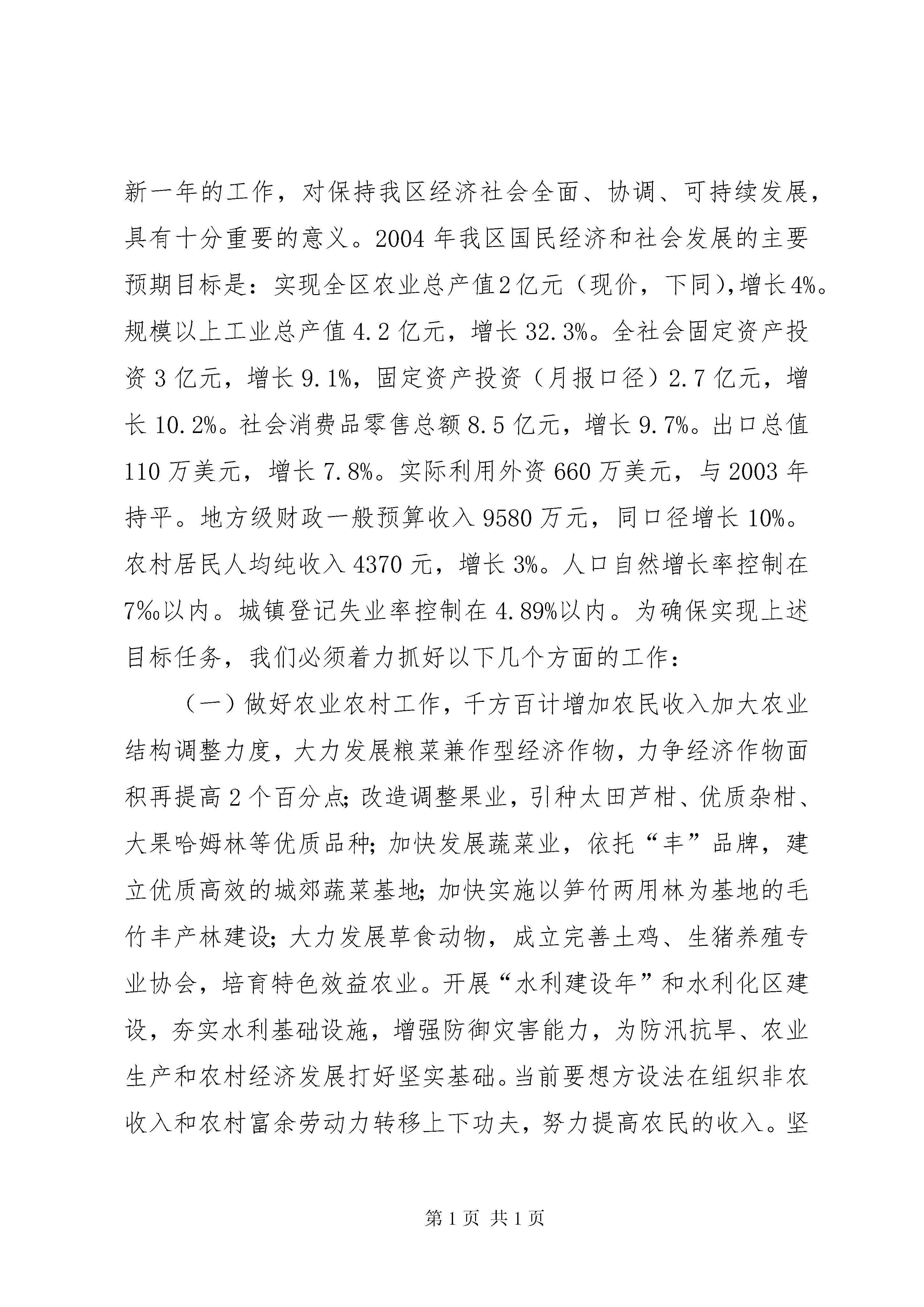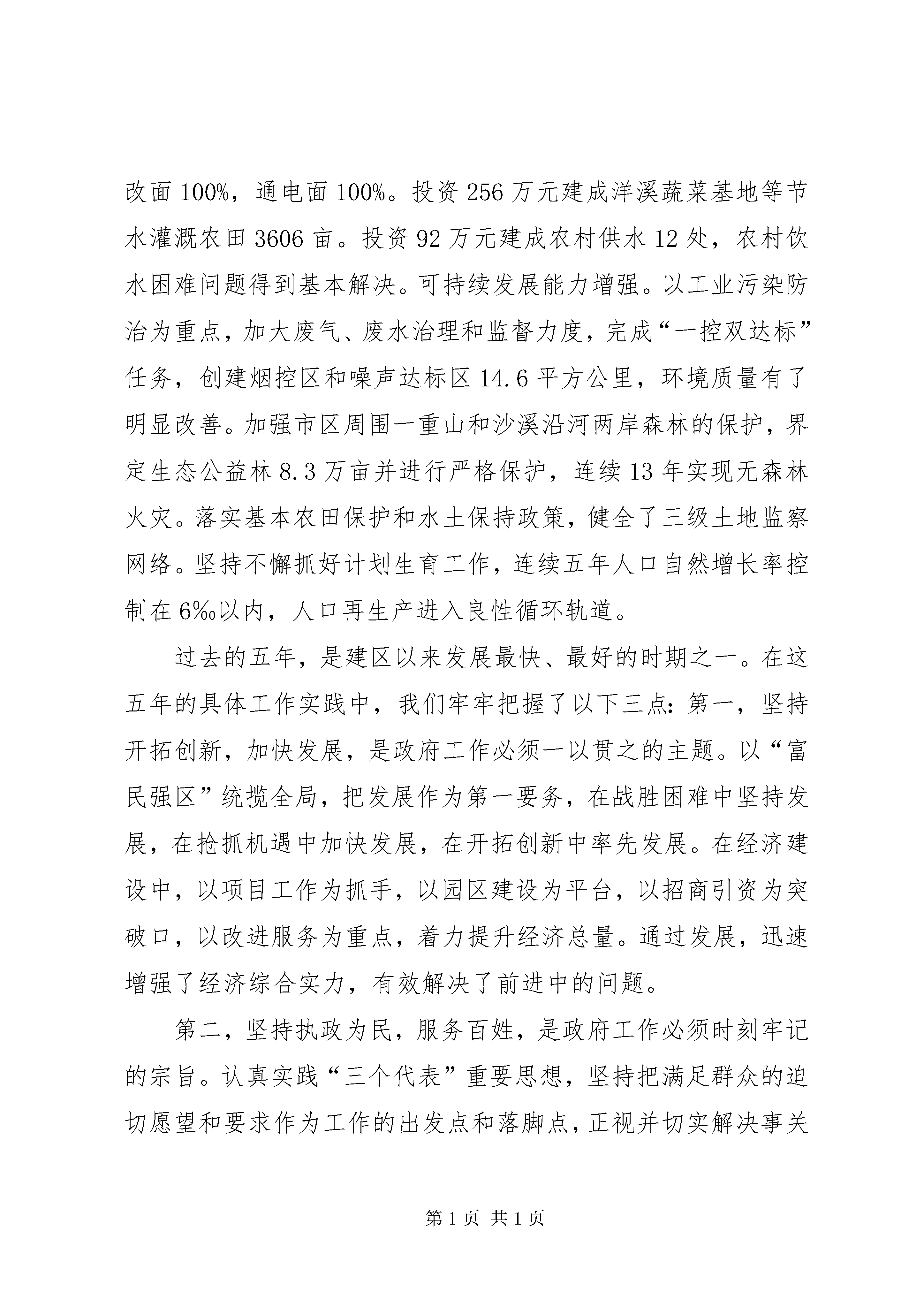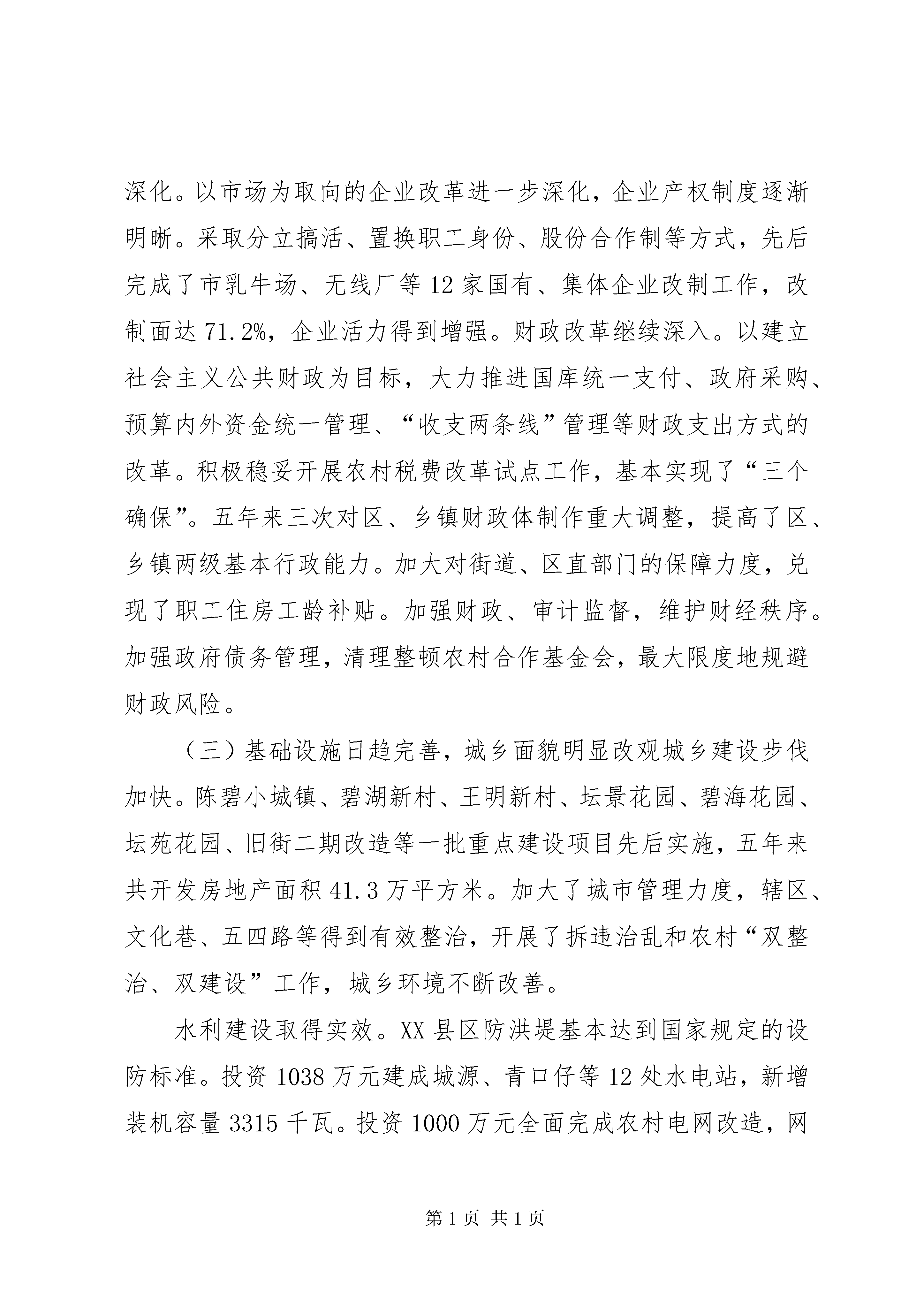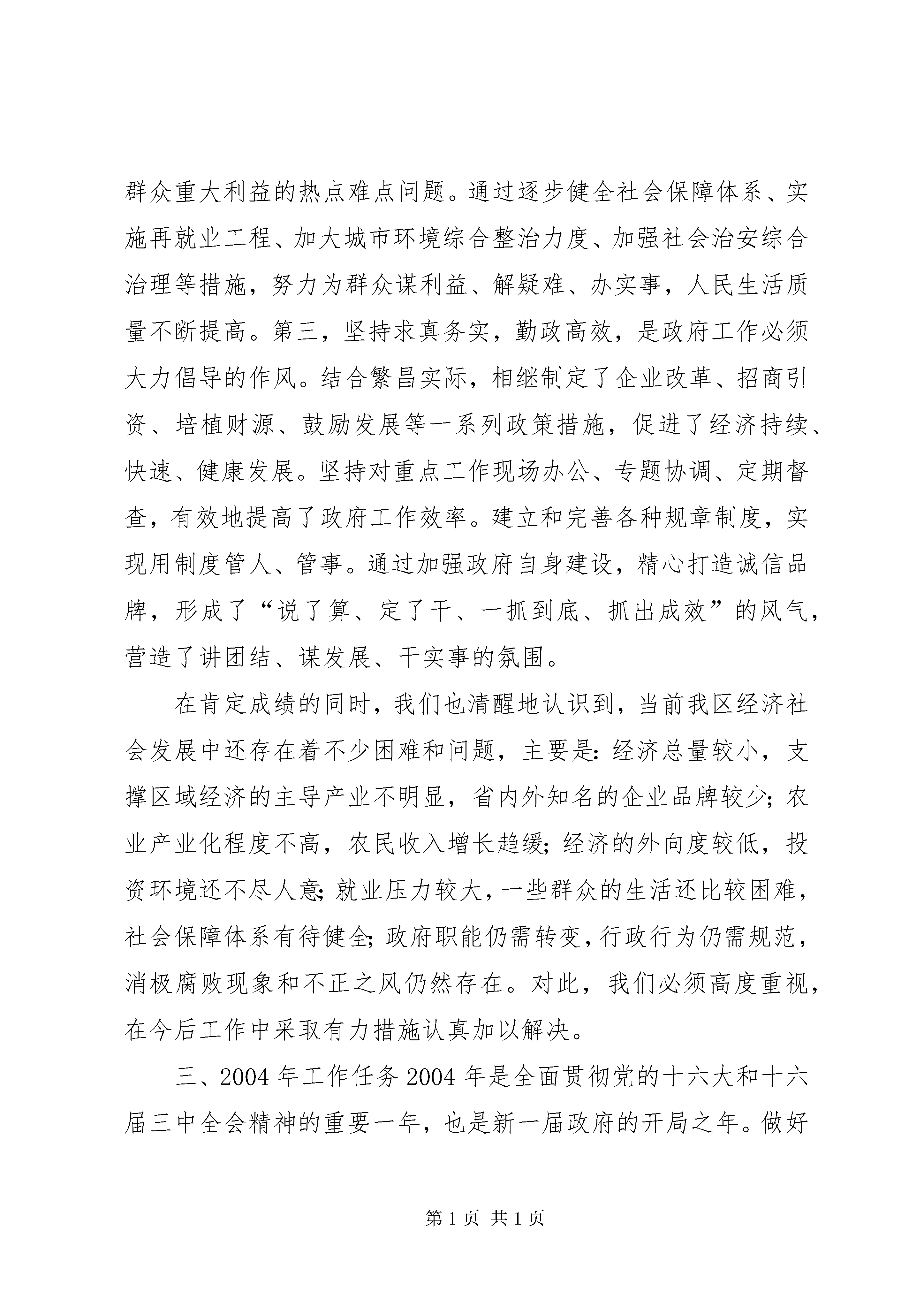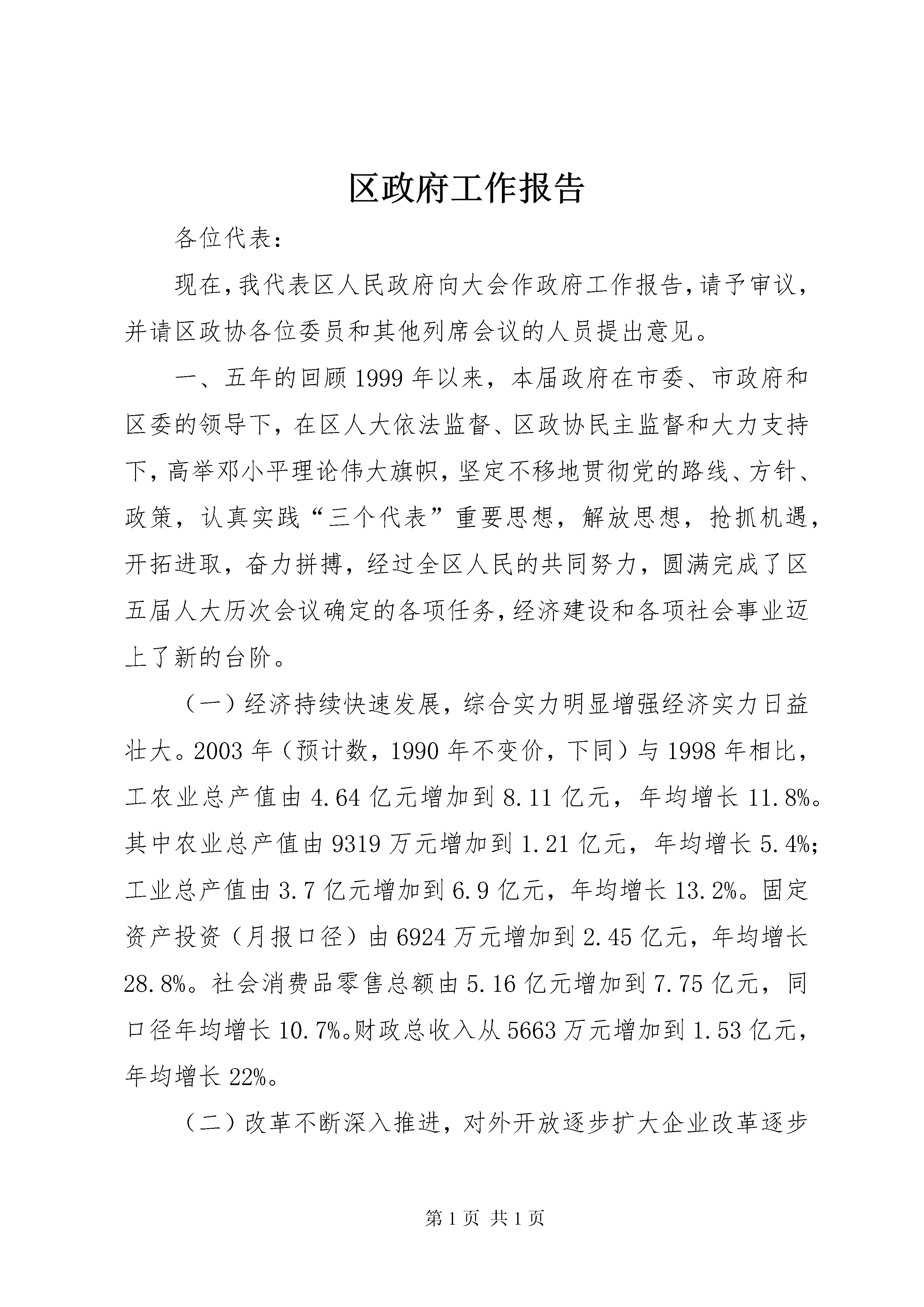 区政府工作报告各位代表:现在,我代表区人民政府向大会作政府工作报告,请予审议,并请区政协各位委员和其他列席会议的人员提出意见。一、五年的回顾1999年以来,本届政府在市委、市政府和区委的领导下,在区人大依法监督、区政协民主监督和大力支持下,高举邓小平理论伟大旗帜,坚定不移地贯彻党的路线、方针、政策,认真实践“三个代表”重要思想,解放思想,抢抓机遇,开拓进取,奋力拼搏,经过全区人民的共同努力,圆满完成了区五届人大历次会议确定的各项任务,经济建设和各项社会事业迈上了新的台阶。(一)经济持续快速发展,综合实力明显增强经济实力日益壮大。2003年(预计数,1990年不变价,下同)与1998年相比,工农业总产值由4.64亿元增加到8.11亿元,年均增长11.8%。其中农业总产值由9319万元增加到1.21亿元,年均增长5.4%;工业总产值由3.7亿元增加到6.9亿元,年均增长13.2%。固定资产投资(月报口径)由6924万元增加到2.45亿元,年均增长28.8%。社会消费品零售总额由5.16亿元增加到7.75亿元,同口径年均增长10.7%。财政总收入从5663万元增加到1.53亿元,年均增长22%。(二)改革不断深入推进,对外开放逐步扩大企业改革逐步深化。以市场为取向的企业改革进一步深化,企业产权制度逐渐明晰。采取分立搞活、置换职工身份、股份合作制等方式,先后完成了市乳牛场、无线厂等12家国有、集体企业改制工作,改制面达71.2%,企业活力得到增强。财政改革继续深入。以建立社会主义公共财政为目标,大力推进国库统一支付、政府采购、预算内外资金统一管理、“收支两条线”管理等财政支出方式的改革。积极稳妥开展农村税费改革试点工作,基本实现了“三个确保”。五年来三次对区、乡镇财政体制作重大调整,提高了区、乡镇两级基本行政能力。加大对街道、区直部门的保障力度,兑现了职工住房工龄补贴。加强财政、审计监督,维护财经秩序。加强政府债务管理,清理整顿农村合作基金会,最大限度地规避财政风险。(三)基础设施日趋完善,城乡面貌明显改观城乡建设步伐加快。陈碧小城镇、碧湖新村、王明新村、坛景花园、碧海花园、坛苑花园、旧街二期改造等一批重点建设项目先后实施,五年来共开发房地产面积41.3万平方米。加大了城市管理力度,辖区、文化巷、五四路等得到有效整治,开展了拆违治乱和农村“双整治、双建设”工作,城乡环境不断改善。水利建设取得实效。XX县区防洪堤基本达到国家规定的设防标准。投资1038万元建成城源、青口仔等12处水电站,新增装机容量3315千瓦。投资1000万元全面完成农村电网改造,网改面100%,通电面100%。投资256万元建成洋溪蔬菜基地等节水灌溉农田3606亩。投资92万元建成农村供水12处,农村饮水困难问题得到基本解决。可持续发展能力增强。以工业污染防治为重点,加大废气、废水治理和监督力度,完成“一控双达标”任务,创建烟控区和噪声达标区14.6平方公里,环境质量有了明显改善。加强市区周围一重山和沙溪沿河两岸森林的保护,界定生态公益林8.3万亩并进行严格保护,连续13年实现无森林火灾。落实基本农田保护和水土保持政策,健全了三级土地监察网络。坚持不懈抓好计划生育工作,连续五年人口自然增长率控制在6‰以内,人口再生产进入良性循环轨道。过去的五年,是建区以来发展最快、最好的时期之一。在这五年的具体工作实践中,我们牢牢把握了以下三点:第一,坚持开拓创新,加快发展,是政府工作必须一以贯之的主题。以“富民强区”统揽全局,把发展作为第一要务,在战胜困难中坚持发展,在抢抓机遇中加快发展,在开拓创新中率先发展。在经济建设中,以项目工作为抓手,以园区建设为平台,以招商引资为突破口,以改进服务为重点,着力提升经济总量。通过发展,迅速增强了经济综合实力,有效解决了前进中的问题。第二,坚持执政为民,服务百姓,是政府工作必须时刻牢记的宗旨。认真实践“三个代表”重要思想,坚持把满足群众的迫切愿望和要求作为工作的出发点和落脚点,正视并切实解决事关群众重大利益的热点难点问题。通过逐步健全社会保障体系、实施再就业工程、加大城市环境综合整治力度、加强社会治安综合治理等措施,努力为群众谋利益、解疑难、办实事,人民生活质量不断提高。第三,坚持求真务实,勤政高效,是政府工作必须大力倡导的作风。结合繁昌实际,相继制定了企业改革、招商引资、培植财源、鼓励发展等一系列政策措施,促进了经济持续、快速、健康发展。坚持对重点工作现场办公、专题协调、定期督查,有效地提高了政府工作效率。建立和完善各种规章制度,实现用制度管人、管事。通过加强政府自身建设,精心打造诚信品牌,形成了“说了算、定了干、一抓到底、抓出成效”的风气,营造了讲团结、谋发展、干实事的氛围。在肯定成绩的同时,我们也清醒地认识到,