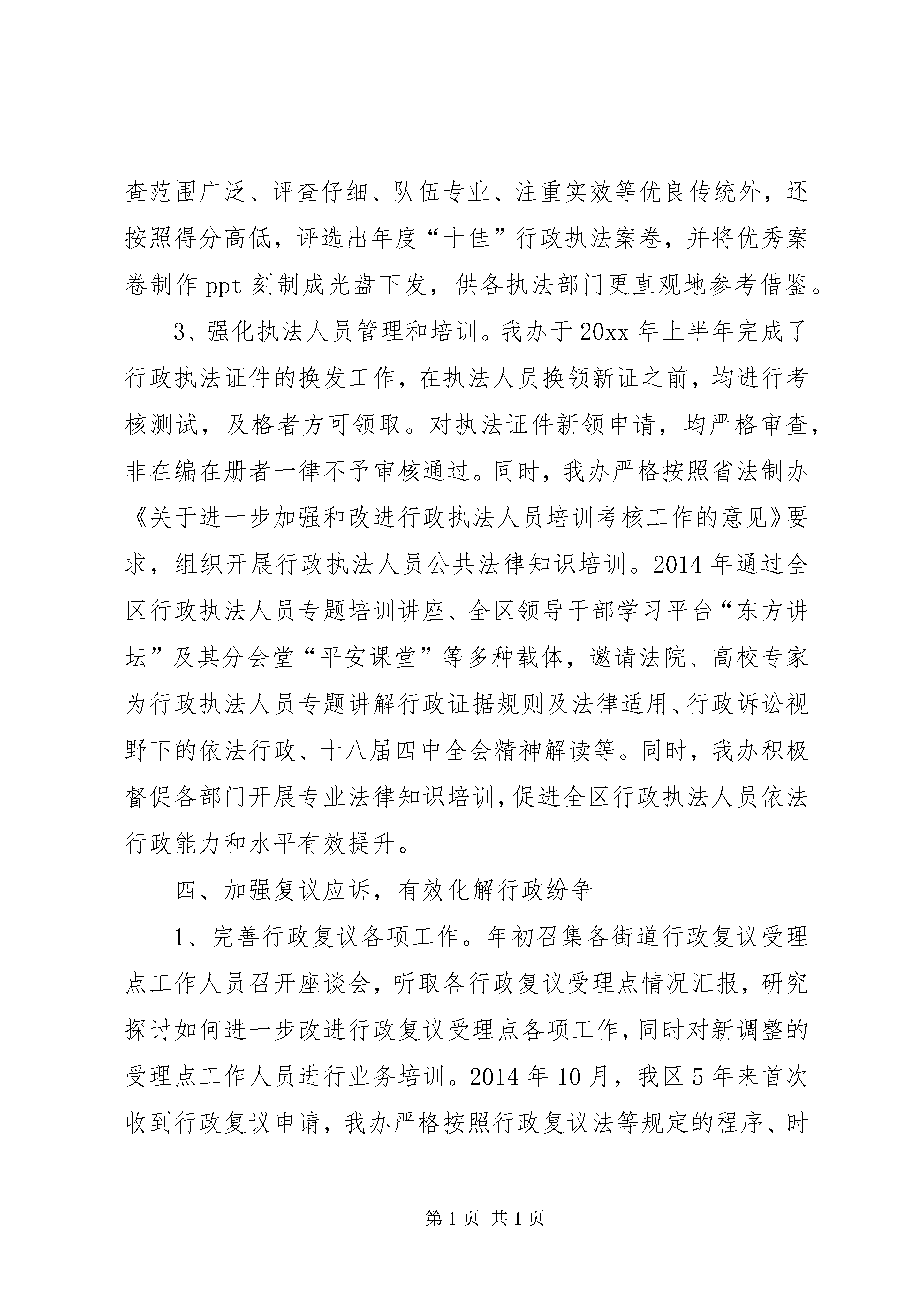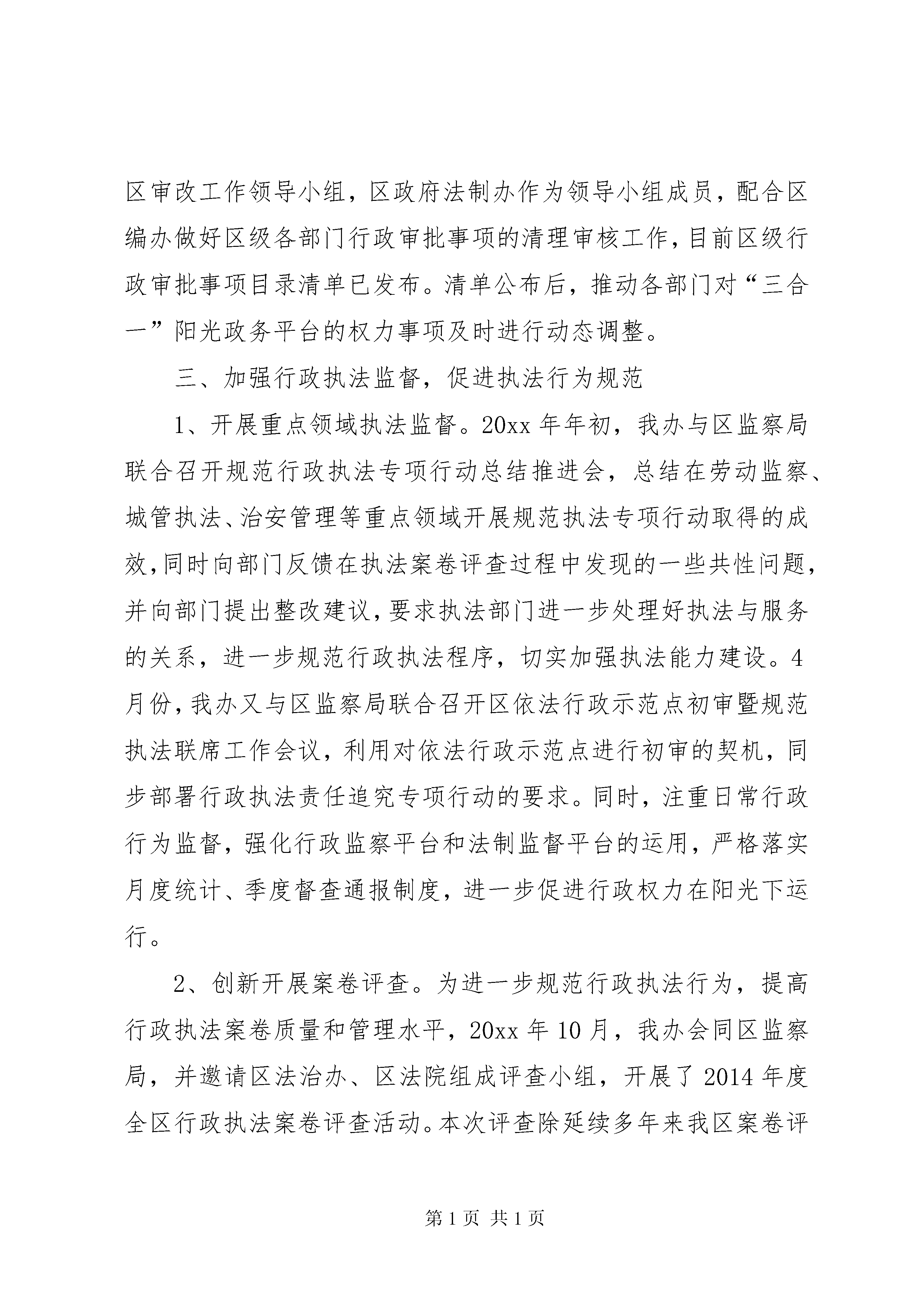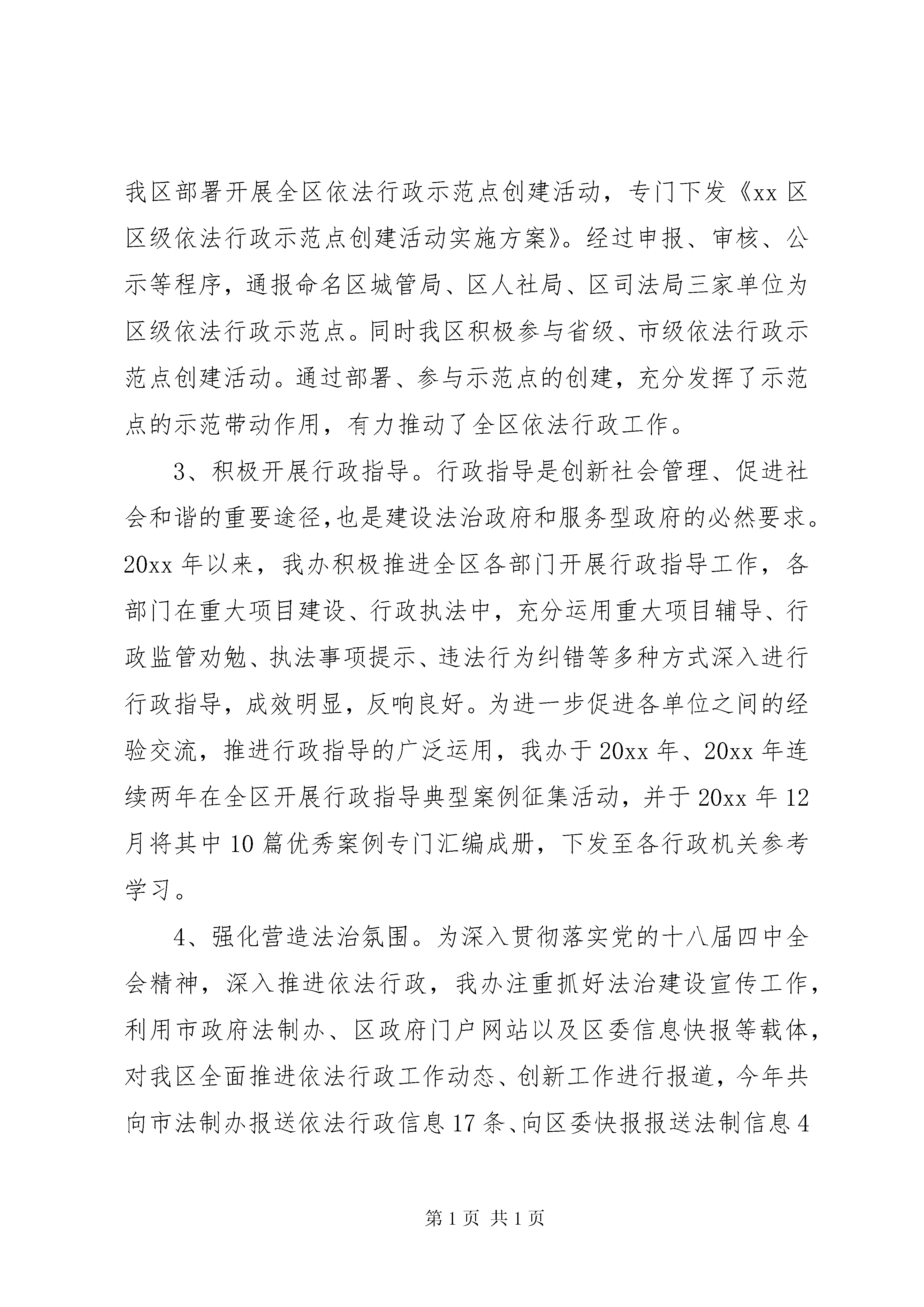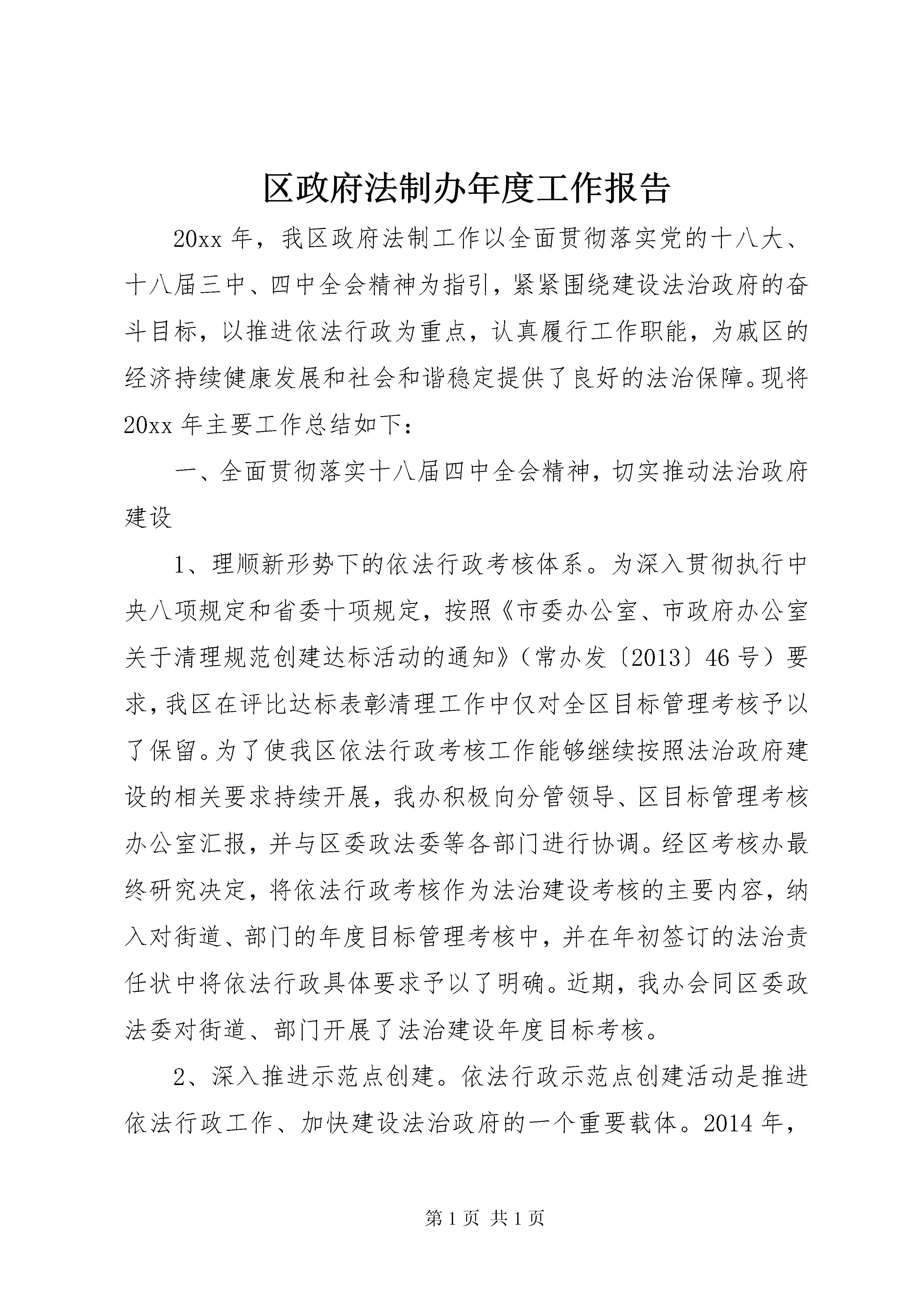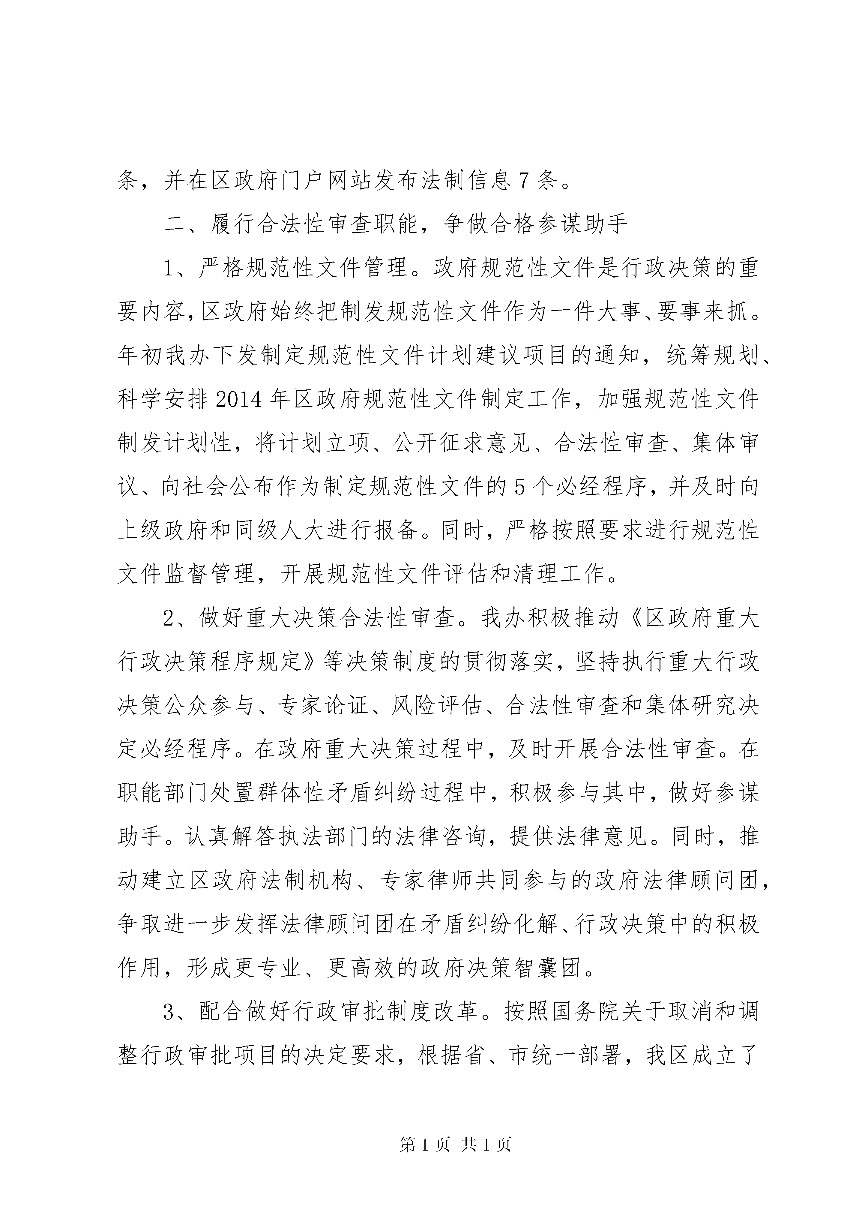 区政府法制办年度工作报告20xx年,我区政府法制工作以全面贯彻落实党的十八大、十八届三中、四中全会精神为指引,紧紧围绕建设法治政府的奋斗目标,以推进依法行政为重点,认真履行工作职能,为戚区的经济持续健康发展和社会和谐稳定提供了良好的法治保障。现将20xx年主要工作总结如下:一、全面贯彻落实十八届四中全会精神,切实推动法治政府建设1、理顺新形势下的依法行政考核体系。为深入贯彻执行中央八项规定和省委十项规定,按照《市委办公室、市政府办公室关于清理规范创建达标活动的通知》(常办发〔2013〕46号)要求,我区在评比达标表彰清理工作中仅对全区目标管理考核予以了保留。为了使我区依法行政考核工作能够继续按照法治政府建设的相关要求持续开展,我办积极向分管领导、区目标管理考核办公室汇报,并与区委政法委等各部门进行协调。经区考核办最终研究决定,将依法行政考核作为法治建设考核的主要内容,纳入对街道、部门的年度目标管理考核中,并在年初签订的法治责任状中将依法行政具体要求予以了明确。近期,我办会同区委政法委对街道、部门开展了法治建设年度目标考核。2、深入推进示范点创建。依法行政示范点创建活动是推进依法行政工作、加快建设法治政府的一个重要载体。2014年,我区部署开展全区依法行政示范点创建活动,专门下发《xx区区级依法行政示范点创建活动实施方案》。经过申报、审核、公示等程序,通报命名区城管局、区人社局、区司法局三家单位为区级依法行政示范点。同时我区积极参与省级、市级依法行政示范点创建活动。通过部署、参与示范点的创建,充分发挥了示范点的示范带动作用,有力推动了全区依法行政工作。3、积极开展行政指导。行政指导是创新社会管理、促进社会和谐的重要途径,也是建设法治政府和服务型政府的必然要求。20xx年以来,我办积极推进全区各部门开展行政指导工作,各部门在重大项目建设、行政执法中,充分运用重大项目辅导、行政监管劝勉、执法事项提示、违法行为纠错等多种方式深入进行行政指导,成效明显,反响良好。为进一步促进各单位之间的经验交流,推进行政指导的广泛运用,我办于20xx年、20xx年连续两年在全区开展行政指导典型案例征集活动,并于20xx年12月将其中10篇优秀案例专门汇编成册,下发至各行政机关参考学习。4、强化营造法治氛围。为深入贯彻落实党的十八届四中全会精神,深入推进依法行政,我办注重抓好法治建设宣传工作,利用市政府法制办、区政府门户网站以及区委信息快报等载体,对我区全面推进依法行政工作动态、创新工作进行报道,今年共向市法制办报送依法行政信息17条、向区委快报报送法制信息4条,并在区政府门户网站发布法制信息7条。二、履行合法性审查职能,争做合格参谋助手1、严格规范性文件管理。政府规范性文件是行政决策的重要内容,区政府始终把制发规范性文件作为一件大事、要事来抓。年初我办下发制定规范性文件计划建议项目的通知,统筹规划、科学安排2014年区政府规范性文件制定工作,加强规范性文件制发计划性,将计划立项、公开征求意见、合法性审查、集体审议、向社会公布作为制定规范性文件的5个必经程序,并及时向上级政府和同级人大进行报备。同时,严格按照要求进行规范性文件监督管理,开展规范性文件评估和清理工作。2、做好重大决策合法性审查。我办积极推动《区政府重大行政决策程序规定》等决策制度的贯彻落实,坚持执行重大行政决策公众参与、专家论证、风险评估、合法性审查和集体研究决定必经程序。在政府重大决策过程中,及时开展合法性审查。在职能部门处置群体性矛盾纠纷过程中,积极参与其中,做好参谋助手。认真解答执法部门的法律咨询,提供法律意见。同时,推动建立区政府法制机构、专家律师共同参与的政府法律顾问团,争取进一步发挥法律顾问团在矛盾纠纷化解、行政决策中的积极作用,形成更专业、更高效的政府决策智囊团。3、配合做好行政审批制度改革。按照国务院关于取消和调整行政审批项目的决定要求,根据省、市统一部署,我区成立了区审改工作领导小组,区政府法制办作为领导小组成员,配合区编办做好区级各部门行政审批事项的清理审核工作,目前区级行政审批事项目录清单已发布。清单公布后,推动各部门对“三合一”阳光政务平台的权力事项及时进行动态调整。三、加强行政执法监督,促进执法行为规范1、开展重点领域执法监督。20xx年年初,我办与区监察局联合召开规范行政执法专项行动总结推进会,总结在劳动监察、城管执法、治安管理等重点领域开展规范执法专项行动取得的成效,同时向部门反馈在执法案卷评查过程中发现的一些共性问题,并向部门提出整改建议,要求执法部门进一步处理好执法与服务的关系,进一步规范行政执法程序,切实加强执法能力建设。4月份,我办又与区监察局联合召开区依法行政示范点初审暨规范执法联席工作会议,利用对依法行政示范点进行初审的契