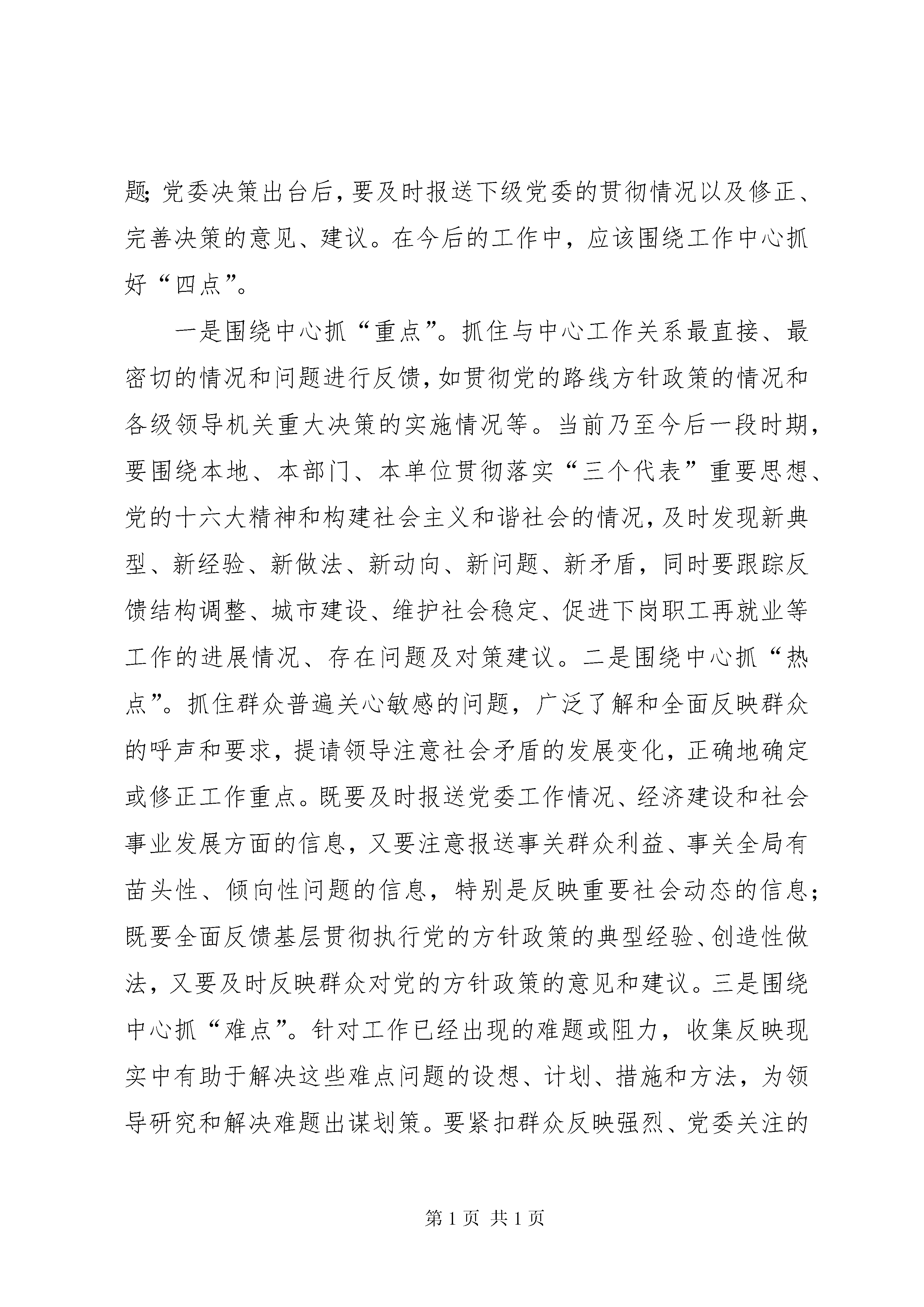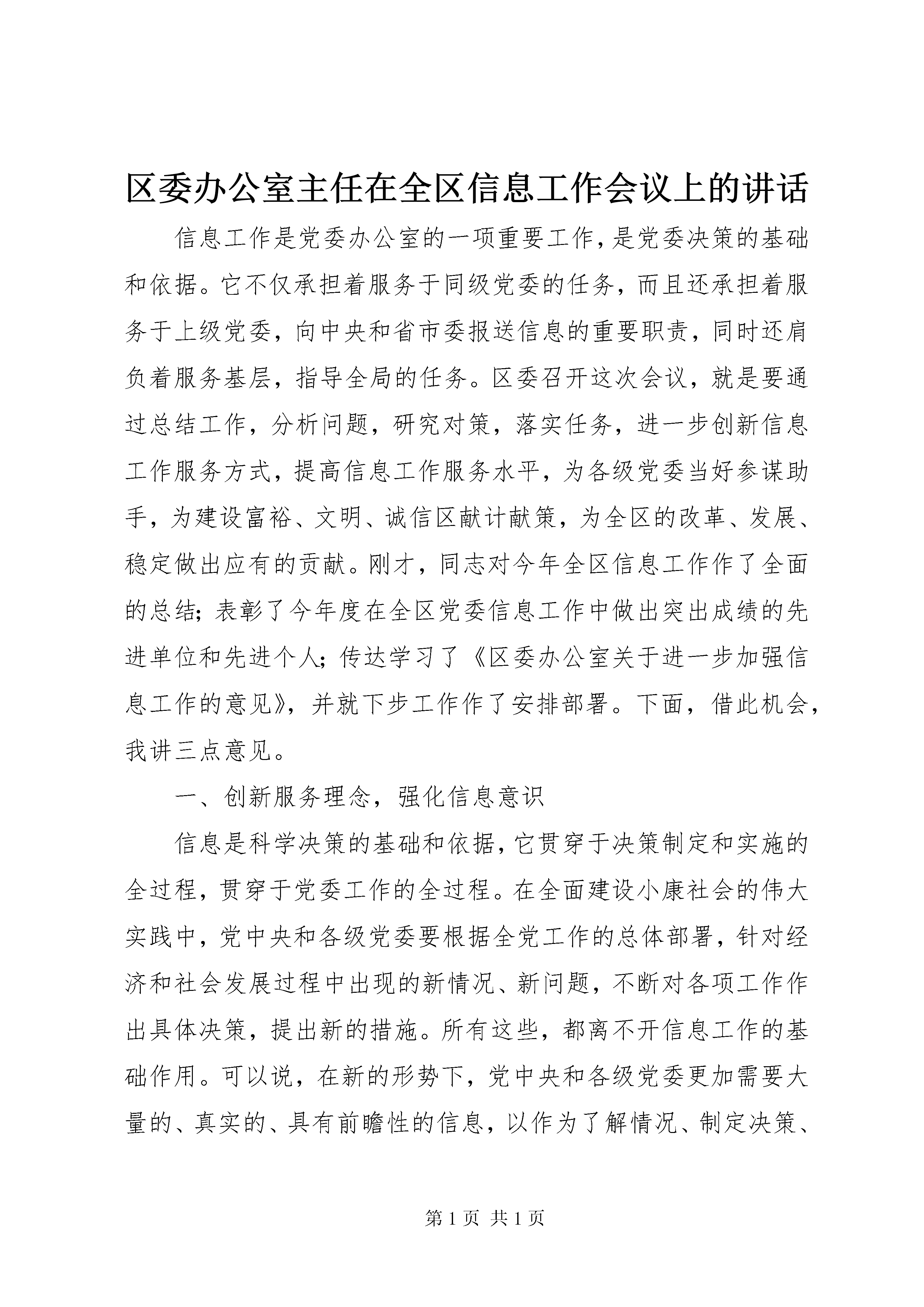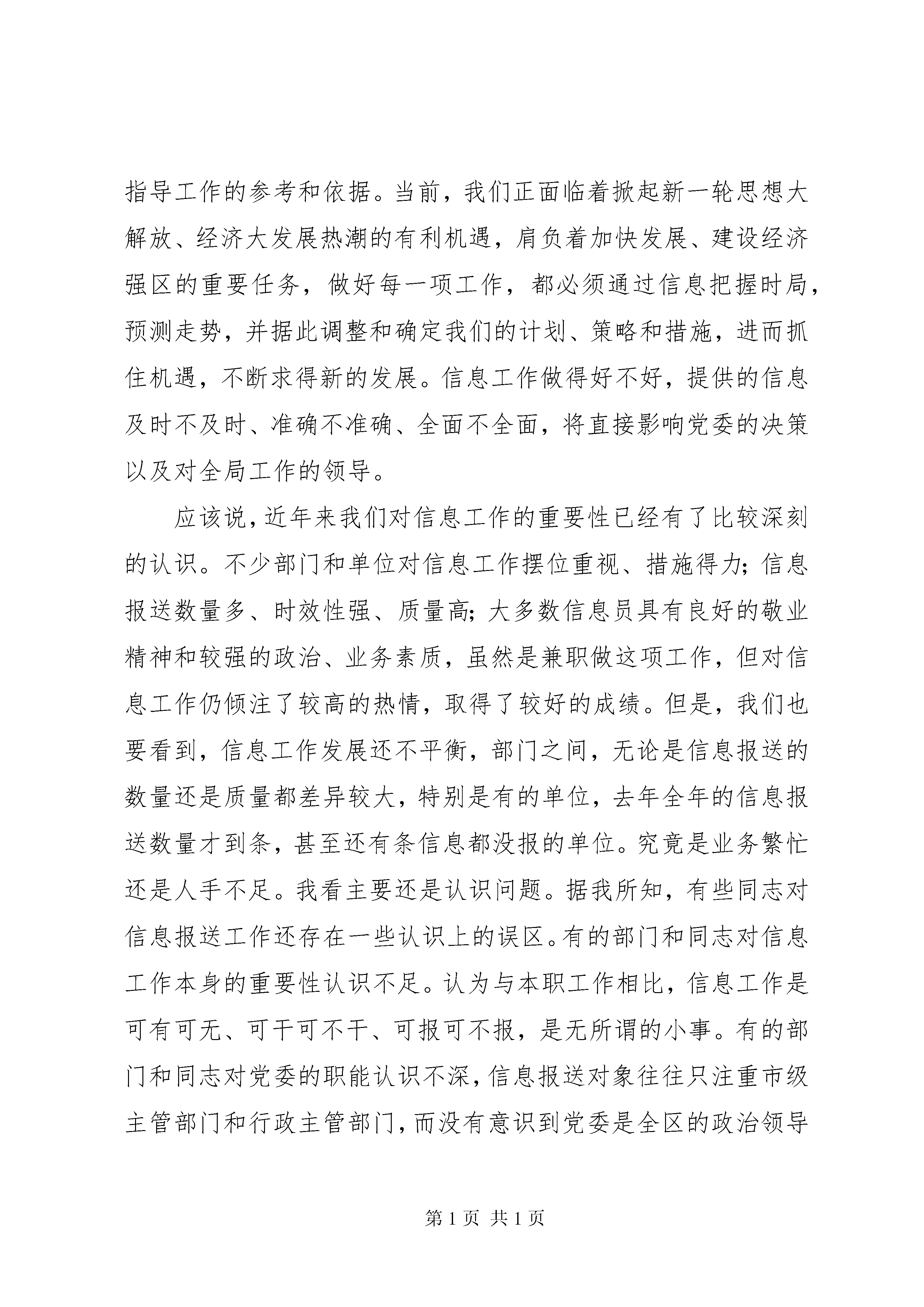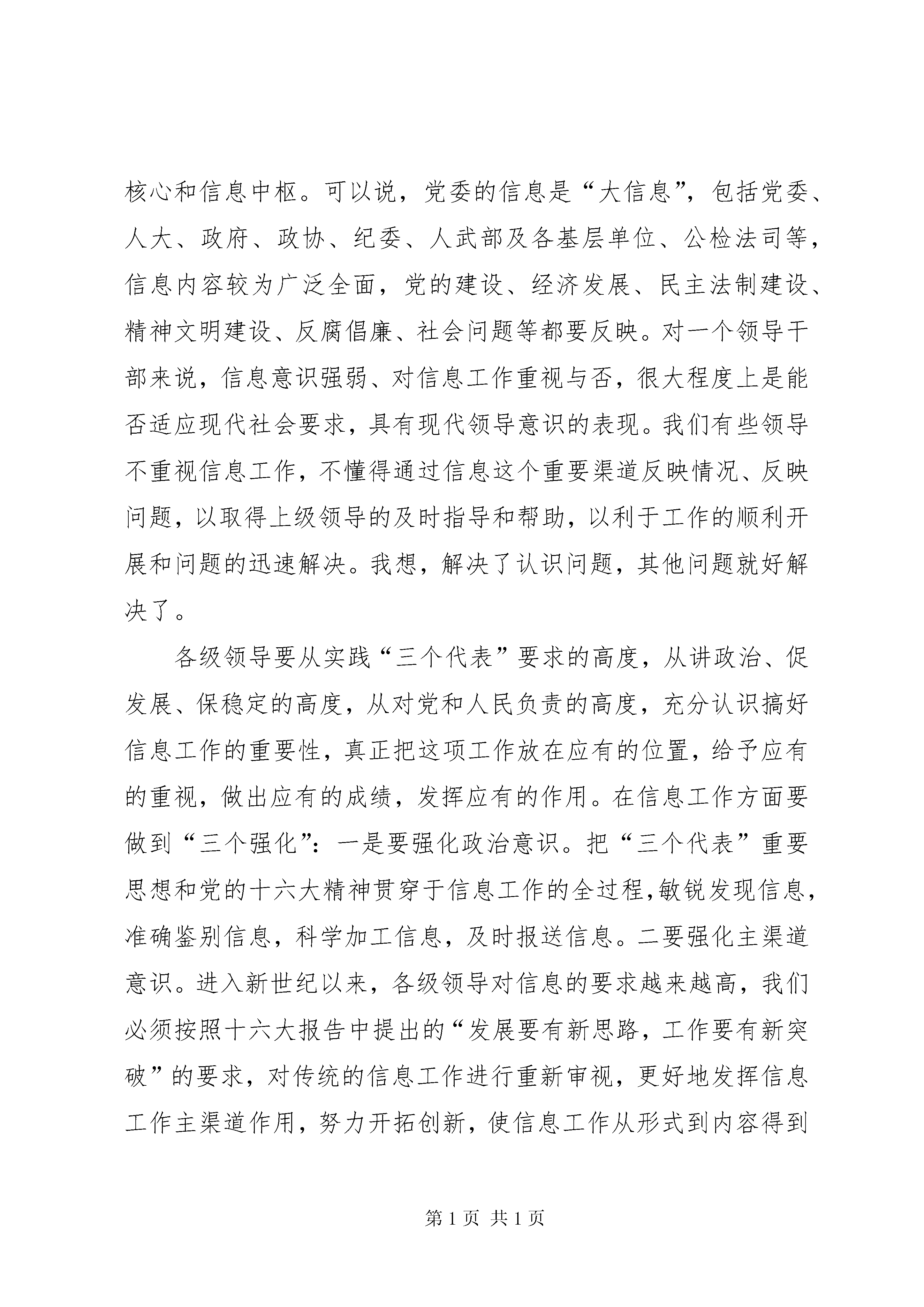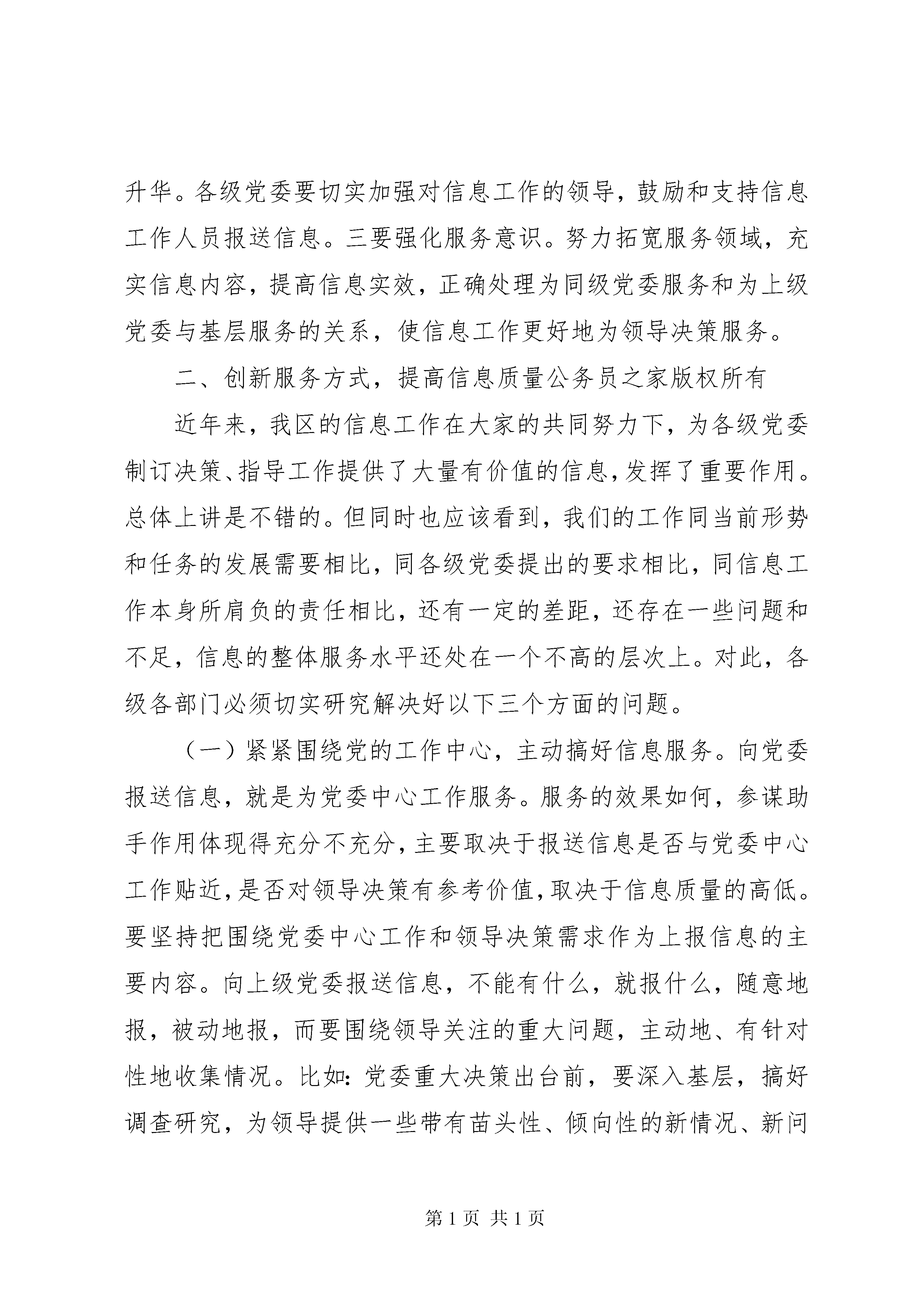 区委办公室主任在全区信息工作会议上的讲话信息工作是党委办公室的一项重要工作,是党委决策的基础和依据。它不仅承担着服务于同级党委的任务,而且还承担着服务于上级党委,向中央和省市委报送信息的重要职责,同时还肩负着服务基层,指导全局的任务。区委召开这次会议,就是要通过总结工作,分析问题,研究对策,落实任务,进一步创新信息工作服务方式,提高信息工作服务水平,为各级党委当好参谋助手,为建设富裕、文明、诚信区献计献策,为全区的改革、发展、稳定做出应有的贡献。刚才,同志对今年全区信息工作作了全面的总结;表彰了今年度在全区党委信息工作中做出突出成绩的先进单位和先进个人;传达学习了《区委办公室关于进一步加强信息工作的意见》,并就下步工作作了安排部署。下面,借此机会,我讲三点意见。一、创新服务理念,强化信息意识信息是科学决策的基础和依据,它贯穿于决策制定和实施的全过程,贯穿于党委工作的全过程。在全面建设小康社会的伟大实践中,党中央和各级党委要根据全党工作的总体部署,针对经济和社会发展过程中出现的新情况、新问题,不断对各项工作作出具体决策,提出新的措施。所有这些,都离不开信息工作的基础作用。可以说,在新的形势下,党中央和各级党委更加需要大量的、真实的、具有前瞻性的信息,以作为了解情况、制定决策、指导工作的参考和依据。当前,我们正面临着掀起新一轮思想大解放、经济大发展热潮的有利机遇,肩负着加快发展、建设经济强区的重要任务,做好每一项工作,都必须通过信息把握时局,预测走势,并据此调整和确定我们的计划、策略和措施,进而抓住机遇,不断求得新的发展。信息工作做得好不好,提供的信息及时不及时、准确不准确、全面不全面,将直接影响党委的决策以及对全局工作的领导。应该说,近年来我们对信息工作的重要性已经有了比较深刻的认识。不少部门和单位对信息工作摆位重视、措施得力;信息报送数量多、时效性强、质量高;大多数信息员具有良好的敬业精神和较强的政治、业务素质,虽然是兼职做这项工作,但对信息工作仍倾注了较高的热情,取得了较好的成绩。但是,我们也要看到,信息工作发展还不平衡,部门之间,无论是信息报送的数量还是质量都差异较大,特别是有的单位,去年全年的信息报送数量才到条,甚至还有条信息都没报的单位。究竟是业务繁忙还是人手不足。我看主要还是认识问题。据我所知,有些同志对信息报送工作还存在一些认识上的误区。有的部门和同志对信息工作本身的重要性认识不足。认为与本职工作相比,信息工作是可有可无、可干可不干、可报可不报,是无所谓的小事。有的部门和同志对党委的职能认识不深,信息报送对象往往只注重市级主管部门和行政主管部门,而没有意识到党委是全区的政治领导核心和信息中枢。可以说,党委的信息是“大信息”,包括党委、人大、政府、政协、纪委、人武部及各基层单位、公检法司等,信息内容较为广泛全面,党的建设、经济发展、民主法制建设、精神文明建设、反腐倡廉、社会问题等都要反映。对一个领导干部来说,信息意识强弱、对信息工作重视与否,很大程度上是能否适应现代社会要求,具有现代领导意识的表现。我们有些领导不重视信息工作,不懂得通过信息这个重要渠道反映情况、反映问题,以取得上级领导的及时指导和帮助,以利于工作的顺利开展和问题的迅速解决。我想,解决了认识问题,其他问题就好解决了。各级领导要从实践“三个代表”要求的高度,从讲政治、促发展、保稳定的高度,从对党和人民负责的高度,充分认识搞好信息工作的重要性,真正把这项工作放在应有的位置,给予应有的重视,做出应有的成绩,发挥应有的作用。在信息工作方面要做到“三个强化”:一是要强化政治意识。把“三个代表”重要思想和党的十六大精神贯穿于信息工作的全过程,敏锐发现信息,准确鉴别信息,科学加工信息,及时报送信息。二要强化主渠道意识。进入新世纪以来,各级领导对信息的要求越来越高,我们必须按照十六大报告中提出的“发展要有新思路,工作要有新突破”的要求,对传统的信息工作进行重新审视,更好地发挥信息工作主渠道作用,努力开拓创新,使信息工作从形式到内容得到升华。各级党委要切实加强对信息工作的领导,鼓励和支持信息工作人员报送信息。三要强化服务意识。努力拓宽服务领域,充实信息内容,提高信息实效,正确处理为同级党委服务和为上级党委与基层服务的关系,使信息工作更好地为领导决策服务。二、创新服务方式,提高信息质量公务员之家版权所有近年来,我区的信息工作在大家的共同努力下,为各级党委制订决策、指导工作提供了大量有价值的信息,发挥了重要作用。总体上讲是不错的。但同时也应该看到,我们的工作同当前形势和任务的发展需要相比,同各级党委提出的要求相比,同信息工作本身所肩负的责任相比,还有一定的差距,还存在一些问题和不足,信息的整体服务水平还处在一个不高的层次上。对此,各级各部门必须切实
