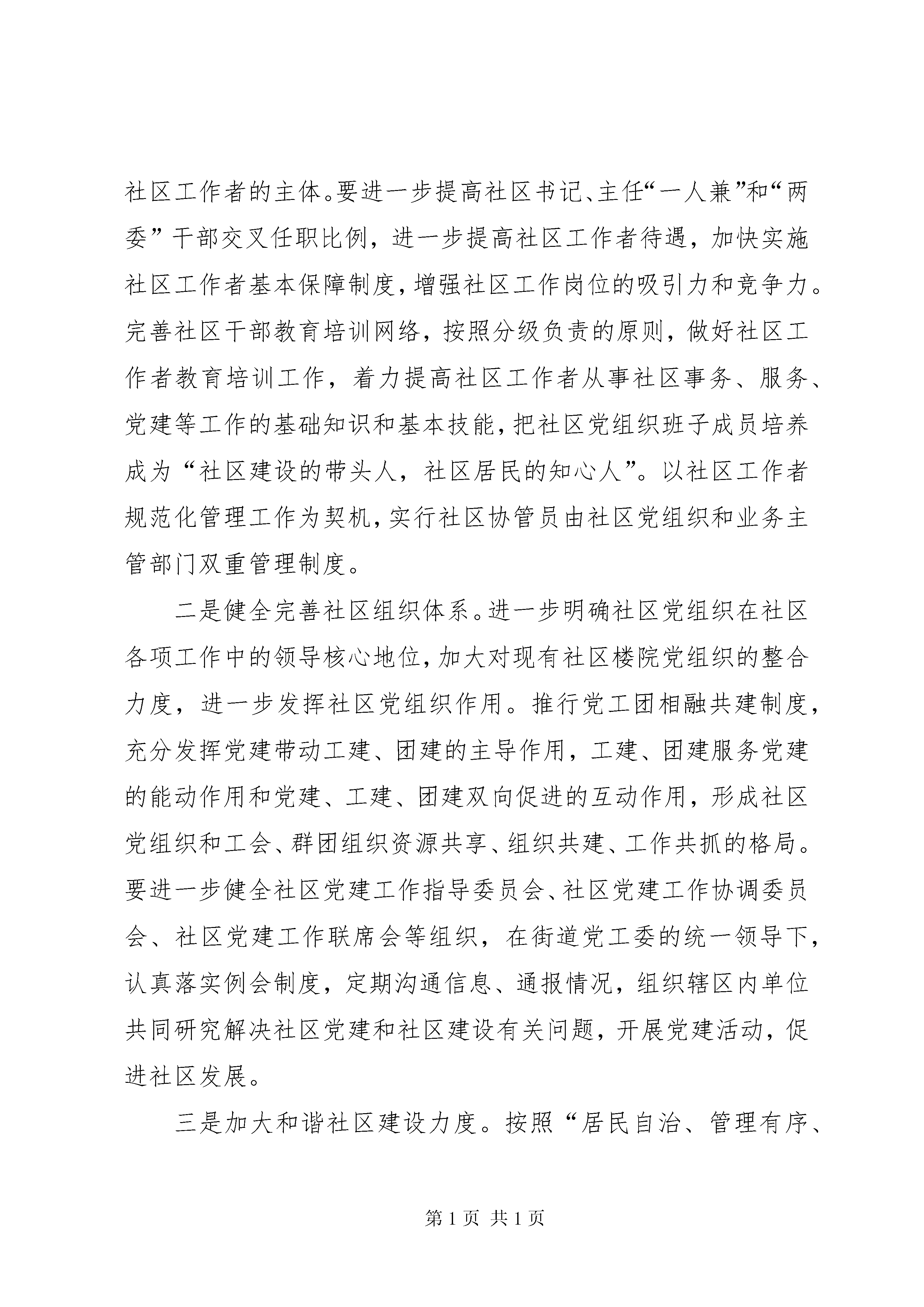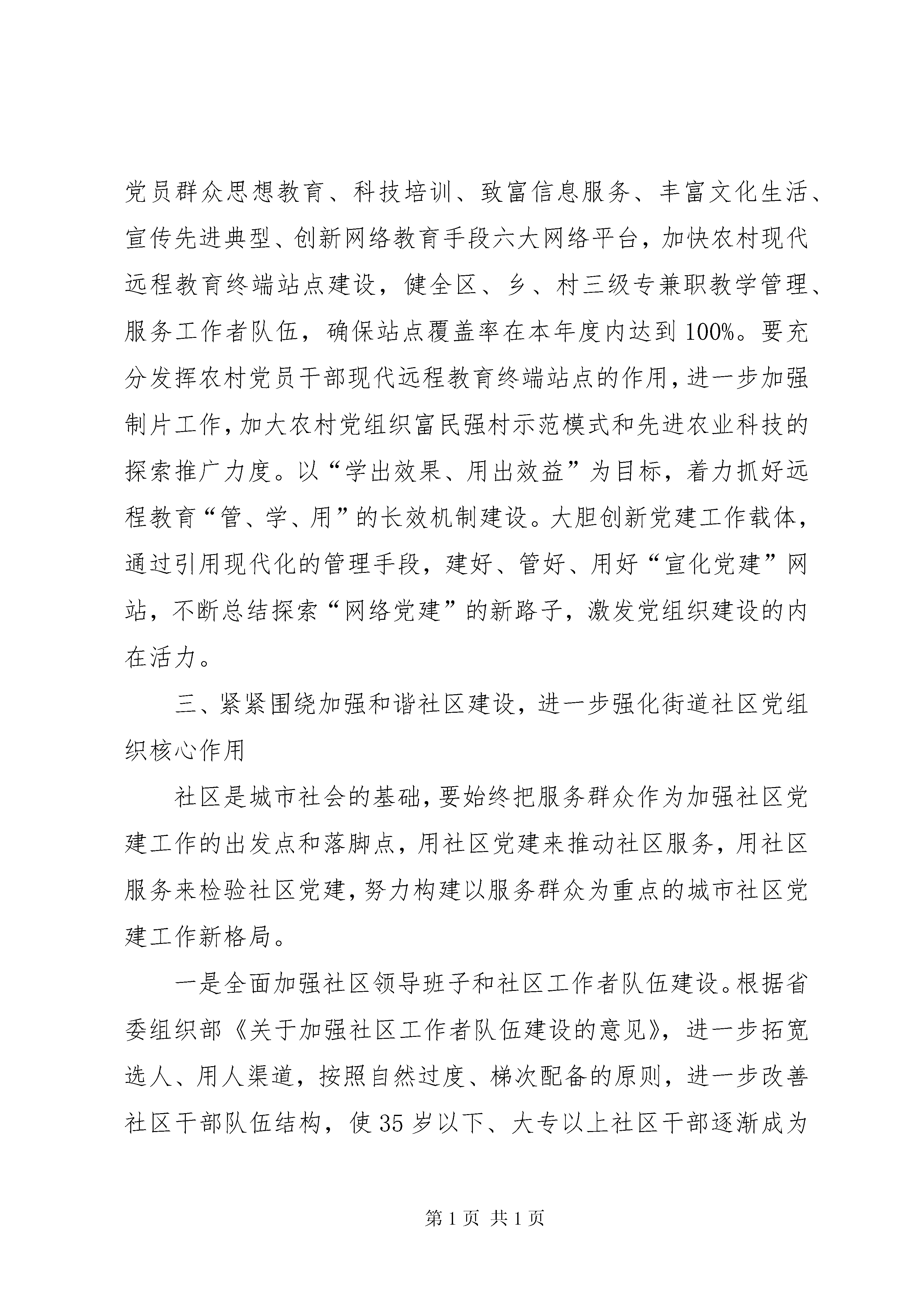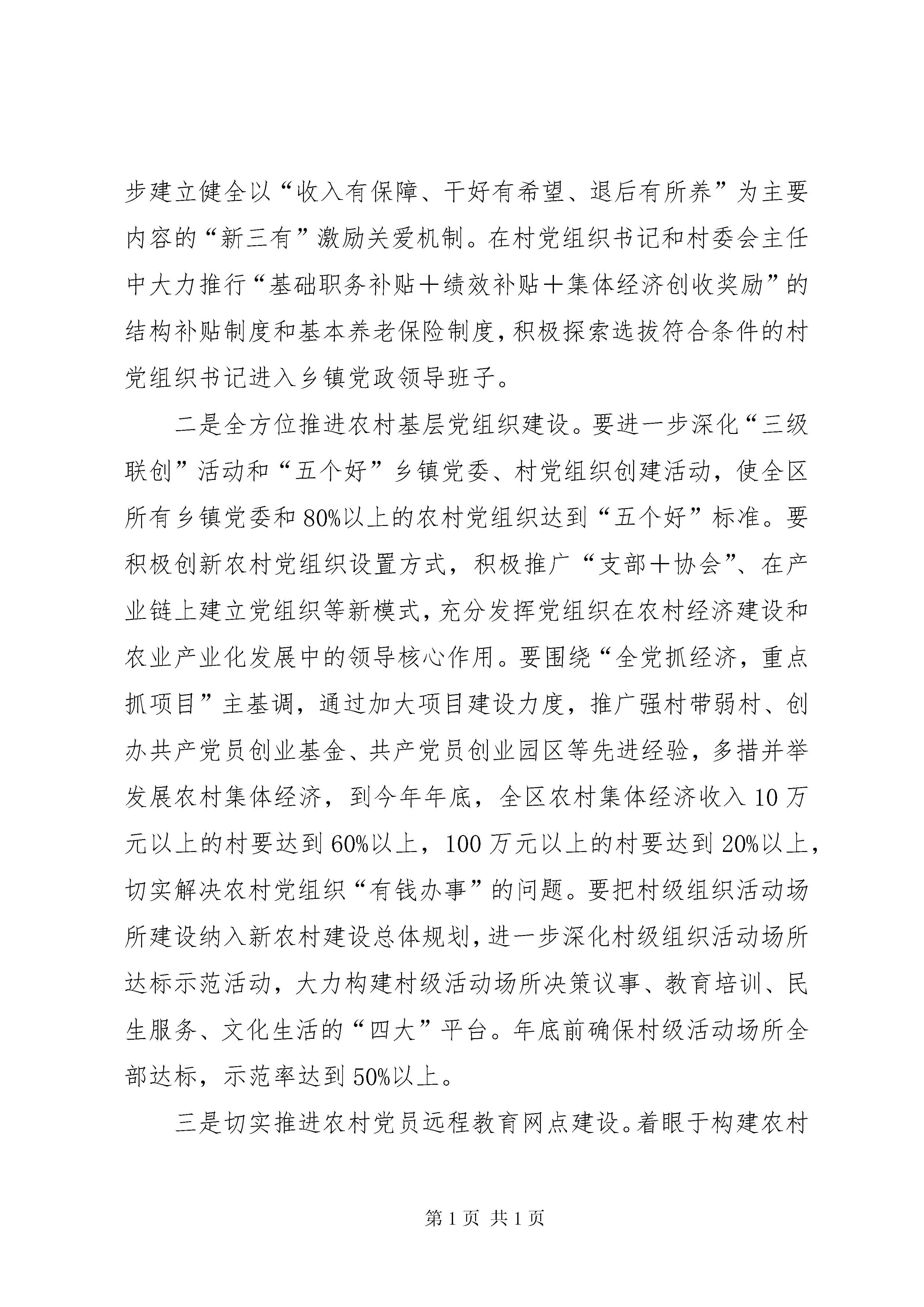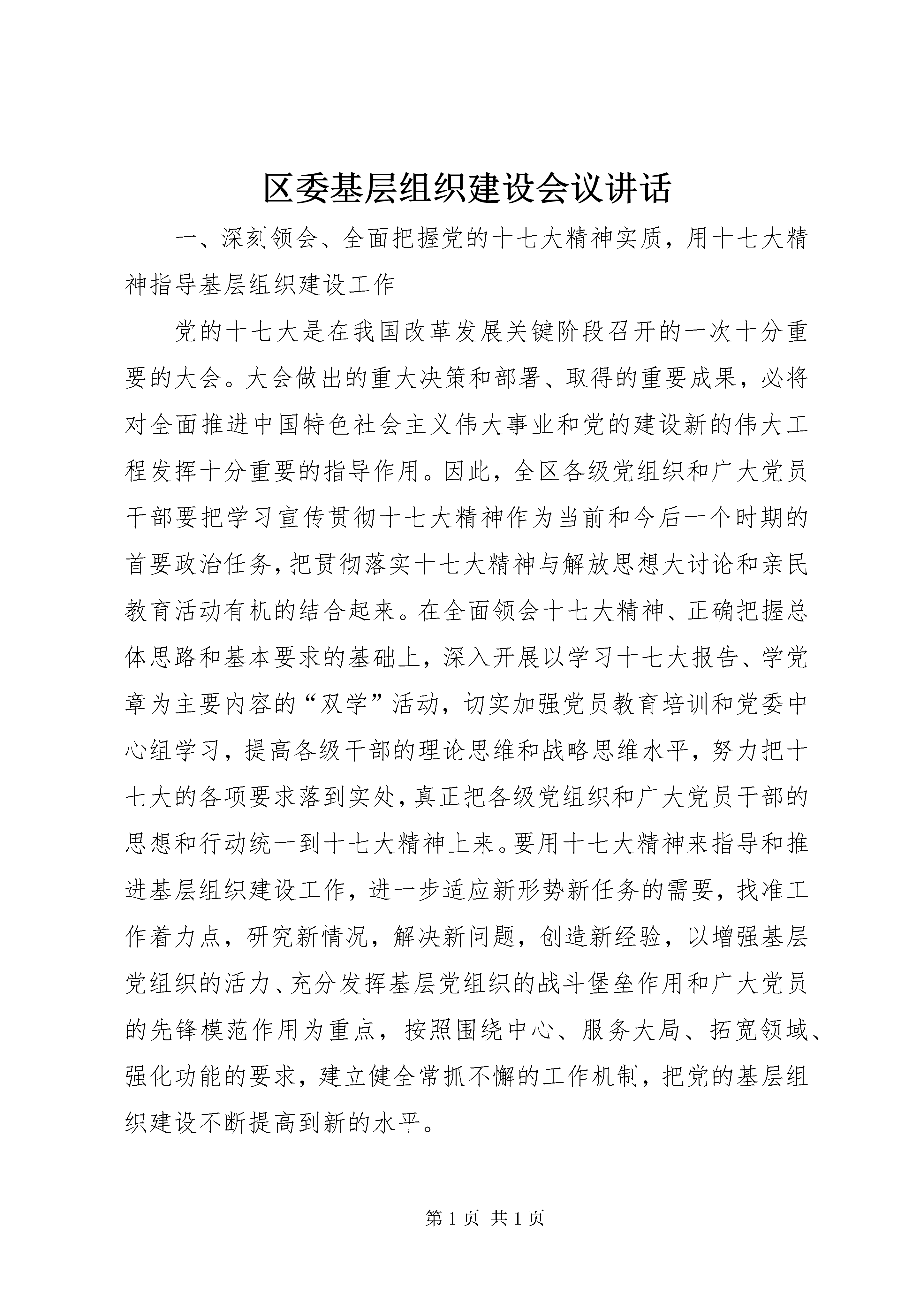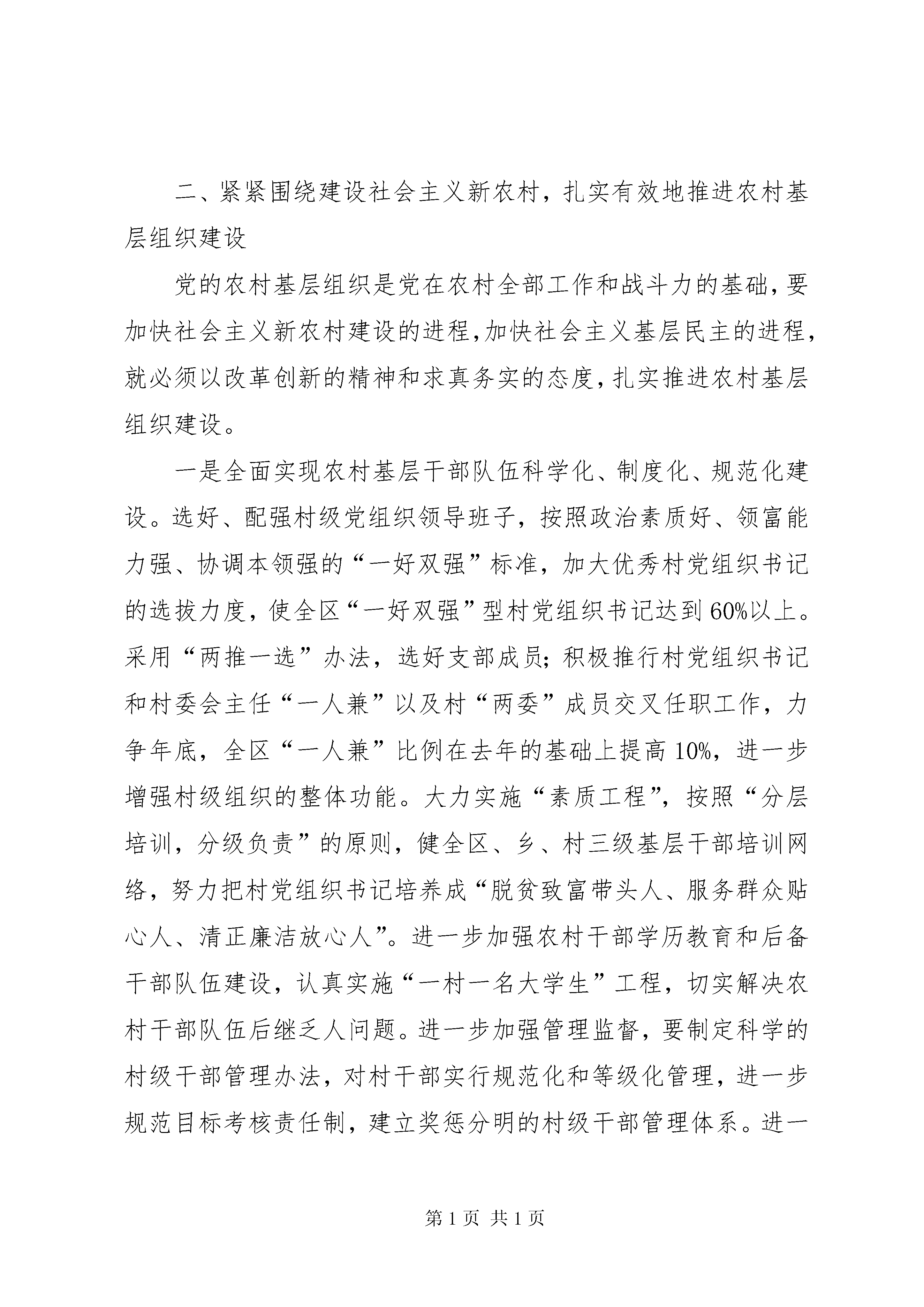 区委基层组织建设会议讲话一、深刻领会、全面把握党的十七大精神实质,用十七大精神指导基层组织建设工作党的十七大是在我国改革发展关键阶段召开的一次十分重要的大会。大会做出的重大决策和部署、取得的重要成果,必将对全面推进中国特色社会主义伟大事业和党的建设新的伟大工程发挥十分重要的指导作用。因此,全区各级党组织和广大党员干部要把学习宣传贯彻十七大精神作为当前和今后一个时期的首要政治任务,把贯彻落实十七大精神与解放思想大讨论和亲民教育活动有机的结合起来。在全面领会十七大精神、正确把握总体思路和基本要求的基础上,深入开展以学习十七大报告、学党章为主要内容的“双学”活动,切实加强党员教育培训和党委中心组学习,提高各级干部的理论思维和战略思维水平,努力把十七大的各项要求落到实处,真正把各级党组织和广大党员干部的思想和行动统一到十七大精神上来。要用十七大精神来指导和推进基层组织建设工作,进一步适应新形势新任务的需要,找准工作着力点,研究新情况,解决新问题,创造新经验,以增强基层党组织的活力、充分发挥基层党组织的战斗堡垒作用和广大党员的先锋模范作用为重点,按照围绕中心、服务大局、拓宽领域、强化功能的要求,建立健全常抓不懈的工作机制,把党的基层组织建设不断提高到新的水平。二、紧紧围绕建设社会主义新农村,扎实有效地推进农村基层组织建设党的农村基层组织是党在农村全部工作和战斗力的基础,要加快社会主义新农村建设的进程,加快社会主义基层民主的进程,就必须以改革创新的精神和求真务实的态度,扎实推进农村基层组织建设。一是全面实现农村基层干部队伍科学化、制度化、规范化建设。选好、配强村级党组织领导班子,按照政治素质好、领富能力强、协调本领强的“一好双强”标准,加大优秀村党组织书记的选拔力度,使全区“一好双强”型村党组织书记达到60%以上。采用“两推一选”办法,选好支部成员;积极推行村党组织书记和村委会主任“一人兼”以及村“两委”成员交叉任职工作,力争年底,全区“一人兼”比例在去年的基础上提高10%,进一步增强村级组织的整体功能。大力实施“素质工程”,按照“分层培训,分级负责”的原则,健全区、乡、村三级基层干部培训网络,努力把村党组织书记培养成“脱贫致富带头人、服务群众贴心人、清正廉洁放心人”。进一步加强农村干部学历教育和后备干部队伍建设,认真实施“一村一名大学生”工程,切实解决农村干部队伍后继乏人问题。进一步加强管理监督,要制定科学的村级干部管理办法,对村干部实行规范化和等级化管理,进一步规范目标考核责任制,建立奖惩分明的村级干部管理体系。进一步建立健全以“收入有保障、干好有希望、退后有所养”为主要内容的“新三有”激励关爱机制。在村党组织书记和村委会主任中大力推行“基础职务补贴+绩效补贴+集体经济创收奖励”的结构补贴制度和基本养老保险制度,积极探索选拔符合条件的村党组织书记进入乡镇党政领导班子。二是全方位推进农村基层党组织建设。要进一步深化“三级联创”活动和“五个好”乡镇党委、村党组织创建活动,使全区所有乡镇党委和80%以上的农村党组织达到“五个好”标准。要积极创新农村党组织设置方式,积极推广“支部+协会”、在产业链上建立党组织等新模式,充分发挥党组织在农村经济建设和农业产业化发展中的领导核心作用。要围绕“全党抓经济,重点抓项目”主基调,通过加大项目建设力度,推广强村带弱村、创办共产党员创业基金、共产党员创业园区等先进经验,多措并举发展农村集体经济,到今年年底,全区农村集体经济收入10万元以上的村要达到60%以上,100万元以上的村要达到20%以上,切实解决农村党组织“有钱办事”的问题。要把村级组织活动场所建设纳入新农村建设总体规划,进一步深化村级组织活动场所达标示范活动,大力构建村级活动场所决策议事、教育培训、民生服务、文化生活的“四大”平台。年底前确保村级活动场所全部达标,示范率达到50%以上。三是切实推进农村党员远程教育网点建设。着眼于构建农村党员群众思想教育、科技培训、致富信息服务、丰富文化生活、宣传先进典型、创新网络教育手段六大网络平台,加快农村现代远程教育终端站点建设,健全区、乡、村三级专兼职教学管理、服务工作者队伍,确保站点覆盖率在本年度内达到100%。要充分发挥农村党员干部现代远程教育终端站点的作用,进一步加强制片工作,加大农村党组织富民强村示范模式和先进农业科技的探索推广力度。以“学出效果、用出效益”为目标,着力抓好远程教育“管、学、用”的长效机制建设。大胆创新党建工作载体,通过引用现代化的管理手段,建好、管好、用好“宣化党建”网站,不断总结探索“网络党建”的新路子,激发党组织建设的内在活力。三、紧紧围绕加强和谐社区建设,进一步强化街道社区党组织核心作用社区是城市社会的基础,要始终把服务群众作为加强社区党建工作的出发点